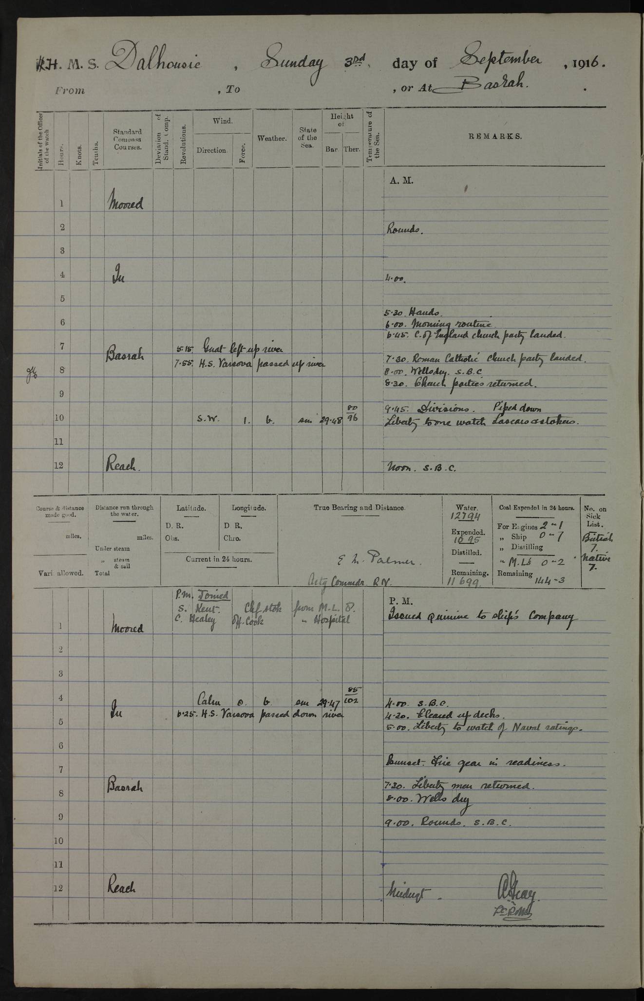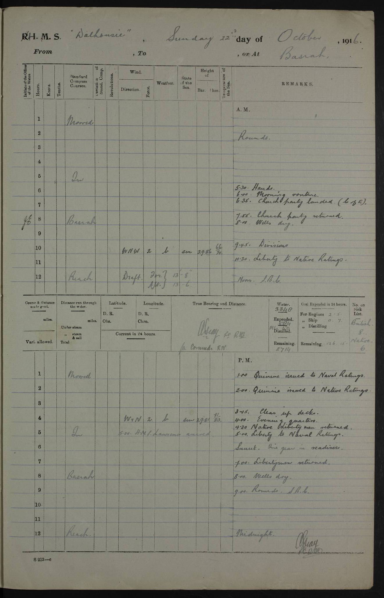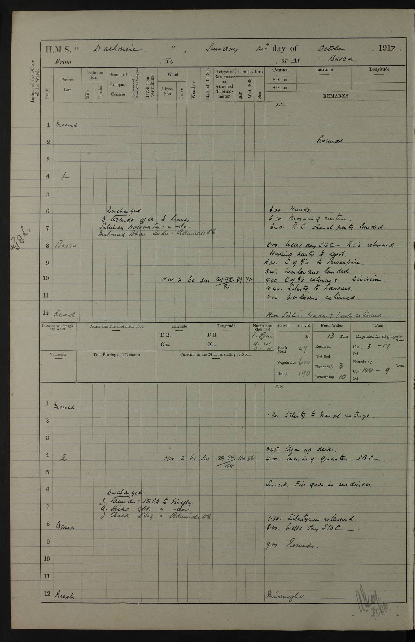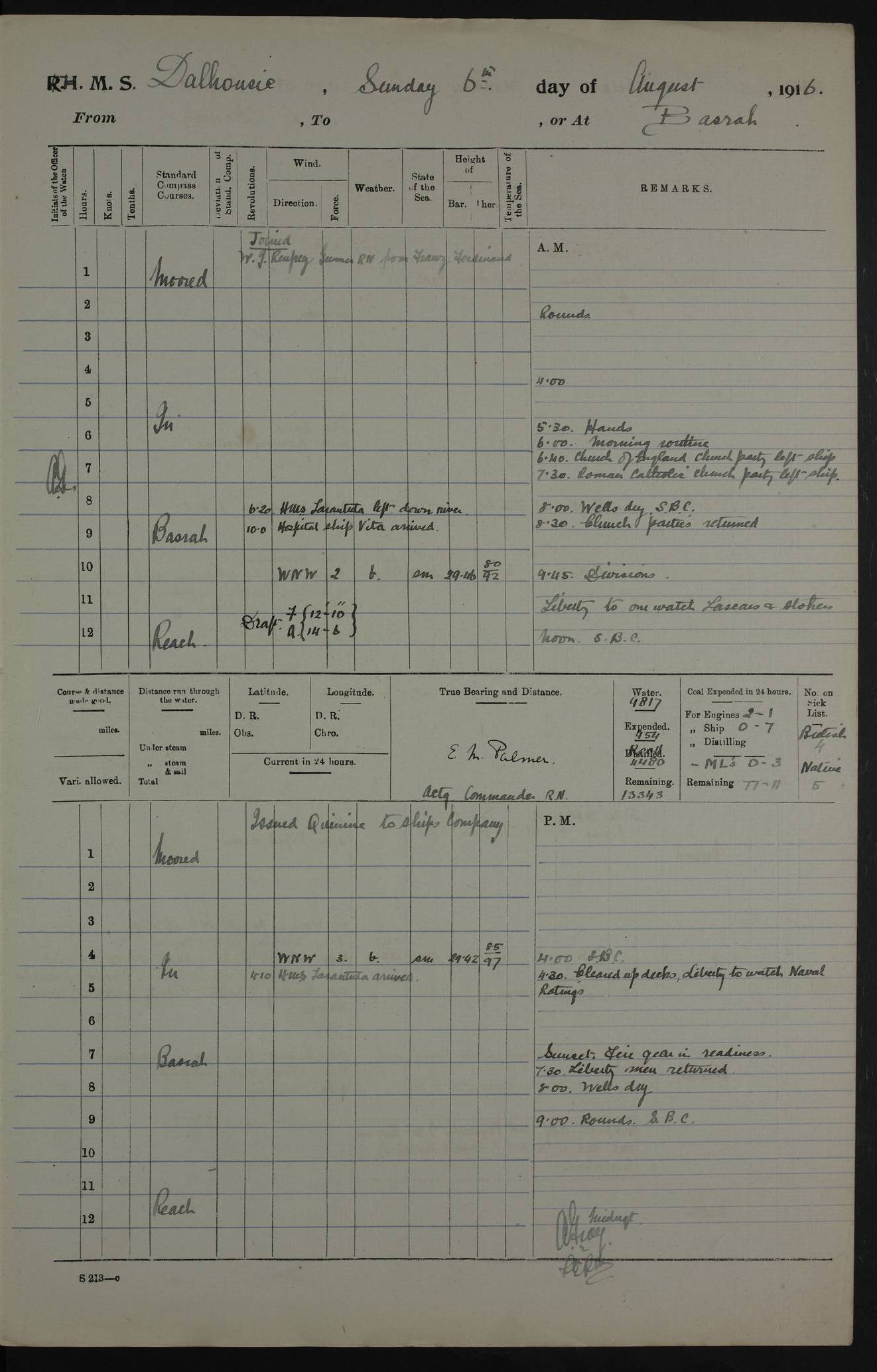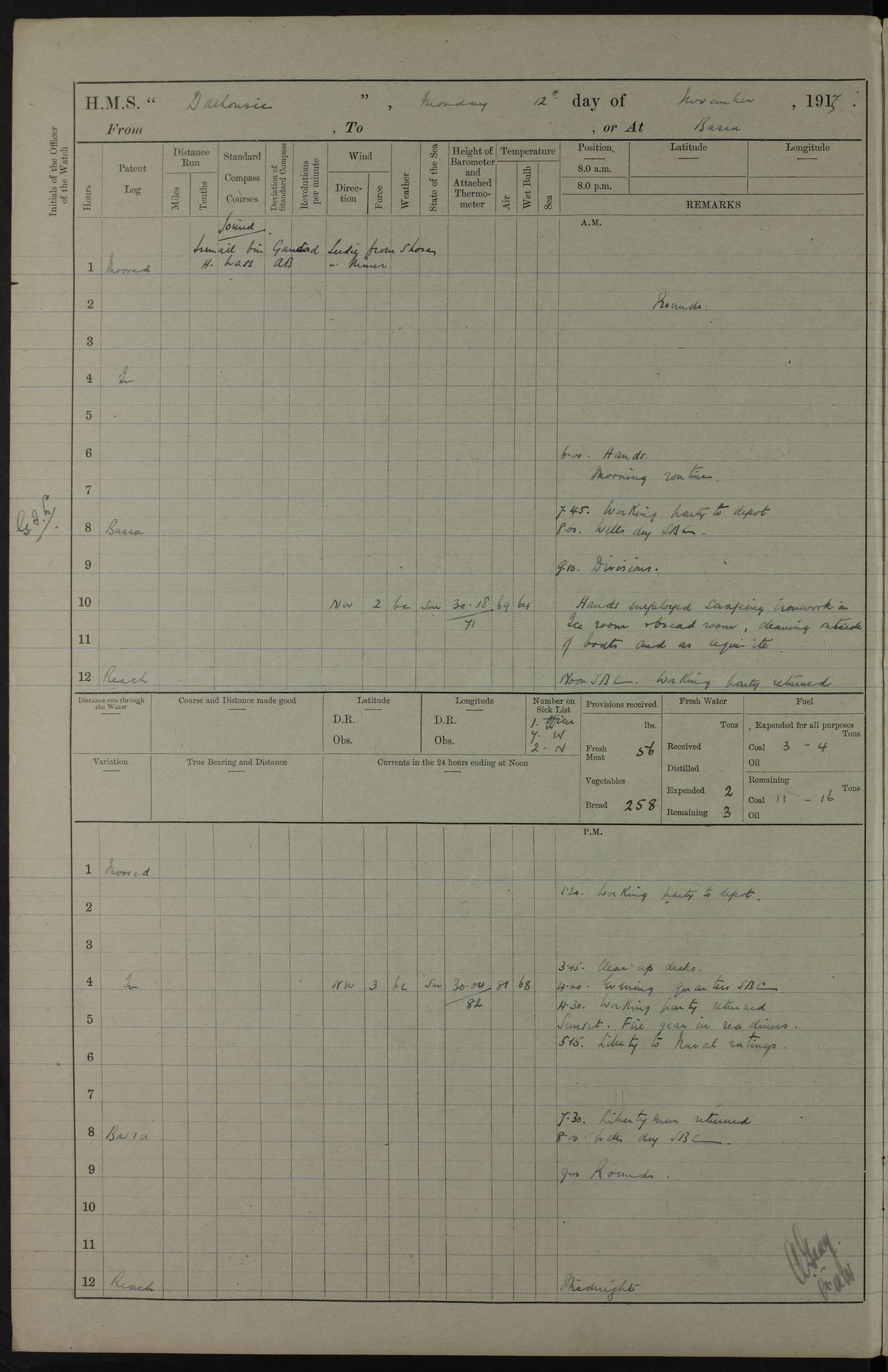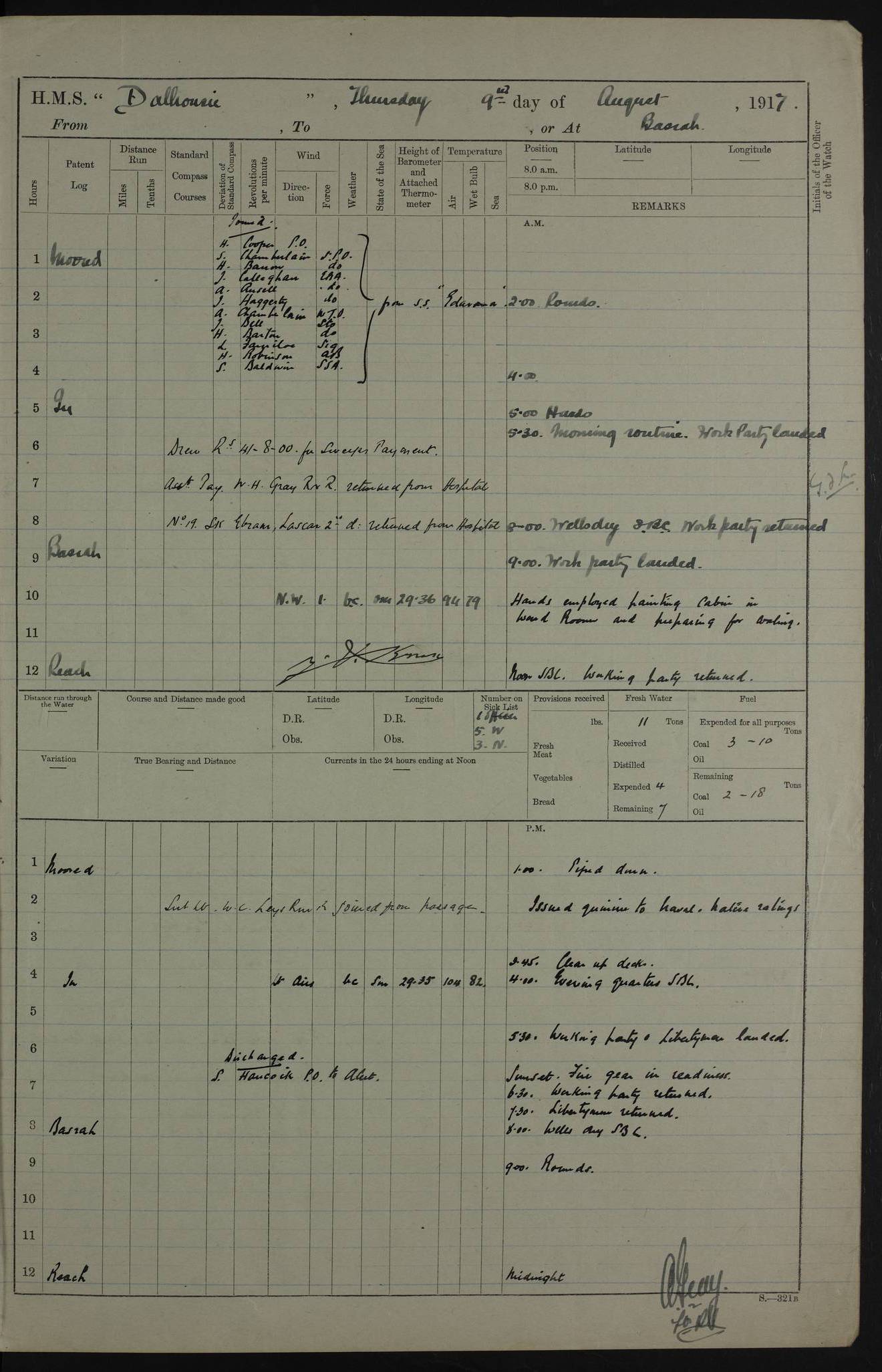 4ef4fafce53e0a0c91005931: (https://s3.amazonaws.com:443/oldweather/ADM53-39406/0015_1.jpg) 27 October 1917 Place: Basrah Lat 30.5269, Long 47.8407 2:00am: Rounds 6:00am: Hands - Morning Routine 7:00am: Exercised Fire stations 7:45am: Working party to Depot 8:00am: Wells dry - Signal Books correct 10:00am: Hands employed cleaning ship 12:00pm: Signal Books correct – Working party returned 1:00pm: Hands piped down 1:30pm: Liberty to Naval Ratings 3:45pm: Cleared up decks 4:00pm: Evening Quarters – Signal Books correct 5:15pm: Liberty to Naval Ratings 6:00pm: Sunset - Fire Gear in readiness 7:30pm: Liberty men returned 8:00pm: Wells dry - Signal Books correct 9:00pm: Rounds – Signal Books correct AM – Discharged To BARALA: W Denyer, Able Seaman - A Childs, Able Seaman - H Beckham Seaman - N Murray Seaman PM - Discharged To SCARAB: A Bushill, Senior Petty Officer - H Garth, Signalman To TARANTULA: G Campbell, Ship’s Steward Assistant 4ef4fafde53e0a0c91005932: (https://s3.amazonaws.com:443/oldweather/ADM53-39406/0016_0.jpg) 28 October 1917 Place: Basrah Lat 30.5269, Long 47.8407 2:00am: Rounds 5:30am: Hands 6:00am: Morning Routine 7:00am: Roman Catholic Church party landed 8:00am: Wells dry – Signal Books correct – Roman Catholics returned - Working party to Depot 8:30am: Church of England party to PROSERPINE 8:45am: Wesleyans landed 9:45am: Church parties returned - Divisions 10:30am: Liberty to Native Ratings 12:00pm: Signal Books correct – Working party returned 1:00pm: Issued Quinine to Naval Ratings- Issued Quinine to Native Ratings 1:30pm: Liberty to Naval ratings 3:45pm: Cleared up decks 4:00pm: Evening Quarters – Signal Books correct 5:15pm: Liberty to Naval Ratings 6:00pm: Sunset - Fire Gear in readiness 7:30pm: Liberty men returned 8:00pm: Wells dry - Signal Books correct 9:00pm: Rounds – Signal Books correct AM – Discharged To GRAYFLY: E.C. Shepherd, Petty Officer - W Hill, Able Seaman - Q Cox, Able Seaman - H Murphy, Able Seaman - A Taylor Telegrapher PM – Joined From SCARAB: J.G. Cooper, Stoker From Admiral’s House: Dounleg bin Eulog, Seedie PM - Discharged To ELEPHANTA: Alex de Souza, Officer's Steward To SCARAB: A Hatchard, Stoker To FIREFLY: W Burke, Stoker To Admiral’s House: Abrahim bin Shambi, Seedie