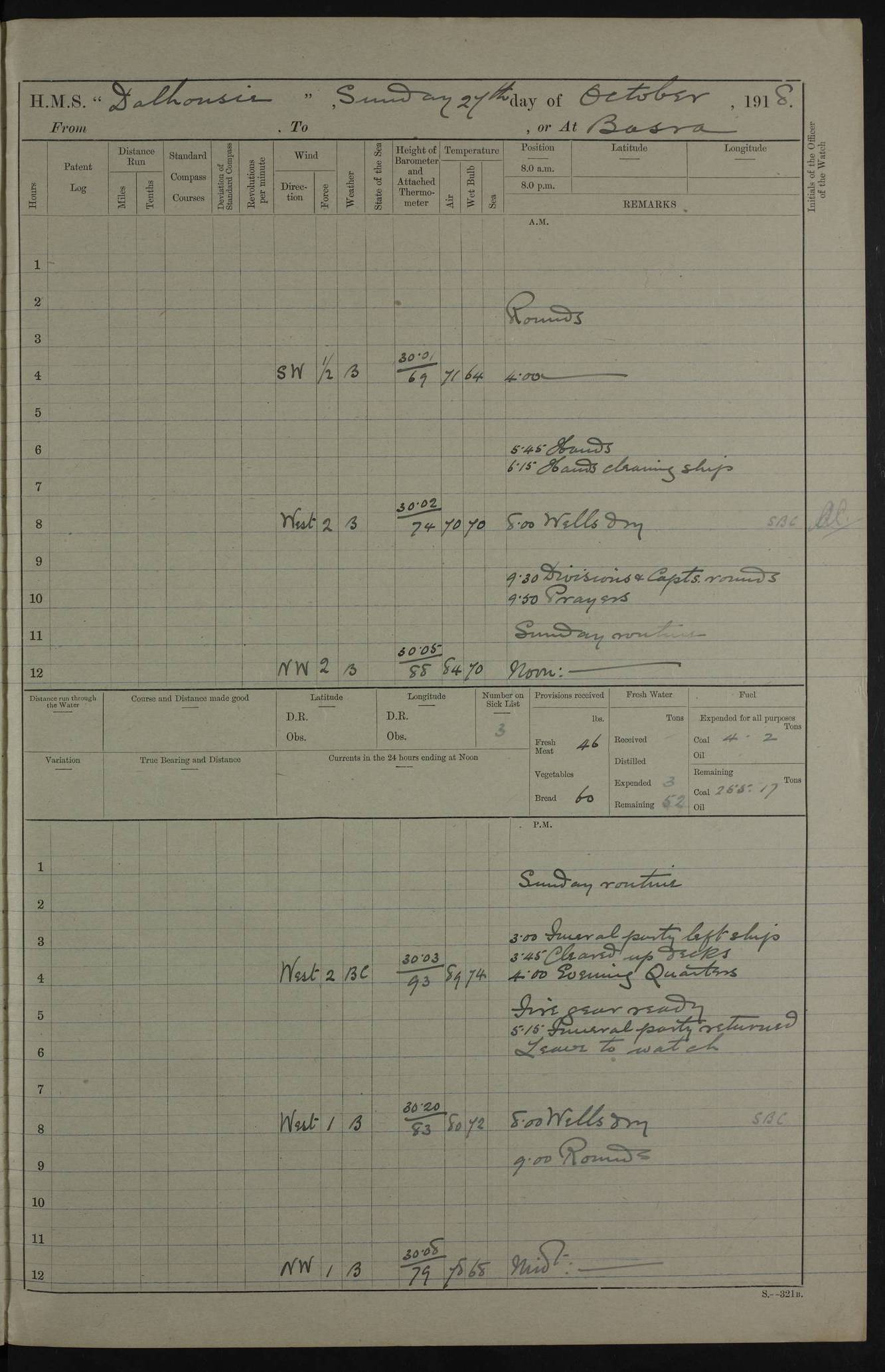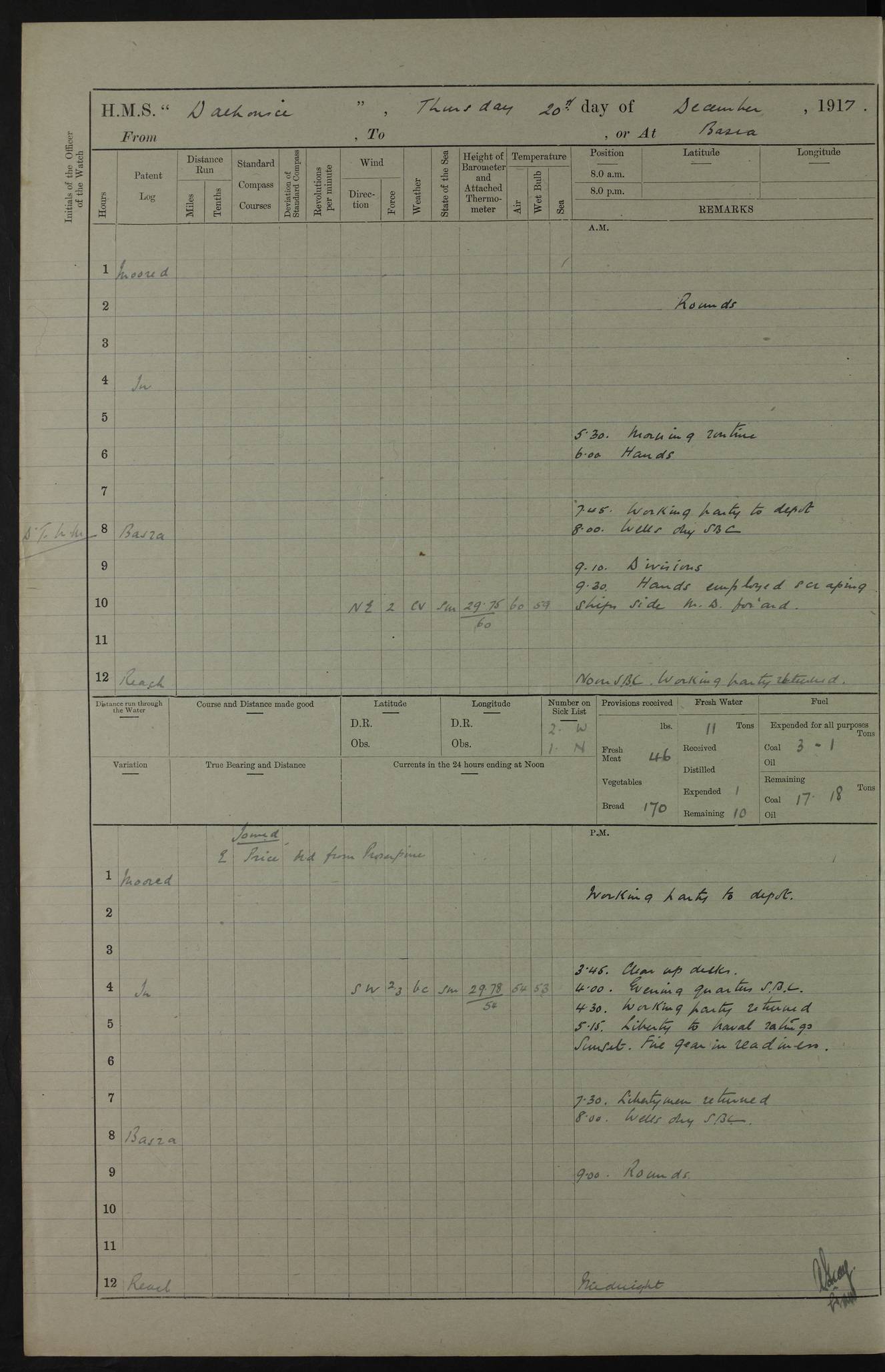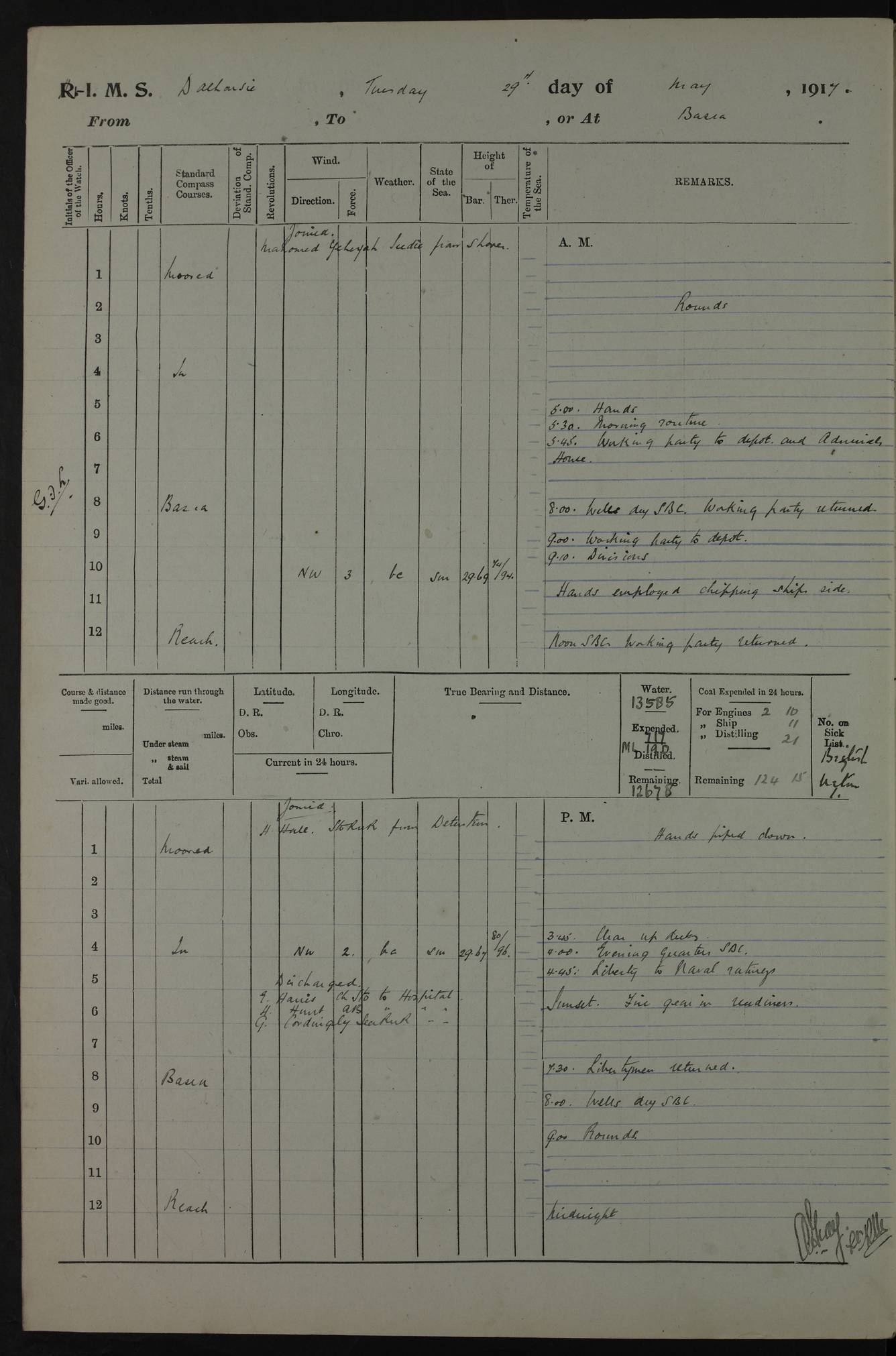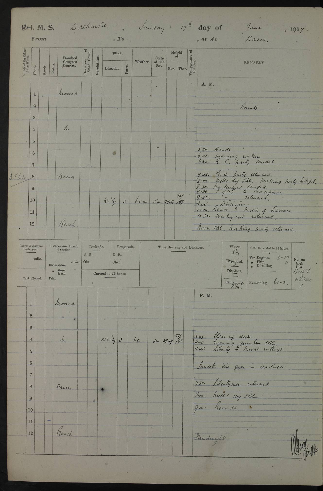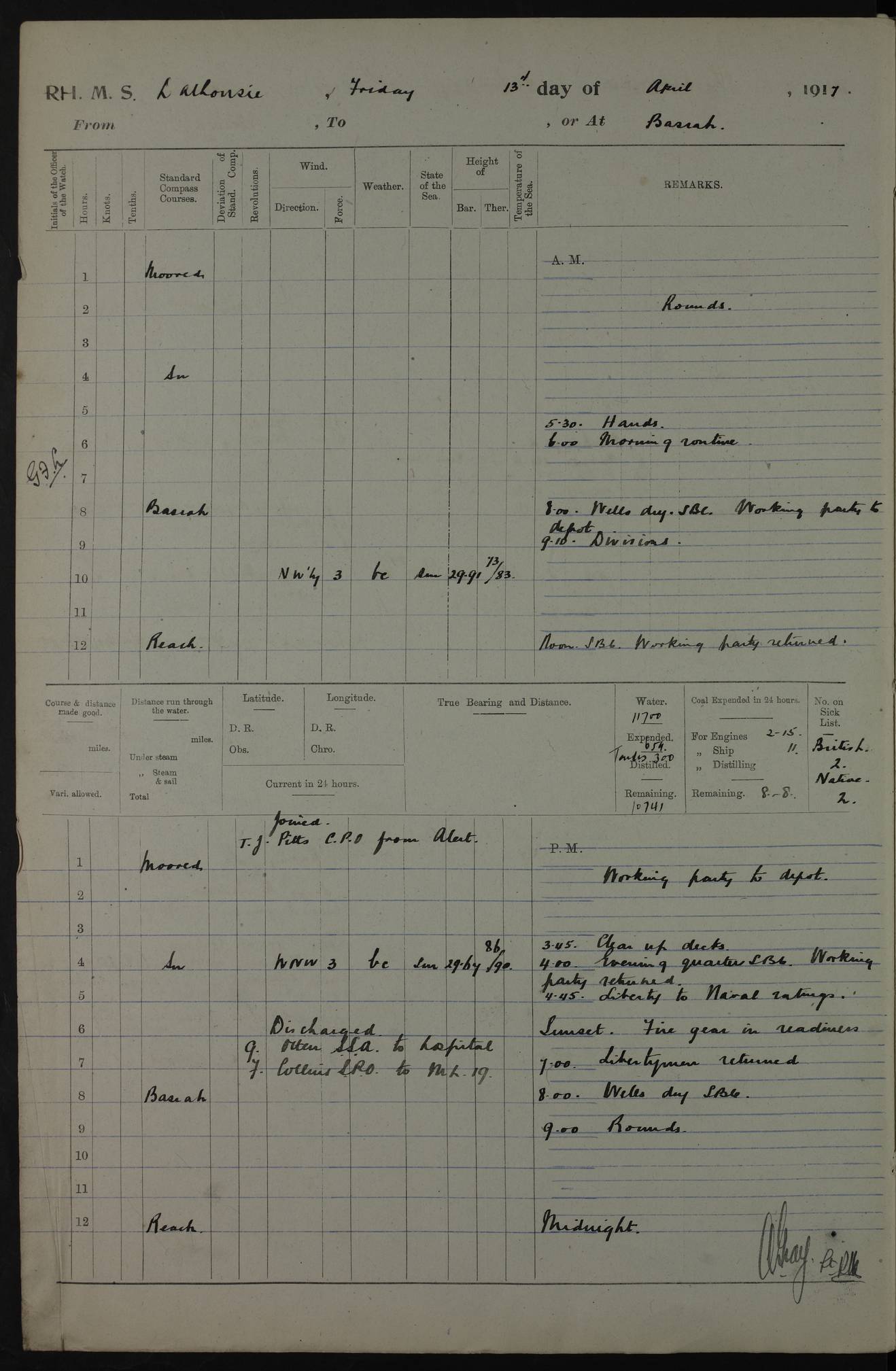 4ef4fafce53e0a0c91005931: (https://s3.amazonaws.com:443/oldweather/ADM53-39406/0015_1.jpg) 27 October 1917 Place: Basrah Lat 30.5269, Long 47.8407 2:00am: Rounds 6:00am: Hands - Morning Routine 7:00am: Exercised Fire stations 7:45am: Working party to Depot 8:00am: Wells dry - Signal Books correct 10:00am: Hands employed cleaning ship 12:00pm: Signal Books correct – Working party returned 1:00pm: Hands piped down 1:30pm: Liberty to Naval Ratings 3:45pm: Cleared up decks 4:00pm: Evening Quarters – Signal Books correct 5:15pm: Liberty to Naval Ratings 6:00pm: Sunset - Fire Gear in readiness 7:30pm: Liberty men returned 8:00pm: Wells dry - Signal Books correct 9:00pm: Rounds – Signal Books correct AM – Discharged To BARALA: W Denyer, Able Seaman - A Childs, Able Seaman - H Beckham Seaman - N Murray Seaman PM - Discharged To SCARAB: A Bushill, Senior Petty Officer - H Garth, Signalman To TARANTULA: G Campbell, Ship’s Steward Assistant 4ef4fafde53e0a0c91005932: (https://s3.amazonaws.com:443/oldweather/ADM53-39406/0016_0.jpg) 28 October 1917 Place: Basrah Lat 30.5269, Long 47.8407 2:00am: Rounds 5:30am: Hands 6:00am: Morning Routine 7:00am: Roman Catholic Church party landed 8:00am: Wells dry – Signal Books correct – Roman Catholics returned - Working party to Depot 8:30am: Church of England party to PROSERPINE 8:45am: Wesleyans landed 9:45am: Church parties returned - Divisions 10:30am: Liberty to Native Ratings 12:00pm: Signal Books correct – Working party returned 1:00pm: Issued Quinine to Naval Ratings- Issued Quinine to Native Ratings 1:30pm: Liberty to Naval ratings 3:45pm: Cleared up decks 4:00pm: Evening Quarters – Signal Books correct 5:15pm: Liberty to Naval Ratings 6:00pm: Sunset - Fire Gear in readiness 7:30pm: Liberty men returned 8:00pm: Wells dry - Signal Books correct 9:00pm: Rounds – Signal Books correct AM – Discharged To GRAYFLY: E.C. Shepherd, Petty Officer - W Hill, Able Seaman - Q Cox, Able Seaman - H Murphy, Able Seaman - A Taylor Telegrapher PM – Joined From SCARAB: J.G. Cooper, Stoker From Admiral’s House: Dounleg bin Eulog, Seedie PM - Discharged To ELEPHANTA: Alex de Souza, Officer's Steward To SCARAB: A Hatchard, Stoker To FIREFLY: W Burke, Stoker To Admiral’s House: Abrahim bin Shambi, Seedie