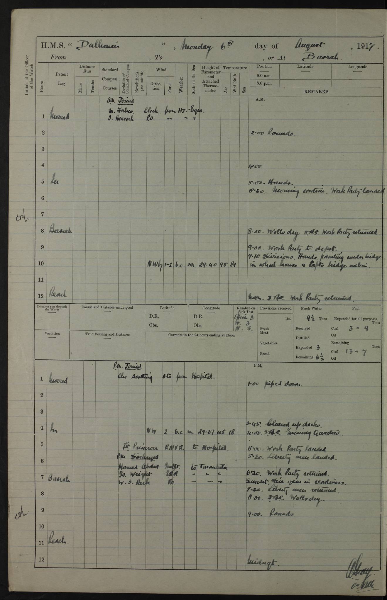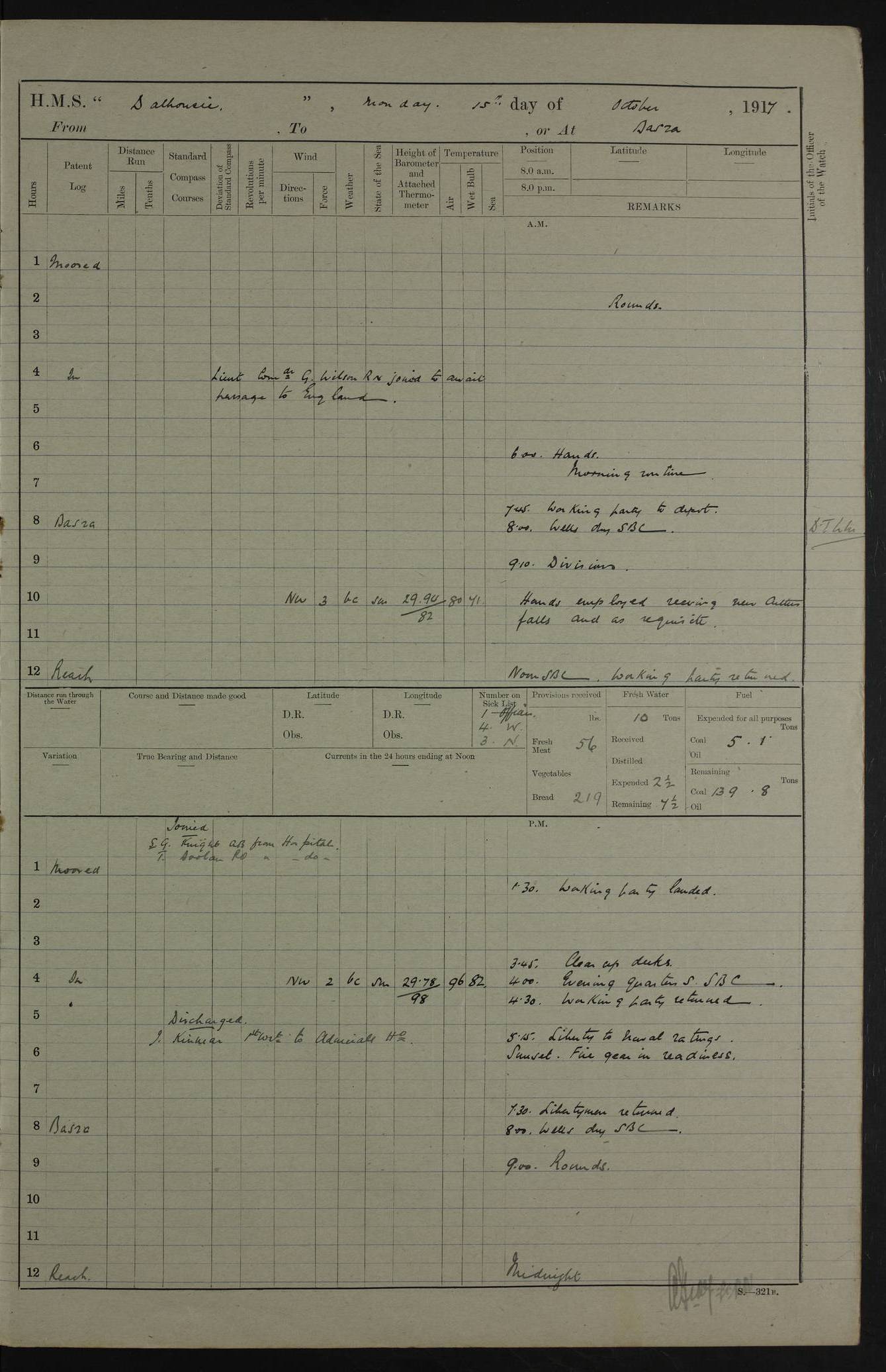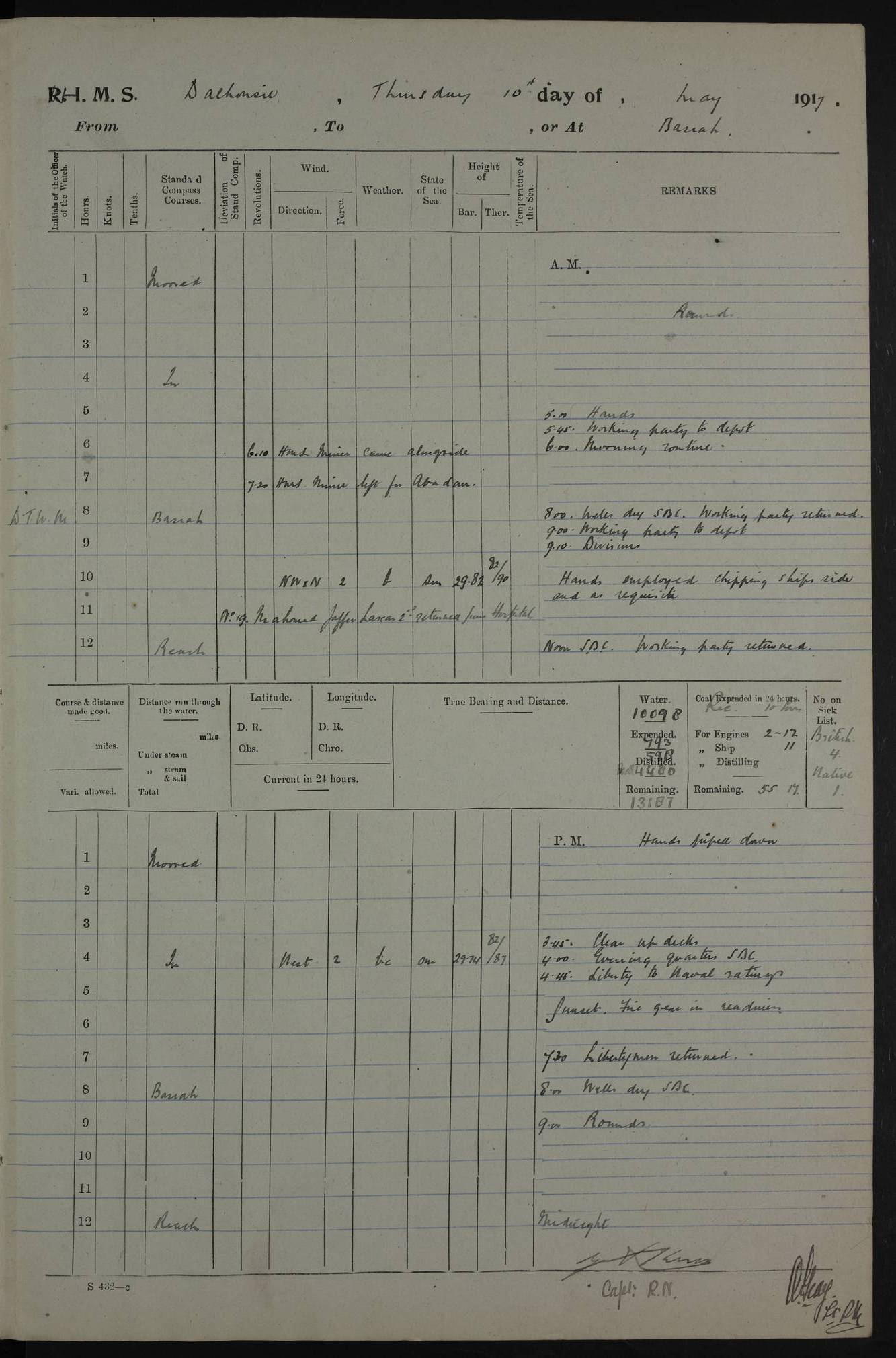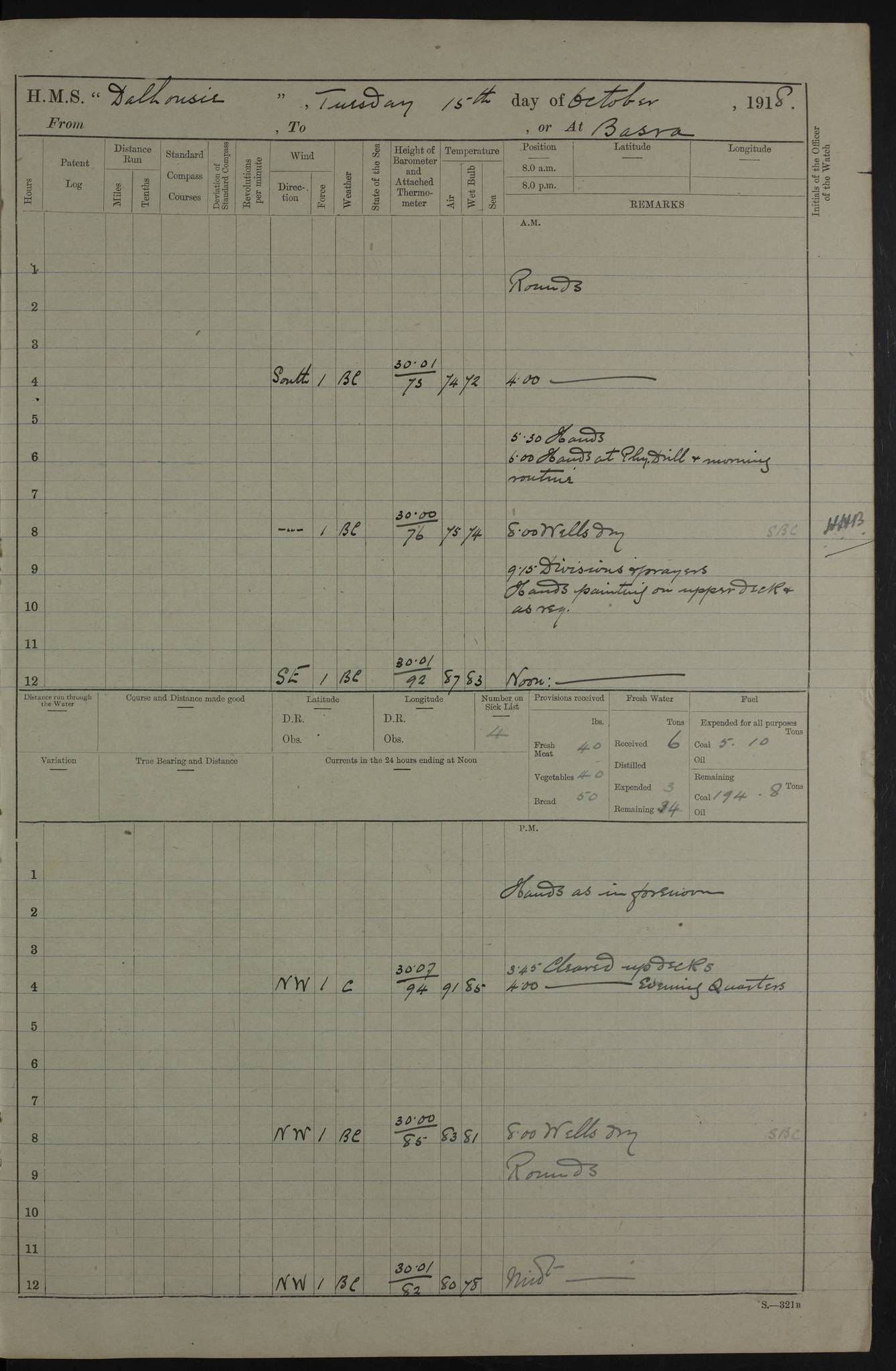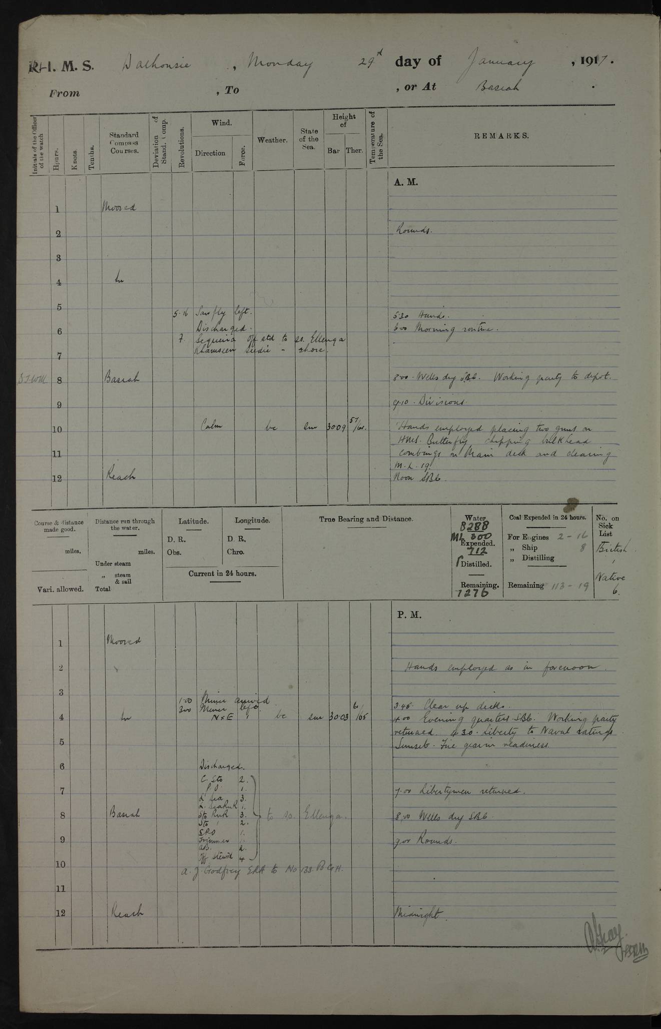 4ef4fafce53e0a0c91005931: (https://s3.amazonaws.com:443/oldweather/ADM53-39406/0015_1.jpg) 27 October 1917 Place: Basrah Lat 30.5269, Long 47.8407 2:00am: Rounds 6:00am: Hands - Morning Routine 7:00am: Exercised Fire stations 7:45am: Working party to Depot 8:00am: Wells dry - Signal Books correct 10:00am: Hands employed cleaning ship 12:00pm: Signal Books correct – Working party returned 1:00pm: Hands piped down 1:30pm: Liberty to Naval Ratings 3:45pm: Cleared up decks 4:00pm: Evening Quarters – Signal Books correct 5:15pm: Liberty to Naval Ratings 6:00pm: Sunset - Fire Gear in readiness 7:30pm: Liberty men returned 8:00pm: Wells dry - Signal Books correct 9:00pm: Rounds – Signal Books correct AM – Discharged To BARALA: W Denyer, Able Seaman - A Childs, Able Seaman - H Beckham Seaman - N Murray Seaman PM - Discharged To SCARAB: A Bushill, Senior Petty Officer - H Garth, Signalman To TARANTULA: G Campbell, Ship’s Steward Assistant 4ef4fafde53e0a0c91005932: (https://s3.amazonaws.com:443/oldweather/ADM53-39406/0016_0.jpg) 28 October 1917 Place: Basrah Lat 30.5269, Long 47.8407 2:00am: Rounds 5:30am: Hands 6:00am: Morning Routine 7:00am: Roman Catholic Church party landed 8:00am: Wells dry – Signal Books correct – Roman Catholics returned - Working party to Depot 8:30am: Church of England party to PROSERPINE 8:45am: Wesleyans landed 9:45am: Church parties returned - Divisions 10:30am: Liberty to Native Ratings 12:00pm: Signal Books correct – Working party returned 1:00pm: Issued Quinine to Naval Ratings- Issued Quinine to Native Ratings 1:30pm: Liberty to Naval ratings 3:45pm: Cleared up decks 4:00pm: Evening Quarters – Signal Books correct 5:15pm: Liberty to Naval Ratings 6:00pm: Sunset - Fire Gear in readiness 7:30pm: Liberty men returned 8:00pm: Wells dry - Signal Books correct 9:00pm: Rounds – Signal Books correct AM – Discharged To GRAYFLY: E.C. Shepherd, Petty Officer - W Hill, Able Seaman - Q Cox, Able Seaman - H Murphy, Able Seaman - A Taylor Telegrapher PM – Joined From SCARAB: J.G. Cooper, Stoker From Admiral’s House: Dounleg bin Eulog, Seedie PM - Discharged To ELEPHANTA: Alex de Souza, Officer's Steward To SCARAB: A Hatchard, Stoker To FIREFLY: W Burke, Stoker To Admiral’s House: Abrahim bin Shambi, Seedie