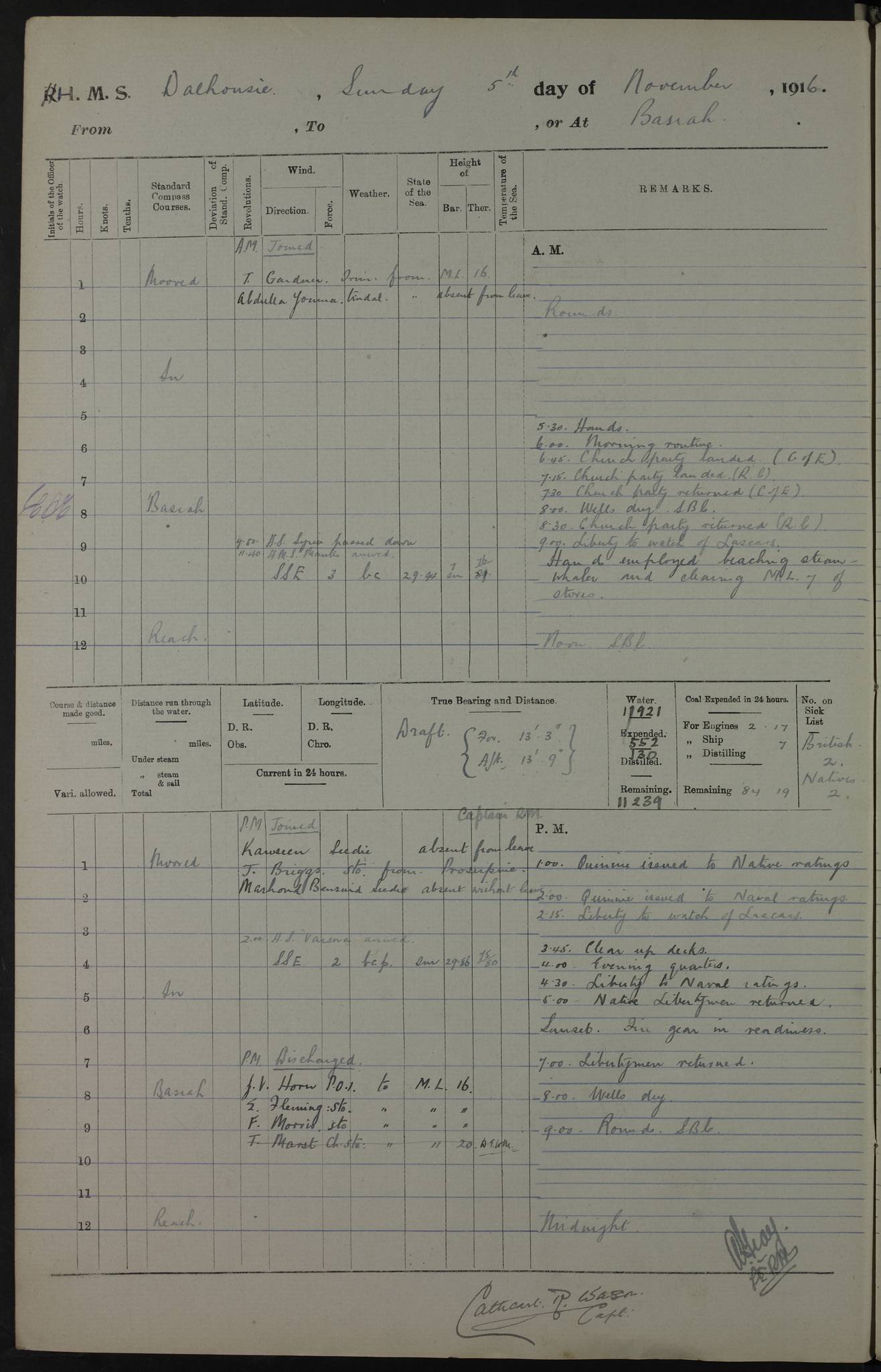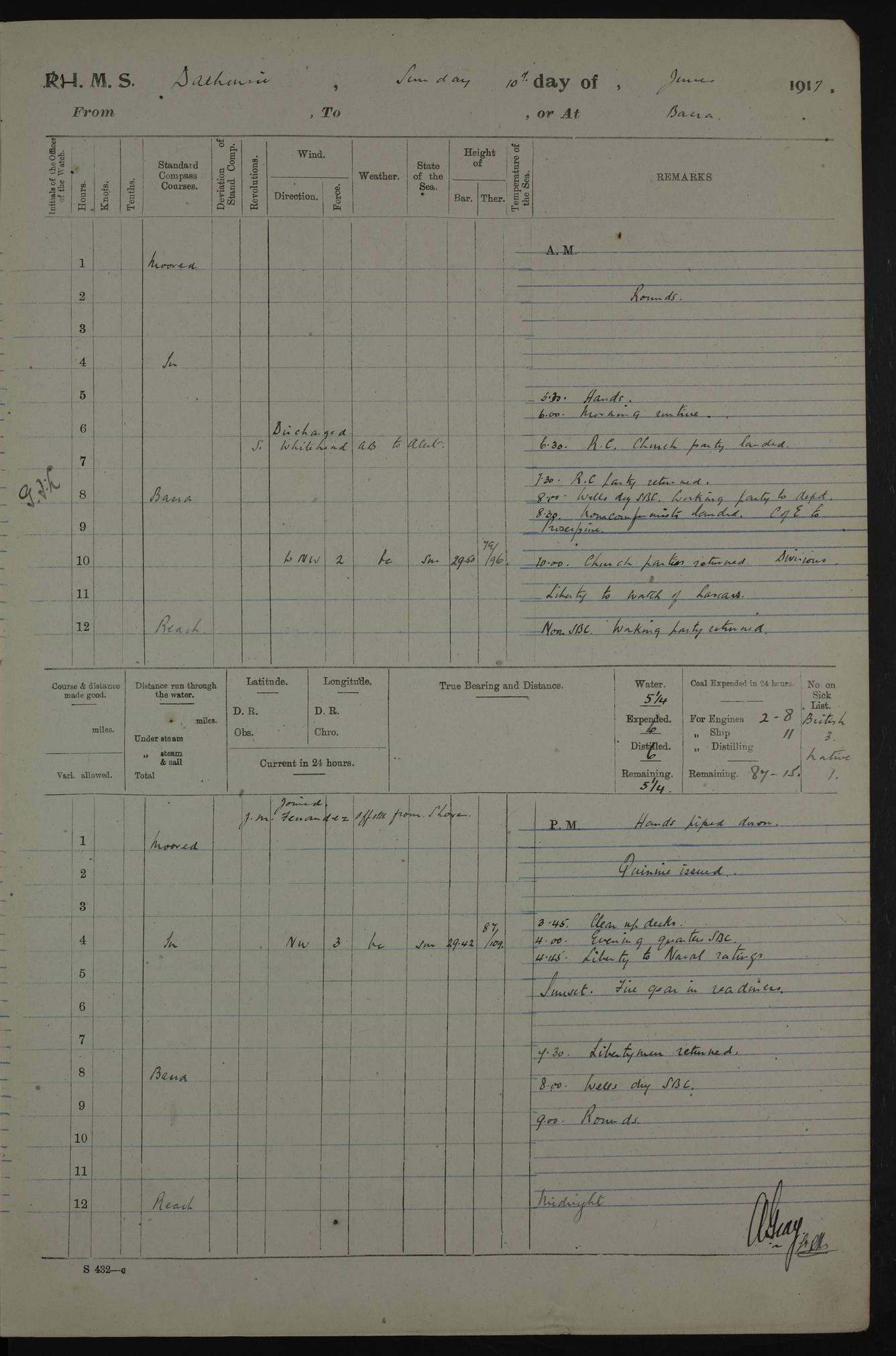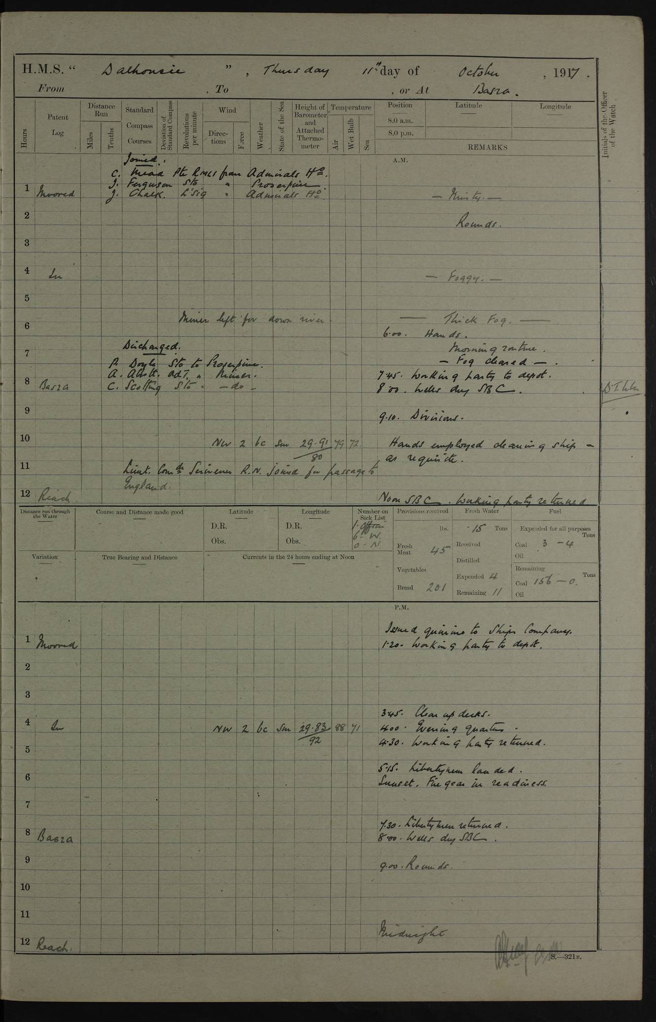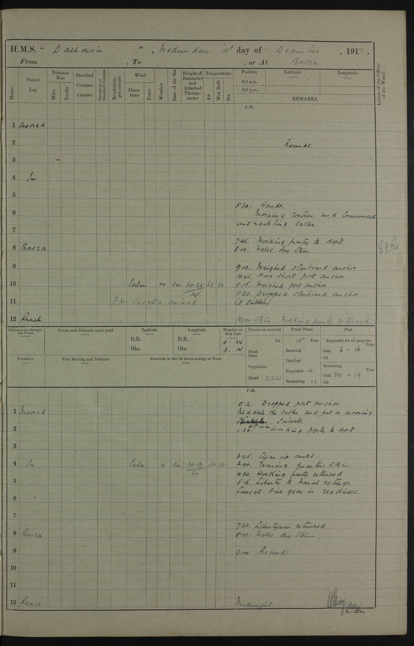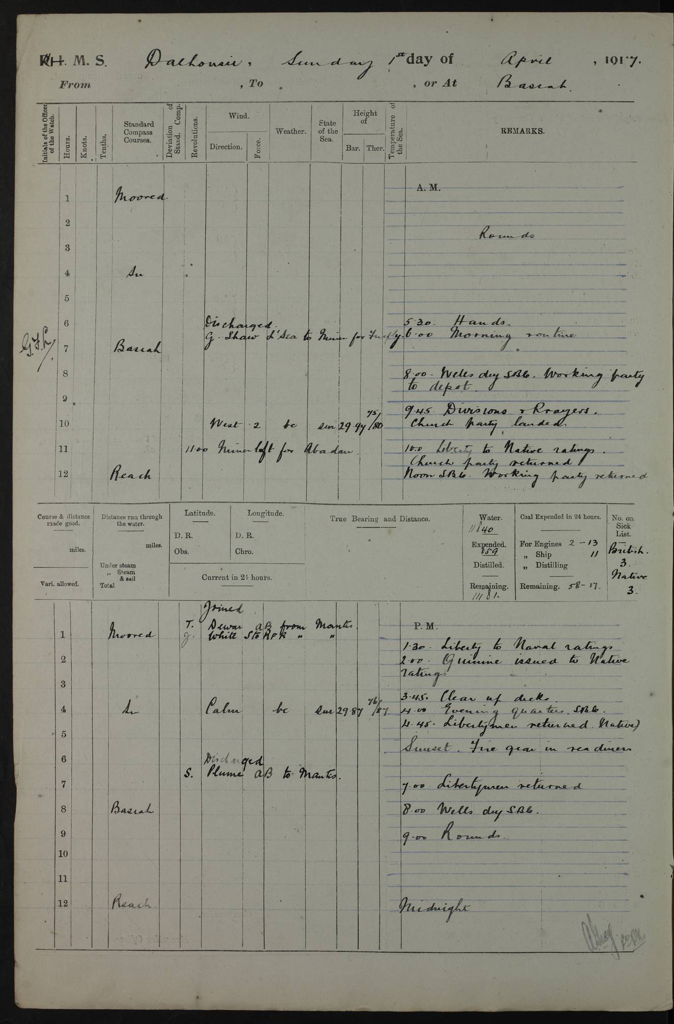 4ef4fafce53e0a0c91005931: (https://s3.amazonaws.com:443/oldweather/ADM53-39406/0015_1.jpg) 27 October 1917 Place: Basrah Lat 30.5269, Long 47.8407 2:00am: Rounds 6:00am: Hands - Morning Routine 7:00am: Exercised Fire stations 7:45am: Working party to Depot 8:00am: Wells dry - Signal Books correct 10:00am: Hands employed cleaning ship 12:00pm: Signal Books correct – Working party returned 1:00pm: Hands piped down 1:30pm: Liberty to Naval Ratings 3:45pm: Cleared up decks 4:00pm: Evening Quarters – Signal Books correct 5:15pm: Liberty to Naval Ratings 6:00pm: Sunset - Fire Gear in readiness 7:30pm: Liberty men returned 8:00pm: Wells dry - Signal Books correct 9:00pm: Rounds – Signal Books correct AM – Discharged To BARALA: W Denyer, Able Seaman - A Childs, Able Seaman - H Beckham Seaman - N Murray Seaman PM - Discharged To SCARAB: A Bushill, Senior Petty Officer - H Garth, Signalman To TARANTULA: G Campbell, Ship’s Steward Assistant 4ef4fafde53e0a0c91005932: (https://s3.amazonaws.com:443/oldweather/ADM53-39406/0016_0.jpg) 28 October 1917 Place: Basrah Lat 30.5269, Long 47.8407 2:00am: Rounds 5:30am: Hands 6:00am: Morning Routine 7:00am: Roman Catholic Church party landed 8:00am: Wells dry – Signal Books correct – Roman Catholics returned - Working party to Depot 8:30am: Church of England party to PROSERPINE 8:45am: Wesleyans landed 9:45am: Church parties returned - Divisions 10:30am: Liberty to Native Ratings 12:00pm: Signal Books correct – Working party returned 1:00pm: Issued Quinine to Naval Ratings- Issued Quinine to Native Ratings 1:30pm: Liberty to Naval ratings 3:45pm: Cleared up decks 4:00pm: Evening Quarters – Signal Books correct 5:15pm: Liberty to Naval Ratings 6:00pm: Sunset - Fire Gear in readiness 7:30pm: Liberty men returned 8:00pm: Wells dry - Signal Books correct 9:00pm: Rounds – Signal Books correct AM – Discharged To GRAYFLY: E.C. Shepherd, Petty Officer - W Hill, Able Seaman - Q Cox, Able Seaman - H Murphy, Able Seaman - A Taylor Telegrapher PM – Joined From SCARAB: J.G. Cooper, Stoker From Admiral’s House: Dounleg bin Eulog, Seedie PM - Discharged To ELEPHANTA: Alex de Souza, Officer's Steward To SCARAB: A Hatchard, Stoker To FIREFLY: W Burke, Stoker To Admiral’s House: Abrahim bin Shambi, Seedie