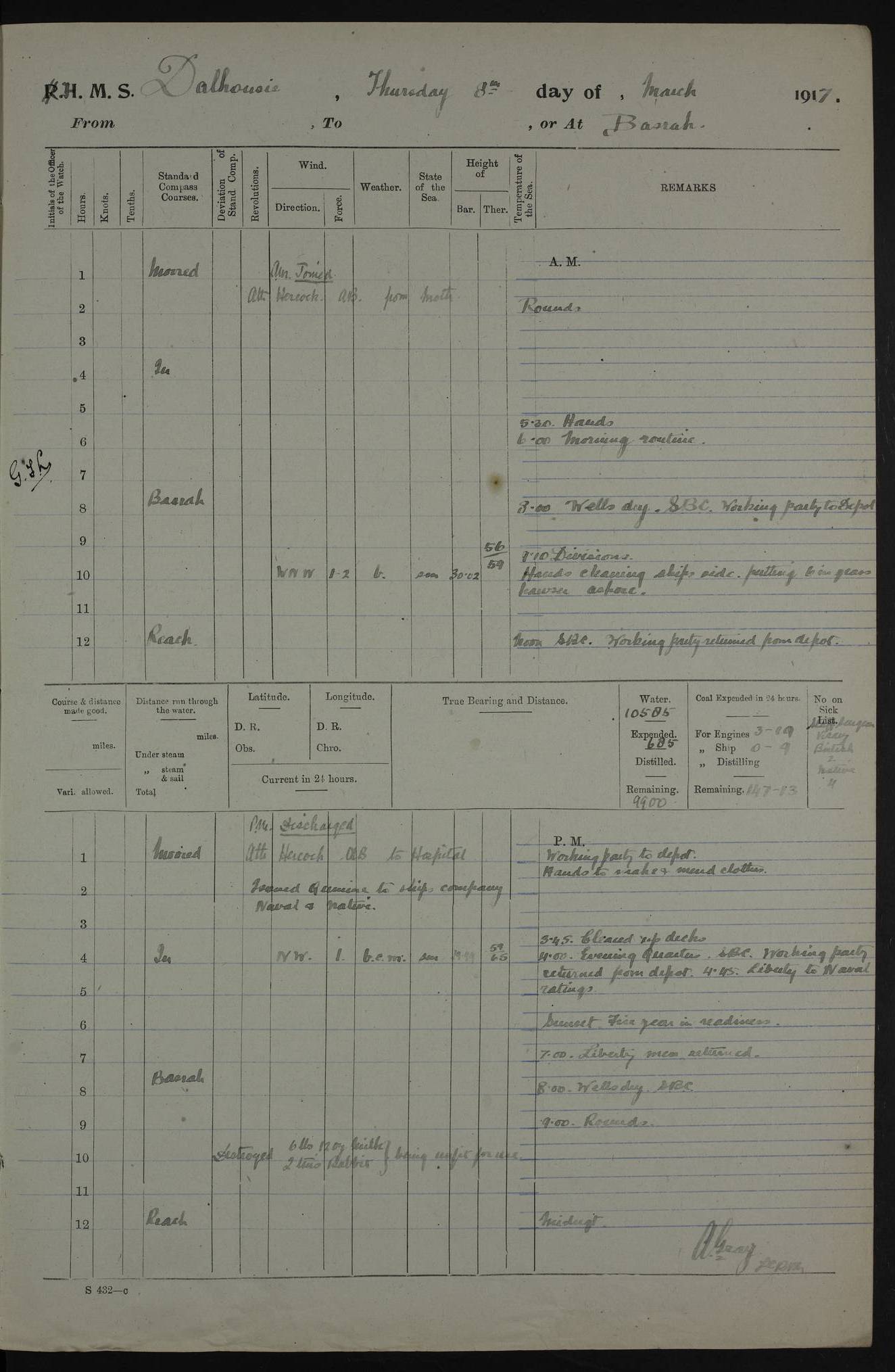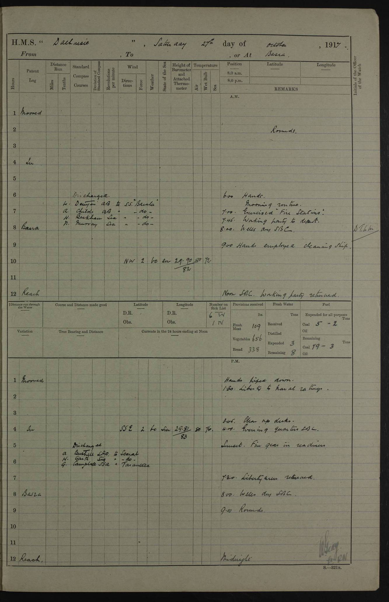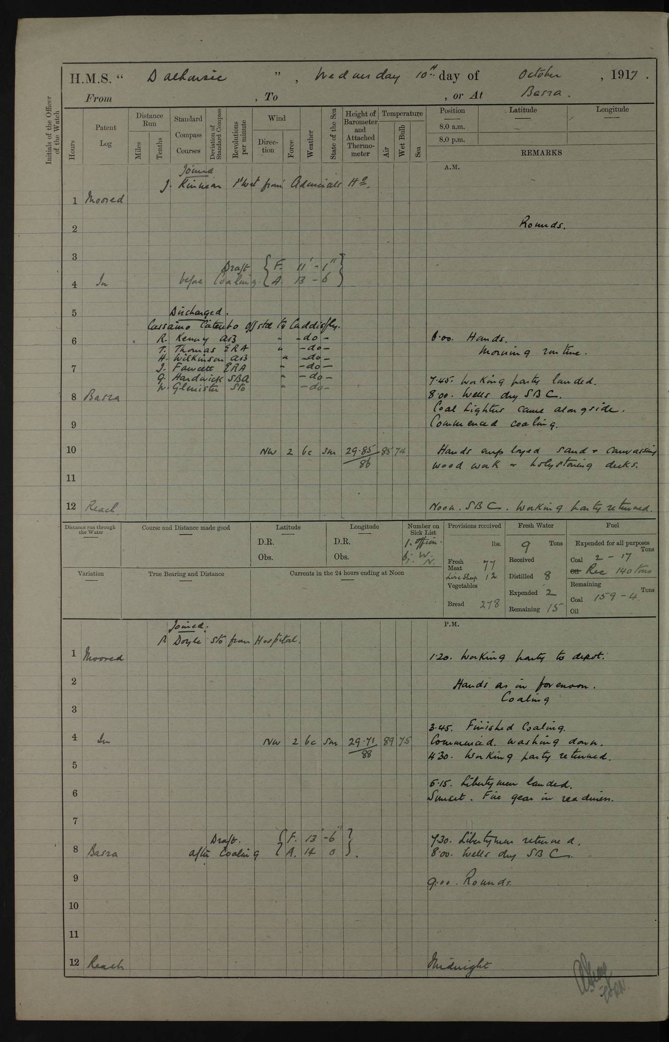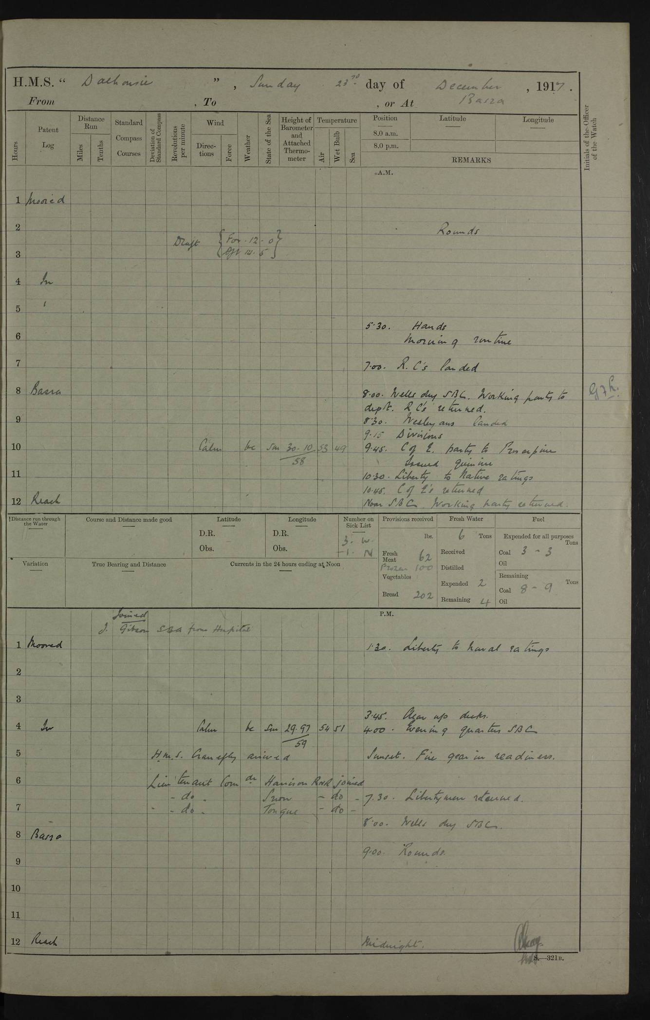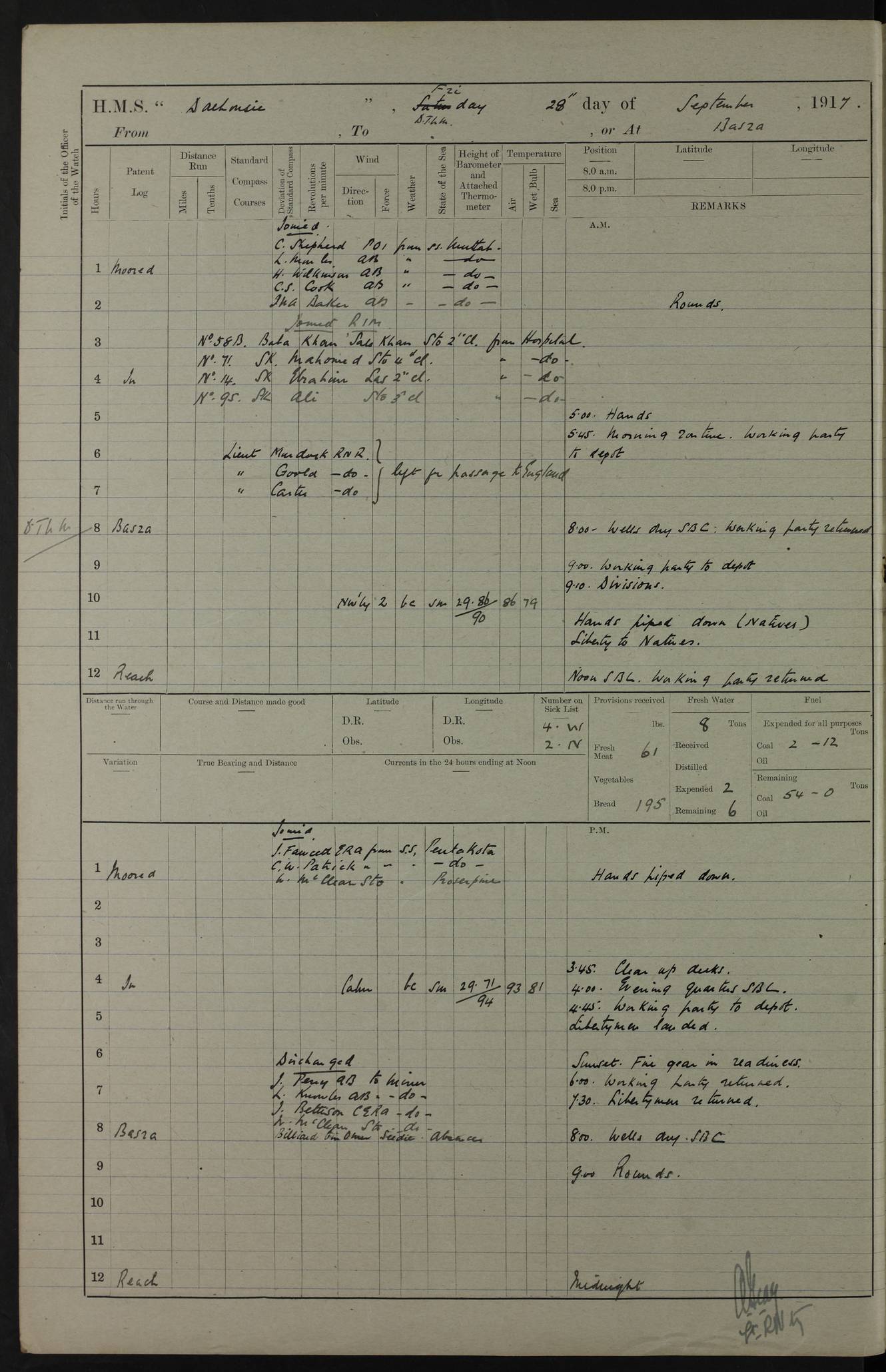 4ef4fafce53e0a0c91005931: (https://s3.amazonaws.com:443/oldweather/ADM53-39406/0015_1.jpg) 27 October 1917 Place: Basrah Lat 30.5269, Long 47.8407 2:00am: Rounds 6:00am: Hands - Morning Routine 7:00am: Exercised Fire stations 7:45am: Working party to Depot 8:00am: Wells dry - Signal Books correct 10:00am: Hands employed cleaning ship 12:00pm: Signal Books correct – Working party returned 1:00pm: Hands piped down 1:30pm: Liberty to Naval Ratings 3:45pm: Cleared up decks 4:00pm: Evening Quarters – Signal Books correct 5:15pm: Liberty to Naval Ratings 6:00pm: Sunset - Fire Gear in readiness 7:30pm: Liberty men returned 8:00pm: Wells dry - Signal Books correct 9:00pm: Rounds – Signal Books correct AM – Discharged To BARALA: W Denyer, Able Seaman - A Childs, Able Seaman - H Beckham Seaman - N Murray Seaman PM - Discharged To SCARAB: A Bushill, Senior Petty Officer - H Garth, Signalman To TARANTULA: G Campbell, Ship’s Steward Assistant 4ef4fafde53e0a0c91005932: (https://s3.amazonaws.com:443/oldweather/ADM53-39406/0016_0.jpg) 28 October 1917 Place: Basrah Lat 30.5269, Long 47.8407 2:00am: Rounds 5:30am: Hands 6:00am: Morning Routine 7:00am: Roman Catholic Church party landed 8:00am: Wells dry – Signal Books correct – Roman Catholics returned - Working party to Depot 8:30am: Church of England party to PROSERPINE 8:45am: Wesleyans landed 9:45am: Church parties returned - Divisions 10:30am: Liberty to Native Ratings 12:00pm: Signal Books correct – Working party returned 1:00pm: Issued Quinine to Naval Ratings- Issued Quinine to Native Ratings 1:30pm: Liberty to Naval ratings 3:45pm: Cleared up decks 4:00pm: Evening Quarters – Signal Books correct 5:15pm: Liberty to Naval Ratings 6:00pm: Sunset - Fire Gear in readiness 7:30pm: Liberty men returned 8:00pm: Wells dry - Signal Books correct 9:00pm: Rounds – Signal Books correct AM – Discharged To GRAYFLY: E.C. Shepherd, Petty Officer - W Hill, Able Seaman - Q Cox, Able Seaman - H Murphy, Able Seaman - A Taylor Telegrapher PM – Joined From SCARAB: J.G. Cooper, Stoker From Admiral’s House: Dounleg bin Eulog, Seedie PM - Discharged To ELEPHANTA: Alex de Souza, Officer's Steward To SCARAB: A Hatchard, Stoker To FIREFLY: W Burke, Stoker To Admiral’s House: Abrahim bin Shambi, Seedie