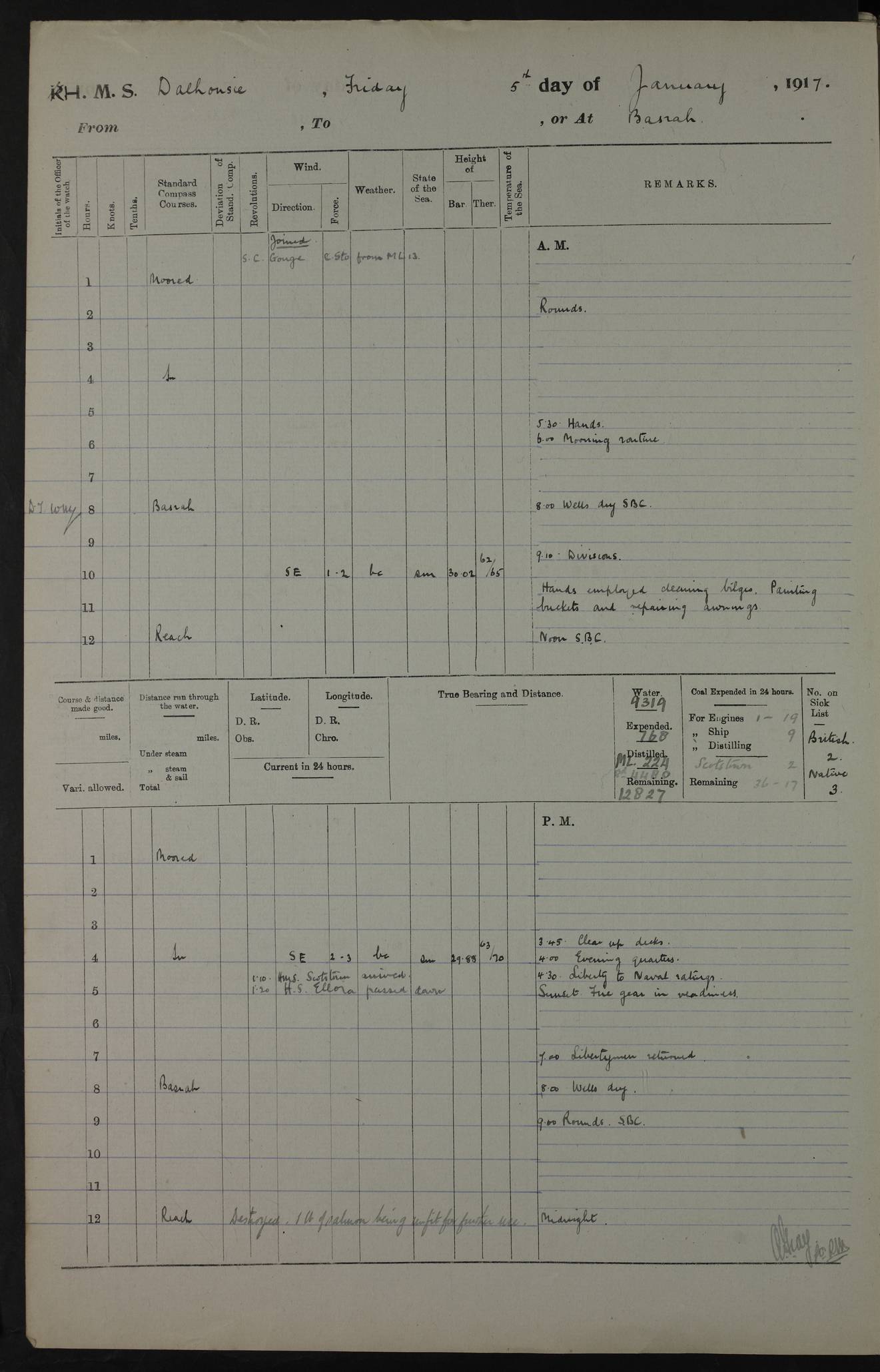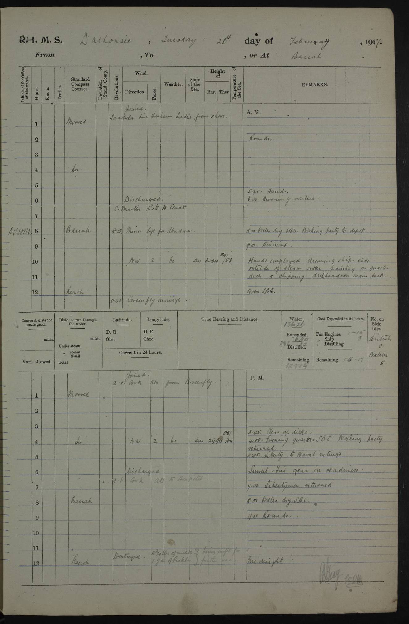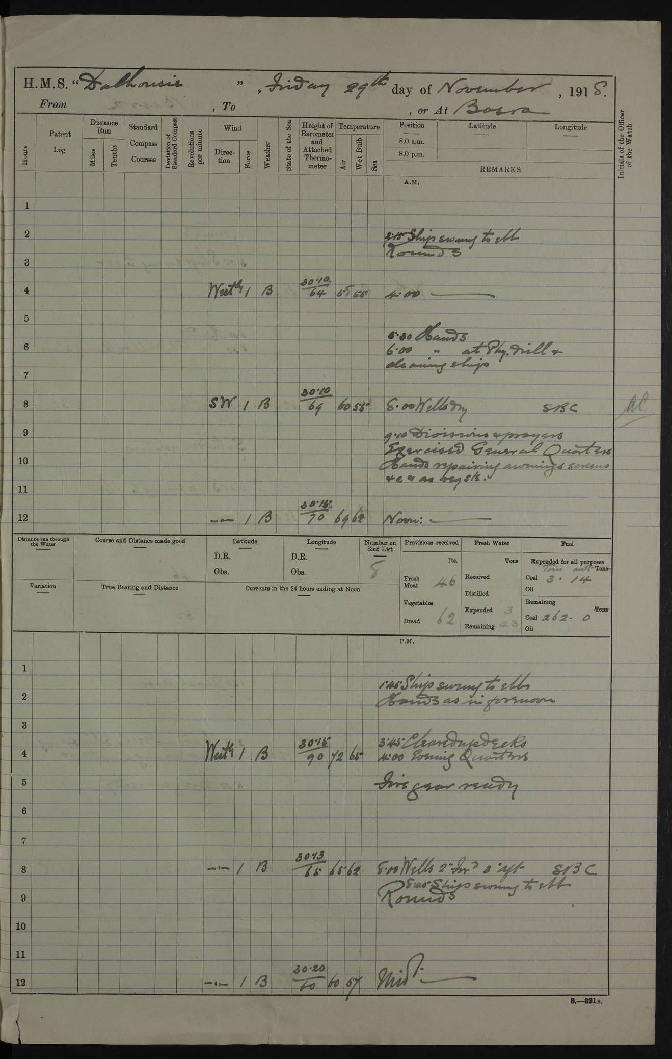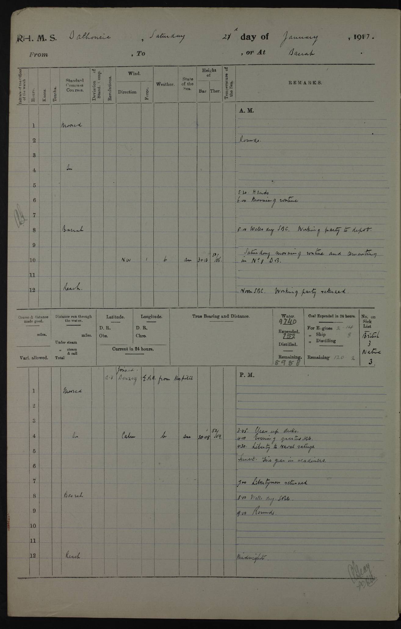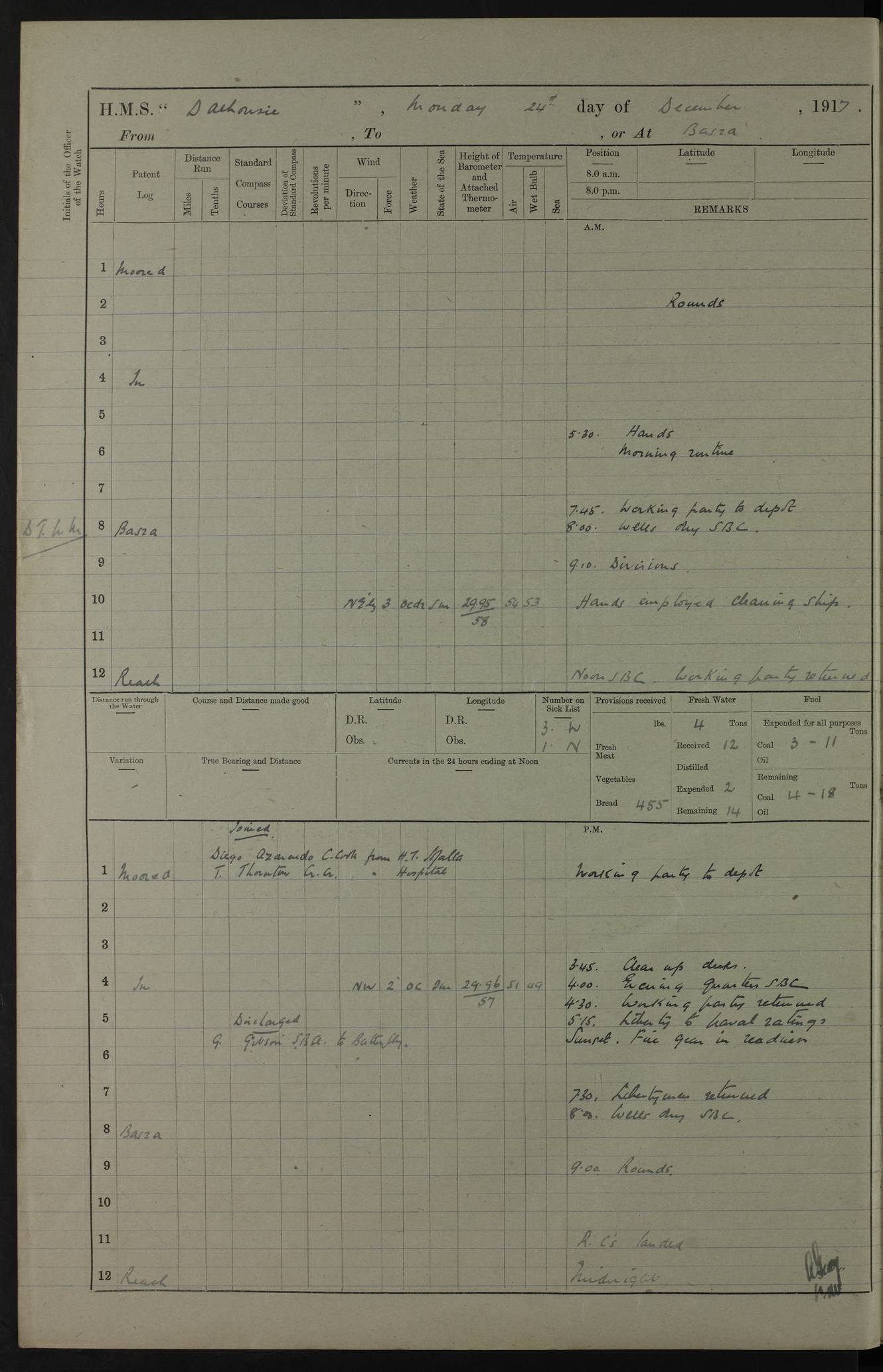 4ef4fafce53e0a0c91005931: (https://s3.amazonaws.com:443/oldweather/ADM53-39406/0015_1.jpg) 27 October 1917 Place: Basrah Lat 30.5269, Long 47.8407 2:00am: Rounds 6:00am: Hands - Morning Routine 7:00am: Exercised Fire stations 7:45am: Working party to Depot 8:00am: Wells dry - Signal Books correct 10:00am: Hands employed cleaning ship 12:00pm: Signal Books correct – Working party returned 1:00pm: Hands piped down 1:30pm: Liberty to Naval Ratings 3:45pm: Cleared up decks 4:00pm: Evening Quarters – Signal Books correct 5:15pm: Liberty to Naval Ratings 6:00pm: Sunset - Fire Gear in readiness 7:30pm: Liberty men returned 8:00pm: Wells dry - Signal Books correct 9:00pm: Rounds – Signal Books correct AM – Discharged To BARALA: W Denyer, Able Seaman - A Childs, Able Seaman - H Beckham Seaman - N Murray Seaman PM - Discharged To SCARAB: A Bushill, Senior Petty Officer - H Garth, Signalman To TARANTULA: G Campbell, Ship’s Steward Assistant 4ef4fafde53e0a0c91005932: (https://s3.amazonaws.com:443/oldweather/ADM53-39406/0016_0.jpg) 28 October 1917 Place: Basrah Lat 30.5269, Long 47.8407 2:00am: Rounds 5:30am: Hands 6:00am: Morning Routine 7:00am: Roman Catholic Church party landed 8:00am: Wells dry – Signal Books correct – Roman Catholics returned - Working party to Depot 8:30am: Church of England party to PROSERPINE 8:45am: Wesleyans landed 9:45am: Church parties returned - Divisions 10:30am: Liberty to Native Ratings 12:00pm: Signal Books correct – Working party returned 1:00pm: Issued Quinine to Naval Ratings- Issued Quinine to Native Ratings 1:30pm: Liberty to Naval ratings 3:45pm: Cleared up decks 4:00pm: Evening Quarters – Signal Books correct 5:15pm: Liberty to Naval Ratings 6:00pm: Sunset - Fire Gear in readiness 7:30pm: Liberty men returned 8:00pm: Wells dry - Signal Books correct 9:00pm: Rounds – Signal Books correct AM – Discharged To GRAYFLY: E.C. Shepherd, Petty Officer - W Hill, Able Seaman - Q Cox, Able Seaman - H Murphy, Able Seaman - A Taylor Telegrapher PM – Joined From SCARAB: J.G. Cooper, Stoker From Admiral’s House: Dounleg bin Eulog, Seedie PM - Discharged To ELEPHANTA: Alex de Souza, Officer's Steward To SCARAB: A Hatchard, Stoker To FIREFLY: W Burke, Stoker To Admiral’s House: Abrahim bin Shambi, Seedie