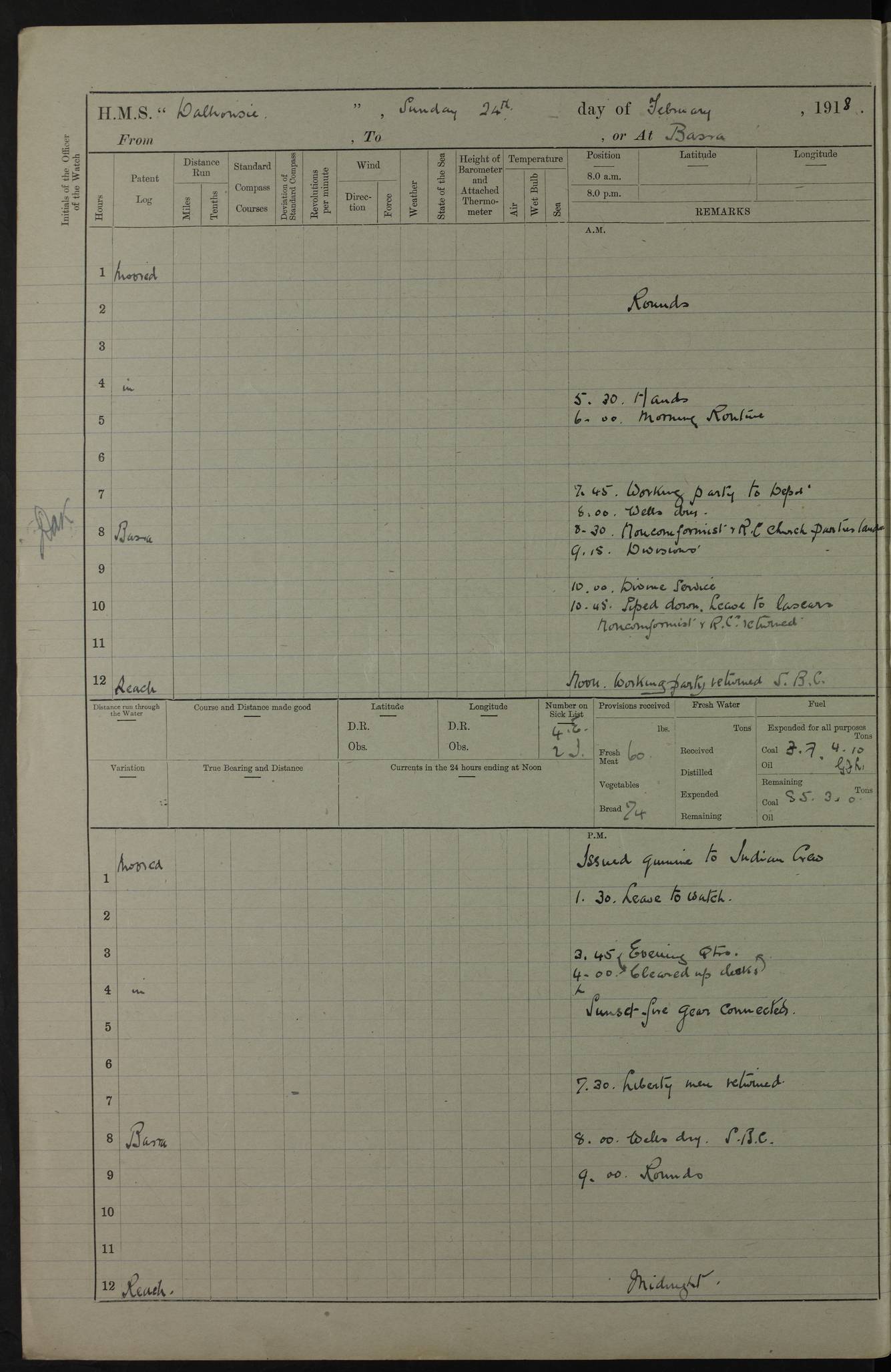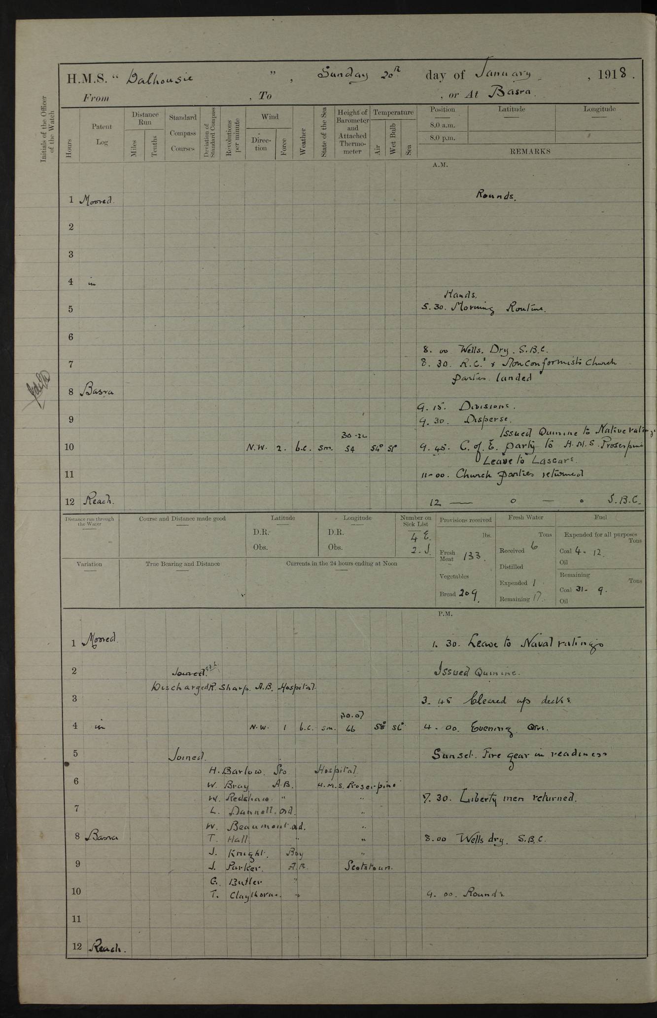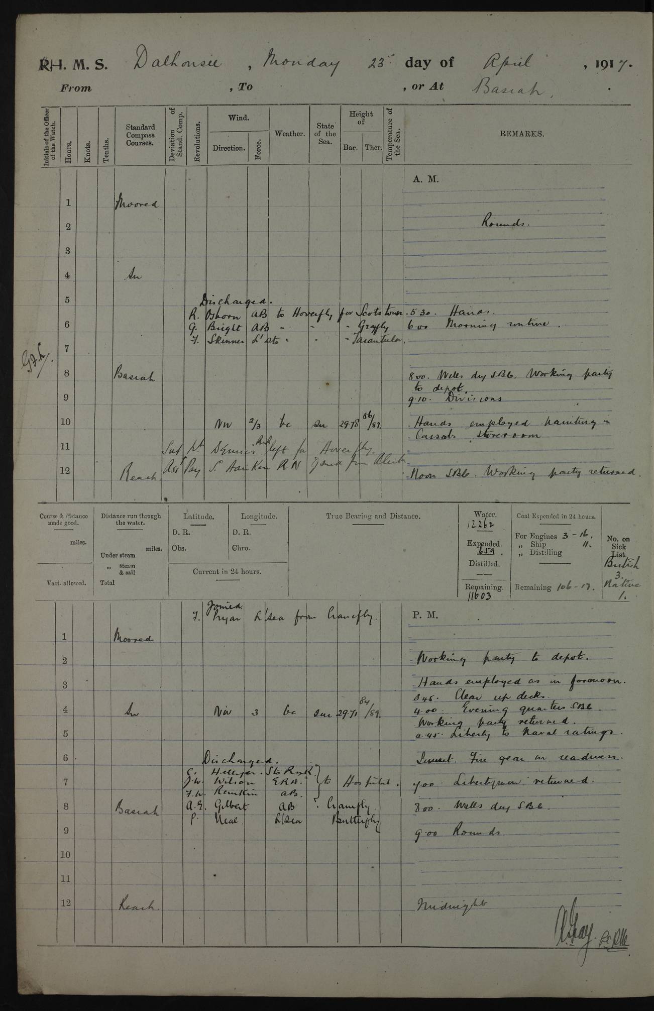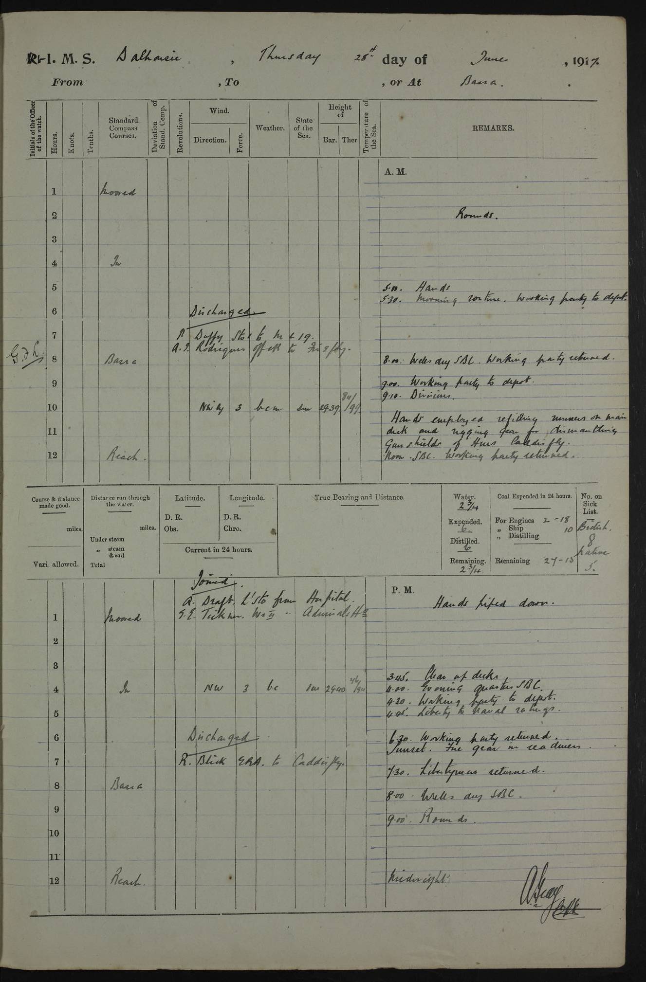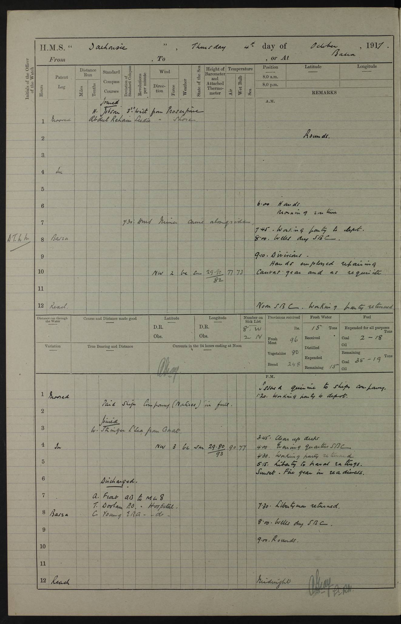 4ef4fafce53e0a0c91005931: (https://s3.amazonaws.com:443/oldweather/ADM53-39406/0015_1.jpg) 27 October 1917 Place: Basrah Lat 30.5269, Long 47.8407 2:00am: Rounds 6:00am: Hands - Morning Routine 7:00am: Exercised Fire stations 7:45am: Working party to Depot 8:00am: Wells dry - Signal Books correct 10:00am: Hands employed cleaning ship 12:00pm: Signal Books correct – Working party returned 1:00pm: Hands piped down 1:30pm: Liberty to Naval Ratings 3:45pm: Cleared up decks 4:00pm: Evening Quarters – Signal Books correct 5:15pm: Liberty to Naval Ratings 6:00pm: Sunset - Fire Gear in readiness 7:30pm: Liberty men returned 8:00pm: Wells dry - Signal Books correct 9:00pm: Rounds – Signal Books correct AM – Discharged To BARALA: W Denyer, Able Seaman - A Childs, Able Seaman - H Beckham Seaman - N Murray Seaman PM - Discharged To SCARAB: A Bushill, Senior Petty Officer - H Garth, Signalman To TARANTULA: G Campbell, Ship’s Steward Assistant 4ef4fafde53e0a0c91005932: (https://s3.amazonaws.com:443/oldweather/ADM53-39406/0016_0.jpg) 28 October 1917 Place: Basrah Lat 30.5269, Long 47.8407 2:00am: Rounds 5:30am: Hands 6:00am: Morning Routine 7:00am: Roman Catholic Church party landed 8:00am: Wells dry – Signal Books correct – Roman Catholics returned - Working party to Depot 8:30am: Church of England party to PROSERPINE 8:45am: Wesleyans landed 9:45am: Church parties returned - Divisions 10:30am: Liberty to Native Ratings 12:00pm: Signal Books correct – Working party returned 1:00pm: Issued Quinine to Naval Ratings- Issued Quinine to Native Ratings 1:30pm: Liberty to Naval ratings 3:45pm: Cleared up decks 4:00pm: Evening Quarters – Signal Books correct 5:15pm: Liberty to Naval Ratings 6:00pm: Sunset - Fire Gear in readiness 7:30pm: Liberty men returned 8:00pm: Wells dry - Signal Books correct 9:00pm: Rounds – Signal Books correct AM – Discharged To GRAYFLY: E.C. Shepherd, Petty Officer - W Hill, Able Seaman - Q Cox, Able Seaman - H Murphy, Able Seaman - A Taylor Telegrapher PM – Joined From SCARAB: J.G. Cooper, Stoker From Admiral’s House: Dounleg bin Eulog, Seedie PM - Discharged To ELEPHANTA: Alex de Souza, Officer's Steward To SCARAB: A Hatchard, Stoker To FIREFLY: W Burke, Stoker To Admiral’s House: Abrahim bin Shambi, Seedie