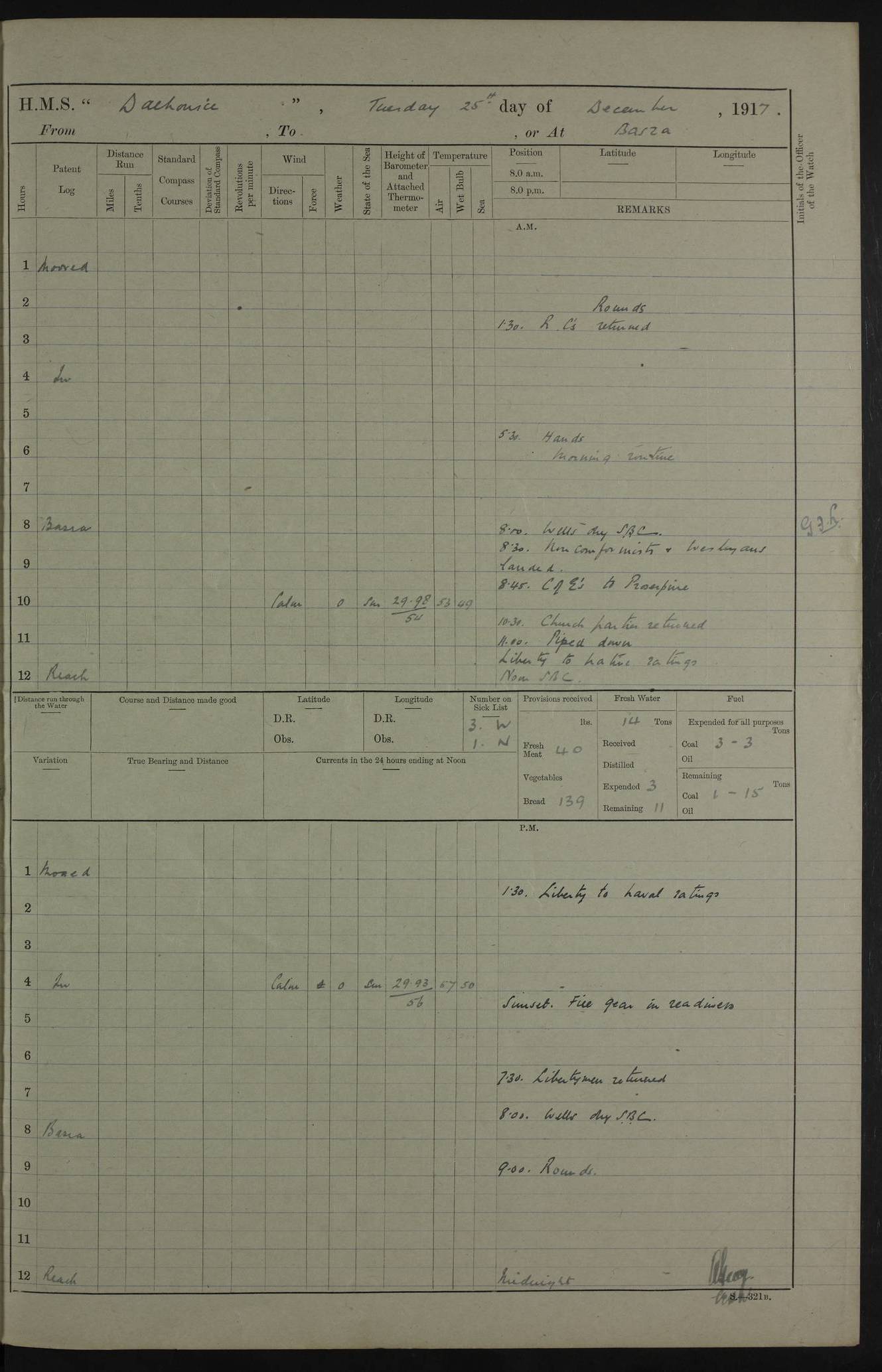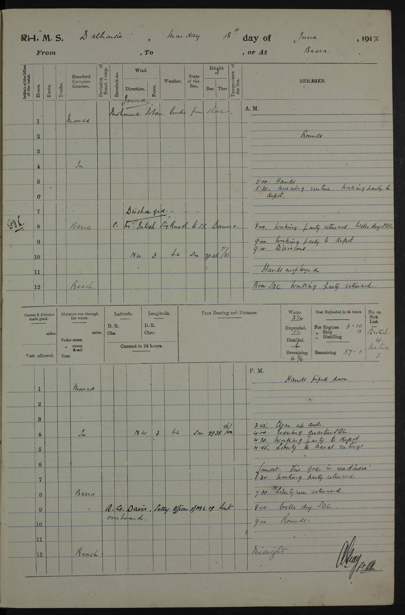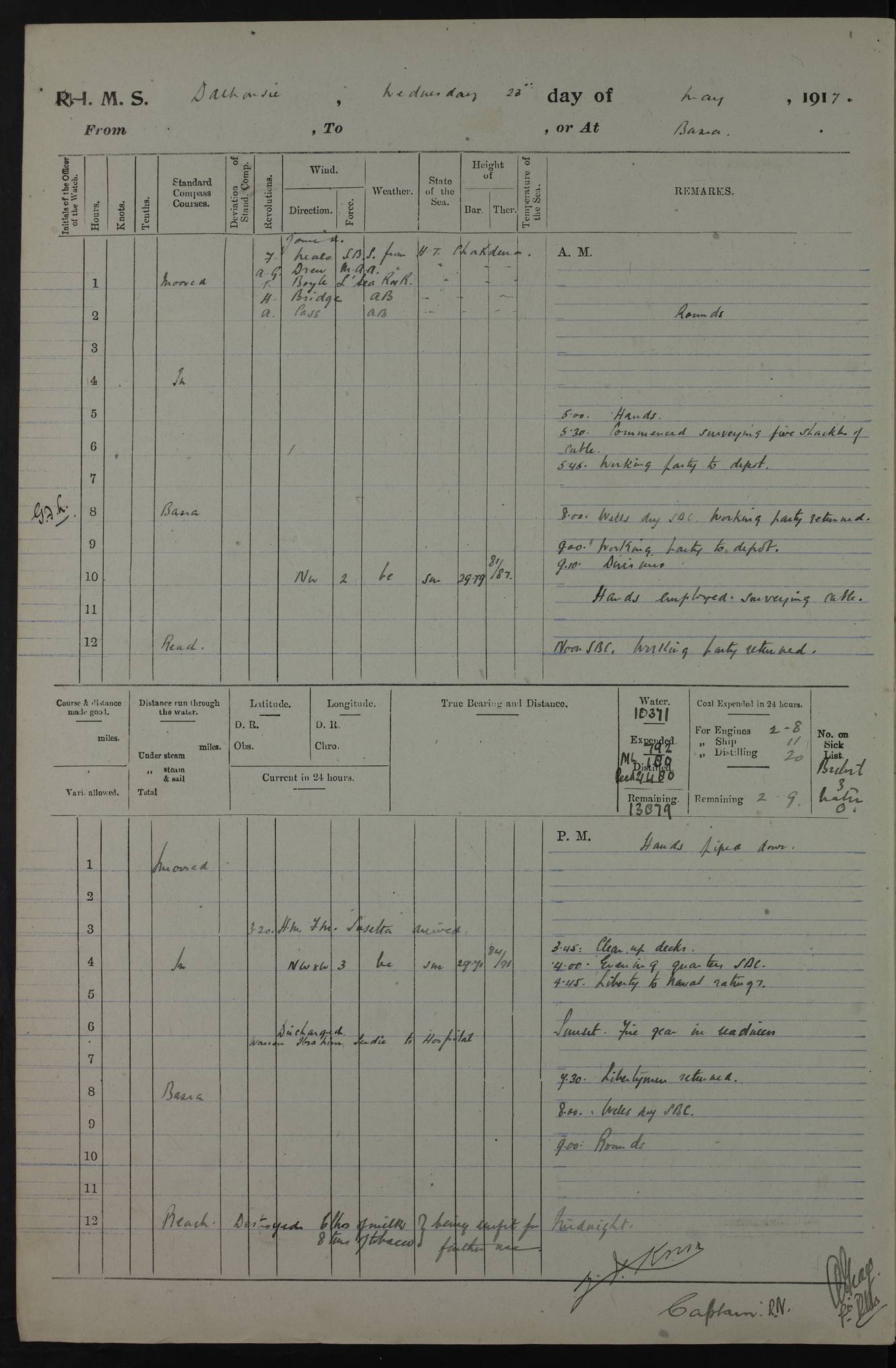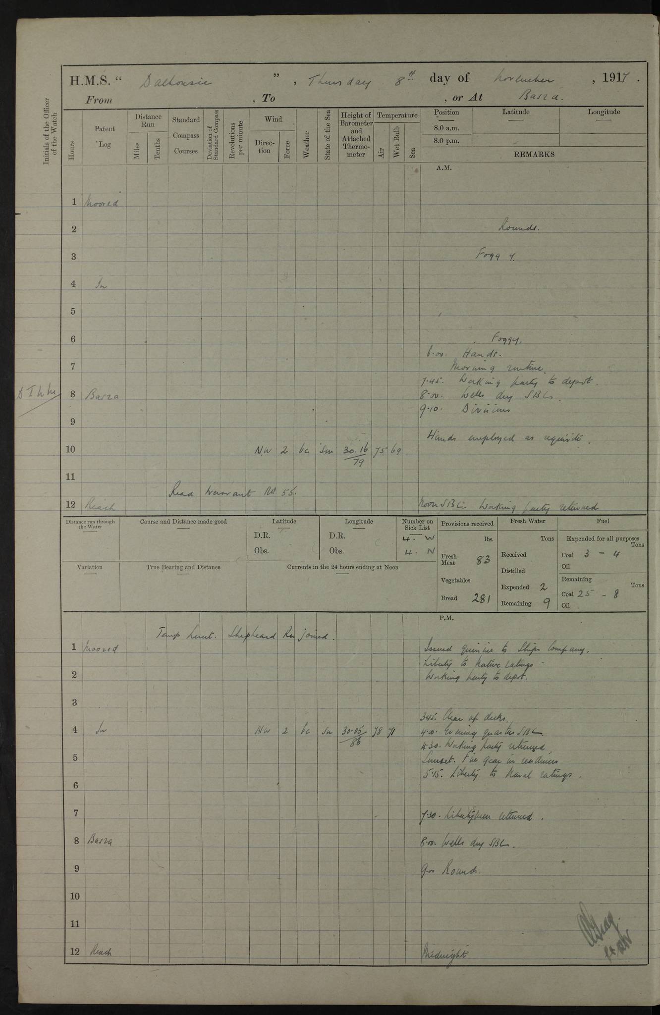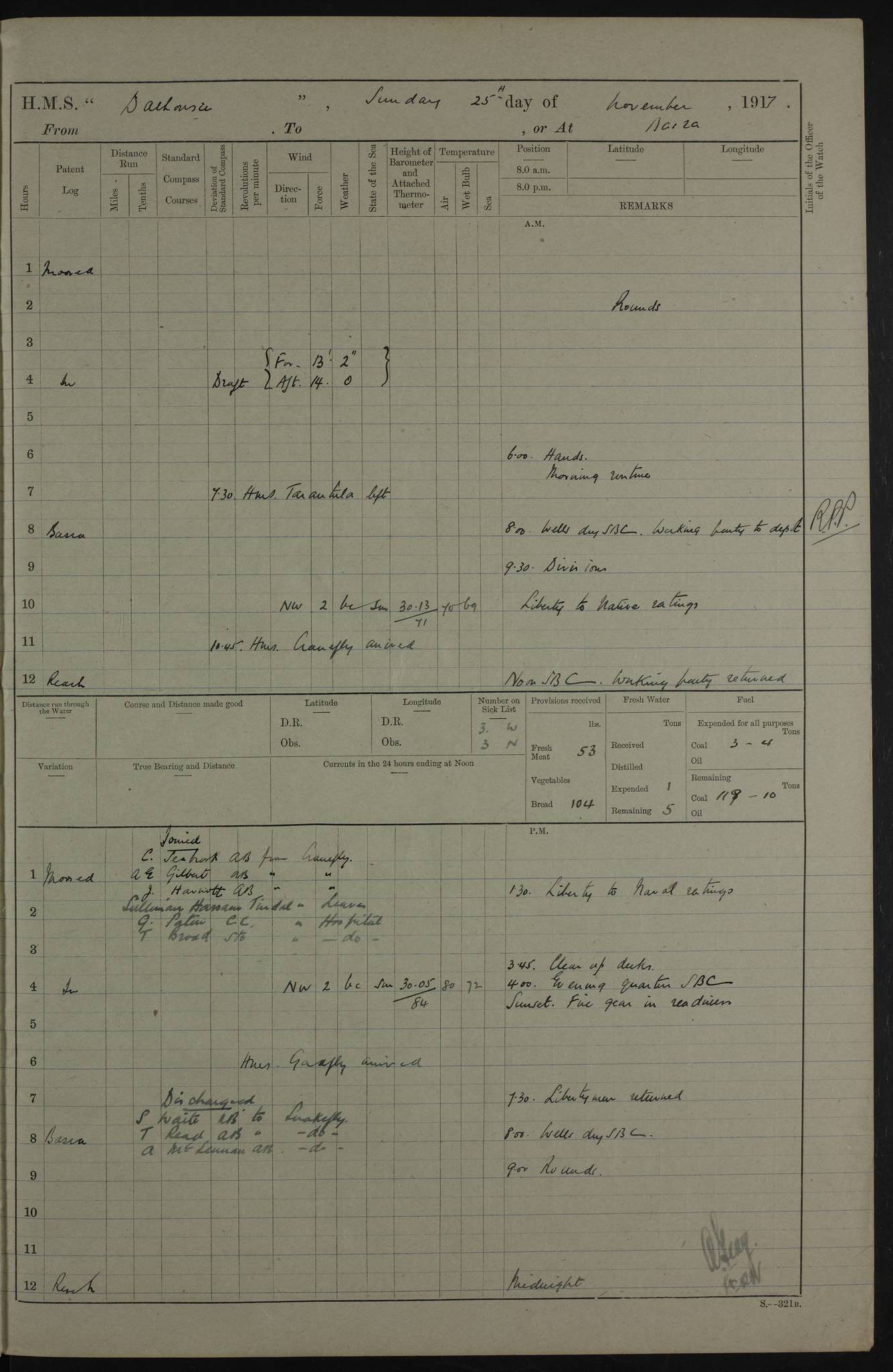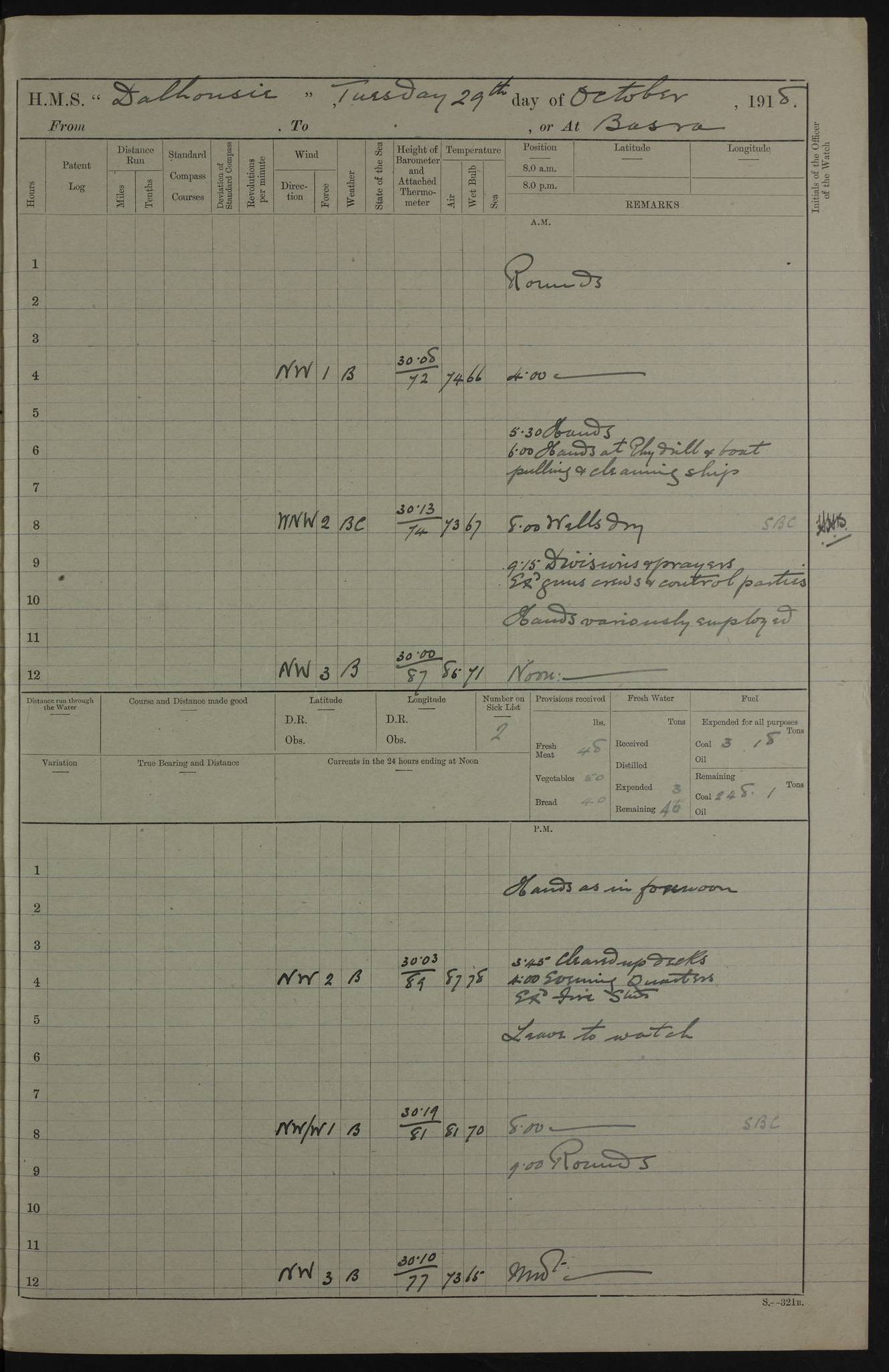 4ef4fafce53e0a0c91005931: (https://s3.amazonaws.com:443/oldweather/ADM53-39406/0015_1.jpg) 27 October 1917 Place: Basrah Lat 30.5269, Long 47.8407 2:00am: Rounds 6:00am: Hands - Morning Routine 7:00am: Exercised Fire stations 7:45am: Working party to Depot 8:00am: Wells dry - Signal Books correct 10:00am: Hands employed cleaning ship 12:00pm: Signal Books correct – Working party returned 1:00pm: Hands piped down 1:30pm: Liberty to Naval Ratings 3:45pm: Cleared up decks 4:00pm: Evening Quarters – Signal Books correct 5:15pm: Liberty to Naval Ratings 6:00pm: Sunset - Fire Gear in readiness 7:30pm: Liberty men returned 8:00pm: Wells dry - Signal Books correct 9:00pm: Rounds – Signal Books correct AM – Discharged To BARALA: W Denyer, Able Seaman - A Childs, Able Seaman - H Beckham Seaman - N Murray Seaman PM - Discharged To SCARAB: A Bushill, Senior Petty Officer - H Garth, Signalman To TARANTULA: G Campbell, Ship’s Steward Assistant 4ef4fafde53e0a0c91005932: (https://s3.amazonaws.com:443/oldweather/ADM53-39406/0016_0.jpg) 28 October 1917 Place: Basrah Lat 30.5269, Long 47.8407 2:00am: Rounds 5:30am: Hands 6:00am: Morning Routine 7:00am: Roman Catholic Church party landed 8:00am: Wells dry – Signal Books correct – Roman Catholics returned - Working party to Depot 8:30am: Church of England party to PROSERPINE 8:45am: Wesleyans landed 9:45am: Church parties returned - Divisions 10:30am: Liberty to Native Ratings 12:00pm: Signal Books correct – Working party returned 1:00pm: Issued Quinine to Naval Ratings- Issued Quinine to Native Ratings 1:30pm: Liberty to Naval ratings 3:45pm: Cleared up decks 4:00pm: Evening Quarters – Signal Books correct 5:15pm: Liberty to Naval Ratings 6:00pm: Sunset - Fire Gear in readiness 7:30pm: Liberty men returned 8:00pm: Wells dry - Signal Books correct 9:00pm: Rounds – Signal Books correct AM – Discharged To GRAYFLY: E.C. Shepherd, Petty Officer - W Hill, Able Seaman - Q Cox, Able Seaman - H Murphy, Able Seaman - A Taylor Telegrapher PM – Joined From SCARAB: J.G. Cooper, Stoker From Admiral’s House: Dounleg bin Eulog, Seedie PM - Discharged To ELEPHANTA: Alex de Souza, Officer's Steward To SCARAB: A Hatchard, Stoker To FIREFLY: W Burke, Stoker To Admiral’s House: Abrahim bin Shambi, Seedie