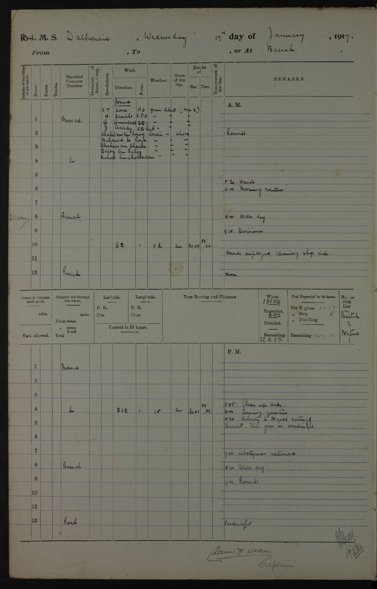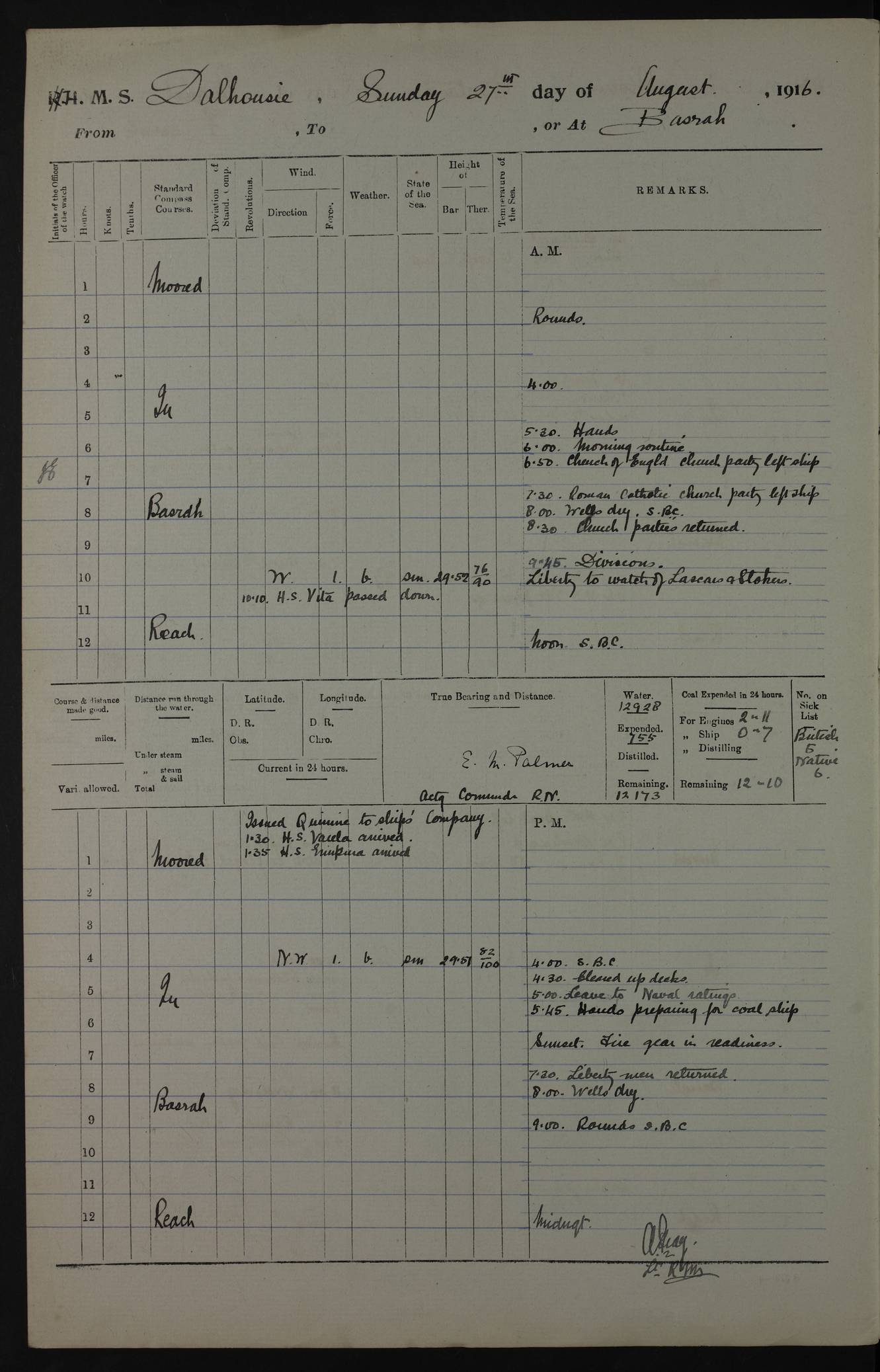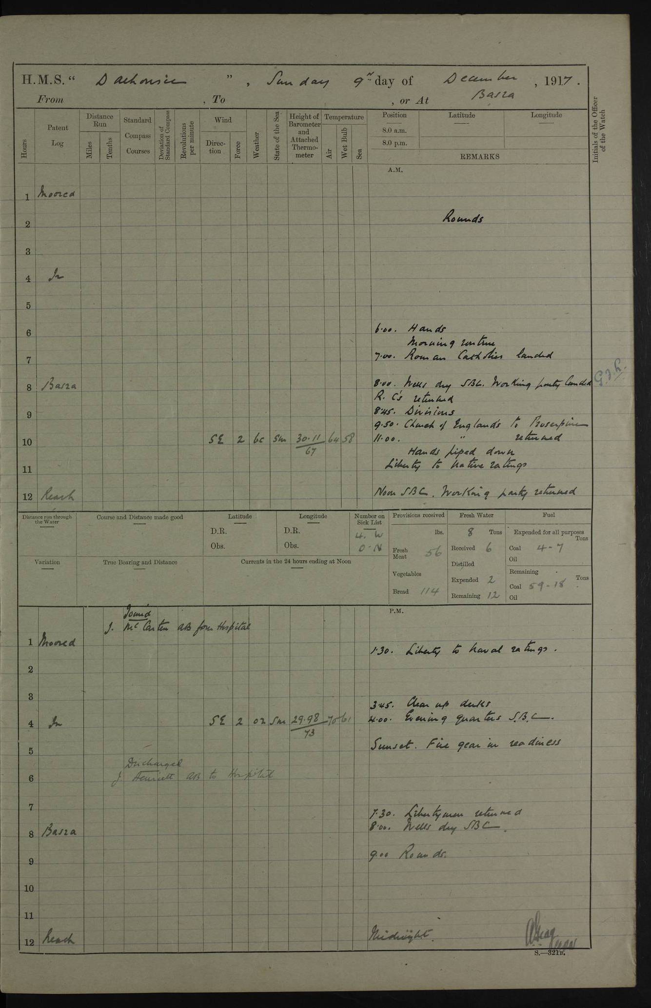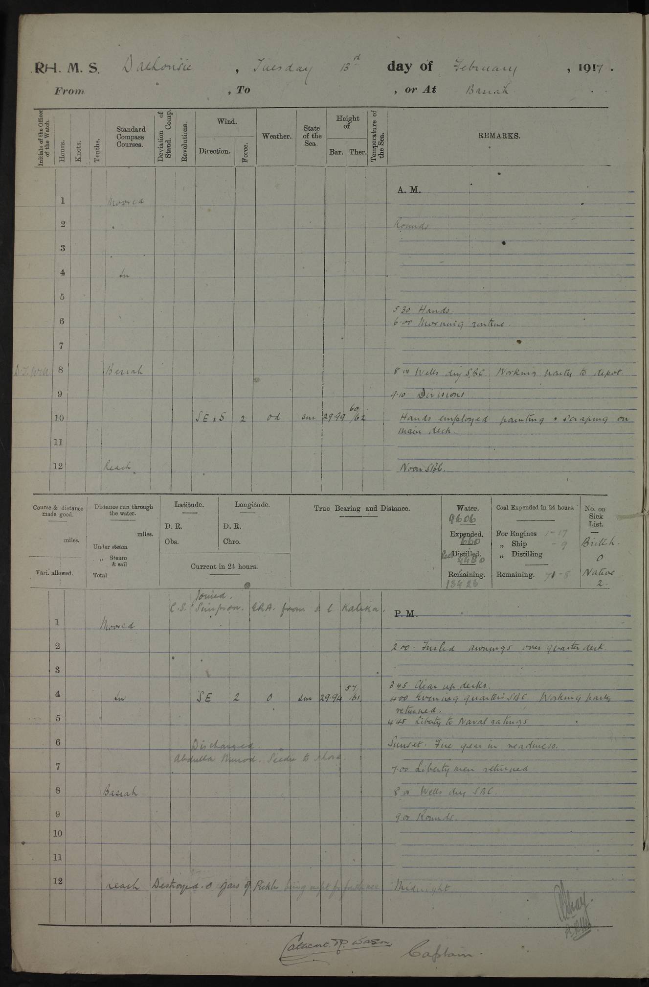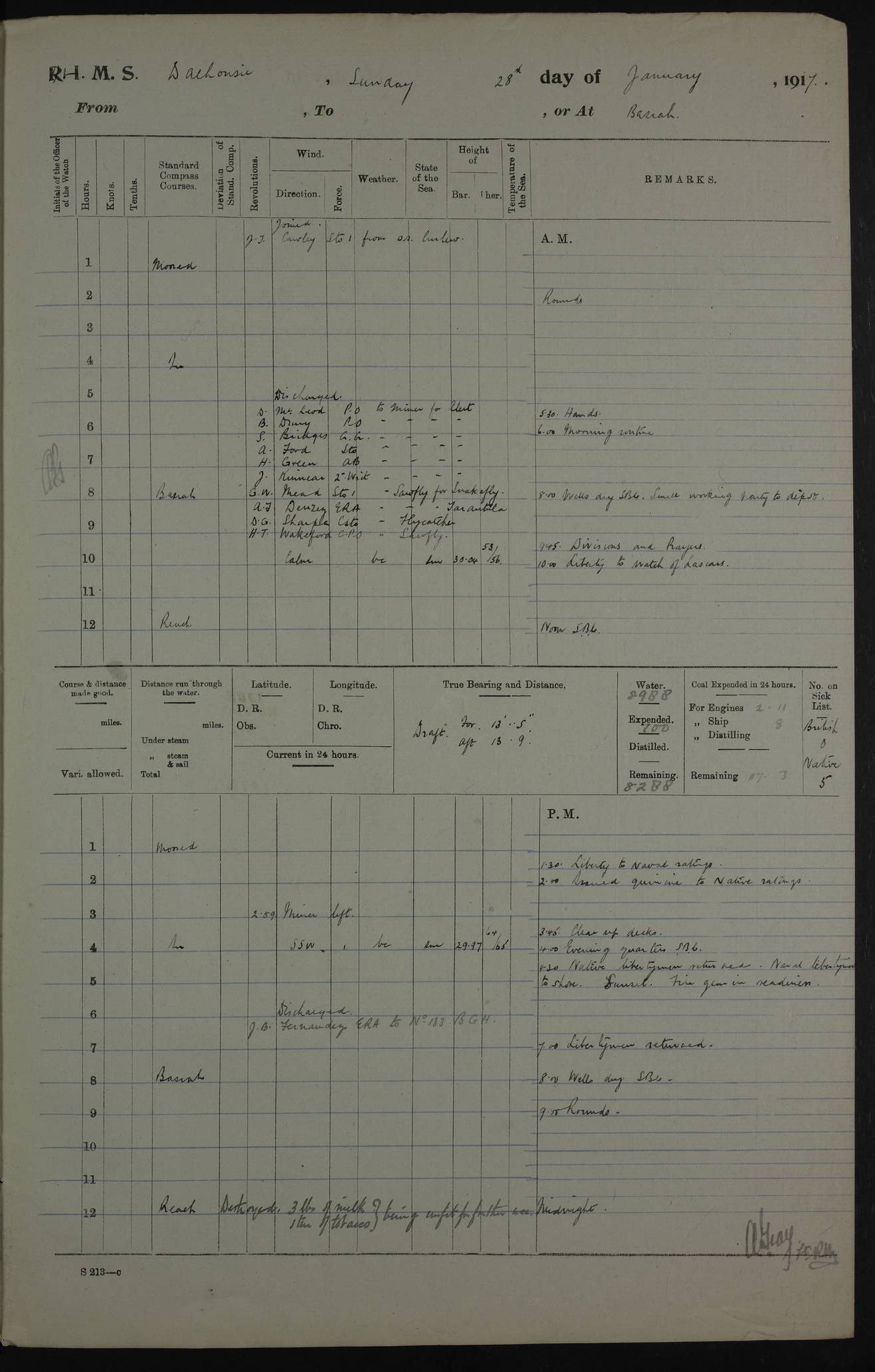 4ef4fafce53e0a0c91005931: (https://s3.amazonaws.com:443/oldweather/ADM53-39406/0015_1.jpg) 27 October 1917 Place: Basrah Lat 30.5269, Long 47.8407 2:00am: Rounds 6:00am: Hands - Morning Routine 7:00am: Exercised Fire stations 7:45am: Working party to Depot 8:00am: Wells dry - Signal Books correct 10:00am: Hands employed cleaning ship 12:00pm: Signal Books correct – Working party returned 1:00pm: Hands piped down 1:30pm: Liberty to Naval Ratings 3:45pm: Cleared up decks 4:00pm: Evening Quarters – Signal Books correct 5:15pm: Liberty to Naval Ratings 6:00pm: Sunset - Fire Gear in readiness 7:30pm: Liberty men returned 8:00pm: Wells dry - Signal Books correct 9:00pm: Rounds – Signal Books correct AM – Discharged To BARALA: W Denyer, Able Seaman - A Childs, Able Seaman - H Beckham Seaman - N Murray Seaman PM - Discharged To SCARAB: A Bushill, Senior Petty Officer - H Garth, Signalman To TARANTULA: G Campbell, Ship’s Steward Assistant 4ef4fafde53e0a0c91005932: (https://s3.amazonaws.com:443/oldweather/ADM53-39406/0016_0.jpg) 28 October 1917 Place: Basrah Lat 30.5269, Long 47.8407 2:00am: Rounds 5:30am: Hands 6:00am: Morning Routine 7:00am: Roman Catholic Church party landed 8:00am: Wells dry – Signal Books correct – Roman Catholics returned - Working party to Depot 8:30am: Church of England party to PROSERPINE 8:45am: Wesleyans landed 9:45am: Church parties returned - Divisions 10:30am: Liberty to Native Ratings 12:00pm: Signal Books correct – Working party returned 1:00pm: Issued Quinine to Naval Ratings- Issued Quinine to Native Ratings 1:30pm: Liberty to Naval ratings 3:45pm: Cleared up decks 4:00pm: Evening Quarters – Signal Books correct 5:15pm: Liberty to Naval Ratings 6:00pm: Sunset - Fire Gear in readiness 7:30pm: Liberty men returned 8:00pm: Wells dry - Signal Books correct 9:00pm: Rounds – Signal Books correct AM – Discharged To GRAYFLY: E.C. Shepherd, Petty Officer - W Hill, Able Seaman - Q Cox, Able Seaman - H Murphy, Able Seaman - A Taylor Telegrapher PM – Joined From SCARAB: J.G. Cooper, Stoker From Admiral’s House: Dounleg bin Eulog, Seedie PM - Discharged To ELEPHANTA: Alex de Souza, Officer's Steward To SCARAB: A Hatchard, Stoker To FIREFLY: W Burke, Stoker To Admiral’s House: Abrahim bin Shambi, Seedie