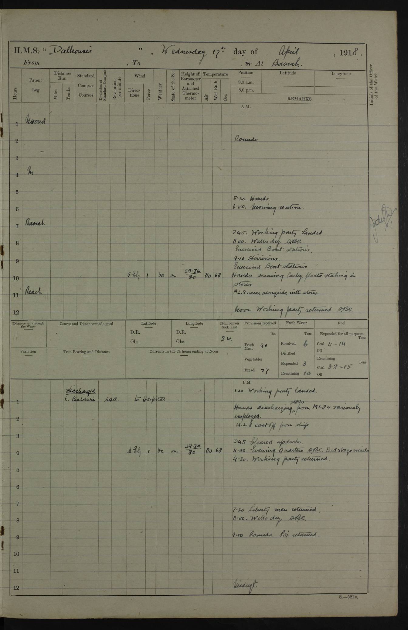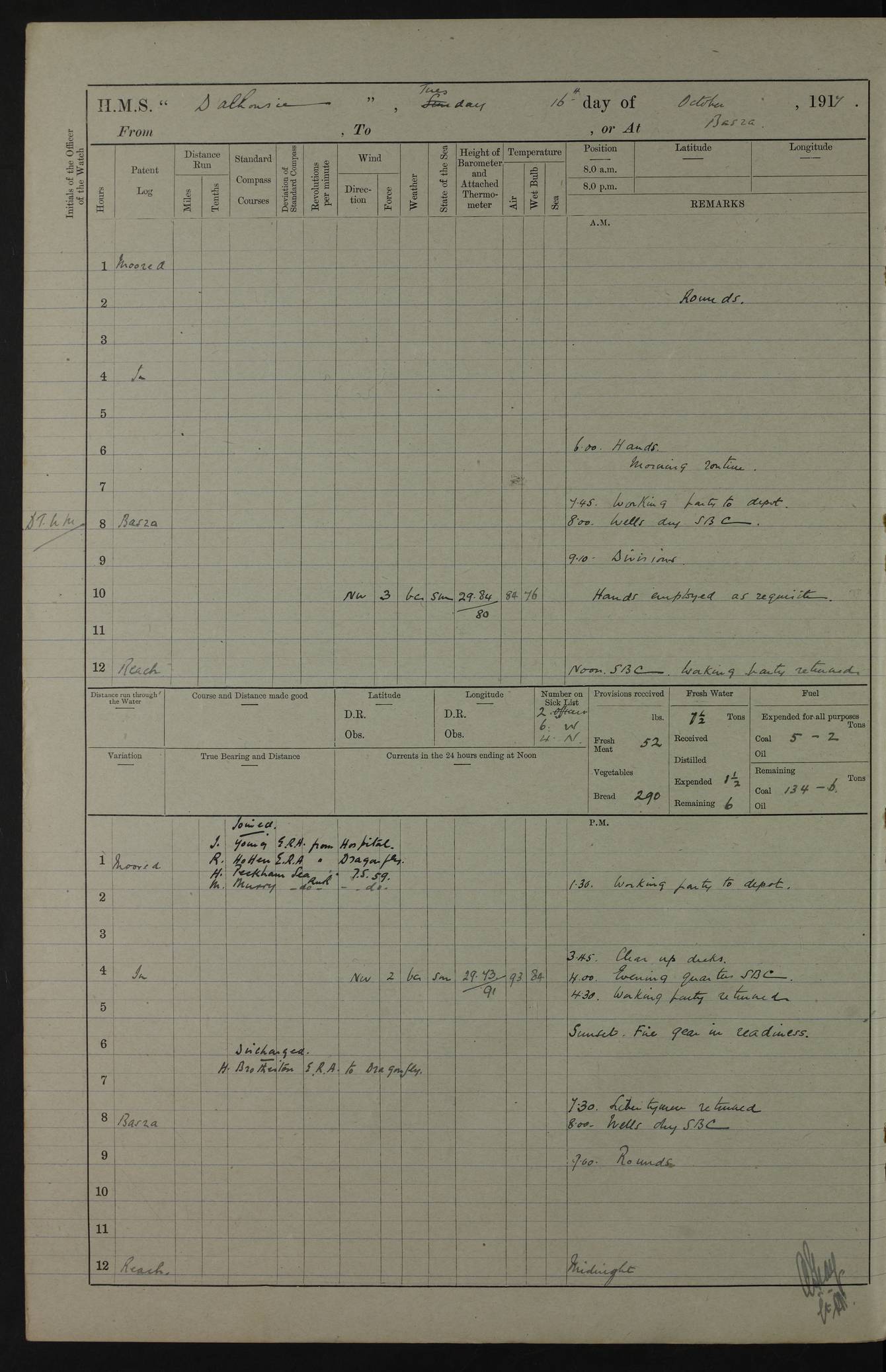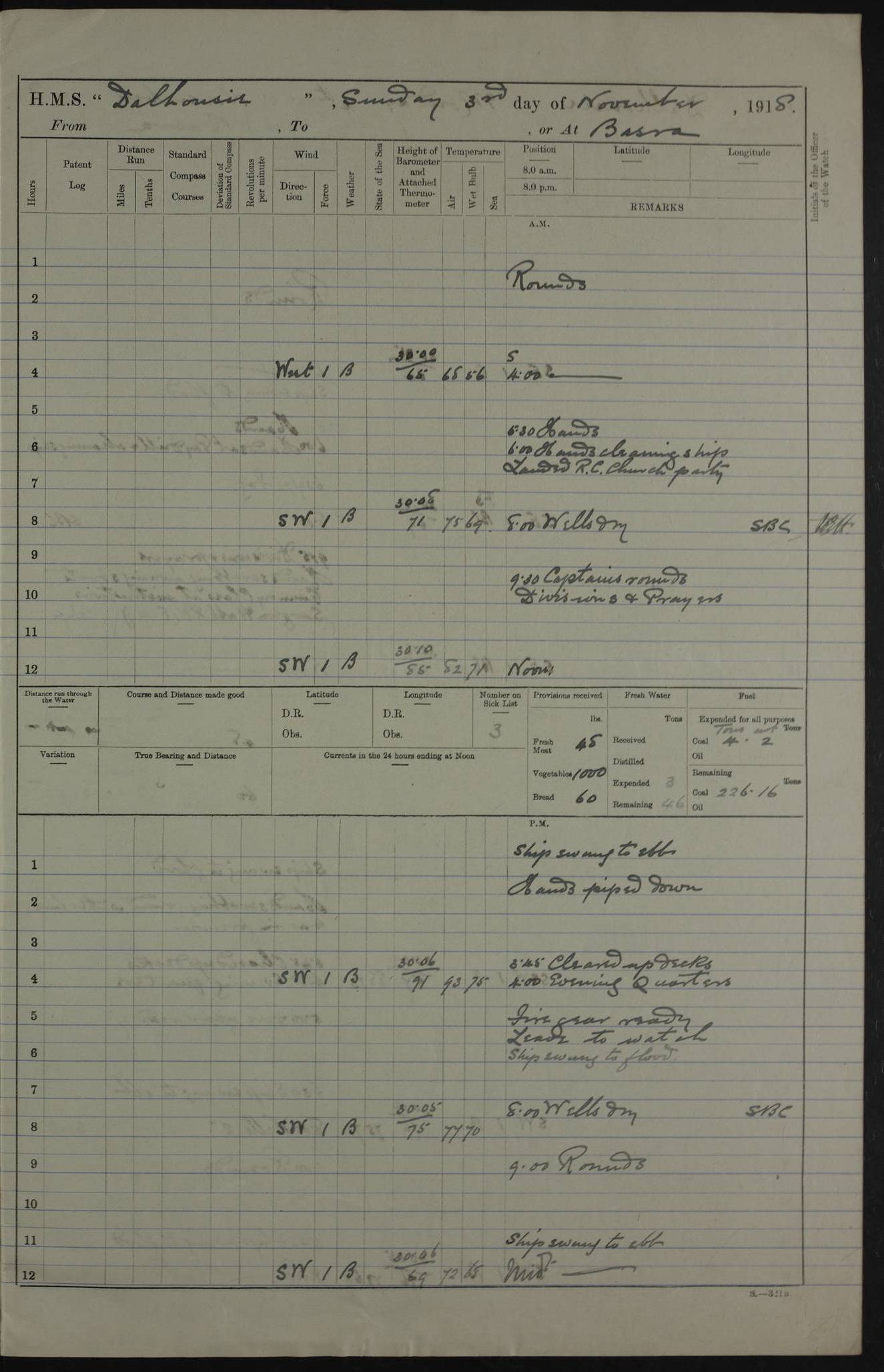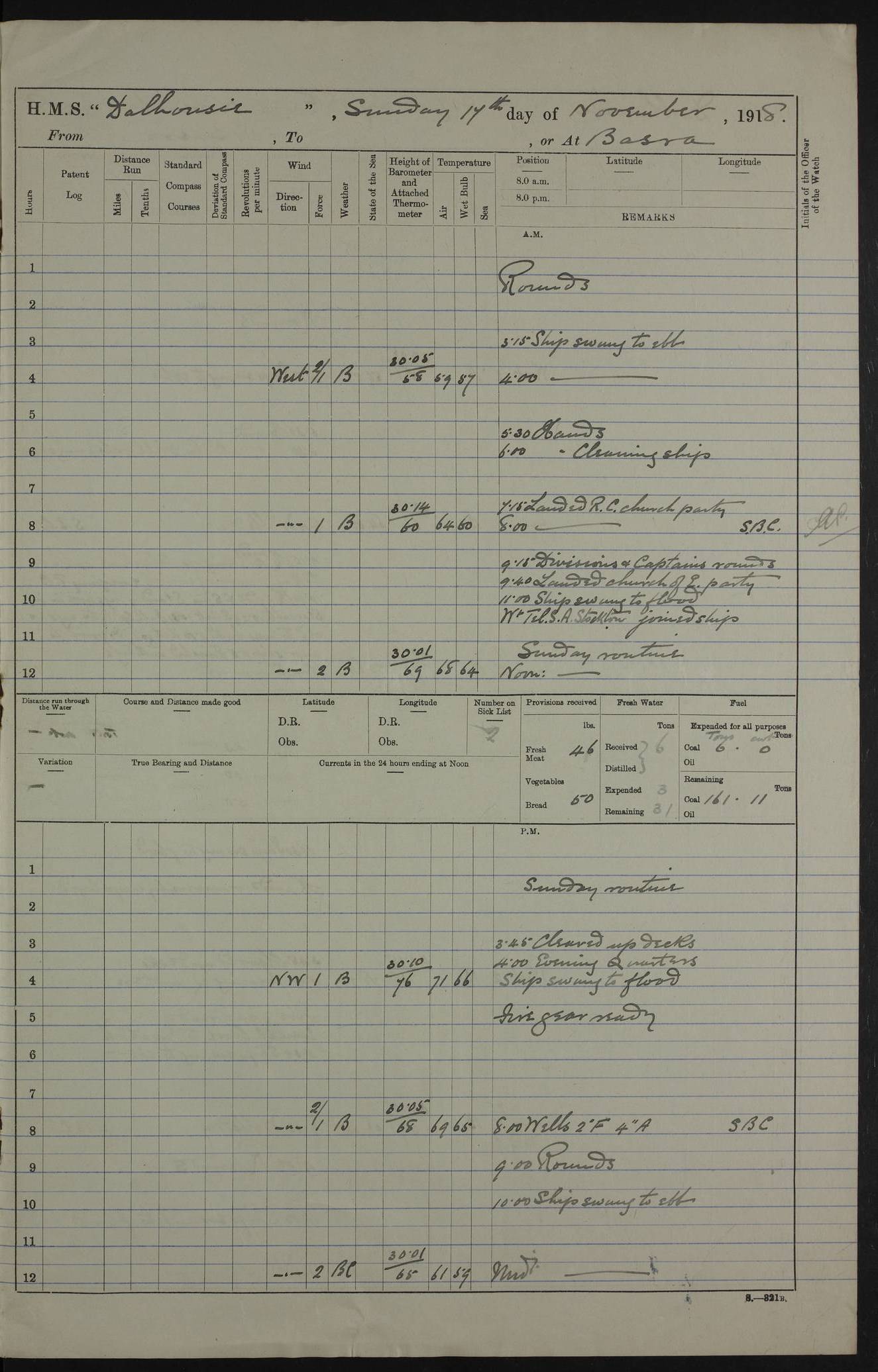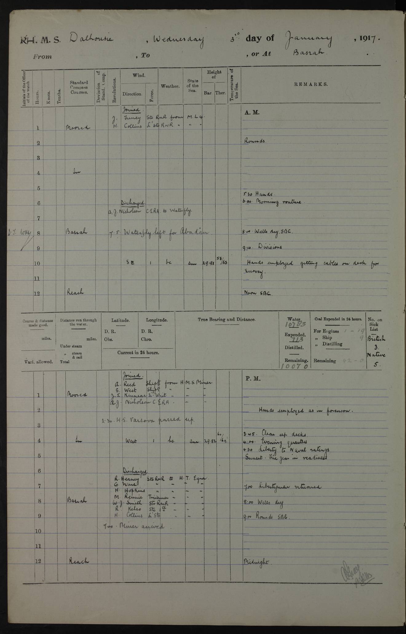 4ef4fafce53e0a0c91005931: (https://s3.amazonaws.com:443/oldweather/ADM53-39406/0015_1.jpg) 27 October 1917 Place: Basrah Lat 30.5269, Long 47.8407 2:00am: Rounds 6:00am: Hands - Morning Routine 7:00am: Exercised Fire stations 7:45am: Working party to Depot 8:00am: Wells dry - Signal Books correct 10:00am: Hands employed cleaning ship 12:00pm: Signal Books correct – Working party returned 1:00pm: Hands piped down 1:30pm: Liberty to Naval Ratings 3:45pm: Cleared up decks 4:00pm: Evening Quarters – Signal Books correct 5:15pm: Liberty to Naval Ratings 6:00pm: Sunset - Fire Gear in readiness 7:30pm: Liberty men returned 8:00pm: Wells dry - Signal Books correct 9:00pm: Rounds – Signal Books correct AM – Discharged To BARALA: W Denyer, Able Seaman - A Childs, Able Seaman - H Beckham Seaman - N Murray Seaman PM - Discharged To SCARAB: A Bushill, Senior Petty Officer - H Garth, Signalman To TARANTULA: G Campbell, Ship’s Steward Assistant 4ef4fafde53e0a0c91005932: (https://s3.amazonaws.com:443/oldweather/ADM53-39406/0016_0.jpg) 28 October 1917 Place: Basrah Lat 30.5269, Long 47.8407 2:00am: Rounds 5:30am: Hands 6:00am: Morning Routine 7:00am: Roman Catholic Church party landed 8:00am: Wells dry – Signal Books correct – Roman Catholics returned - Working party to Depot 8:30am: Church of England party to PROSERPINE 8:45am: Wesleyans landed 9:45am: Church parties returned - Divisions 10:30am: Liberty to Native Ratings 12:00pm: Signal Books correct – Working party returned 1:00pm: Issued Quinine to Naval Ratings- Issued Quinine to Native Ratings 1:30pm: Liberty to Naval ratings 3:45pm: Cleared up decks 4:00pm: Evening Quarters – Signal Books correct 5:15pm: Liberty to Naval Ratings 6:00pm: Sunset - Fire Gear in readiness 7:30pm: Liberty men returned 8:00pm: Wells dry - Signal Books correct 9:00pm: Rounds – Signal Books correct AM – Discharged To GRAYFLY: E.C. Shepherd, Petty Officer - W Hill, Able Seaman - Q Cox, Able Seaman - H Murphy, Able Seaman - A Taylor Telegrapher PM – Joined From SCARAB: J.G. Cooper, Stoker From Admiral’s House: Dounleg bin Eulog, Seedie PM - Discharged To ELEPHANTA: Alex de Souza, Officer's Steward To SCARAB: A Hatchard, Stoker To FIREFLY: W Burke, Stoker To Admiral’s House: Abrahim bin Shambi, Seedie