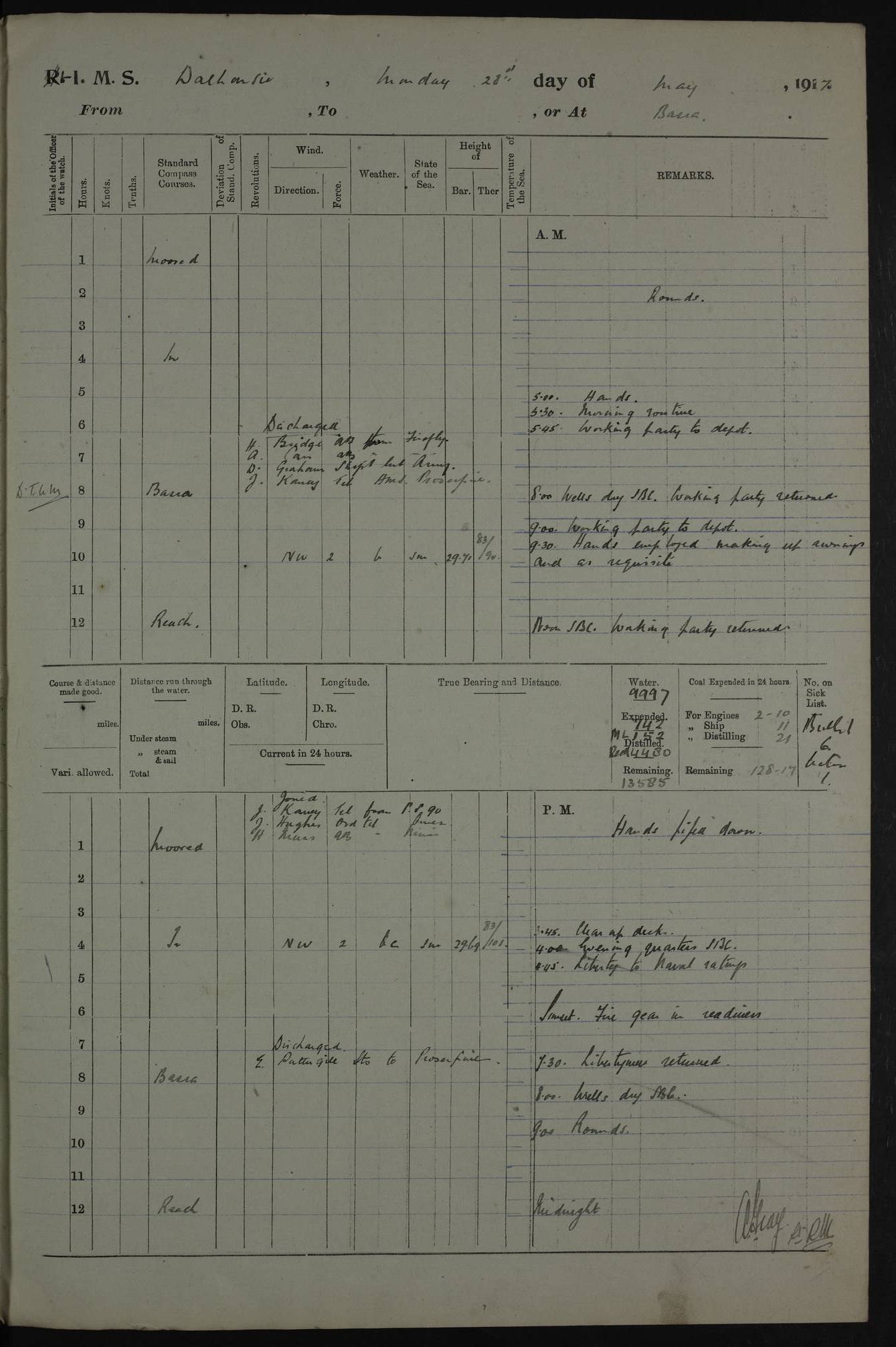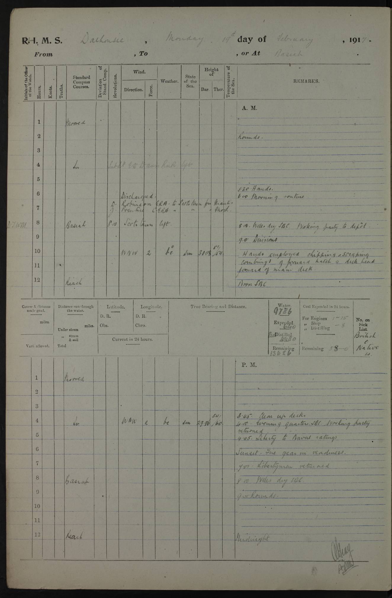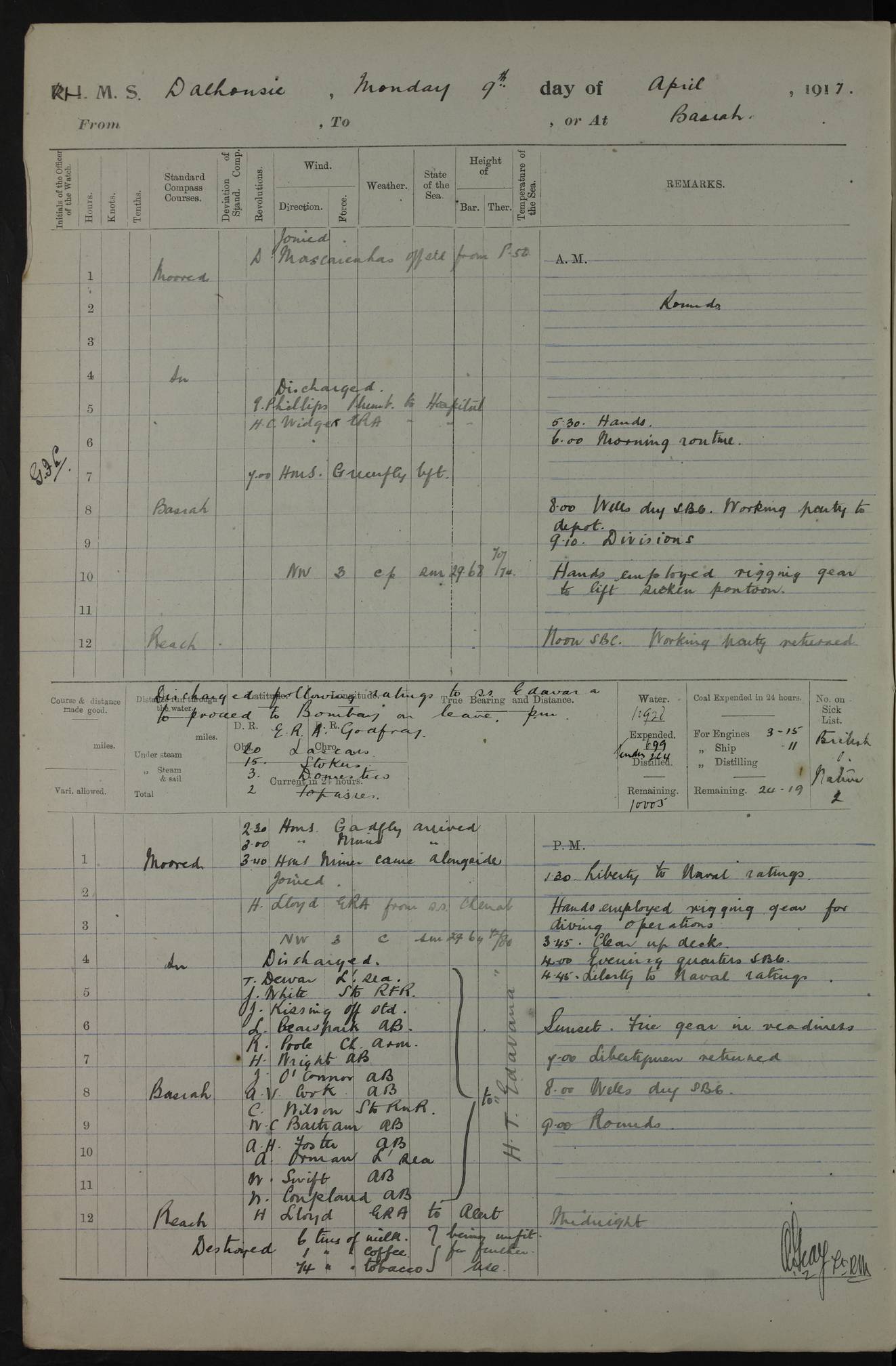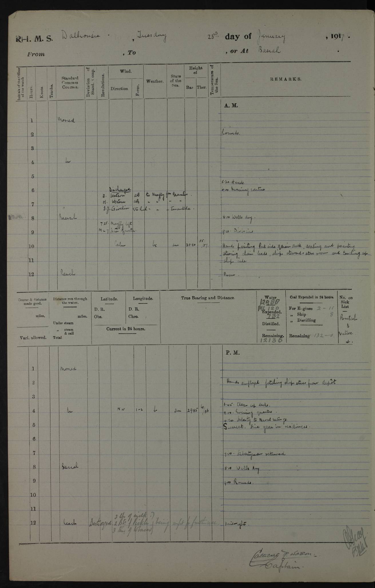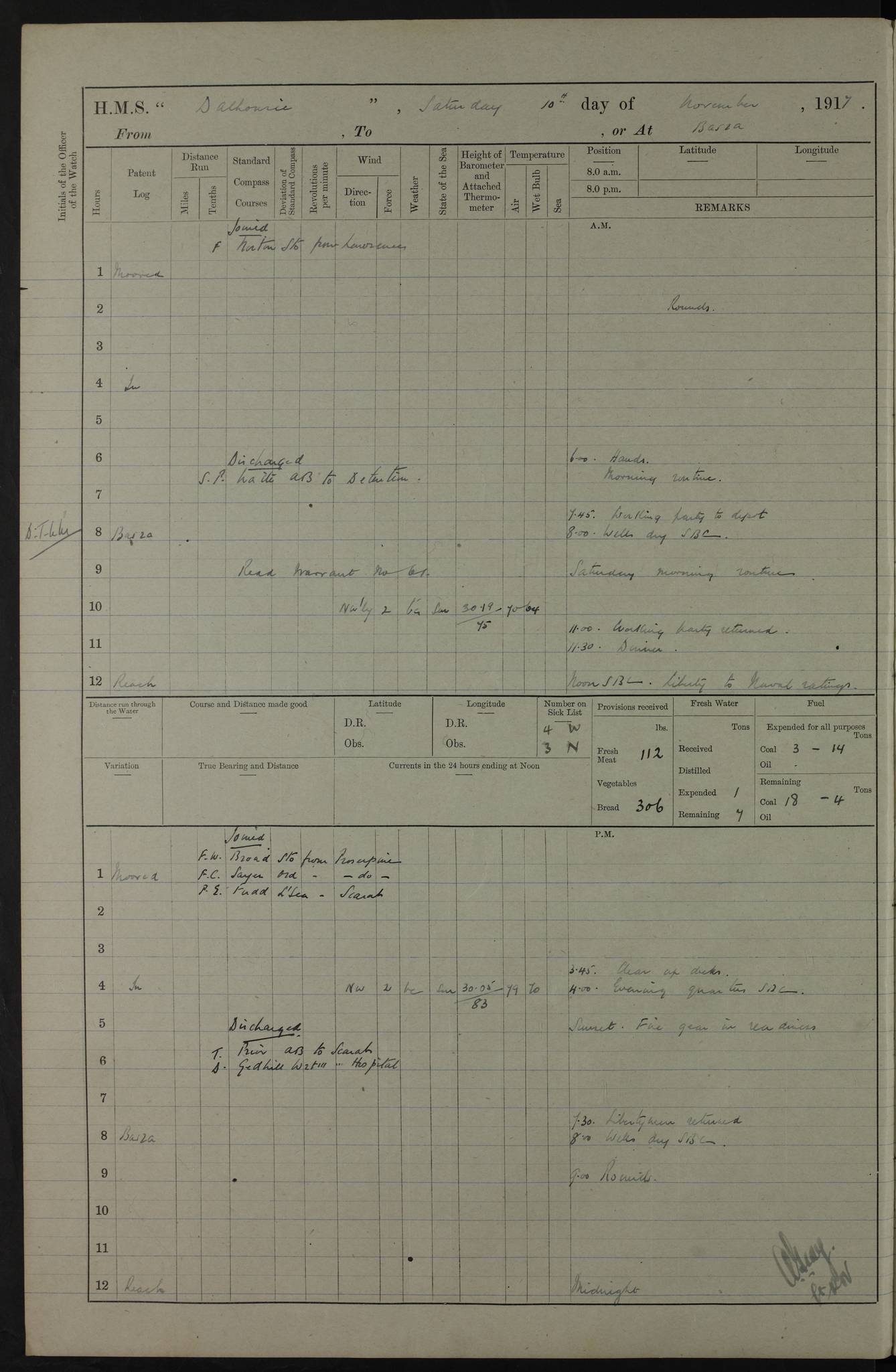 4ef4fafce53e0a0c91005931: (https://s3.amazonaws.com:443/oldweather/ADM53-39406/0015_1.jpg) 27 October 1917 Place: Basrah Lat 30.5269, Long 47.8407 2:00am: Rounds 6:00am: Hands - Morning Routine 7:00am: Exercised Fire stations 7:45am: Working party to Depot 8:00am: Wells dry - Signal Books correct 10:00am: Hands employed cleaning ship 12:00pm: Signal Books correct – Working party returned 1:00pm: Hands piped down 1:30pm: Liberty to Naval Ratings 3:45pm: Cleared up decks 4:00pm: Evening Quarters – Signal Books correct 5:15pm: Liberty to Naval Ratings 6:00pm: Sunset - Fire Gear in readiness 7:30pm: Liberty men returned 8:00pm: Wells dry - Signal Books correct 9:00pm: Rounds – Signal Books correct AM – Discharged To BARALA: W Denyer, Able Seaman - A Childs, Able Seaman - H Beckham Seaman - N Murray Seaman PM - Discharged To SCARAB: A Bushill, Senior Petty Officer - H Garth, Signalman To TARANTULA: G Campbell, Ship’s Steward Assistant 4ef4fafde53e0a0c91005932: (https://s3.amazonaws.com:443/oldweather/ADM53-39406/0016_0.jpg) 28 October 1917 Place: Basrah Lat 30.5269, Long 47.8407 2:00am: Rounds 5:30am: Hands 6:00am: Morning Routine 7:00am: Roman Catholic Church party landed 8:00am: Wells dry – Signal Books correct – Roman Catholics returned - Working party to Depot 8:30am: Church of England party to PROSERPINE 8:45am: Wesleyans landed 9:45am: Church parties returned - Divisions 10:30am: Liberty to Native Ratings 12:00pm: Signal Books correct – Working party returned 1:00pm: Issued Quinine to Naval Ratings- Issued Quinine to Native Ratings 1:30pm: Liberty to Naval ratings 3:45pm: Cleared up decks 4:00pm: Evening Quarters – Signal Books correct 5:15pm: Liberty to Naval Ratings 6:00pm: Sunset - Fire Gear in readiness 7:30pm: Liberty men returned 8:00pm: Wells dry - Signal Books correct 9:00pm: Rounds – Signal Books correct AM – Discharged To GRAYFLY: E.C. Shepherd, Petty Officer - W Hill, Able Seaman - Q Cox, Able Seaman - H Murphy, Able Seaman - A Taylor Telegrapher PM – Joined From SCARAB: J.G. Cooper, Stoker From Admiral’s House: Dounleg bin Eulog, Seedie PM - Discharged To ELEPHANTA: Alex de Souza, Officer's Steward To SCARAB: A Hatchard, Stoker To FIREFLY: W Burke, Stoker To Admiral’s House: Abrahim bin Shambi, Seedie