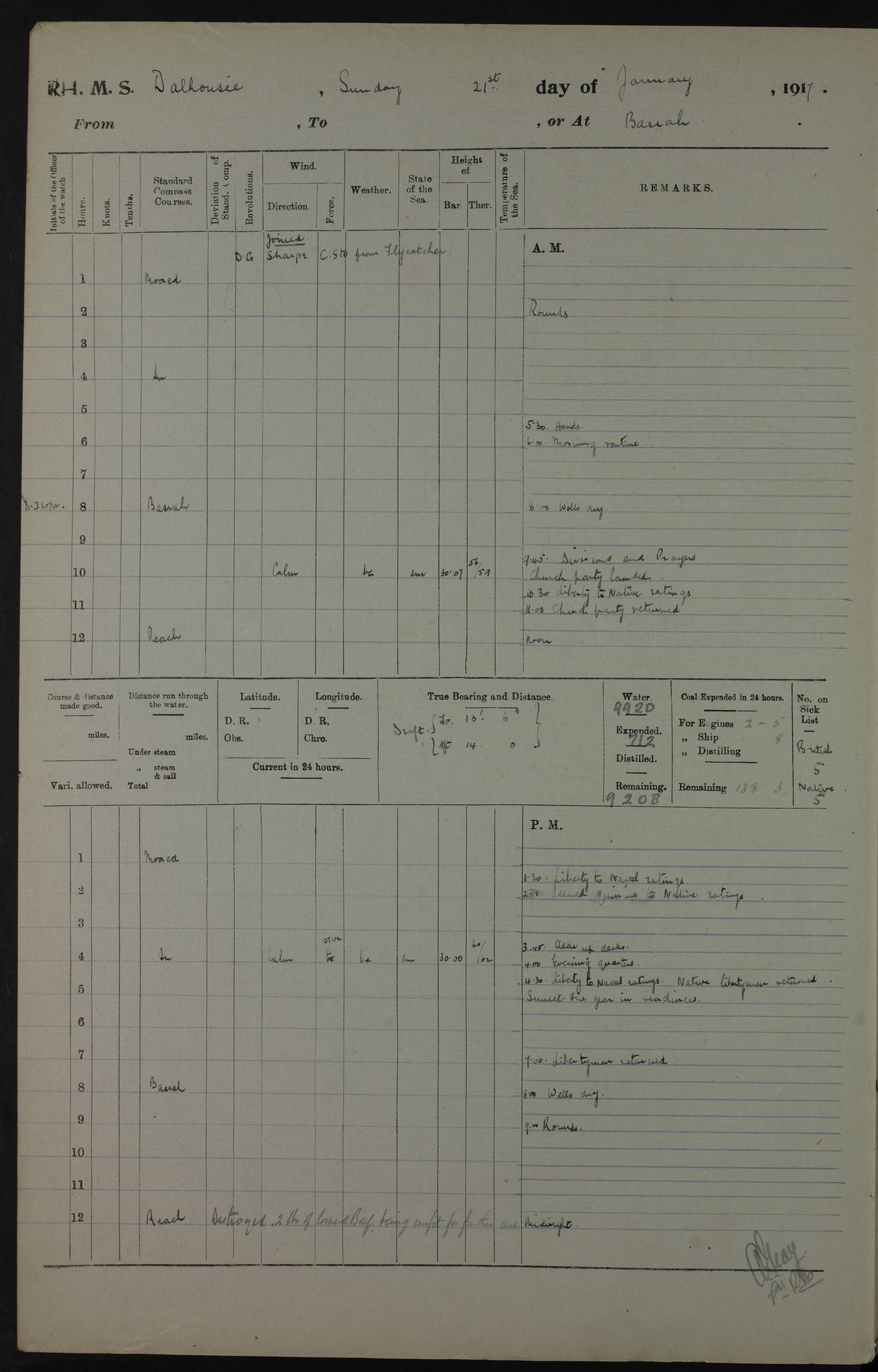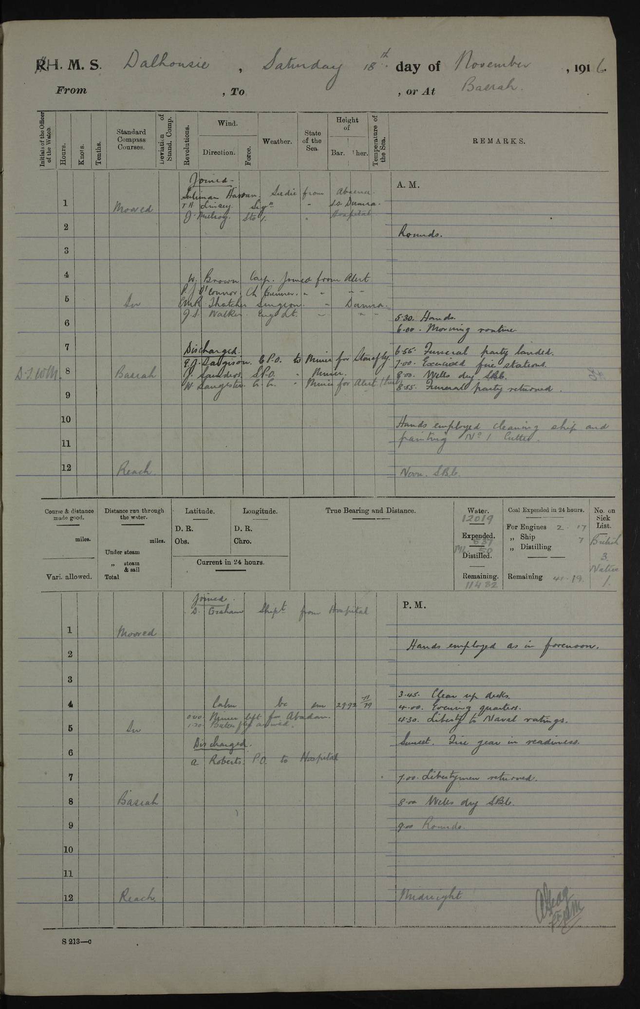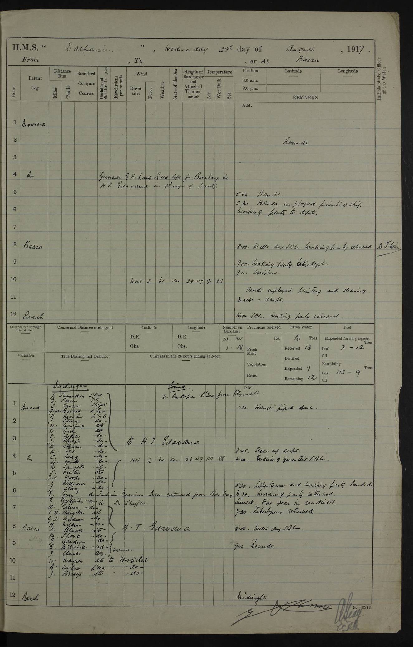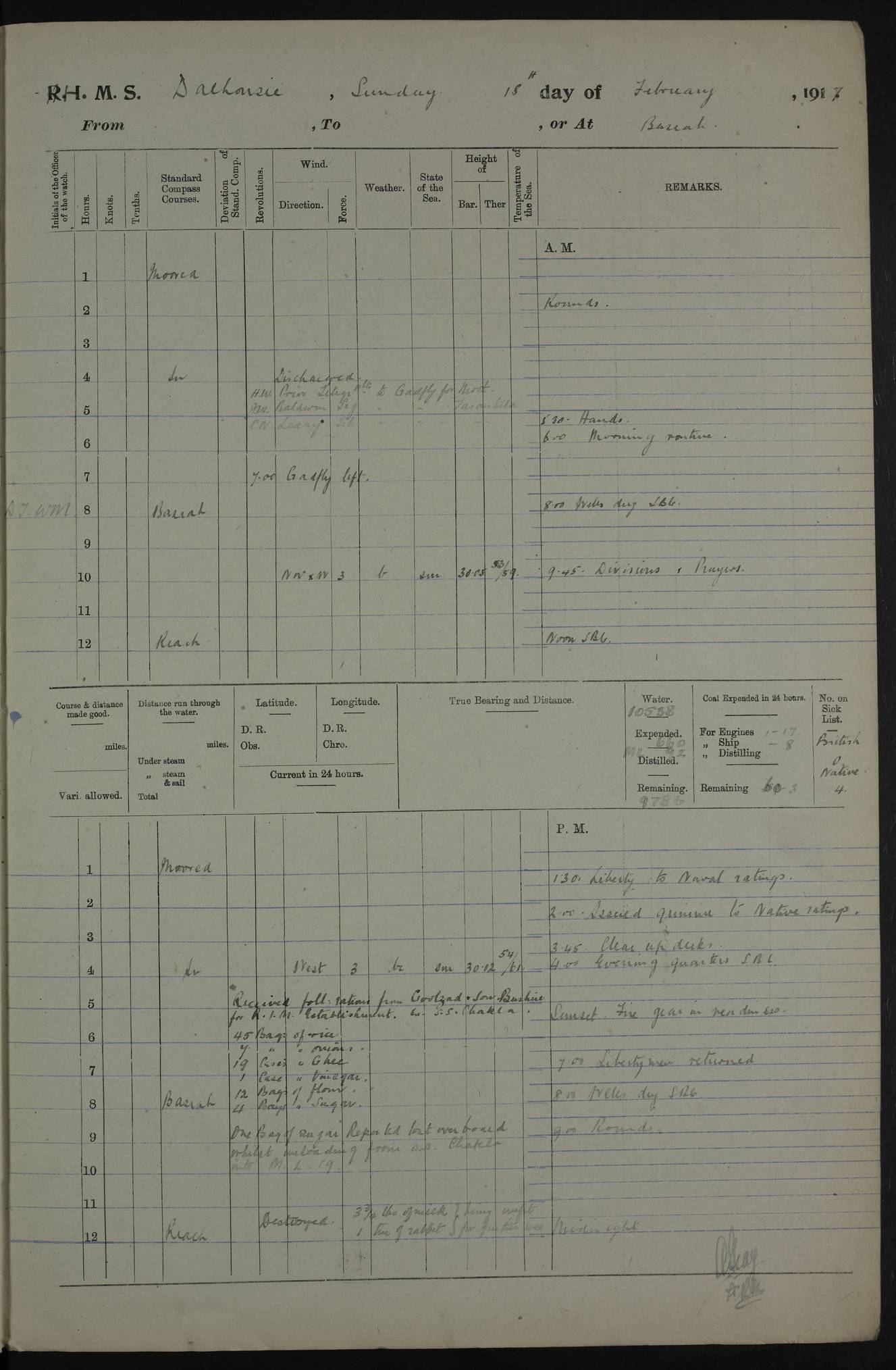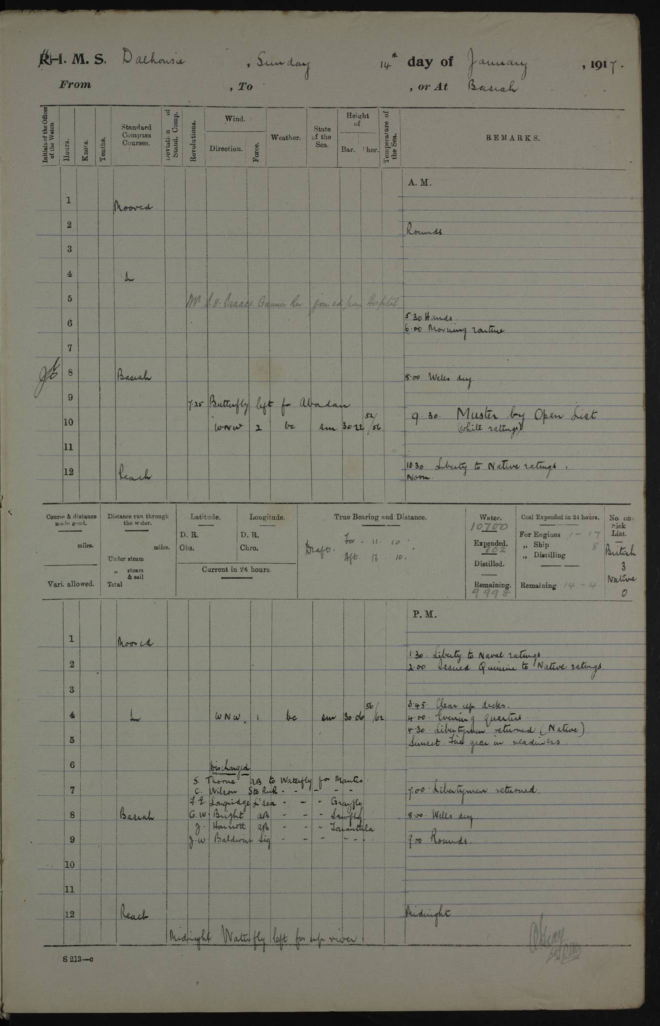 4ef4fafce53e0a0c91005931: (https://s3.amazonaws.com:443/oldweather/ADM53-39406/0015_1.jpg) 27 October 1917 Place: Basrah Lat 30.5269, Long 47.8407 2:00am: Rounds 6:00am: Hands - Morning Routine 7:00am: Exercised Fire stations 7:45am: Working party to Depot 8:00am: Wells dry - Signal Books correct 10:00am: Hands employed cleaning ship 12:00pm: Signal Books correct – Working party returned 1:00pm: Hands piped down 1:30pm: Liberty to Naval Ratings 3:45pm: Cleared up decks 4:00pm: Evening Quarters – Signal Books correct 5:15pm: Liberty to Naval Ratings 6:00pm: Sunset - Fire Gear in readiness 7:30pm: Liberty men returned 8:00pm: Wells dry - Signal Books correct 9:00pm: Rounds – Signal Books correct AM – Discharged To BARALA: W Denyer, Able Seaman - A Childs, Able Seaman - H Beckham Seaman - N Murray Seaman PM - Discharged To SCARAB: A Bushill, Senior Petty Officer - H Garth, Signalman To TARANTULA: G Campbell, Ship’s Steward Assistant 4ef4fafde53e0a0c91005932: (https://s3.amazonaws.com:443/oldweather/ADM53-39406/0016_0.jpg) 28 October 1917 Place: Basrah Lat 30.5269, Long 47.8407 2:00am: Rounds 5:30am: Hands 6:00am: Morning Routine 7:00am: Roman Catholic Church party landed 8:00am: Wells dry – Signal Books correct – Roman Catholics returned - Working party to Depot 8:30am: Church of England party to PROSERPINE 8:45am: Wesleyans landed 9:45am: Church parties returned - Divisions 10:30am: Liberty to Native Ratings 12:00pm: Signal Books correct – Working party returned 1:00pm: Issued Quinine to Naval Ratings- Issued Quinine to Native Ratings 1:30pm: Liberty to Naval ratings 3:45pm: Cleared up decks 4:00pm: Evening Quarters – Signal Books correct 5:15pm: Liberty to Naval Ratings 6:00pm: Sunset - Fire Gear in readiness 7:30pm: Liberty men returned 8:00pm: Wells dry - Signal Books correct 9:00pm: Rounds – Signal Books correct AM – Discharged To GRAYFLY: E.C. Shepherd, Petty Officer - W Hill, Able Seaman - Q Cox, Able Seaman - H Murphy, Able Seaman - A Taylor Telegrapher PM – Joined From SCARAB: J.G. Cooper, Stoker From Admiral’s House: Dounleg bin Eulog, Seedie PM - Discharged To ELEPHANTA: Alex de Souza, Officer's Steward To SCARAB: A Hatchard, Stoker To FIREFLY: W Burke, Stoker To Admiral’s House: Abrahim bin Shambi, Seedie