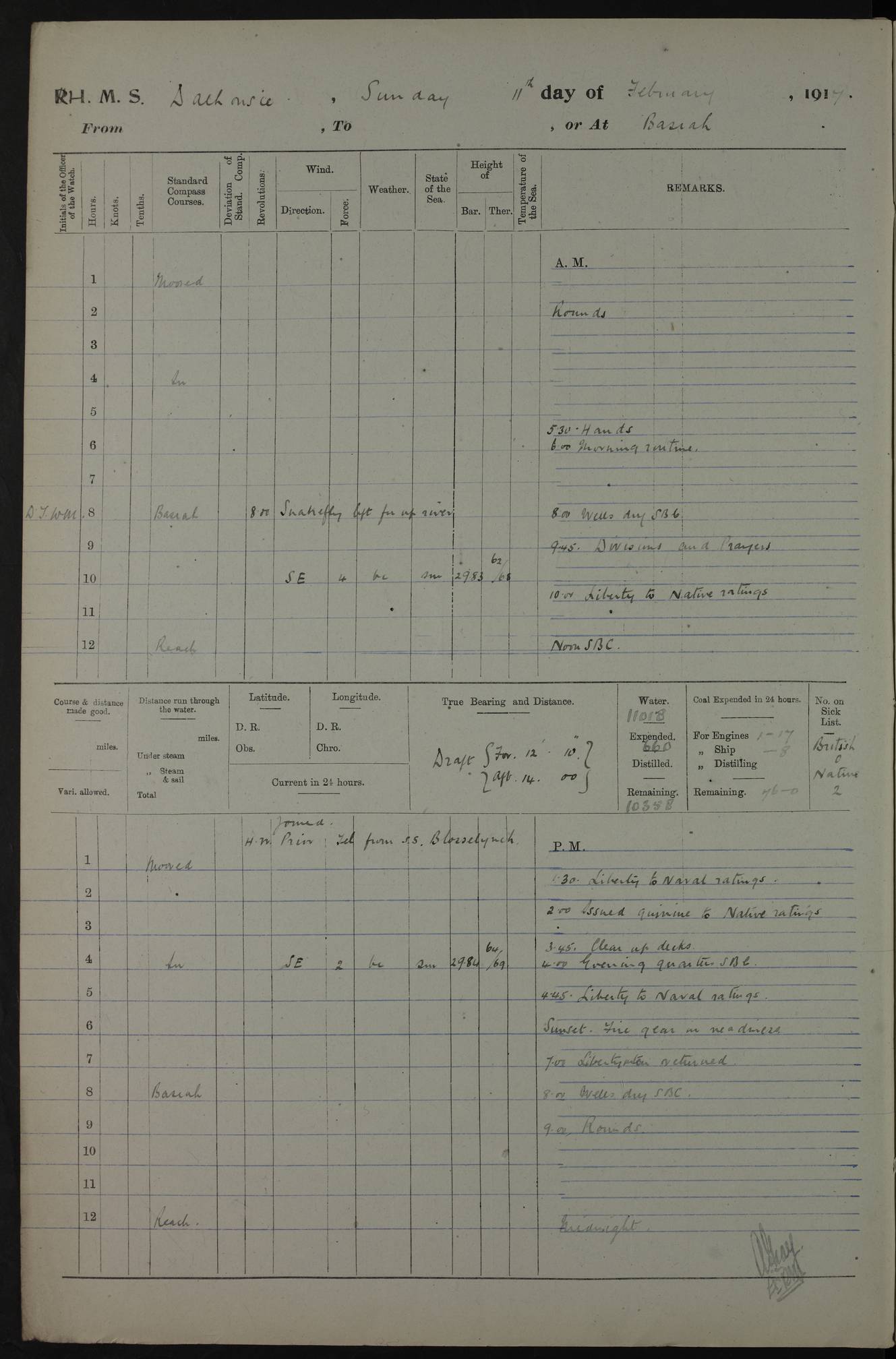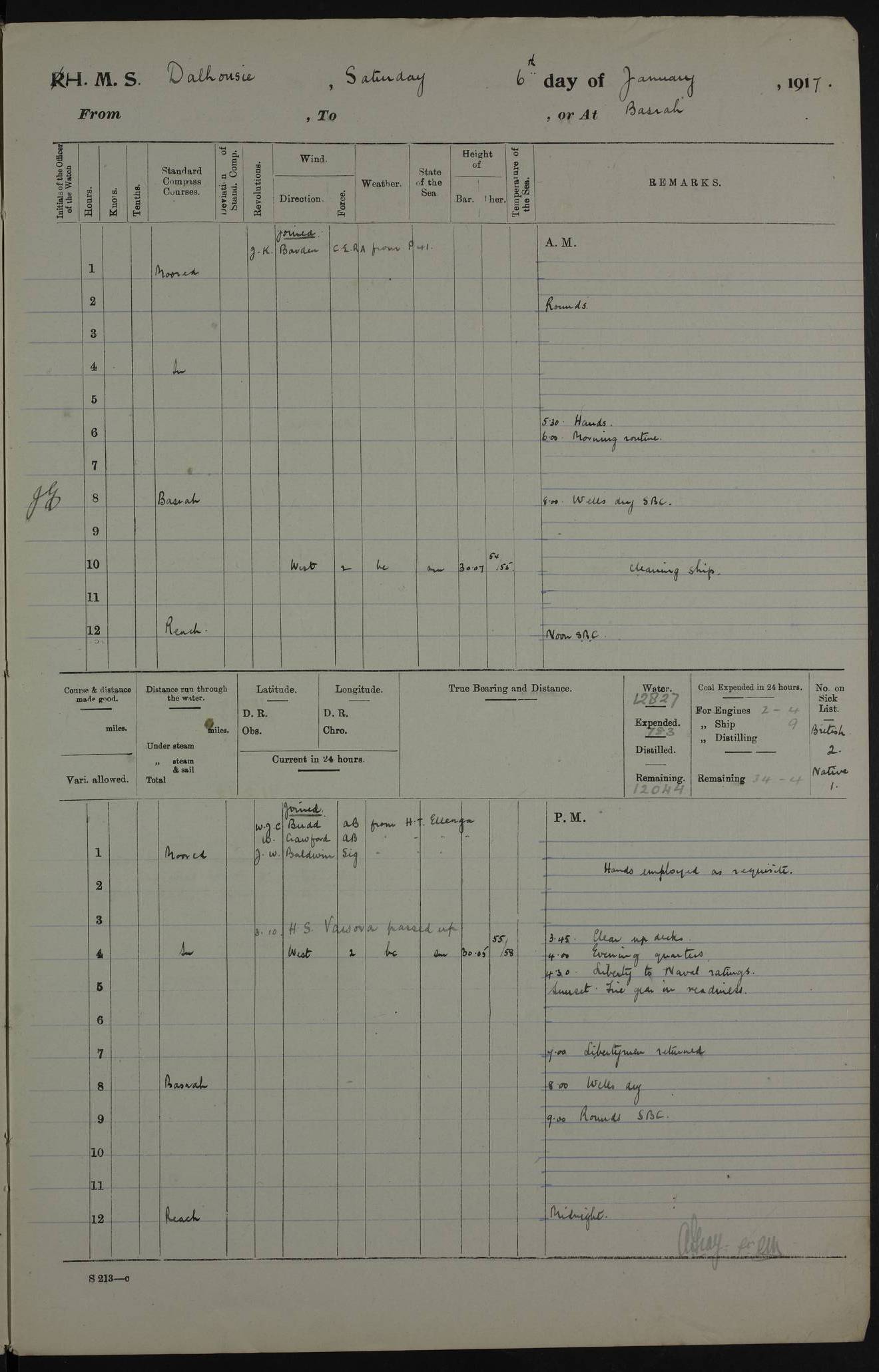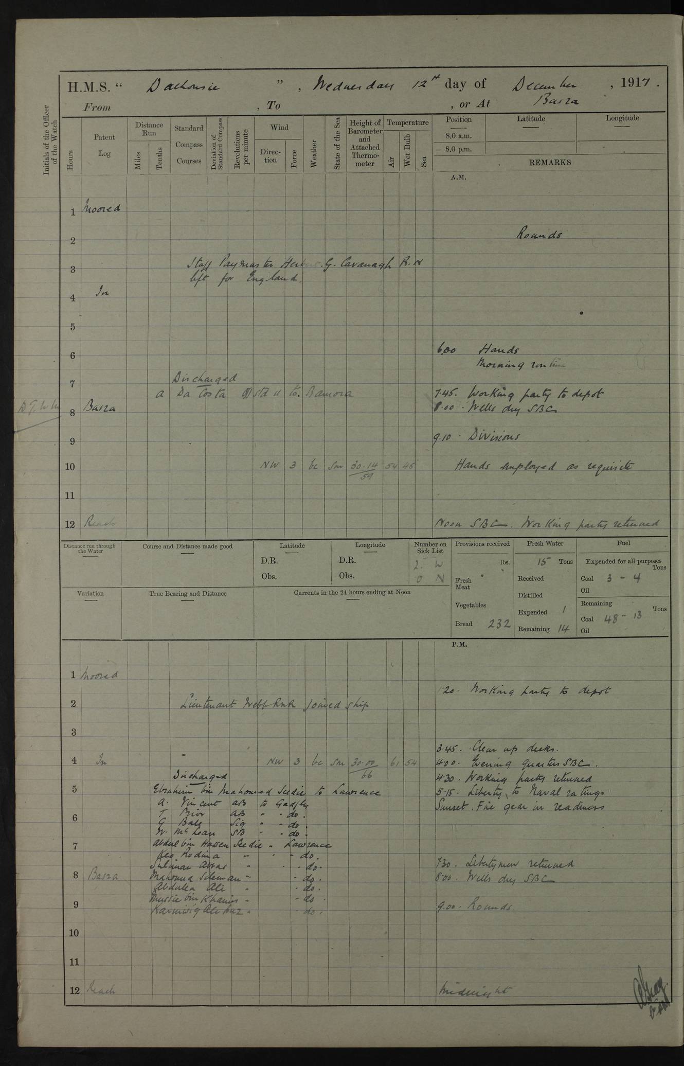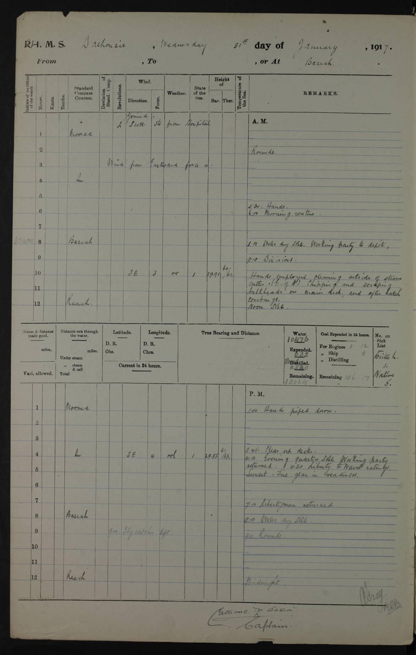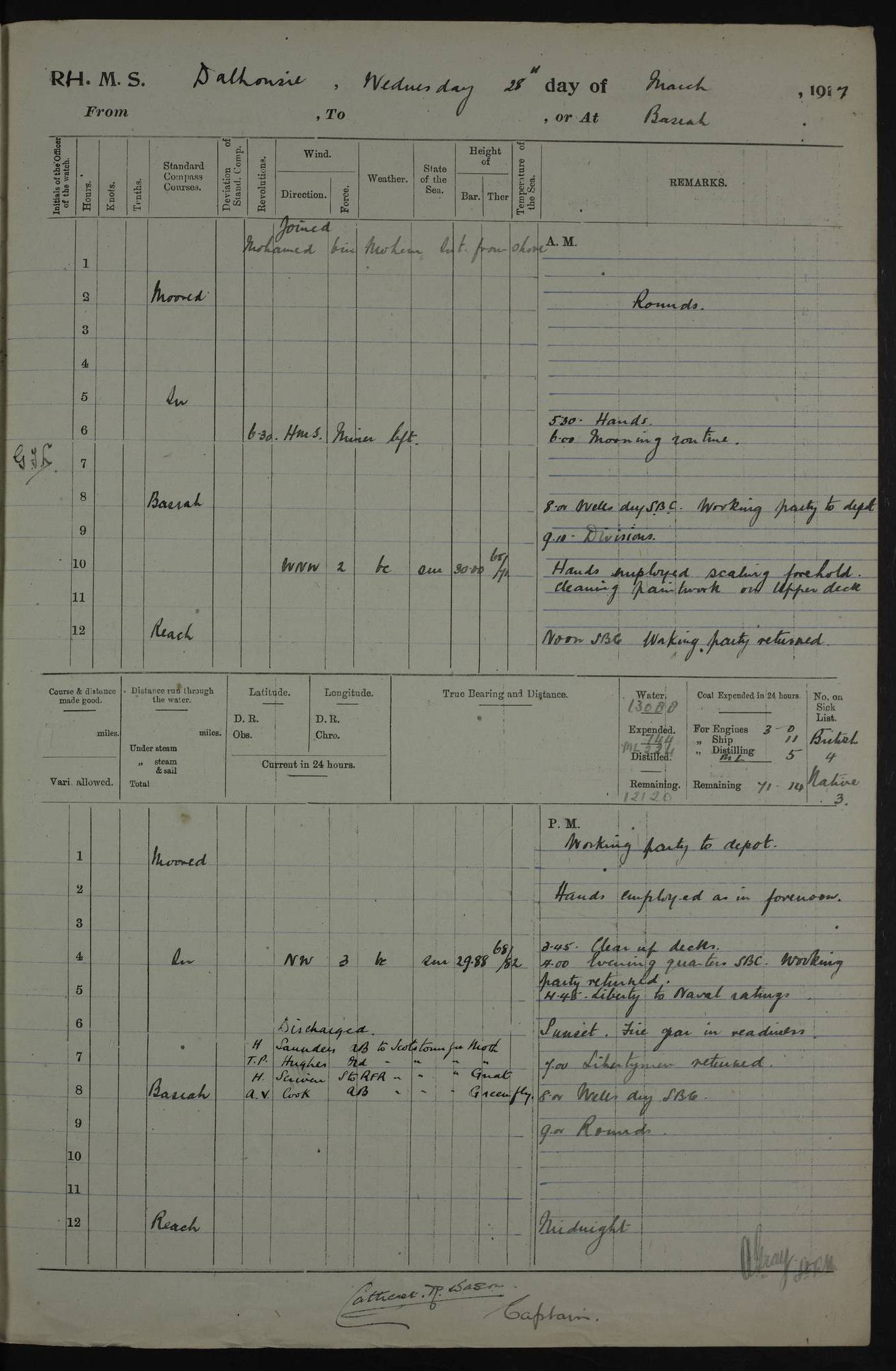 4ef4fafce53e0a0c91005931: (https://s3.amazonaws.com:443/oldweather/ADM53-39406/0015_1.jpg) 27 October 1917 Place: Basrah Lat 30.5269, Long 47.8407 2:00am: Rounds 6:00am: Hands - Morning Routine 7:00am: Exercised Fire stations 7:45am: Working party to Depot 8:00am: Wells dry - Signal Books correct 10:00am: Hands employed cleaning ship 12:00pm: Signal Books correct – Working party returned 1:00pm: Hands piped down 1:30pm: Liberty to Naval Ratings 3:45pm: Cleared up decks 4:00pm: Evening Quarters – Signal Books correct 5:15pm: Liberty to Naval Ratings 6:00pm: Sunset - Fire Gear in readiness 7:30pm: Liberty men returned 8:00pm: Wells dry - Signal Books correct 9:00pm: Rounds – Signal Books correct AM – Discharged To BARALA: W Denyer, Able Seaman - A Childs, Able Seaman - H Beckham Seaman - N Murray Seaman PM - Discharged To SCARAB: A Bushill, Senior Petty Officer - H Garth, Signalman To TARANTULA: G Campbell, Ship’s Steward Assistant 4ef4fafde53e0a0c91005932: (https://s3.amazonaws.com:443/oldweather/ADM53-39406/0016_0.jpg) 28 October 1917 Place: Basrah Lat 30.5269, Long 47.8407 2:00am: Rounds 5:30am: Hands 6:00am: Morning Routine 7:00am: Roman Catholic Church party landed 8:00am: Wells dry – Signal Books correct – Roman Catholics returned - Working party to Depot 8:30am: Church of England party to PROSERPINE 8:45am: Wesleyans landed 9:45am: Church parties returned - Divisions 10:30am: Liberty to Native Ratings 12:00pm: Signal Books correct – Working party returned 1:00pm: Issued Quinine to Naval Ratings- Issued Quinine to Native Ratings 1:30pm: Liberty to Naval ratings 3:45pm: Cleared up decks 4:00pm: Evening Quarters – Signal Books correct 5:15pm: Liberty to Naval Ratings 6:00pm: Sunset - Fire Gear in readiness 7:30pm: Liberty men returned 8:00pm: Wells dry - Signal Books correct 9:00pm: Rounds – Signal Books correct AM – Discharged To GRAYFLY: E.C. Shepherd, Petty Officer - W Hill, Able Seaman - Q Cox, Able Seaman - H Murphy, Able Seaman - A Taylor Telegrapher PM – Joined From SCARAB: J.G. Cooper, Stoker From Admiral’s House: Dounleg bin Eulog, Seedie PM - Discharged To ELEPHANTA: Alex de Souza, Officer's Steward To SCARAB: A Hatchard, Stoker To FIREFLY: W Burke, Stoker To Admiral’s House: Abrahim bin Shambi, Seedie