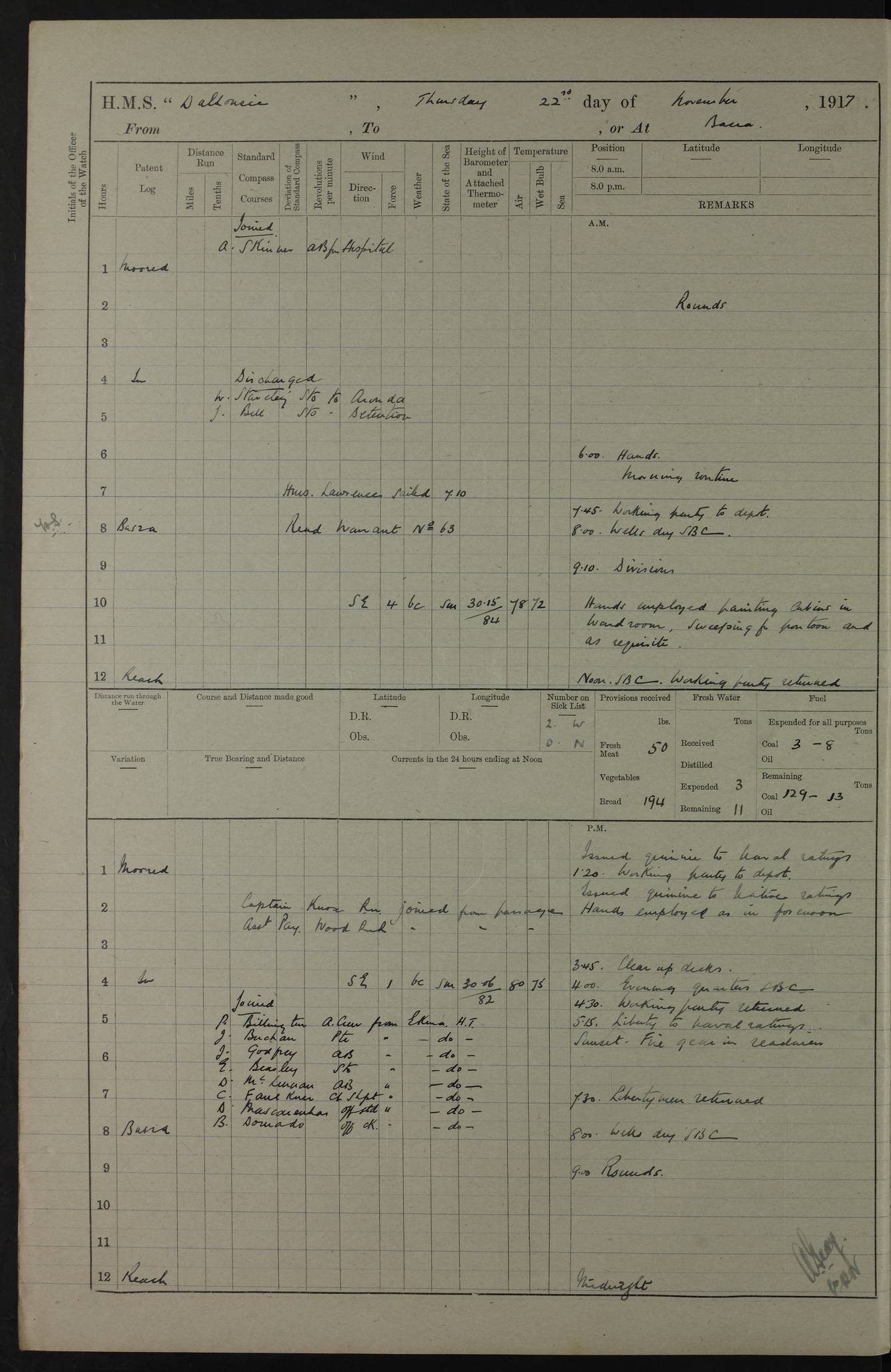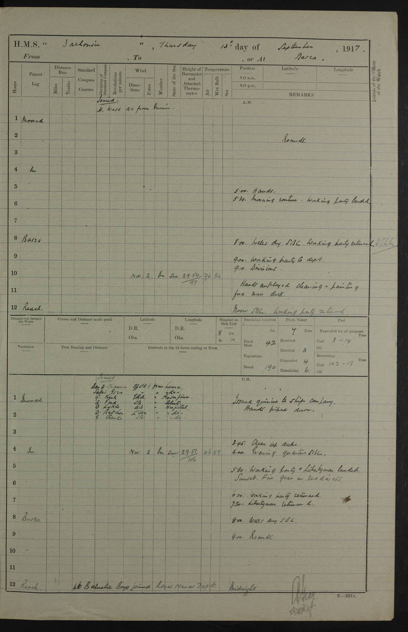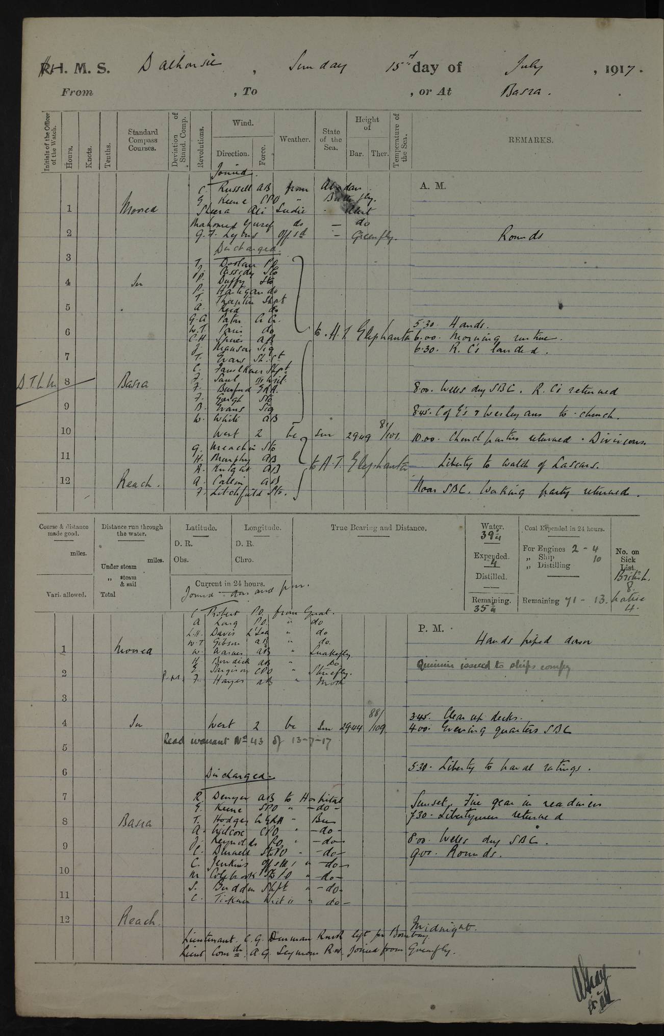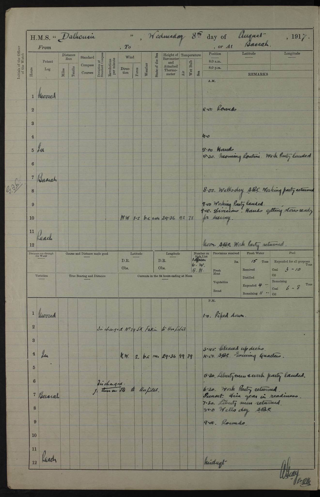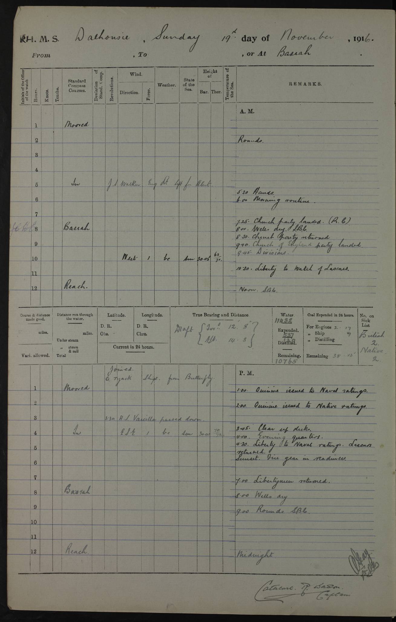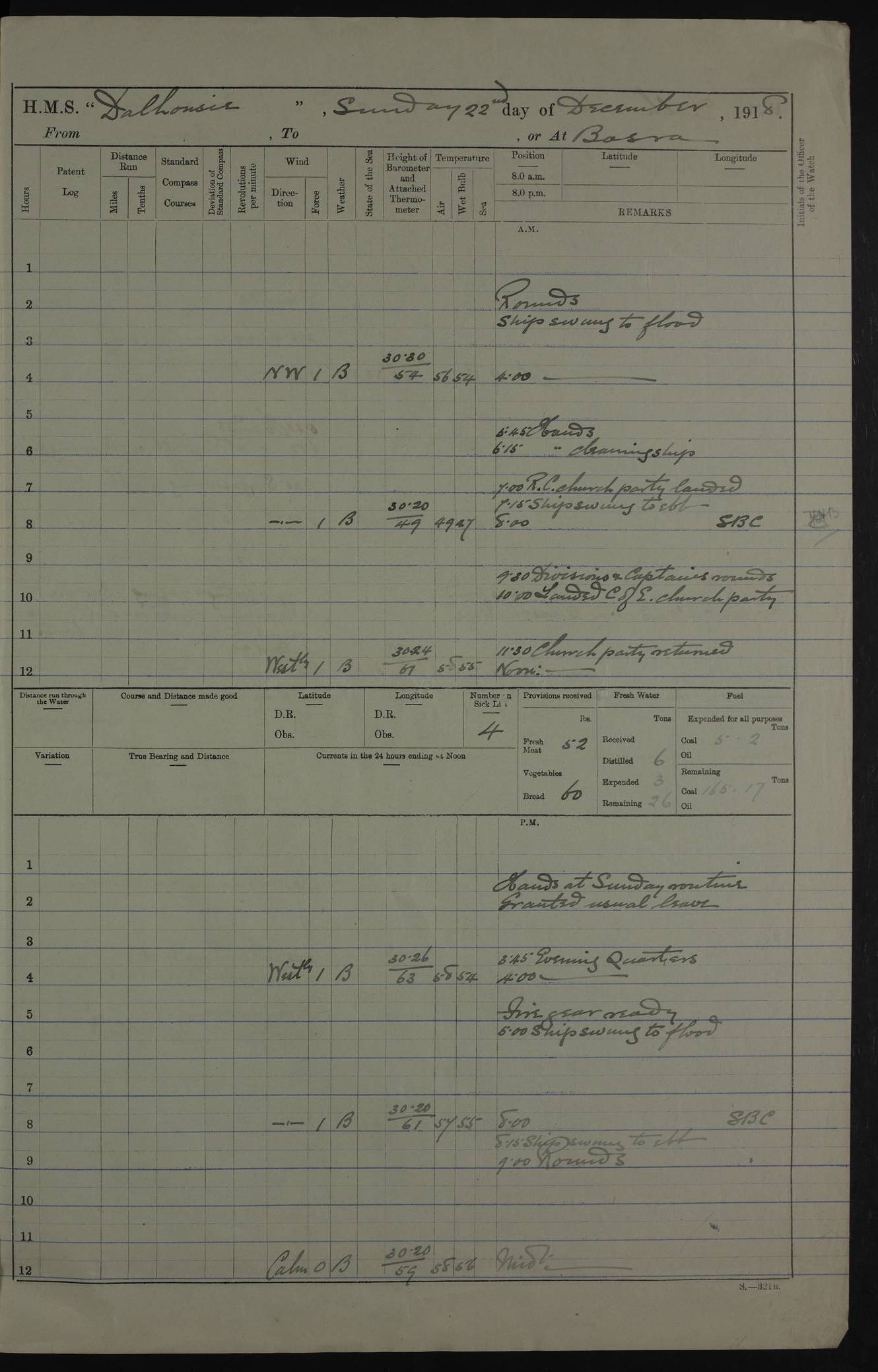 4ef4fafce53e0a0c91005931: (https://s3.amazonaws.com:443/oldweather/ADM53-39406/0015_1.jpg) 27 October 1917 Place: Basrah Lat 30.5269, Long 47.8407 2:00am: Rounds 6:00am: Hands - Morning Routine 7:00am: Exercised Fire stations 7:45am: Working party to Depot 8:00am: Wells dry - Signal Books correct 10:00am: Hands employed cleaning ship 12:00pm: Signal Books correct – Working party returned 1:00pm: Hands piped down 1:30pm: Liberty to Naval Ratings 3:45pm: Cleared up decks 4:00pm: Evening Quarters – Signal Books correct 5:15pm: Liberty to Naval Ratings 6:00pm: Sunset - Fire Gear in readiness 7:30pm: Liberty men returned 8:00pm: Wells dry - Signal Books correct 9:00pm: Rounds – Signal Books correct AM – Discharged To BARALA: W Denyer, Able Seaman - A Childs, Able Seaman - H Beckham Seaman - N Murray Seaman PM - Discharged To SCARAB: A Bushill, Senior Petty Officer - H Garth, Signalman To TARANTULA: G Campbell, Ship’s Steward Assistant 4ef4fafde53e0a0c91005932: (https://s3.amazonaws.com:443/oldweather/ADM53-39406/0016_0.jpg) 28 October 1917 Place: Basrah Lat 30.5269, Long 47.8407 2:00am: Rounds 5:30am: Hands 6:00am: Morning Routine 7:00am: Roman Catholic Church party landed 8:00am: Wells dry – Signal Books correct – Roman Catholics returned - Working party to Depot 8:30am: Church of England party to PROSERPINE 8:45am: Wesleyans landed 9:45am: Church parties returned - Divisions 10:30am: Liberty to Native Ratings 12:00pm: Signal Books correct – Working party returned 1:00pm: Issued Quinine to Naval Ratings- Issued Quinine to Native Ratings 1:30pm: Liberty to Naval ratings 3:45pm: Cleared up decks 4:00pm: Evening Quarters – Signal Books correct 5:15pm: Liberty to Naval Ratings 6:00pm: Sunset - Fire Gear in readiness 7:30pm: Liberty men returned 8:00pm: Wells dry - Signal Books correct 9:00pm: Rounds – Signal Books correct AM – Discharged To GRAYFLY: E.C. Shepherd, Petty Officer - W Hill, Able Seaman - Q Cox, Able Seaman - H Murphy, Able Seaman - A Taylor Telegrapher PM – Joined From SCARAB: J.G. Cooper, Stoker From Admiral’s House: Dounleg bin Eulog, Seedie PM - Discharged To ELEPHANTA: Alex de Souza, Officer's Steward To SCARAB: A Hatchard, Stoker To FIREFLY: W Burke, Stoker To Admiral’s House: Abrahim bin Shambi, Seedie