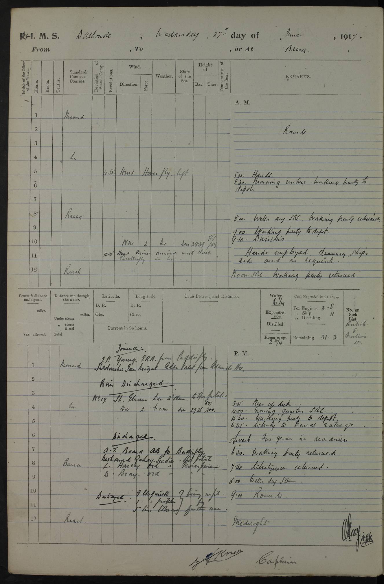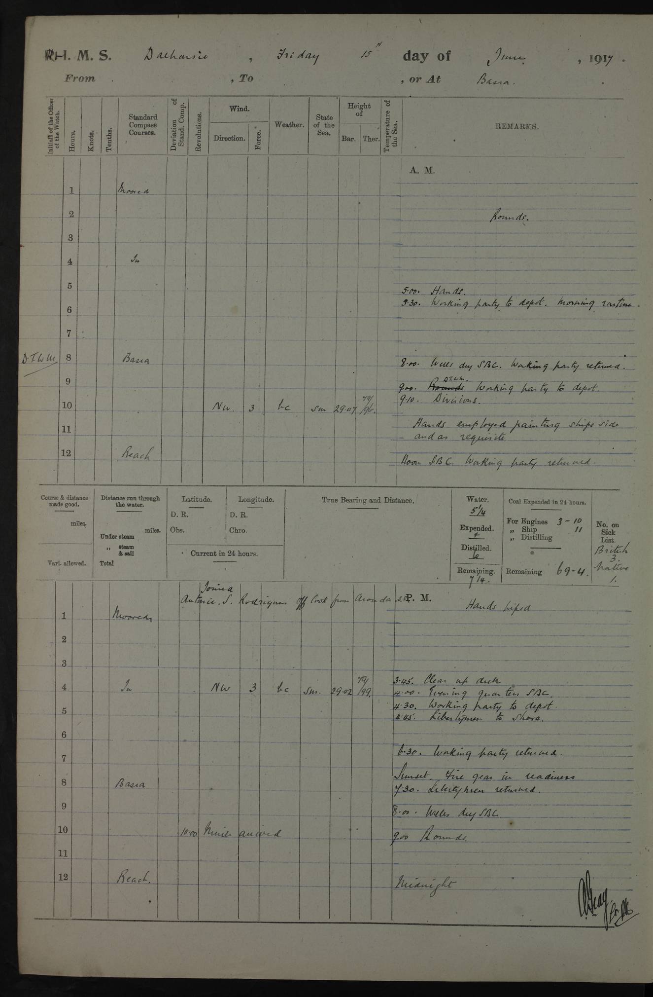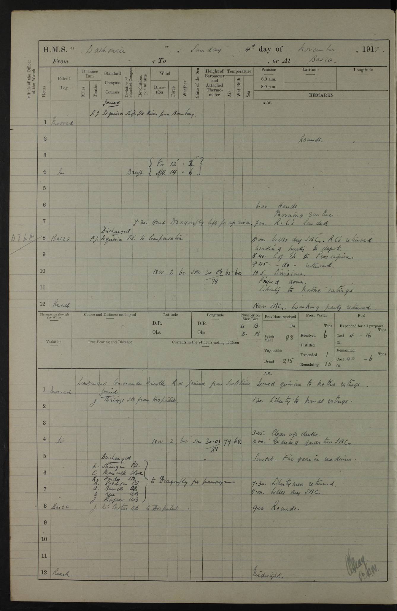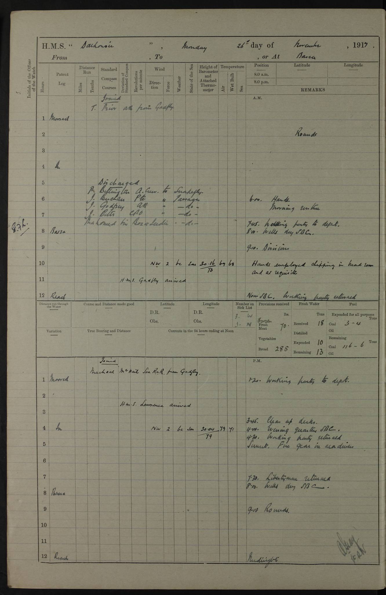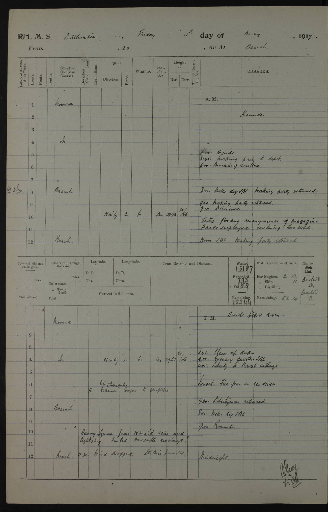 4ef4fafce53e0a0c91005931: (https://s3.amazonaws.com:443/oldweather/ADM53-39406/0015_1.jpg) 27 October 1917 Place: Basrah Lat 30.5269, Long 47.8407 2:00am: Rounds 6:00am: Hands - Morning Routine 7:00am: Exercised Fire stations 7:45am: Working party to Depot 8:00am: Wells dry - Signal Books correct 10:00am: Hands employed cleaning ship 12:00pm: Signal Books correct – Working party returned 1:00pm: Hands piped down 1:30pm: Liberty to Naval Ratings 3:45pm: Cleared up decks 4:00pm: Evening Quarters – Signal Books correct 5:15pm: Liberty to Naval Ratings 6:00pm: Sunset - Fire Gear in readiness 7:30pm: Liberty men returned 8:00pm: Wells dry - Signal Books correct 9:00pm: Rounds – Signal Books correct AM – Discharged To BARALA: W Denyer, Able Seaman - A Childs, Able Seaman - H Beckham Seaman - N Murray Seaman PM - Discharged To SCARAB: A Bushill, Senior Petty Officer - H Garth, Signalman To TARANTULA: G Campbell, Ship’s Steward Assistant 4ef4fafde53e0a0c91005932: (https://s3.amazonaws.com:443/oldweather/ADM53-39406/0016_0.jpg) 28 October 1917 Place: Basrah Lat 30.5269, Long 47.8407 2:00am: Rounds 5:30am: Hands 6:00am: Morning Routine 7:00am: Roman Catholic Church party landed 8:00am: Wells dry – Signal Books correct – Roman Catholics returned - Working party to Depot 8:30am: Church of England party to PROSERPINE 8:45am: Wesleyans landed 9:45am: Church parties returned - Divisions 10:30am: Liberty to Native Ratings 12:00pm: Signal Books correct – Working party returned 1:00pm: Issued Quinine to Naval Ratings- Issued Quinine to Native Ratings 1:30pm: Liberty to Naval ratings 3:45pm: Cleared up decks 4:00pm: Evening Quarters – Signal Books correct 5:15pm: Liberty to Naval Ratings 6:00pm: Sunset - Fire Gear in readiness 7:30pm: Liberty men returned 8:00pm: Wells dry - Signal Books correct 9:00pm: Rounds – Signal Books correct AM – Discharged To GRAYFLY: E.C. Shepherd, Petty Officer - W Hill, Able Seaman - Q Cox, Able Seaman - H Murphy, Able Seaman - A Taylor Telegrapher PM – Joined From SCARAB: J.G. Cooper, Stoker From Admiral’s House: Dounleg bin Eulog, Seedie PM - Discharged To ELEPHANTA: Alex de Souza, Officer's Steward To SCARAB: A Hatchard, Stoker To FIREFLY: W Burke, Stoker To Admiral’s House: Abrahim bin Shambi, Seedie