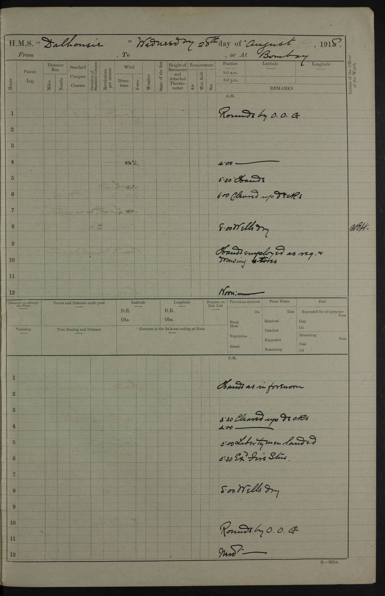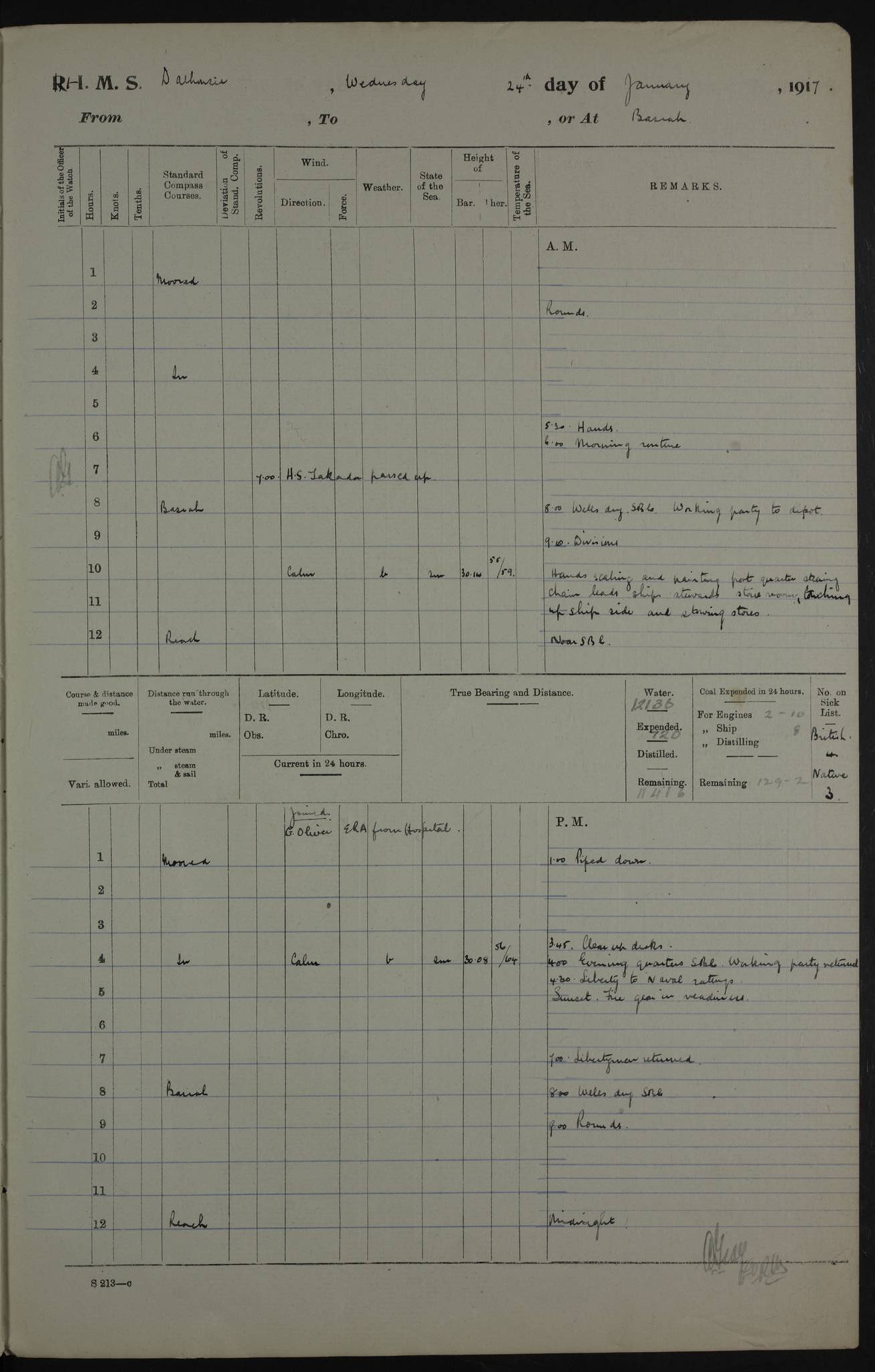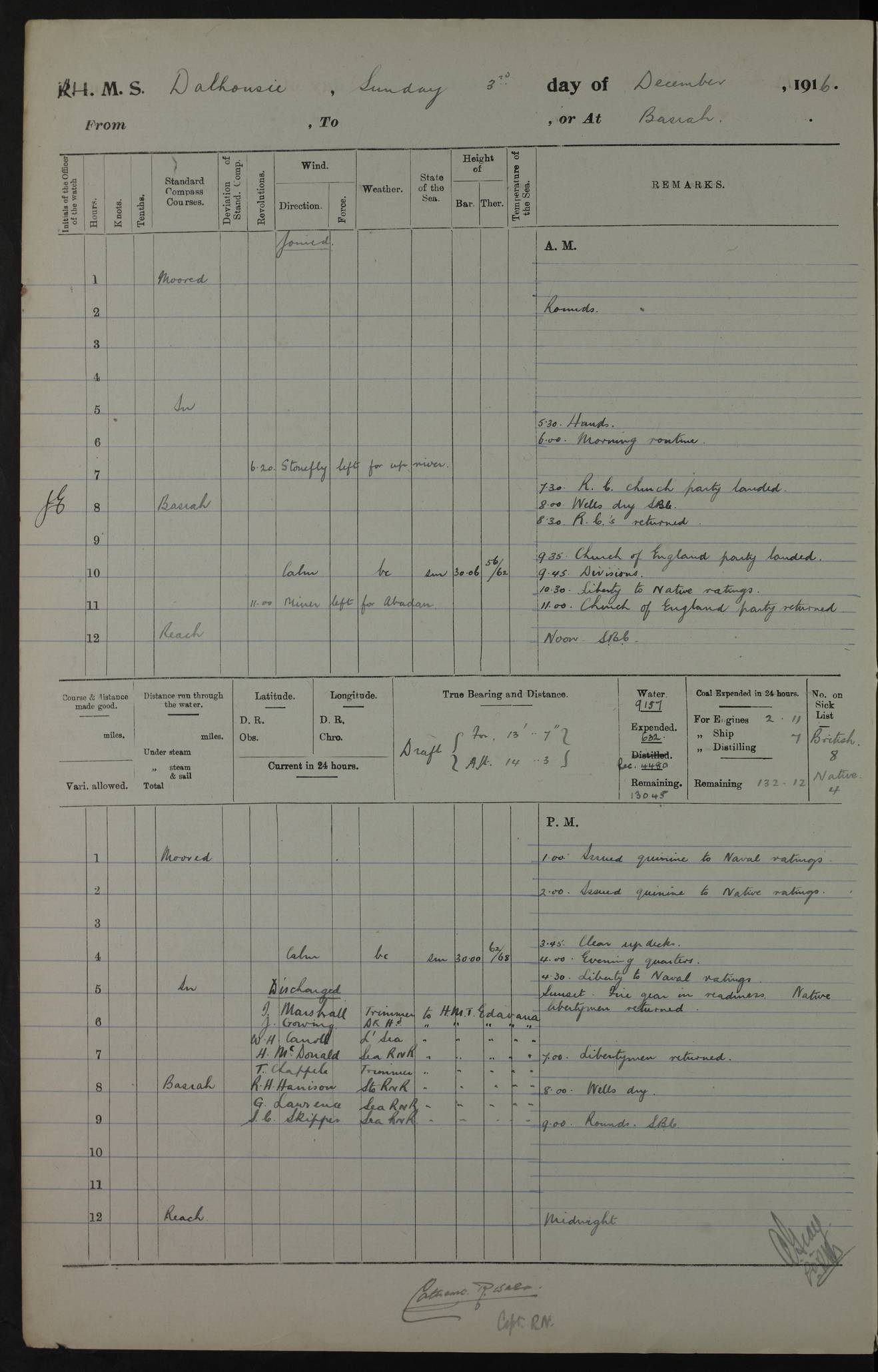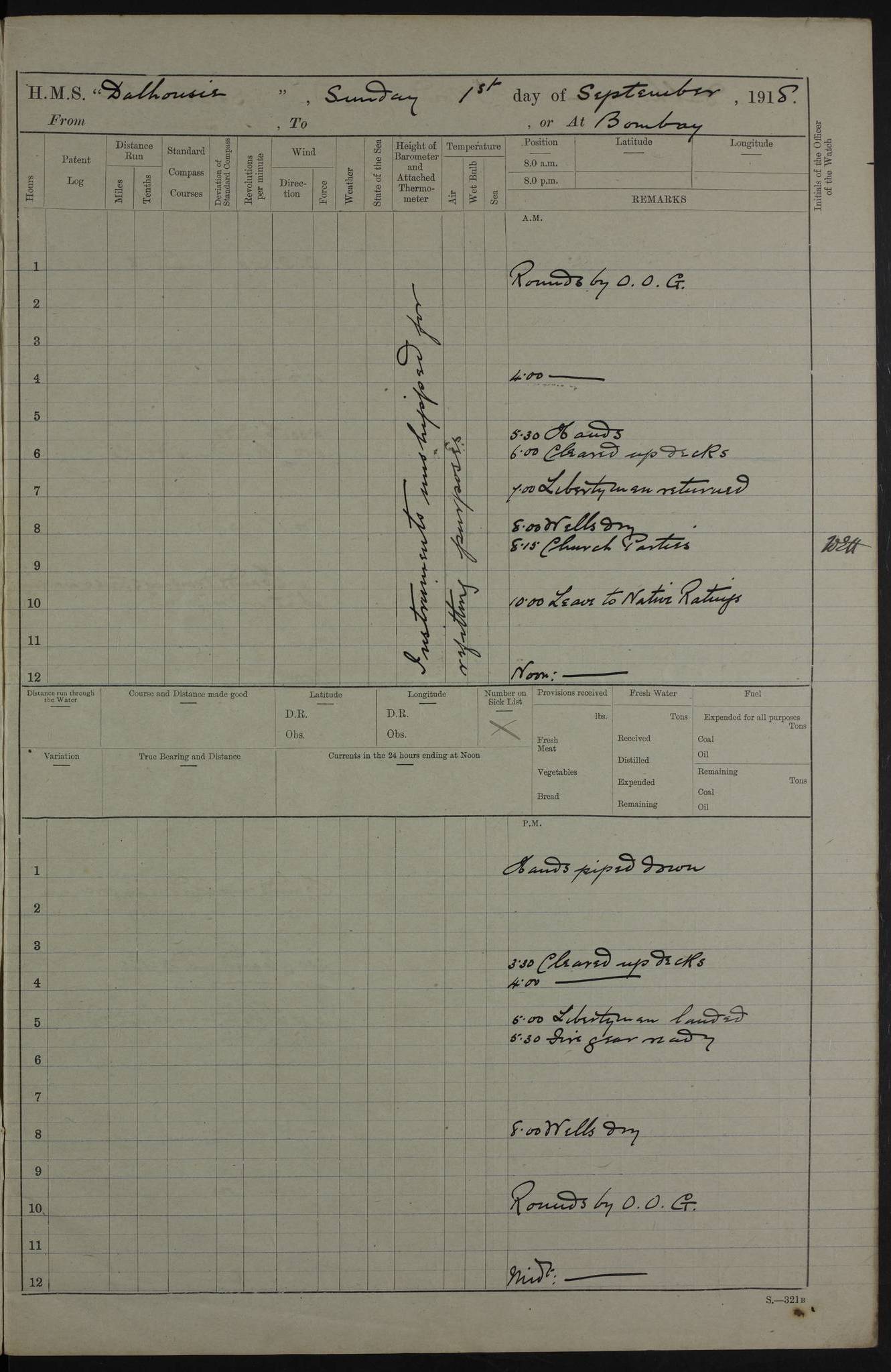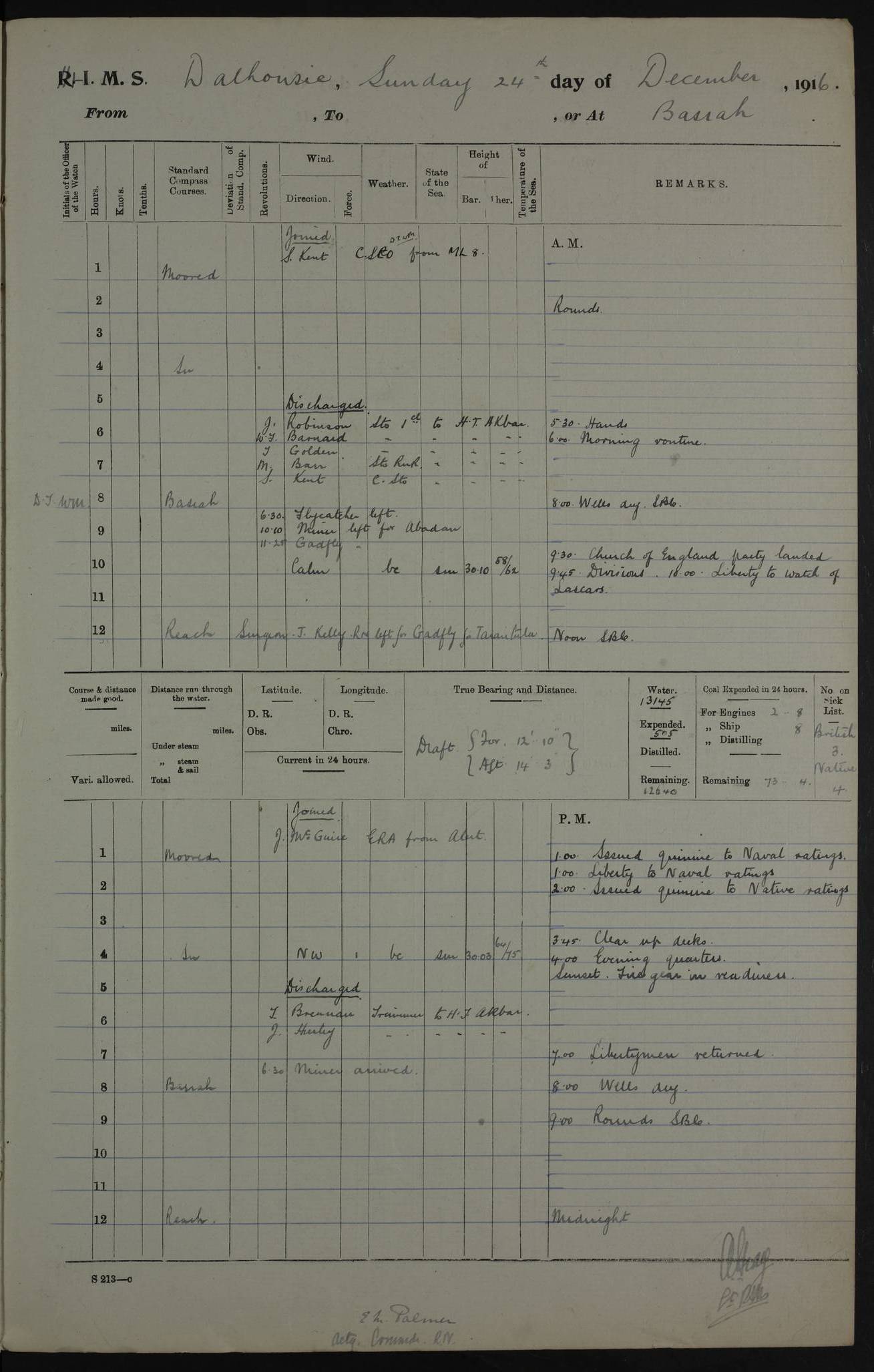 4ef4fafce53e0a0c91005931: (https://s3.amazonaws.com:443/oldweather/ADM53-39406/0015_1.jpg) 27 October 1917 Place: Basrah Lat 30.5269, Long 47.8407 2:00am: Rounds 6:00am: Hands - Morning Routine 7:00am: Exercised Fire stations 7:45am: Working party to Depot 8:00am: Wells dry - Signal Books correct 10:00am: Hands employed cleaning ship 12:00pm: Signal Books correct – Working party returned 1:00pm: Hands piped down 1:30pm: Liberty to Naval Ratings 3:45pm: Cleared up decks 4:00pm: Evening Quarters – Signal Books correct 5:15pm: Liberty to Naval Ratings 6:00pm: Sunset - Fire Gear in readiness 7:30pm: Liberty men returned 8:00pm: Wells dry - Signal Books correct 9:00pm: Rounds – Signal Books correct AM – Discharged To BARALA: W Denyer, Able Seaman - A Childs, Able Seaman - H Beckham Seaman - N Murray Seaman PM - Discharged To SCARAB: A Bushill, Senior Petty Officer - H Garth, Signalman To TARANTULA: G Campbell, Ship’s Steward Assistant 4ef4fafde53e0a0c91005932: (https://s3.amazonaws.com:443/oldweather/ADM53-39406/0016_0.jpg) 28 October 1917 Place: Basrah Lat 30.5269, Long 47.8407 2:00am: Rounds 5:30am: Hands 6:00am: Morning Routine 7:00am: Roman Catholic Church party landed 8:00am: Wells dry – Signal Books correct – Roman Catholics returned - Working party to Depot 8:30am: Church of England party to PROSERPINE 8:45am: Wesleyans landed 9:45am: Church parties returned - Divisions 10:30am: Liberty to Native Ratings 12:00pm: Signal Books correct – Working party returned 1:00pm: Issued Quinine to Naval Ratings- Issued Quinine to Native Ratings 1:30pm: Liberty to Naval ratings 3:45pm: Cleared up decks 4:00pm: Evening Quarters – Signal Books correct 5:15pm: Liberty to Naval Ratings 6:00pm: Sunset - Fire Gear in readiness 7:30pm: Liberty men returned 8:00pm: Wells dry - Signal Books correct 9:00pm: Rounds – Signal Books correct AM – Discharged To GRAYFLY: E.C. Shepherd, Petty Officer - W Hill, Able Seaman - Q Cox, Able Seaman - H Murphy, Able Seaman - A Taylor Telegrapher PM – Joined From SCARAB: J.G. Cooper, Stoker From Admiral’s House: Dounleg bin Eulog, Seedie PM - Discharged To ELEPHANTA: Alex de Souza, Officer's Steward To SCARAB: A Hatchard, Stoker To FIREFLY: W Burke, Stoker To Admiral’s House: Abrahim bin Shambi, Seedie
