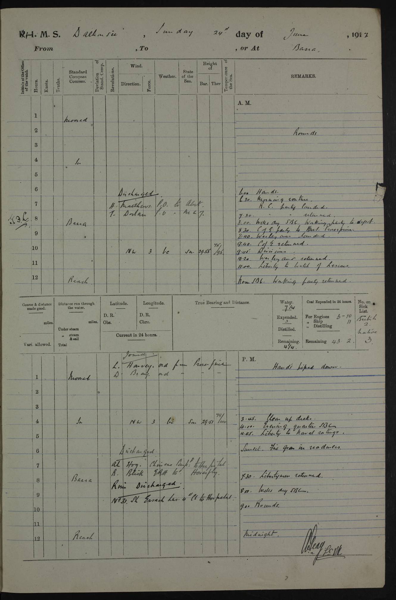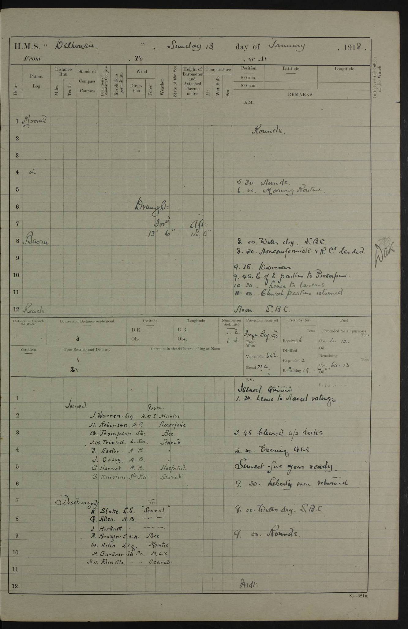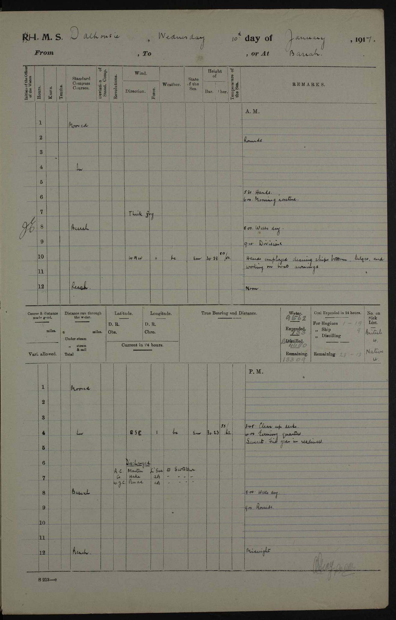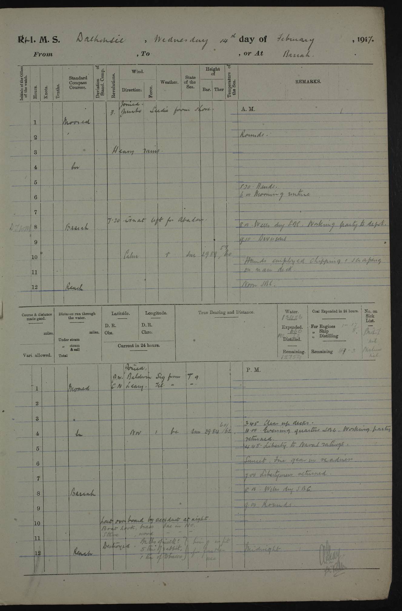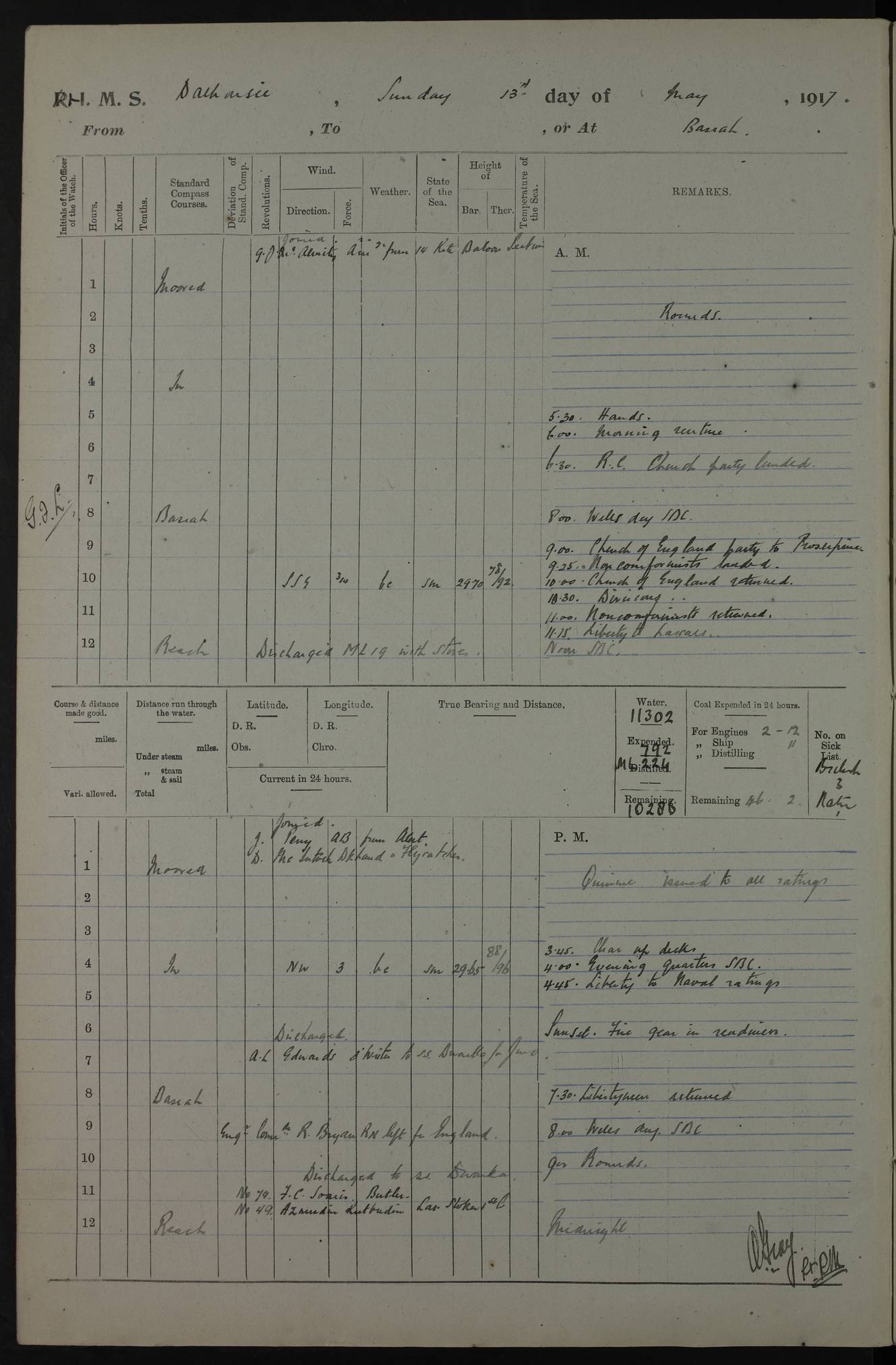 4ef4fafce53e0a0c91005931: (https://s3.amazonaws.com:443/oldweather/ADM53-39406/0015_1.jpg) 27 October 1917 Place: Basrah Lat 30.5269, Long 47.8407 2:00am: Rounds 6:00am: Hands - Morning Routine 7:00am: Exercised Fire stations 7:45am: Working party to Depot 8:00am: Wells dry - Signal Books correct 10:00am: Hands employed cleaning ship 12:00pm: Signal Books correct – Working party returned 1:00pm: Hands piped down 1:30pm: Liberty to Naval Ratings 3:45pm: Cleared up decks 4:00pm: Evening Quarters – Signal Books correct 5:15pm: Liberty to Naval Ratings 6:00pm: Sunset - Fire Gear in readiness 7:30pm: Liberty men returned 8:00pm: Wells dry - Signal Books correct 9:00pm: Rounds – Signal Books correct AM – Discharged To BARALA: W Denyer, Able Seaman - A Childs, Able Seaman - H Beckham Seaman - N Murray Seaman PM - Discharged To SCARAB: A Bushill, Senior Petty Officer - H Garth, Signalman To TARANTULA: G Campbell, Ship’s Steward Assistant 4ef4fafde53e0a0c91005932: (https://s3.amazonaws.com:443/oldweather/ADM53-39406/0016_0.jpg) 28 October 1917 Place: Basrah Lat 30.5269, Long 47.8407 2:00am: Rounds 5:30am: Hands 6:00am: Morning Routine 7:00am: Roman Catholic Church party landed 8:00am: Wells dry – Signal Books correct – Roman Catholics returned - Working party to Depot 8:30am: Church of England party to PROSERPINE 8:45am: Wesleyans landed 9:45am: Church parties returned - Divisions 10:30am: Liberty to Native Ratings 12:00pm: Signal Books correct – Working party returned 1:00pm: Issued Quinine to Naval Ratings- Issued Quinine to Native Ratings 1:30pm: Liberty to Naval ratings 3:45pm: Cleared up decks 4:00pm: Evening Quarters – Signal Books correct 5:15pm: Liberty to Naval Ratings 6:00pm: Sunset - Fire Gear in readiness 7:30pm: Liberty men returned 8:00pm: Wells dry - Signal Books correct 9:00pm: Rounds – Signal Books correct AM – Discharged To GRAYFLY: E.C. Shepherd, Petty Officer - W Hill, Able Seaman - Q Cox, Able Seaman - H Murphy, Able Seaman - A Taylor Telegrapher PM – Joined From SCARAB: J.G. Cooper, Stoker From Admiral’s House: Dounleg bin Eulog, Seedie PM - Discharged To ELEPHANTA: Alex de Souza, Officer's Steward To SCARAB: A Hatchard, Stoker To FIREFLY: W Burke, Stoker To Admiral’s House: Abrahim bin Shambi, Seedie