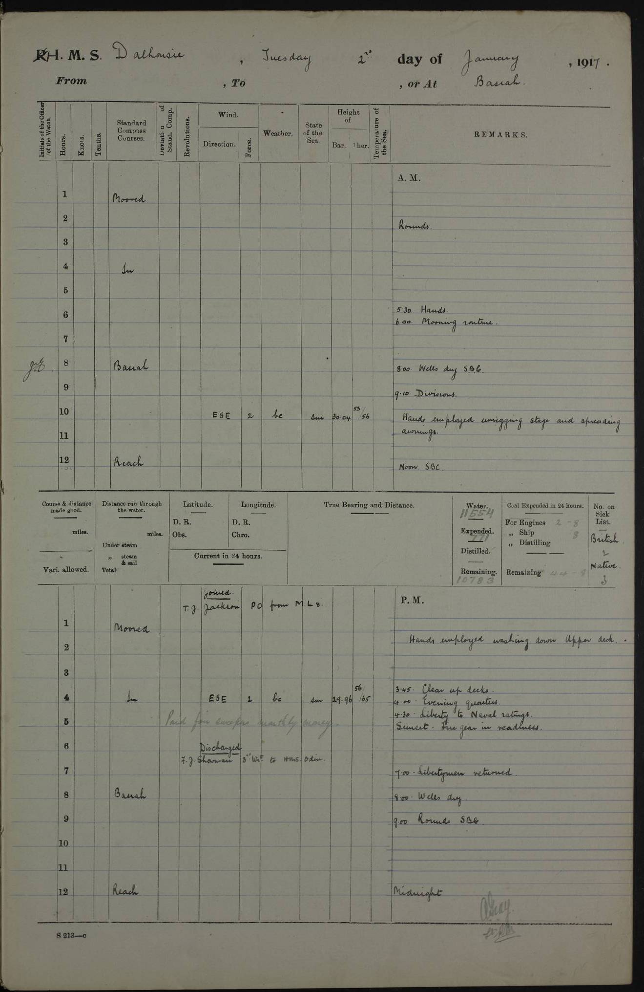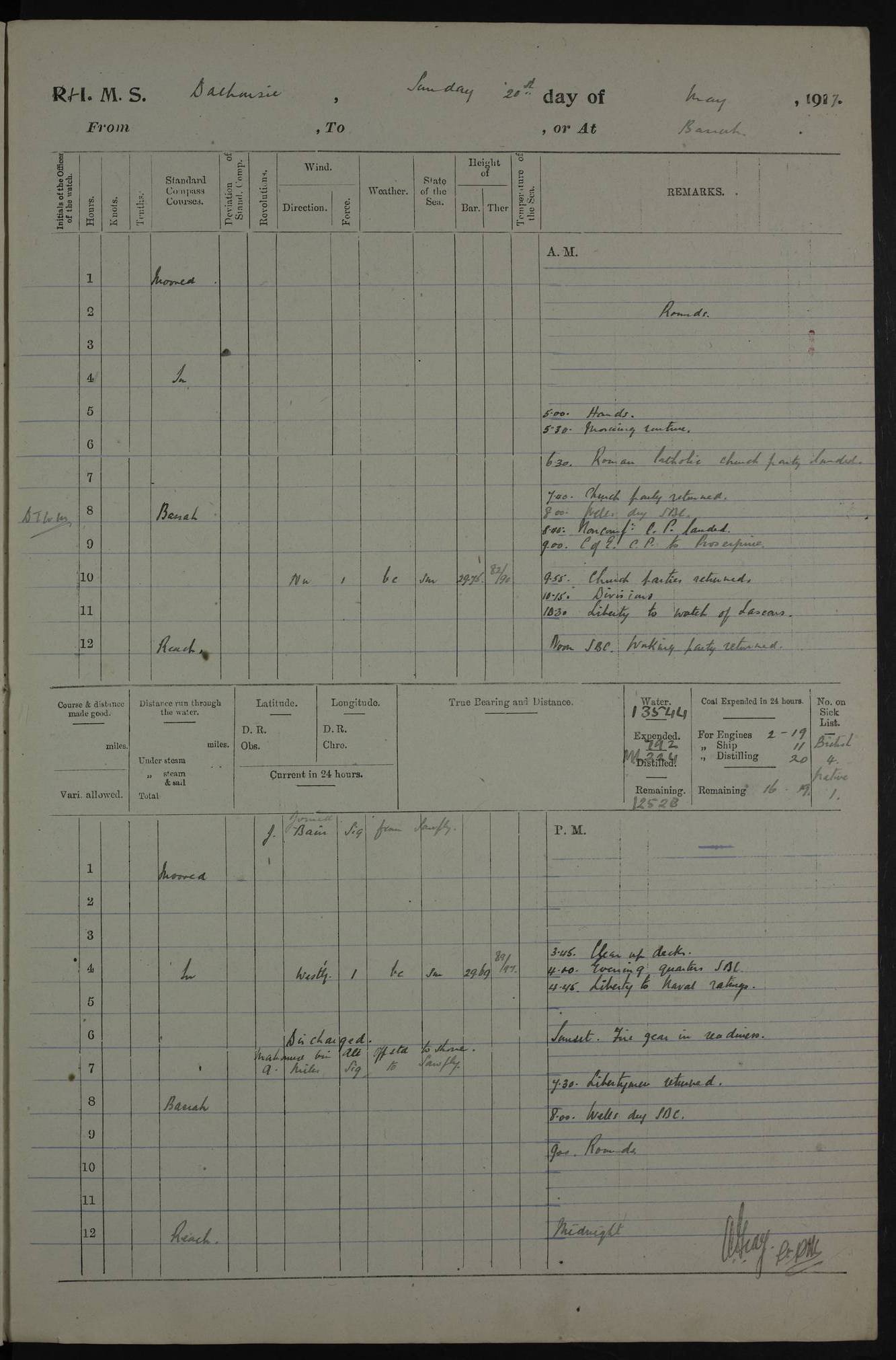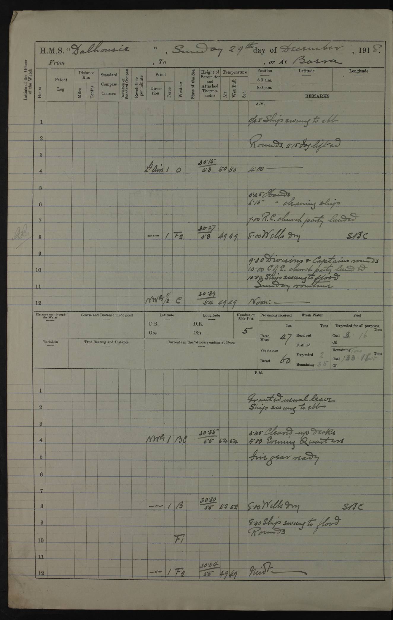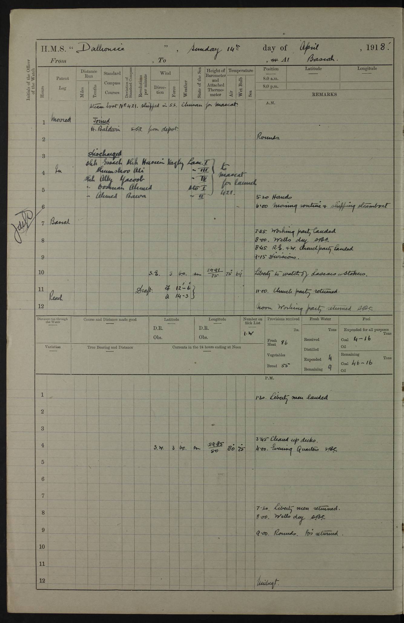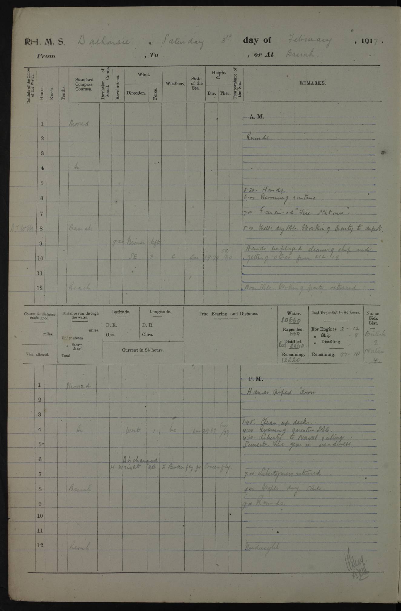 4ef4fafce53e0a0c91005931: (https://s3.amazonaws.com:443/oldweather/ADM53-39406/0015_1.jpg) 27 October 1917 Place: Basrah Lat 30.5269, Long 47.8407 2:00am: Rounds 6:00am: Hands - Morning Routine 7:00am: Exercised Fire stations 7:45am: Working party to Depot 8:00am: Wells dry - Signal Books correct 10:00am: Hands employed cleaning ship 12:00pm: Signal Books correct – Working party returned 1:00pm: Hands piped down 1:30pm: Liberty to Naval Ratings 3:45pm: Cleared up decks 4:00pm: Evening Quarters – Signal Books correct 5:15pm: Liberty to Naval Ratings 6:00pm: Sunset - Fire Gear in readiness 7:30pm: Liberty men returned 8:00pm: Wells dry - Signal Books correct 9:00pm: Rounds – Signal Books correct AM – Discharged To BARALA: W Denyer, Able Seaman - A Childs, Able Seaman - H Beckham Seaman - N Murray Seaman PM - Discharged To SCARAB: A Bushill, Senior Petty Officer - H Garth, Signalman To TARANTULA: G Campbell, Ship’s Steward Assistant 4ef4fafde53e0a0c91005932: (https://s3.amazonaws.com:443/oldweather/ADM53-39406/0016_0.jpg) 28 October 1917 Place: Basrah Lat 30.5269, Long 47.8407 2:00am: Rounds 5:30am: Hands 6:00am: Morning Routine 7:00am: Roman Catholic Church party landed 8:00am: Wells dry – Signal Books correct – Roman Catholics returned - Working party to Depot 8:30am: Church of England party to PROSERPINE 8:45am: Wesleyans landed 9:45am: Church parties returned - Divisions 10:30am: Liberty to Native Ratings 12:00pm: Signal Books correct – Working party returned 1:00pm: Issued Quinine to Naval Ratings- Issued Quinine to Native Ratings 1:30pm: Liberty to Naval ratings 3:45pm: Cleared up decks 4:00pm: Evening Quarters – Signal Books correct 5:15pm: Liberty to Naval Ratings 6:00pm: Sunset - Fire Gear in readiness 7:30pm: Liberty men returned 8:00pm: Wells dry - Signal Books correct 9:00pm: Rounds – Signal Books correct AM – Discharged To GRAYFLY: E.C. Shepherd, Petty Officer - W Hill, Able Seaman - Q Cox, Able Seaman - H Murphy, Able Seaman - A Taylor Telegrapher PM – Joined From SCARAB: J.G. Cooper, Stoker From Admiral’s House: Dounleg bin Eulog, Seedie PM - Discharged To ELEPHANTA: Alex de Souza, Officer's Steward To SCARAB: A Hatchard, Stoker To FIREFLY: W Burke, Stoker To Admiral’s House: Abrahim bin Shambi, Seedie
