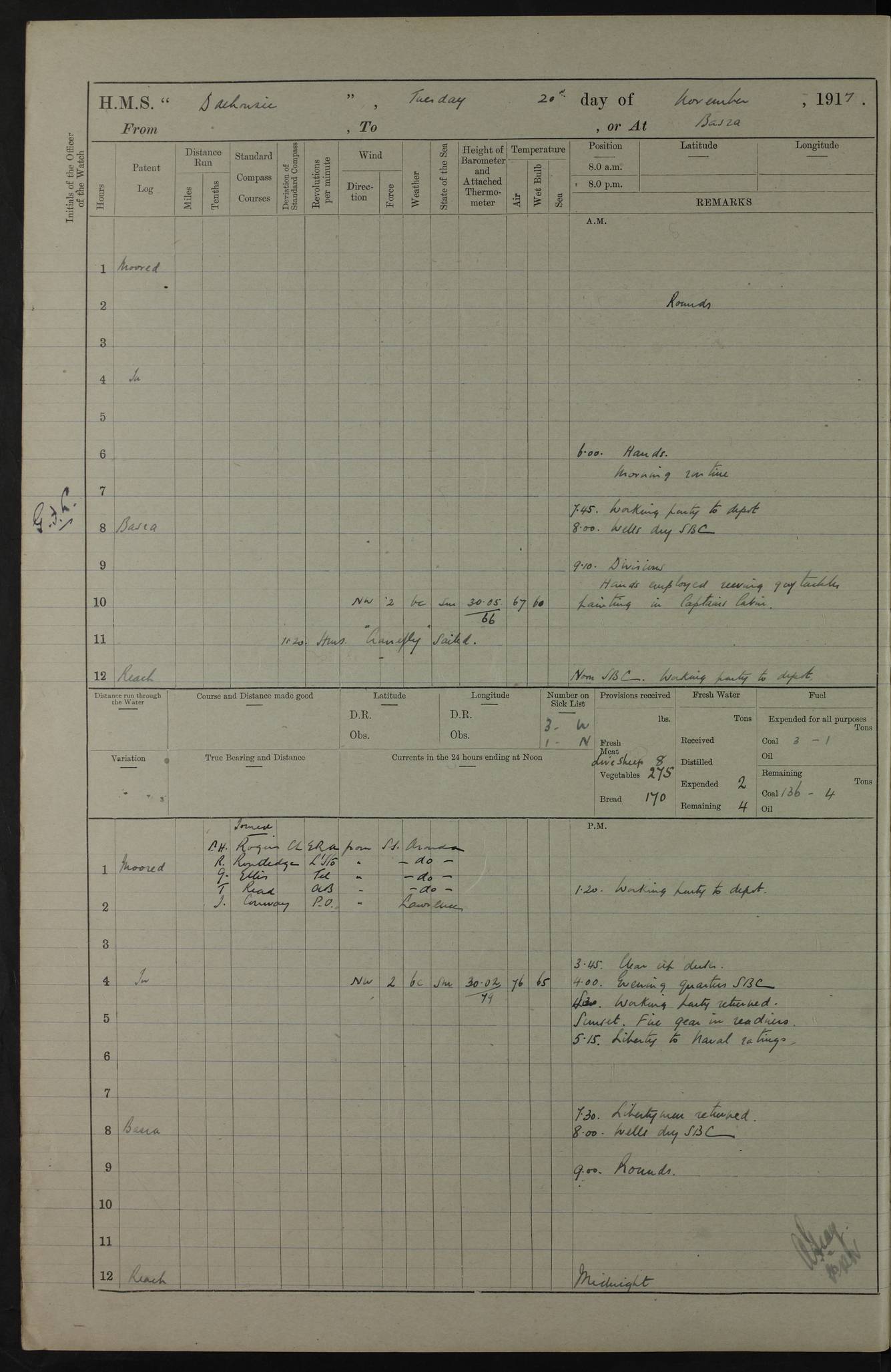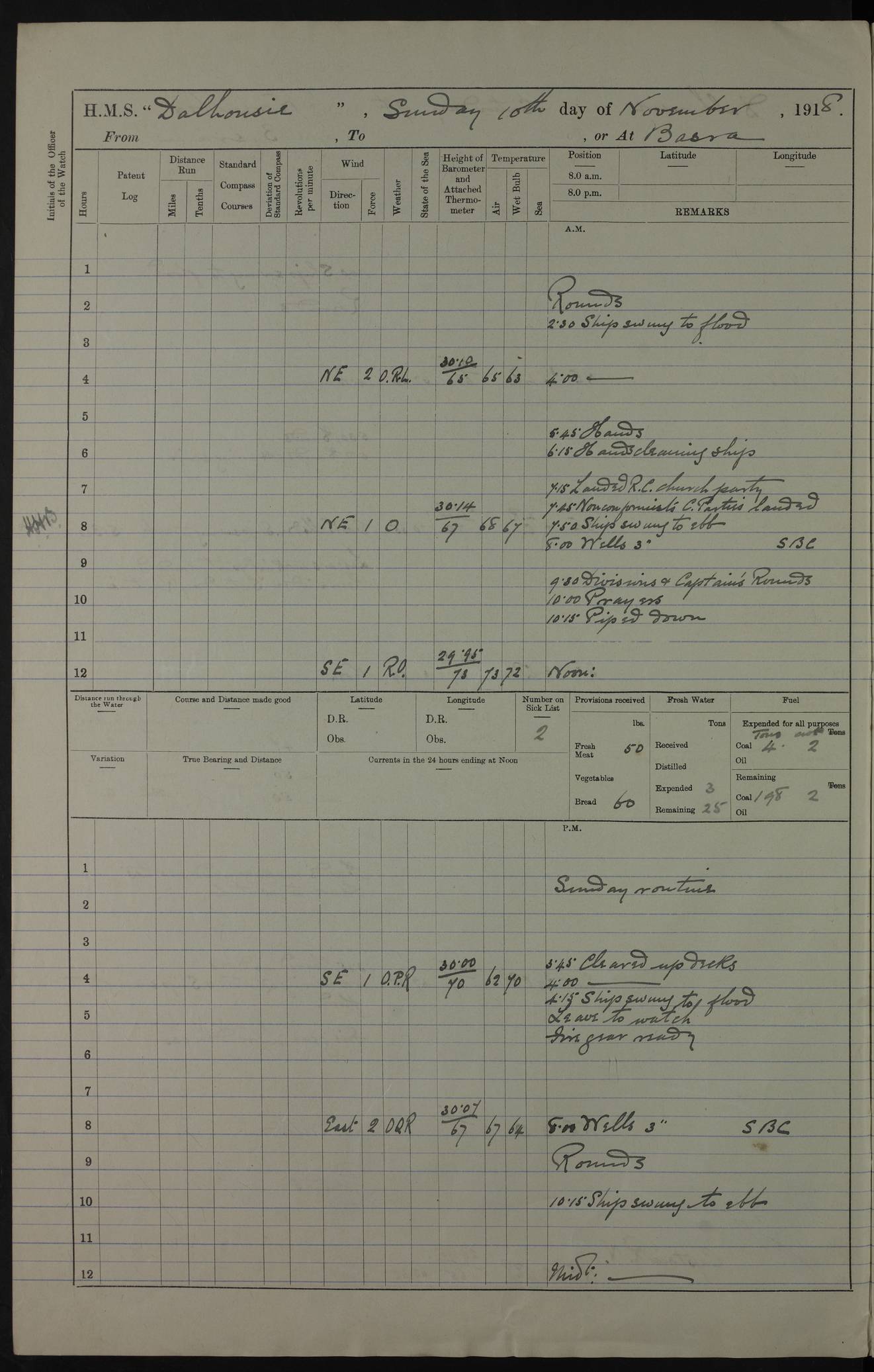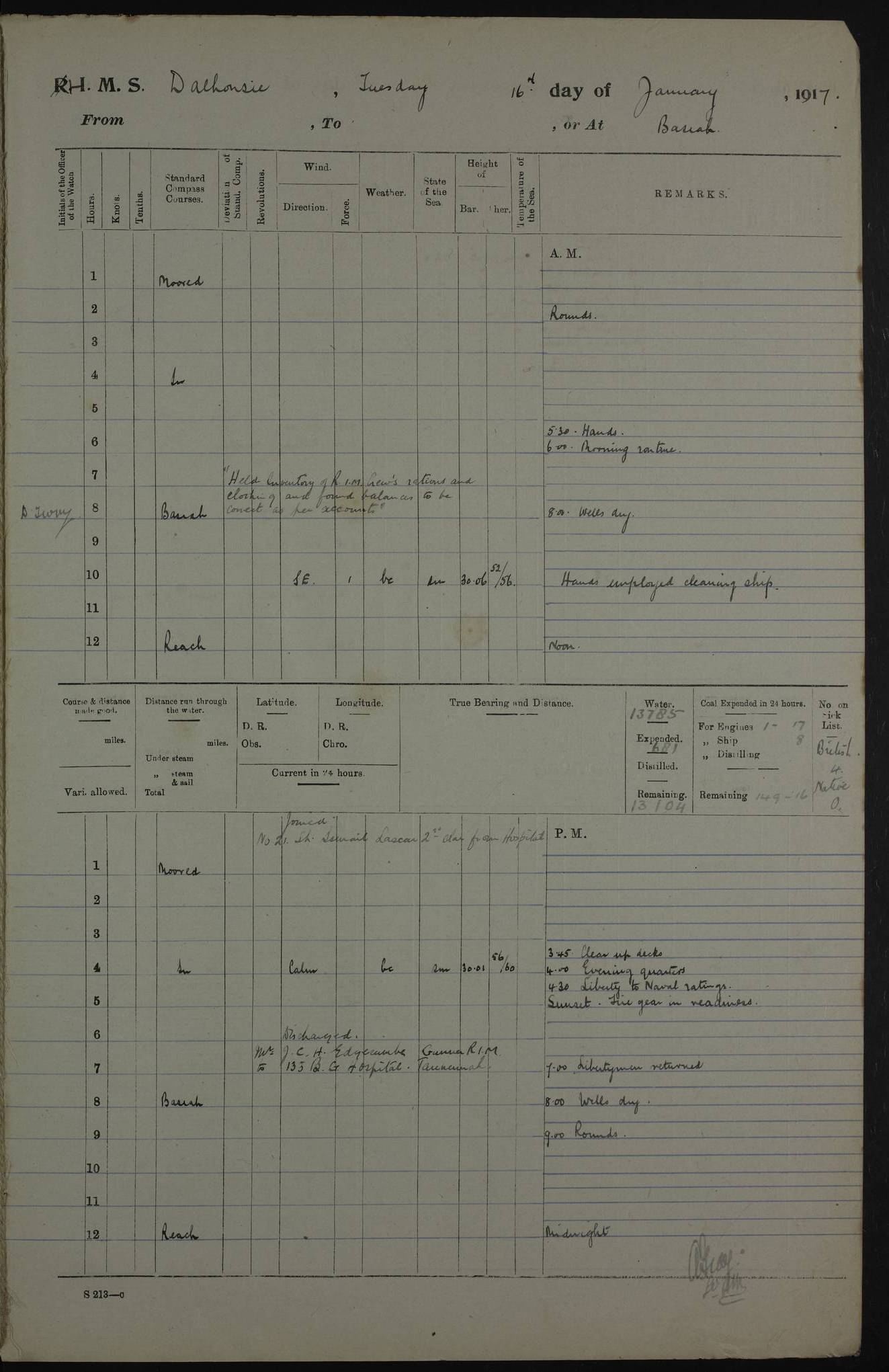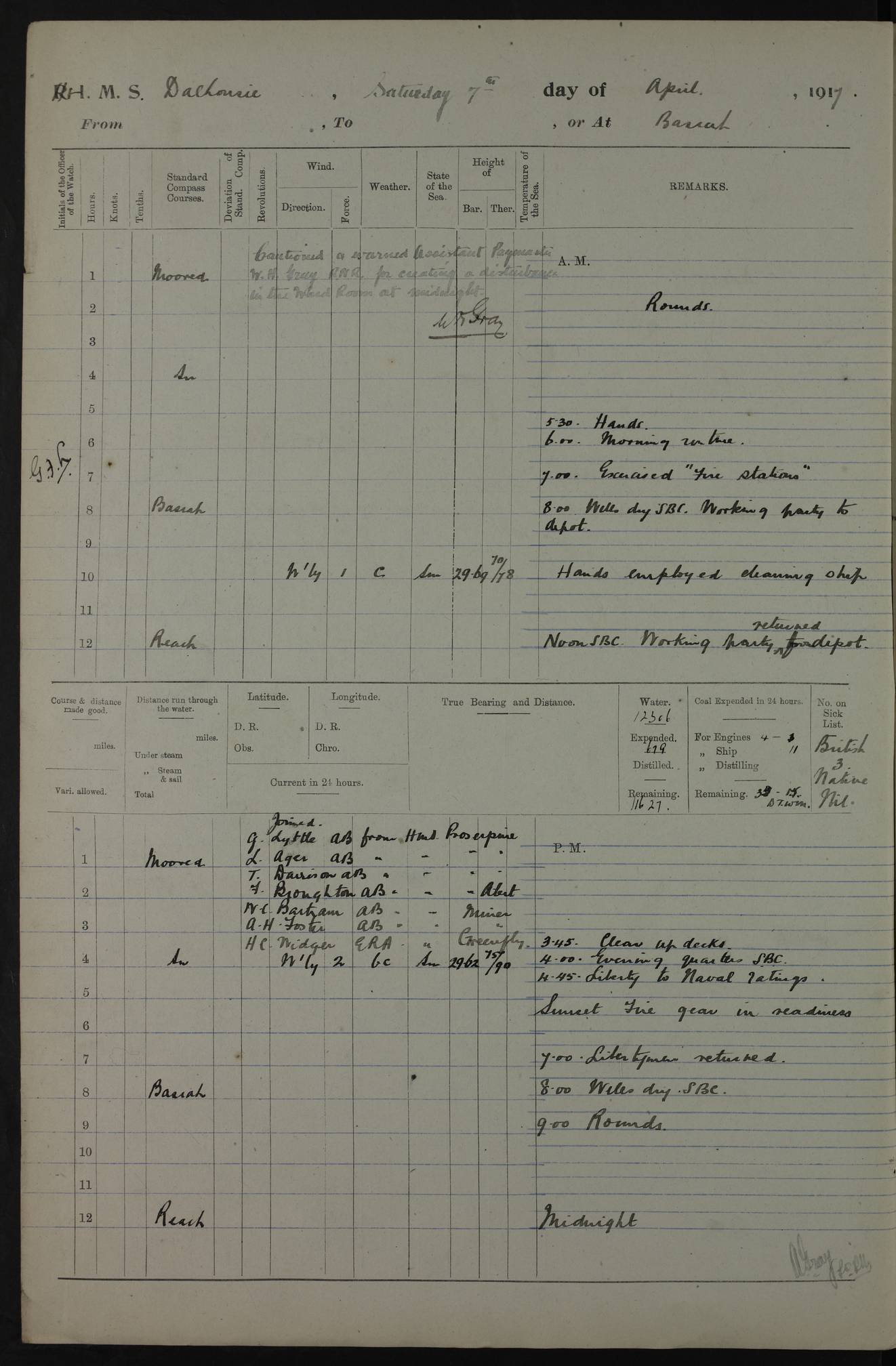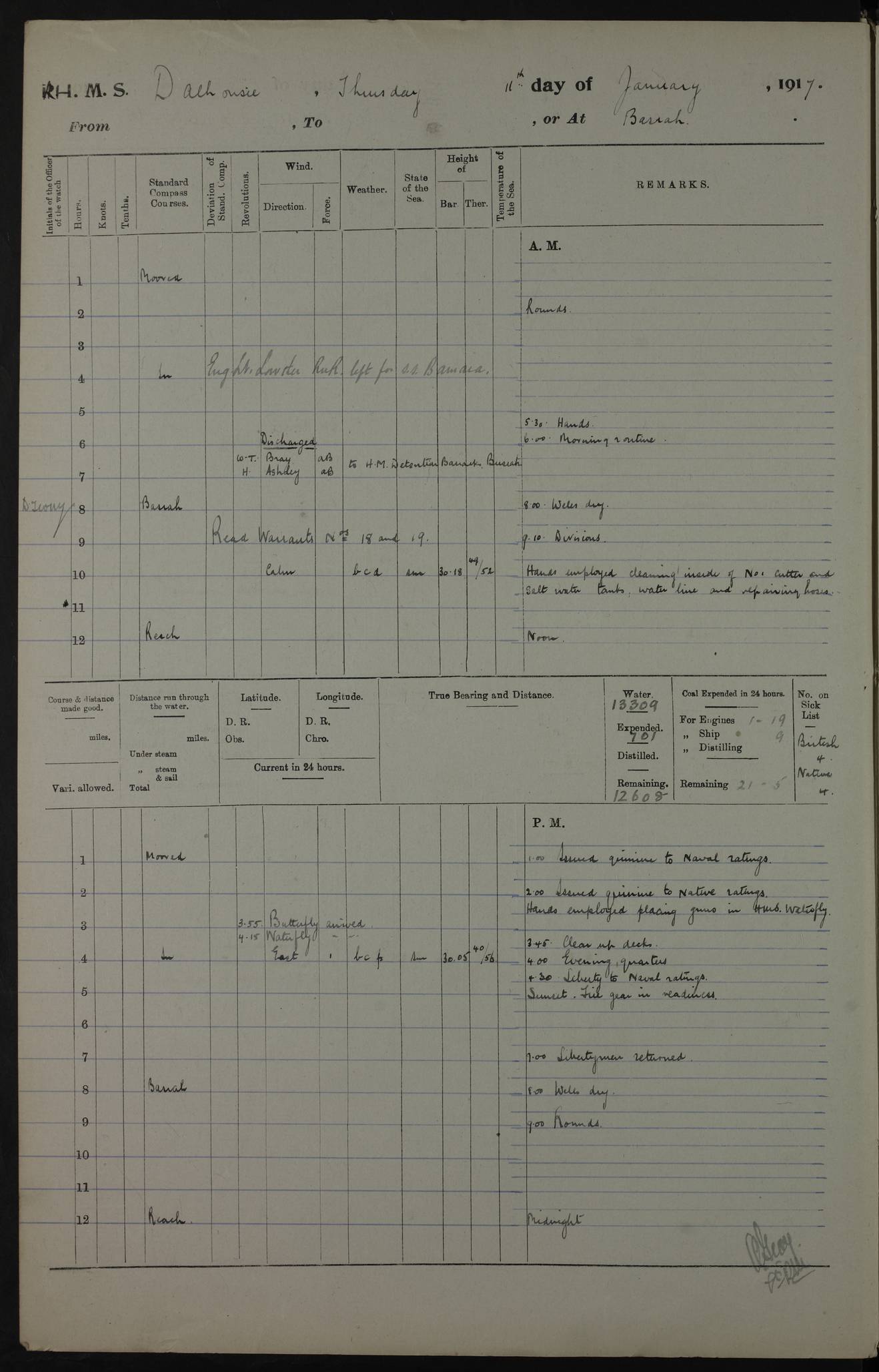 4ef4fafce53e0a0c91005931: (https://s3.amazonaws.com:443/oldweather/ADM53-39406/0015_1.jpg) 27 October 1917 Place: Basrah Lat 30.5269, Long 47.8407 2:00am: Rounds 6:00am: Hands - Morning Routine 7:00am: Exercised Fire stations 7:45am: Working party to Depot 8:00am: Wells dry - Signal Books correct 10:00am: Hands employed cleaning ship 12:00pm: Signal Books correct – Working party returned 1:00pm: Hands piped down 1:30pm: Liberty to Naval Ratings 3:45pm: Cleared up decks 4:00pm: Evening Quarters – Signal Books correct 5:15pm: Liberty to Naval Ratings 6:00pm: Sunset - Fire Gear in readiness 7:30pm: Liberty men returned 8:00pm: Wells dry - Signal Books correct 9:00pm: Rounds – Signal Books correct AM – Discharged To BARALA: W Denyer, Able Seaman - A Childs, Able Seaman - H Beckham Seaman - N Murray Seaman PM - Discharged To SCARAB: A Bushill, Senior Petty Officer - H Garth, Signalman To TARANTULA: G Campbell, Ship’s Steward Assistant 4ef4fafde53e0a0c91005932: (https://s3.amazonaws.com:443/oldweather/ADM53-39406/0016_0.jpg) 28 October 1917 Place: Basrah Lat 30.5269, Long 47.8407 2:00am: Rounds 5:30am: Hands 6:00am: Morning Routine 7:00am: Roman Catholic Church party landed 8:00am: Wells dry – Signal Books correct – Roman Catholics returned - Working party to Depot 8:30am: Church of England party to PROSERPINE 8:45am: Wesleyans landed 9:45am: Church parties returned - Divisions 10:30am: Liberty to Native Ratings 12:00pm: Signal Books correct – Working party returned 1:00pm: Issued Quinine to Naval Ratings- Issued Quinine to Native Ratings 1:30pm: Liberty to Naval ratings 3:45pm: Cleared up decks 4:00pm: Evening Quarters – Signal Books correct 5:15pm: Liberty to Naval Ratings 6:00pm: Sunset - Fire Gear in readiness 7:30pm: Liberty men returned 8:00pm: Wells dry - Signal Books correct 9:00pm: Rounds – Signal Books correct AM – Discharged To GRAYFLY: E.C. Shepherd, Petty Officer - W Hill, Able Seaman - Q Cox, Able Seaman - H Murphy, Able Seaman - A Taylor Telegrapher PM – Joined From SCARAB: J.G. Cooper, Stoker From Admiral’s House: Dounleg bin Eulog, Seedie PM - Discharged To ELEPHANTA: Alex de Souza, Officer's Steward To SCARAB: A Hatchard, Stoker To FIREFLY: W Burke, Stoker To Admiral’s House: Abrahim bin Shambi, Seedie