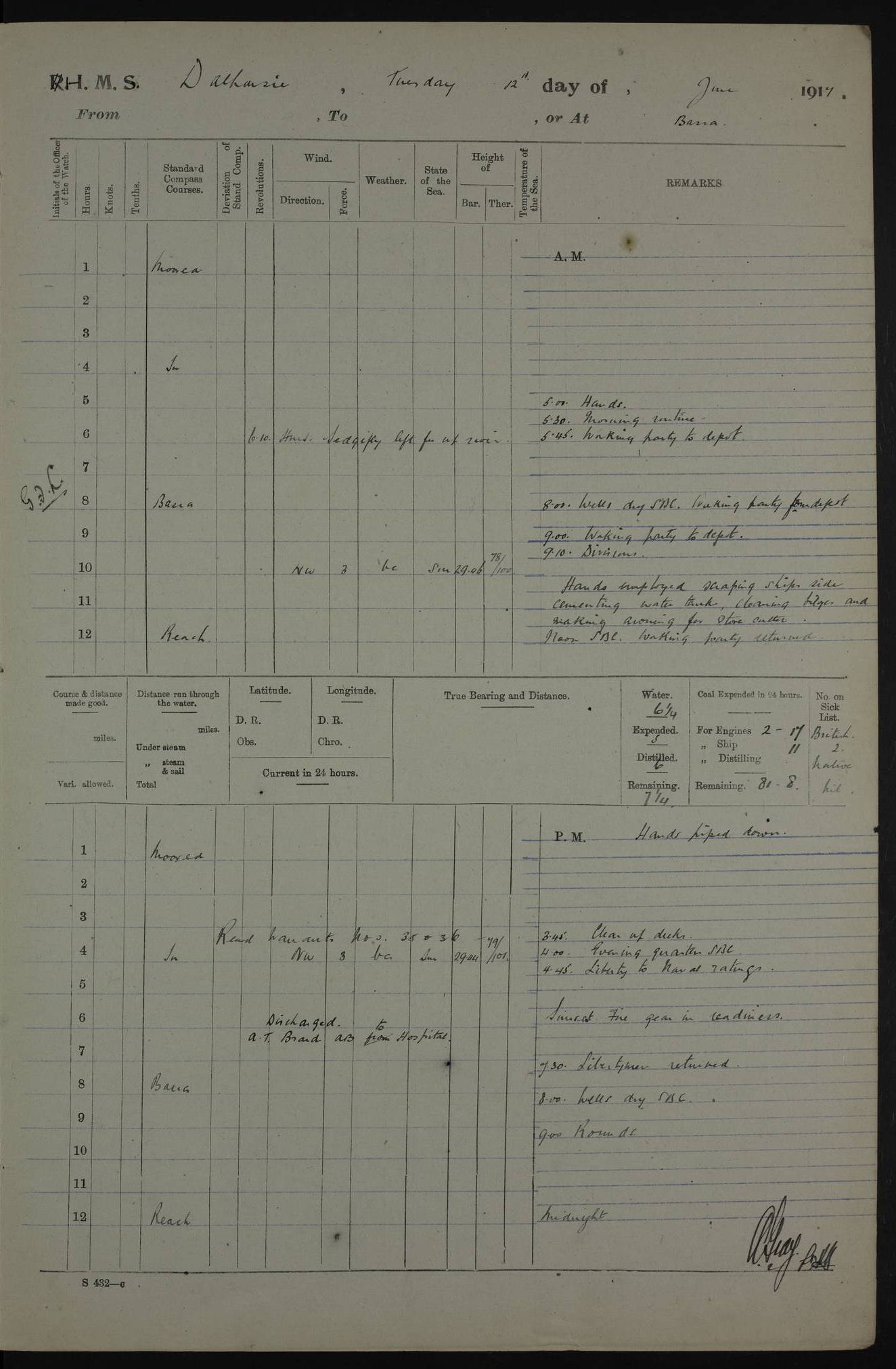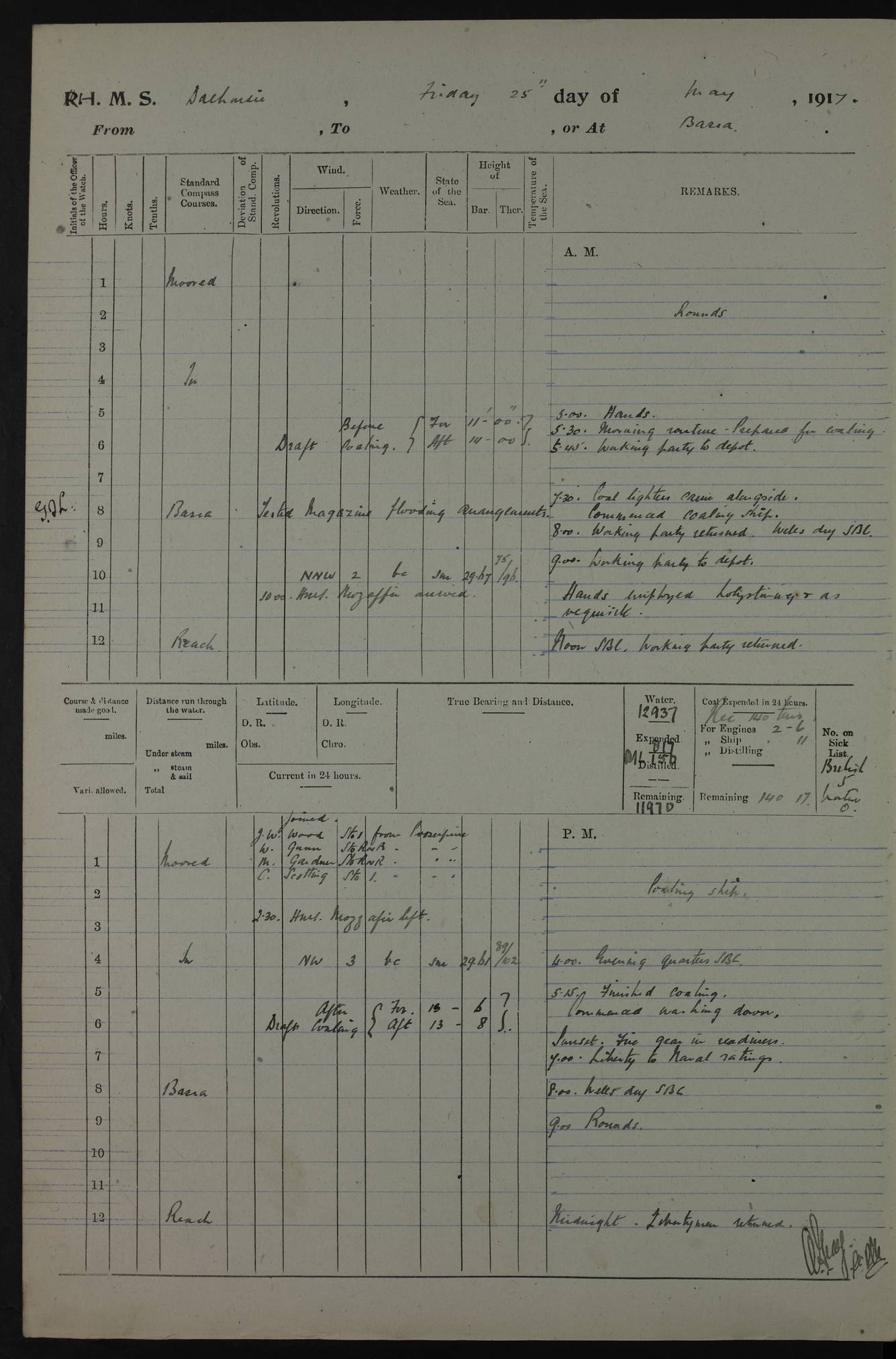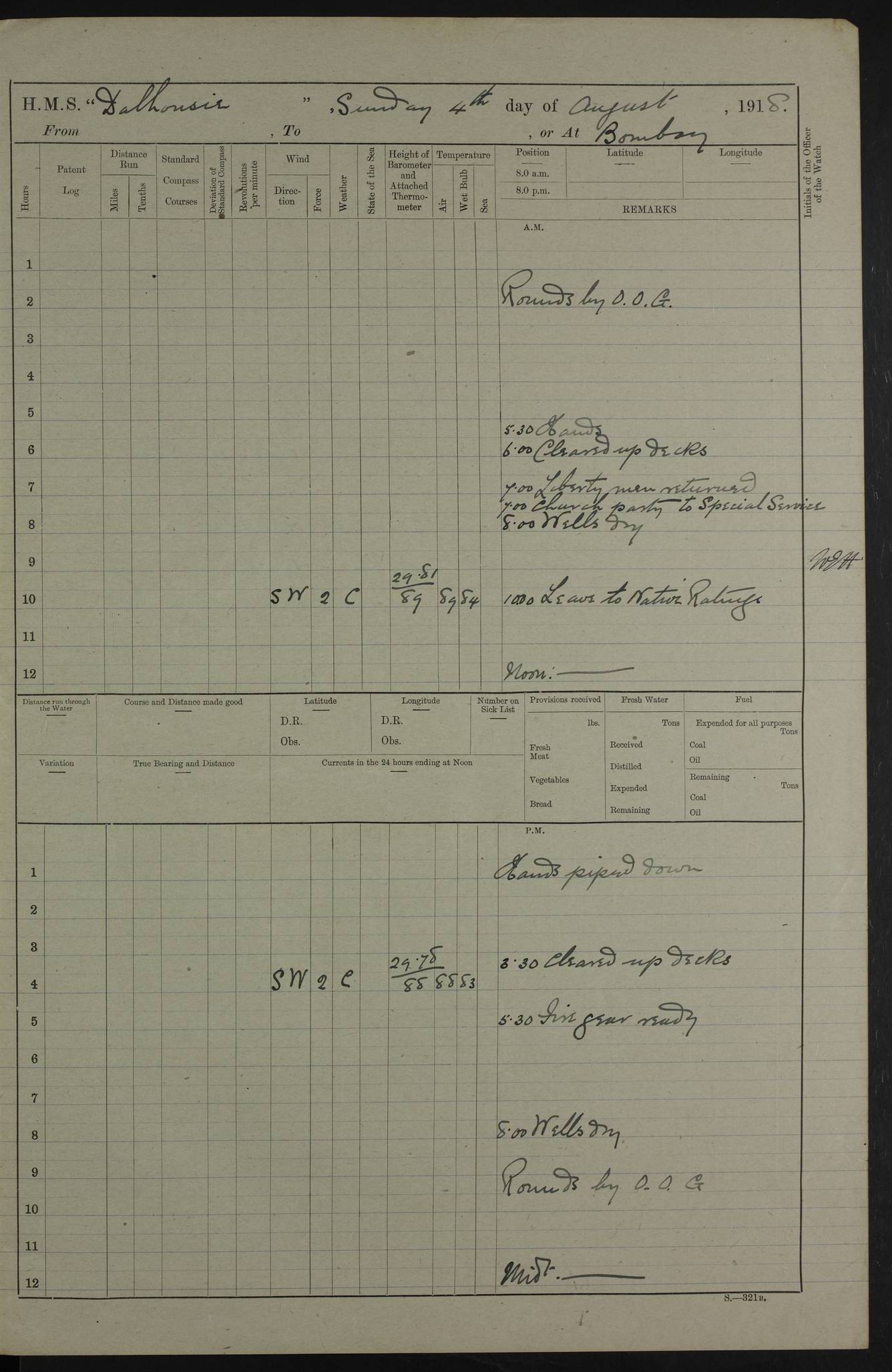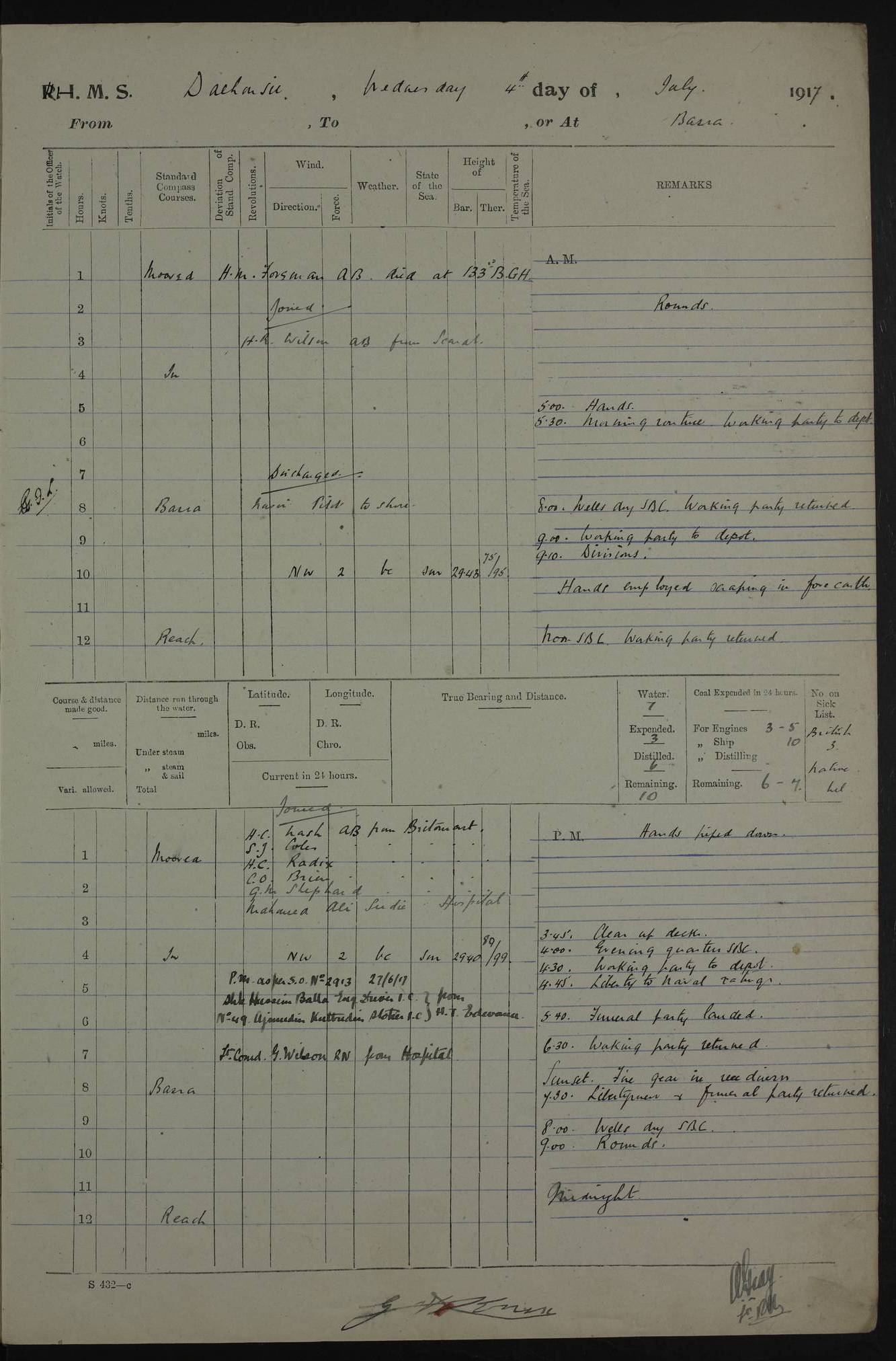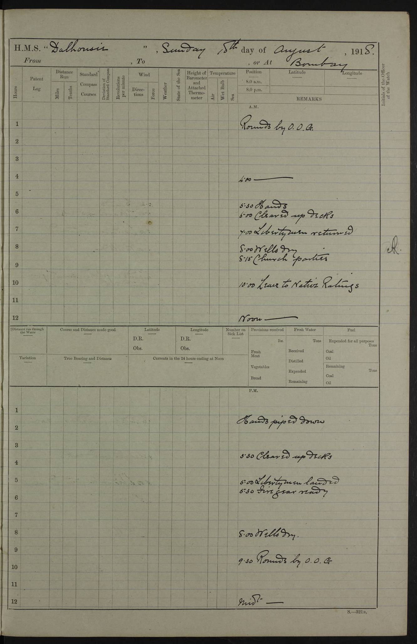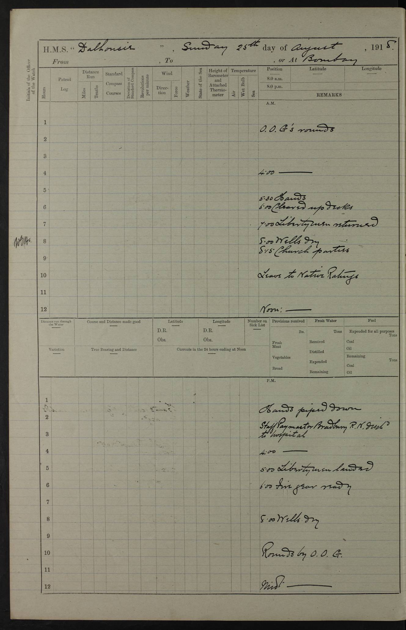 4ef4fafce53e0a0c91005931: (https://s3.amazonaws.com:443/oldweather/ADM53-39406/0015_1.jpg) 27 October 1917 Place: Basrah Lat 30.5269, Long 47.8407 2:00am: Rounds 6:00am: Hands - Morning Routine 7:00am: Exercised Fire stations 7:45am: Working party to Depot 8:00am: Wells dry - Signal Books correct 10:00am: Hands employed cleaning ship 12:00pm: Signal Books correct – Working party returned 1:00pm: Hands piped down 1:30pm: Liberty to Naval Ratings 3:45pm: Cleared up decks 4:00pm: Evening Quarters – Signal Books correct 5:15pm: Liberty to Naval Ratings 6:00pm: Sunset - Fire Gear in readiness 7:30pm: Liberty men returned 8:00pm: Wells dry - Signal Books correct 9:00pm: Rounds – Signal Books correct AM – Discharged To BARALA: W Denyer, Able Seaman - A Childs, Able Seaman - H Beckham Seaman - N Murray Seaman PM - Discharged To SCARAB: A Bushill, Senior Petty Officer - H Garth, Signalman To TARANTULA: G Campbell, Ship’s Steward Assistant 4ef4fafde53e0a0c91005932: (https://s3.amazonaws.com:443/oldweather/ADM53-39406/0016_0.jpg) 28 October 1917 Place: Basrah Lat 30.5269, Long 47.8407 2:00am: Rounds 5:30am: Hands 6:00am: Morning Routine 7:00am: Roman Catholic Church party landed 8:00am: Wells dry – Signal Books correct – Roman Catholics returned - Working party to Depot 8:30am: Church of England party to PROSERPINE 8:45am: Wesleyans landed 9:45am: Church parties returned - Divisions 10:30am: Liberty to Native Ratings 12:00pm: Signal Books correct – Working party returned 1:00pm: Issued Quinine to Naval Ratings- Issued Quinine to Native Ratings 1:30pm: Liberty to Naval ratings 3:45pm: Cleared up decks 4:00pm: Evening Quarters – Signal Books correct 5:15pm: Liberty to Naval Ratings 6:00pm: Sunset - Fire Gear in readiness 7:30pm: Liberty men returned 8:00pm: Wells dry - Signal Books correct 9:00pm: Rounds – Signal Books correct AM – Discharged To GRAYFLY: E.C. Shepherd, Petty Officer - W Hill, Able Seaman - Q Cox, Able Seaman - H Murphy, Able Seaman - A Taylor Telegrapher PM – Joined From SCARAB: J.G. Cooper, Stoker From Admiral’s House: Dounleg bin Eulog, Seedie PM - Discharged To ELEPHANTA: Alex de Souza, Officer's Steward To SCARAB: A Hatchard, Stoker To FIREFLY: W Burke, Stoker To Admiral’s House: Abrahim bin Shambi, Seedie
