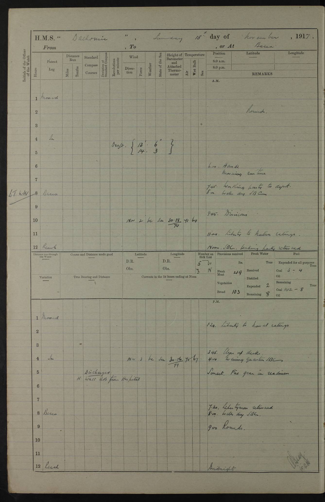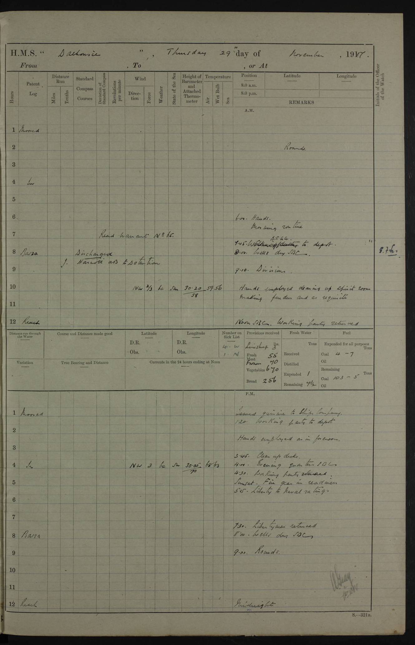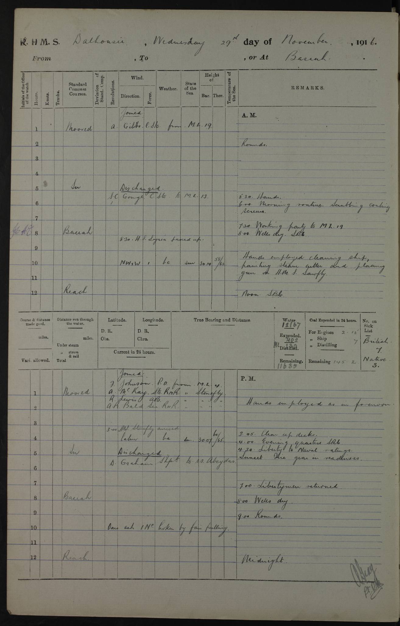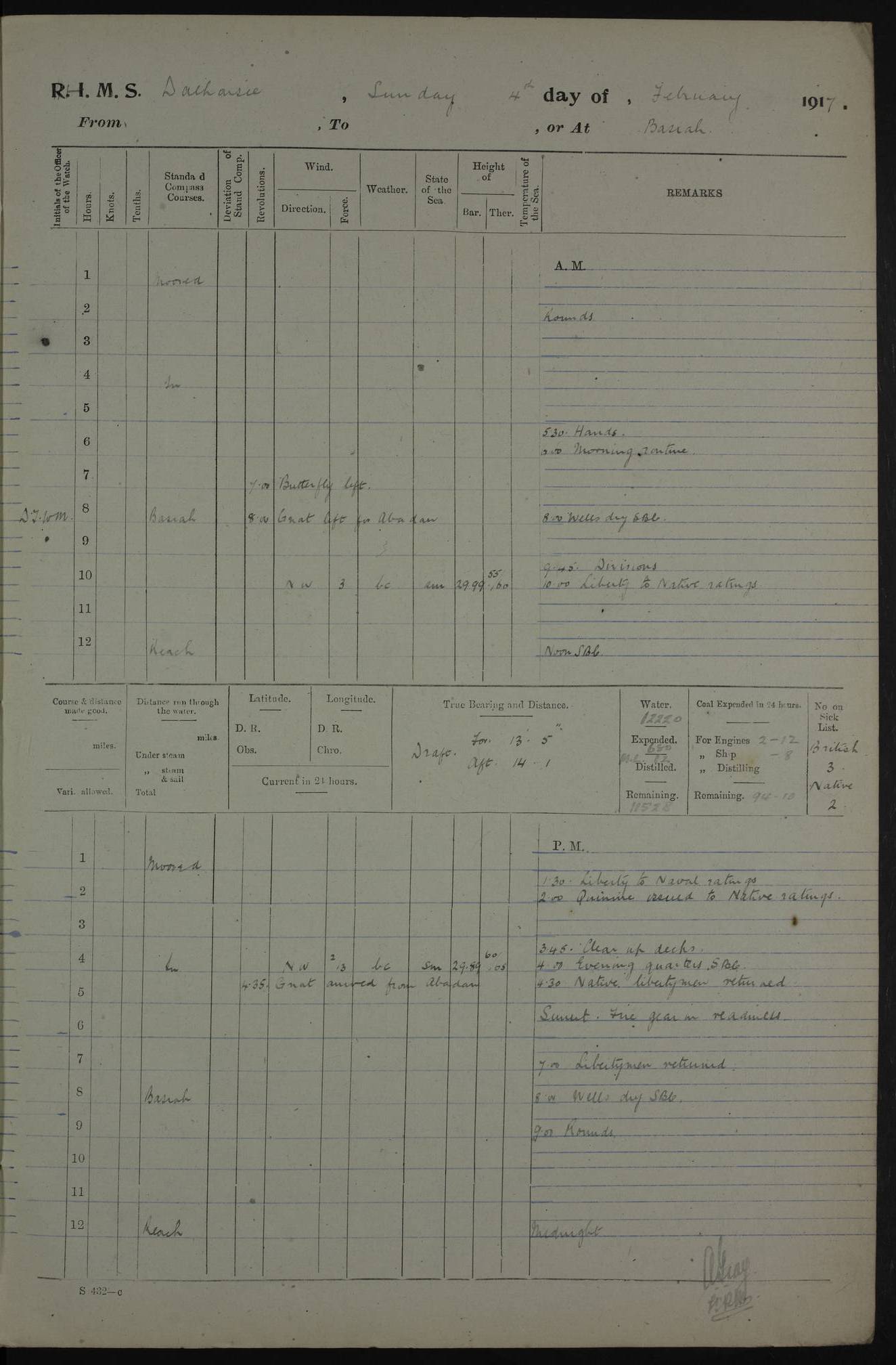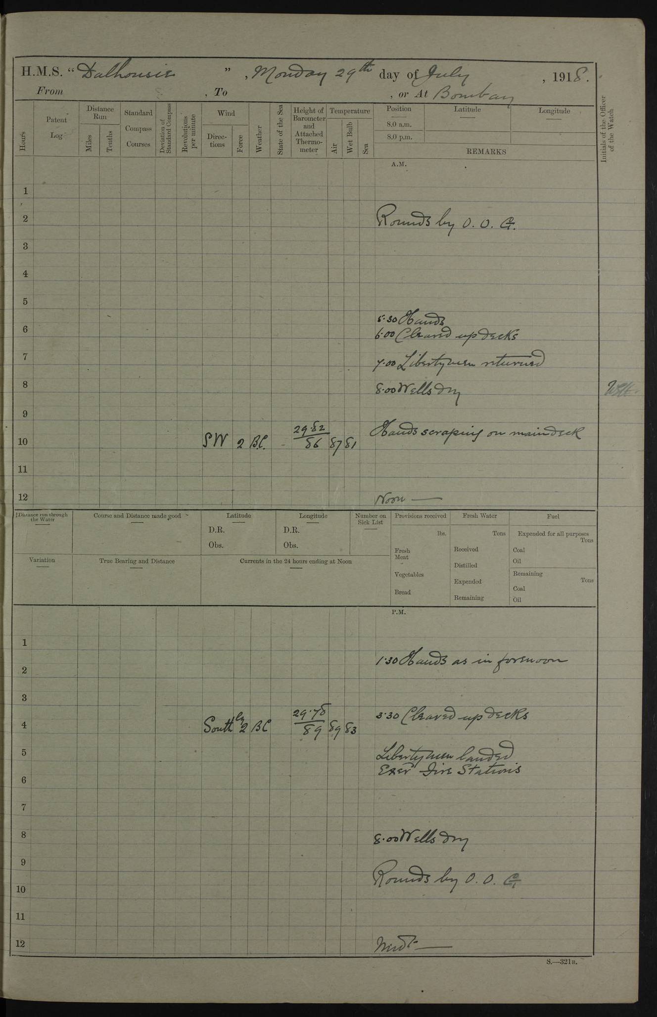 4ef4fafce53e0a0c91005931: (https://s3.amazonaws.com:443/oldweather/ADM53-39406/0015_1.jpg) 27 October 1917 Place: Basrah Lat 30.5269, Long 47.8407 2:00am: Rounds 6:00am: Hands - Morning Routine 7:00am: Exercised Fire stations 7:45am: Working party to Depot 8:00am: Wells dry - Signal Books correct 10:00am: Hands employed cleaning ship 12:00pm: Signal Books correct – Working party returned 1:00pm: Hands piped down 1:30pm: Liberty to Naval Ratings 3:45pm: Cleared up decks 4:00pm: Evening Quarters – Signal Books correct 5:15pm: Liberty to Naval Ratings 6:00pm: Sunset - Fire Gear in readiness 7:30pm: Liberty men returned 8:00pm: Wells dry - Signal Books correct 9:00pm: Rounds – Signal Books correct AM – Discharged To BARALA: W Denyer, Able Seaman - A Childs, Able Seaman - H Beckham Seaman - N Murray Seaman PM - Discharged To SCARAB: A Bushill, Senior Petty Officer - H Garth, Signalman To TARANTULA: G Campbell, Ship’s Steward Assistant 4ef4fafde53e0a0c91005932: (https://s3.amazonaws.com:443/oldweather/ADM53-39406/0016_0.jpg) 28 October 1917 Place: Basrah Lat 30.5269, Long 47.8407 2:00am: Rounds 5:30am: Hands 6:00am: Morning Routine 7:00am: Roman Catholic Church party landed 8:00am: Wells dry – Signal Books correct – Roman Catholics returned - Working party to Depot 8:30am: Church of England party to PROSERPINE 8:45am: Wesleyans landed 9:45am: Church parties returned - Divisions 10:30am: Liberty to Native Ratings 12:00pm: Signal Books correct – Working party returned 1:00pm: Issued Quinine to Naval Ratings- Issued Quinine to Native Ratings 1:30pm: Liberty to Naval ratings 3:45pm: Cleared up decks 4:00pm: Evening Quarters – Signal Books correct 5:15pm: Liberty to Naval Ratings 6:00pm: Sunset - Fire Gear in readiness 7:30pm: Liberty men returned 8:00pm: Wells dry - Signal Books correct 9:00pm: Rounds – Signal Books correct AM – Discharged To GRAYFLY: E.C. Shepherd, Petty Officer - W Hill, Able Seaman - Q Cox, Able Seaman - H Murphy, Able Seaman - A Taylor Telegrapher PM – Joined From SCARAB: J.G. Cooper, Stoker From Admiral’s House: Dounleg bin Eulog, Seedie PM - Discharged To ELEPHANTA: Alex de Souza, Officer's Steward To SCARAB: A Hatchard, Stoker To FIREFLY: W Burke, Stoker To Admiral’s House: Abrahim bin Shambi, Seedie