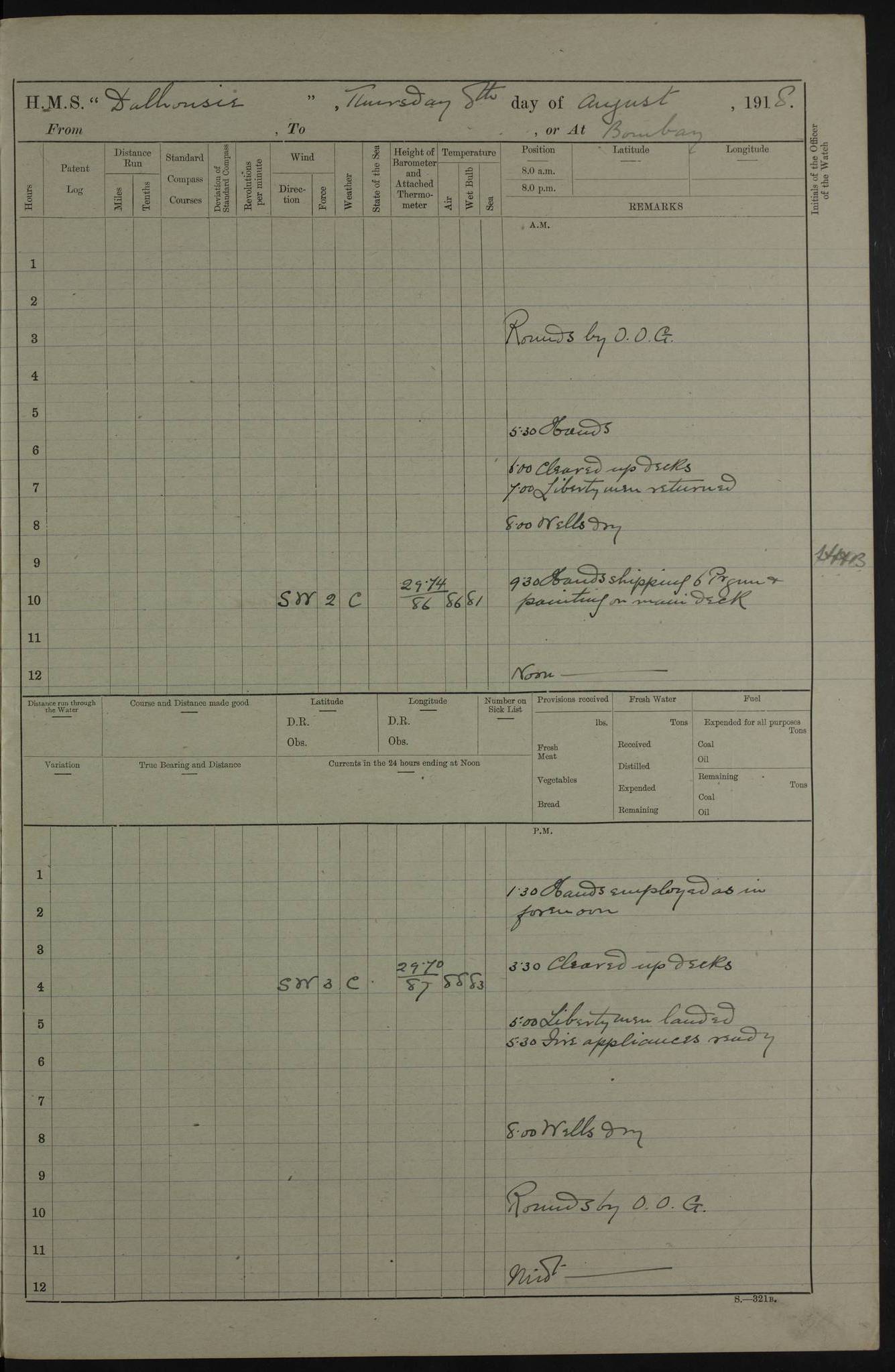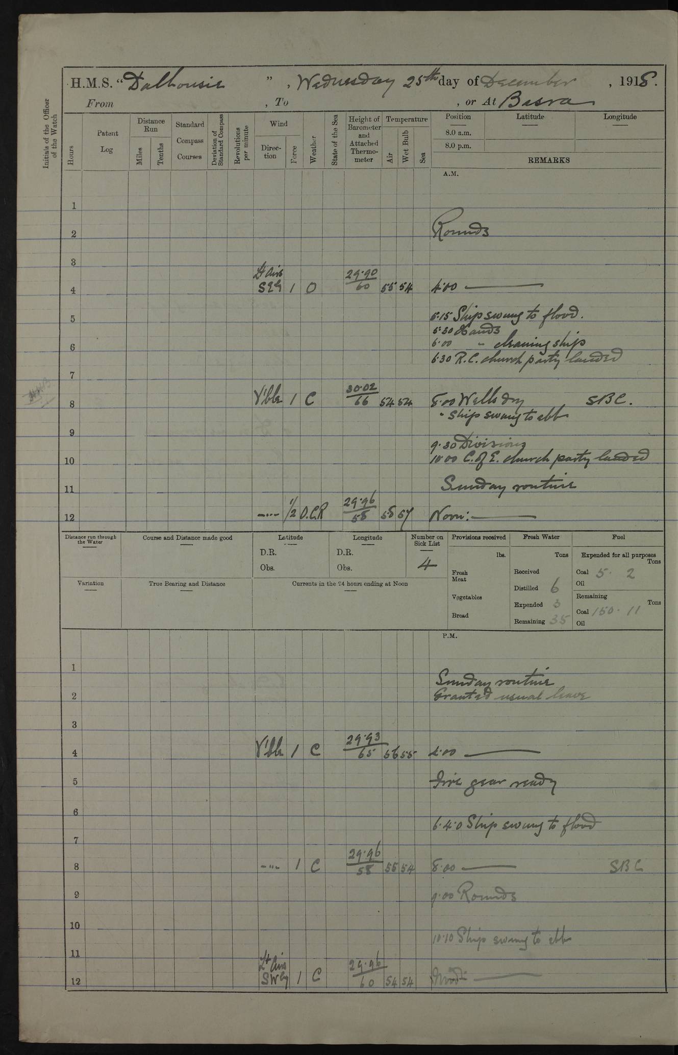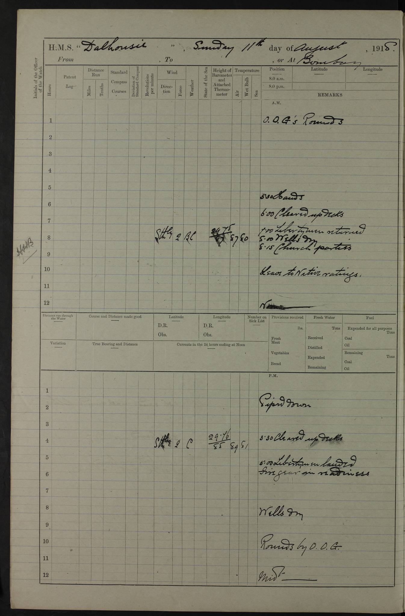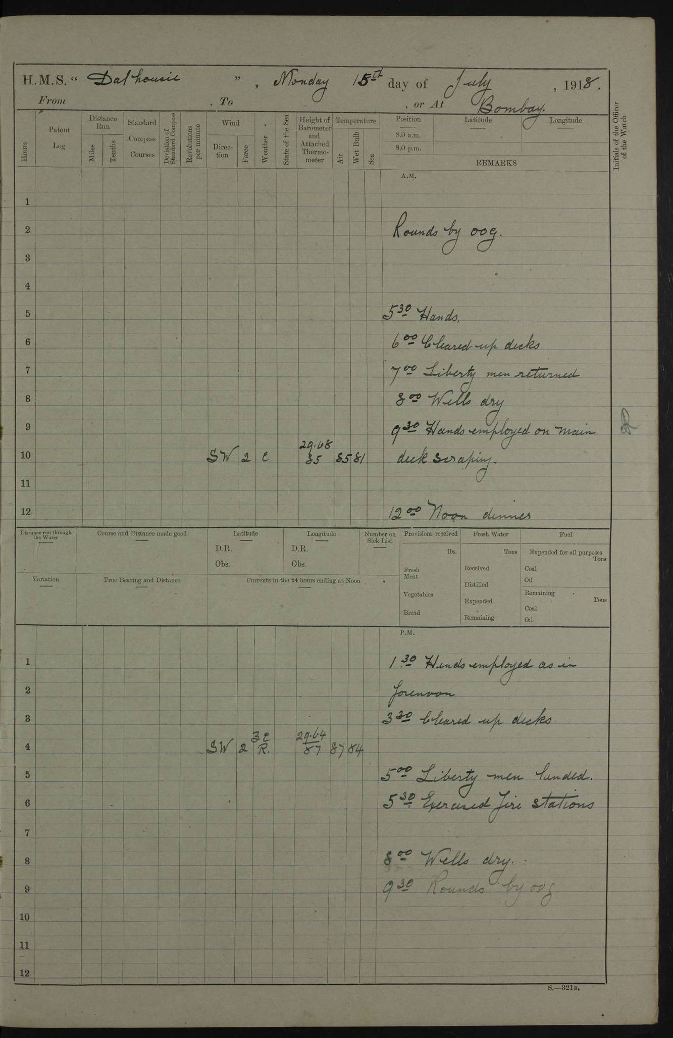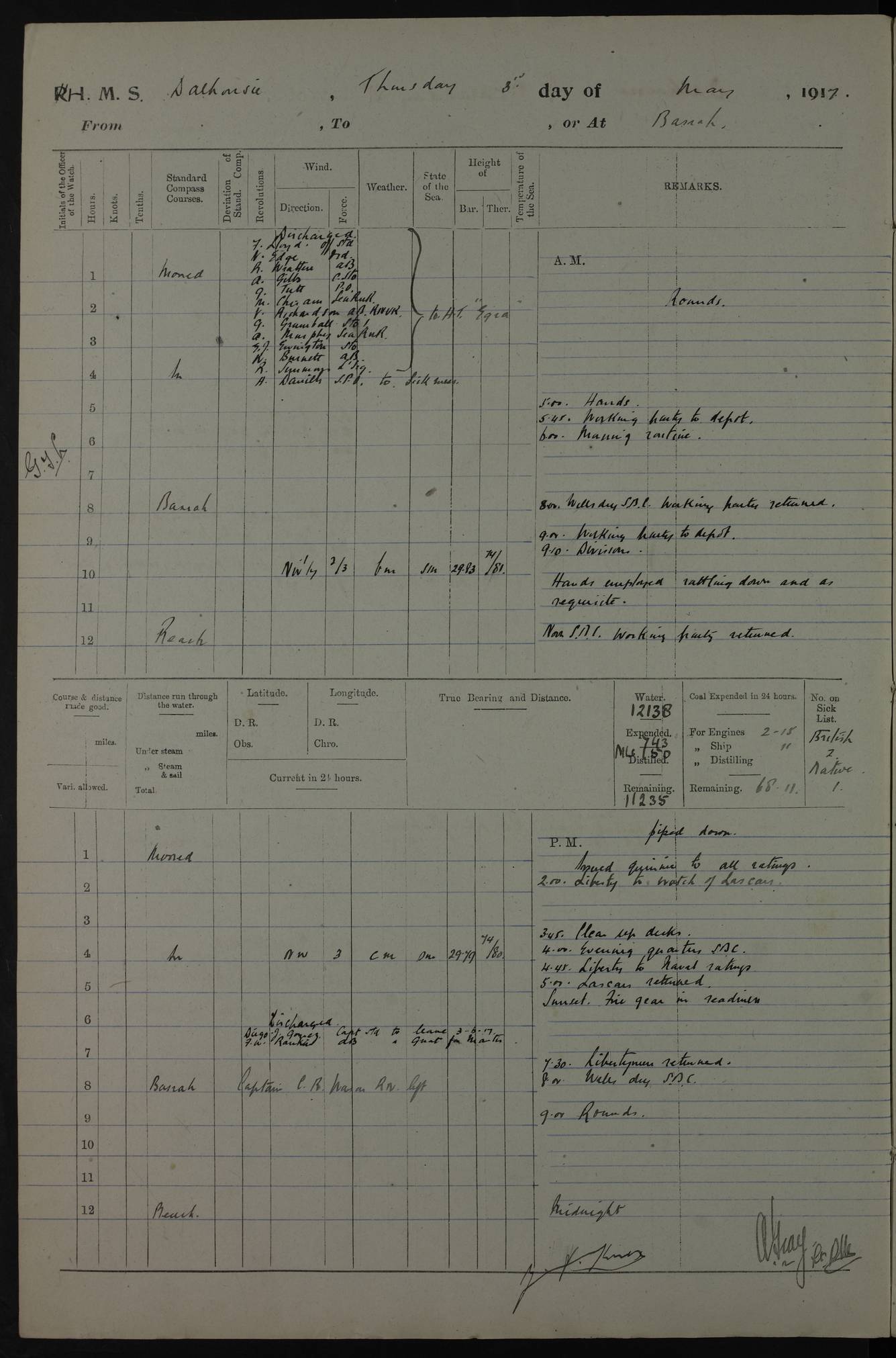 4ef4fafce53e0a0c91005931: (https://s3.amazonaws.com:443/oldweather/ADM53-39406/0015_1.jpg) 27 October 1917 Place: Basrah Lat 30.5269, Long 47.8407 2:00am: Rounds 6:00am: Hands - Morning Routine 7:00am: Exercised Fire stations 7:45am: Working party to Depot 8:00am: Wells dry - Signal Books correct 10:00am: Hands employed cleaning ship 12:00pm: Signal Books correct – Working party returned 1:00pm: Hands piped down 1:30pm: Liberty to Naval Ratings 3:45pm: Cleared up decks 4:00pm: Evening Quarters – Signal Books correct 5:15pm: Liberty to Naval Ratings 6:00pm: Sunset - Fire Gear in readiness 7:30pm: Liberty men returned 8:00pm: Wells dry - Signal Books correct 9:00pm: Rounds – Signal Books correct AM – Discharged To BARALA: W Denyer, Able Seaman - A Childs, Able Seaman - H Beckham Seaman - N Murray Seaman PM - Discharged To SCARAB: A Bushill, Senior Petty Officer - H Garth, Signalman To TARANTULA: G Campbell, Ship’s Steward Assistant 4ef4fafde53e0a0c91005932: (https://s3.amazonaws.com:443/oldweather/ADM53-39406/0016_0.jpg) 28 October 1917 Place: Basrah Lat 30.5269, Long 47.8407 2:00am: Rounds 5:30am: Hands 6:00am: Morning Routine 7:00am: Roman Catholic Church party landed 8:00am: Wells dry – Signal Books correct – Roman Catholics returned - Working party to Depot 8:30am: Church of England party to PROSERPINE 8:45am: Wesleyans landed 9:45am: Church parties returned - Divisions 10:30am: Liberty to Native Ratings 12:00pm: Signal Books correct – Working party returned 1:00pm: Issued Quinine to Naval Ratings- Issued Quinine to Native Ratings 1:30pm: Liberty to Naval ratings 3:45pm: Cleared up decks 4:00pm: Evening Quarters – Signal Books correct 5:15pm: Liberty to Naval Ratings 6:00pm: Sunset - Fire Gear in readiness 7:30pm: Liberty men returned 8:00pm: Wells dry - Signal Books correct 9:00pm: Rounds – Signal Books correct AM – Discharged To GRAYFLY: E.C. Shepherd, Petty Officer - W Hill, Able Seaman - Q Cox, Able Seaman - H Murphy, Able Seaman - A Taylor Telegrapher PM – Joined From SCARAB: J.G. Cooper, Stoker From Admiral’s House: Dounleg bin Eulog, Seedie PM - Discharged To ELEPHANTA: Alex de Souza, Officer's Steward To SCARAB: A Hatchard, Stoker To FIREFLY: W Burke, Stoker To Admiral’s House: Abrahim bin Shambi, Seedie