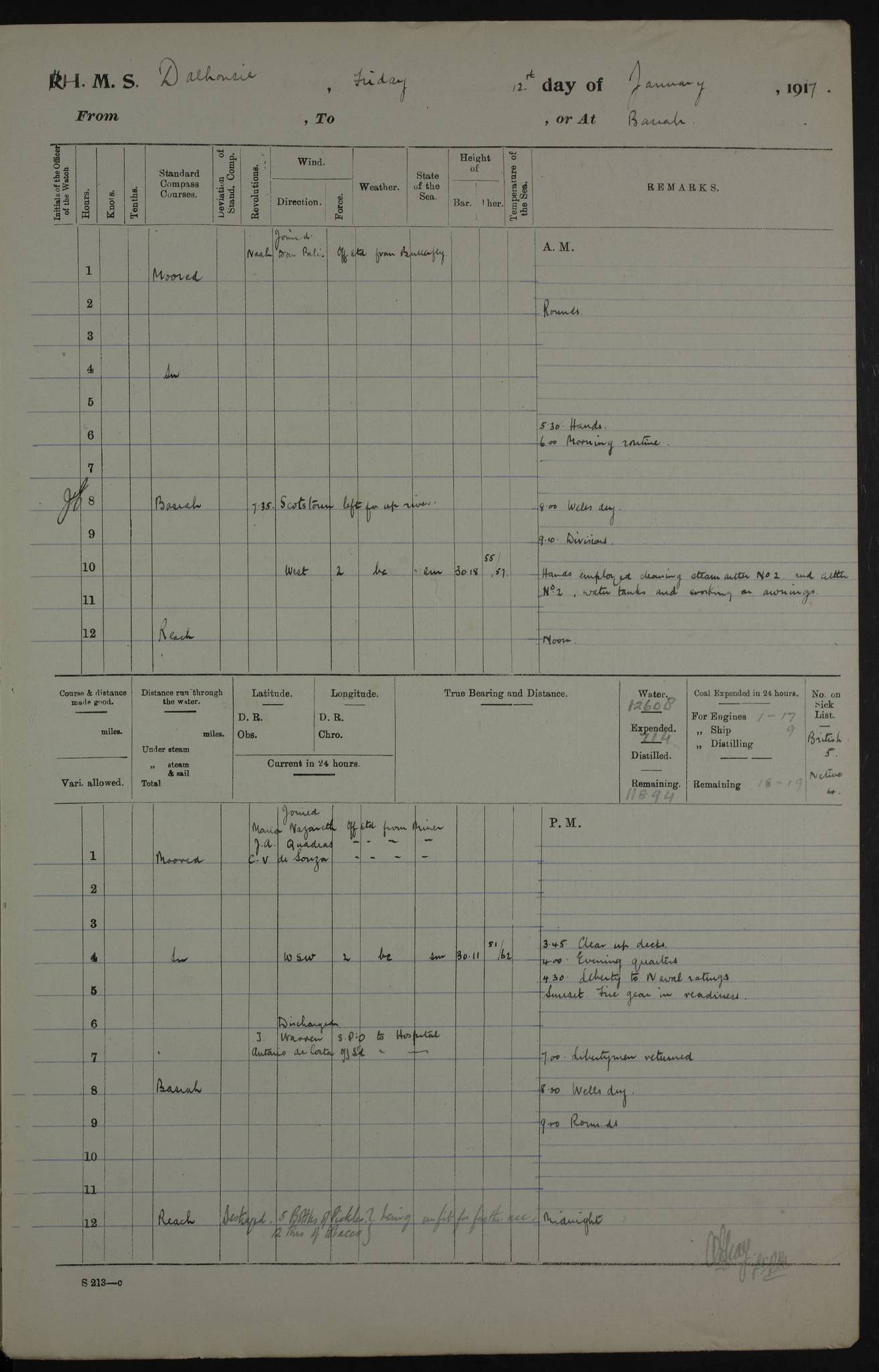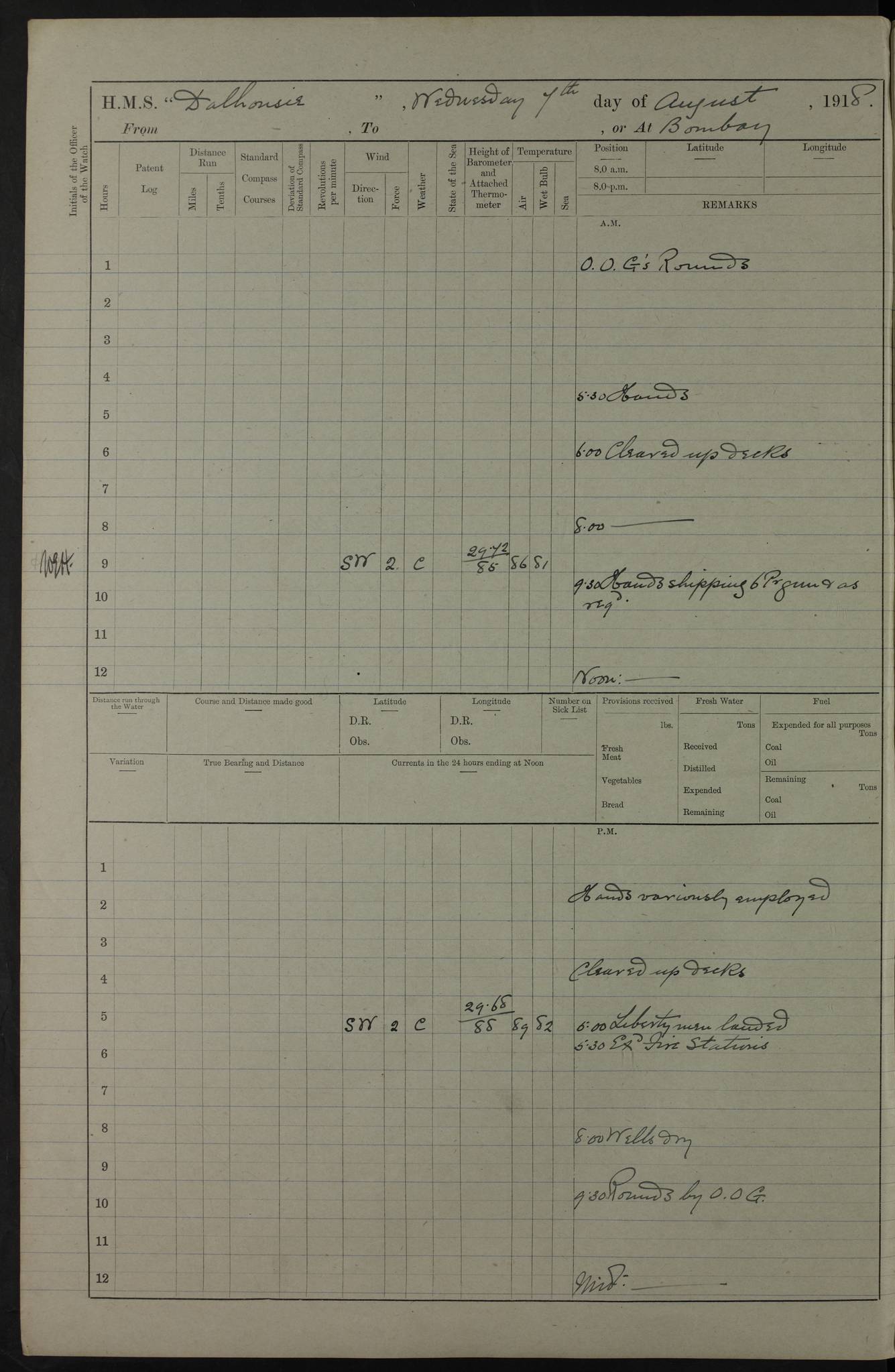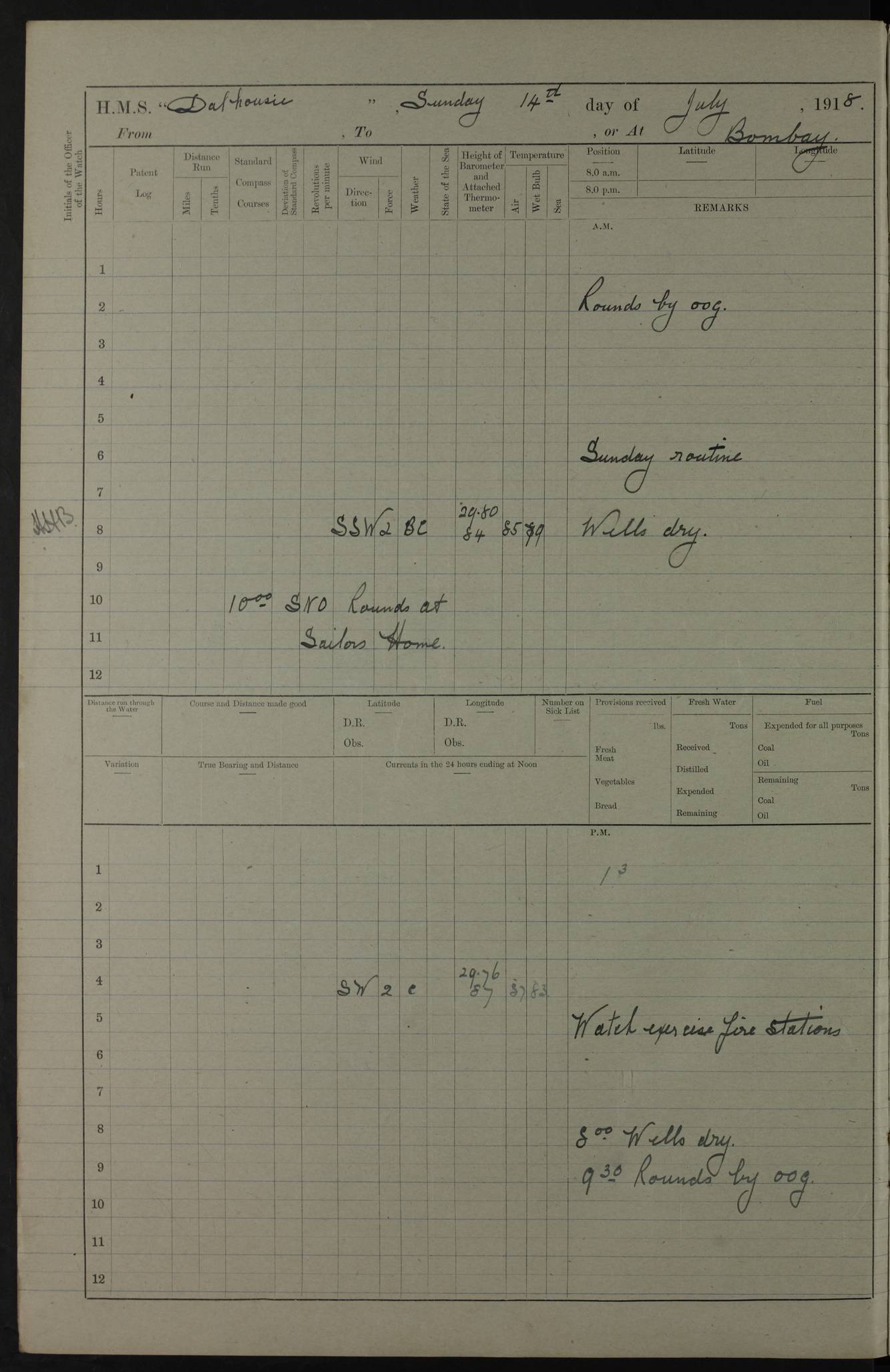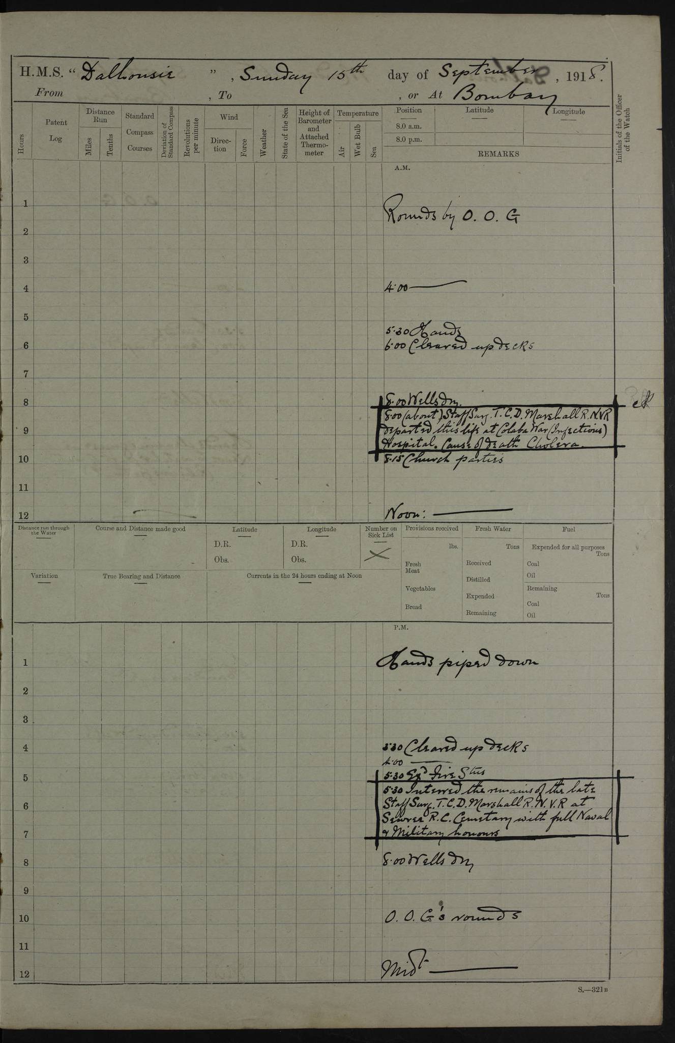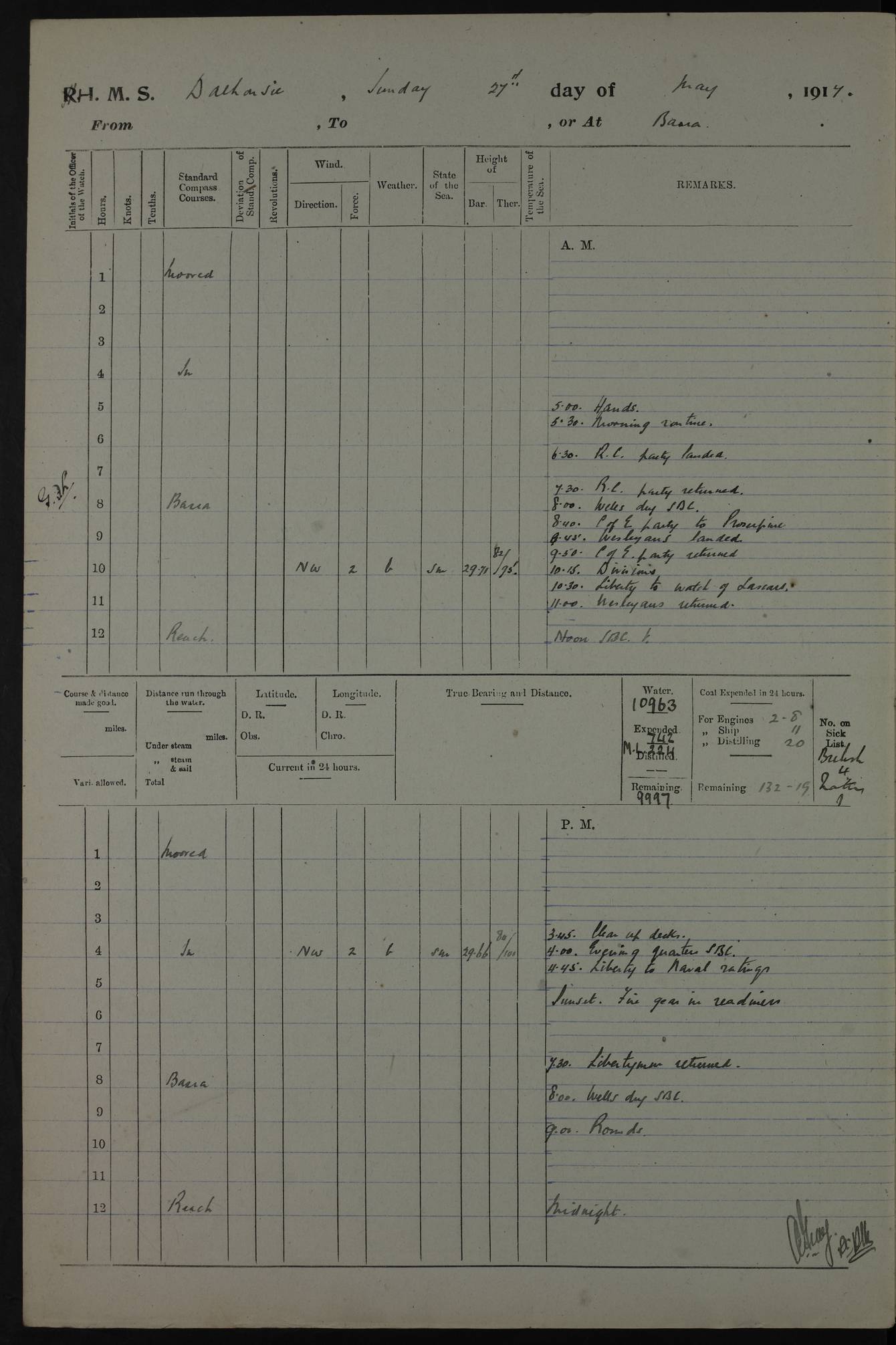 4ef4fafce53e0a0c91005931: (https://s3.amazonaws.com:443/oldweather/ADM53-39406/0015_1.jpg) 27 October 1917 Place: Basrah Lat 30.5269, Long 47.8407 2:00am: Rounds 6:00am: Hands - Morning Routine 7:00am: Exercised Fire stations 7:45am: Working party to Depot 8:00am: Wells dry - Signal Books correct 10:00am: Hands employed cleaning ship 12:00pm: Signal Books correct – Working party returned 1:00pm: Hands piped down 1:30pm: Liberty to Naval Ratings 3:45pm: Cleared up decks 4:00pm: Evening Quarters – Signal Books correct 5:15pm: Liberty to Naval Ratings 6:00pm: Sunset - Fire Gear in readiness 7:30pm: Liberty men returned 8:00pm: Wells dry - Signal Books correct 9:00pm: Rounds – Signal Books correct AM – Discharged To BARALA: W Denyer, Able Seaman - A Childs, Able Seaman - H Beckham Seaman - N Murray Seaman PM - Discharged To SCARAB: A Bushill, Senior Petty Officer - H Garth, Signalman To TARANTULA: G Campbell, Ship’s Steward Assistant 4ef4fafde53e0a0c91005932: (https://s3.amazonaws.com:443/oldweather/ADM53-39406/0016_0.jpg) 28 October 1917 Place: Basrah Lat 30.5269, Long 47.8407 2:00am: Rounds 5:30am: Hands 6:00am: Morning Routine 7:00am: Roman Catholic Church party landed 8:00am: Wells dry – Signal Books correct – Roman Catholics returned - Working party to Depot 8:30am: Church of England party to PROSERPINE 8:45am: Wesleyans landed 9:45am: Church parties returned - Divisions 10:30am: Liberty to Native Ratings 12:00pm: Signal Books correct – Working party returned 1:00pm: Issued Quinine to Naval Ratings- Issued Quinine to Native Ratings 1:30pm: Liberty to Naval ratings 3:45pm: Cleared up decks 4:00pm: Evening Quarters – Signal Books correct 5:15pm: Liberty to Naval Ratings 6:00pm: Sunset - Fire Gear in readiness 7:30pm: Liberty men returned 8:00pm: Wells dry - Signal Books correct 9:00pm: Rounds – Signal Books correct AM – Discharged To GRAYFLY: E.C. Shepherd, Petty Officer - W Hill, Able Seaman - Q Cox, Able Seaman - H Murphy, Able Seaman - A Taylor Telegrapher PM – Joined From SCARAB: J.G. Cooper, Stoker From Admiral’s House: Dounleg bin Eulog, Seedie PM - Discharged To ELEPHANTA: Alex de Souza, Officer's Steward To SCARAB: A Hatchard, Stoker To FIREFLY: W Burke, Stoker To Admiral’s House: Abrahim bin Shambi, Seedie