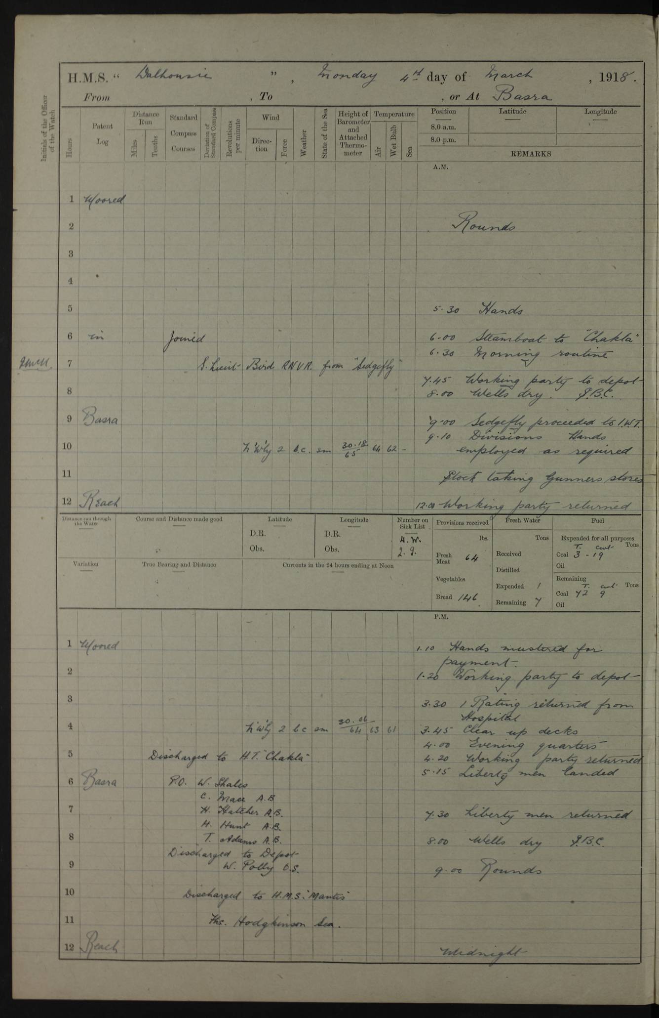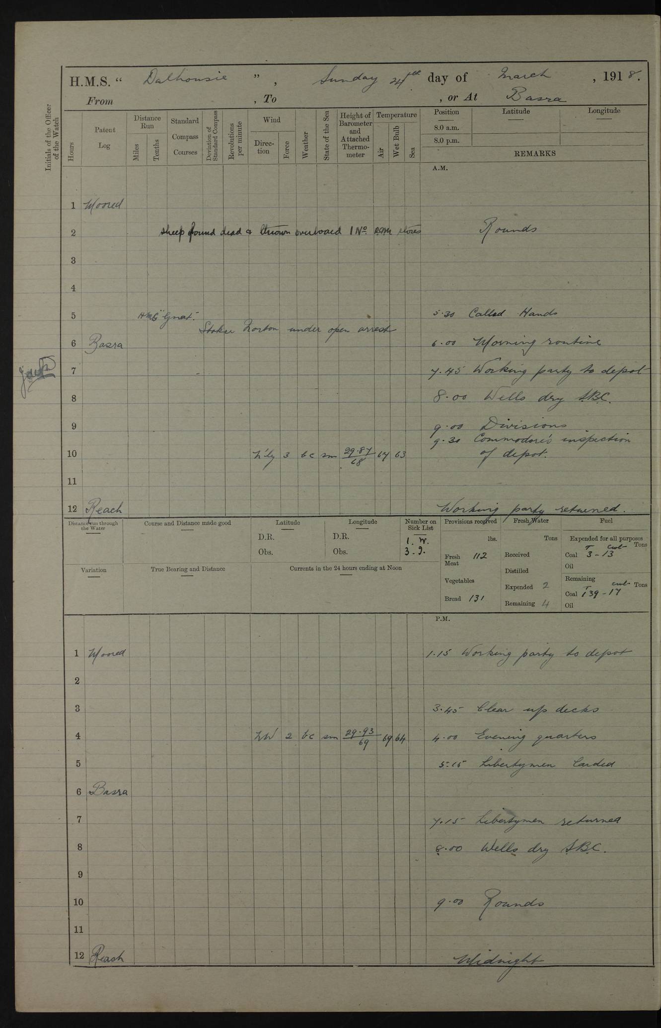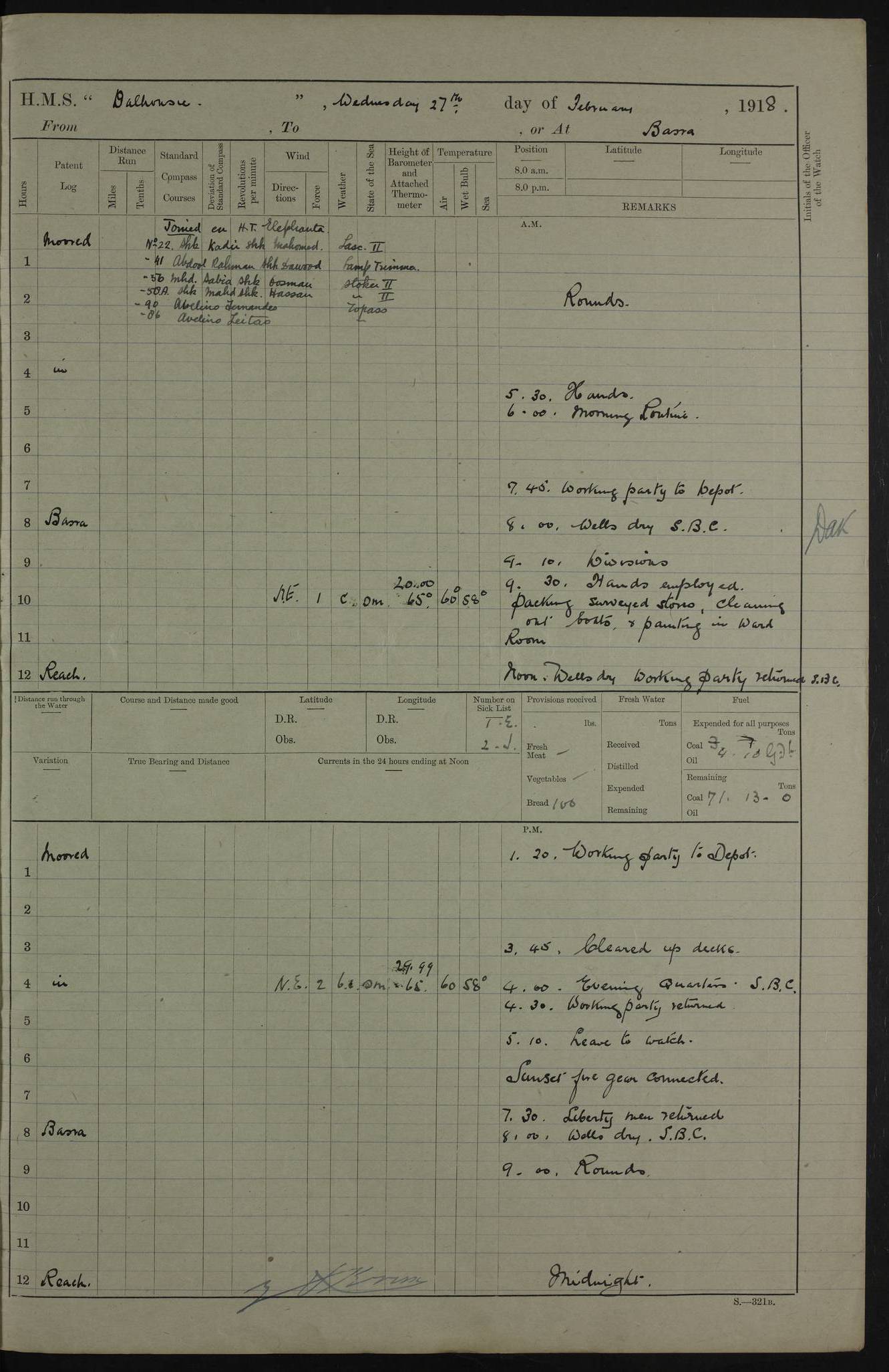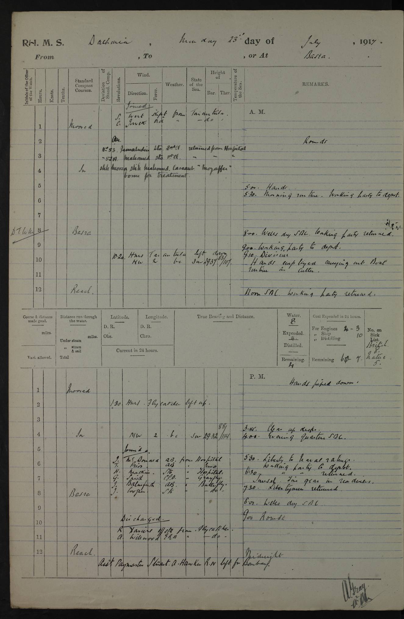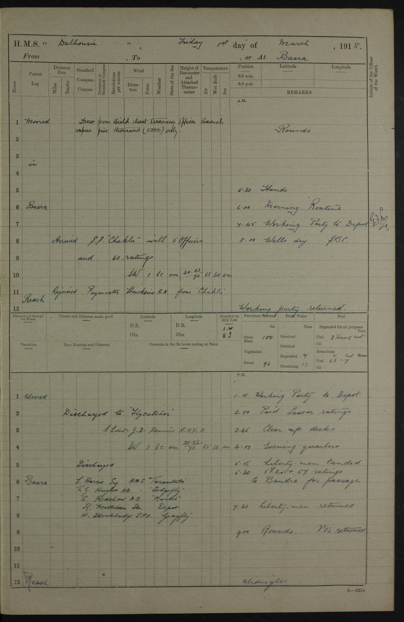 AM – Discharged To EKMA: PJ O’Connor, Lieutenant Royal Navy To Passage: 2 Indian Ratings To FLYCATCHER: D Butcher, Leading Seaman 4ef4fb19e53e0a0c910059d0: (https://s3.amazonaws.com:443/oldweather/ADM53-39410/0015_0.jpg) 26 February 1918 Place: Basrah Lat 30.5269, Long 47.8407 2:00am: Rounds 5:30am: Hands 6:00am: Morning Routine 7:45am: Working party to Depot 8:00am: Wells dry - Signal Books correct 9:10am: Divisions 10:00am: Hands employed painting in cabins & as requisite 12:00pm: Signal Books correct – Working party returned 1:20pm: Working party to Depot 3:45pm: Cleared up decks 4:00pm: Evening Quarters – Signal Books correct 4:30pm: Working party returned 5:10pm: Leave to Watch 6:00pm: Sunset - Fire Gear connected 7:30pm: Liberty men returned 8:00pm: Wells dry - Signal Books correct 9:00pm: Rounds – Signal Books correct PM – Joined From TARANTULA: J Baldwin, Leading Signalman From Hospital: Louis Mones, Engineering driver PM - Discharged To MANTIS: G Munay, Leading Signalman – C Killburn, Signalman To TARANTULA: CM Leary, Telegrapher 4ef4fb19e53e0a0c910059d1: (https://s3.amazonaws.com:443/oldweather/ADM53-39410/0015_1.jpg) 27 February 1918 Place: Basrah Lat 30.5269, Long 47.8407 2:00am: Rounds 5:30am: Hands 6:00am: Morning Routine 7:45am: Working party to Depot 8:00am: Wells dry - Signal Books correct 9:10am: Divisions 10:00am: Hands employed packing surveyed stores, cleaning out boats & painting in Warrant Ratings 12:00pm: Signal Books correct – Working party returned 1:20pm: Working party to Depot 3:45pm: Cleared up decks 4:00pm: Evening Quarters – Signal Books correct 4:30pm: Working party returned 5:10pm: Leave to Watch 6:00pm: Sunset - Fire Gear connected 7:30pm: Liberty men returned 8:00pm: Wells dry - Signal Books correct 9:00pm: Rounds – Signal Books correct AM – Joined From ELEPHANTA: No. 22 Sheik Kadir Sheik Mahomed, Lascar 2nd – No. 41 Abdool Rahman Sheik Dawood, Lamp Trimmer – No. 56 Mahomed Sabia Sheik Bosman, Stoker 2nd – No. 50A Sheik Mahomed Sheik Hassan, Stoker 2nd – No. 90 Abelino Fernandez, Topass – No. 86 Avelino Leitas, Topass 4ef4fb1ae53e0a0c910059d2: (https://s3.amazonaws.com:443/oldweather/ADM53-39410/0016_0.jpg) 28 February 1918 Place: Basrah Lat 30.5269, Long 47.8407 2:00am: Rounds 5:30am: Hands 6:00am: Morning Routine 7:45am: Working party to Depot 8:00am: Wells dry - Signal Books correct 9:10am: Divisions 10:00am: Hands employed discharging stores 12:00pm: Signal Books correct – Working party returned 1:00pm: Issued Quinine to Naval Ratings - Issued Quinine to Native Ratings 1:20pm: Working party to Depot 3:45pm: Cleared up decks 4:00pm: Evening Quarters – Signal Books correct 4:30pm: Working party returned 5:10pm: Leave to Watch 6:00pm: Sunset - Fire Gear connected 7:30pm: Liberty men returned 8:00pm: Wells dry - Signal Books correct 9:00pm: Rounds – Signal Books correct PM – Joined From SAPPHIRE: WC Woolley, Petty Officer PM - Discharged To TARANTULA: L Harris, Signalman To SEDGEFLY: T Hughes, Able Seaman To MANTIS: S Redshaw, Able Seaman To Depot: R Matheison, Stoker – H Philo, Stoker TO GRAYFLY: H Stockbridge, Senior Petty Officer 4ef4fb1ae53e0a0c910059d3: (https://s3.amazonaws.com:443/oldweather/ADM53-39410/0016_1.jpg) Log Page – Blank – no data on Page 4ef4fb1ae53e0a0c910059d4: (https://s3.amazonaws.com:443/oldweather/ADM53-39410/0017_0.jpg) Log Page – Blank – no data on Page 4ef4fb1ae53e0a0c910059d5: (https://s3.amazonaws.com:443/oldweather/ADM53-39410/0017_1.jpg) Log Page – Blank 4ef4fb1ae53e0a0c910059d6: (https://s3.amazonaws.com:443/oldweather/ADM53-39410/0018_0.jpg) Log Page – Blank 4ef4fb1ae53e0a0c910059d7: (https://s3.amazonaws.com:443/oldweather/ADM53-39410/0018_1.jpg) Log Page – Blank LOGS FOR MARCH 1918 4ef4fb1be53e0a0c910059d8: (https://s3.amazonaws.com:443/oldweather/ADM53-39411/0000_0.jpg) Log Page – Cover March 1918 4ef4fb1be53e0a0c910059d9: (https://s3.amazonaws.com:443/oldweather/ADM53-39411/0000_1.jpg) Log Page – Cover – March 1918 4ef4fb1be53e0a0c910059da: (https://s3.amazonaws.com:443/oldweather/ADM53-39411/0001_0.jpg) Log Page – Blank 4ef4fb1be53e0a0c910059db: (https://s3.amazonaws.com:443/oldweather/ADM53-39411/0001_1.jpg) Log Page – Blank – no data on Page 4ef4fb1ce53e0a0c910059dc: (https://s3.amazonaws.com:443/oldweather/ADM53-39411/0002_0.jpg) Log Page – Blank – no data on Page 4ef4fb1ce53e0a0c910059dd: (https://s3.amazonaws.com:443/oldweather/ADM53-39411/0002_1.jpg) 1 March 1918 Place: Basrah Lat 30.5269, Long 47.8407 1:00am: drew from Field Chest Treasury Officer Basrah Five thousand (5,000) Rupees only 2:00am: Rounds 5:30am: Hands 6:00am: Morning Routine 7:45am: Working party to Depot 8:00am: Wells dry – Signal Books correct – CHAKLA arrived with 5 Officers & 60 Ratings 12:00pm: Signal Books correct – Working party returned 1:15pm: Working party to Depot 2:00pm: Paid Lascar Ratings 3:45pm: Cleared up decks 4:00pm: Evening Quarters 4:30pm: Working party returned 5:10pm: Leave to Watch 5:30pm: 5 Petty Officers & 57 Ratings to Bandra for Passage 6:00pm: Sunset - Fire Gear connected 7:30pm: Liberty men returned 9:00pm: Rounds – Petty Officers returned AM – Joined From CHALKA: Hawkins, Paymaster Royal Navy PM - Discharged To FLYCATCHER: Dennis, Sub Lieutenant Royal Navy Volunteer Reserve To TARANTULA: L Harris, Signalman To SEDGEFLY: TG Hughes, Able Seaman To MANTIS: S Redshaw, Able Seaman To Depot: R Mathieson, Stoker To GRAYFLY: H Stockbridge, Senior Petty Officer 4ef4fb1ce53e0a0c910059de: (https://s3.amazonaws.com:443/oldweather/ADM53-39411/0003_0.jpg) 2 March 1918 Place: Basrah Lat 30.5269, Long 47.8407 2:00am: Rounds 5:30am: Hands 6:00am: Morning Routine 7:00am: Exercised Fire Stations 7:45am: Working party to Depot 8:00am: Wells dry - Signal Books correct 9:10am: Divisions 10:00am: Hands employed as requisite 12:00pm: Working party returned 1:15pm: Working party to Depot 3:45pm: Cleared up decks 4:00pm: Evening Quarters – Signal Books corr