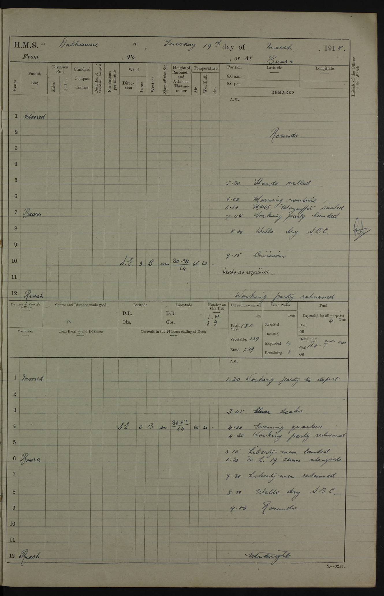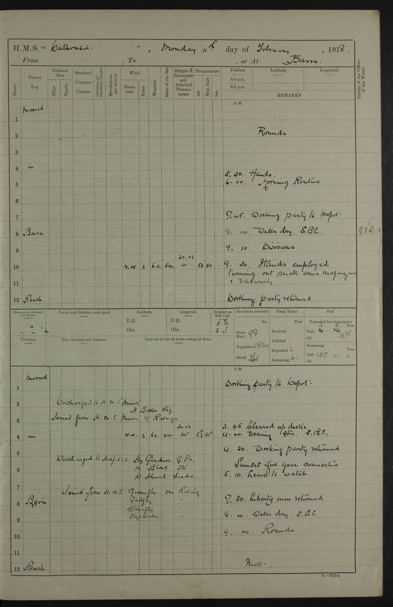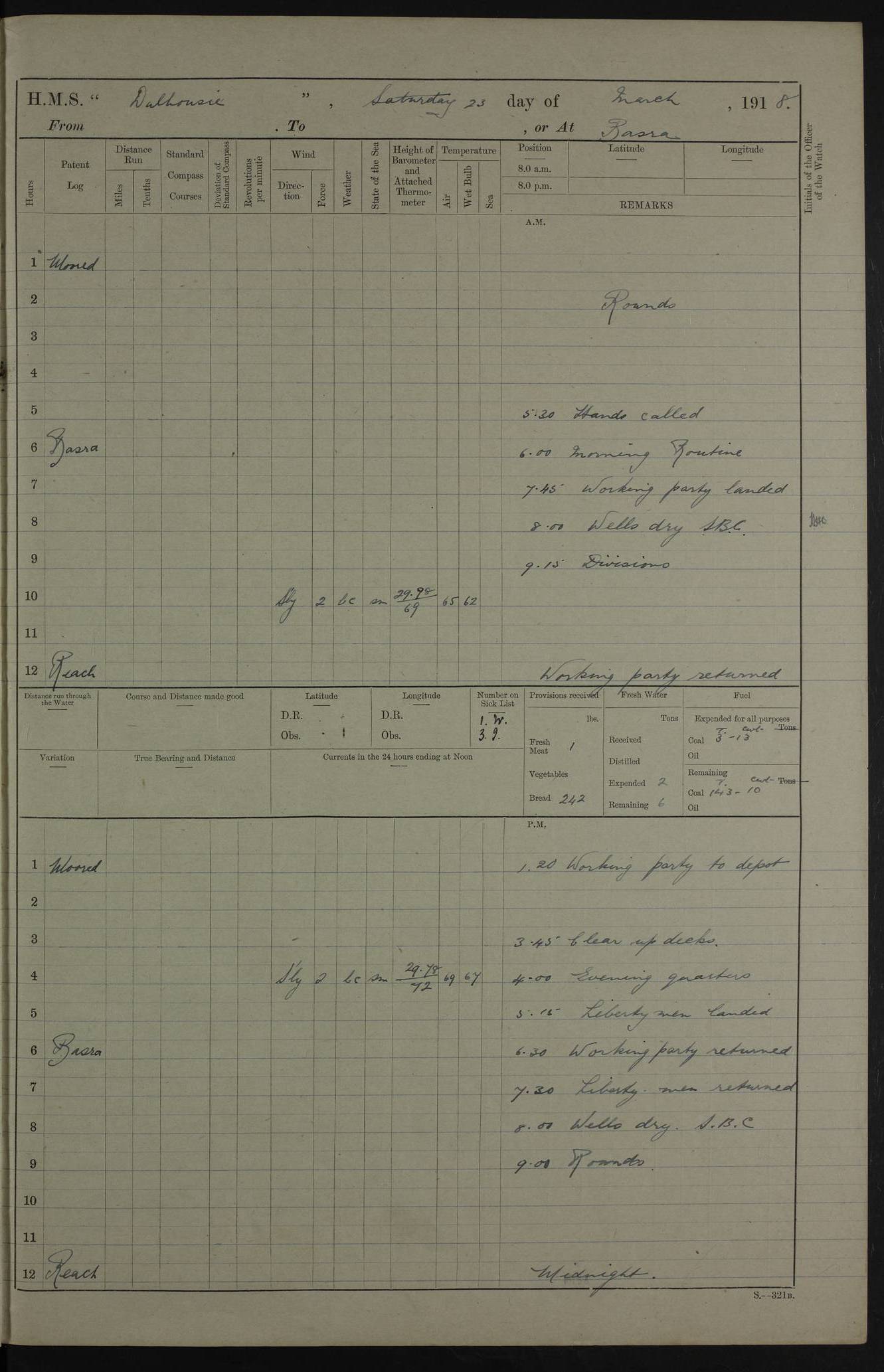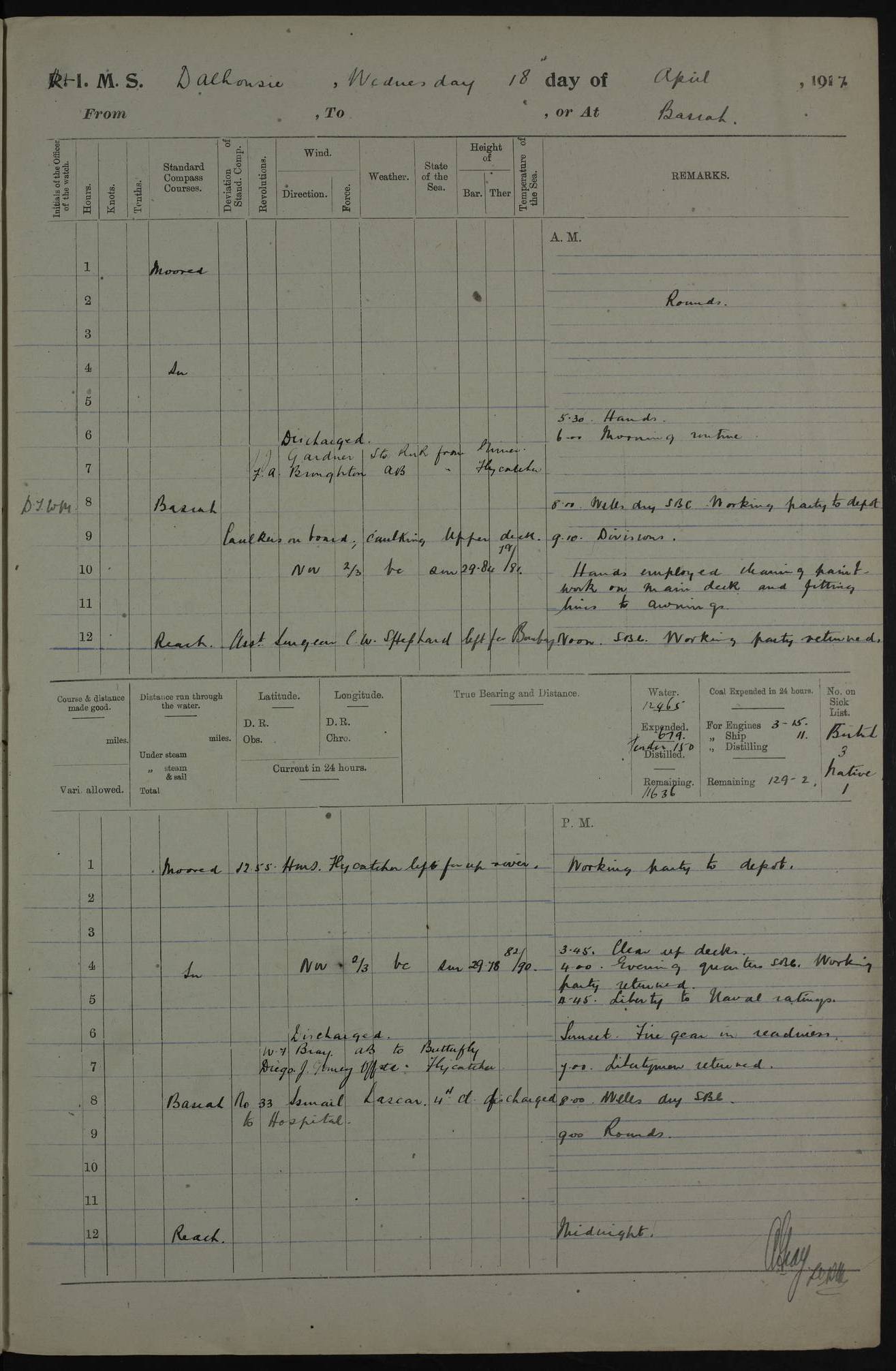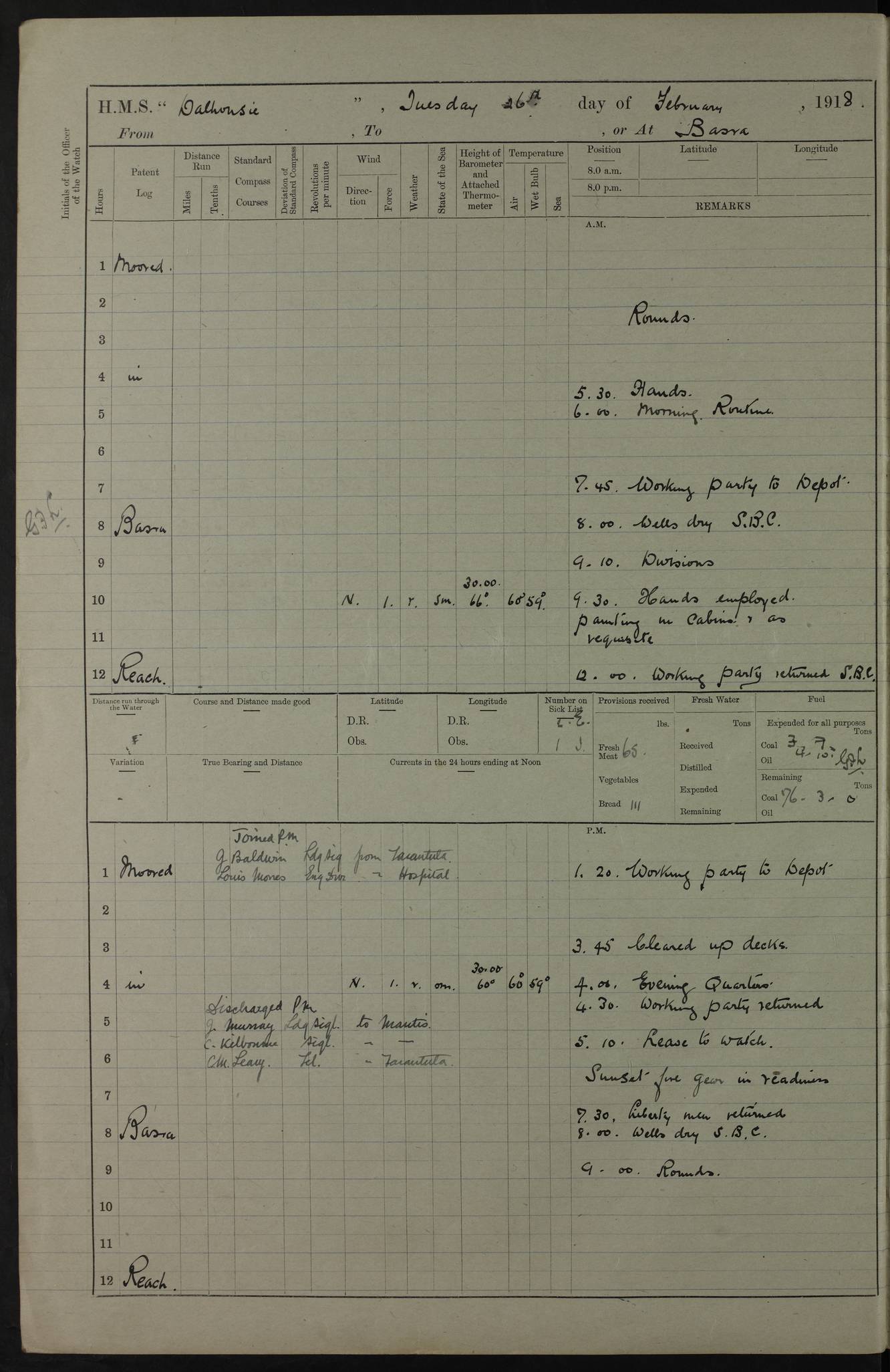 AM – Discharged To EKMA: PJ O’Connor, Lieutenant Royal Navy To Passage: 2 Indian Ratings To FLYCATCHER: D Butcher, Leading Seaman 4ef4fb19e53e0a0c910059d0: (https://s3.amazonaws.com:443/oldweather/ADM53-39410/0015_0.jpg) 26 February 1918 Place: Basrah Lat 30.5269, Long 47.8407 2:00am: Rounds 5:30am: Hands 6:00am: Morning Routine 7:45am: Working party to Depot 8:00am: Wells dry - Signal Books correct 9:10am: Divisions 10:00am: Hands employed painting in cabins & as requisite 12:00pm: Signal Books correct – Working party returned 1:20pm: Working party to Depot 3:45pm: Cleared up decks 4:00pm: Evening Quarters – Signal Books correct 4:30pm: Working party returned 5:10pm: Leave to Watch 6:00pm: Sunset - Fire Gear connected 7:30pm: Liberty men returned 8:00pm: Wells dry - Signal Books correct 9:00pm: Rounds – Signal Books correct PM – Joined From TARANTULA: J Baldwin, Leading Signalman From Hospital: Louis Mones, Engineering driver PM - Discharged To MANTIS: G Munay, Leading Signalman – C Killburn, Signalman To TARANTULA: CM Leary, Telegrapher 4ef4fb19e53e0a0c910059d1: (https://s3.amazonaws.com:443/oldweather/ADM53-39410/0015_1.jpg) 27 February 1918 Place: Basrah Lat 30.5269, Long 47.8407 2:00am: Rounds 5:30am: Hands 6:00am: Morning Routine 7:45am: Working party to Depot 8:00am: Wells dry - Signal Books correct 9:10am: Divisions 10:00am: Hands employed packing surveyed stores, cleaning out boats & painting in Warrant Ratings 12:00pm: Signal Books correct – Working party returned 1:20pm: Working party to Depot 3:45pm: Cleared up decks 4:00pm: Evening Quarters – Signal Books correct 4:30pm: Working party returned 5:10pm: Leave to Watch 6:00pm: Sunset - Fire Gear connected 7:30pm: Liberty men returned 8:00pm: Wells dry - Signal Books correct 9:00pm: Rounds – Signal Books correct AM – Joined From ELEPHANTA: No. 22 Sheik Kadir Sheik Mahomed, Lascar 2nd – No. 41 Abdool Rahman Sheik Dawood, Lamp Trimmer – No. 56 Mahomed Sabia Sheik Bosman, Stoker 2nd – No. 50A Sheik Mahomed Sheik Hassan, Stoker 2nd – No. 90 Abelino Fernandez, Topass – No. 86 Avelino Leitas, Topass 4ef4fb1ae53e0a0c910059d2: (https://s3.amazonaws.com:443/oldweather/ADM53-39410/0016_0.jpg) 28 February 1918 Place: Basrah Lat 30.5269, Long 47.8407 2:00am: Rounds 5:30am: Hands 6:00am: Morning Routine 7:45am: Working party to Depot 8:00am: Wells dry - Signal Books correct 9:10am: Divisions 10:00am: Hands employed discharging stores 12:00pm: Signal Books correct – Working party returned 1:00pm: Issued Quinine to Naval Ratings - Issued Quinine to Native Ratings 1:20pm: Working party to Depot 3:45pm: Cleared up decks 4:00pm: Evening Quarters – Signal Books correct 4:30pm: Working party returned 5:10pm: Leave to Watch 6:00pm: Sunset - Fire Gear connected 7:30pm: Liberty men returned 8:00pm: Wells dry - Signal Books correct 9:00pm: Rounds – Signal Books correct PM – Joined From SAPPHIRE: WC Woolley, Petty Officer PM - Discharged To TARANTULA: L Harris, Signalman To SEDGEFLY: T Hughes, Able Seaman To MANTIS: S Redshaw, Able Seaman To Depot: R Matheison, Stoker – H Philo, Stoker TO GRAYFLY: H Stockbridge, Senior Petty Officer 4ef4fb1ae53e0a0c910059d3: (https://s3.amazonaws.com:443/oldweather/ADM53-39410/0016_1.jpg) Log Page – Blank – no data on Page 4ef4fb1ae53e0a0c910059d4: (https://s3.amazonaws.com:443/oldweather/ADM53-39410/0017_0.jpg) Log Page – Blank – no data on Page 4ef4fb1ae53e0a0c910059d5: (https://s3.amazonaws.com:443/oldweather/ADM53-39410/0017_1.jpg) Log Page – Blank 4ef4fb1ae53e0a0c910059d6: (https://s3.amazonaws.com:443/oldweather/ADM53-39410/0018_0.jpg) Log Page – Blank 4ef4fb1ae53e0a0c910059d7: (https://s3.amazonaws.com:443/oldweather/ADM53-39410/0018_1.jpg) Log Page – Blank LOGS FOR MARCH 1918 4ef4fb1be53e0a0c910059d8: (https://s3.amazonaws.com:443/oldweather/ADM53-39411/0000_0.jpg) Log Page – Cover March 1918 4ef4fb1be53e0a0c910059d9: (https://s3.amazonaws.com:443/oldweather/ADM53-39411/0000_1.jpg) Log Page – Cover – March 1918 4ef4fb1be53e0a0c910059da: (https://s3.amazonaws.com:443/oldweather/ADM53-39411/0001_0.jpg) Log Page – Blank 4ef4fb1be53e0a0c910059db: (https://s3.amazonaws.com:443/oldweather/ADM53-39411/0001_1.jpg) Log Page – Blank – no data on Page 4ef4fb1ce53e0a0c910059dc: (https://s3.amazonaws.com:443/oldweather/ADM53-39411/0002_0.jpg) Log Page – Blank – no data on Page 4ef4fb1ce53e0a0c910059dd: (https://s3.amazonaws.com:443/oldweather/ADM53-39411/0002_1.jpg) 1 March 1918 Place: Basrah Lat 30.5269, Long 47.8407 1:00am: drew from Field Chest Treasury Officer Basrah Five thousand (5,000) Rupees only 2:00am: Rounds 5:30am: Hands 6:00am: Morning Routine 7:45am: Working party to Depot 8:00am: Wells dry – Signal Books correct – CHAKLA arrived with 5 Officers & 60 Ratings 12:00pm: Signal Books correct – Working party returned 1:15pm: Working party to Depot 2:00pm: Paid Lascar Ratings 3:45pm: Cleared up decks 4:00pm: Evening Quarters 4:30pm: Working party returned 5:10pm: Leave to Watch 5:30pm: 5 Petty Officers & 57 Ratings to Bandra for Passage 6:00pm: Sunset - Fire Gear connected 7:30pm: Liberty men returned 9:00pm: Rounds – Petty Officers returned AM – Joined From CHALKA: Hawkins, Paymaster Royal Navy PM - Discharged To FLYCATCHER: Dennis, Sub Lieutenant Royal Navy Volunteer Reserve To TARANTULA: L Harris, Signalman To SEDGEFLY: TG Hughes, Able Seaman To MANTIS: S Redshaw, Able Seaman To Depot: R Mathieson, Stoker To GRAYFLY: H Stockbridge, Senior Petty Officer 4ef4fb1ce53e0a0c910059de: (https://s3.amazonaws.com:443/oldweather/ADM53-39411/0003_0.jpg) 2 March 1918 Place: Basrah Lat 30.5269, Long 47.8407 2:00am: Rounds 5:30am: Hands 6:00am: Morning Routine 7:00am: Exercised Fire Stations 7:45am: Working party to Depot 8:00am: Wells dry - Signal Books correct 9:10am: Divisions 10:00am: Hands employed as requisite 12:00pm: Working party returned 1:15pm: Working party to Depot 3:45pm: Cleared up decks 4:00pm: Evening Quarters – Signal Books corr