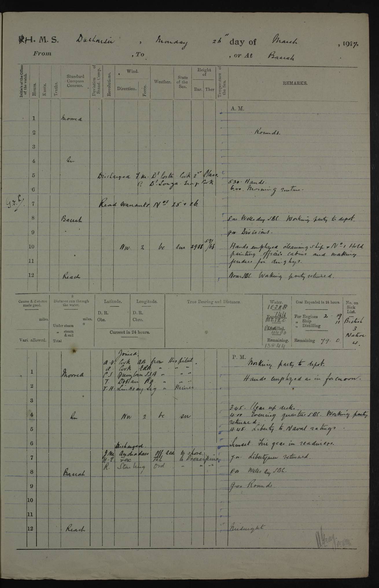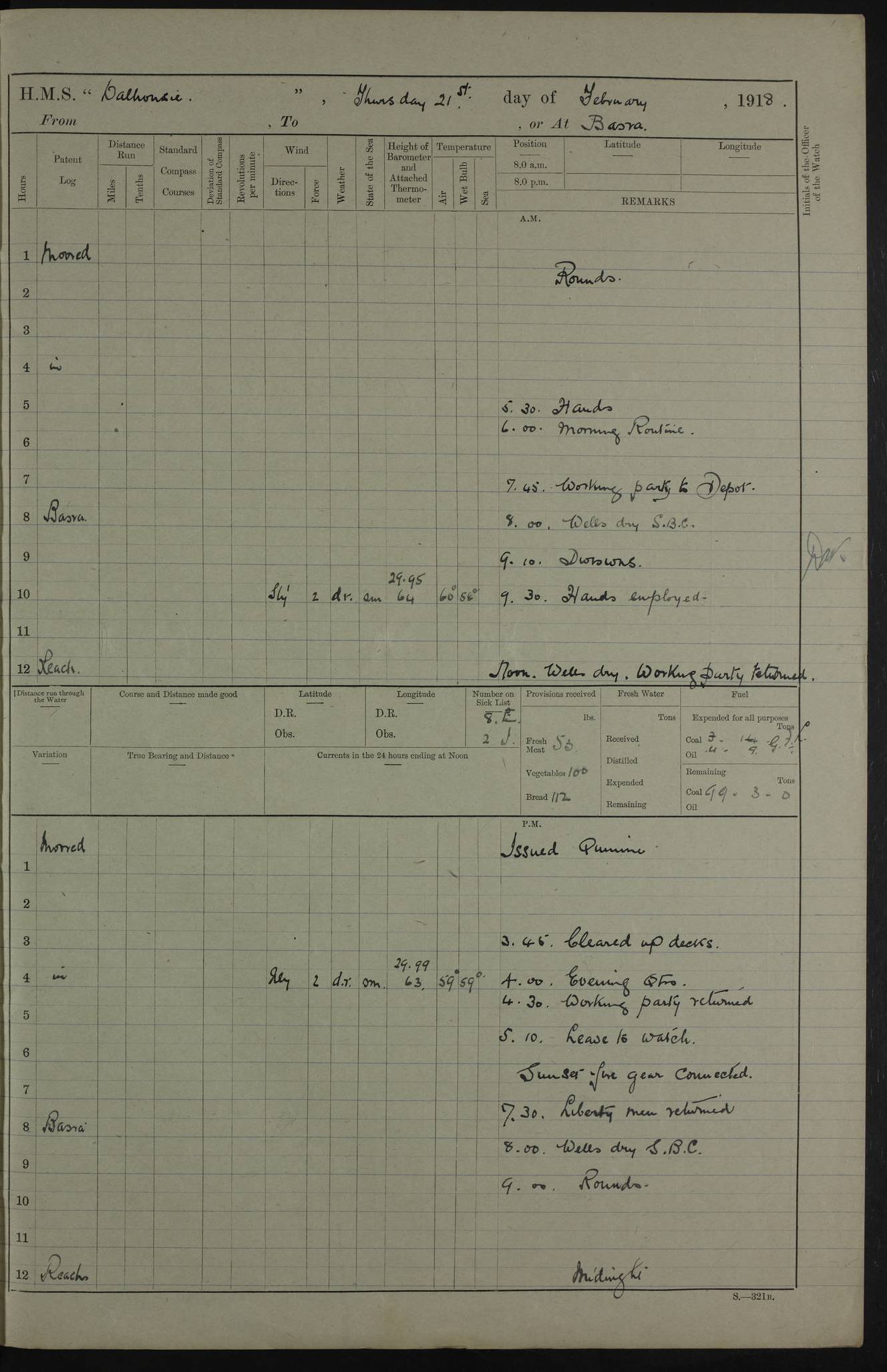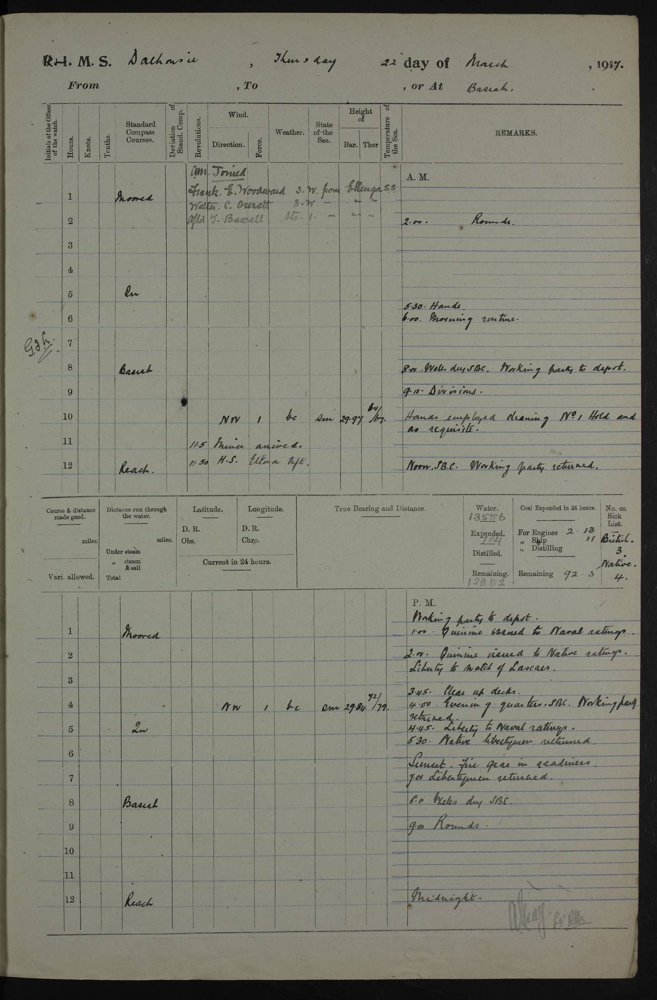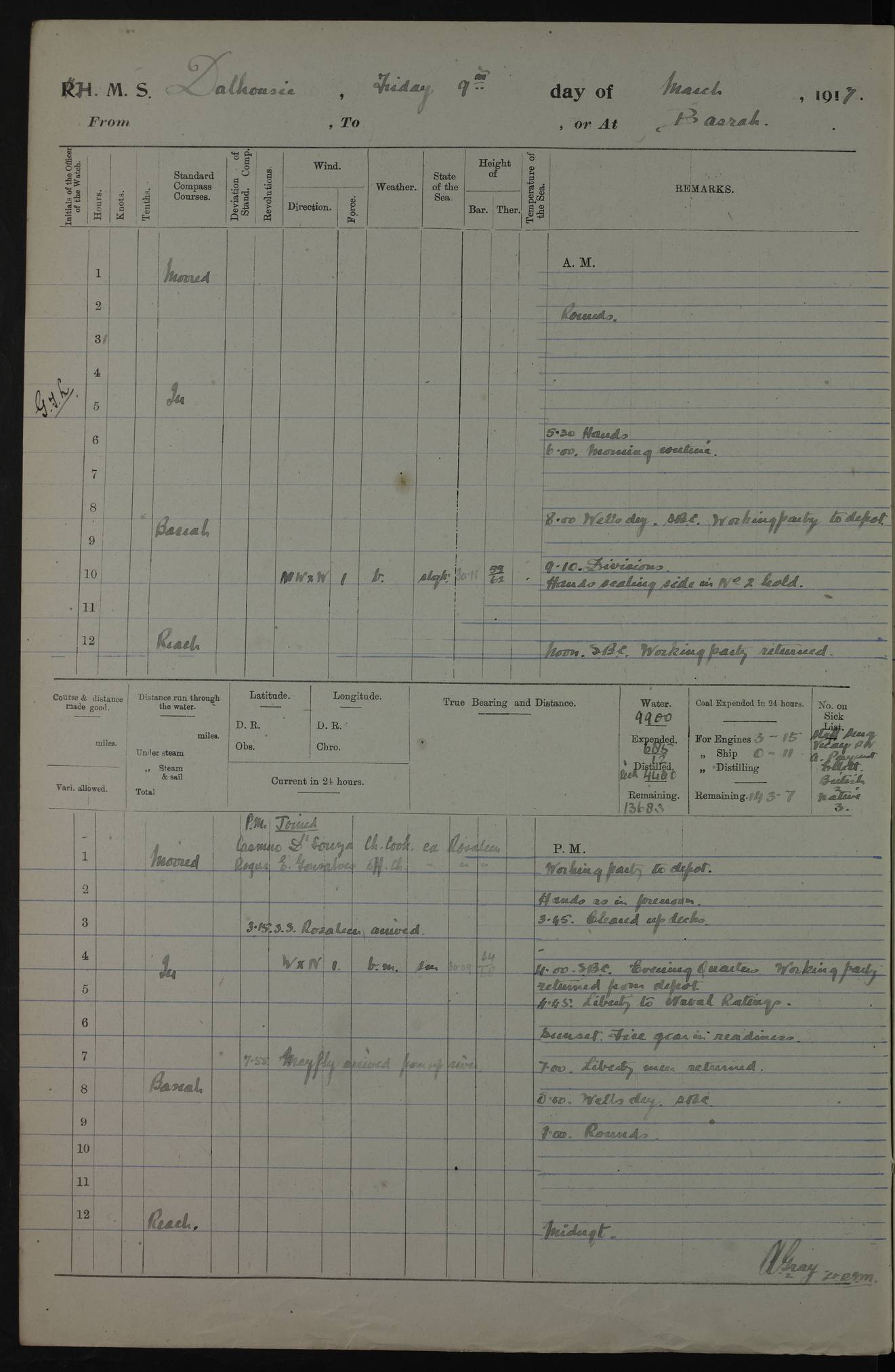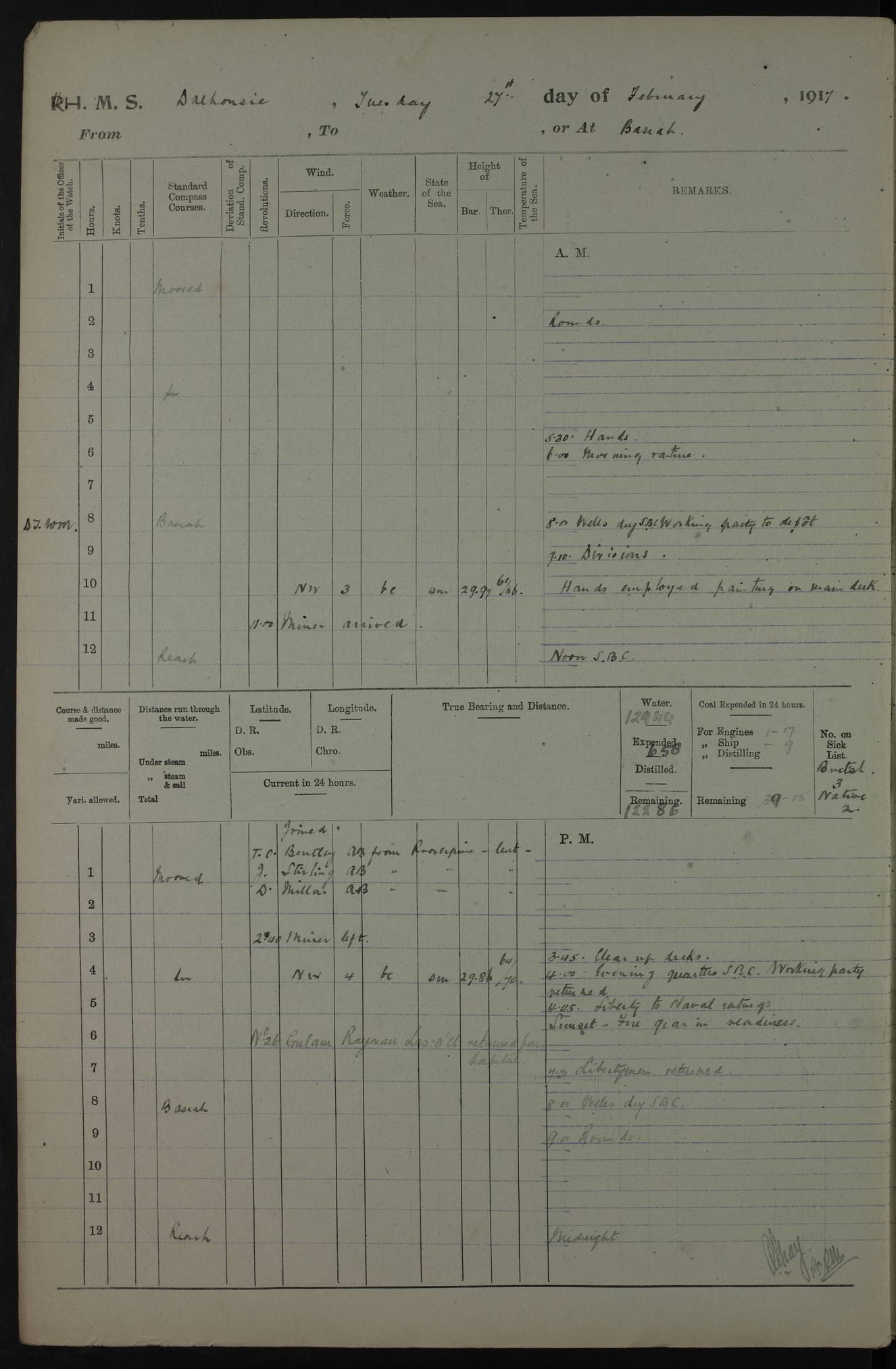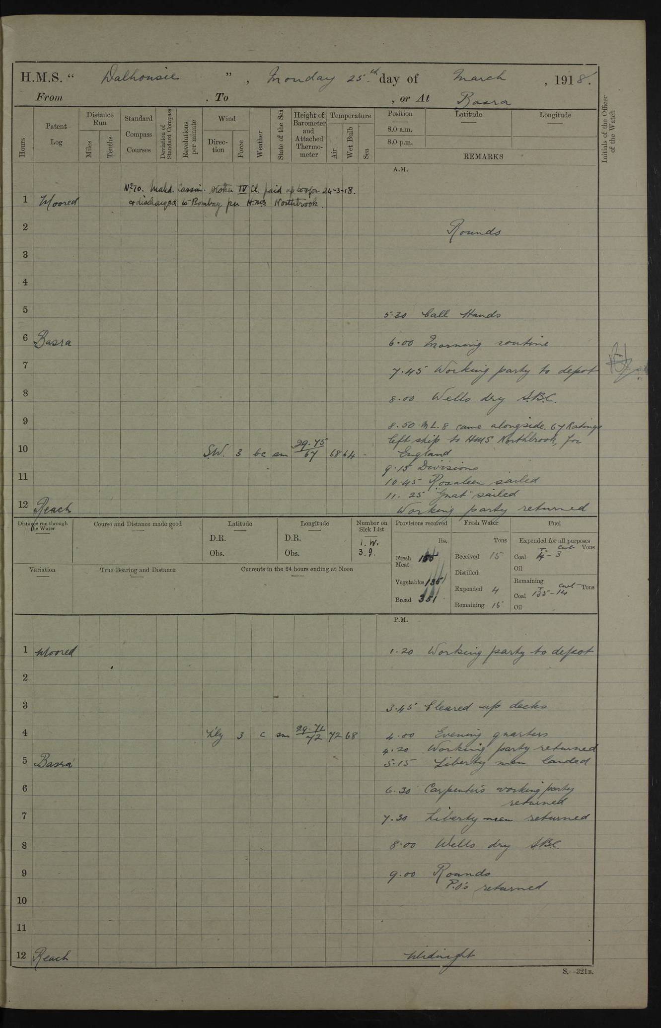 AM – Discharged To EKMA: PJ O’Connor, Lieutenant Royal Navy To Passage: 2 Indian Ratings To FLYCATCHER: D Butcher, Leading Seaman 4ef4fb19e53e0a0c910059d0: (https://s3.amazonaws.com:443/oldweather/ADM53-39410/0015_0.jpg) 26 February 1918 Place: Basrah Lat 30.5269, Long 47.8407 2:00am: Rounds 5:30am: Hands 6:00am: Morning Routine 7:45am: Working party to Depot 8:00am: Wells dry - Signal Books correct 9:10am: Divisions 10:00am: Hands employed painting in cabins & as requisite 12:00pm: Signal Books correct – Working party returned 1:20pm: Working party to Depot 3:45pm: Cleared up decks 4:00pm: Evening Quarters – Signal Books correct 4:30pm: Working party returned 5:10pm: Leave to Watch 6:00pm: Sunset - Fire Gear connected 7:30pm: Liberty men returned 8:00pm: Wells dry - Signal Books correct 9:00pm: Rounds – Signal Books correct PM – Joined From TARANTULA: J Baldwin, Leading Signalman From Hospital: Louis Mones, Engineering driver PM - Discharged To MANTIS: G Munay, Leading Signalman – C Killburn, Signalman To TARANTULA: CM Leary, Telegrapher 4ef4fb19e53e0a0c910059d1: (https://s3.amazonaws.com:443/oldweather/ADM53-39410/0015_1.jpg) 27 February 1918 Place: Basrah Lat 30.5269, Long 47.8407 2:00am: Rounds 5:30am: Hands 6:00am: Morning Routine 7:45am: Working party to Depot 8:00am: Wells dry - Signal Books correct 9:10am: Divisions 10:00am: Hands employed packing surveyed stores, cleaning out boats & painting in Warrant Ratings 12:00pm: Signal Books correct – Working party returned 1:20pm: Working party to Depot 3:45pm: Cleared up decks 4:00pm: Evening Quarters – Signal Books correct 4:30pm: Working party returned 5:10pm: Leave to Watch 6:00pm: Sunset - Fire Gear connected 7:30pm: Liberty men returned 8:00pm: Wells dry - Signal Books correct 9:00pm: Rounds – Signal Books correct AM – Joined From ELEPHANTA: No. 22 Sheik Kadir Sheik Mahomed, Lascar 2nd – No. 41 Abdool Rahman Sheik Dawood, Lamp Trimmer – No. 56 Mahomed Sabia Sheik Bosman, Stoker 2nd – No. 50A Sheik Mahomed Sheik Hassan, Stoker 2nd – No. 90 Abelino Fernandez, Topass – No. 86 Avelino Leitas, Topass 4ef4fb1ae53e0a0c910059d2: (https://s3.amazonaws.com:443/oldweather/ADM53-39410/0016_0.jpg) 28 February 1918 Place: Basrah Lat 30.5269, Long 47.8407 2:00am: Rounds 5:30am: Hands 6:00am: Morning Routine 7:45am: Working party to Depot 8:00am: Wells dry - Signal Books correct 9:10am: Divisions 10:00am: Hands employed discharging stores 12:00pm: Signal Books correct – Working party returned 1:00pm: Issued Quinine to Naval Ratings - Issued Quinine to Native Ratings 1:20pm: Working party to Depot 3:45pm: Cleared up decks 4:00pm: Evening Quarters – Signal Books correct 4:30pm: Working party returned 5:10pm: Leave to Watch 6:00pm: Sunset - Fire Gear connected 7:30pm: Liberty men returned 8:00pm: Wells dry - Signal Books correct 9:00pm: Rounds – Signal Books correct PM – Joined From SAPPHIRE: WC Woolley, Petty Officer PM - Discharged To TARANTULA: L Harris, Signalman To SEDGEFLY: T Hughes, Able Seaman To MANTIS: S Redshaw, Able Seaman To Depot: R Matheison, Stoker – H Philo, Stoker TO GRAYFLY: H Stockbridge, Senior Petty Officer 4ef4fb1ae53e0a0c910059d3: (https://s3.amazonaws.com:443/oldweather/ADM53-39410/0016_1.jpg) Log Page – Blank – no data on Page 4ef4fb1ae53e0a0c910059d4: (https://s3.amazonaws.com:443/oldweather/ADM53-39410/0017_0.jpg) Log Page – Blank – no data on Page 4ef4fb1ae53e0a0c910059d5: (https://s3.amazonaws.com:443/oldweather/ADM53-39410/0017_1.jpg) Log Page – Blank 4ef4fb1ae53e0a0c910059d6: (https://s3.amazonaws.com:443/oldweather/ADM53-39410/0018_0.jpg) Log Page – Blank 4ef4fb1ae53e0a0c910059d7: (https://s3.amazonaws.com:443/oldweather/ADM53-39410/0018_1.jpg) Log Page – Blank LOGS FOR MARCH 1918 4ef4fb1be53e0a0c910059d8: (https://s3.amazonaws.com:443/oldweather/ADM53-39411/0000_0.jpg) Log Page – Cover March 1918 4ef4fb1be53e0a0c910059d9: (https://s3.amazonaws.com:443/oldweather/ADM53-39411/0000_1.jpg) Log Page – Cover – March 1918 4ef4fb1be53e0a0c910059da: (https://s3.amazonaws.com:443/oldweather/ADM53-39411/0001_0.jpg) Log Page – Blank 4ef4fb1be53e0a0c910059db: (https://s3.amazonaws.com:443/oldweather/ADM53-39411/0001_1.jpg) Log Page – Blank – no data on Page 4ef4fb1ce53e0a0c910059dc: (https://s3.amazonaws.com:443/oldweather/ADM53-39411/0002_0.jpg) Log Page – Blank – no data on Page 4ef4fb1ce53e0a0c910059dd: (https://s3.amazonaws.com:443/oldweather/ADM53-39411/0002_1.jpg) 1 March 1918 Place: Basrah Lat 30.5269, Long 47.8407 1:00am: drew from Field Chest Treasury Officer Basrah Five thousand (5,000) Rupees only 2:00am: Rounds 5:30am: Hands 6:00am: Morning Routine 7:45am: Working party to Depot 8:00am: Wells dry – Signal Books correct – CHAKLA arrived with 5 Officers & 60 Ratings 12:00pm: Signal Books correct – Working party returned 1:15pm: Working party to Depot 2:00pm: Paid Lascar Ratings 3:45pm: Cleared up decks 4:00pm: Evening Quarters 4:30pm: Working party returned 5:10pm: Leave to Watch 5:30pm: 5 Petty Officers & 57 Ratings to Bandra for Passage 6:00pm: Sunset - Fire Gear connected 7:30pm: Liberty men returned 9:00pm: Rounds – Petty Officers returned AM – Joined From CHALKA: Hawkins, Paymaster Royal Navy PM - Discharged To FLYCATCHER: Dennis, Sub Lieutenant Royal Navy Volunteer Reserve To TARANTULA: L Harris, Signalman To SEDGEFLY: TG Hughes, Able Seaman To MANTIS: S Redshaw, Able Seaman To Depot: R Mathieson, Stoker To GRAYFLY: H Stockbridge, Senior Petty Officer 4ef4fb1ce53e0a0c910059de: (https://s3.amazonaws.com:443/oldweather/ADM53-39411/0003_0.jpg) 2 March 1918 Place: Basrah Lat 30.5269, Long 47.8407 2:00am: Rounds 5:30am: Hands 6:00am: Morning Routine 7:00am: Exercised Fire Stations 7:45am: Working party to Depot 8:00am: Wells dry - Signal Books correct 9:10am: Divisions 10:00am: Hands employed as requisite 12:00pm: Working party returned 1:15pm: Working party to Depot 3:45pm: Cleared up decks 4:00pm: Evening Quarters – Signal Books corr