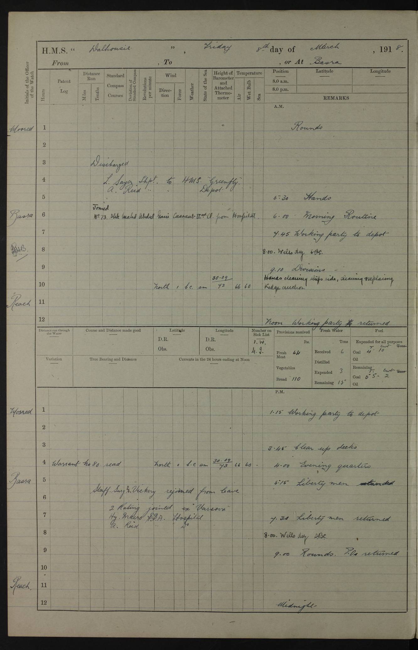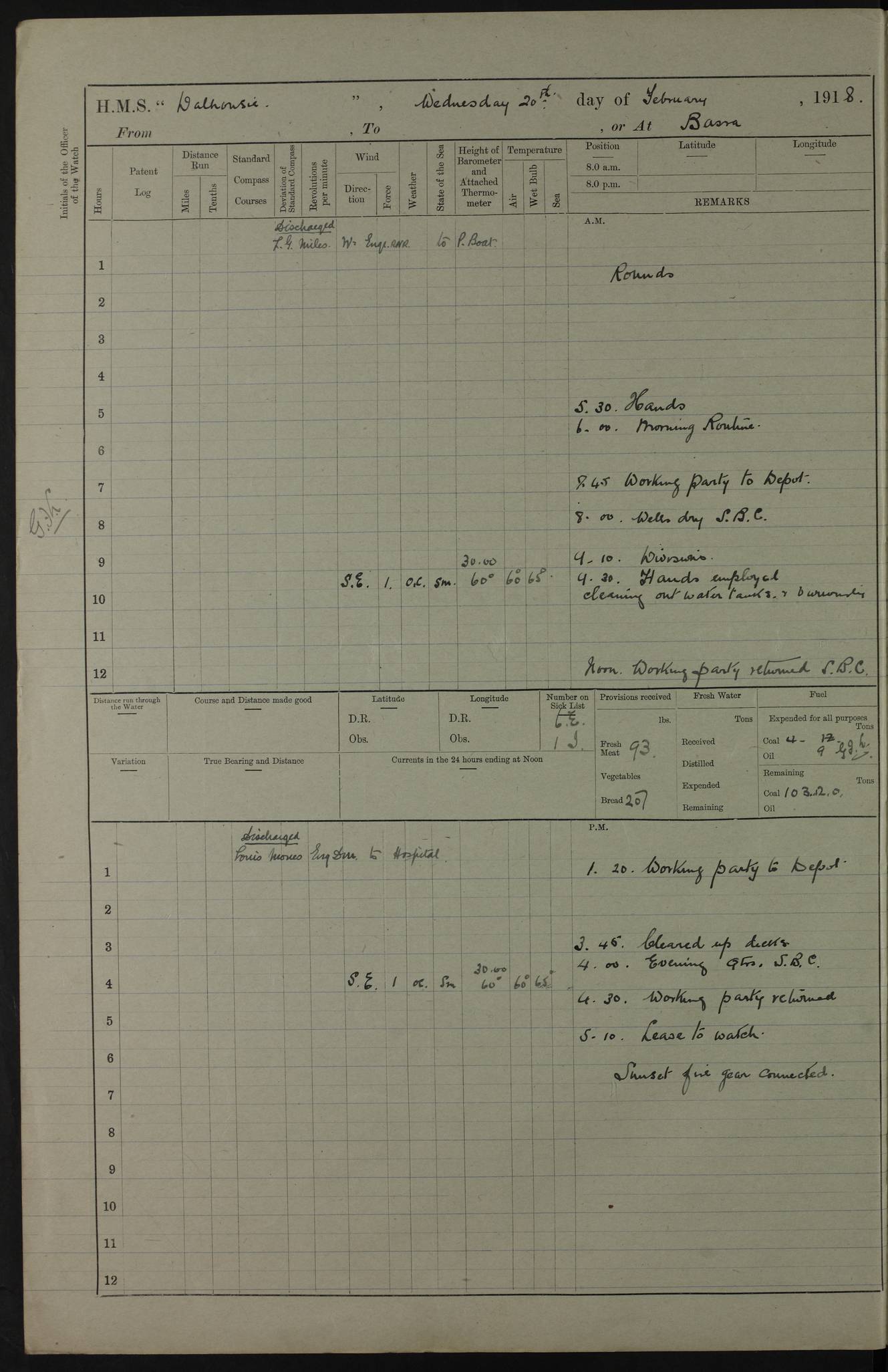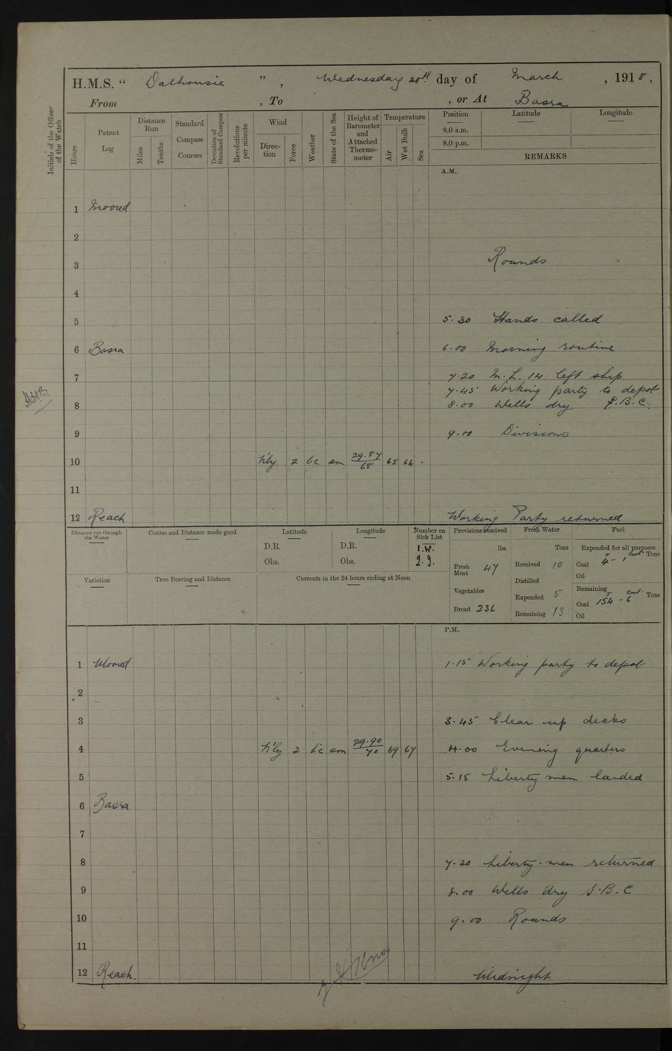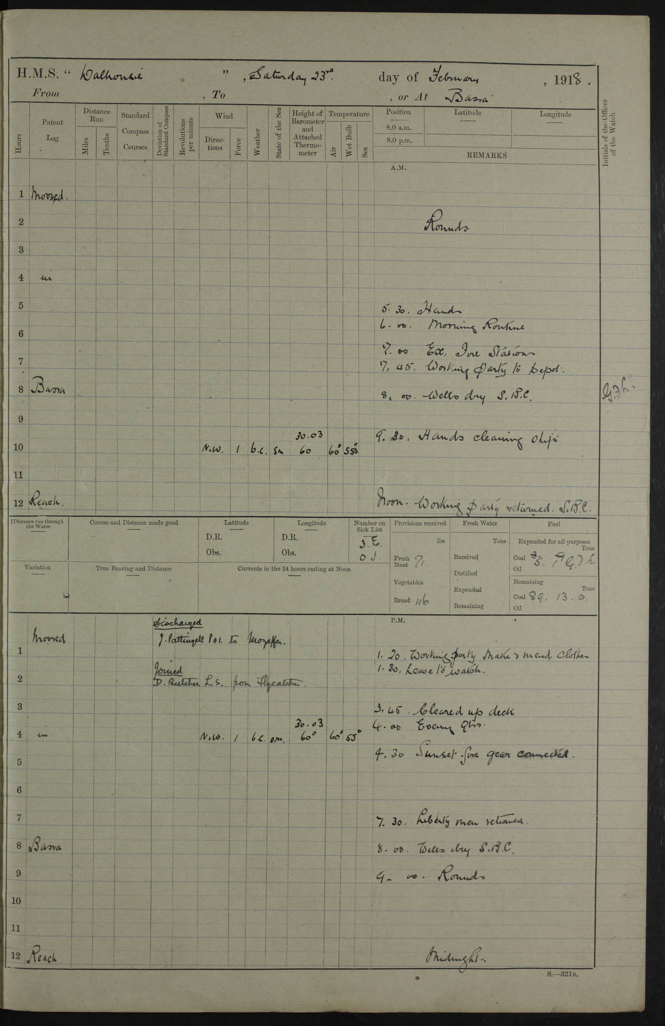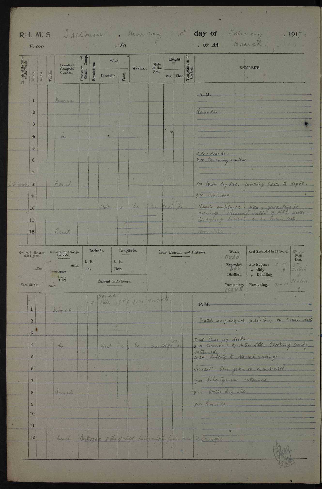 AM – Discharged To EKMA: PJ O’Connor, Lieutenant Royal Navy To Passage: 2 Indian Ratings To FLYCATCHER: D Butcher, Leading Seaman 4ef4fb19e53e0a0c910059d0: (https://s3.amazonaws.com:443/oldweather/ADM53-39410/0015_0.jpg) 26 February 1918 Place: Basrah Lat 30.5269, Long 47.8407 2:00am: Rounds 5:30am: Hands 6:00am: Morning Routine 7:45am: Working party to Depot 8:00am: Wells dry - Signal Books correct 9:10am: Divisions 10:00am: Hands employed painting in cabins & as requisite 12:00pm: Signal Books correct – Working party returned 1:20pm: Working party to Depot 3:45pm: Cleared up decks 4:00pm: Evening Quarters – Signal Books correct 4:30pm: Working party returned 5:10pm: Leave to Watch 6:00pm: Sunset - Fire Gear connected 7:30pm: Liberty men returned 8:00pm: Wells dry - Signal Books correct 9:00pm: Rounds – Signal Books correct PM – Joined From TARANTULA: J Baldwin, Leading Signalman From Hospital: Louis Mones, Engineering driver PM - Discharged To MANTIS: G Munay, Leading Signalman – C Killburn, Signalman To TARANTULA: CM Leary, Telegrapher 4ef4fb19e53e0a0c910059d1: (https://s3.amazonaws.com:443/oldweather/ADM53-39410/0015_1.jpg) 27 February 1918 Place: Basrah Lat 30.5269, Long 47.8407 2:00am: Rounds 5:30am: Hands 6:00am: Morning Routine 7:45am: Working party to Depot 8:00am: Wells dry - Signal Books correct 9:10am: Divisions 10:00am: Hands employed packing surveyed stores, cleaning out boats & painting in Warrant Ratings 12:00pm: Signal Books correct – Working party returned 1:20pm: Working party to Depot 3:45pm: Cleared up decks 4:00pm: Evening Quarters – Signal Books correct 4:30pm: Working party returned 5:10pm: Leave to Watch 6:00pm: Sunset - Fire Gear connected 7:30pm: Liberty men returned 8:00pm: Wells dry - Signal Books correct 9:00pm: Rounds – Signal Books correct AM – Joined From ELEPHANTA: No. 22 Sheik Kadir Sheik Mahomed, Lascar 2nd – No. 41 Abdool Rahman Sheik Dawood, Lamp Trimmer – No. 56 Mahomed Sabia Sheik Bosman, Stoker 2nd – No. 50A Sheik Mahomed Sheik Hassan, Stoker 2nd – No. 90 Abelino Fernandez, Topass – No. 86 Avelino Leitas, Topass 4ef4fb1ae53e0a0c910059d2: (https://s3.amazonaws.com:443/oldweather/ADM53-39410/0016_0.jpg) 28 February 1918 Place: Basrah Lat 30.5269, Long 47.8407 2:00am: Rounds 5:30am: Hands 6:00am: Morning Routine 7:45am: Working party to Depot 8:00am: Wells dry - Signal Books correct 9:10am: Divisions 10:00am: Hands employed discharging stores 12:00pm: Signal Books correct – Working party returned 1:00pm: Issued Quinine to Naval Ratings - Issued Quinine to Native Ratings 1:20pm: Working party to Depot 3:45pm: Cleared up decks 4:00pm: Evening Quarters – Signal Books correct 4:30pm: Working party returned 5:10pm: Leave to Watch 6:00pm: Sunset - Fire Gear connected 7:30pm: Liberty men returned 8:00pm: Wells dry - Signal Books correct 9:00pm: Rounds – Signal Books correct PM – Joined From SAPPHIRE: WC Woolley, Petty Officer PM - Discharged To TARANTULA: L Harris, Signalman To SEDGEFLY: T Hughes, Able Seaman To MANTIS: S Redshaw, Able Seaman To Depot: R Matheison, Stoker – H Philo, Stoker TO GRAYFLY: H Stockbridge, Senior Petty Officer 4ef4fb1ae53e0a0c910059d3: (https://s3.amazonaws.com:443/oldweather/ADM53-39410/0016_1.jpg) Log Page – Blank – no data on Page 4ef4fb1ae53e0a0c910059d4: (https://s3.amazonaws.com:443/oldweather/ADM53-39410/0017_0.jpg) Log Page – Blank – no data on Page 4ef4fb1ae53e0a0c910059d5: (https://s3.amazonaws.com:443/oldweather/ADM53-39410/0017_1.jpg) Log Page – Blank 4ef4fb1ae53e0a0c910059d6: (https://s3.amazonaws.com:443/oldweather/ADM53-39410/0018_0.jpg) Log Page – Blank 4ef4fb1ae53e0a0c910059d7: (https://s3.amazonaws.com:443/oldweather/ADM53-39410/0018_1.jpg) Log Page – Blank LOGS FOR MARCH 1918 4ef4fb1be53e0a0c910059d8: (https://s3.amazonaws.com:443/oldweather/ADM53-39411/0000_0.jpg) Log Page – Cover March 1918 4ef4fb1be53e0a0c910059d9: (https://s3.amazonaws.com:443/oldweather/ADM53-39411/0000_1.jpg) Log Page – Cover – March 1918 4ef4fb1be53e0a0c910059da: (https://s3.amazonaws.com:443/oldweather/ADM53-39411/0001_0.jpg) Log Page – Blank 4ef4fb1be53e0a0c910059db: (https://s3.amazonaws.com:443/oldweather/ADM53-39411/0001_1.jpg) Log Page – Blank – no data on Page 4ef4fb1ce53e0a0c910059dc: (https://s3.amazonaws.com:443/oldweather/ADM53-39411/0002_0.jpg) Log Page – Blank – no data on Page 4ef4fb1ce53e0a0c910059dd: (https://s3.amazonaws.com:443/oldweather/ADM53-39411/0002_1.jpg) 1 March 1918 Place: Basrah Lat 30.5269, Long 47.8407 1:00am: drew from Field Chest Treasury Officer Basrah Five thousand (5,000) Rupees only 2:00am: Rounds 5:30am: Hands 6:00am: Morning Routine 7:45am: Working party to Depot 8:00am: Wells dry – Signal Books correct – CHAKLA arrived with 5 Officers & 60 Ratings 12:00pm: Signal Books correct – Working party returned 1:15pm: Working party to Depot 2:00pm: Paid Lascar Ratings 3:45pm: Cleared up decks 4:00pm: Evening Quarters 4:30pm: Working party returned 5:10pm: Leave to Watch 5:30pm: 5 Petty Officers & 57 Ratings to Bandra for Passage 6:00pm: Sunset - Fire Gear connected 7:30pm: Liberty men returned 9:00pm: Rounds – Petty Officers returned AM – Joined From CHALKA: Hawkins, Paymaster Royal Navy PM - Discharged To FLYCATCHER: Dennis, Sub Lieutenant Royal Navy Volunteer Reserve To TARANTULA: L Harris, Signalman To SEDGEFLY: TG Hughes, Able Seaman To MANTIS: S Redshaw, Able Seaman To Depot: R Mathieson, Stoker To GRAYFLY: H Stockbridge, Senior Petty Officer 4ef4fb1ce53e0a0c910059de: (https://s3.amazonaws.com:443/oldweather/ADM53-39411/0003_0.jpg) 2 March 1918 Place: Basrah Lat 30.5269, Long 47.8407 2:00am: Rounds 5:30am: Hands 6:00am: Morning Routine 7:00am: Exercised Fire Stations 7:45am: Working party to Depot 8:00am: Wells dry - Signal Books correct 9:10am: Divisions 10:00am: Hands employed as requisite 12:00pm: Working party returned 1:15pm: Working party to Depot 3:45pm: Cleared up decks 4:00pm: Evening Quarters – Signal Books corr