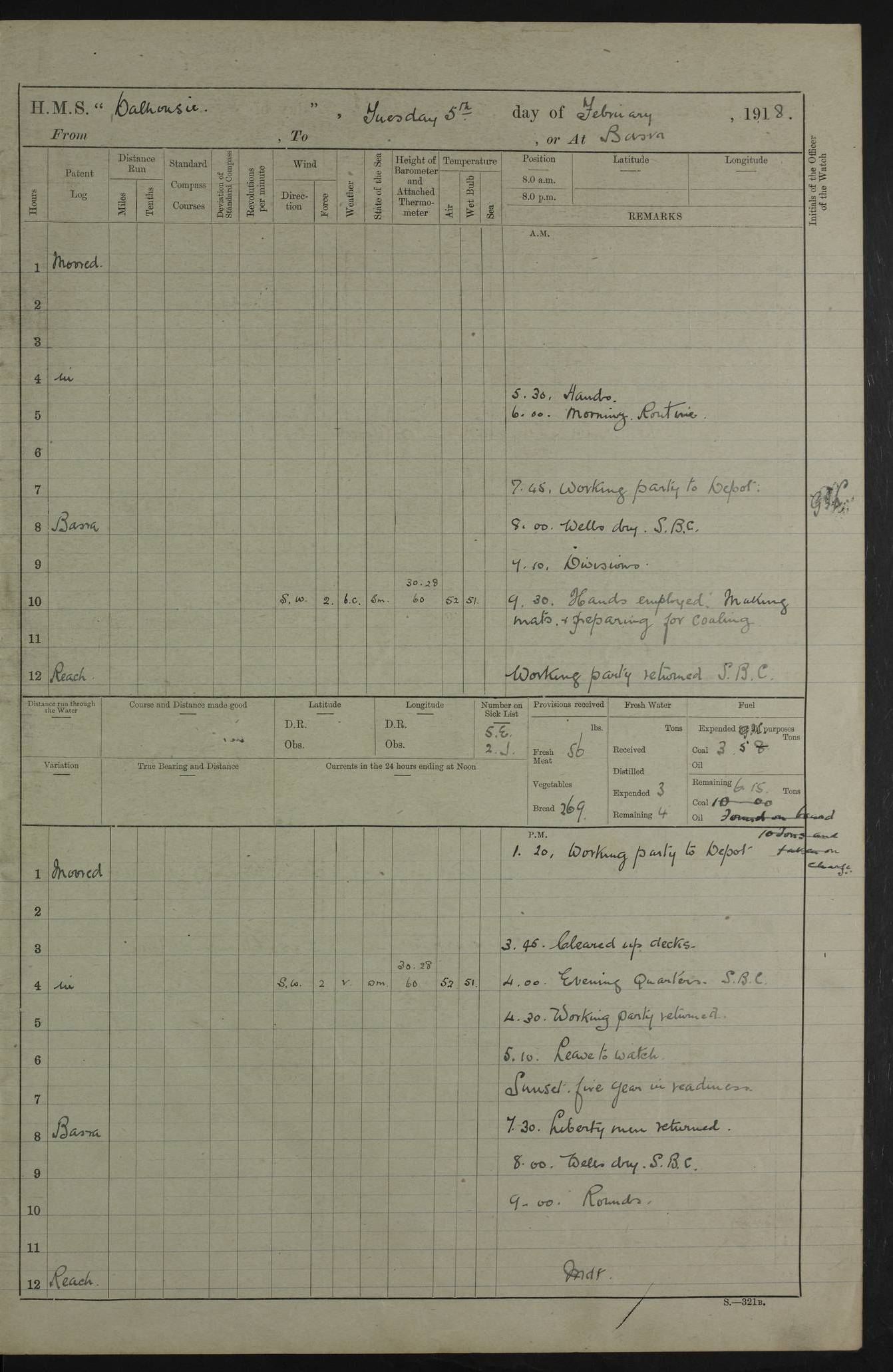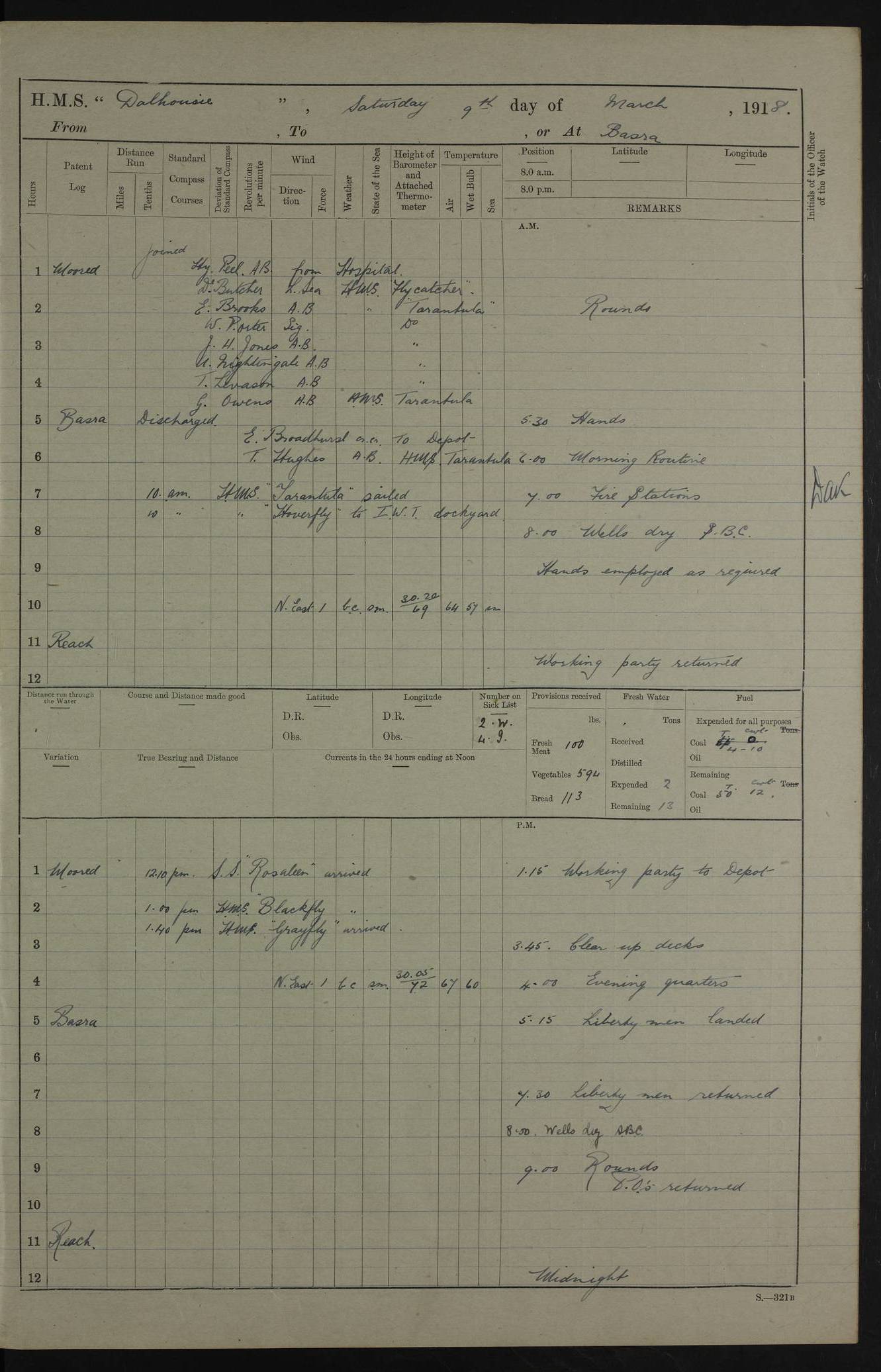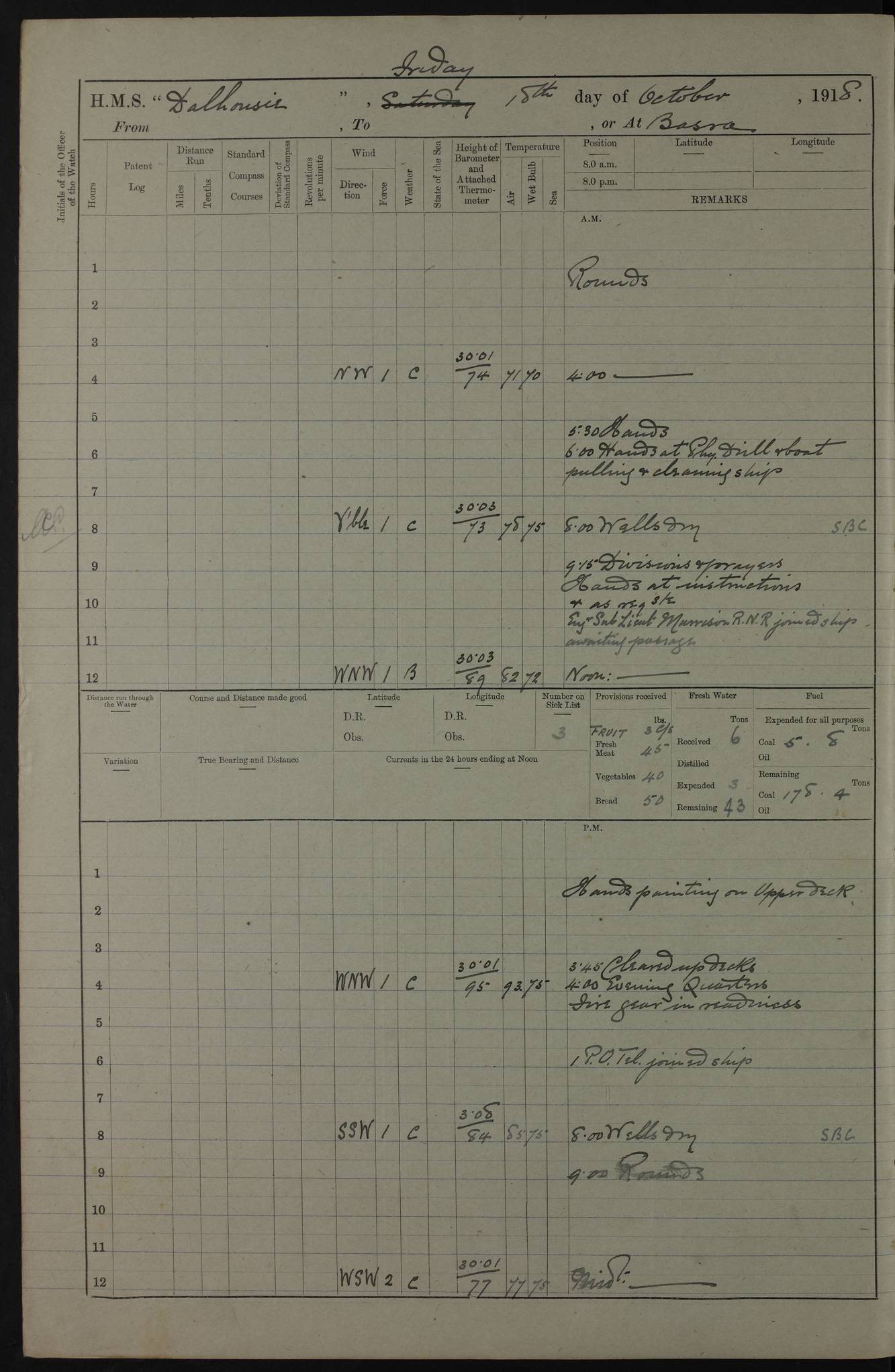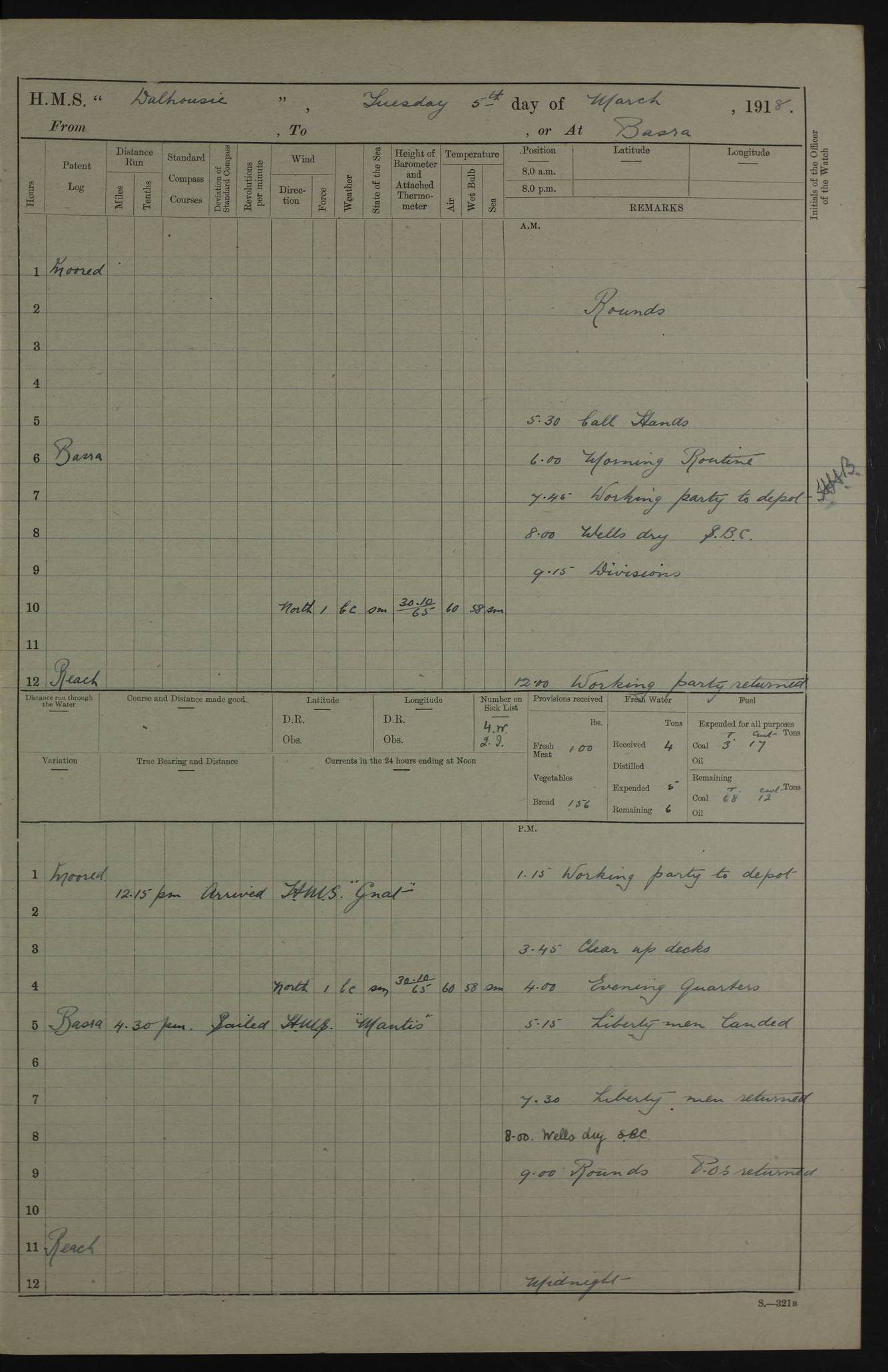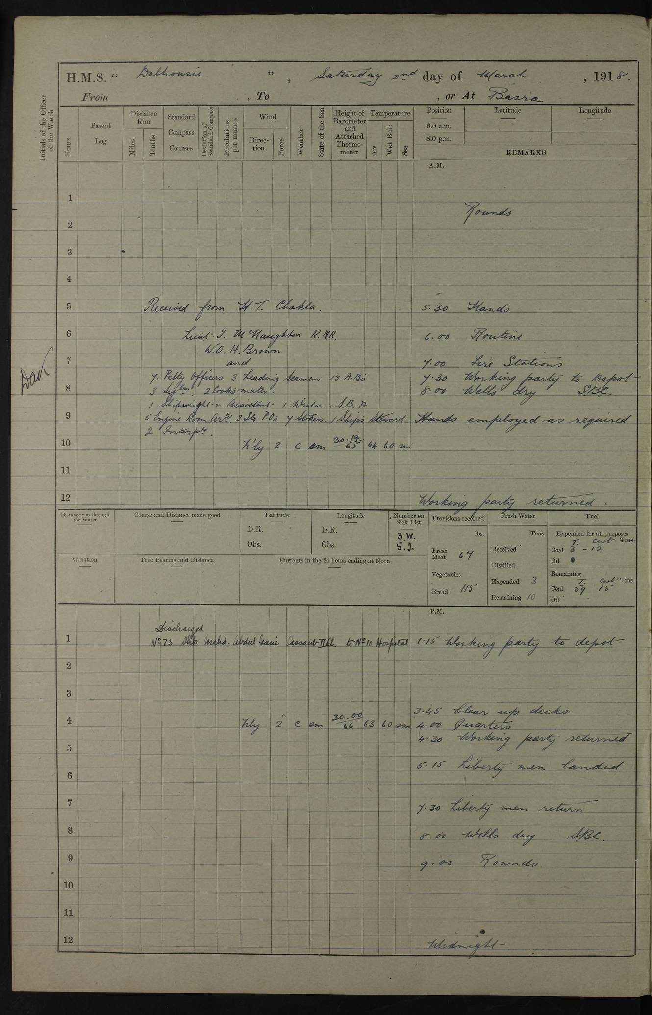 AM – Discharged To EKMA: PJ O’Connor, Lieutenant Royal Navy To Passage: 2 Indian Ratings To FLYCATCHER: D Butcher, Leading Seaman 4ef4fb19e53e0a0c910059d0: (https://s3.amazonaws.com:443/oldweather/ADM53-39410/0015_0.jpg) 26 February 1918 Place: Basrah Lat 30.5269, Long 47.8407 2:00am: Rounds 5:30am: Hands 6:00am: Morning Routine 7:45am: Working party to Depot 8:00am: Wells dry - Signal Books correct 9:10am: Divisions 10:00am: Hands employed painting in cabins & as requisite 12:00pm: Signal Books correct – Working party returned 1:20pm: Working party to Depot 3:45pm: Cleared up decks 4:00pm: Evening Quarters – Signal Books correct 4:30pm: Working party returned 5:10pm: Leave to Watch 6:00pm: Sunset - Fire Gear connected 7:30pm: Liberty men returned 8:00pm: Wells dry - Signal Books correct 9:00pm: Rounds – Signal Books correct PM – Joined From TARANTULA: J Baldwin, Leading Signalman From Hospital: Louis Mones, Engineering driver PM - Discharged To MANTIS: G Munay, Leading Signalman – C Killburn, Signalman To TARANTULA: CM Leary, Telegrapher 4ef4fb19e53e0a0c910059d1: (https://s3.amazonaws.com:443/oldweather/ADM53-39410/0015_1.jpg) 27 February 1918 Place: Basrah Lat 30.5269, Long 47.8407 2:00am: Rounds 5:30am: Hands 6:00am: Morning Routine 7:45am: Working party to Depot 8:00am: Wells dry - Signal Books correct 9:10am: Divisions 10:00am: Hands employed packing surveyed stores, cleaning out boats & painting in Warrant Ratings 12:00pm: Signal Books correct – Working party returned 1:20pm: Working party to Depot 3:45pm: Cleared up decks 4:00pm: Evening Quarters – Signal Books correct 4:30pm: Working party returned 5:10pm: Leave to Watch 6:00pm: Sunset - Fire Gear connected 7:30pm: Liberty men returned 8:00pm: Wells dry - Signal Books correct 9:00pm: Rounds – Signal Books correct AM – Joined From ELEPHANTA: No. 22 Sheik Kadir Sheik Mahomed, Lascar 2nd – No. 41 Abdool Rahman Sheik Dawood, Lamp Trimmer – No. 56 Mahomed Sabia Sheik Bosman, Stoker 2nd – No. 50A Sheik Mahomed Sheik Hassan, Stoker 2nd – No. 90 Abelino Fernandez, Topass – No. 86 Avelino Leitas, Topass 4ef4fb1ae53e0a0c910059d2: (https://s3.amazonaws.com:443/oldweather/ADM53-39410/0016_0.jpg) 28 February 1918 Place: Basrah Lat 30.5269, Long 47.8407 2:00am: Rounds 5:30am: Hands 6:00am: Morning Routine 7:45am: Working party to Depot 8:00am: Wells dry - Signal Books correct 9:10am: Divisions 10:00am: Hands employed discharging stores 12:00pm: Signal Books correct – Working party returned 1:00pm: Issued Quinine to Naval Ratings - Issued Quinine to Native Ratings 1:20pm: Working party to Depot 3:45pm: Cleared up decks 4:00pm: Evening Quarters – Signal Books correct 4:30pm: Working party returned 5:10pm: Leave to Watch 6:00pm: Sunset - Fire Gear connected 7:30pm: Liberty men returned 8:00pm: Wells dry - Signal Books correct 9:00pm: Rounds – Signal Books correct PM – Joined From SAPPHIRE: WC Woolley, Petty Officer PM - Discharged To TARANTULA: L Harris, Signalman To SEDGEFLY: T Hughes, Able Seaman To MANTIS: S Redshaw, Able Seaman To Depot: R Matheison, Stoker – H Philo, Stoker TO GRAYFLY: H Stockbridge, Senior Petty Officer 4ef4fb1ae53e0a0c910059d3: (https://s3.amazonaws.com:443/oldweather/ADM53-39410/0016_1.jpg) Log Page – Blank – no data on Page 4ef4fb1ae53e0a0c910059d4: (https://s3.amazonaws.com:443/oldweather/ADM53-39410/0017_0.jpg) Log Page – Blank – no data on Page 4ef4fb1ae53e0a0c910059d5: (https://s3.amazonaws.com:443/oldweather/ADM53-39410/0017_1.jpg) Log Page – Blank 4ef4fb1ae53e0a0c910059d6: (https://s3.amazonaws.com:443/oldweather/ADM53-39410/0018_0.jpg) Log Page – Blank 4ef4fb1ae53e0a0c910059d7: (https://s3.amazonaws.com:443/oldweather/ADM53-39410/0018_1.jpg) Log Page – Blank LOGS FOR MARCH 1918 4ef4fb1be53e0a0c910059d8: (https://s3.amazonaws.com:443/oldweather/ADM53-39411/0000_0.jpg) Log Page – Cover March 1918 4ef4fb1be53e0a0c910059d9: (https://s3.amazonaws.com:443/oldweather/ADM53-39411/0000_1.jpg) Log Page – Cover – March 1918 4ef4fb1be53e0a0c910059da: (https://s3.amazonaws.com:443/oldweather/ADM53-39411/0001_0.jpg) Log Page – Blank 4ef4fb1be53e0a0c910059db: (https://s3.amazonaws.com:443/oldweather/ADM53-39411/0001_1.jpg) Log Page – Blank – no data on Page 4ef4fb1ce53e0a0c910059dc: (https://s3.amazonaws.com:443/oldweather/ADM53-39411/0002_0.jpg) Log Page – Blank – no data on Page 4ef4fb1ce53e0a0c910059dd: (https://s3.amazonaws.com:443/oldweather/ADM53-39411/0002_1.jpg) 1 March 1918 Place: Basrah Lat 30.5269, Long 47.8407 1:00am: drew from Field Chest Treasury Officer Basrah Five thousand (5,000) Rupees only 2:00am: Rounds 5:30am: Hands 6:00am: Morning Routine 7:45am: Working party to Depot 8:00am: Wells dry – Signal Books correct – CHAKLA arrived with 5 Officers & 60 Ratings 12:00pm: Signal Books correct – Working party returned 1:15pm: Working party to Depot 2:00pm: Paid Lascar Ratings 3:45pm: Cleared up decks 4:00pm: Evening Quarters 4:30pm: Working party returned 5:10pm: Leave to Watch 5:30pm: 5 Petty Officers & 57 Ratings to Bandra for Passage 6:00pm: Sunset - Fire Gear connected 7:30pm: Liberty men returned 9:00pm: Rounds – Petty Officers returned AM – Joined From CHALKA: Hawkins, Paymaster Royal Navy PM - Discharged To FLYCATCHER: Dennis, Sub Lieutenant Royal Navy Volunteer Reserve To TARANTULA: L Harris, Signalman To SEDGEFLY: TG Hughes, Able Seaman To MANTIS: S Redshaw, Able Seaman To Depot: R Mathieson, Stoker To GRAYFLY: H Stockbridge, Senior Petty Officer 4ef4fb1ce53e0a0c910059de: (https://s3.amazonaws.com:443/oldweather/ADM53-39411/0003_0.jpg) 2 March 1918 Place: Basrah Lat 30.5269, Long 47.8407 2:00am: Rounds 5:30am: Hands 6:00am: Morning Routine 7:00am: Exercised Fire Stations 7:45am: Working party to Depot 8:00am: Wells dry - Signal Books correct 9:10am: Divisions 10:00am: Hands employed as requisite 12:00pm: Working party returned 1:15pm: Working party to Depot 3:45pm: Cleared up decks 4:00pm: Evening Quarters – Signal Books corr