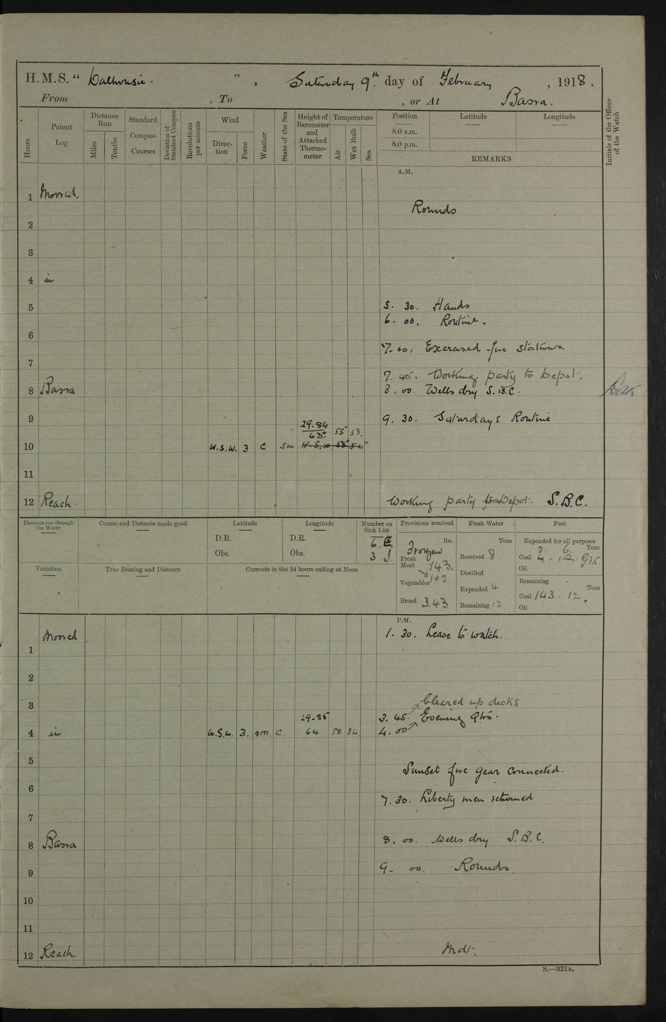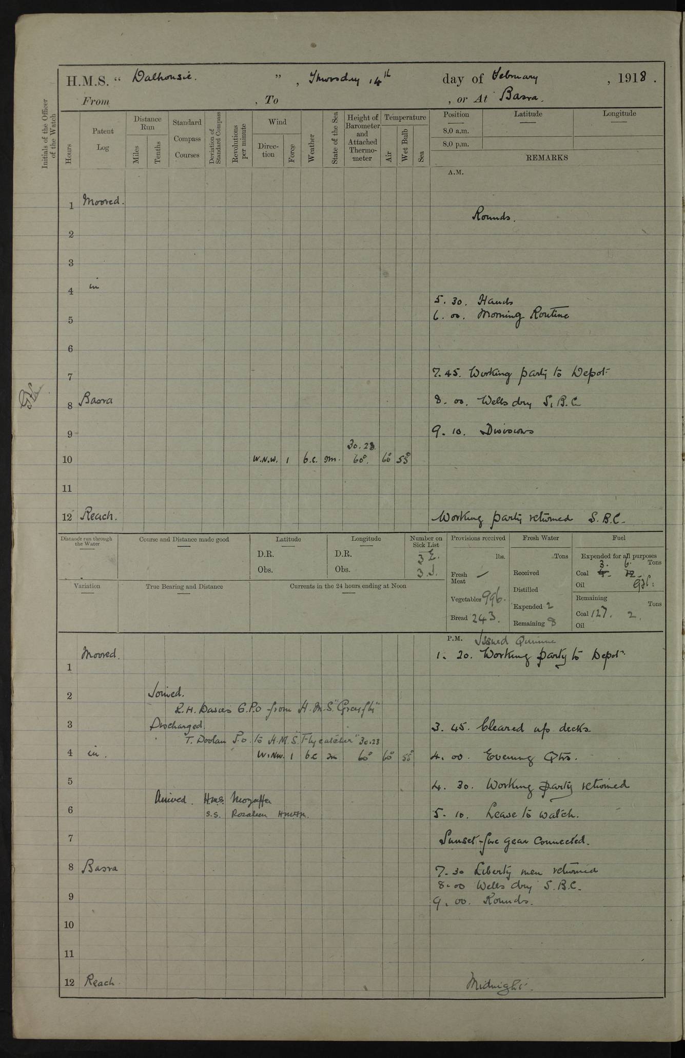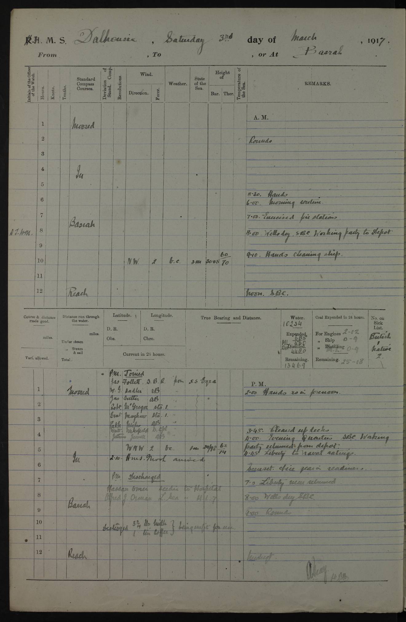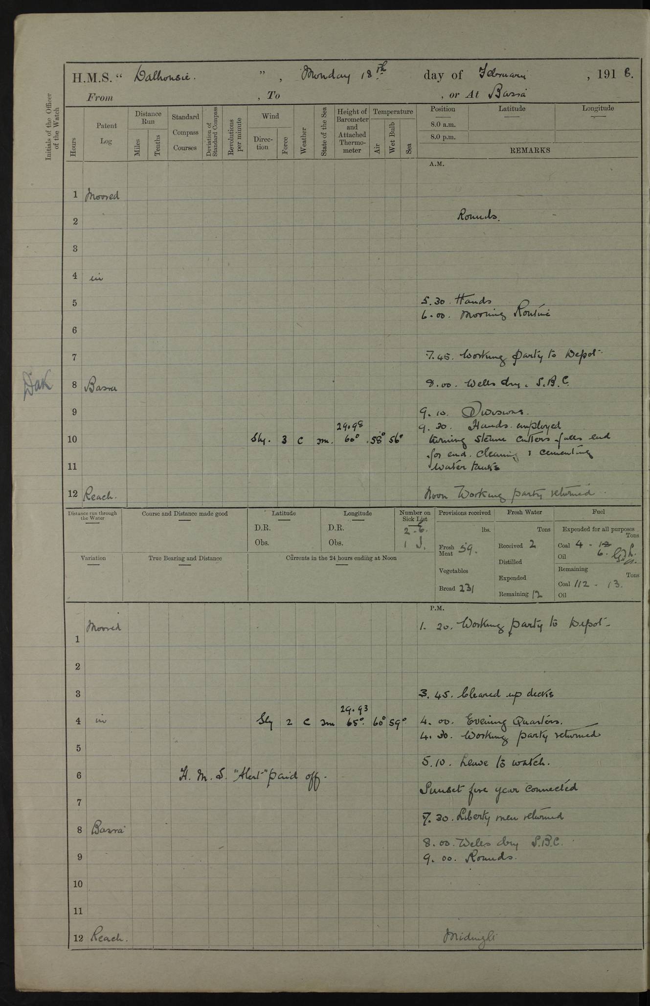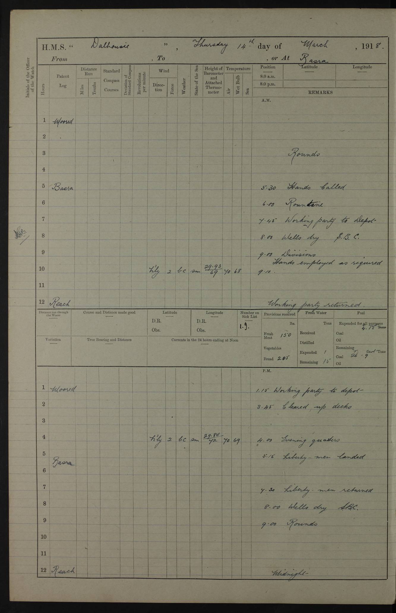 AM – Discharged To EKMA: PJ O’Connor, Lieutenant Royal Navy To Passage: 2 Indian Ratings To FLYCATCHER: D Butcher, Leading Seaman 4ef4fb19e53e0a0c910059d0: (https://s3.amazonaws.com:443/oldweather/ADM53-39410/0015_0.jpg) 26 February 1918 Place: Basrah Lat 30.5269, Long 47.8407 2:00am: Rounds 5:30am: Hands 6:00am: Morning Routine 7:45am: Working party to Depot 8:00am: Wells dry - Signal Books correct 9:10am: Divisions 10:00am: Hands employed painting in cabins & as requisite 12:00pm: Signal Books correct – Working party returned 1:20pm: Working party to Depot 3:45pm: Cleared up decks 4:00pm: Evening Quarters – Signal Books correct 4:30pm: Working party returned 5:10pm: Leave to Watch 6:00pm: Sunset - Fire Gear connected 7:30pm: Liberty men returned 8:00pm: Wells dry - Signal Books correct 9:00pm: Rounds – Signal Books correct PM – Joined From TARANTULA: J Baldwin, Leading Signalman From Hospital: Louis Mones, Engineering driver PM - Discharged To MANTIS: G Munay, Leading Signalman – C Killburn, Signalman To TARANTULA: CM Leary, Telegrapher 4ef4fb19e53e0a0c910059d1: (https://s3.amazonaws.com:443/oldweather/ADM53-39410/0015_1.jpg) 27 February 1918 Place: Basrah Lat 30.5269, Long 47.8407 2:00am: Rounds 5:30am: Hands 6:00am: Morning Routine 7:45am: Working party to Depot 8:00am: Wells dry - Signal Books correct 9:10am: Divisions 10:00am: Hands employed packing surveyed stores, cleaning out boats & painting in Warrant Ratings 12:00pm: Signal Books correct – Working party returned 1:20pm: Working party to Depot 3:45pm: Cleared up decks 4:00pm: Evening Quarters – Signal Books correct 4:30pm: Working party returned 5:10pm: Leave to Watch 6:00pm: Sunset - Fire Gear connected 7:30pm: Liberty men returned 8:00pm: Wells dry - Signal Books correct 9:00pm: Rounds – Signal Books correct AM – Joined From ELEPHANTA: No. 22 Sheik Kadir Sheik Mahomed, Lascar 2nd – No. 41 Abdool Rahman Sheik Dawood, Lamp Trimmer – No. 56 Mahomed Sabia Sheik Bosman, Stoker 2nd – No. 50A Sheik Mahomed Sheik Hassan, Stoker 2nd – No. 90 Abelino Fernandez, Topass – No. 86 Avelino Leitas, Topass 4ef4fb1ae53e0a0c910059d2: (https://s3.amazonaws.com:443/oldweather/ADM53-39410/0016_0.jpg) 28 February 1918 Place: Basrah Lat 30.5269, Long 47.8407 2:00am: Rounds 5:30am: Hands 6:00am: Morning Routine 7:45am: Working party to Depot 8:00am: Wells dry - Signal Books correct 9:10am: Divisions 10:00am: Hands employed discharging stores 12:00pm: Signal Books correct – Working party returned 1:00pm: Issued Quinine to Naval Ratings - Issued Quinine to Native Ratings 1:20pm: Working party to Depot 3:45pm: Cleared up decks 4:00pm: Evening Quarters – Signal Books correct 4:30pm: Working party returned 5:10pm: Leave to Watch 6:00pm: Sunset - Fire Gear connected 7:30pm: Liberty men returned 8:00pm: Wells dry - Signal Books correct 9:00pm: Rounds – Signal Books correct PM – Joined From SAPPHIRE: WC Woolley, Petty Officer PM - Discharged To TARANTULA: L Harris, Signalman To SEDGEFLY: T Hughes, Able Seaman To MANTIS: S Redshaw, Able Seaman To Depot: R Matheison, Stoker – H Philo, Stoker TO GRAYFLY: H Stockbridge, Senior Petty Officer 4ef4fb1ae53e0a0c910059d3: (https://s3.amazonaws.com:443/oldweather/ADM53-39410/0016_1.jpg) Log Page – Blank – no data on Page 4ef4fb1ae53e0a0c910059d4: (https://s3.amazonaws.com:443/oldweather/ADM53-39410/0017_0.jpg) Log Page – Blank – no data on Page 4ef4fb1ae53e0a0c910059d5: (https://s3.amazonaws.com:443/oldweather/ADM53-39410/0017_1.jpg) Log Page – Blank 4ef4fb1ae53e0a0c910059d6: (https://s3.amazonaws.com:443/oldweather/ADM53-39410/0018_0.jpg) Log Page – Blank 4ef4fb1ae53e0a0c910059d7: (https://s3.amazonaws.com:443/oldweather/ADM53-39410/0018_1.jpg) Log Page – Blank LOGS FOR MARCH 1918 4ef4fb1be53e0a0c910059d8: (https://s3.amazonaws.com:443/oldweather/ADM53-39411/0000_0.jpg) Log Page – Cover March 1918 4ef4fb1be53e0a0c910059d9: (https://s3.amazonaws.com:443/oldweather/ADM53-39411/0000_1.jpg) Log Page – Cover – March 1918 4ef4fb1be53e0a0c910059da: (https://s3.amazonaws.com:443/oldweather/ADM53-39411/0001_0.jpg) Log Page – Blank 4ef4fb1be53e0a0c910059db: (https://s3.amazonaws.com:443/oldweather/ADM53-39411/0001_1.jpg) Log Page – Blank – no data on Page 4ef4fb1ce53e0a0c910059dc: (https://s3.amazonaws.com:443/oldweather/ADM53-39411/0002_0.jpg) Log Page – Blank – no data on Page 4ef4fb1ce53e0a0c910059dd: (https://s3.amazonaws.com:443/oldweather/ADM53-39411/0002_1.jpg) 1 March 1918 Place: Basrah Lat 30.5269, Long 47.8407 1:00am: drew from Field Chest Treasury Officer Basrah Five thousand (5,000) Rupees only 2:00am: Rounds 5:30am: Hands 6:00am: Morning Routine 7:45am: Working party to Depot 8:00am: Wells dry – Signal Books correct – CHAKLA arrived with 5 Officers & 60 Ratings 12:00pm: Signal Books correct – Working party returned 1:15pm: Working party to Depot 2:00pm: Paid Lascar Ratings 3:45pm: Cleared up decks 4:00pm: Evening Quarters 4:30pm: Working party returned 5:10pm: Leave to Watch 5:30pm: 5 Petty Officers & 57 Ratings to Bandra for Passage 6:00pm: Sunset - Fire Gear connected 7:30pm: Liberty men returned 9:00pm: Rounds – Petty Officers returned AM – Joined From CHALKA: Hawkins, Paymaster Royal Navy PM - Discharged To FLYCATCHER: Dennis, Sub Lieutenant Royal Navy Volunteer Reserve To TARANTULA: L Harris, Signalman To SEDGEFLY: TG Hughes, Able Seaman To MANTIS: S Redshaw, Able Seaman To Depot: R Mathieson, Stoker To GRAYFLY: H Stockbridge, Senior Petty Officer 4ef4fb1ce53e0a0c910059de: (https://s3.amazonaws.com:443/oldweather/ADM53-39411/0003_0.jpg) 2 March 1918 Place: Basrah Lat 30.5269, Long 47.8407 2:00am: Rounds 5:30am: Hands 6:00am: Morning Routine 7:00am: Exercised Fire Stations 7:45am: Working party to Depot 8:00am: Wells dry - Signal Books correct 9:10am: Divisions 10:00am: Hands employed as requisite 12:00pm: Working party returned 1:15pm: Working party to Depot 3:45pm: Cleared up decks 4:00pm: Evening Quarters – Signal Books corr