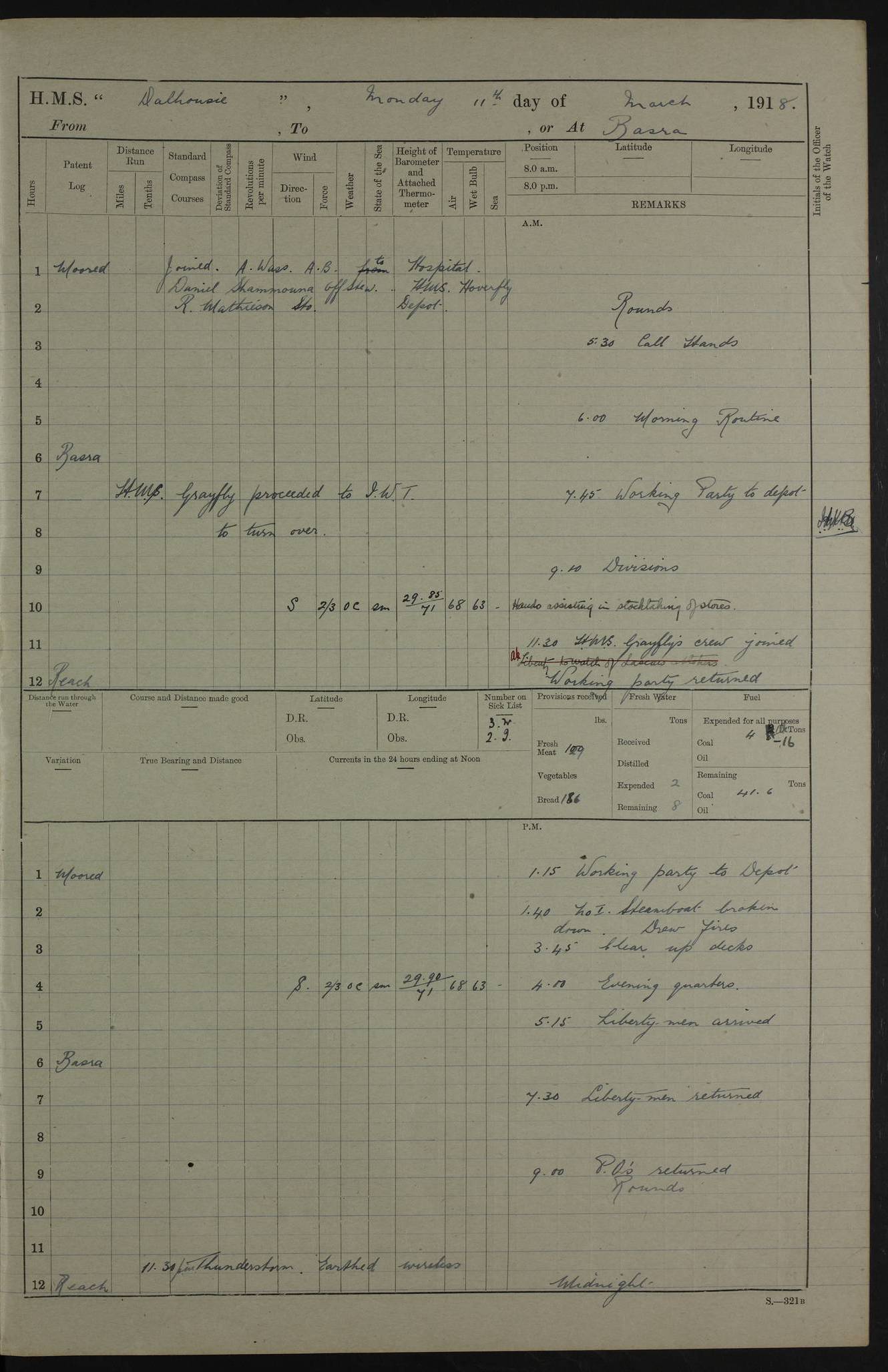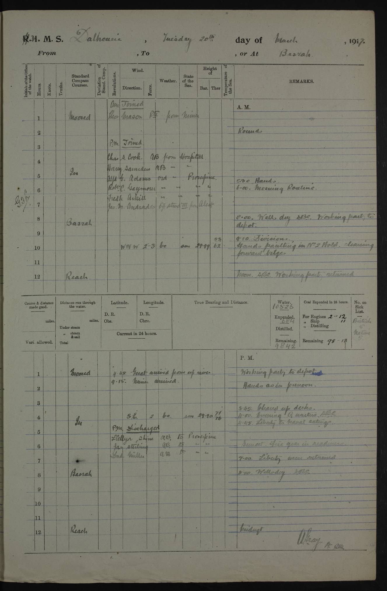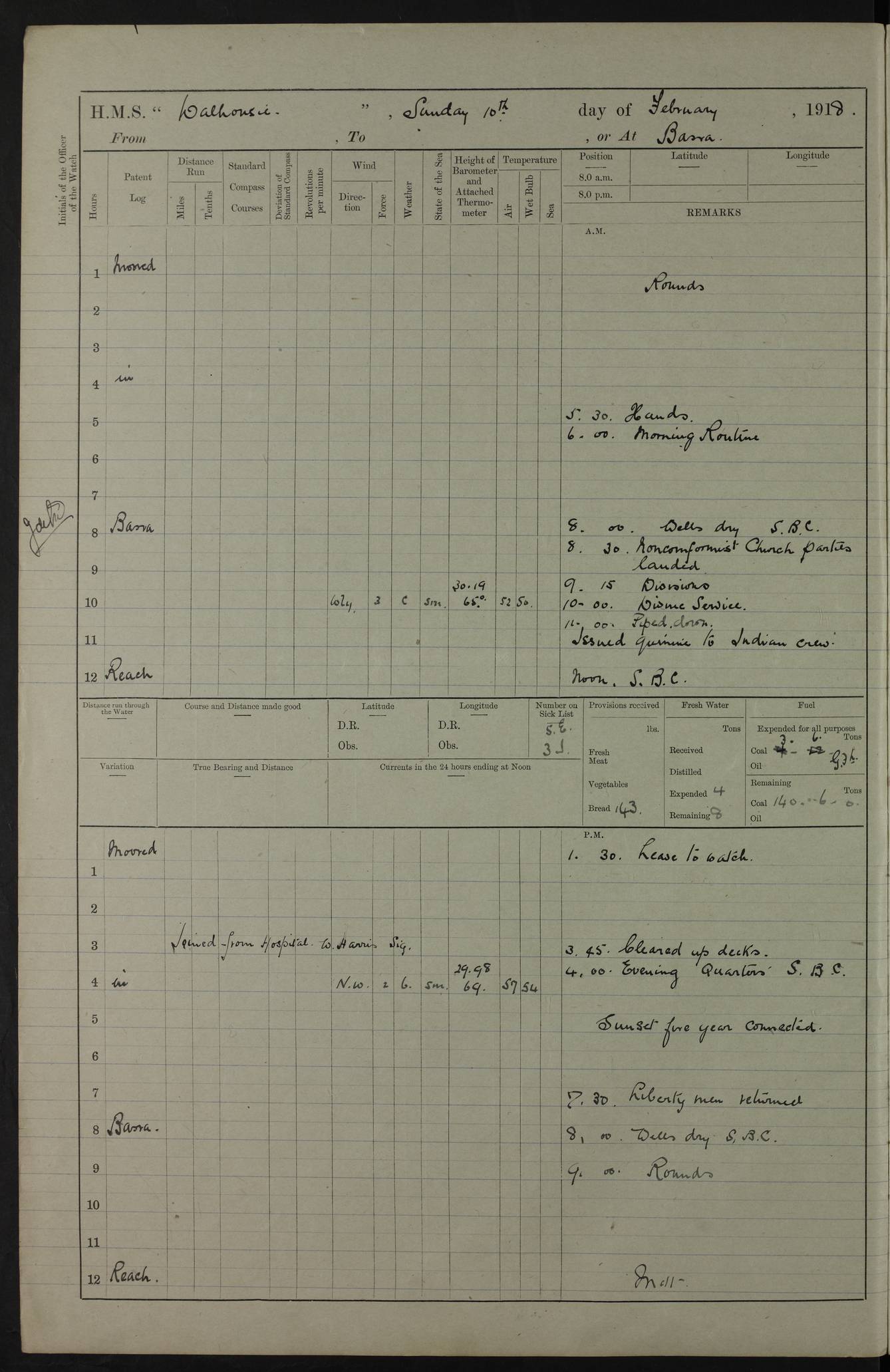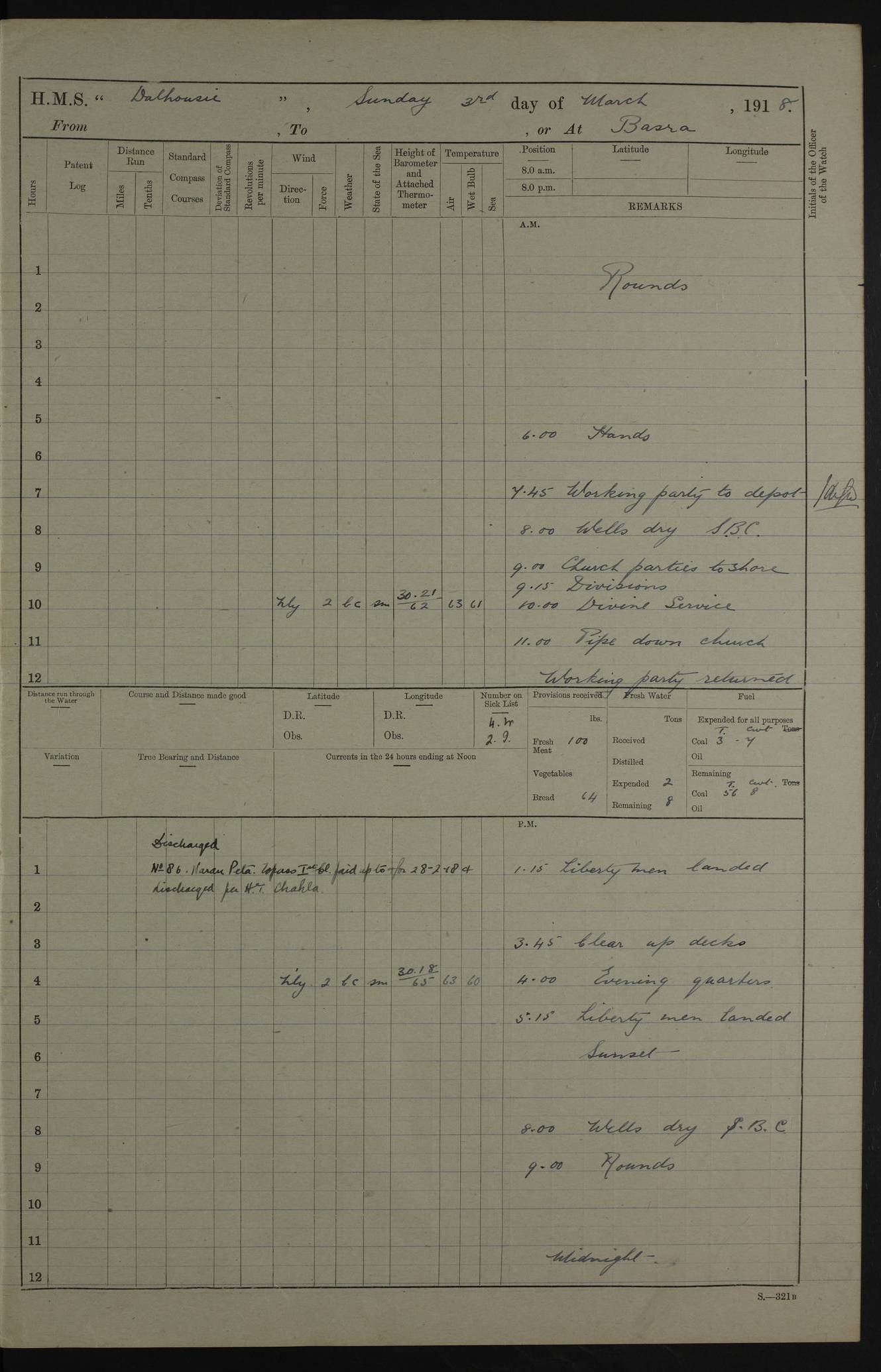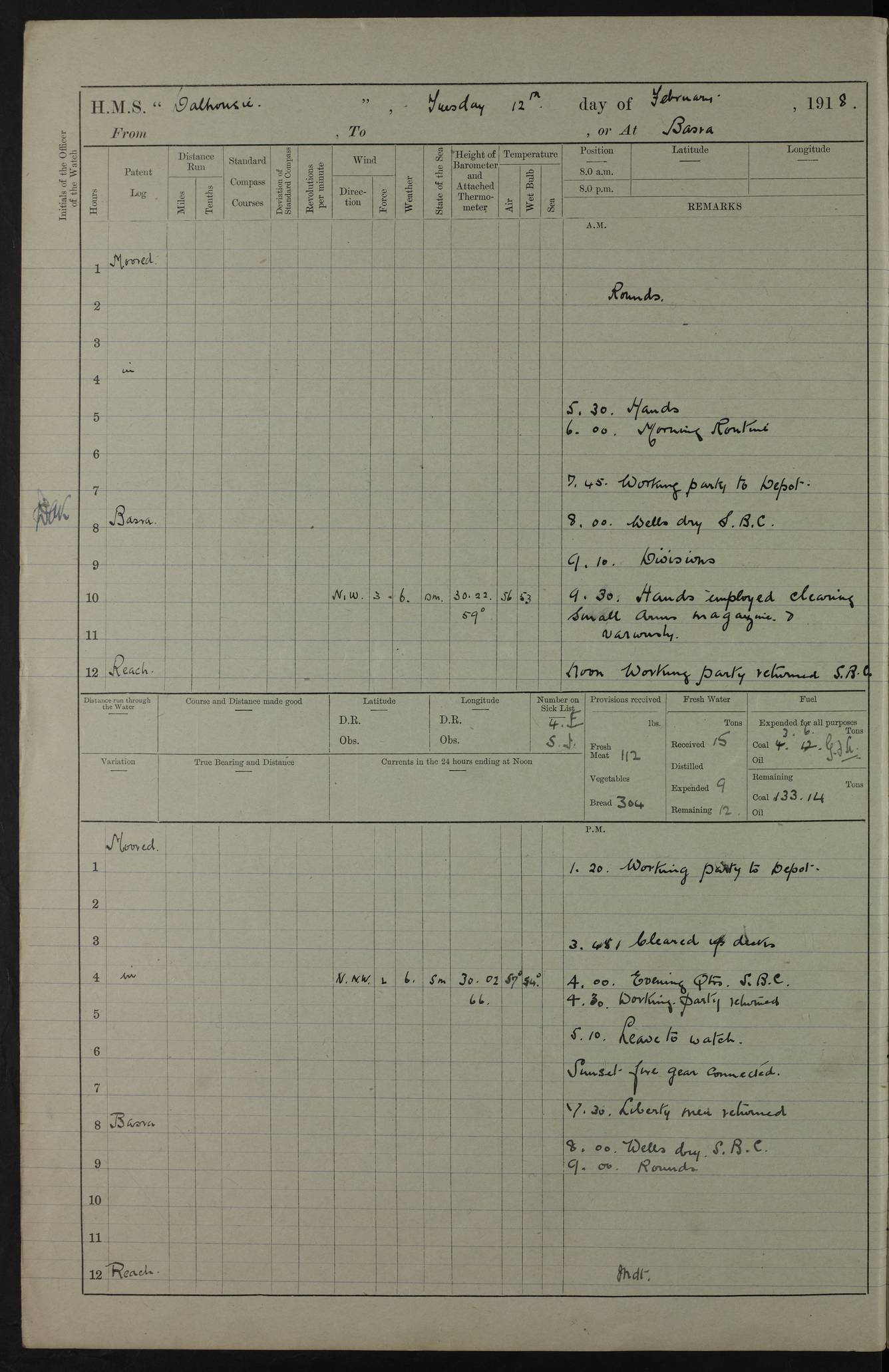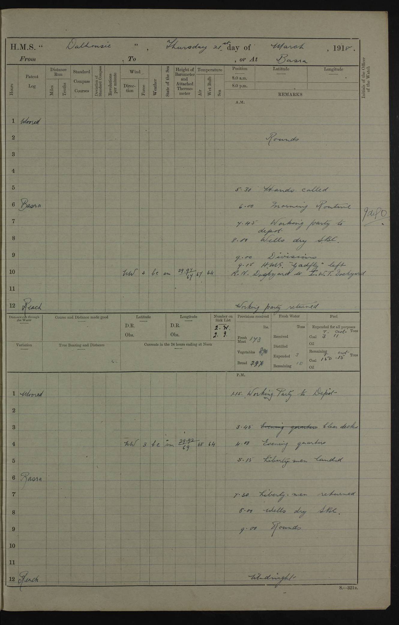 AM – Discharged To EKMA: PJ O’Connor, Lieutenant Royal Navy To Passage: 2 Indian Ratings To FLYCATCHER: D Butcher, Leading Seaman 4ef4fb19e53e0a0c910059d0: (https://s3.amazonaws.com:443/oldweather/ADM53-39410/0015_0.jpg) 26 February 1918 Place: Basrah Lat 30.5269, Long 47.8407 2:00am: Rounds 5:30am: Hands 6:00am: Morning Routine 7:45am: Working party to Depot 8:00am: Wells dry - Signal Books correct 9:10am: Divisions 10:00am: Hands employed painting in cabins & as requisite 12:00pm: Signal Books correct – Working party returned 1:20pm: Working party to Depot 3:45pm: Cleared up decks 4:00pm: Evening Quarters – Signal Books correct 4:30pm: Working party returned 5:10pm: Leave to Watch 6:00pm: Sunset - Fire Gear connected 7:30pm: Liberty men returned 8:00pm: Wells dry - Signal Books correct 9:00pm: Rounds – Signal Books correct PM – Joined From TARANTULA: J Baldwin, Leading Signalman From Hospital: Louis Mones, Engineering driver PM - Discharged To MANTIS: G Munay, Leading Signalman – C Killburn, Signalman To TARANTULA: CM Leary, Telegrapher 4ef4fb19e53e0a0c910059d1: (https://s3.amazonaws.com:443/oldweather/ADM53-39410/0015_1.jpg) 27 February 1918 Place: Basrah Lat 30.5269, Long 47.8407 2:00am: Rounds 5:30am: Hands 6:00am: Morning Routine 7:45am: Working party to Depot 8:00am: Wells dry - Signal Books correct 9:10am: Divisions 10:00am: Hands employed packing surveyed stores, cleaning out boats & painting in Warrant Ratings 12:00pm: Signal Books correct – Working party returned 1:20pm: Working party to Depot 3:45pm: Cleared up decks 4:00pm: Evening Quarters – Signal Books correct 4:30pm: Working party returned 5:10pm: Leave to Watch 6:00pm: Sunset - Fire Gear connected 7:30pm: Liberty men returned 8:00pm: Wells dry - Signal Books correct 9:00pm: Rounds – Signal Books correct AM – Joined From ELEPHANTA: No. 22 Sheik Kadir Sheik Mahomed, Lascar 2nd – No. 41 Abdool Rahman Sheik Dawood, Lamp Trimmer – No. 56 Mahomed Sabia Sheik Bosman, Stoker 2nd – No. 50A Sheik Mahomed Sheik Hassan, Stoker 2nd – No. 90 Abelino Fernandez, Topass – No. 86 Avelino Leitas, Topass 4ef4fb1ae53e0a0c910059d2: (https://s3.amazonaws.com:443/oldweather/ADM53-39410/0016_0.jpg) 28 February 1918 Place: Basrah Lat 30.5269, Long 47.8407 2:00am: Rounds 5:30am: Hands 6:00am: Morning Routine 7:45am: Working party to Depot 8:00am: Wells dry - Signal Books correct 9:10am: Divisions 10:00am: Hands employed discharging stores 12:00pm: Signal Books correct – Working party returned 1:00pm: Issued Quinine to Naval Ratings - Issued Quinine to Native Ratings 1:20pm: Working party to Depot 3:45pm: Cleared up decks 4:00pm: Evening Quarters – Signal Books correct 4:30pm: Working party returned 5:10pm: Leave to Watch 6:00pm: Sunset - Fire Gear connected 7:30pm: Liberty men returned 8:00pm: Wells dry - Signal Books correct 9:00pm: Rounds – Signal Books correct PM – Joined From SAPPHIRE: WC Woolley, Petty Officer PM - Discharged To TARANTULA: L Harris, Signalman To SEDGEFLY: T Hughes, Able Seaman To MANTIS: S Redshaw, Able Seaman To Depot: R Matheison, Stoker – H Philo, Stoker TO GRAYFLY: H Stockbridge, Senior Petty Officer 4ef4fb1ae53e0a0c910059d3: (https://s3.amazonaws.com:443/oldweather/ADM53-39410/0016_1.jpg) Log Page – Blank – no data on Page 4ef4fb1ae53e0a0c910059d4: (https://s3.amazonaws.com:443/oldweather/ADM53-39410/0017_0.jpg) Log Page – Blank – no data on Page 4ef4fb1ae53e0a0c910059d5: (https://s3.amazonaws.com:443/oldweather/ADM53-39410/0017_1.jpg) Log Page – Blank 4ef4fb1ae53e0a0c910059d6: (https://s3.amazonaws.com:443/oldweather/ADM53-39410/0018_0.jpg) Log Page – Blank 4ef4fb1ae53e0a0c910059d7: (https://s3.amazonaws.com:443/oldweather/ADM53-39410/0018_1.jpg) Log Page – Blank LOGS FOR MARCH 1918 4ef4fb1be53e0a0c910059d8: (https://s3.amazonaws.com:443/oldweather/ADM53-39411/0000_0.jpg) Log Page – Cover March 1918 4ef4fb1be53e0a0c910059d9: (https://s3.amazonaws.com:443/oldweather/ADM53-39411/0000_1.jpg) Log Page – Cover – March 1918 4ef4fb1be53e0a0c910059da: (https://s3.amazonaws.com:443/oldweather/ADM53-39411/0001_0.jpg) Log Page – Blank 4ef4fb1be53e0a0c910059db: (https://s3.amazonaws.com:443/oldweather/ADM53-39411/0001_1.jpg) Log Page – Blank – no data on Page 4ef4fb1ce53e0a0c910059dc: (https://s3.amazonaws.com:443/oldweather/ADM53-39411/0002_0.jpg) Log Page – Blank – no data on Page 4ef4fb1ce53e0a0c910059dd: (https://s3.amazonaws.com:443/oldweather/ADM53-39411/0002_1.jpg) 1 March 1918 Place: Basrah Lat 30.5269, Long 47.8407 1:00am: drew from Field Chest Treasury Officer Basrah Five thousand (5,000) Rupees only 2:00am: Rounds 5:30am: Hands 6:00am: Morning Routine 7:45am: Working party to Depot 8:00am: Wells dry – Signal Books correct – CHAKLA arrived with 5 Officers & 60 Ratings 12:00pm: Signal Books correct – Working party returned 1:15pm: Working party to Depot 2:00pm: Paid Lascar Ratings 3:45pm: Cleared up decks 4:00pm: Evening Quarters 4:30pm: Working party returned 5:10pm: Leave to Watch 5:30pm: 5 Petty Officers & 57 Ratings to Bandra for Passage 6:00pm: Sunset - Fire Gear connected 7:30pm: Liberty men returned 9:00pm: Rounds – Petty Officers returned AM – Joined From CHALKA: Hawkins, Paymaster Royal Navy PM - Discharged To FLYCATCHER: Dennis, Sub Lieutenant Royal Navy Volunteer Reserve To TARANTULA: L Harris, Signalman To SEDGEFLY: TG Hughes, Able Seaman To MANTIS: S Redshaw, Able Seaman To Depot: R Mathieson, Stoker To GRAYFLY: H Stockbridge, Senior Petty Officer 4ef4fb1ce53e0a0c910059de: (https://s3.amazonaws.com:443/oldweather/ADM53-39411/0003_0.jpg) 2 March 1918 Place: Basrah Lat 30.5269, Long 47.8407 2:00am: Rounds 5:30am: Hands 6:00am: Morning Routine 7:00am: Exercised Fire Stations 7:45am: Working party to Depot 8:00am: Wells dry - Signal Books correct 9:10am: Divisions 10:00am: Hands employed as requisite 12:00pm: Working party returned 1:15pm: Working party to Depot 3:45pm: Cleared up decks 4:00pm: Evening Quarters – Signal Books corr