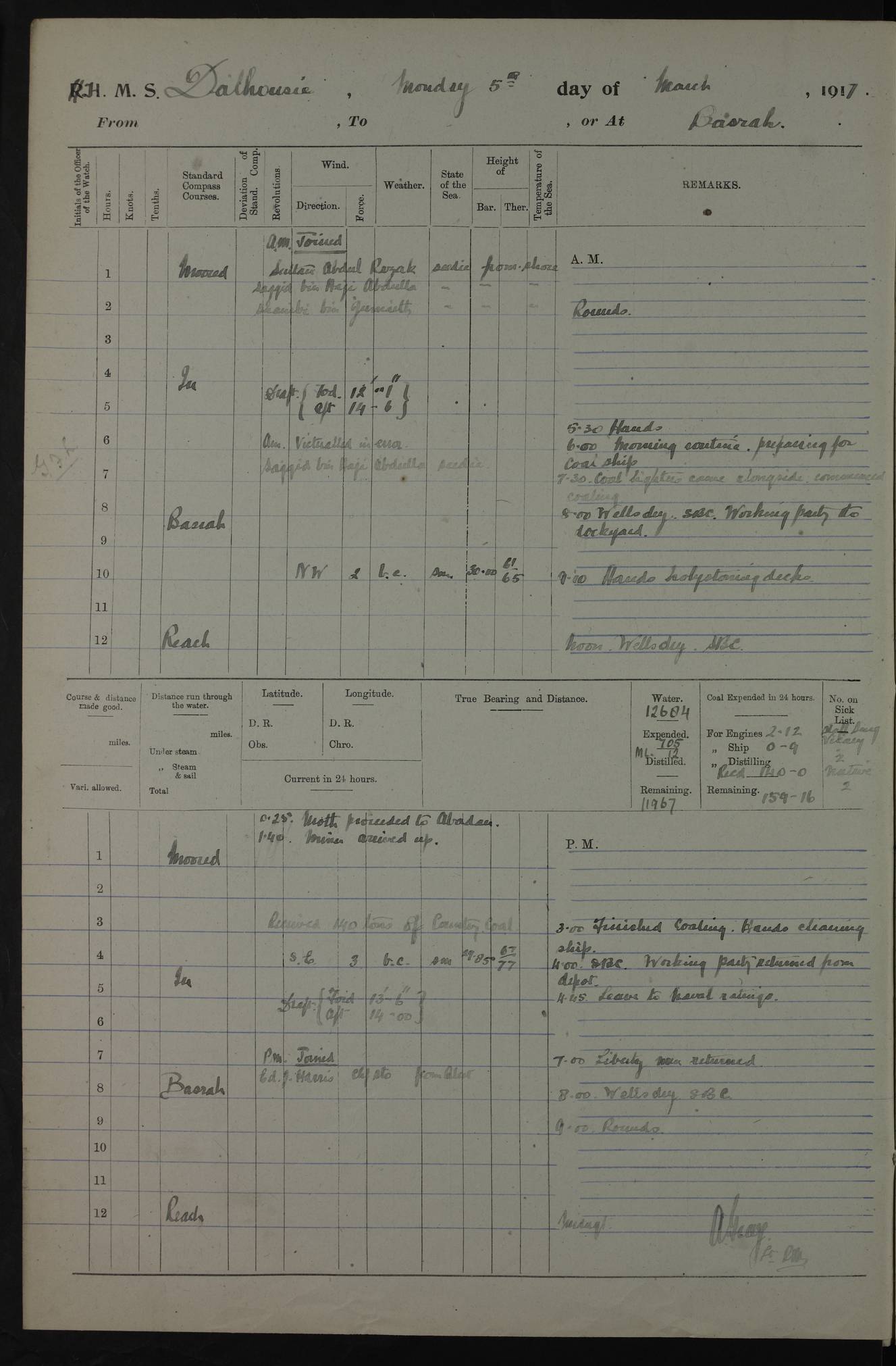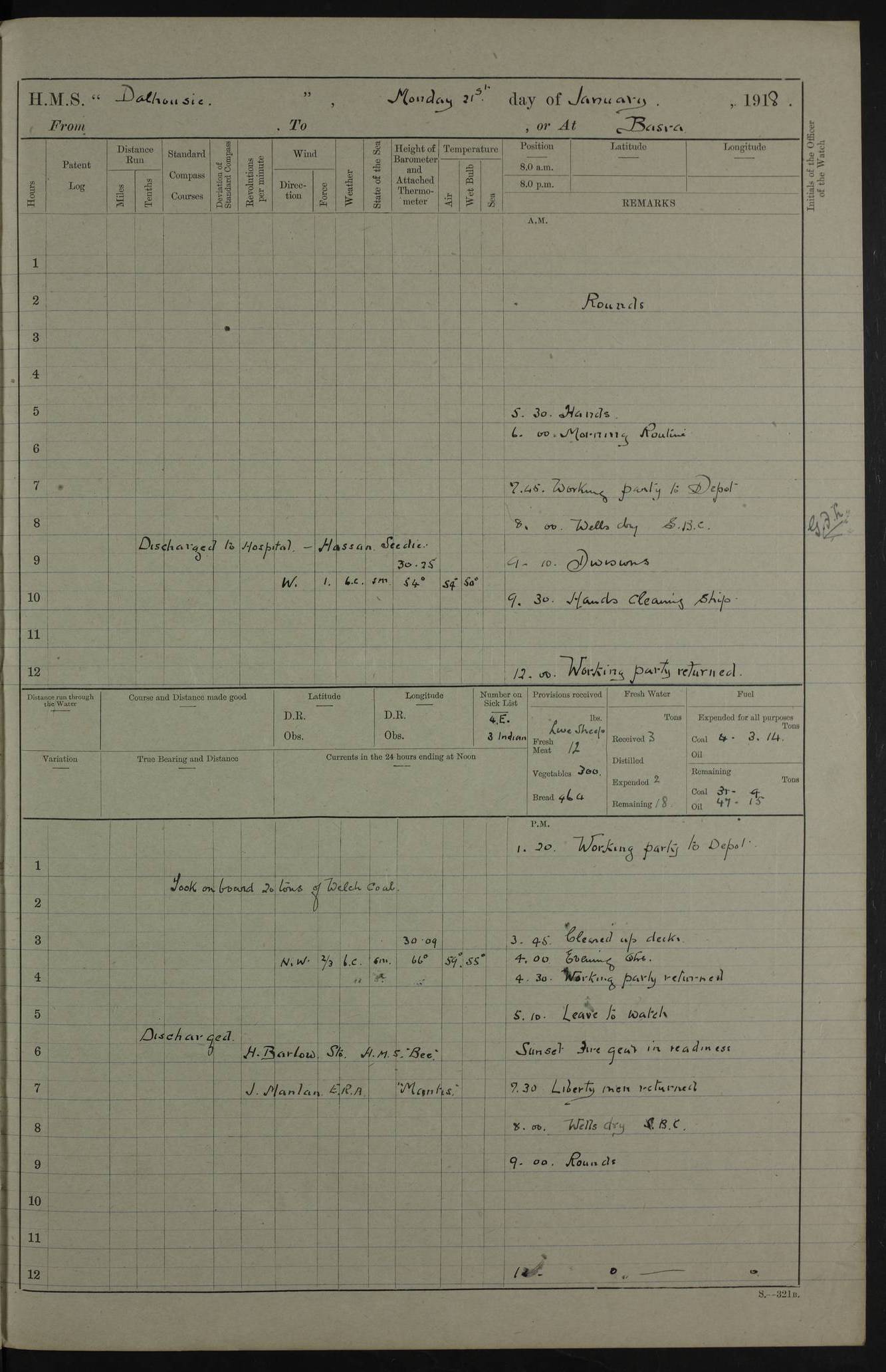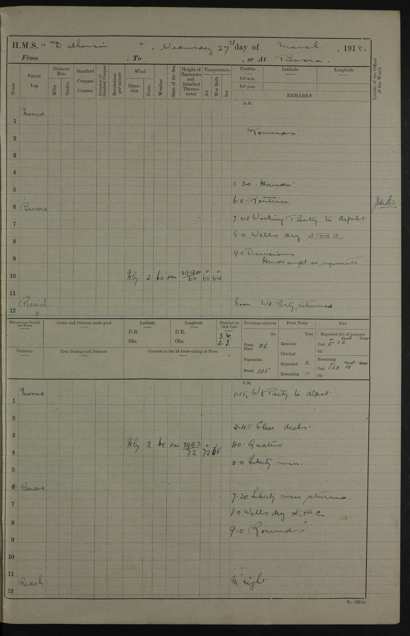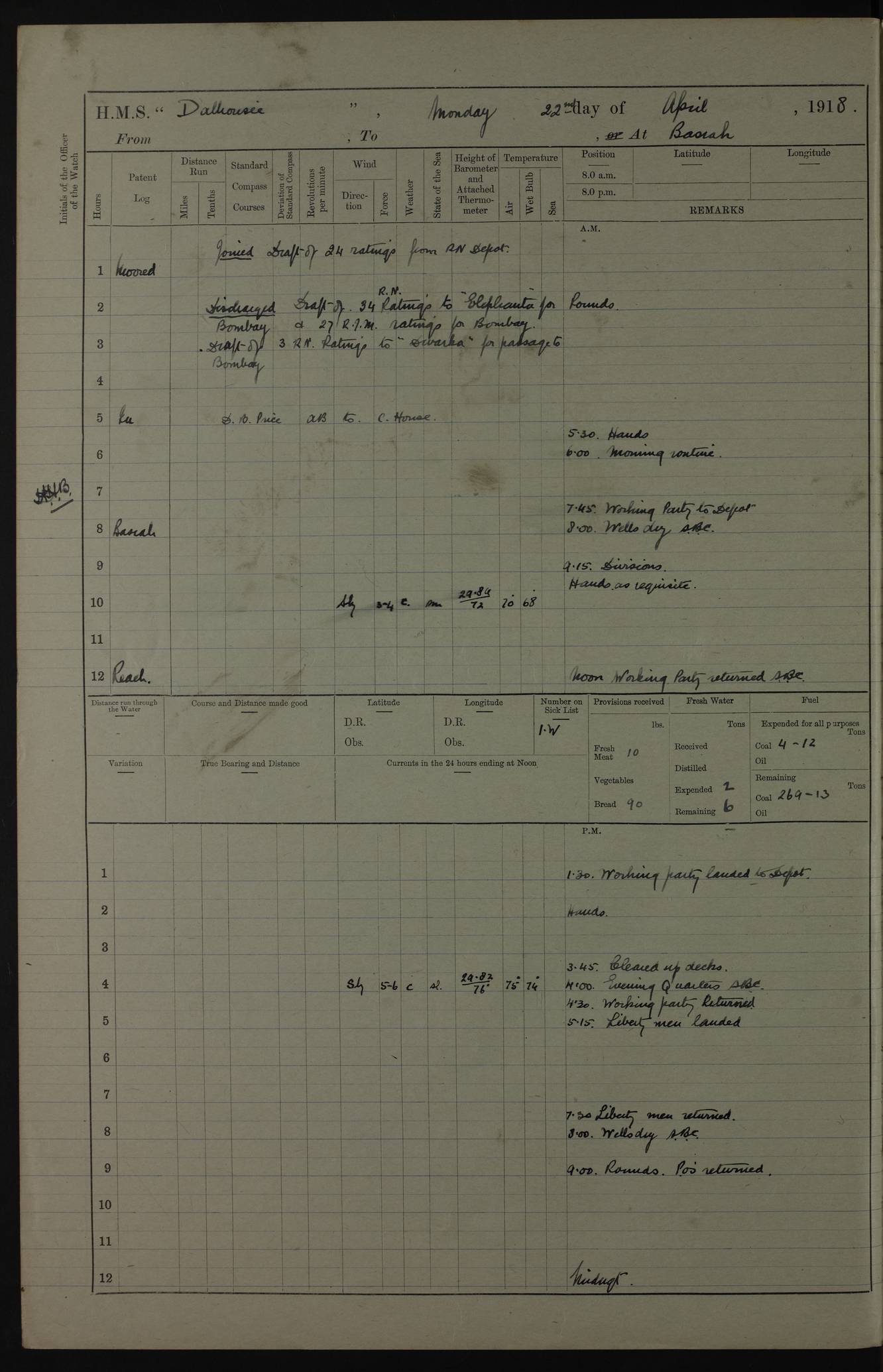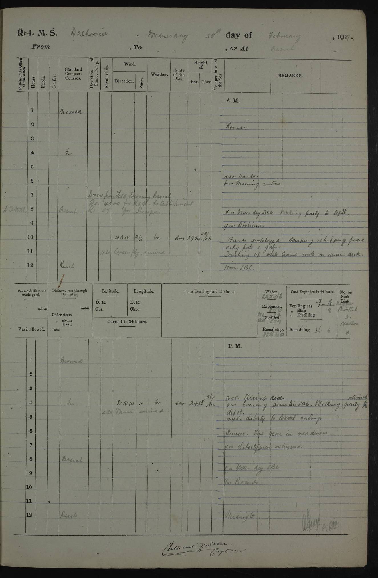 AM – Discharged To EKMA: PJ O’Connor, Lieutenant Royal Navy To Passage: 2 Indian Ratings To FLYCATCHER: D Butcher, Leading Seaman 4ef4fb19e53e0a0c910059d0: (https://s3.amazonaws.com:443/oldweather/ADM53-39410/0015_0.jpg) 26 February 1918 Place: Basrah Lat 30.5269, Long 47.8407 2:00am: Rounds 5:30am: Hands 6:00am: Morning Routine 7:45am: Working party to Depot 8:00am: Wells dry - Signal Books correct 9:10am: Divisions 10:00am: Hands employed painting in cabins & as requisite 12:00pm: Signal Books correct – Working party returned 1:20pm: Working party to Depot 3:45pm: Cleared up decks 4:00pm: Evening Quarters – Signal Books correct 4:30pm: Working party returned 5:10pm: Leave to Watch 6:00pm: Sunset - Fire Gear connected 7:30pm: Liberty men returned 8:00pm: Wells dry - Signal Books correct 9:00pm: Rounds – Signal Books correct PM – Joined From TARANTULA: J Baldwin, Leading Signalman From Hospital: Louis Mones, Engineering driver PM - Discharged To MANTIS: G Munay, Leading Signalman – C Killburn, Signalman To TARANTULA: CM Leary, Telegrapher 4ef4fb19e53e0a0c910059d1: (https://s3.amazonaws.com:443/oldweather/ADM53-39410/0015_1.jpg) 27 February 1918 Place: Basrah Lat 30.5269, Long 47.8407 2:00am: Rounds 5:30am: Hands 6:00am: Morning Routine 7:45am: Working party to Depot 8:00am: Wells dry - Signal Books correct 9:10am: Divisions 10:00am: Hands employed packing surveyed stores, cleaning out boats & painting in Warrant Ratings 12:00pm: Signal Books correct – Working party returned 1:20pm: Working party to Depot 3:45pm: Cleared up decks 4:00pm: Evening Quarters – Signal Books correct 4:30pm: Working party returned 5:10pm: Leave to Watch 6:00pm: Sunset - Fire Gear connected 7:30pm: Liberty men returned 8:00pm: Wells dry - Signal Books correct 9:00pm: Rounds – Signal Books correct AM – Joined From ELEPHANTA: No. 22 Sheik Kadir Sheik Mahomed, Lascar 2nd – No. 41 Abdool Rahman Sheik Dawood, Lamp Trimmer – No. 56 Mahomed Sabia Sheik Bosman, Stoker 2nd – No. 50A Sheik Mahomed Sheik Hassan, Stoker 2nd – No. 90 Abelino Fernandez, Topass – No. 86 Avelino Leitas, Topass 4ef4fb1ae53e0a0c910059d2: (https://s3.amazonaws.com:443/oldweather/ADM53-39410/0016_0.jpg) 28 February 1918 Place: Basrah Lat 30.5269, Long 47.8407 2:00am: Rounds 5:30am: Hands 6:00am: Morning Routine 7:45am: Working party to Depot 8:00am: Wells dry - Signal Books correct 9:10am: Divisions 10:00am: Hands employed discharging stores 12:00pm: Signal Books correct – Working party returned 1:00pm: Issued Quinine to Naval Ratings - Issued Quinine to Native Ratings 1:20pm: Working party to Depot 3:45pm: Cleared up decks 4:00pm: Evening Quarters – Signal Books correct 4:30pm: Working party returned 5:10pm: Leave to Watch 6:00pm: Sunset - Fire Gear connected 7:30pm: Liberty men returned 8:00pm: Wells dry - Signal Books correct 9:00pm: Rounds – Signal Books correct PM – Joined From SAPPHIRE: WC Woolley, Petty Officer PM - Discharged To TARANTULA: L Harris, Signalman To SEDGEFLY: T Hughes, Able Seaman To MANTIS: S Redshaw, Able Seaman To Depot: R Matheison, Stoker – H Philo, Stoker TO GRAYFLY: H Stockbridge, Senior Petty Officer 4ef4fb1ae53e0a0c910059d3: (https://s3.amazonaws.com:443/oldweather/ADM53-39410/0016_1.jpg) Log Page – Blank – no data on Page 4ef4fb1ae53e0a0c910059d4: (https://s3.amazonaws.com:443/oldweather/ADM53-39410/0017_0.jpg) Log Page – Blank – no data on Page 4ef4fb1ae53e0a0c910059d5: (https://s3.amazonaws.com:443/oldweather/ADM53-39410/0017_1.jpg) Log Page – Blank 4ef4fb1ae53e0a0c910059d6: (https://s3.amazonaws.com:443/oldweather/ADM53-39410/0018_0.jpg) Log Page – Blank 4ef4fb1ae53e0a0c910059d7: (https://s3.amazonaws.com:443/oldweather/ADM53-39410/0018_1.jpg) Log Page – Blank LOGS FOR MARCH 1918 4ef4fb1be53e0a0c910059d8: (https://s3.amazonaws.com:443/oldweather/ADM53-39411/0000_0.jpg) Log Page – Cover March 1918 4ef4fb1be53e0a0c910059d9: (https://s3.amazonaws.com:443/oldweather/ADM53-39411/0000_1.jpg) Log Page – Cover – March 1918 4ef4fb1be53e0a0c910059da: (https://s3.amazonaws.com:443/oldweather/ADM53-39411/0001_0.jpg) Log Page – Blank 4ef4fb1be53e0a0c910059db: (https://s3.amazonaws.com:443/oldweather/ADM53-39411/0001_1.jpg) Log Page – Blank – no data on Page 4ef4fb1ce53e0a0c910059dc: (https://s3.amazonaws.com:443/oldweather/ADM53-39411/0002_0.jpg) Log Page – Blank – no data on Page 4ef4fb1ce53e0a0c910059dd: (https://s3.amazonaws.com:443/oldweather/ADM53-39411/0002_1.jpg) 1 March 1918 Place: Basrah Lat 30.5269, Long 47.8407 1:00am: drew from Field Chest Treasury Officer Basrah Five thousand (5,000) Rupees only 2:00am: Rounds 5:30am: Hands 6:00am: Morning Routine 7:45am: Working party to Depot 8:00am: Wells dry – Signal Books correct – CHAKLA arrived with 5 Officers & 60 Ratings 12:00pm: Signal Books correct – Working party returned 1:15pm: Working party to Depot 2:00pm: Paid Lascar Ratings 3:45pm: Cleared up decks 4:00pm: Evening Quarters 4:30pm: Working party returned 5:10pm: Leave to Watch 5:30pm: 5 Petty Officers & 57 Ratings to Bandra for Passage 6:00pm: Sunset - Fire Gear connected 7:30pm: Liberty men returned 9:00pm: Rounds – Petty Officers returned AM – Joined From CHALKA: Hawkins, Paymaster Royal Navy PM - Discharged To FLYCATCHER: Dennis, Sub Lieutenant Royal Navy Volunteer Reserve To TARANTULA: L Harris, Signalman To SEDGEFLY: TG Hughes, Able Seaman To MANTIS: S Redshaw, Able Seaman To Depot: R Mathieson, Stoker To GRAYFLY: H Stockbridge, Senior Petty Officer 4ef4fb1ce53e0a0c910059de: (https://s3.amazonaws.com:443/oldweather/ADM53-39411/0003_0.jpg) 2 March 1918 Place: Basrah Lat 30.5269, Long 47.8407 2:00am: Rounds 5:30am: Hands 6:00am: Morning Routine 7:00am: Exercised Fire Stations 7:45am: Working party to Depot 8:00am: Wells dry - Signal Books correct 9:10am: Divisions 10:00am: Hands employed as requisite 12:00pm: Working party returned 1:15pm: Working party to Depot 3:45pm: Cleared up decks 4:00pm: Evening Quarters – Signal Books corr