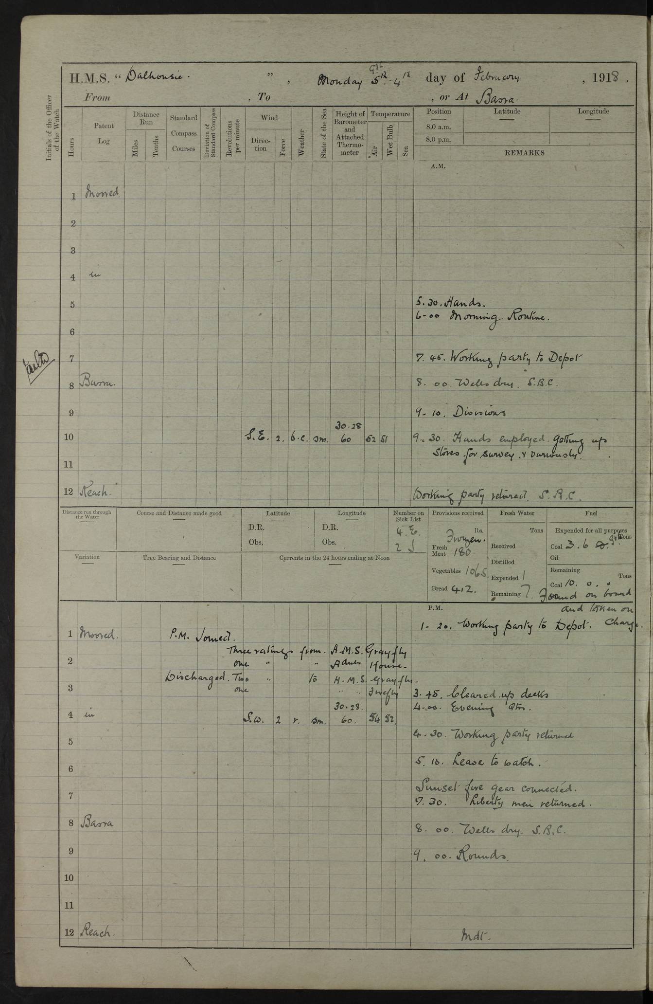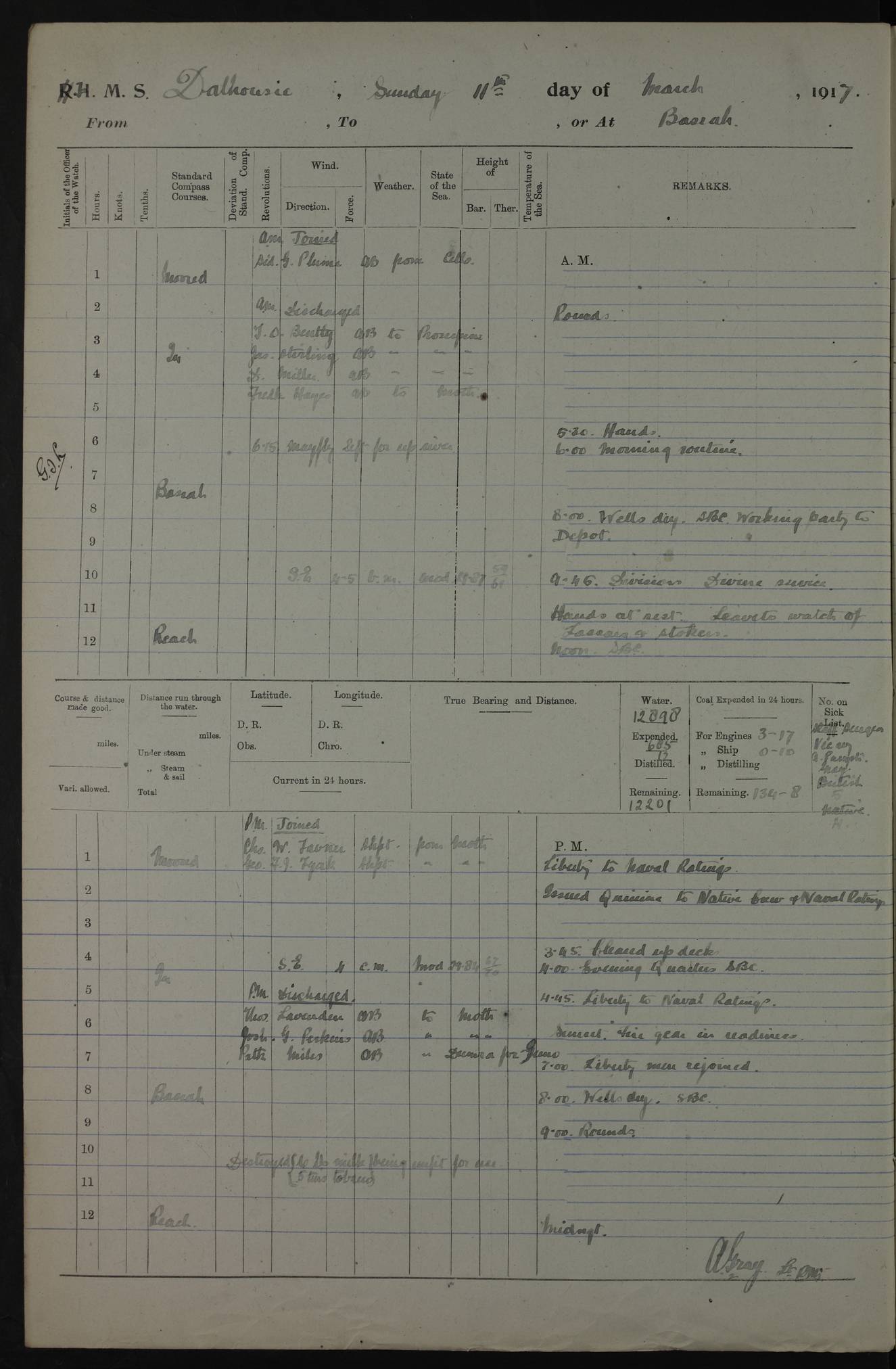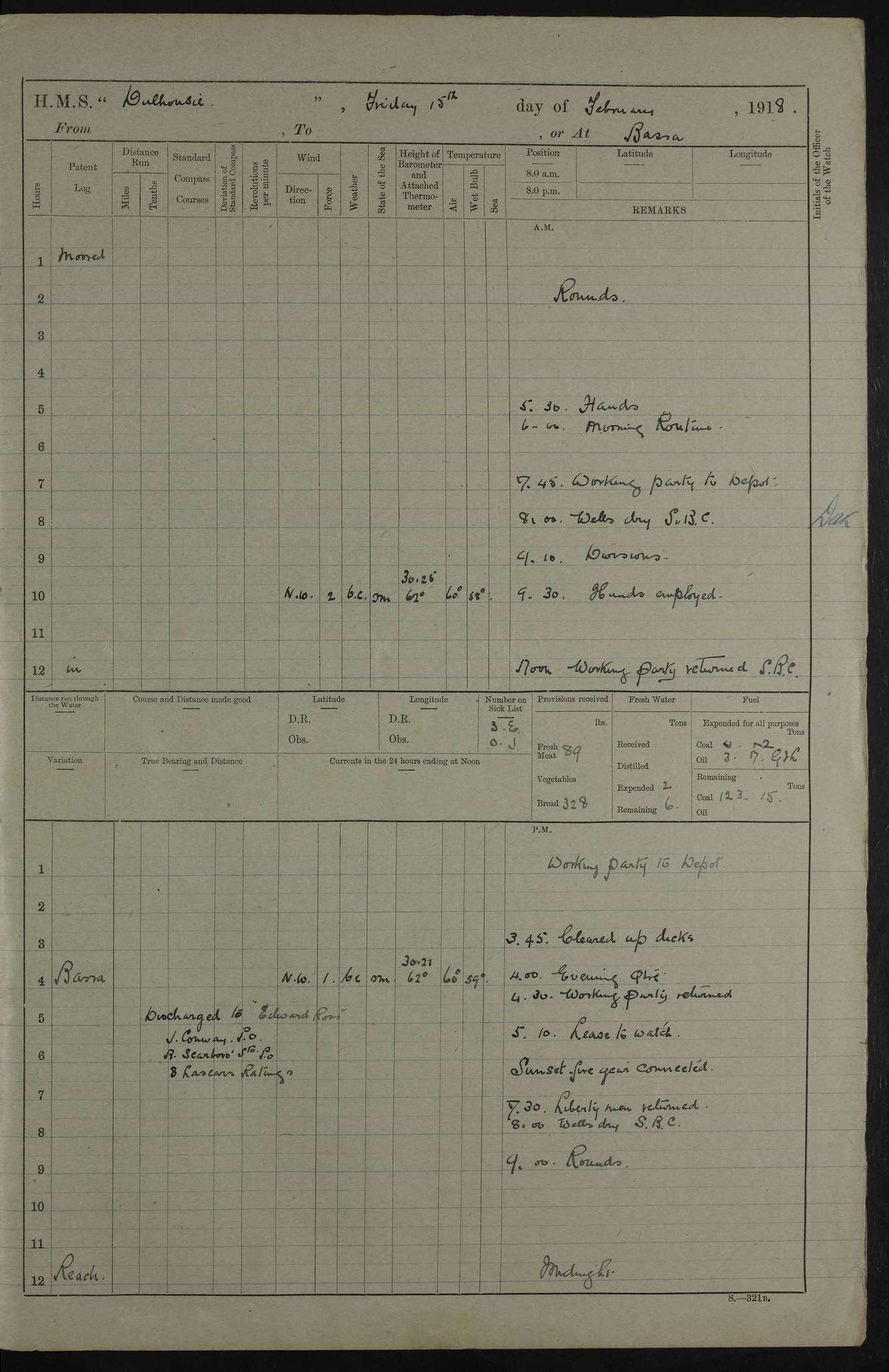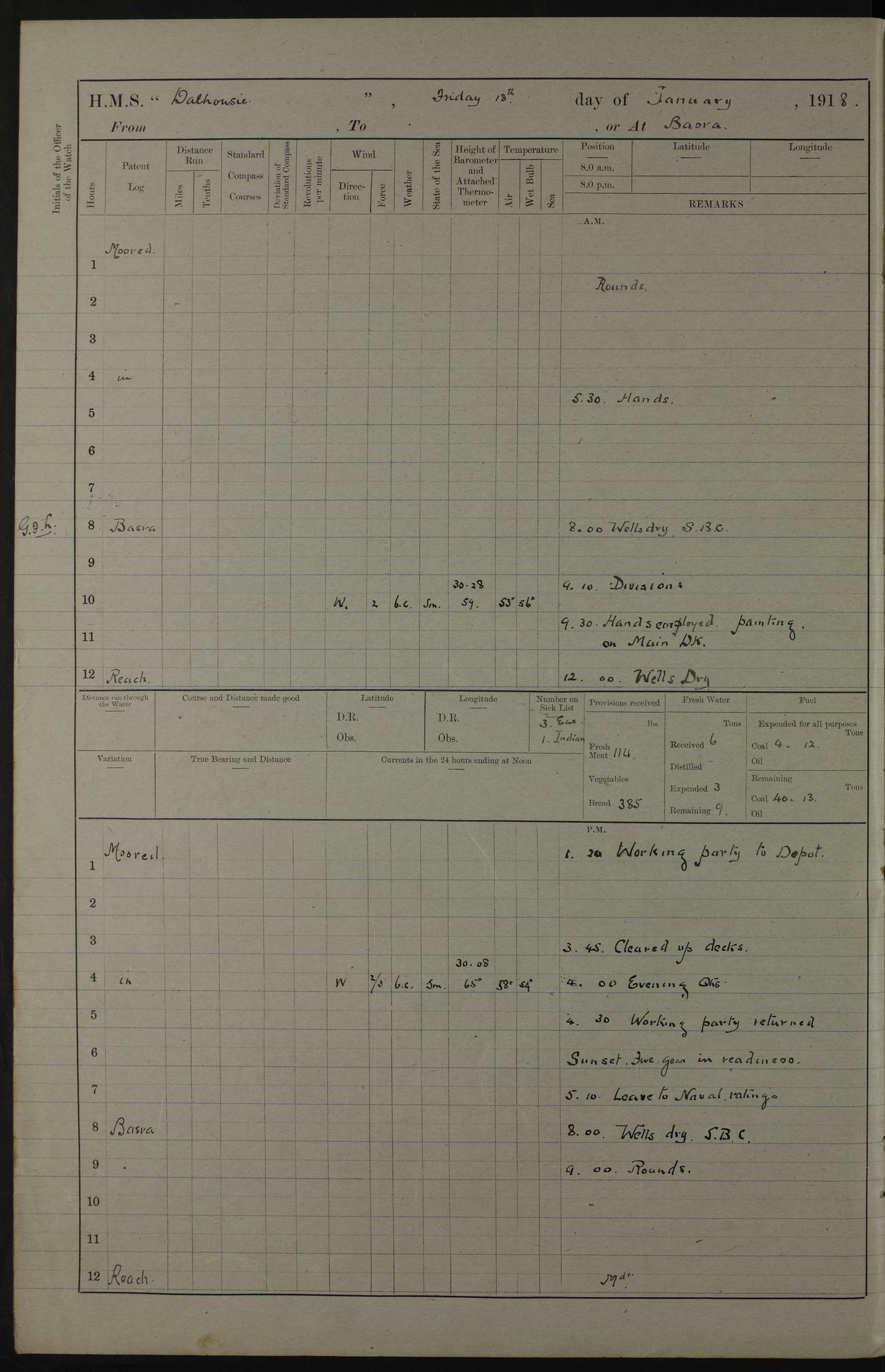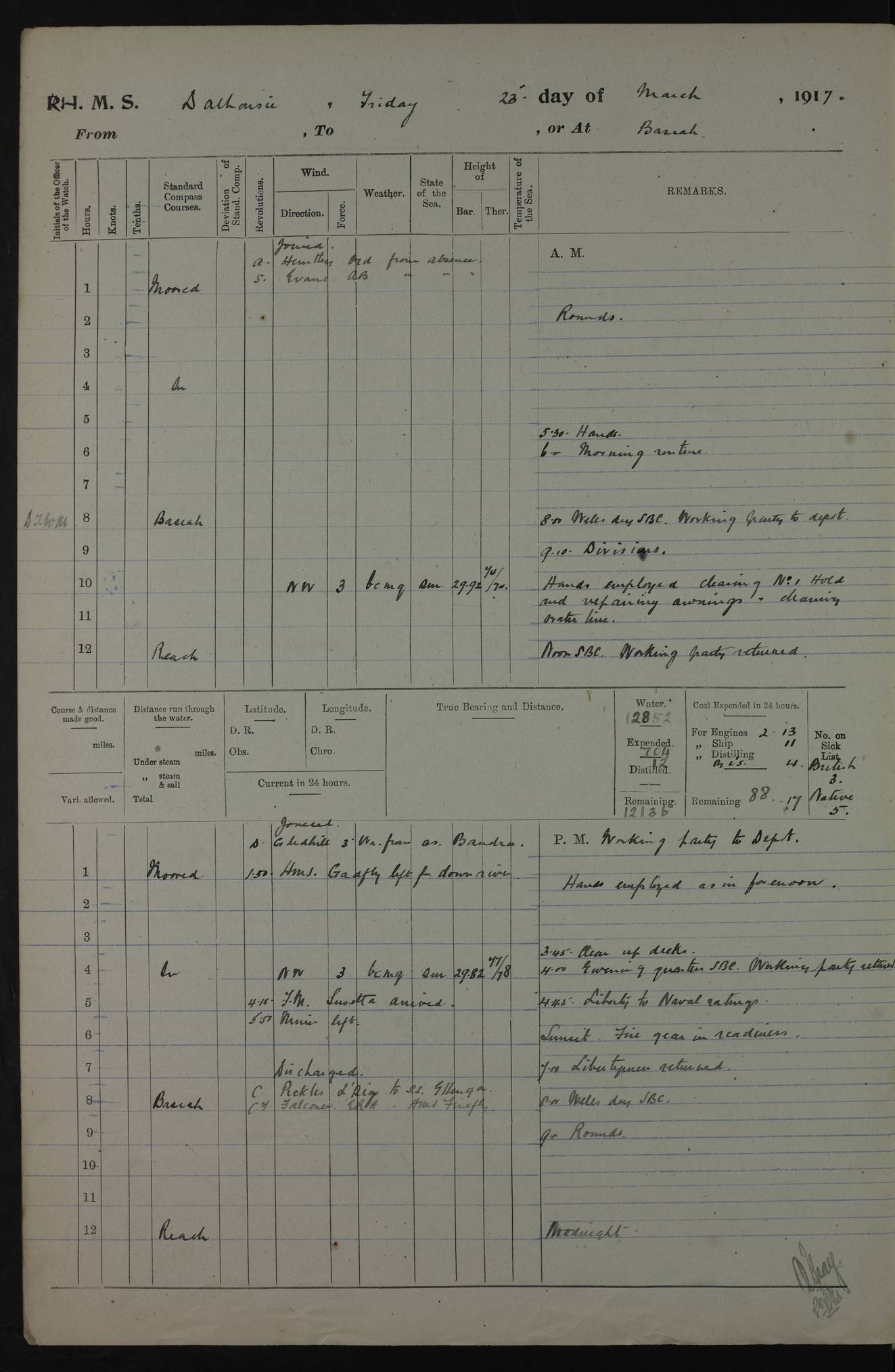 AM – Discharged To EKMA: PJ O’Connor, Lieutenant Royal Navy To Passage: 2 Indian Ratings To FLYCATCHER: D Butcher, Leading Seaman 4ef4fb19e53e0a0c910059d0: (https://s3.amazonaws.com:443/oldweather/ADM53-39410/0015_0.jpg) 26 February 1918 Place: Basrah Lat 30.5269, Long 47.8407 2:00am: Rounds 5:30am: Hands 6:00am: Morning Routine 7:45am: Working party to Depot 8:00am: Wells dry - Signal Books correct 9:10am: Divisions 10:00am: Hands employed painting in cabins & as requisite 12:00pm: Signal Books correct – Working party returned 1:20pm: Working party to Depot 3:45pm: Cleared up decks 4:00pm: Evening Quarters – Signal Books correct 4:30pm: Working party returned 5:10pm: Leave to Watch 6:00pm: Sunset - Fire Gear connected 7:30pm: Liberty men returned 8:00pm: Wells dry - Signal Books correct 9:00pm: Rounds – Signal Books correct PM – Joined From TARANTULA: J Baldwin, Leading Signalman From Hospital: Louis Mones, Engineering driver PM - Discharged To MANTIS: G Munay, Leading Signalman – C Killburn, Signalman To TARANTULA: CM Leary, Telegrapher 4ef4fb19e53e0a0c910059d1: (https://s3.amazonaws.com:443/oldweather/ADM53-39410/0015_1.jpg) 27 February 1918 Place: Basrah Lat 30.5269, Long 47.8407 2:00am: Rounds 5:30am: Hands 6:00am: Morning Routine 7:45am: Working party to Depot 8:00am: Wells dry - Signal Books correct 9:10am: Divisions 10:00am: Hands employed packing surveyed stores, cleaning out boats & painting in Warrant Ratings 12:00pm: Signal Books correct – Working party returned 1:20pm: Working party to Depot 3:45pm: Cleared up decks 4:00pm: Evening Quarters – Signal Books correct 4:30pm: Working party returned 5:10pm: Leave to Watch 6:00pm: Sunset - Fire Gear connected 7:30pm: Liberty men returned 8:00pm: Wells dry - Signal Books correct 9:00pm: Rounds – Signal Books correct AM – Joined From ELEPHANTA: No. 22 Sheik Kadir Sheik Mahomed, Lascar 2nd – No. 41 Abdool Rahman Sheik Dawood, Lamp Trimmer – No. 56 Mahomed Sabia Sheik Bosman, Stoker 2nd – No. 50A Sheik Mahomed Sheik Hassan, Stoker 2nd – No. 90 Abelino Fernandez, Topass – No. 86 Avelino Leitas, Topass 4ef4fb1ae53e0a0c910059d2: (https://s3.amazonaws.com:443/oldweather/ADM53-39410/0016_0.jpg) 28 February 1918 Place: Basrah Lat 30.5269, Long 47.8407 2:00am: Rounds 5:30am: Hands 6:00am: Morning Routine 7:45am: Working party to Depot 8:00am: Wells dry - Signal Books correct 9:10am: Divisions 10:00am: Hands employed discharging stores 12:00pm: Signal Books correct – Working party returned 1:00pm: Issued Quinine to Naval Ratings - Issued Quinine to Native Ratings 1:20pm: Working party to Depot 3:45pm: Cleared up decks 4:00pm: Evening Quarters – Signal Books correct 4:30pm: Working party returned 5:10pm: Leave to Watch 6:00pm: Sunset - Fire Gear connected 7:30pm: Liberty men returned 8:00pm: Wells dry - Signal Books correct 9:00pm: Rounds – Signal Books correct PM – Joined From SAPPHIRE: WC Woolley, Petty Officer PM - Discharged To TARANTULA: L Harris, Signalman To SEDGEFLY: T Hughes, Able Seaman To MANTIS: S Redshaw, Able Seaman To Depot: R Matheison, Stoker – H Philo, Stoker TO GRAYFLY: H Stockbridge, Senior Petty Officer 4ef4fb1ae53e0a0c910059d3: (https://s3.amazonaws.com:443/oldweather/ADM53-39410/0016_1.jpg) Log Page – Blank – no data on Page 4ef4fb1ae53e0a0c910059d4: (https://s3.amazonaws.com:443/oldweather/ADM53-39410/0017_0.jpg) Log Page – Blank – no data on Page 4ef4fb1ae53e0a0c910059d5: (https://s3.amazonaws.com:443/oldweather/ADM53-39410/0017_1.jpg) Log Page – Blank 4ef4fb1ae53e0a0c910059d6: (https://s3.amazonaws.com:443/oldweather/ADM53-39410/0018_0.jpg) Log Page – Blank 4ef4fb1ae53e0a0c910059d7: (https://s3.amazonaws.com:443/oldweather/ADM53-39410/0018_1.jpg) Log Page – Blank LOGS FOR MARCH 1918 4ef4fb1be53e0a0c910059d8: (https://s3.amazonaws.com:443/oldweather/ADM53-39411/0000_0.jpg) Log Page – Cover March 1918 4ef4fb1be53e0a0c910059d9: (https://s3.amazonaws.com:443/oldweather/ADM53-39411/0000_1.jpg) Log Page – Cover – March 1918 4ef4fb1be53e0a0c910059da: (https://s3.amazonaws.com:443/oldweather/ADM53-39411/0001_0.jpg) Log Page – Blank 4ef4fb1be53e0a0c910059db: (https://s3.amazonaws.com:443/oldweather/ADM53-39411/0001_1.jpg) Log Page – Blank – no data on Page 4ef4fb1ce53e0a0c910059dc: (https://s3.amazonaws.com:443/oldweather/ADM53-39411/0002_0.jpg) Log Page – Blank – no data on Page 4ef4fb1ce53e0a0c910059dd: (https://s3.amazonaws.com:443/oldweather/ADM53-39411/0002_1.jpg) 1 March 1918 Place: Basrah Lat 30.5269, Long 47.8407 1:00am: drew from Field Chest Treasury Officer Basrah Five thousand (5,000) Rupees only 2:00am: Rounds 5:30am: Hands 6:00am: Morning Routine 7:45am: Working party to Depot 8:00am: Wells dry – Signal Books correct – CHAKLA arrived with 5 Officers & 60 Ratings 12:00pm: Signal Books correct – Working party returned 1:15pm: Working party to Depot 2:00pm: Paid Lascar Ratings 3:45pm: Cleared up decks 4:00pm: Evening Quarters 4:30pm: Working party returned 5:10pm: Leave to Watch 5:30pm: 5 Petty Officers & 57 Ratings to Bandra for Passage 6:00pm: Sunset - Fire Gear connected 7:30pm: Liberty men returned 9:00pm: Rounds – Petty Officers returned AM – Joined From CHALKA: Hawkins, Paymaster Royal Navy PM - Discharged To FLYCATCHER: Dennis, Sub Lieutenant Royal Navy Volunteer Reserve To TARANTULA: L Harris, Signalman To SEDGEFLY: TG Hughes, Able Seaman To MANTIS: S Redshaw, Able Seaman To Depot: R Mathieson, Stoker To GRAYFLY: H Stockbridge, Senior Petty Officer 4ef4fb1ce53e0a0c910059de: (https://s3.amazonaws.com:443/oldweather/ADM53-39411/0003_0.jpg) 2 March 1918 Place: Basrah Lat 30.5269, Long 47.8407 2:00am: Rounds 5:30am: Hands 6:00am: Morning Routine 7:00am: Exercised Fire Stations 7:45am: Working party to Depot 8:00am: Wells dry - Signal Books correct 9:10am: Divisions 10:00am: Hands employed as requisite 12:00pm: Working party returned 1:15pm: Working party to Depot 3:45pm: Cleared up decks 4:00pm: Evening Quarters – Signal Books corr