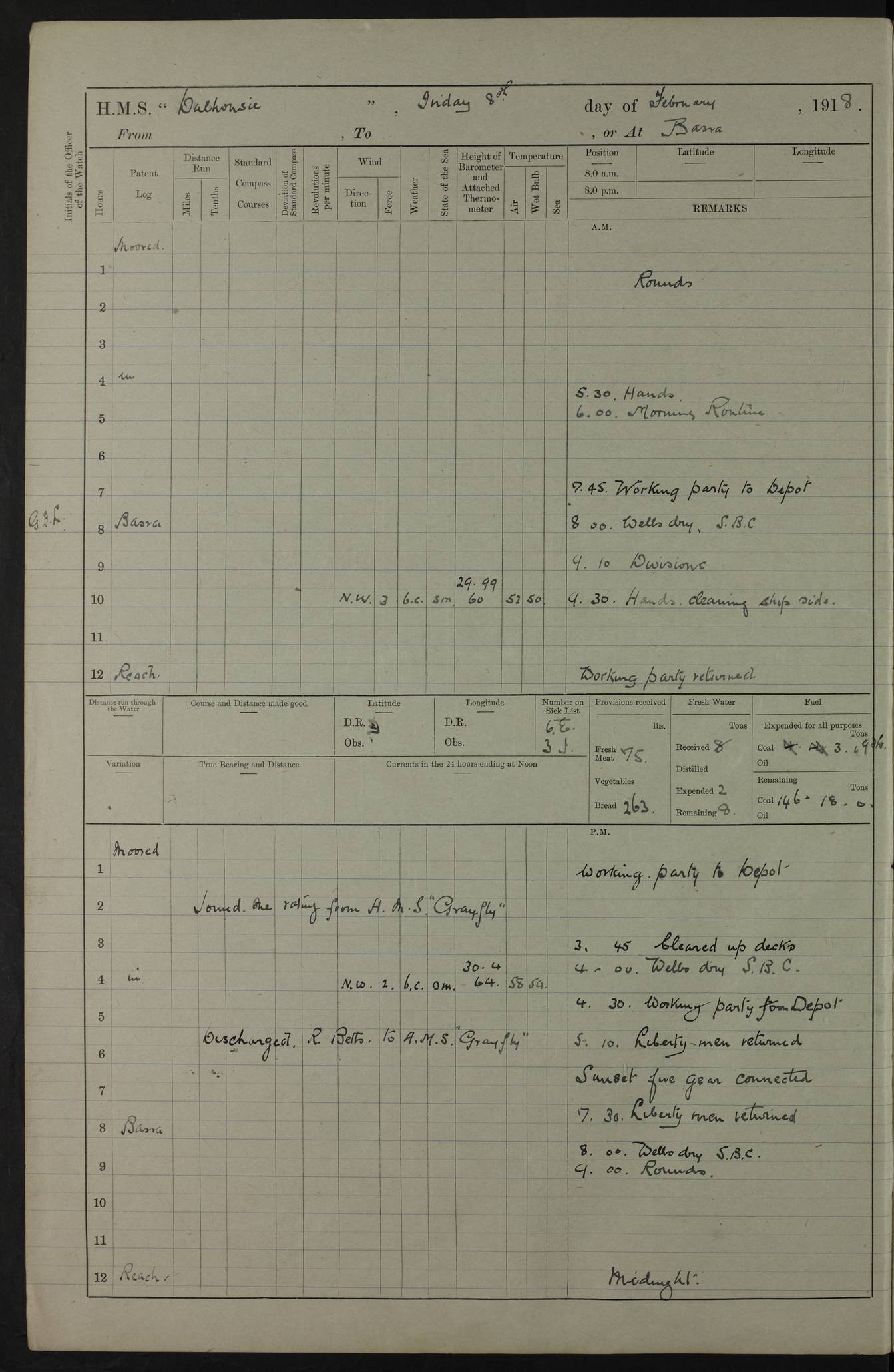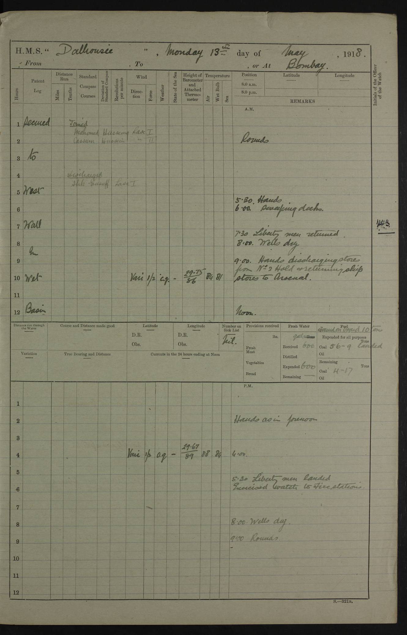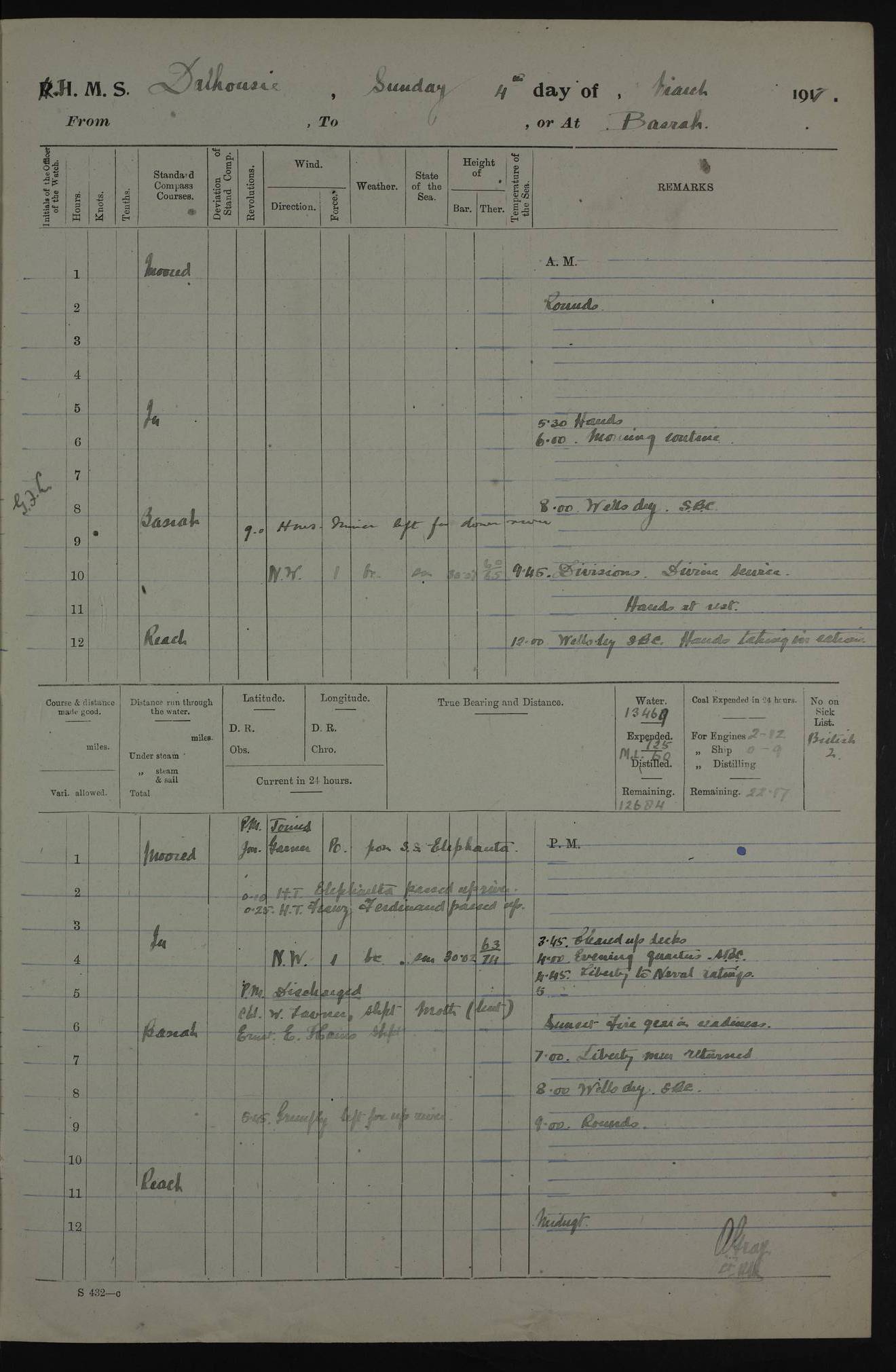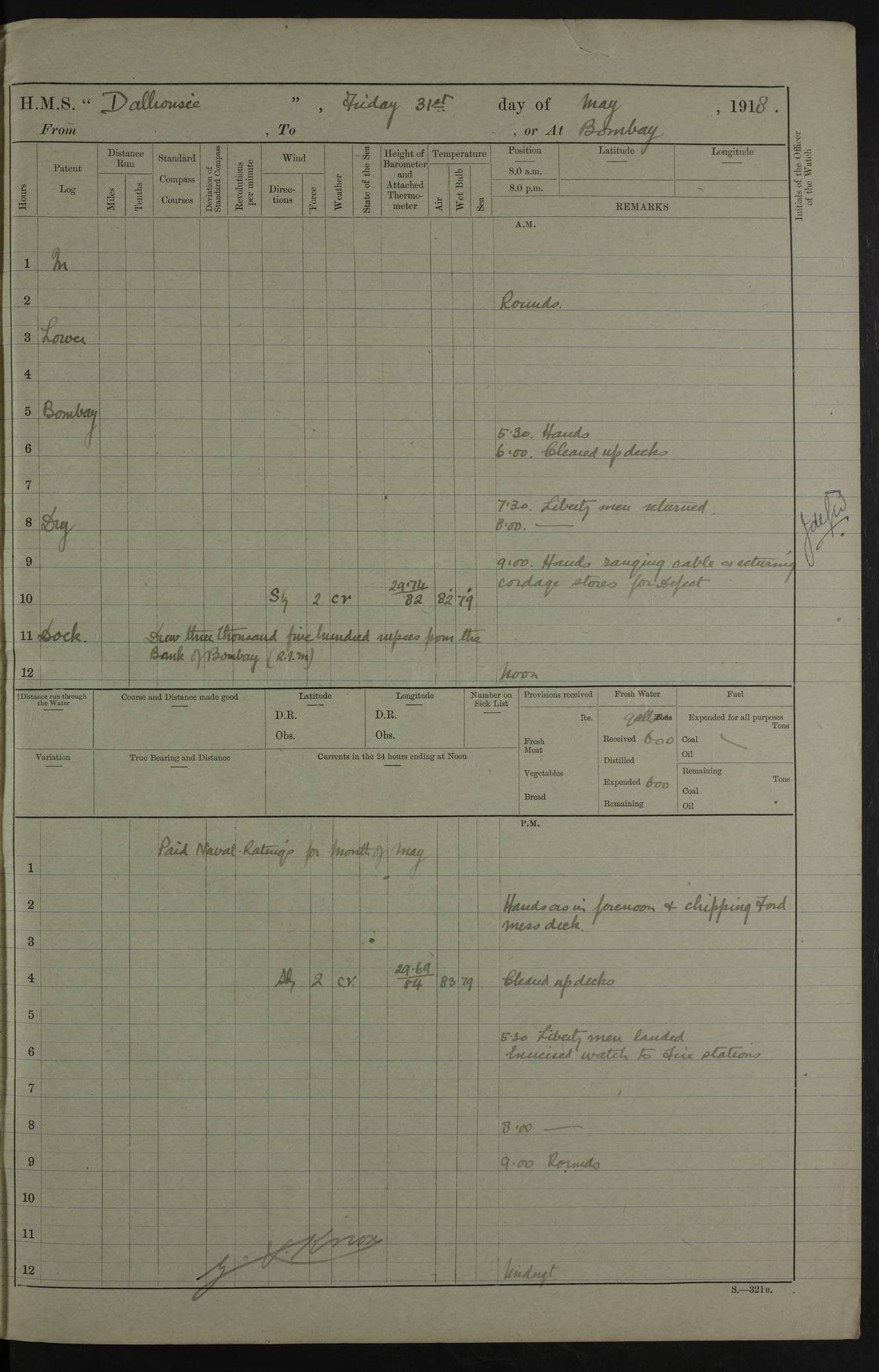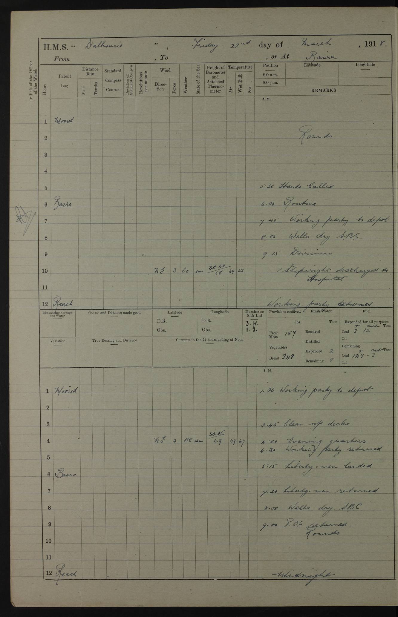 AM – Discharged To EKMA: PJ O’Connor, Lieutenant Royal Navy To Passage: 2 Indian Ratings To FLYCATCHER: D Butcher, Leading Seaman 4ef4fb19e53e0a0c910059d0: (https://s3.amazonaws.com:443/oldweather/ADM53-39410/0015_0.jpg) 26 February 1918 Place: Basrah Lat 30.5269, Long 47.8407 2:00am: Rounds 5:30am: Hands 6:00am: Morning Routine 7:45am: Working party to Depot 8:00am: Wells dry - Signal Books correct 9:10am: Divisions 10:00am: Hands employed painting in cabins & as requisite 12:00pm: Signal Books correct – Working party returned 1:20pm: Working party to Depot 3:45pm: Cleared up decks 4:00pm: Evening Quarters – Signal Books correct 4:30pm: Working party returned 5:10pm: Leave to Watch 6:00pm: Sunset - Fire Gear connected 7:30pm: Liberty men returned 8:00pm: Wells dry - Signal Books correct 9:00pm: Rounds – Signal Books correct PM – Joined From TARANTULA: J Baldwin, Leading Signalman From Hospital: Louis Mones, Engineering driver PM - Discharged To MANTIS: G Munay, Leading Signalman – C Killburn, Signalman To TARANTULA: CM Leary, Telegrapher 4ef4fb19e53e0a0c910059d1: (https://s3.amazonaws.com:443/oldweather/ADM53-39410/0015_1.jpg) 27 February 1918 Place: Basrah Lat 30.5269, Long 47.8407 2:00am: Rounds 5:30am: Hands 6:00am: Morning Routine 7:45am: Working party to Depot 8:00am: Wells dry - Signal Books correct 9:10am: Divisions 10:00am: Hands employed packing surveyed stores, cleaning out boats & painting in Warrant Ratings 12:00pm: Signal Books correct – Working party returned 1:20pm: Working party to Depot 3:45pm: Cleared up decks 4:00pm: Evening Quarters – Signal Books correct 4:30pm: Working party returned 5:10pm: Leave to Watch 6:00pm: Sunset - Fire Gear connected 7:30pm: Liberty men returned 8:00pm: Wells dry - Signal Books correct 9:00pm: Rounds – Signal Books correct AM – Joined From ELEPHANTA: No. 22 Sheik Kadir Sheik Mahomed, Lascar 2nd – No. 41 Abdool Rahman Sheik Dawood, Lamp Trimmer – No. 56 Mahomed Sabia Sheik Bosman, Stoker 2nd – No. 50A Sheik Mahomed Sheik Hassan, Stoker 2nd – No. 90 Abelino Fernandez, Topass – No. 86 Avelino Leitas, Topass 4ef4fb1ae53e0a0c910059d2: (https://s3.amazonaws.com:443/oldweather/ADM53-39410/0016_0.jpg) 28 February 1918 Place: Basrah Lat 30.5269, Long 47.8407 2:00am: Rounds 5:30am: Hands 6:00am: Morning Routine 7:45am: Working party to Depot 8:00am: Wells dry - Signal Books correct 9:10am: Divisions 10:00am: Hands employed discharging stores 12:00pm: Signal Books correct – Working party returned 1:00pm: Issued Quinine to Naval Ratings - Issued Quinine to Native Ratings 1:20pm: Working party to Depot 3:45pm: Cleared up decks 4:00pm: Evening Quarters – Signal Books correct 4:30pm: Working party returned 5:10pm: Leave to Watch 6:00pm: Sunset - Fire Gear connected 7:30pm: Liberty men returned 8:00pm: Wells dry - Signal Books correct 9:00pm: Rounds – Signal Books correct PM – Joined From SAPPHIRE: WC Woolley, Petty Officer PM - Discharged To TARANTULA: L Harris, Signalman To SEDGEFLY: T Hughes, Able Seaman To MANTIS: S Redshaw, Able Seaman To Depot: R Matheison, Stoker – H Philo, Stoker TO GRAYFLY: H Stockbridge, Senior Petty Officer 4ef4fb1ae53e0a0c910059d3: (https://s3.amazonaws.com:443/oldweather/ADM53-39410/0016_1.jpg) Log Page – Blank – no data on Page 4ef4fb1ae53e0a0c910059d4: (https://s3.amazonaws.com:443/oldweather/ADM53-39410/0017_0.jpg) Log Page – Blank – no data on Page 4ef4fb1ae53e0a0c910059d5: (https://s3.amazonaws.com:443/oldweather/ADM53-39410/0017_1.jpg) Log Page – Blank 4ef4fb1ae53e0a0c910059d6: (https://s3.amazonaws.com:443/oldweather/ADM53-39410/0018_0.jpg) Log Page – Blank 4ef4fb1ae53e0a0c910059d7: (https://s3.amazonaws.com:443/oldweather/ADM53-39410/0018_1.jpg) Log Page – Blank LOGS FOR MARCH 1918 4ef4fb1be53e0a0c910059d8: (https://s3.amazonaws.com:443/oldweather/ADM53-39411/0000_0.jpg) Log Page – Cover March 1918 4ef4fb1be53e0a0c910059d9: (https://s3.amazonaws.com:443/oldweather/ADM53-39411/0000_1.jpg) Log Page – Cover – March 1918 4ef4fb1be53e0a0c910059da: (https://s3.amazonaws.com:443/oldweather/ADM53-39411/0001_0.jpg) Log Page – Blank 4ef4fb1be53e0a0c910059db: (https://s3.amazonaws.com:443/oldweather/ADM53-39411/0001_1.jpg) Log Page – Blank – no data on Page 4ef4fb1ce53e0a0c910059dc: (https://s3.amazonaws.com:443/oldweather/ADM53-39411/0002_0.jpg) Log Page – Blank – no data on Page 4ef4fb1ce53e0a0c910059dd: (https://s3.amazonaws.com:443/oldweather/ADM53-39411/0002_1.jpg) 1 March 1918 Place: Basrah Lat 30.5269, Long 47.8407 1:00am: drew from Field Chest Treasury Officer Basrah Five thousand (5,000) Rupees only 2:00am: Rounds 5:30am: Hands 6:00am: Morning Routine 7:45am: Working party to Depot 8:00am: Wells dry – Signal Books correct – CHAKLA arrived with 5 Officers & 60 Ratings 12:00pm: Signal Books correct – Working party returned 1:15pm: Working party to Depot 2:00pm: Paid Lascar Ratings 3:45pm: Cleared up decks 4:00pm: Evening Quarters 4:30pm: Working party returned 5:10pm: Leave to Watch 5:30pm: 5 Petty Officers & 57 Ratings to Bandra for Passage 6:00pm: Sunset - Fire Gear connected 7:30pm: Liberty men returned 9:00pm: Rounds – Petty Officers returned AM – Joined From CHALKA: Hawkins, Paymaster Royal Navy PM - Discharged To FLYCATCHER: Dennis, Sub Lieutenant Royal Navy Volunteer Reserve To TARANTULA: L Harris, Signalman To SEDGEFLY: TG Hughes, Able Seaman To MANTIS: S Redshaw, Able Seaman To Depot: R Mathieson, Stoker To GRAYFLY: H Stockbridge, Senior Petty Officer 4ef4fb1ce53e0a0c910059de: (https://s3.amazonaws.com:443/oldweather/ADM53-39411/0003_0.jpg) 2 March 1918 Place: Basrah Lat 30.5269, Long 47.8407 2:00am: Rounds 5:30am: Hands 6:00am: Morning Routine 7:00am: Exercised Fire Stations 7:45am: Working party to Depot 8:00am: Wells dry - Signal Books correct 9:10am: Divisions 10:00am: Hands employed as requisite 12:00pm: Working party returned 1:15pm: Working party to Depot 3:45pm: Cleared up decks 4:00pm: Evening Quarters – Signal Books corr