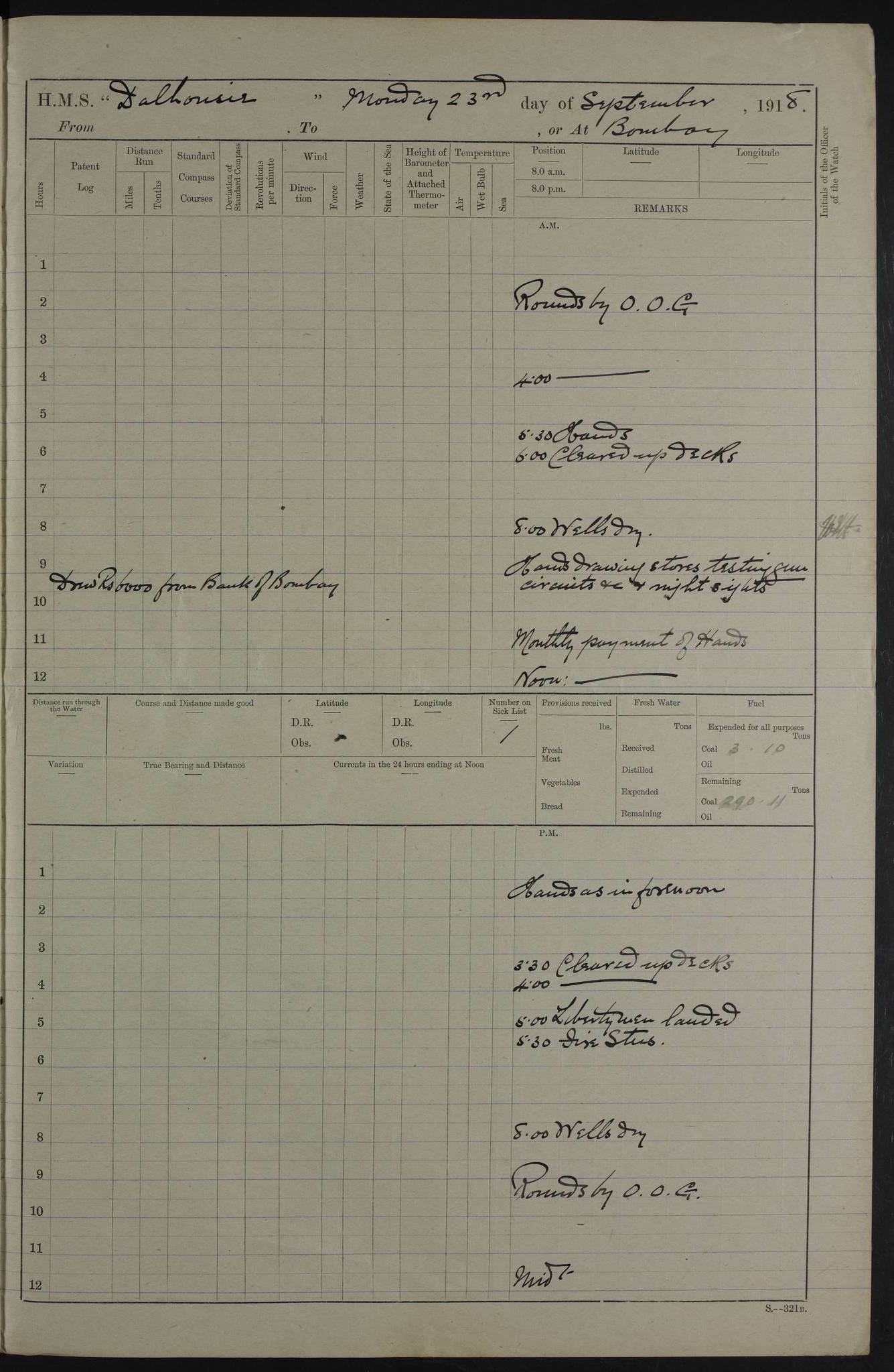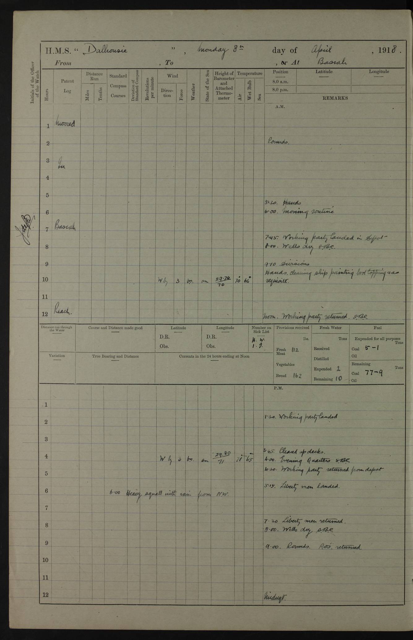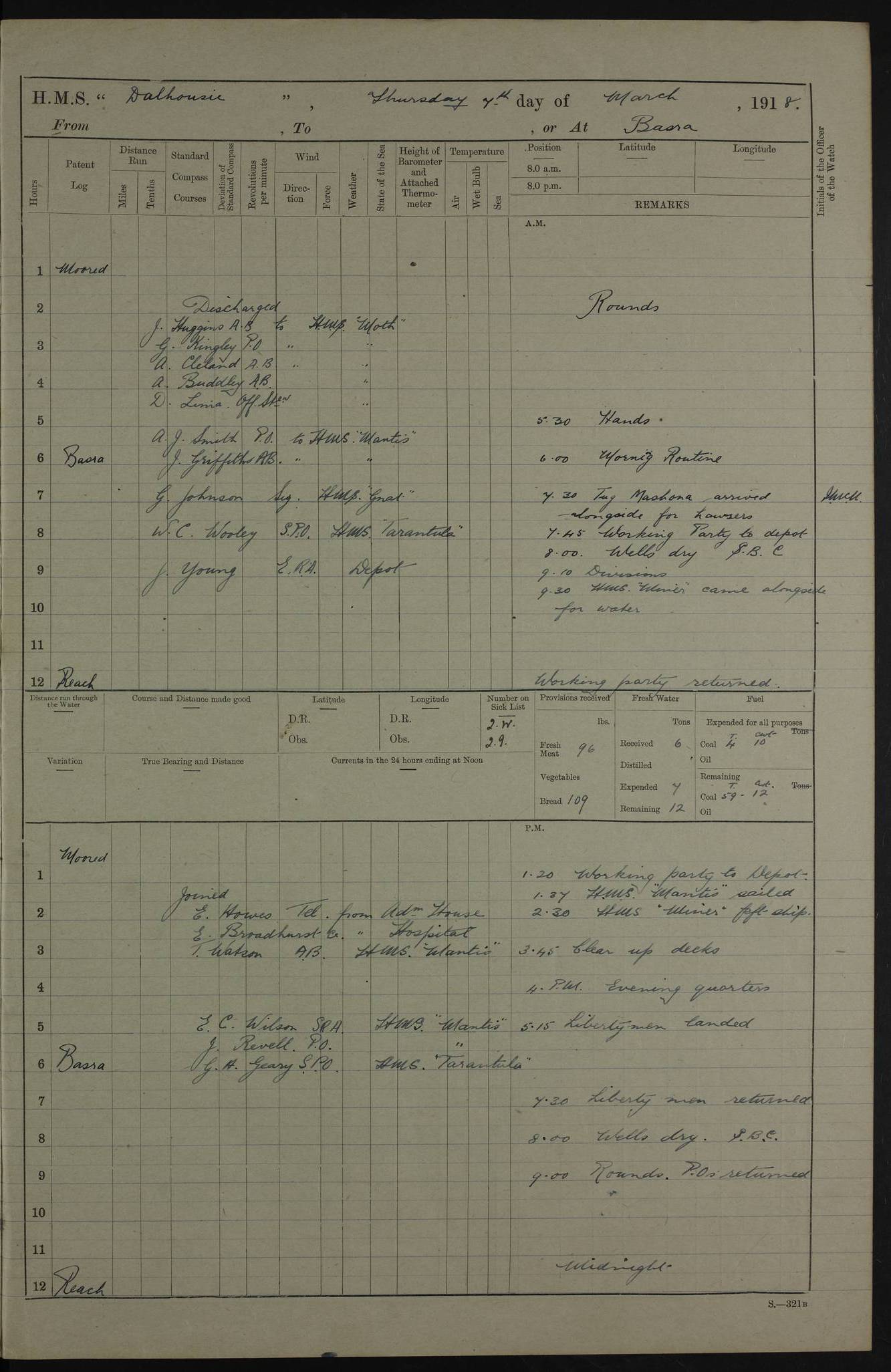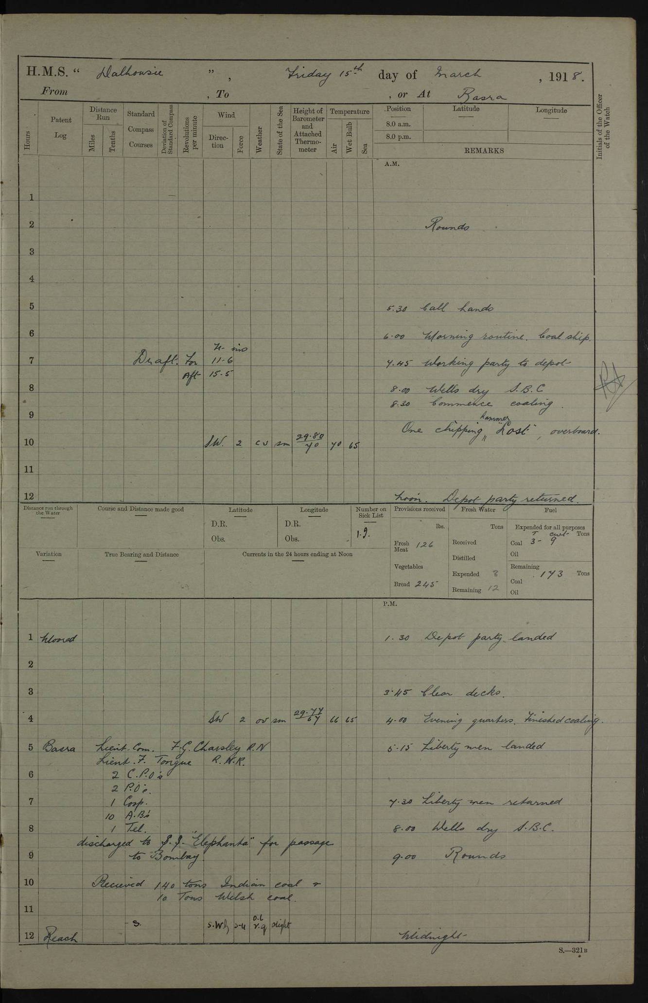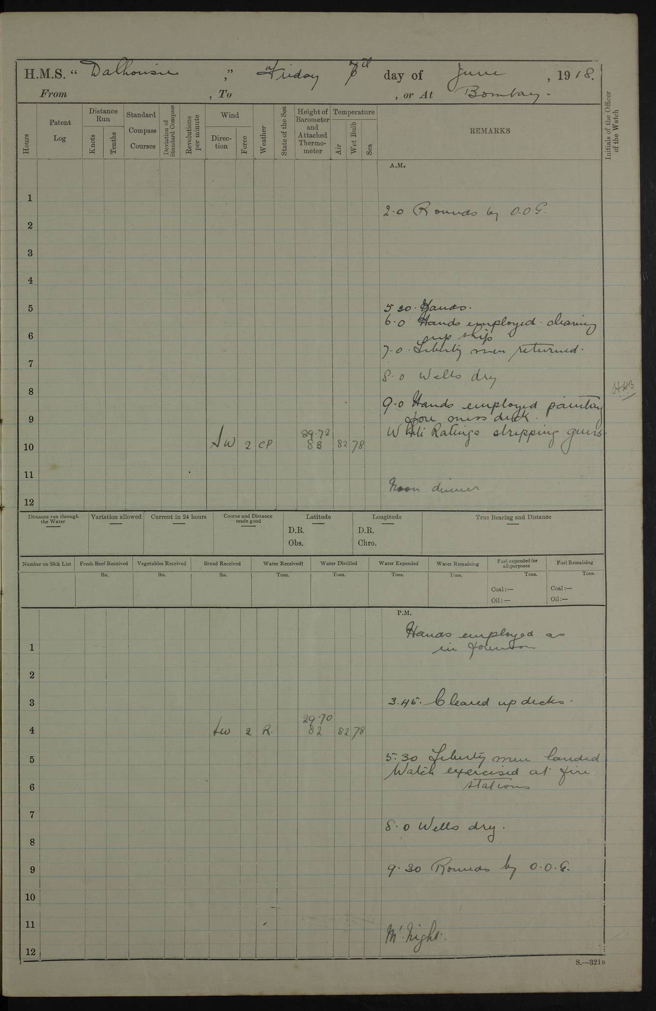AM – Discharged To EKMA: PJ O’Connor, Lieutenant Royal Navy To Passage: 2 Indian Ratings To FLYCATCHER: D Butcher, Leading Seaman 4ef4fb19e53e0a0c910059d0: (https://s3.amazonaws.com:443/oldweather/ADM53-39410/0015_0.jpg) 26 February 1918 Place: Basrah Lat 30.5269, Long 47.8407 2:00am: Rounds 5:30am: Hands 6:00am: Morning Routine 7:45am: Working party to Depot 8:00am: Wells dry - Signal Books correct 9:10am: Divisions 10:00am: Hands employed painting in cabins & as requisite 12:00pm: Signal Books correct – Working party returned 1:20pm: Working party to Depot 3:45pm: Cleared up decks 4:00pm: Evening Quarters – Signal Books correct 4:30pm: Working party returned 5:10pm: Leave to Watch 6:00pm: Sunset - Fire Gear connected 7:30pm: Liberty men returned 8:00pm: Wells dry - Signal Books correct 9:00pm: Rounds – Signal Books correct PM – Joined From TARANTULA: J Baldwin, Leading Signalman From Hospital: Louis Mones, Engineering driver PM - Discharged To MANTIS: G Munay, Leading Signalman – C Killburn, Signalman To TARANTULA: CM Leary, Telegrapher 4ef4fb19e53e0a0c910059d1: (https://s3.amazonaws.com:443/oldweather/ADM53-39410/0015_1.jpg) 27 February 1918 Place: Basrah Lat 30.5269, Long 47.8407 2:00am: Rounds 5:30am: Hands 6:00am: Morning Routine 7:45am: Working party to Depot 8:00am: Wells dry - Signal Books correct 9:10am: Divisions 10:00am: Hands employed packing surveyed stores, cleaning out boats & painting in Warrant Ratings 12:00pm: Signal Books correct – Working party returned 1:20pm: Working party to Depot 3:45pm: Cleared up decks 4:00pm: Evening Quarters – Signal Books correct 4:30pm: Working party returned 5:10pm: Leave to Watch 6:00pm: Sunset - Fire Gear connected 7:30pm: Liberty men returned 8:00pm: Wells dry - Signal Books correct 9:00pm: Rounds – Signal Books correct AM – Joined From ELEPHANTA: No. 22 Sheik Kadir Sheik Mahomed, Lascar 2nd – No. 41 Abdool Rahman Sheik Dawood, Lamp Trimmer – No. 56 Mahomed Sabia Sheik Bosman, Stoker 2nd – No. 50A Sheik Mahomed Sheik Hassan, Stoker 2nd – No. 90 Abelino Fernandez, Topass – No. 86 Avelino Leitas, Topass 4ef4fb1ae53e0a0c910059d2: (https://s3.amazonaws.com:443/oldweather/ADM53-39410/0016_0.jpg) 28 February 1918 Place: Basrah Lat 30.5269, Long 47.8407 2:00am: Rounds 5:30am: Hands 6:00am: Morning Routine 7:45am: Working party to Depot 8:00am: Wells dry - Signal Books correct 9:10am: Divisions 10:00am: Hands employed discharging stores 12:00pm: Signal Books correct – Working party returned 1:00pm: Issued Quinine to Naval Ratings - Issued Quinine to Native Ratings 1:20pm: Working party to Depot 3:45pm: Cleared up decks 4:00pm: Evening Quarters – Signal Books correct 4:30pm: Working party returned 5:10pm: Leave to Watch 6:00pm: Sunset - Fire Gear connected 7:30pm: Liberty men returned 8:00pm: Wells dry - Signal Books correct 9:00pm: Rounds – Signal Books correct PM – Joined From SAPPHIRE: WC Woolley, Petty Officer PM - Discharged To TARANTULA: L Harris, Signalman To SEDGEFLY: T Hughes, Able Seaman To MANTIS: S Redshaw, Able Seaman To Depot: R Matheison, Stoker – H Philo, Stoker TO GRAYFLY: H Stockbridge, Senior Petty Officer 4ef4fb1ae53e0a0c910059d3: (https://s3.amazonaws.com:443/oldweather/ADM53-39410/0016_1.jpg) Log Page – Blank – no data on Page 4ef4fb1ae53e0a0c910059d4: (https://s3.amazonaws.com:443/oldweather/ADM53-39410/0017_0.jpg) Log Page – Blank – no data on Page 4ef4fb1ae53e0a0c910059d5: (https://s3.amazonaws.com:443/oldweather/ADM53-39410/0017_1.jpg) Log Page – Blank 4ef4fb1ae53e0a0c910059d6: (https://s3.amazonaws.com:443/oldweather/ADM53-39410/0018_0.jpg) Log Page – Blank 4ef4fb1ae53e0a0c910059d7: (https://s3.amazonaws.com:443/oldweather/ADM53-39410/0018_1.jpg) Log Page – Blank LOGS FOR MARCH 1918 4ef4fb1be53e0a0c910059d8: (https://s3.amazonaws.com:443/oldweather/ADM53-39411/0000_0.jpg) Log Page – Cover March 1918 4ef4fb1be53e0a0c910059d9: (https://s3.amazonaws.com:443/oldweather/ADM53-39411/0000_1.jpg) Log Page – Cover – March 1918 4ef4fb1be53e0a0c910059da: (https://s3.amazonaws.com:443/oldweather/ADM53-39411/0001_0.jpg) Log Page – Blank 4ef4fb1be53e0a0c910059db: (https://s3.amazonaws.com:443/oldweather/ADM53-39411/0001_1.jpg) Log Page – Blank – no data on Page 4ef4fb1ce53e0a0c910059dc: (https://s3.amazonaws.com:443/oldweather/ADM53-39411/0002_0.jpg) Log Page – Blank – no data on Page 4ef4fb1ce53e0a0c910059dd: (https://s3.amazonaws.com:443/oldweather/ADM53-39411/0002_1.jpg) 1 March 1918 Place: Basrah Lat 30.5269, Long 47.8407 1:00am: drew from Field Chest Treasury Officer Basrah Five thousand (5,000) Rupees only 2:00am: Rounds 5:30am: Hands 6:00am: Morning Routine 7:45am: Working party to Depot 8:00am: Wells dry – Signal Books correct – CHAKLA arrived with 5 Officers & 60 Ratings 12:00pm: Signal Books correct – Working party returned 1:15pm: Working party to Depot 2:00pm: Paid Lascar Ratings 3:45pm: Cleared up decks 4:00pm: Evening Quarters 4:30pm: Working party returned 5:10pm: Leave to Watch 5:30pm: 5 Petty Officers & 57 Ratings to Bandra for Passage 6:00pm: Sunset - Fire Gear connected 7:30pm: Liberty men returned 9:00pm: Rounds – Petty Officers returned AM – Joined From CHALKA: Hawkins, Paymaster Royal Navy PM - Discharged To FLYCATCHER: Dennis, Sub Lieutenant Royal Navy Volunteer Reserve To TARANTULA: L Harris, Signalman To SEDGEFLY: TG Hughes, Able Seaman To MANTIS: S Redshaw, Able Seaman To Depot: R Mathieson, Stoker To GRAYFLY: H Stockbridge, Senior Petty Officer 4ef4fb1ce53e0a0c910059de: (https://s3.amazonaws.com:443/oldweather/ADM53-39411/0003_0.jpg) 2 March 1918 Place: Basrah Lat 30.5269, Long 47.8407 2:00am: Rounds 5:30am: Hands 6:00am: Morning Routine 7:00am: Exercised Fire Stations 7:45am: Working party to Depot 8:00am: Wells dry - Signal Books correct 9:10am: Divisions 10:00am: Hands employed as requisite 12:00pm: Working party returned 1:15pm: Working party to Depot 3:45pm: Cleared up decks 4:00pm: Evening Quarters – Signal Books corr