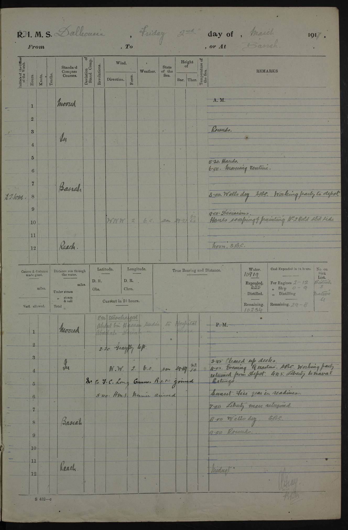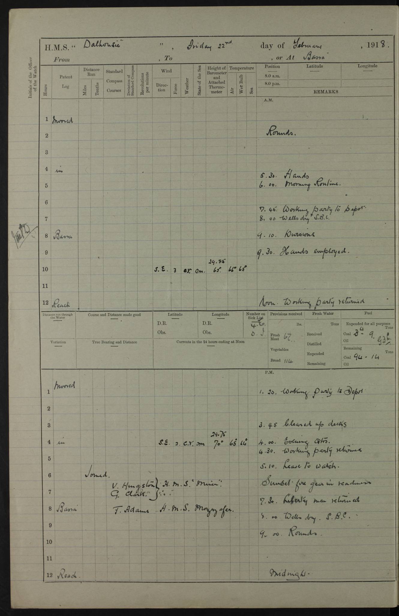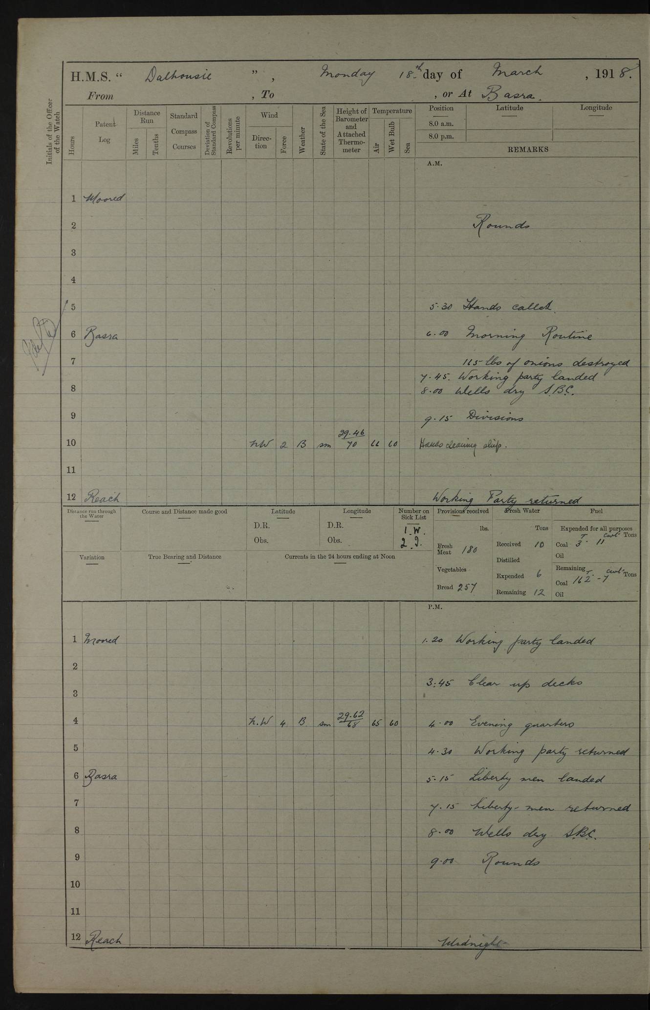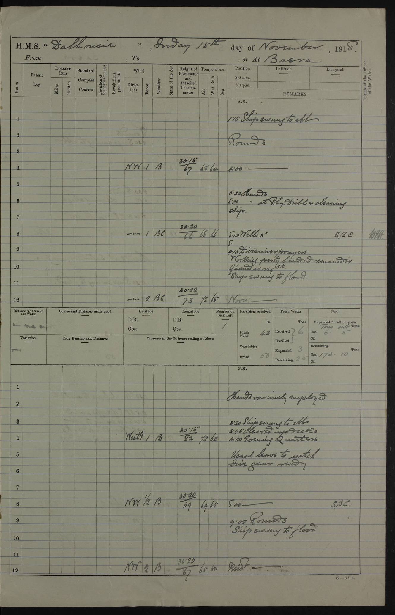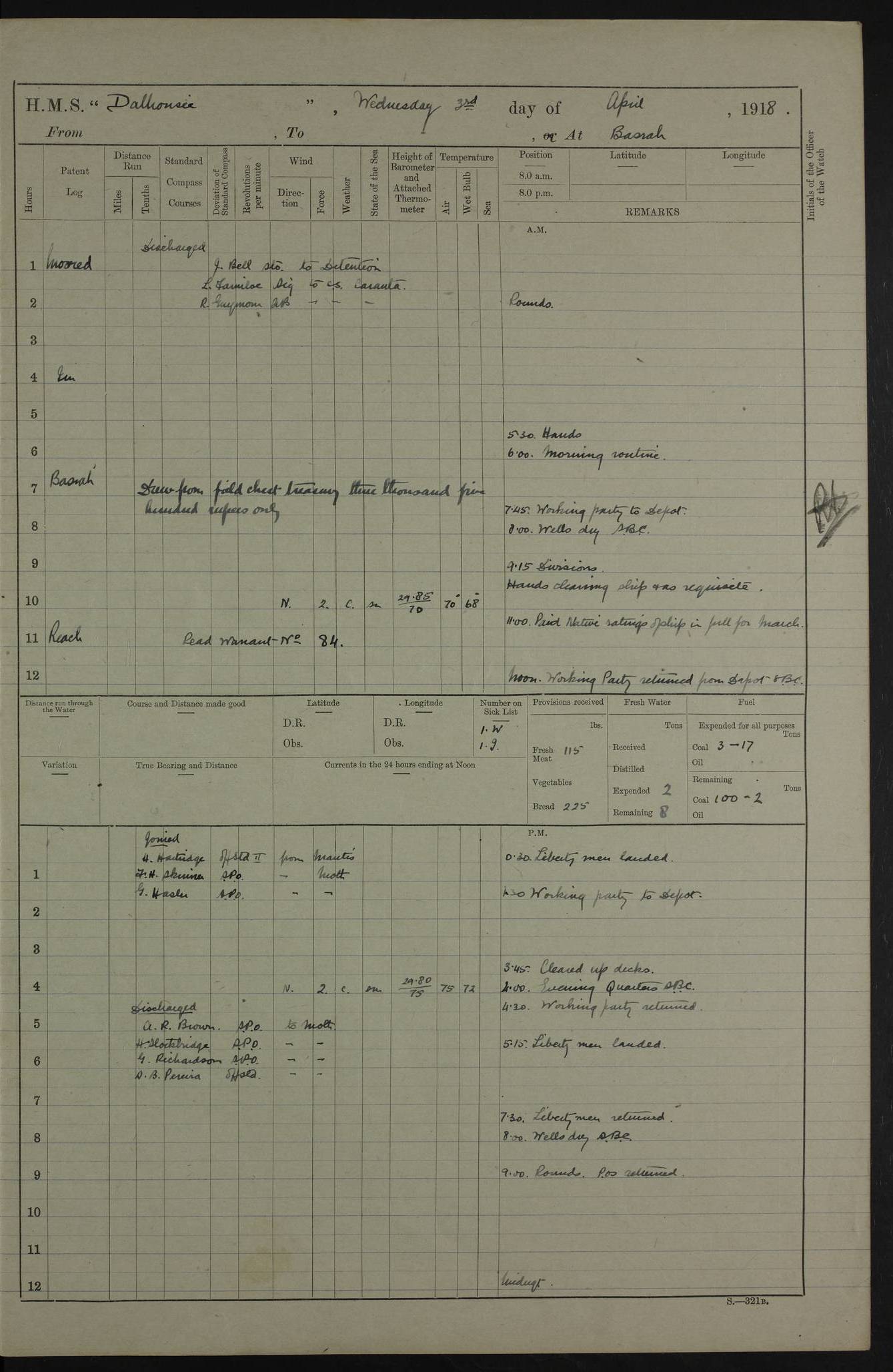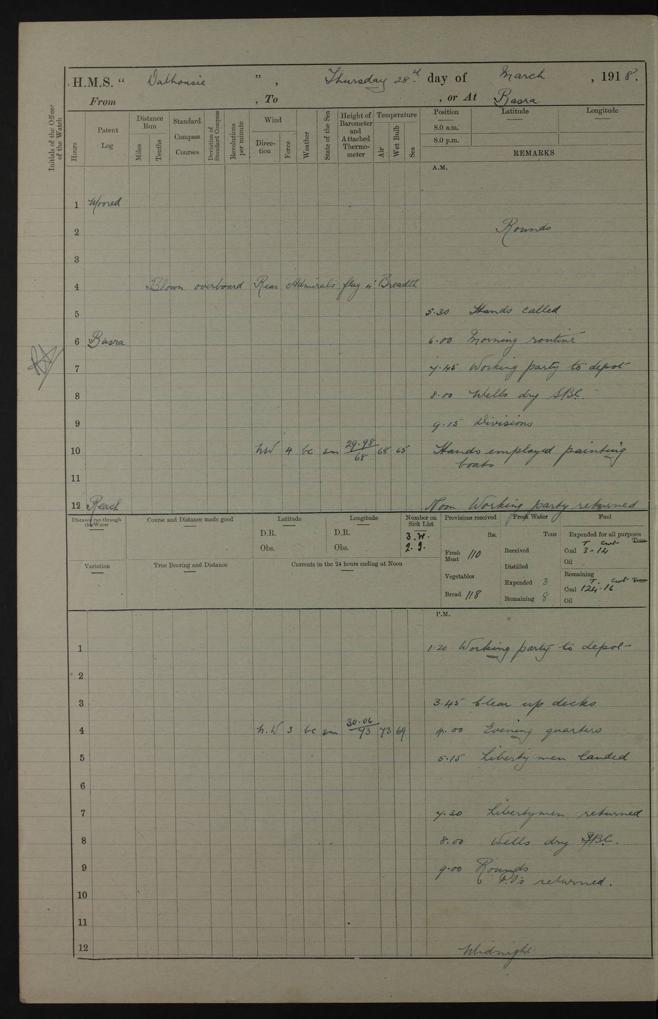 AM – Discharged To EKMA: PJ O’Connor, Lieutenant Royal Navy To Passage: 2 Indian Ratings To FLYCATCHER: D Butcher, Leading Seaman 4ef4fb19e53e0a0c910059d0: (https://s3.amazonaws.com:443/oldweather/ADM53-39410/0015_0.jpg) 26 February 1918 Place: Basrah Lat 30.5269, Long 47.8407 2:00am: Rounds 5:30am: Hands 6:00am: Morning Routine 7:45am: Working party to Depot 8:00am: Wells dry - Signal Books correct 9:10am: Divisions 10:00am: Hands employed painting in cabins & as requisite 12:00pm: Signal Books correct – Working party returned 1:20pm: Working party to Depot 3:45pm: Cleared up decks 4:00pm: Evening Quarters – Signal Books correct 4:30pm: Working party returned 5:10pm: Leave to Watch 6:00pm: Sunset - Fire Gear connected 7:30pm: Liberty men returned 8:00pm: Wells dry - Signal Books correct 9:00pm: Rounds – Signal Books correct PM – Joined From TARANTULA: J Baldwin, Leading Signalman From Hospital: Louis Mones, Engineering driver PM - Discharged To MANTIS: G Munay, Leading Signalman – C Killburn, Signalman To TARANTULA: CM Leary, Telegrapher 4ef4fb19e53e0a0c910059d1: (https://s3.amazonaws.com:443/oldweather/ADM53-39410/0015_1.jpg) 27 February 1918 Place: Basrah Lat 30.5269, Long 47.8407 2:00am: Rounds 5:30am: Hands 6:00am: Morning Routine 7:45am: Working party to Depot 8:00am: Wells dry - Signal Books correct 9:10am: Divisions 10:00am: Hands employed packing surveyed stores, cleaning out boats & painting in Warrant Ratings 12:00pm: Signal Books correct – Working party returned 1:20pm: Working party to Depot 3:45pm: Cleared up decks 4:00pm: Evening Quarters – Signal Books correct 4:30pm: Working party returned 5:10pm: Leave to Watch 6:00pm: Sunset - Fire Gear connected 7:30pm: Liberty men returned 8:00pm: Wells dry - Signal Books correct 9:00pm: Rounds – Signal Books correct AM – Joined From ELEPHANTA: No. 22 Sheik Kadir Sheik Mahomed, Lascar 2nd – No. 41 Abdool Rahman Sheik Dawood, Lamp Trimmer – No. 56 Mahomed Sabia Sheik Bosman, Stoker 2nd – No. 50A Sheik Mahomed Sheik Hassan, Stoker 2nd – No. 90 Abelino Fernandez, Topass – No. 86 Avelino Leitas, Topass 4ef4fb1ae53e0a0c910059d2: (https://s3.amazonaws.com:443/oldweather/ADM53-39410/0016_0.jpg) 28 February 1918 Place: Basrah Lat 30.5269, Long 47.8407 2:00am: Rounds 5:30am: Hands 6:00am: Morning Routine 7:45am: Working party to Depot 8:00am: Wells dry - Signal Books correct 9:10am: Divisions 10:00am: Hands employed discharging stores 12:00pm: Signal Books correct – Working party returned 1:00pm: Issued Quinine to Naval Ratings - Issued Quinine to Native Ratings 1:20pm: Working party to Depot 3:45pm: Cleared up decks 4:00pm: Evening Quarters – Signal Books correct 4:30pm: Working party returned 5:10pm: Leave to Watch 6:00pm: Sunset - Fire Gear connected 7:30pm: Liberty men returned 8:00pm: Wells dry - Signal Books correct 9:00pm: Rounds – Signal Books correct PM – Joined From SAPPHIRE: WC Woolley, Petty Officer PM - Discharged To TARANTULA: L Harris, Signalman To SEDGEFLY: T Hughes, Able Seaman To MANTIS: S Redshaw, Able Seaman To Depot: R Matheison, Stoker – H Philo, Stoker TO GRAYFLY: H Stockbridge, Senior Petty Officer 4ef4fb1ae53e0a0c910059d3: (https://s3.amazonaws.com:443/oldweather/ADM53-39410/0016_1.jpg) Log Page – Blank – no data on Page 4ef4fb1ae53e0a0c910059d4: (https://s3.amazonaws.com:443/oldweather/ADM53-39410/0017_0.jpg) Log Page – Blank – no data on Page 4ef4fb1ae53e0a0c910059d5: (https://s3.amazonaws.com:443/oldweather/ADM53-39410/0017_1.jpg) Log Page – Blank 4ef4fb1ae53e0a0c910059d6: (https://s3.amazonaws.com:443/oldweather/ADM53-39410/0018_0.jpg) Log Page – Blank 4ef4fb1ae53e0a0c910059d7: (https://s3.amazonaws.com:443/oldweather/ADM53-39410/0018_1.jpg) Log Page – Blank LOGS FOR MARCH 1918 4ef4fb1be53e0a0c910059d8: (https://s3.amazonaws.com:443/oldweather/ADM53-39411/0000_0.jpg) Log Page – Cover March 1918 4ef4fb1be53e0a0c910059d9: (https://s3.amazonaws.com:443/oldweather/ADM53-39411/0000_1.jpg) Log Page – Cover – March 1918 4ef4fb1be53e0a0c910059da: (https://s3.amazonaws.com:443/oldweather/ADM53-39411/0001_0.jpg) Log Page – Blank 4ef4fb1be53e0a0c910059db: (https://s3.amazonaws.com:443/oldweather/ADM53-39411/0001_1.jpg) Log Page – Blank – no data on Page 4ef4fb1ce53e0a0c910059dc: (https://s3.amazonaws.com:443/oldweather/ADM53-39411/0002_0.jpg) Log Page – Blank – no data on Page 4ef4fb1ce53e0a0c910059dd: (https://s3.amazonaws.com:443/oldweather/ADM53-39411/0002_1.jpg) 1 March 1918 Place: Basrah Lat 30.5269, Long 47.8407 1:00am: drew from Field Chest Treasury Officer Basrah Five thousand (5,000) Rupees only 2:00am: Rounds 5:30am: Hands 6:00am: Morning Routine 7:45am: Working party to Depot 8:00am: Wells dry – Signal Books correct – CHAKLA arrived with 5 Officers & 60 Ratings 12:00pm: Signal Books correct – Working party returned 1:15pm: Working party to Depot 2:00pm: Paid Lascar Ratings 3:45pm: Cleared up decks 4:00pm: Evening Quarters 4:30pm: Working party returned 5:10pm: Leave to Watch 5:30pm: 5 Petty Officers & 57 Ratings to Bandra for Passage 6:00pm: Sunset - Fire Gear connected 7:30pm: Liberty men returned 9:00pm: Rounds – Petty Officers returned AM – Joined From CHALKA: Hawkins, Paymaster Royal Navy PM - Discharged To FLYCATCHER: Dennis, Sub Lieutenant Royal Navy Volunteer Reserve To TARANTULA: L Harris, Signalman To SEDGEFLY: TG Hughes, Able Seaman To MANTIS: S Redshaw, Able Seaman To Depot: R Mathieson, Stoker To GRAYFLY: H Stockbridge, Senior Petty Officer 4ef4fb1ce53e0a0c910059de: (https://s3.amazonaws.com:443/oldweather/ADM53-39411/0003_0.jpg) 2 March 1918 Place: Basrah Lat 30.5269, Long 47.8407 2:00am: Rounds 5:30am: Hands 6:00am: Morning Routine 7:00am: Exercised Fire Stations 7:45am: Working party to Depot 8:00am: Wells dry - Signal Books correct 9:10am: Divisions 10:00am: Hands employed as requisite 12:00pm: Working party returned 1:15pm: Working party to Depot 3:45pm: Cleared up decks 4:00pm: Evening Quarters – Signal Books corr