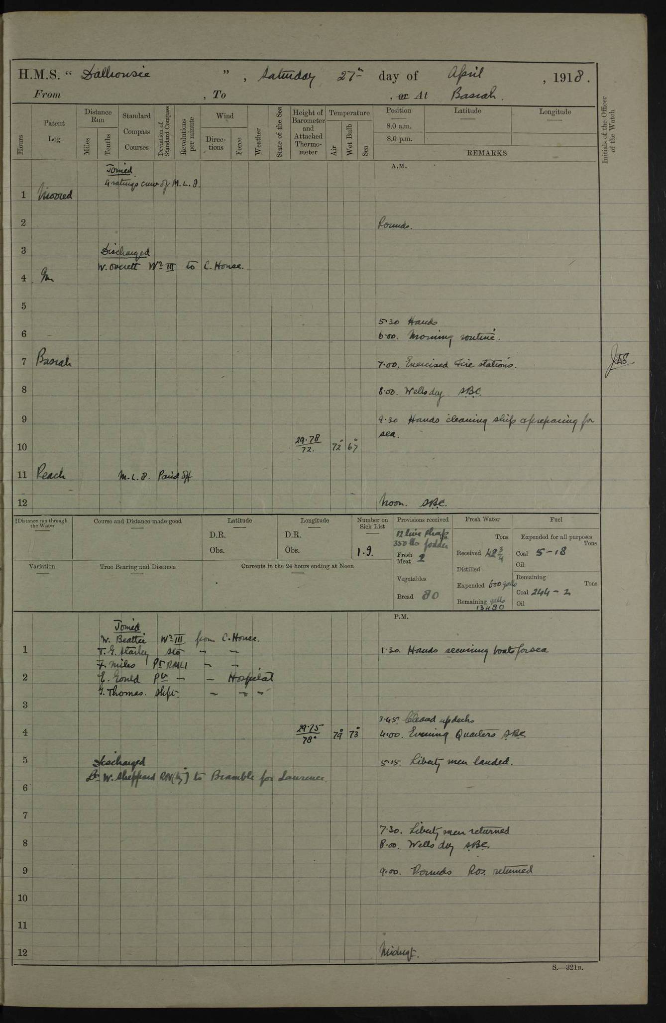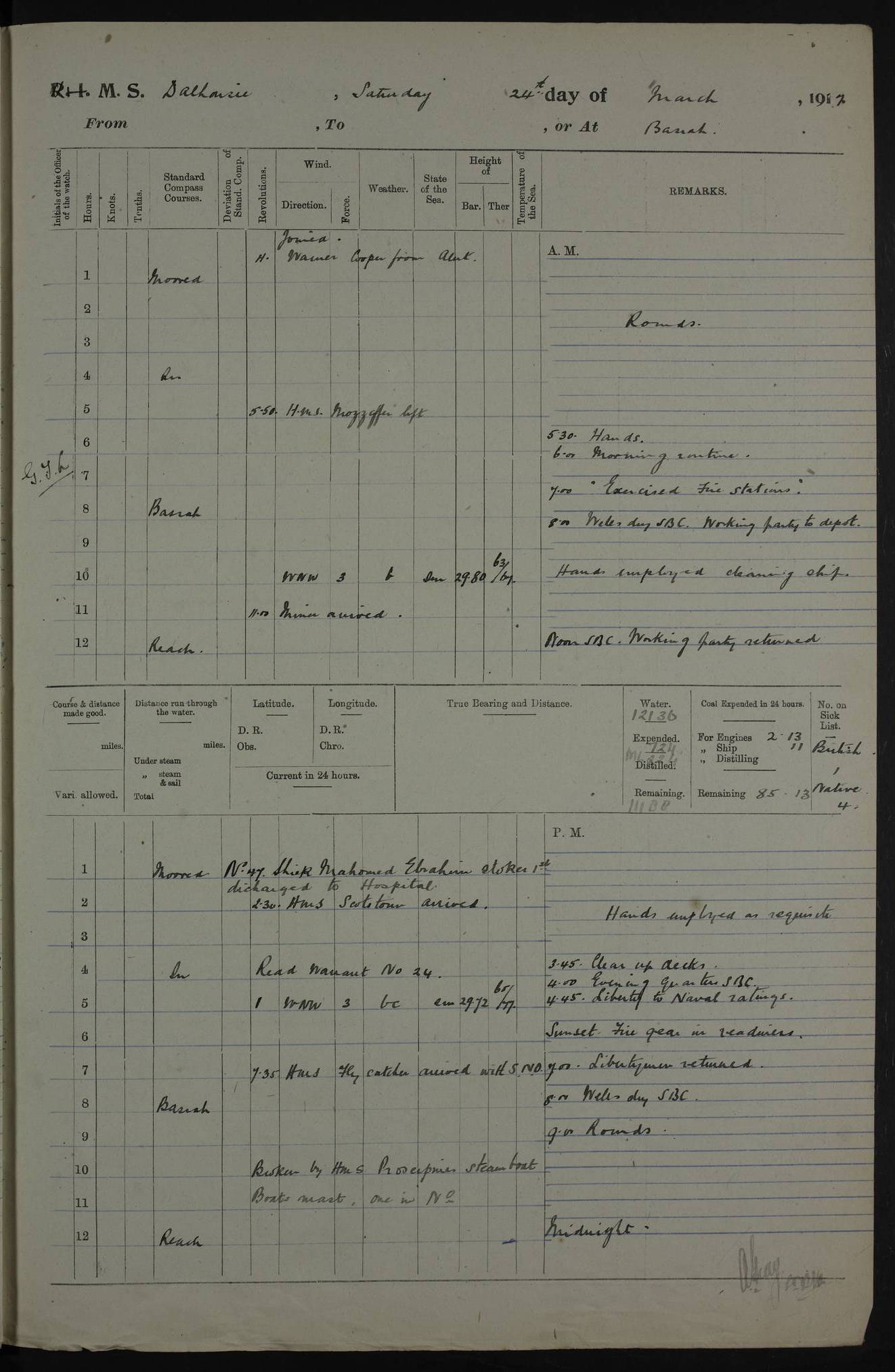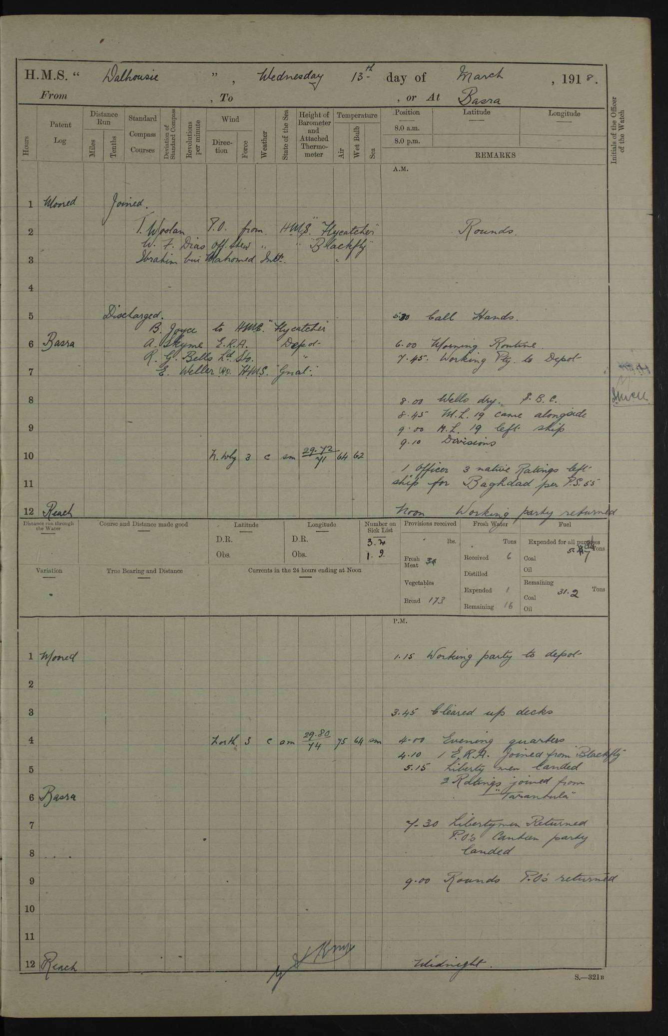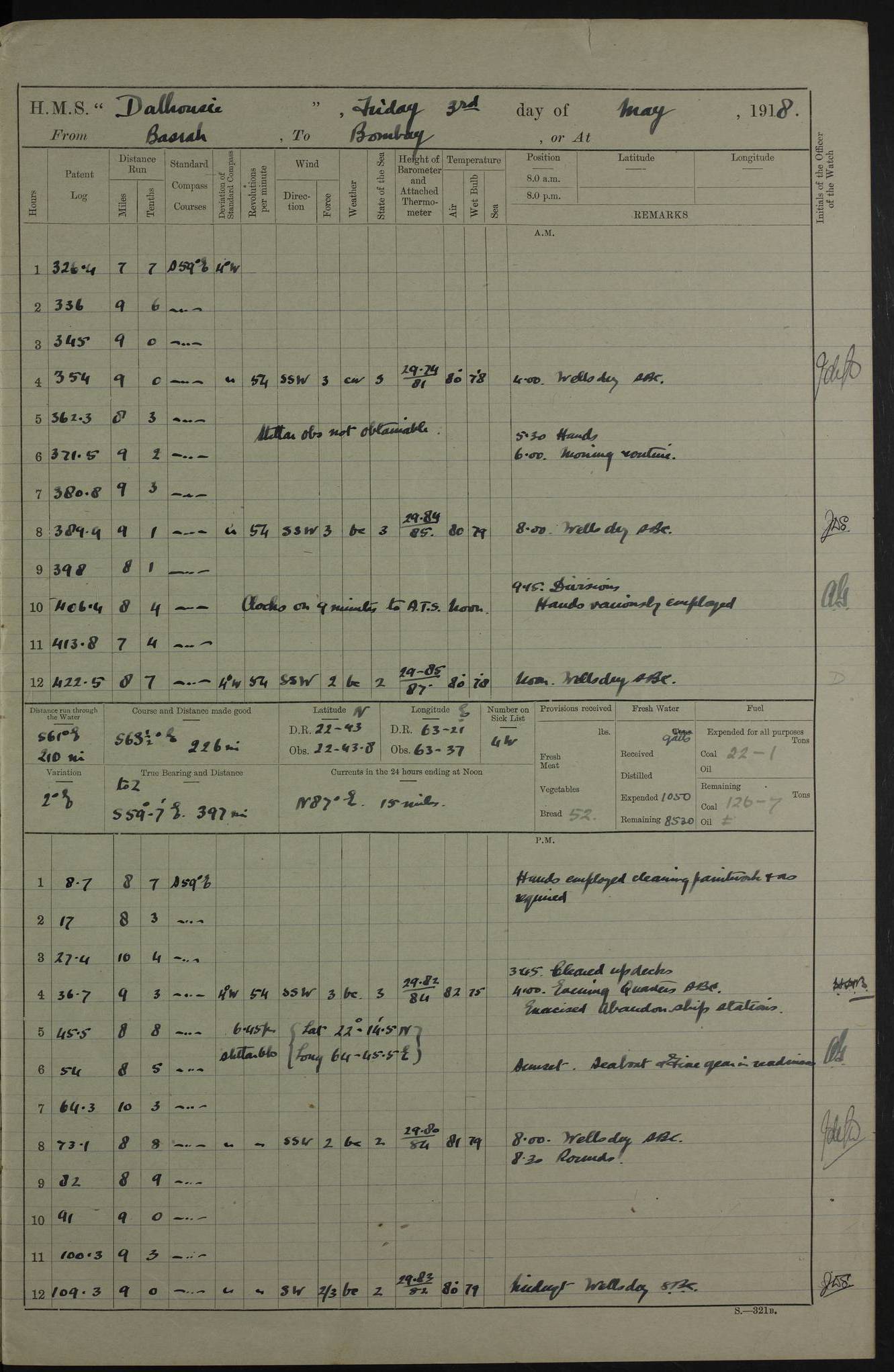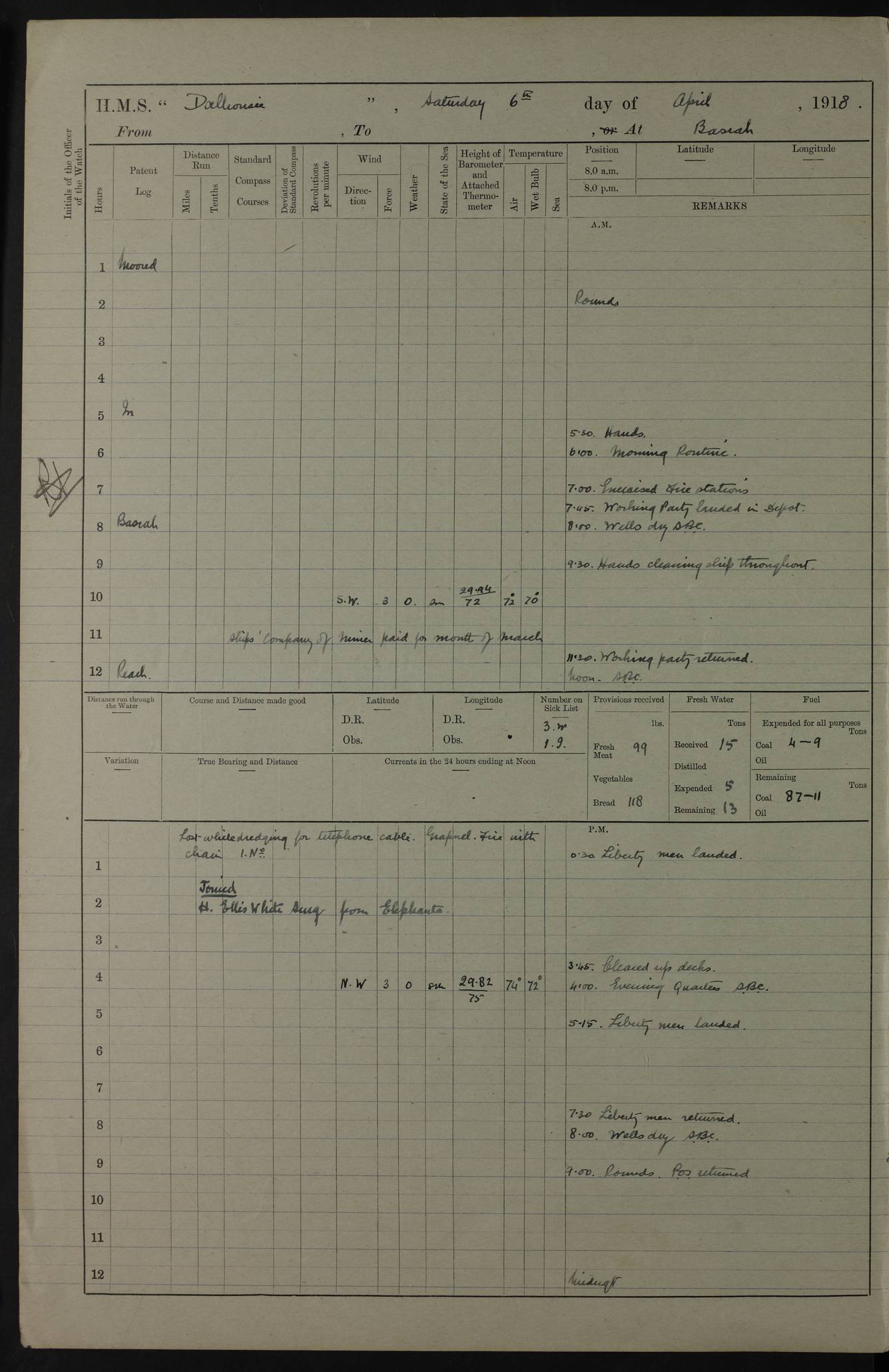 AM – Discharged To EKMA: PJ O’Connor, Lieutenant Royal Navy To Passage: 2 Indian Ratings To FLYCATCHER: D Butcher, Leading Seaman 4ef4fb19e53e0a0c910059d0: (https://s3.amazonaws.com:443/oldweather/ADM53-39410/0015_0.jpg) 26 February 1918 Place: Basrah Lat 30.5269, Long 47.8407 2:00am: Rounds 5:30am: Hands 6:00am: Morning Routine 7:45am: Working party to Depot 8:00am: Wells dry - Signal Books correct 9:10am: Divisions 10:00am: Hands employed painting in cabins & as requisite 12:00pm: Signal Books correct – Working party returned 1:20pm: Working party to Depot 3:45pm: Cleared up decks 4:00pm: Evening Quarters – Signal Books correct 4:30pm: Working party returned 5:10pm: Leave to Watch 6:00pm: Sunset - Fire Gear connected 7:30pm: Liberty men returned 8:00pm: Wells dry - Signal Books correct 9:00pm: Rounds – Signal Books correct PM – Joined From TARANTULA: J Baldwin, Leading Signalman From Hospital: Louis Mones, Engineering driver PM - Discharged To MANTIS: G Munay, Leading Signalman – C Killburn, Signalman To TARANTULA: CM Leary, Telegrapher 4ef4fb19e53e0a0c910059d1: (https://s3.amazonaws.com:443/oldweather/ADM53-39410/0015_1.jpg) 27 February 1918 Place: Basrah Lat 30.5269, Long 47.8407 2:00am: Rounds 5:30am: Hands 6:00am: Morning Routine 7:45am: Working party to Depot 8:00am: Wells dry - Signal Books correct 9:10am: Divisions 10:00am: Hands employed packing surveyed stores, cleaning out boats & painting in Warrant Ratings 12:00pm: Signal Books correct – Working party returned 1:20pm: Working party to Depot 3:45pm: Cleared up decks 4:00pm: Evening Quarters – Signal Books correct 4:30pm: Working party returned 5:10pm: Leave to Watch 6:00pm: Sunset - Fire Gear connected 7:30pm: Liberty men returned 8:00pm: Wells dry - Signal Books correct 9:00pm: Rounds – Signal Books correct AM – Joined From ELEPHANTA: No. 22 Sheik Kadir Sheik Mahomed, Lascar 2nd – No. 41 Abdool Rahman Sheik Dawood, Lamp Trimmer – No. 56 Mahomed Sabia Sheik Bosman, Stoker 2nd – No. 50A Sheik Mahomed Sheik Hassan, Stoker 2nd – No. 90 Abelino Fernandez, Topass – No. 86 Avelino Leitas, Topass 4ef4fb1ae53e0a0c910059d2: (https://s3.amazonaws.com:443/oldweather/ADM53-39410/0016_0.jpg) 28 February 1918 Place: Basrah Lat 30.5269, Long 47.8407 2:00am: Rounds 5:30am: Hands 6:00am: Morning Routine 7:45am: Working party to Depot 8:00am: Wells dry - Signal Books correct 9:10am: Divisions 10:00am: Hands employed discharging stores 12:00pm: Signal Books correct – Working party returned 1:00pm: Issued Quinine to Naval Ratings - Issued Quinine to Native Ratings 1:20pm: Working party to Depot 3:45pm: Cleared up decks 4:00pm: Evening Quarters – Signal Books correct 4:30pm: Working party returned 5:10pm: Leave to Watch 6:00pm: Sunset - Fire Gear connected 7:30pm: Liberty men returned 8:00pm: Wells dry - Signal Books correct 9:00pm: Rounds – Signal Books correct PM – Joined From SAPPHIRE: WC Woolley, Petty Officer PM - Discharged To TARANTULA: L Harris, Signalman To SEDGEFLY: T Hughes, Able Seaman To MANTIS: S Redshaw, Able Seaman To Depot: R Matheison, Stoker – H Philo, Stoker TO GRAYFLY: H Stockbridge, Senior Petty Officer 4ef4fb1ae53e0a0c910059d3: (https://s3.amazonaws.com:443/oldweather/ADM53-39410/0016_1.jpg) Log Page – Blank – no data on Page 4ef4fb1ae53e0a0c910059d4: (https://s3.amazonaws.com:443/oldweather/ADM53-39410/0017_0.jpg) Log Page – Blank – no data on Page 4ef4fb1ae53e0a0c910059d5: (https://s3.amazonaws.com:443/oldweather/ADM53-39410/0017_1.jpg) Log Page – Blank 4ef4fb1ae53e0a0c910059d6: (https://s3.amazonaws.com:443/oldweather/ADM53-39410/0018_0.jpg) Log Page – Blank 4ef4fb1ae53e0a0c910059d7: (https://s3.amazonaws.com:443/oldweather/ADM53-39410/0018_1.jpg) Log Page – Blank LOGS FOR MARCH 1918 4ef4fb1be53e0a0c910059d8: (https://s3.amazonaws.com:443/oldweather/ADM53-39411/0000_0.jpg) Log Page – Cover March 1918 4ef4fb1be53e0a0c910059d9: (https://s3.amazonaws.com:443/oldweather/ADM53-39411/0000_1.jpg) Log Page – Cover – March 1918 4ef4fb1be53e0a0c910059da: (https://s3.amazonaws.com:443/oldweather/ADM53-39411/0001_0.jpg) Log Page – Blank 4ef4fb1be53e0a0c910059db: (https://s3.amazonaws.com:443/oldweather/ADM53-39411/0001_1.jpg) Log Page – Blank – no data on Page 4ef4fb1ce53e0a0c910059dc: (https://s3.amazonaws.com:443/oldweather/ADM53-39411/0002_0.jpg) Log Page – Blank – no data on Page 4ef4fb1ce53e0a0c910059dd: (https://s3.amazonaws.com:443/oldweather/ADM53-39411/0002_1.jpg) 1 March 1918 Place: Basrah Lat 30.5269, Long 47.8407 1:00am: drew from Field Chest Treasury Officer Basrah Five thousand (5,000) Rupees only 2:00am: Rounds 5:30am: Hands 6:00am: Morning Routine 7:45am: Working party to Depot 8:00am: Wells dry – Signal Books correct – CHAKLA arrived with 5 Officers & 60 Ratings 12:00pm: Signal Books correct – Working party returned 1:15pm: Working party to Depot 2:00pm: Paid Lascar Ratings 3:45pm: Cleared up decks 4:00pm: Evening Quarters 4:30pm: Working party returned 5:10pm: Leave to Watch 5:30pm: 5 Petty Officers & 57 Ratings to Bandra for Passage 6:00pm: Sunset - Fire Gear connected 7:30pm: Liberty men returned 9:00pm: Rounds – Petty Officers returned AM – Joined From CHALKA: Hawkins, Paymaster Royal Navy PM - Discharged To FLYCATCHER: Dennis, Sub Lieutenant Royal Navy Volunteer Reserve To TARANTULA: L Harris, Signalman To SEDGEFLY: TG Hughes, Able Seaman To MANTIS: S Redshaw, Able Seaman To Depot: R Mathieson, Stoker To GRAYFLY: H Stockbridge, Senior Petty Officer 4ef4fb1ce53e0a0c910059de: (https://s3.amazonaws.com:443/oldweather/ADM53-39411/0003_0.jpg) 2 March 1918 Place: Basrah Lat 30.5269, Long 47.8407 2:00am: Rounds 5:30am: Hands 6:00am: Morning Routine 7:00am: Exercised Fire Stations 7:45am: Working party to Depot 8:00am: Wells dry - Signal Books correct 9:10am: Divisions 10:00am: Hands employed as requisite 12:00pm: Working party returned 1:15pm: Working party to Depot 3:45pm: Cleared up decks 4:00pm: Evening Quarters – Signal Books corr