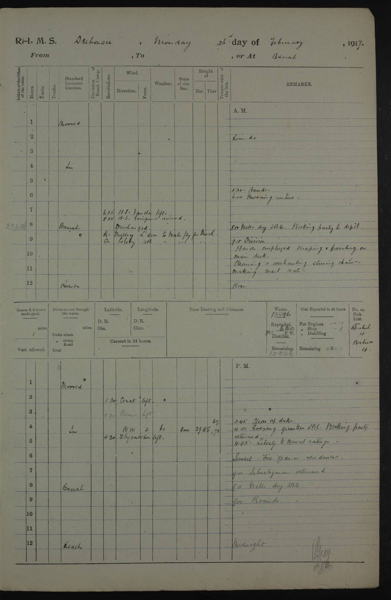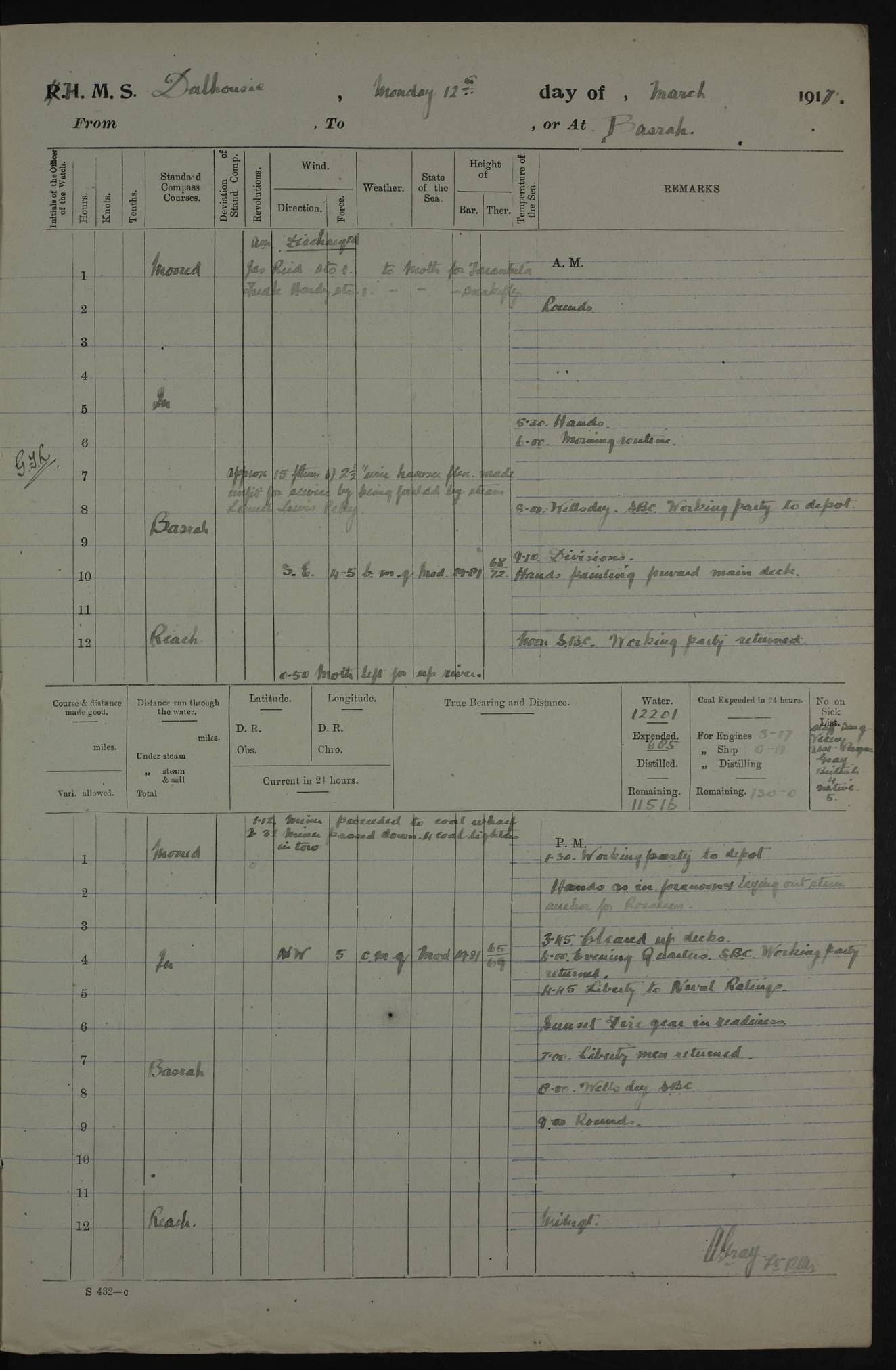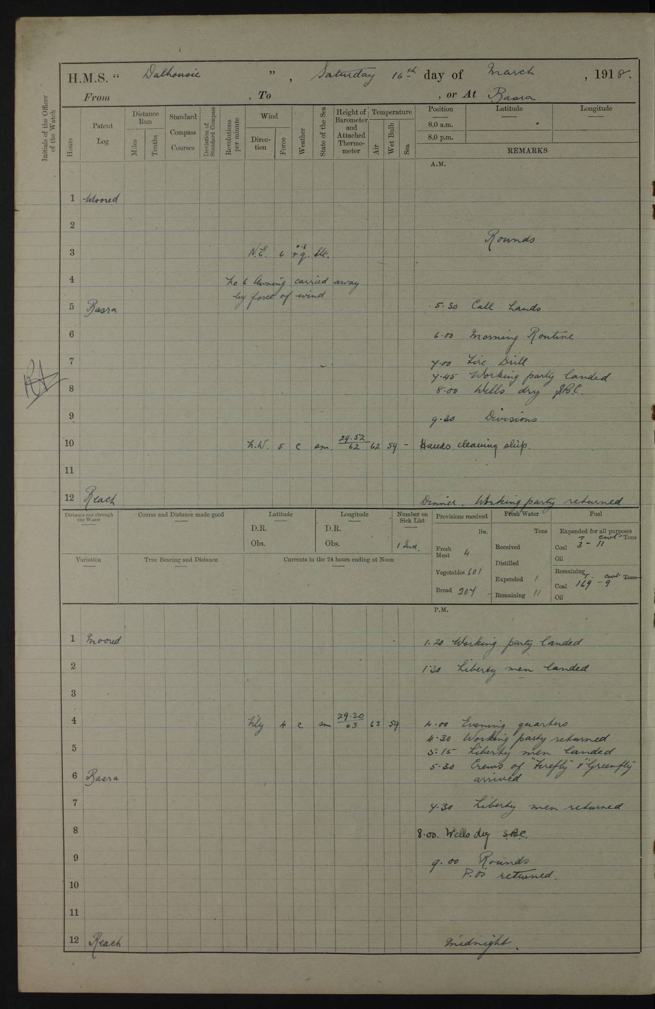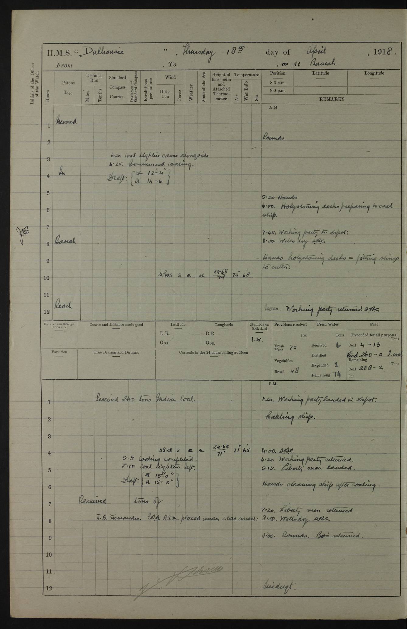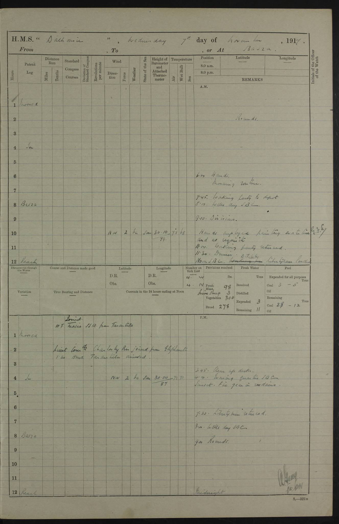 AM – Discharged To EKMA: PJ O’Connor, Lieutenant Royal Navy To Passage: 2 Indian Ratings To FLYCATCHER: D Butcher, Leading Seaman 4ef4fb19e53e0a0c910059d0: (https://s3.amazonaws.com:443/oldweather/ADM53-39410/0015_0.jpg) 26 February 1918 Place: Basrah Lat 30.5269, Long 47.8407 2:00am: Rounds 5:30am: Hands 6:00am: Morning Routine 7:45am: Working party to Depot 8:00am: Wells dry - Signal Books correct 9:10am: Divisions 10:00am: Hands employed painting in cabins & as requisite 12:00pm: Signal Books correct – Working party returned 1:20pm: Working party to Depot 3:45pm: Cleared up decks 4:00pm: Evening Quarters – Signal Books correct 4:30pm: Working party returned 5:10pm: Leave to Watch 6:00pm: Sunset - Fire Gear connected 7:30pm: Liberty men returned 8:00pm: Wells dry - Signal Books correct 9:00pm: Rounds – Signal Books correct PM – Joined From TARANTULA: J Baldwin, Leading Signalman From Hospital: Louis Mones, Engineering driver PM - Discharged To MANTIS: G Munay, Leading Signalman – C Killburn, Signalman To TARANTULA: CM Leary, Telegrapher 4ef4fb19e53e0a0c910059d1: (https://s3.amazonaws.com:443/oldweather/ADM53-39410/0015_1.jpg) 27 February 1918 Place: Basrah Lat 30.5269, Long 47.8407 2:00am: Rounds 5:30am: Hands 6:00am: Morning Routine 7:45am: Working party to Depot 8:00am: Wells dry - Signal Books correct 9:10am: Divisions 10:00am: Hands employed packing surveyed stores, cleaning out boats & painting in Warrant Ratings 12:00pm: Signal Books correct – Working party returned 1:20pm: Working party to Depot 3:45pm: Cleared up decks 4:00pm: Evening Quarters – Signal Books correct 4:30pm: Working party returned 5:10pm: Leave to Watch 6:00pm: Sunset - Fire Gear connected 7:30pm: Liberty men returned 8:00pm: Wells dry - Signal Books correct 9:00pm: Rounds – Signal Books correct AM – Joined From ELEPHANTA: No. 22 Sheik Kadir Sheik Mahomed, Lascar 2nd – No. 41 Abdool Rahman Sheik Dawood, Lamp Trimmer – No. 56 Mahomed Sabia Sheik Bosman, Stoker 2nd – No. 50A Sheik Mahomed Sheik Hassan, Stoker 2nd – No. 90 Abelino Fernandez, Topass – No. 86 Avelino Leitas, Topass 4ef4fb1ae53e0a0c910059d2: (https://s3.amazonaws.com:443/oldweather/ADM53-39410/0016_0.jpg) 28 February 1918 Place: Basrah Lat 30.5269, Long 47.8407 2:00am: Rounds 5:30am: Hands 6:00am: Morning Routine 7:45am: Working party to Depot 8:00am: Wells dry - Signal Books correct 9:10am: Divisions 10:00am: Hands employed discharging stores 12:00pm: Signal Books correct – Working party returned 1:00pm: Issued Quinine to Naval Ratings - Issued Quinine to Native Ratings 1:20pm: Working party to Depot 3:45pm: Cleared up decks 4:00pm: Evening Quarters – Signal Books correct 4:30pm: Working party returned 5:10pm: Leave to Watch 6:00pm: Sunset - Fire Gear connected 7:30pm: Liberty men returned 8:00pm: Wells dry - Signal Books correct 9:00pm: Rounds – Signal Books correct PM – Joined From SAPPHIRE: WC Woolley, Petty Officer PM - Discharged To TARANTULA: L Harris, Signalman To SEDGEFLY: T Hughes, Able Seaman To MANTIS: S Redshaw, Able Seaman To Depot: R Matheison, Stoker – H Philo, Stoker TO GRAYFLY: H Stockbridge, Senior Petty Officer 4ef4fb1ae53e0a0c910059d3: (https://s3.amazonaws.com:443/oldweather/ADM53-39410/0016_1.jpg) Log Page – Blank – no data on Page 4ef4fb1ae53e0a0c910059d4: (https://s3.amazonaws.com:443/oldweather/ADM53-39410/0017_0.jpg) Log Page – Blank – no data on Page 4ef4fb1ae53e0a0c910059d5: (https://s3.amazonaws.com:443/oldweather/ADM53-39410/0017_1.jpg) Log Page – Blank 4ef4fb1ae53e0a0c910059d6: (https://s3.amazonaws.com:443/oldweather/ADM53-39410/0018_0.jpg) Log Page – Blank 4ef4fb1ae53e0a0c910059d7: (https://s3.amazonaws.com:443/oldweather/ADM53-39410/0018_1.jpg) Log Page – Blank LOGS FOR MARCH 1918 4ef4fb1be53e0a0c910059d8: (https://s3.amazonaws.com:443/oldweather/ADM53-39411/0000_0.jpg) Log Page – Cover March 1918 4ef4fb1be53e0a0c910059d9: (https://s3.amazonaws.com:443/oldweather/ADM53-39411/0000_1.jpg) Log Page – Cover – March 1918 4ef4fb1be53e0a0c910059da: (https://s3.amazonaws.com:443/oldweather/ADM53-39411/0001_0.jpg) Log Page – Blank 4ef4fb1be53e0a0c910059db: (https://s3.amazonaws.com:443/oldweather/ADM53-39411/0001_1.jpg) Log Page – Blank – no data on Page 4ef4fb1ce53e0a0c910059dc: (https://s3.amazonaws.com:443/oldweather/ADM53-39411/0002_0.jpg) Log Page – Blank – no data on Page 4ef4fb1ce53e0a0c910059dd: (https://s3.amazonaws.com:443/oldweather/ADM53-39411/0002_1.jpg) 1 March 1918 Place: Basrah Lat 30.5269, Long 47.8407 1:00am: drew from Field Chest Treasury Officer Basrah Five thousand (5,000) Rupees only 2:00am: Rounds 5:30am: Hands 6:00am: Morning Routine 7:45am: Working party to Depot 8:00am: Wells dry – Signal Books correct – CHAKLA arrived with 5 Officers & 60 Ratings 12:00pm: Signal Books correct – Working party returned 1:15pm: Working party to Depot 2:00pm: Paid Lascar Ratings 3:45pm: Cleared up decks 4:00pm: Evening Quarters 4:30pm: Working party returned 5:10pm: Leave to Watch 5:30pm: 5 Petty Officers & 57 Ratings to Bandra for Passage 6:00pm: Sunset - Fire Gear connected 7:30pm: Liberty men returned 9:00pm: Rounds – Petty Officers returned AM – Joined From CHALKA: Hawkins, Paymaster Royal Navy PM - Discharged To FLYCATCHER: Dennis, Sub Lieutenant Royal Navy Volunteer Reserve To TARANTULA: L Harris, Signalman To SEDGEFLY: TG Hughes, Able Seaman To MANTIS: S Redshaw, Able Seaman To Depot: R Mathieson, Stoker To GRAYFLY: H Stockbridge, Senior Petty Officer 4ef4fb1ce53e0a0c910059de: (https://s3.amazonaws.com:443/oldweather/ADM53-39411/0003_0.jpg) 2 March 1918 Place: Basrah Lat 30.5269, Long 47.8407 2:00am: Rounds 5:30am: Hands 6:00am: Morning Routine 7:00am: Exercised Fire Stations 7:45am: Working party to Depot 8:00am: Wells dry - Signal Books correct 9:10am: Divisions 10:00am: Hands employed as requisite 12:00pm: Working party returned 1:15pm: Working party to Depot 3:45pm: Cleared up decks 4:00pm: Evening Quarters – Signal Books corr