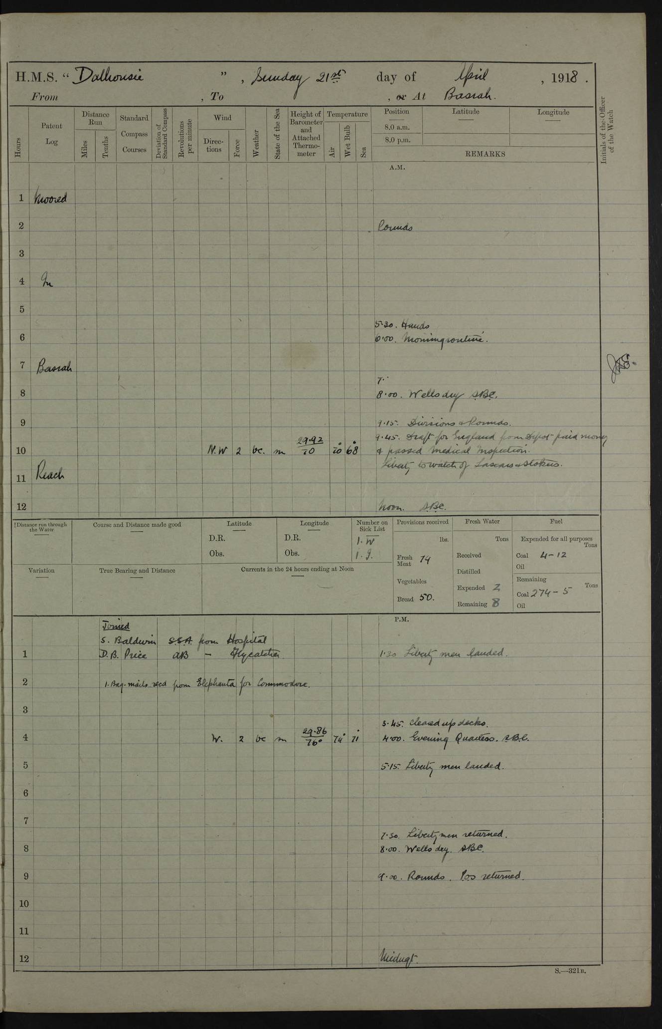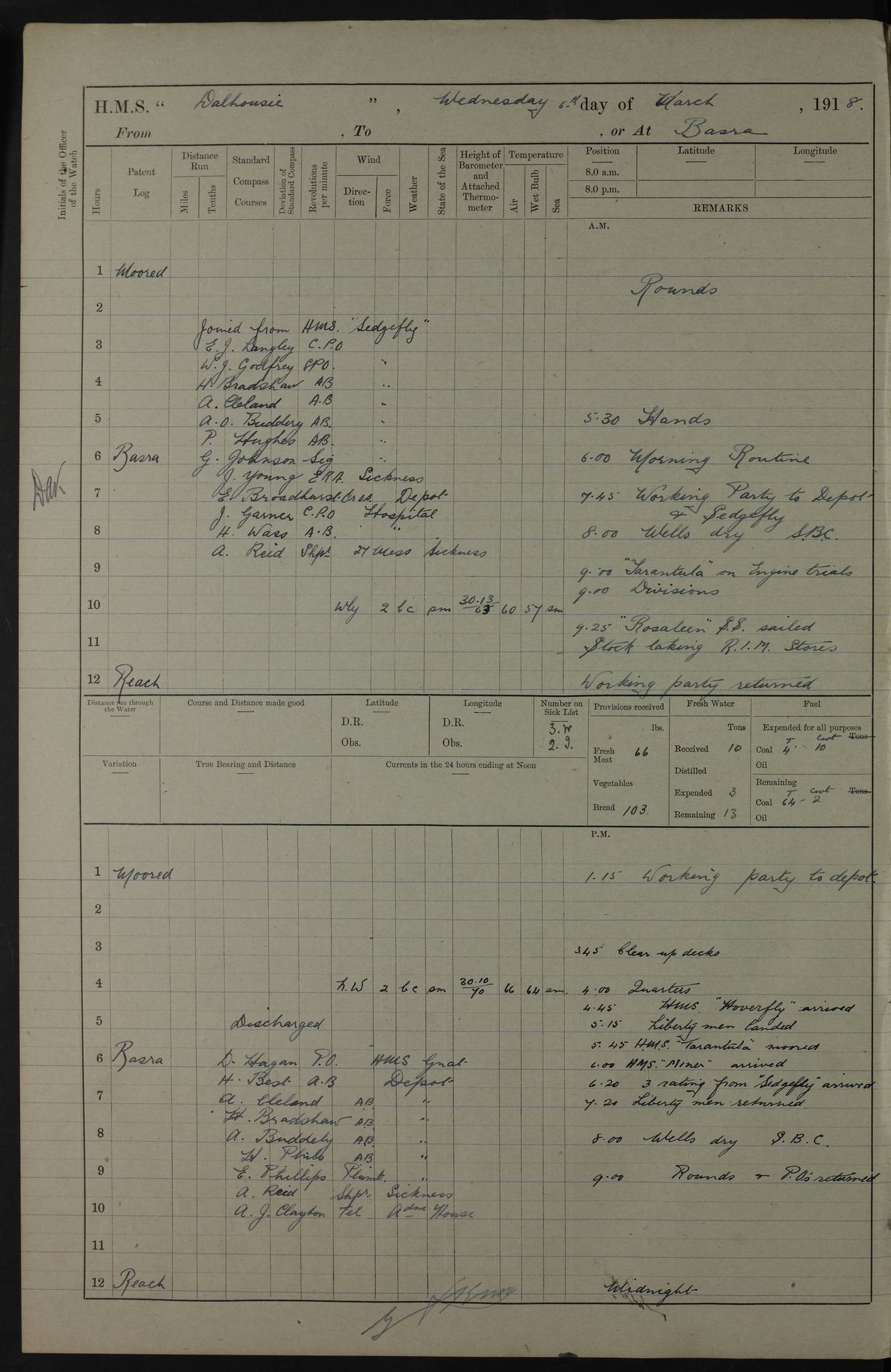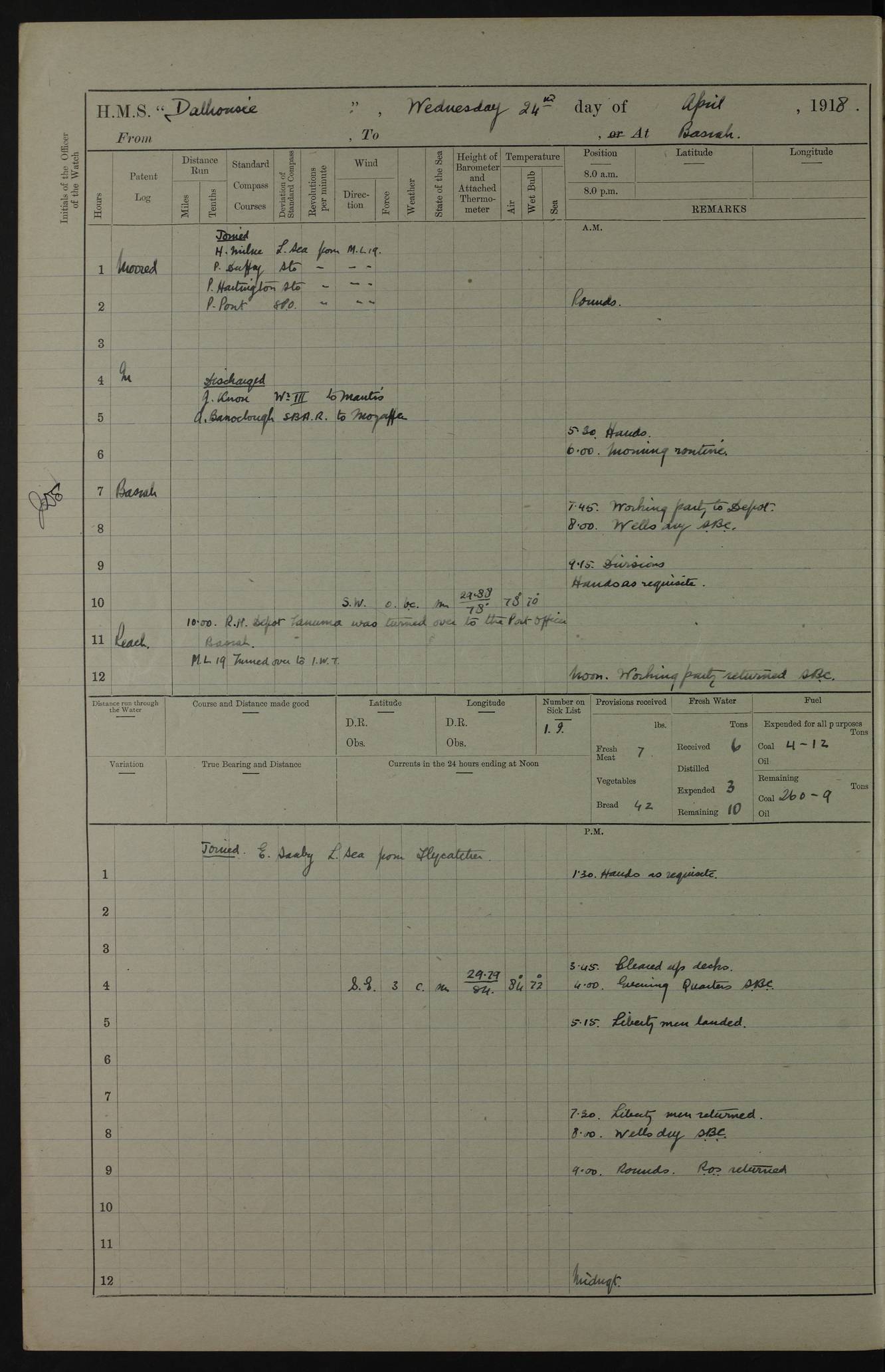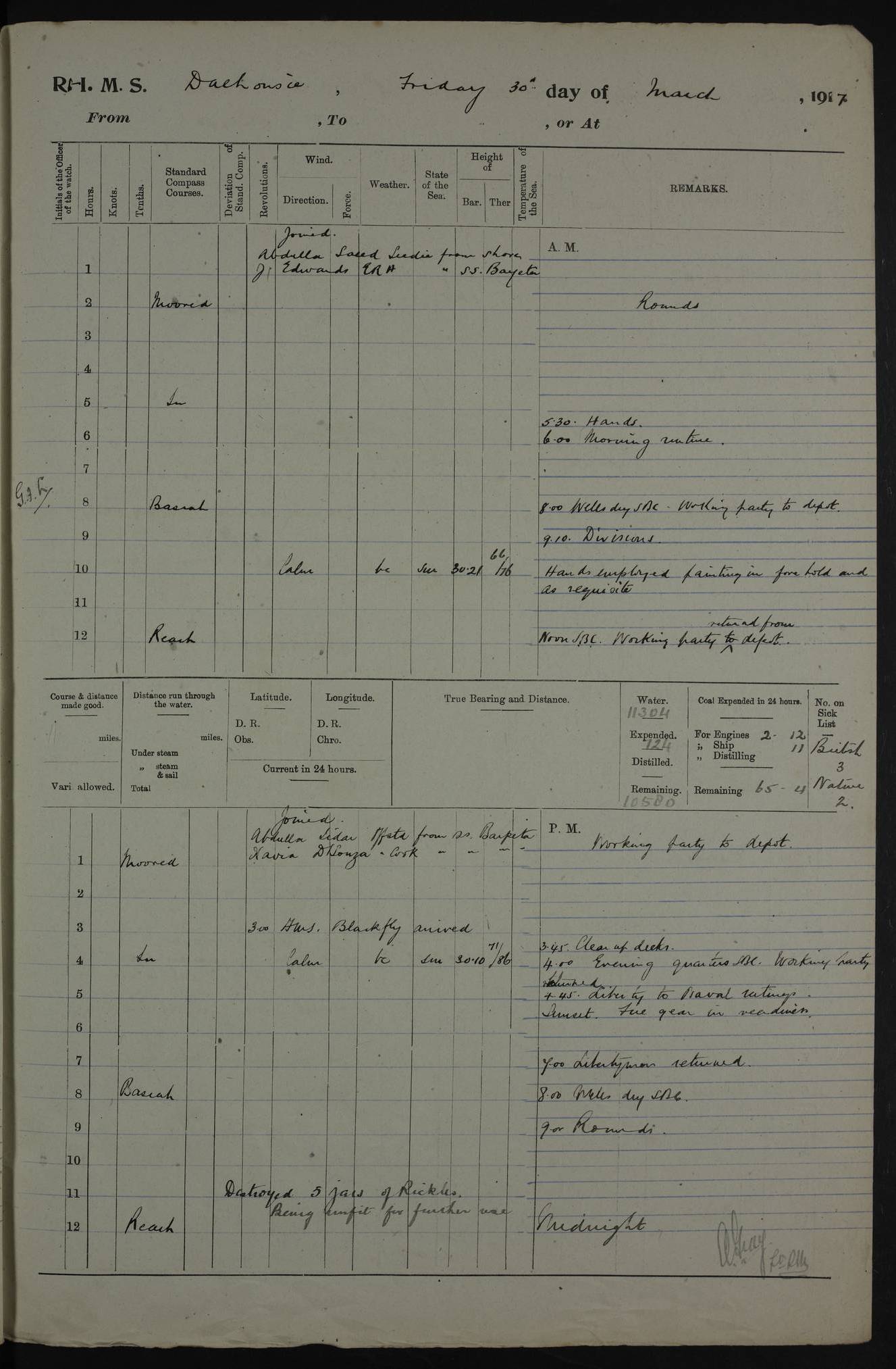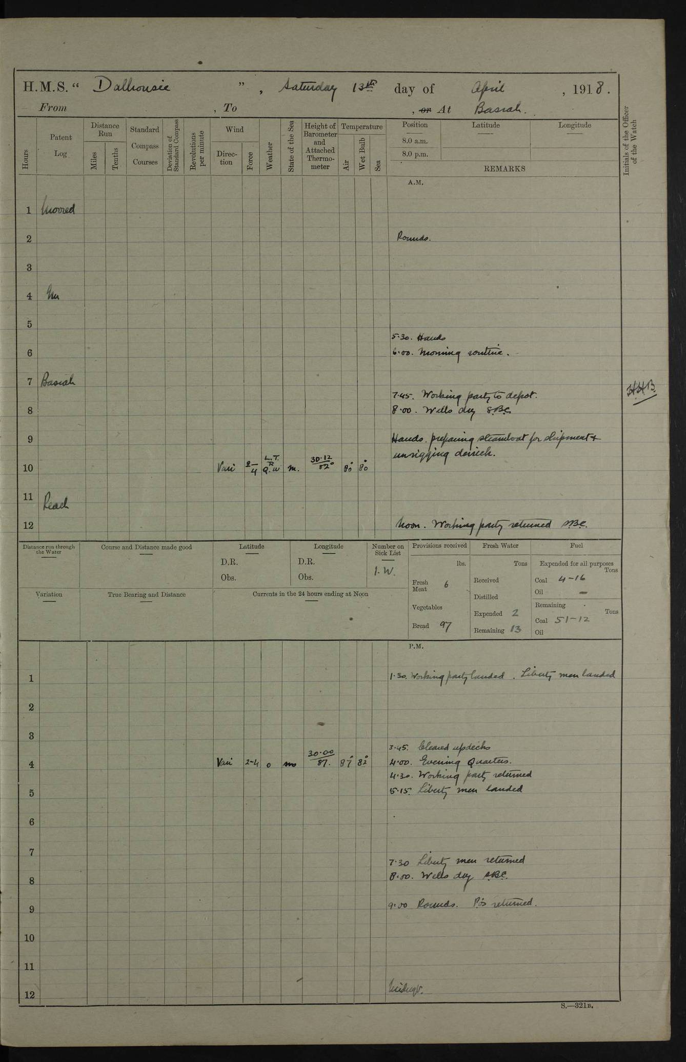 AM – Discharged To EKMA: PJ O’Connor, Lieutenant Royal Navy To Passage: 2 Indian Ratings To FLYCATCHER: D Butcher, Leading Seaman 4ef4fb19e53e0a0c910059d0: (https://s3.amazonaws.com:443/oldweather/ADM53-39410/0015_0.jpg) 26 February 1918 Place: Basrah Lat 30.5269, Long 47.8407 2:00am: Rounds 5:30am: Hands 6:00am: Morning Routine 7:45am: Working party to Depot 8:00am: Wells dry - Signal Books correct 9:10am: Divisions 10:00am: Hands employed painting in cabins & as requisite 12:00pm: Signal Books correct – Working party returned 1:20pm: Working party to Depot 3:45pm: Cleared up decks 4:00pm: Evening Quarters – Signal Books correct 4:30pm: Working party returned 5:10pm: Leave to Watch 6:00pm: Sunset - Fire Gear connected 7:30pm: Liberty men returned 8:00pm: Wells dry - Signal Books correct 9:00pm: Rounds – Signal Books correct PM – Joined From TARANTULA: J Baldwin, Leading Signalman From Hospital: Louis Mones, Engineering driver PM - Discharged To MANTIS: G Munay, Leading Signalman – C Killburn, Signalman To TARANTULA: CM Leary, Telegrapher 4ef4fb19e53e0a0c910059d1: (https://s3.amazonaws.com:443/oldweather/ADM53-39410/0015_1.jpg) 27 February 1918 Place: Basrah Lat 30.5269, Long 47.8407 2:00am: Rounds 5:30am: Hands 6:00am: Morning Routine 7:45am: Working party to Depot 8:00am: Wells dry - Signal Books correct 9:10am: Divisions 10:00am: Hands employed packing surveyed stores, cleaning out boats & painting in Warrant Ratings 12:00pm: Signal Books correct – Working party returned 1:20pm: Working party to Depot 3:45pm: Cleared up decks 4:00pm: Evening Quarters – Signal Books correct 4:30pm: Working party returned 5:10pm: Leave to Watch 6:00pm: Sunset - Fire Gear connected 7:30pm: Liberty men returned 8:00pm: Wells dry - Signal Books correct 9:00pm: Rounds – Signal Books correct AM – Joined From ELEPHANTA: No. 22 Sheik Kadir Sheik Mahomed, Lascar 2nd – No. 41 Abdool Rahman Sheik Dawood, Lamp Trimmer – No. 56 Mahomed Sabia Sheik Bosman, Stoker 2nd – No. 50A Sheik Mahomed Sheik Hassan, Stoker 2nd – No. 90 Abelino Fernandez, Topass – No. 86 Avelino Leitas, Topass 4ef4fb1ae53e0a0c910059d2: (https://s3.amazonaws.com:443/oldweather/ADM53-39410/0016_0.jpg) 28 February 1918 Place: Basrah Lat 30.5269, Long 47.8407 2:00am: Rounds 5:30am: Hands 6:00am: Morning Routine 7:45am: Working party to Depot 8:00am: Wells dry - Signal Books correct 9:10am: Divisions 10:00am: Hands employed discharging stores 12:00pm: Signal Books correct – Working party returned 1:00pm: Issued Quinine to Naval Ratings - Issued Quinine to Native Ratings 1:20pm: Working party to Depot 3:45pm: Cleared up decks 4:00pm: Evening Quarters – Signal Books correct 4:30pm: Working party returned 5:10pm: Leave to Watch 6:00pm: Sunset - Fire Gear connected 7:30pm: Liberty men returned 8:00pm: Wells dry - Signal Books correct 9:00pm: Rounds – Signal Books correct PM – Joined From SAPPHIRE: WC Woolley, Petty Officer PM - Discharged To TARANTULA: L Harris, Signalman To SEDGEFLY: T Hughes, Able Seaman To MANTIS: S Redshaw, Able Seaman To Depot: R Matheison, Stoker – H Philo, Stoker TO GRAYFLY: H Stockbridge, Senior Petty Officer 4ef4fb1ae53e0a0c910059d3: (https://s3.amazonaws.com:443/oldweather/ADM53-39410/0016_1.jpg) Log Page – Blank – no data on Page 4ef4fb1ae53e0a0c910059d4: (https://s3.amazonaws.com:443/oldweather/ADM53-39410/0017_0.jpg) Log Page – Blank – no data on Page 4ef4fb1ae53e0a0c910059d5: (https://s3.amazonaws.com:443/oldweather/ADM53-39410/0017_1.jpg) Log Page – Blank 4ef4fb1ae53e0a0c910059d6: (https://s3.amazonaws.com:443/oldweather/ADM53-39410/0018_0.jpg) Log Page – Blank 4ef4fb1ae53e0a0c910059d7: (https://s3.amazonaws.com:443/oldweather/ADM53-39410/0018_1.jpg) Log Page – Blank LOGS FOR MARCH 1918 4ef4fb1be53e0a0c910059d8: (https://s3.amazonaws.com:443/oldweather/ADM53-39411/0000_0.jpg) Log Page – Cover March 1918 4ef4fb1be53e0a0c910059d9: (https://s3.amazonaws.com:443/oldweather/ADM53-39411/0000_1.jpg) Log Page – Cover – March 1918 4ef4fb1be53e0a0c910059da: (https://s3.amazonaws.com:443/oldweather/ADM53-39411/0001_0.jpg) Log Page – Blank 4ef4fb1be53e0a0c910059db: (https://s3.amazonaws.com:443/oldweather/ADM53-39411/0001_1.jpg) Log Page – Blank – no data on Page 4ef4fb1ce53e0a0c910059dc: (https://s3.amazonaws.com:443/oldweather/ADM53-39411/0002_0.jpg) Log Page – Blank – no data on Page 4ef4fb1ce53e0a0c910059dd: (https://s3.amazonaws.com:443/oldweather/ADM53-39411/0002_1.jpg) 1 March 1918 Place: Basrah Lat 30.5269, Long 47.8407 1:00am: drew from Field Chest Treasury Officer Basrah Five thousand (5,000) Rupees only 2:00am: Rounds 5:30am: Hands 6:00am: Morning Routine 7:45am: Working party to Depot 8:00am: Wells dry – Signal Books correct – CHAKLA arrived with 5 Officers & 60 Ratings 12:00pm: Signal Books correct – Working party returned 1:15pm: Working party to Depot 2:00pm: Paid Lascar Ratings 3:45pm: Cleared up decks 4:00pm: Evening Quarters 4:30pm: Working party returned 5:10pm: Leave to Watch 5:30pm: 5 Petty Officers & 57 Ratings to Bandra for Passage 6:00pm: Sunset - Fire Gear connected 7:30pm: Liberty men returned 9:00pm: Rounds – Petty Officers returned AM – Joined From CHALKA: Hawkins, Paymaster Royal Navy PM - Discharged To FLYCATCHER: Dennis, Sub Lieutenant Royal Navy Volunteer Reserve To TARANTULA: L Harris, Signalman To SEDGEFLY: TG Hughes, Able Seaman To MANTIS: S Redshaw, Able Seaman To Depot: R Mathieson, Stoker To GRAYFLY: H Stockbridge, Senior Petty Officer 4ef4fb1ce53e0a0c910059de: (https://s3.amazonaws.com:443/oldweather/ADM53-39411/0003_0.jpg) 2 March 1918 Place: Basrah Lat 30.5269, Long 47.8407 2:00am: Rounds 5:30am: Hands 6:00am: Morning Routine 7:00am: Exercised Fire Stations 7:45am: Working party to Depot 8:00am: Wells dry - Signal Books correct 9:10am: Divisions 10:00am: Hands employed as requisite 12:00pm: Working party returned 1:15pm: Working party to Depot 3:45pm: Cleared up decks 4:00pm: Evening Quarters – Signal Books corr