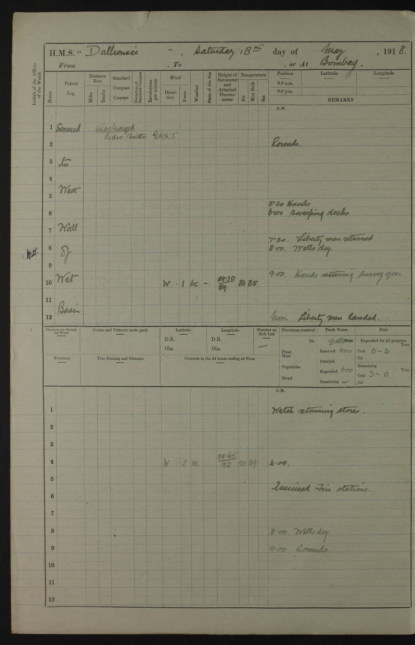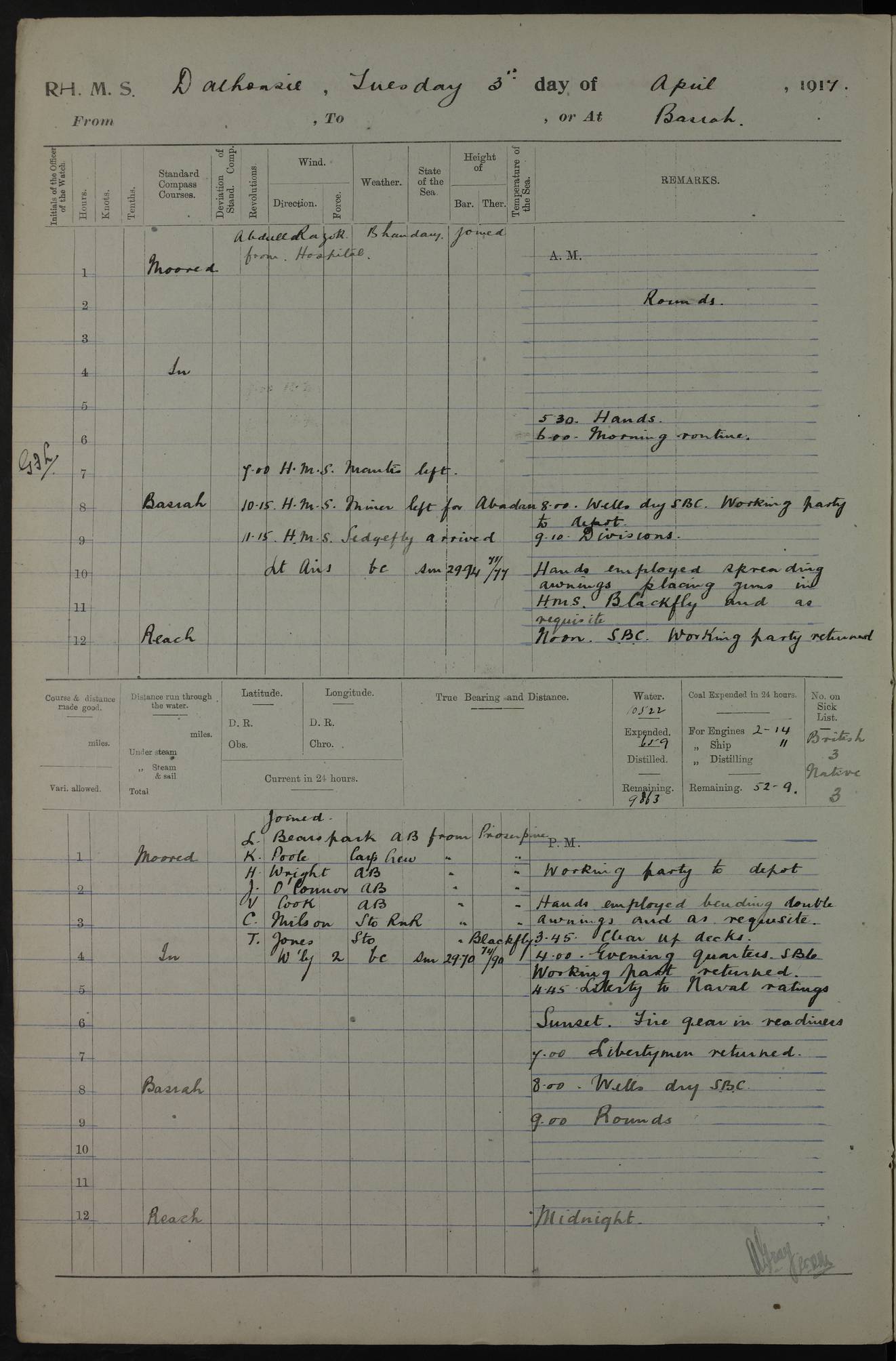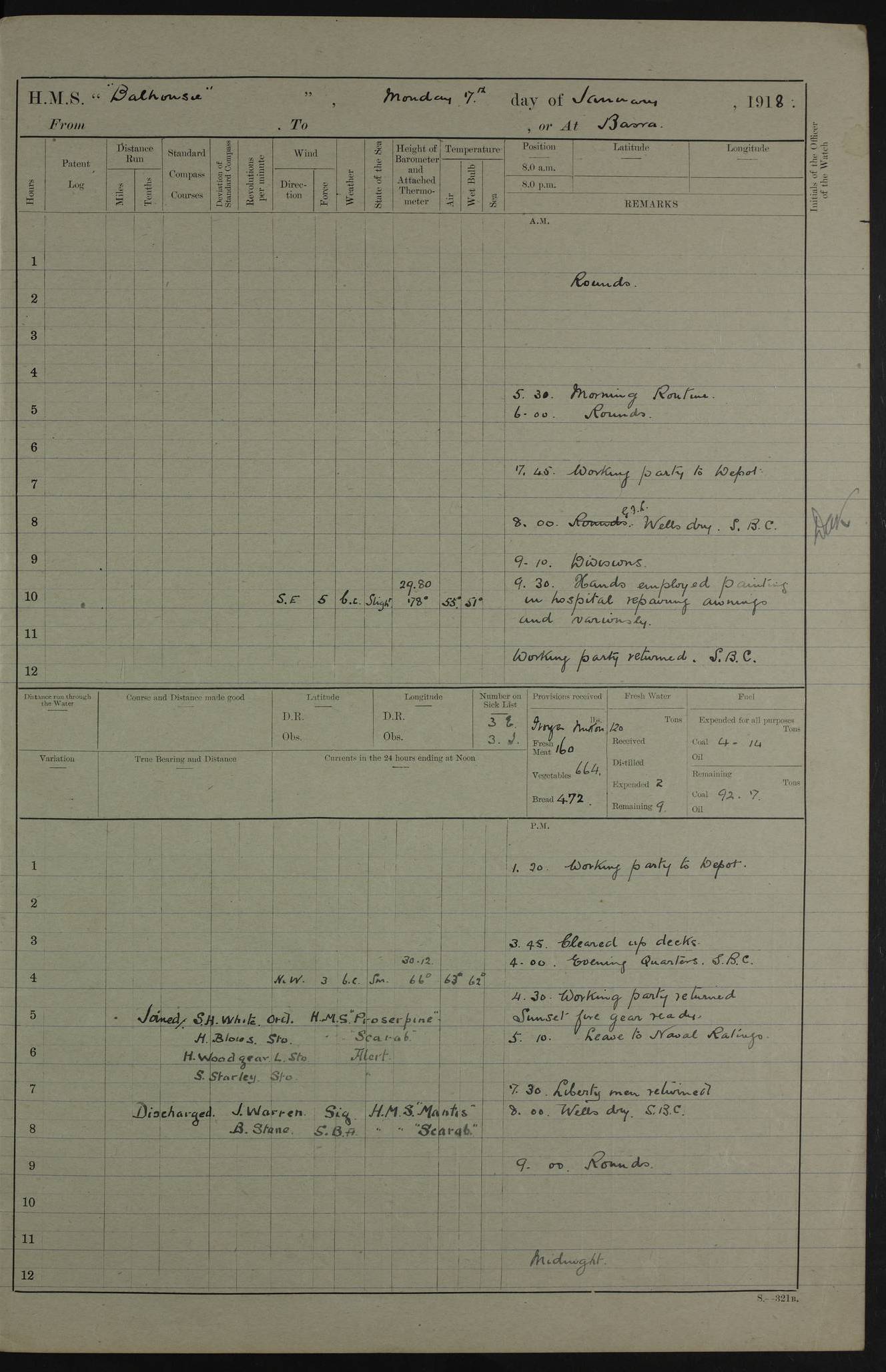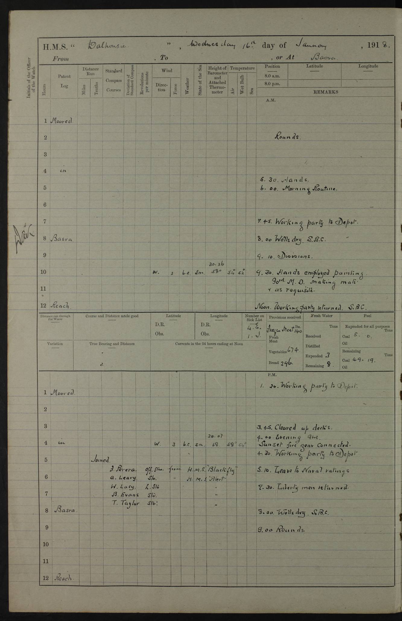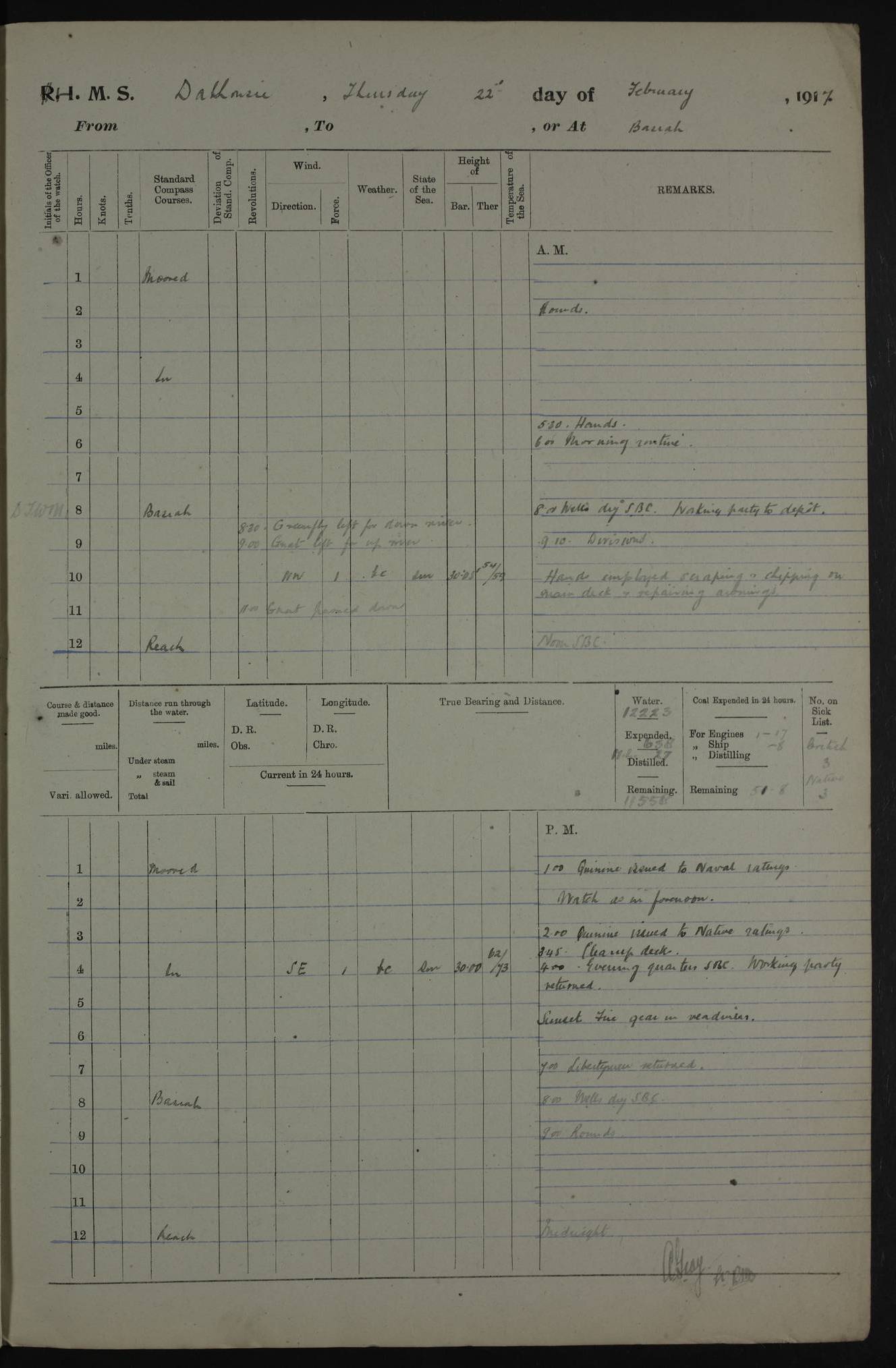AM – Discharged To EKMA: PJ O’Connor, Lieutenant Royal Navy To Passage: 2 Indian Ratings To FLYCATCHER: D Butcher, Leading Seaman 4ef4fb19e53e0a0c910059d0: (https://s3.amazonaws.com:443/oldweather/ADM53-39410/0015_0.jpg) 26 February 1918 Place: Basrah Lat 30.5269, Long 47.8407 2:00am: Rounds 5:30am: Hands 6:00am: Morning Routine 7:45am: Working party to Depot 8:00am: Wells dry - Signal Books correct 9:10am: Divisions 10:00am: Hands employed painting in cabins & as requisite 12:00pm: Signal Books correct – Working party returned 1:20pm: Working party to Depot 3:45pm: Cleared up decks 4:00pm: Evening Quarters – Signal Books correct 4:30pm: Working party returned 5:10pm: Leave to Watch 6:00pm: Sunset - Fire Gear connected 7:30pm: Liberty men returned 8:00pm: Wells dry - Signal Books correct 9:00pm: Rounds – Signal Books correct PM – Joined From TARANTULA: J Baldwin, Leading Signalman From Hospital: Louis Mones, Engineering driver PM - Discharged To MANTIS: G Munay, Leading Signalman – C Killburn, Signalman To TARANTULA: CM Leary, Telegrapher 4ef4fb19e53e0a0c910059d1: (https://s3.amazonaws.com:443/oldweather/ADM53-39410/0015_1.jpg) 27 February 1918 Place: Basrah Lat 30.5269, Long 47.8407 2:00am: Rounds 5:30am: Hands 6:00am: Morning Routine 7:45am: Working party to Depot 8:00am: Wells dry - Signal Books correct 9:10am: Divisions 10:00am: Hands employed packing surveyed stores, cleaning out boats & painting in Warrant Ratings 12:00pm: Signal Books correct – Working party returned 1:20pm: Working party to Depot 3:45pm: Cleared up decks 4:00pm: Evening Quarters – Signal Books correct 4:30pm: Working party returned 5:10pm: Leave to Watch 6:00pm: Sunset - Fire Gear connected 7:30pm: Liberty men returned 8:00pm: Wells dry - Signal Books correct 9:00pm: Rounds – Signal Books correct AM – Joined From ELEPHANTA: No. 22 Sheik Kadir Sheik Mahomed, Lascar 2nd – No. 41 Abdool Rahman Sheik Dawood, Lamp Trimmer – No. 56 Mahomed Sabia Sheik Bosman, Stoker 2nd – No. 50A Sheik Mahomed Sheik Hassan, Stoker 2nd – No. 90 Abelino Fernandez, Topass – No. 86 Avelino Leitas, Topass 4ef4fb1ae53e0a0c910059d2: (https://s3.amazonaws.com:443/oldweather/ADM53-39410/0016_0.jpg) 28 February 1918 Place: Basrah Lat 30.5269, Long 47.8407 2:00am: Rounds 5:30am: Hands 6:00am: Morning Routine 7:45am: Working party to Depot 8:00am: Wells dry - Signal Books correct 9:10am: Divisions 10:00am: Hands employed discharging stores 12:00pm: Signal Books correct – Working party returned 1:00pm: Issued Quinine to Naval Ratings - Issued Quinine to Native Ratings 1:20pm: Working party to Depot 3:45pm: Cleared up decks 4:00pm: Evening Quarters – Signal Books correct 4:30pm: Working party returned 5:10pm: Leave to Watch 6:00pm: Sunset - Fire Gear connected 7:30pm: Liberty men returned 8:00pm: Wells dry - Signal Books correct 9:00pm: Rounds – Signal Books correct PM – Joined From SAPPHIRE: WC Woolley, Petty Officer PM - Discharged To TARANTULA: L Harris, Signalman To SEDGEFLY: T Hughes, Able Seaman To MANTIS: S Redshaw, Able Seaman To Depot: R Matheison, Stoker – H Philo, Stoker TO GRAYFLY: H Stockbridge, Senior Petty Officer 4ef4fb1ae53e0a0c910059d3: (https://s3.amazonaws.com:443/oldweather/ADM53-39410/0016_1.jpg) Log Page – Blank – no data on Page 4ef4fb1ae53e0a0c910059d4: (https://s3.amazonaws.com:443/oldweather/ADM53-39410/0017_0.jpg) Log Page – Blank – no data on Page 4ef4fb1ae53e0a0c910059d5: (https://s3.amazonaws.com:443/oldweather/ADM53-39410/0017_1.jpg) Log Page – Blank 4ef4fb1ae53e0a0c910059d6: (https://s3.amazonaws.com:443/oldweather/ADM53-39410/0018_0.jpg) Log Page – Blank 4ef4fb1ae53e0a0c910059d7: (https://s3.amazonaws.com:443/oldweather/ADM53-39410/0018_1.jpg) Log Page – Blank LOGS FOR MARCH 1918 4ef4fb1be53e0a0c910059d8: (https://s3.amazonaws.com:443/oldweather/ADM53-39411/0000_0.jpg) Log Page – Cover March 1918 4ef4fb1be53e0a0c910059d9: (https://s3.amazonaws.com:443/oldweather/ADM53-39411/0000_1.jpg) Log Page – Cover – March 1918 4ef4fb1be53e0a0c910059da: (https://s3.amazonaws.com:443/oldweather/ADM53-39411/0001_0.jpg) Log Page – Blank 4ef4fb1be53e0a0c910059db: (https://s3.amazonaws.com:443/oldweather/ADM53-39411/0001_1.jpg) Log Page – Blank – no data on Page 4ef4fb1ce53e0a0c910059dc: (https://s3.amazonaws.com:443/oldweather/ADM53-39411/0002_0.jpg) Log Page – Blank – no data on Page 4ef4fb1ce53e0a0c910059dd: (https://s3.amazonaws.com:443/oldweather/ADM53-39411/0002_1.jpg) 1 March 1918 Place: Basrah Lat 30.5269, Long 47.8407 1:00am: drew from Field Chest Treasury Officer Basrah Five thousand (5,000) Rupees only 2:00am: Rounds 5:30am: Hands 6:00am: Morning Routine 7:45am: Working party to Depot 8:00am: Wells dry – Signal Books correct – CHAKLA arrived with 5 Officers & 60 Ratings 12:00pm: Signal Books correct – Working party returned 1:15pm: Working party to Depot 2:00pm: Paid Lascar Ratings 3:45pm: Cleared up decks 4:00pm: Evening Quarters 4:30pm: Working party returned 5:10pm: Leave to Watch 5:30pm: 5 Petty Officers & 57 Ratings to Bandra for Passage 6:00pm: Sunset - Fire Gear connected 7:30pm: Liberty men returned 9:00pm: Rounds – Petty Officers returned AM – Joined From CHALKA: Hawkins, Paymaster Royal Navy PM - Discharged To FLYCATCHER: Dennis, Sub Lieutenant Royal Navy Volunteer Reserve To TARANTULA: L Harris, Signalman To SEDGEFLY: TG Hughes, Able Seaman To MANTIS: S Redshaw, Able Seaman To Depot: R Mathieson, Stoker To GRAYFLY: H Stockbridge, Senior Petty Officer 4ef4fb1ce53e0a0c910059de: (https://s3.amazonaws.com:443/oldweather/ADM53-39411/0003_0.jpg) 2 March 1918 Place: Basrah Lat 30.5269, Long 47.8407 2:00am: Rounds 5:30am: Hands 6:00am: Morning Routine 7:00am: Exercised Fire Stations 7:45am: Working party to Depot 8:00am: Wells dry - Signal Books correct 9:10am: Divisions 10:00am: Hands employed as requisite 12:00pm: Working party returned 1:15pm: Working party to Depot 3:45pm: Cleared up decks 4:00pm: Evening Quarters – Signal Books corr
