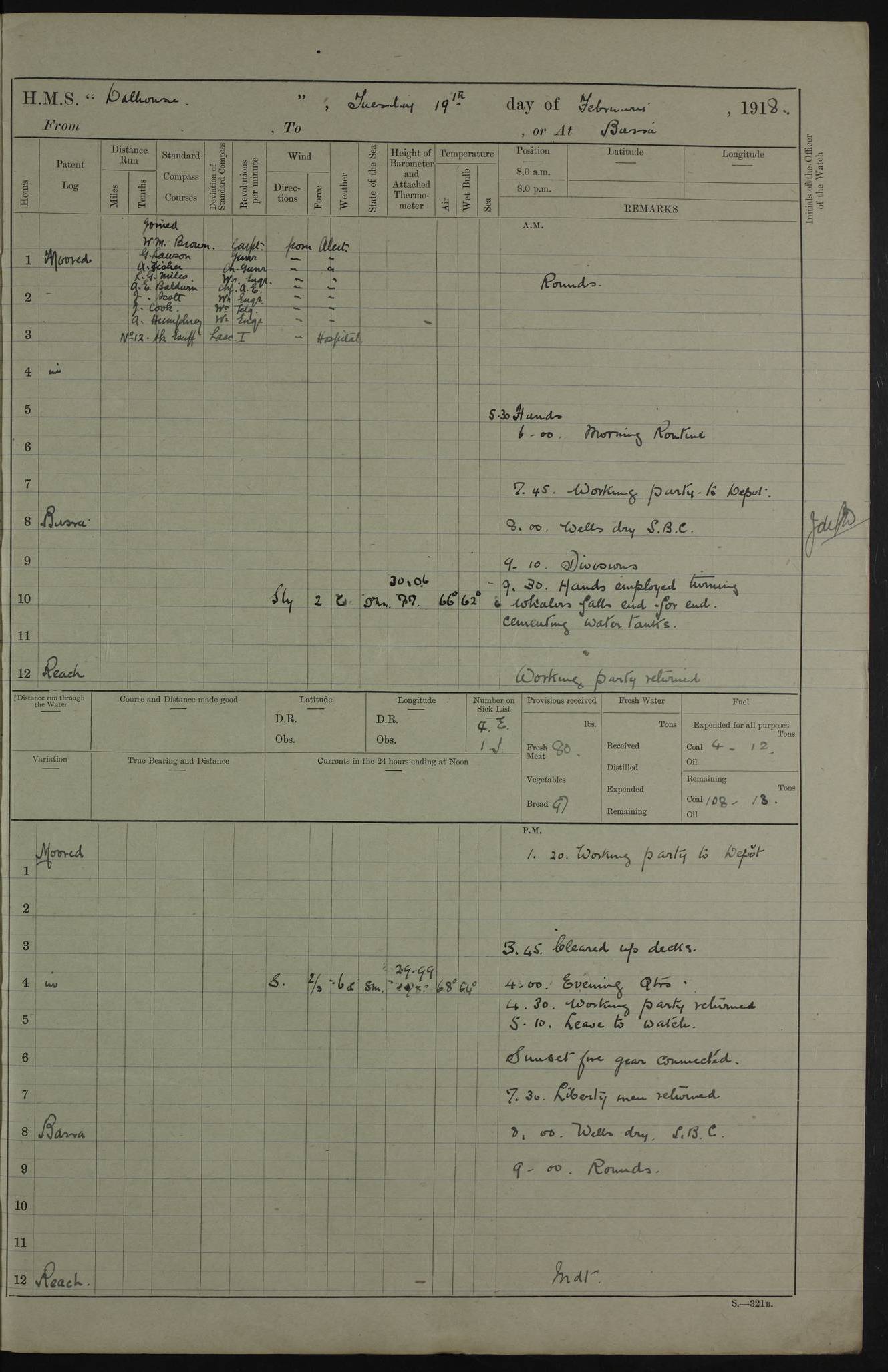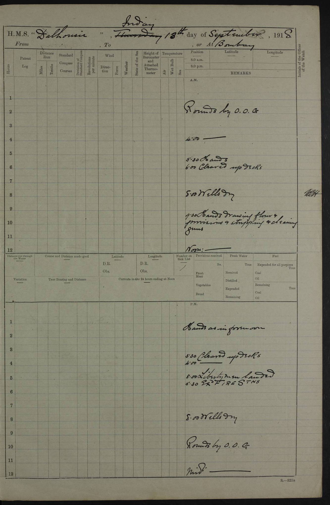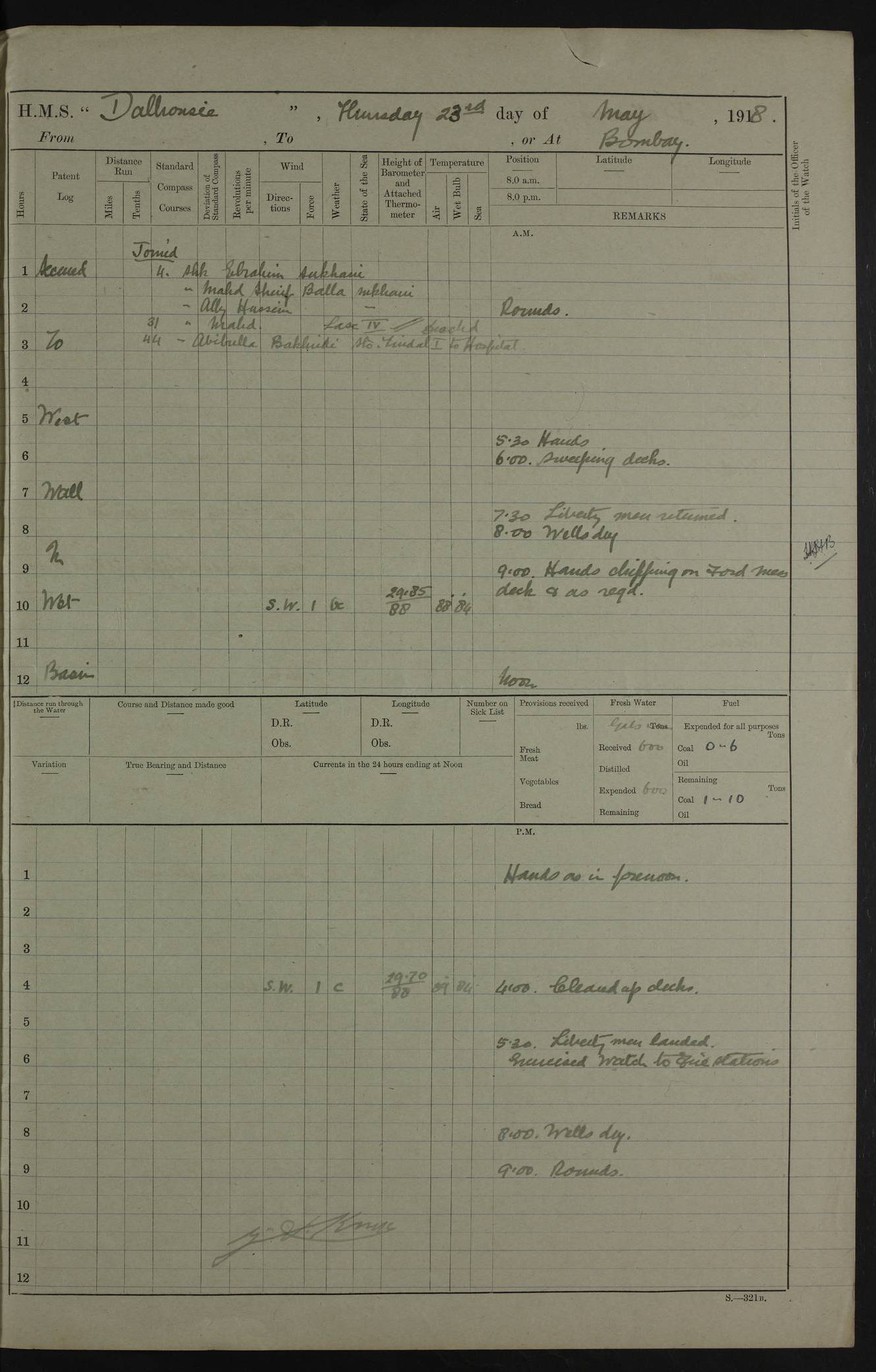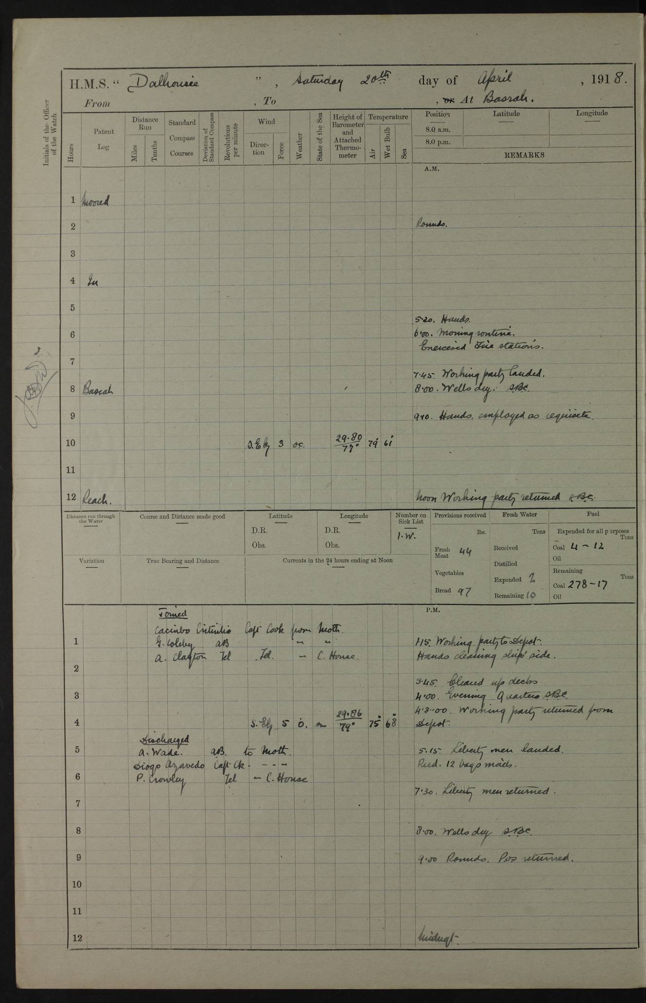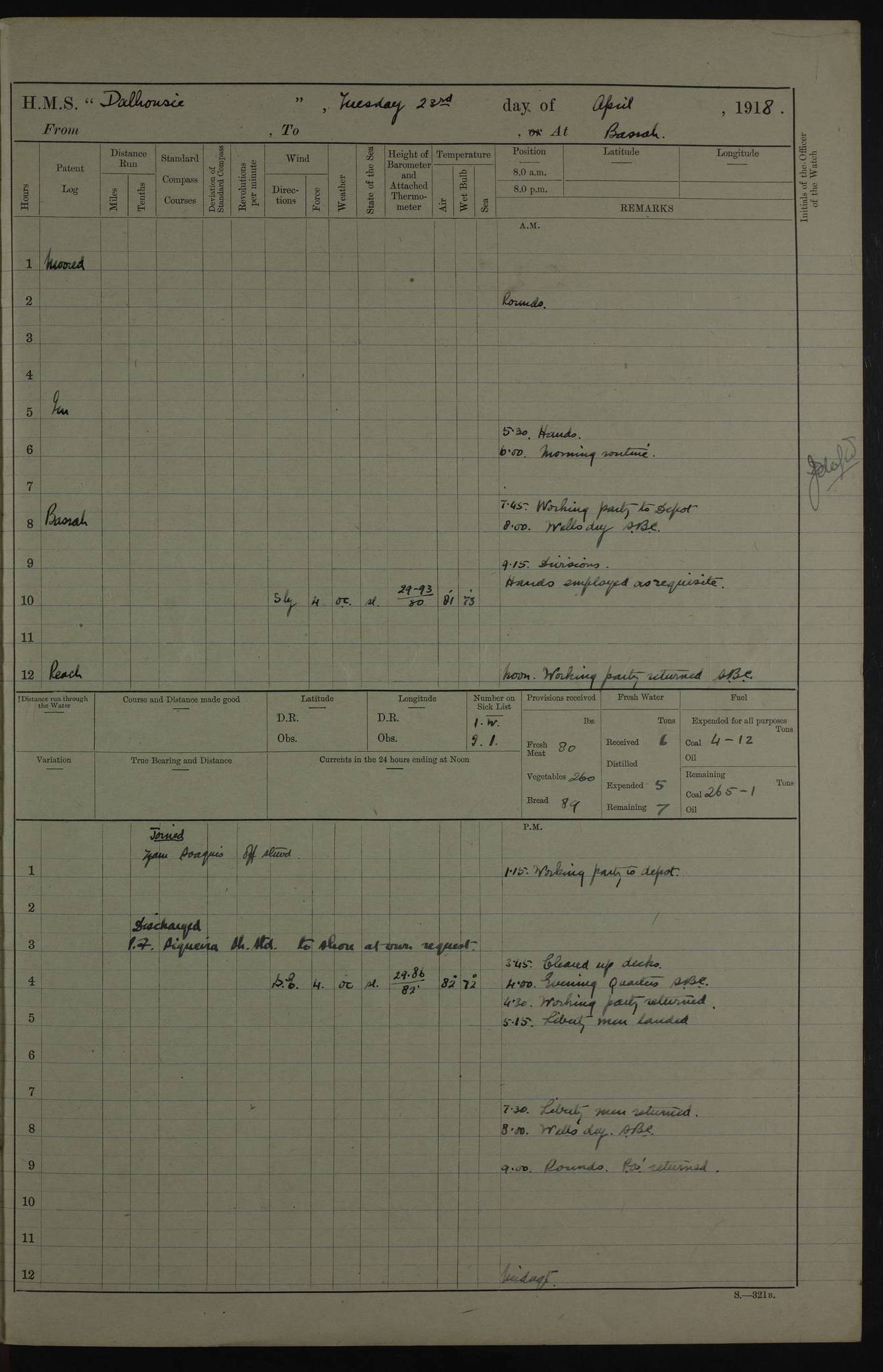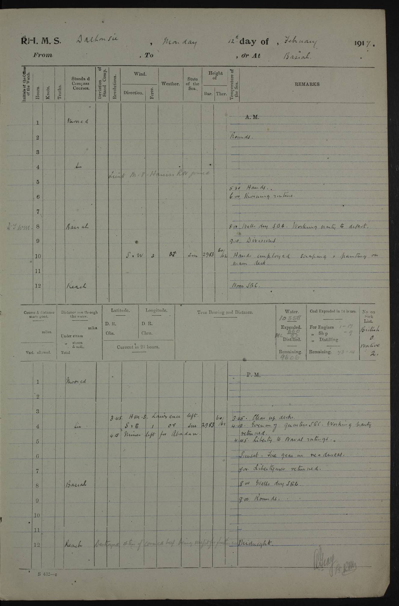 AM – Discharged To EKMA: PJ O’Connor, Lieutenant Royal Navy To Passage: 2 Indian Ratings To FLYCATCHER: D Butcher, Leading Seaman 4ef4fb19e53e0a0c910059d0: (https://s3.amazonaws.com:443/oldweather/ADM53-39410/0015_0.jpg) 26 February 1918 Place: Basrah Lat 30.5269, Long 47.8407 2:00am: Rounds 5:30am: Hands 6:00am: Morning Routine 7:45am: Working party to Depot 8:00am: Wells dry - Signal Books correct 9:10am: Divisions 10:00am: Hands employed painting in cabins & as requisite 12:00pm: Signal Books correct – Working party returned 1:20pm: Working party to Depot 3:45pm: Cleared up decks 4:00pm: Evening Quarters – Signal Books correct 4:30pm: Working party returned 5:10pm: Leave to Watch 6:00pm: Sunset - Fire Gear connected 7:30pm: Liberty men returned 8:00pm: Wells dry - Signal Books correct 9:00pm: Rounds – Signal Books correct PM – Joined From TARANTULA: J Baldwin, Leading Signalman From Hospital: Louis Mones, Engineering driver PM - Discharged To MANTIS: G Munay, Leading Signalman – C Killburn, Signalman To TARANTULA: CM Leary, Telegrapher 4ef4fb19e53e0a0c910059d1: (https://s3.amazonaws.com:443/oldweather/ADM53-39410/0015_1.jpg) 27 February 1918 Place: Basrah Lat 30.5269, Long 47.8407 2:00am: Rounds 5:30am: Hands 6:00am: Morning Routine 7:45am: Working party to Depot 8:00am: Wells dry - Signal Books correct 9:10am: Divisions 10:00am: Hands employed packing surveyed stores, cleaning out boats & painting in Warrant Ratings 12:00pm: Signal Books correct – Working party returned 1:20pm: Working party to Depot 3:45pm: Cleared up decks 4:00pm: Evening Quarters – Signal Books correct 4:30pm: Working party returned 5:10pm: Leave to Watch 6:00pm: Sunset - Fire Gear connected 7:30pm: Liberty men returned 8:00pm: Wells dry - Signal Books correct 9:00pm: Rounds – Signal Books correct AM – Joined From ELEPHANTA: No. 22 Sheik Kadir Sheik Mahomed, Lascar 2nd – No. 41 Abdool Rahman Sheik Dawood, Lamp Trimmer – No. 56 Mahomed Sabia Sheik Bosman, Stoker 2nd – No. 50A Sheik Mahomed Sheik Hassan, Stoker 2nd – No. 90 Abelino Fernandez, Topass – No. 86 Avelino Leitas, Topass 4ef4fb1ae53e0a0c910059d2: (https://s3.amazonaws.com:443/oldweather/ADM53-39410/0016_0.jpg) 28 February 1918 Place: Basrah Lat 30.5269, Long 47.8407 2:00am: Rounds 5:30am: Hands 6:00am: Morning Routine 7:45am: Working party to Depot 8:00am: Wells dry - Signal Books correct 9:10am: Divisions 10:00am: Hands employed discharging stores 12:00pm: Signal Books correct – Working party returned 1:00pm: Issued Quinine to Naval Ratings - Issued Quinine to Native Ratings 1:20pm: Working party to Depot 3:45pm: Cleared up decks 4:00pm: Evening Quarters – Signal Books correct 4:30pm: Working party returned 5:10pm: Leave to Watch 6:00pm: Sunset - Fire Gear connected 7:30pm: Liberty men returned 8:00pm: Wells dry - Signal Books correct 9:00pm: Rounds – Signal Books correct PM – Joined From SAPPHIRE: WC Woolley, Petty Officer PM - Discharged To TARANTULA: L Harris, Signalman To SEDGEFLY: T Hughes, Able Seaman To MANTIS: S Redshaw, Able Seaman To Depot: R Matheison, Stoker – H Philo, Stoker TO GRAYFLY: H Stockbridge, Senior Petty Officer 4ef4fb1ae53e0a0c910059d3: (https://s3.amazonaws.com:443/oldweather/ADM53-39410/0016_1.jpg) Log Page – Blank – no data on Page 4ef4fb1ae53e0a0c910059d4: (https://s3.amazonaws.com:443/oldweather/ADM53-39410/0017_0.jpg) Log Page – Blank – no data on Page 4ef4fb1ae53e0a0c910059d5: (https://s3.amazonaws.com:443/oldweather/ADM53-39410/0017_1.jpg) Log Page – Blank 4ef4fb1ae53e0a0c910059d6: (https://s3.amazonaws.com:443/oldweather/ADM53-39410/0018_0.jpg) Log Page – Blank 4ef4fb1ae53e0a0c910059d7: (https://s3.amazonaws.com:443/oldweather/ADM53-39410/0018_1.jpg) Log Page – Blank LOGS FOR MARCH 1918 4ef4fb1be53e0a0c910059d8: (https://s3.amazonaws.com:443/oldweather/ADM53-39411/0000_0.jpg) Log Page – Cover March 1918 4ef4fb1be53e0a0c910059d9: (https://s3.amazonaws.com:443/oldweather/ADM53-39411/0000_1.jpg) Log Page – Cover – March 1918 4ef4fb1be53e0a0c910059da: (https://s3.amazonaws.com:443/oldweather/ADM53-39411/0001_0.jpg) Log Page – Blank 4ef4fb1be53e0a0c910059db: (https://s3.amazonaws.com:443/oldweather/ADM53-39411/0001_1.jpg) Log Page – Blank – no data on Page 4ef4fb1ce53e0a0c910059dc: (https://s3.amazonaws.com:443/oldweather/ADM53-39411/0002_0.jpg) Log Page – Blank – no data on Page 4ef4fb1ce53e0a0c910059dd: (https://s3.amazonaws.com:443/oldweather/ADM53-39411/0002_1.jpg) 1 March 1918 Place: Basrah Lat 30.5269, Long 47.8407 1:00am: drew from Field Chest Treasury Officer Basrah Five thousand (5,000) Rupees only 2:00am: Rounds 5:30am: Hands 6:00am: Morning Routine 7:45am: Working party to Depot 8:00am: Wells dry – Signal Books correct – CHAKLA arrived with 5 Officers & 60 Ratings 12:00pm: Signal Books correct – Working party returned 1:15pm: Working party to Depot 2:00pm: Paid Lascar Ratings 3:45pm: Cleared up decks 4:00pm: Evening Quarters 4:30pm: Working party returned 5:10pm: Leave to Watch 5:30pm: 5 Petty Officers & 57 Ratings to Bandra for Passage 6:00pm: Sunset - Fire Gear connected 7:30pm: Liberty men returned 9:00pm: Rounds – Petty Officers returned AM – Joined From CHALKA: Hawkins, Paymaster Royal Navy PM - Discharged To FLYCATCHER: Dennis, Sub Lieutenant Royal Navy Volunteer Reserve To TARANTULA: L Harris, Signalman To SEDGEFLY: TG Hughes, Able Seaman To MANTIS: S Redshaw, Able Seaman To Depot: R Mathieson, Stoker To GRAYFLY: H Stockbridge, Senior Petty Officer 4ef4fb1ce53e0a0c910059de: (https://s3.amazonaws.com:443/oldweather/ADM53-39411/0003_0.jpg) 2 March 1918 Place: Basrah Lat 30.5269, Long 47.8407 2:00am: Rounds 5:30am: Hands 6:00am: Morning Routine 7:00am: Exercised Fire Stations 7:45am: Working party to Depot 8:00am: Wells dry - Signal Books correct 9:10am: Divisions 10:00am: Hands employed as requisite 12:00pm: Working party returned 1:15pm: Working party to Depot 3:45pm: Cleared up decks 4:00pm: Evening Quarters – Signal Books corr