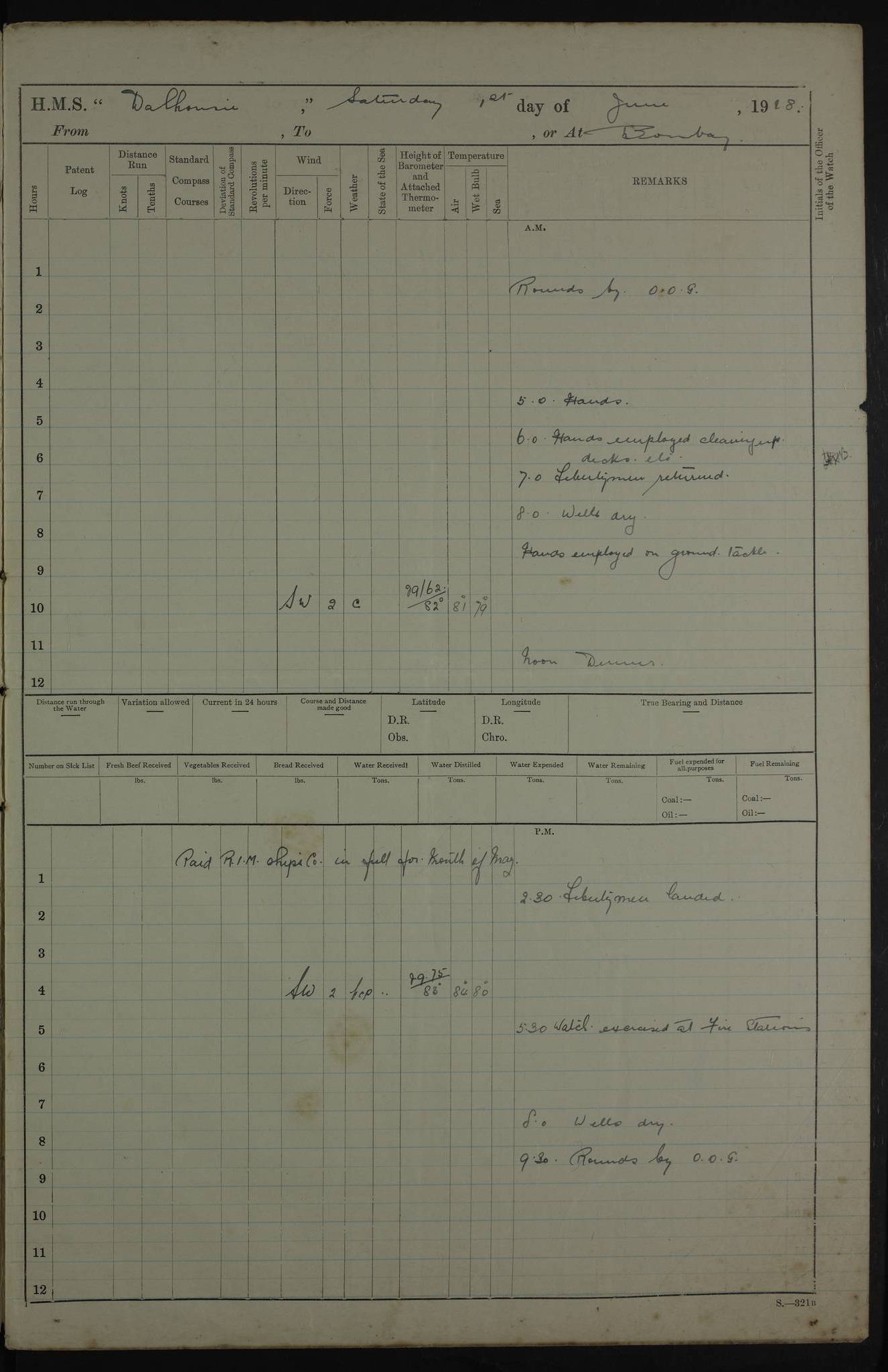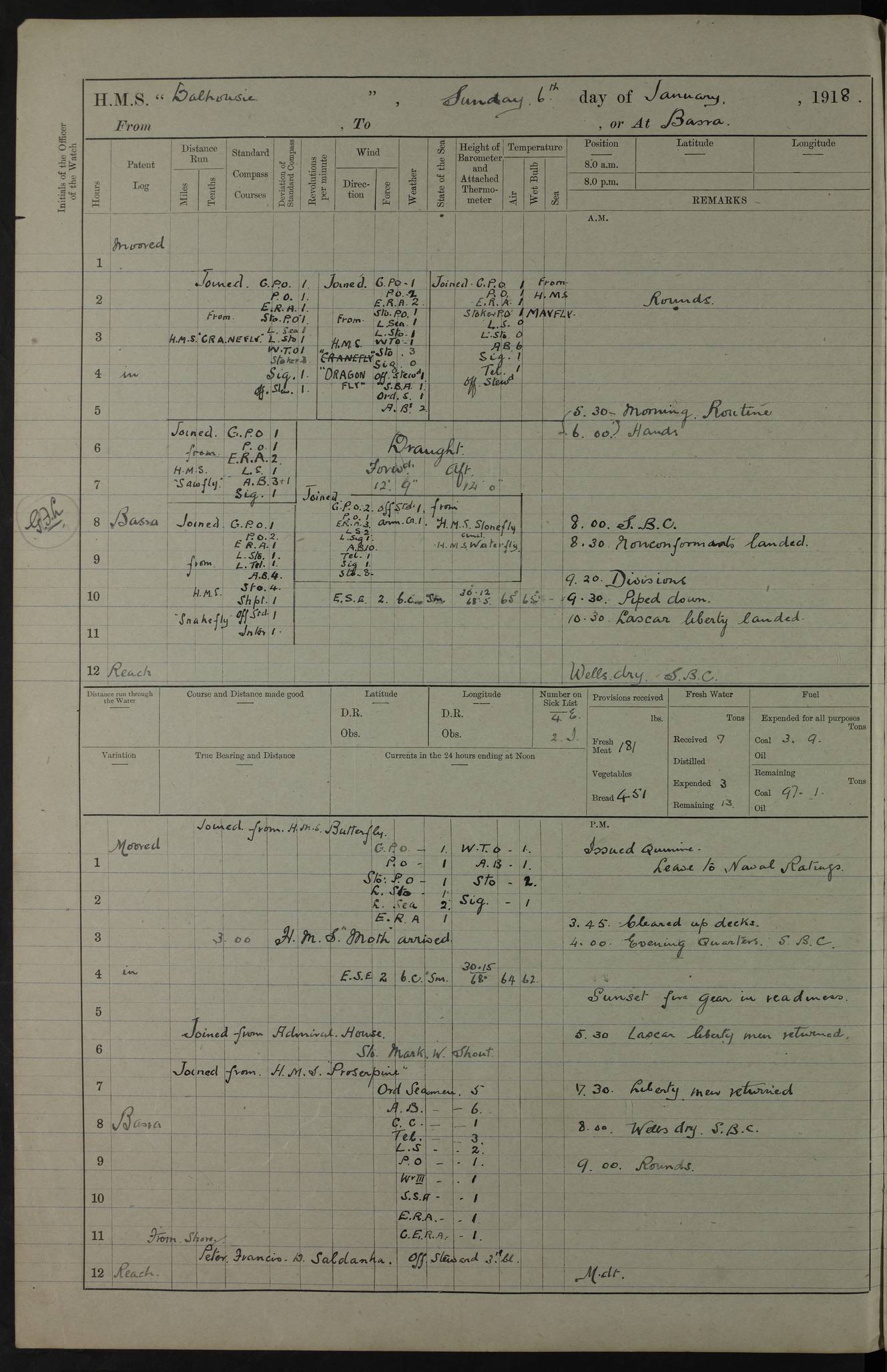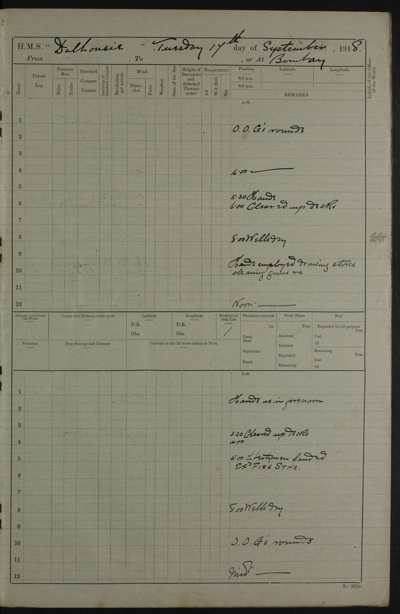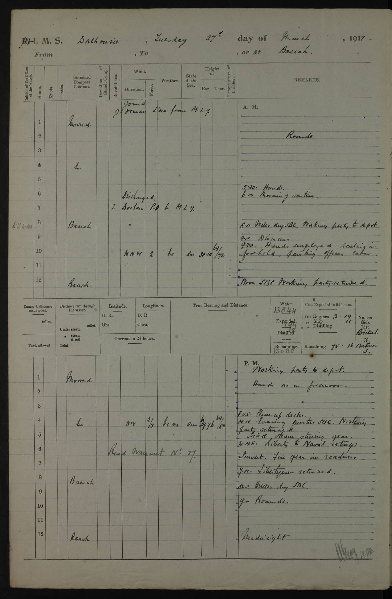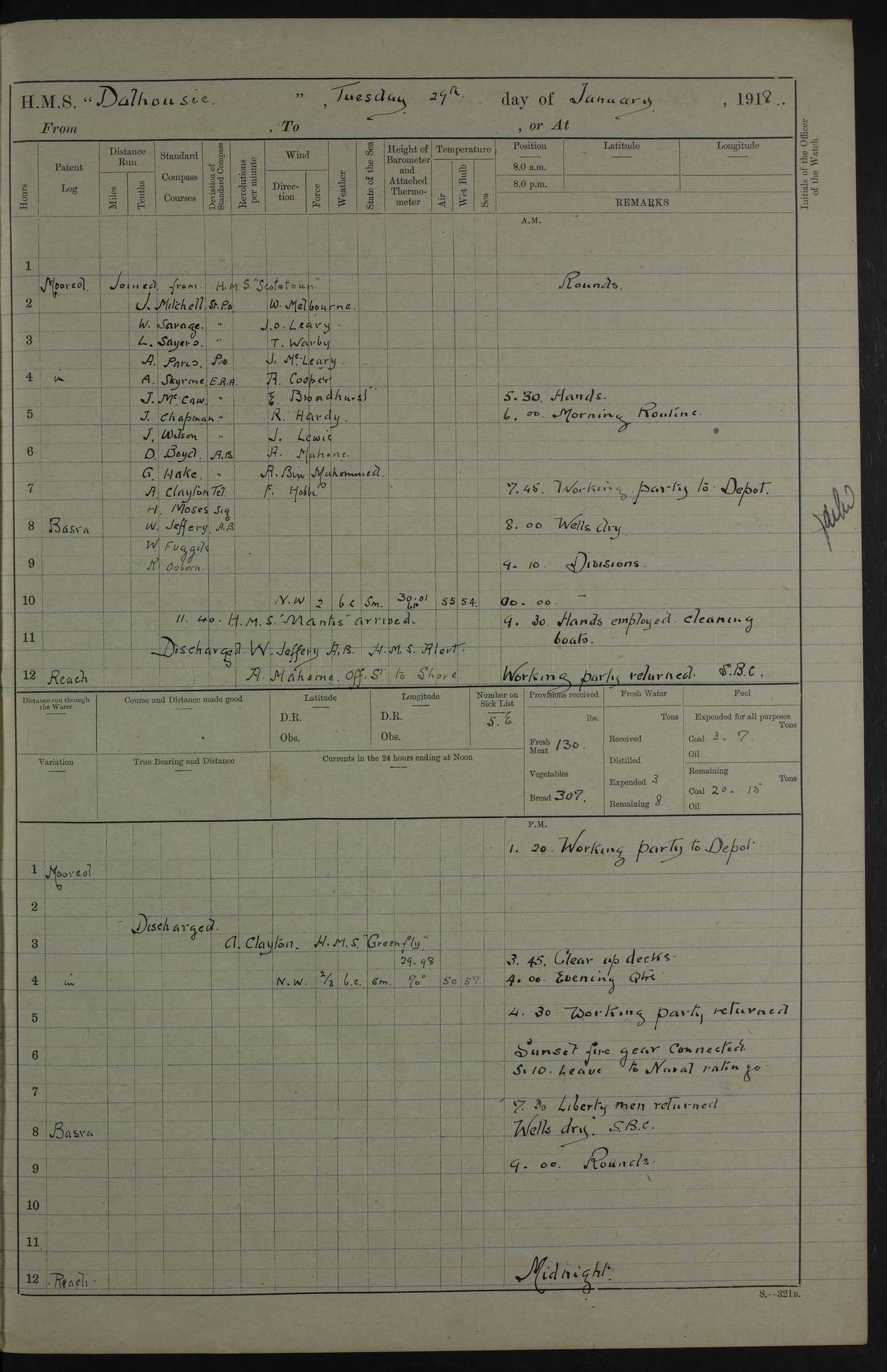 AM – Discharged To EKMA: PJ O’Connor, Lieutenant Royal Navy To Passage: 2 Indian Ratings To FLYCATCHER: D Butcher, Leading Seaman 4ef4fb19e53e0a0c910059d0: (https://s3.amazonaws.com:443/oldweather/ADM53-39410/0015_0.jpg) 26 February 1918 Place: Basrah Lat 30.5269, Long 47.8407 2:00am: Rounds 5:30am: Hands 6:00am: Morning Routine 7:45am: Working party to Depot 8:00am: Wells dry - Signal Books correct 9:10am: Divisions 10:00am: Hands employed painting in cabins & as requisite 12:00pm: Signal Books correct – Working party returned 1:20pm: Working party to Depot 3:45pm: Cleared up decks 4:00pm: Evening Quarters – Signal Books correct 4:30pm: Working party returned 5:10pm: Leave to Watch 6:00pm: Sunset - Fire Gear connected 7:30pm: Liberty men returned 8:00pm: Wells dry - Signal Books correct 9:00pm: Rounds – Signal Books correct PM – Joined From TARANTULA: J Baldwin, Leading Signalman From Hospital: Louis Mones, Engineering driver PM - Discharged To MANTIS: G Munay, Leading Signalman – C Killburn, Signalman To TARANTULA: CM Leary, Telegrapher 4ef4fb19e53e0a0c910059d1: (https://s3.amazonaws.com:443/oldweather/ADM53-39410/0015_1.jpg) 27 February 1918 Place: Basrah Lat 30.5269, Long 47.8407 2:00am: Rounds 5:30am: Hands 6:00am: Morning Routine 7:45am: Working party to Depot 8:00am: Wells dry - Signal Books correct 9:10am: Divisions 10:00am: Hands employed packing surveyed stores, cleaning out boats & painting in Warrant Ratings 12:00pm: Signal Books correct – Working party returned 1:20pm: Working party to Depot 3:45pm: Cleared up decks 4:00pm: Evening Quarters – Signal Books correct 4:30pm: Working party returned 5:10pm: Leave to Watch 6:00pm: Sunset - Fire Gear connected 7:30pm: Liberty men returned 8:00pm: Wells dry - Signal Books correct 9:00pm: Rounds – Signal Books correct AM – Joined From ELEPHANTA: No. 22 Sheik Kadir Sheik Mahomed, Lascar 2nd – No. 41 Abdool Rahman Sheik Dawood, Lamp Trimmer – No. 56 Mahomed Sabia Sheik Bosman, Stoker 2nd – No. 50A Sheik Mahomed Sheik Hassan, Stoker 2nd – No. 90 Abelino Fernandez, Topass – No. 86 Avelino Leitas, Topass 4ef4fb1ae53e0a0c910059d2: (https://s3.amazonaws.com:443/oldweather/ADM53-39410/0016_0.jpg) 28 February 1918 Place: Basrah Lat 30.5269, Long 47.8407 2:00am: Rounds 5:30am: Hands 6:00am: Morning Routine 7:45am: Working party to Depot 8:00am: Wells dry - Signal Books correct 9:10am: Divisions 10:00am: Hands employed discharging stores 12:00pm: Signal Books correct – Working party returned 1:00pm: Issued Quinine to Naval Ratings - Issued Quinine to Native Ratings 1:20pm: Working party to Depot 3:45pm: Cleared up decks 4:00pm: Evening Quarters – Signal Books correct 4:30pm: Working party returned 5:10pm: Leave to Watch 6:00pm: Sunset - Fire Gear connected 7:30pm: Liberty men returned 8:00pm: Wells dry - Signal Books correct 9:00pm: Rounds – Signal Books correct PM – Joined From SAPPHIRE: WC Woolley, Petty Officer PM - Discharged To TARANTULA: L Harris, Signalman To SEDGEFLY: T Hughes, Able Seaman To MANTIS: S Redshaw, Able Seaman To Depot: R Matheison, Stoker – H Philo, Stoker TO GRAYFLY: H Stockbridge, Senior Petty Officer 4ef4fb1ae53e0a0c910059d3: (https://s3.amazonaws.com:443/oldweather/ADM53-39410/0016_1.jpg) Log Page – Blank – no data on Page 4ef4fb1ae53e0a0c910059d4: (https://s3.amazonaws.com:443/oldweather/ADM53-39410/0017_0.jpg) Log Page – Blank – no data on Page 4ef4fb1ae53e0a0c910059d5: (https://s3.amazonaws.com:443/oldweather/ADM53-39410/0017_1.jpg) Log Page – Blank 4ef4fb1ae53e0a0c910059d6: (https://s3.amazonaws.com:443/oldweather/ADM53-39410/0018_0.jpg) Log Page – Blank 4ef4fb1ae53e0a0c910059d7: (https://s3.amazonaws.com:443/oldweather/ADM53-39410/0018_1.jpg) Log Page – Blank LOGS FOR MARCH 1918 4ef4fb1be53e0a0c910059d8: (https://s3.amazonaws.com:443/oldweather/ADM53-39411/0000_0.jpg) Log Page – Cover March 1918 4ef4fb1be53e0a0c910059d9: (https://s3.amazonaws.com:443/oldweather/ADM53-39411/0000_1.jpg) Log Page – Cover – March 1918 4ef4fb1be53e0a0c910059da: (https://s3.amazonaws.com:443/oldweather/ADM53-39411/0001_0.jpg) Log Page – Blank 4ef4fb1be53e0a0c910059db: (https://s3.amazonaws.com:443/oldweather/ADM53-39411/0001_1.jpg) Log Page – Blank – no data on Page 4ef4fb1ce53e0a0c910059dc: (https://s3.amazonaws.com:443/oldweather/ADM53-39411/0002_0.jpg) Log Page – Blank – no data on Page 4ef4fb1ce53e0a0c910059dd: (https://s3.amazonaws.com:443/oldweather/ADM53-39411/0002_1.jpg) 1 March 1918 Place: Basrah Lat 30.5269, Long 47.8407 1:00am: drew from Field Chest Treasury Officer Basrah Five thousand (5,000) Rupees only 2:00am: Rounds 5:30am: Hands 6:00am: Morning Routine 7:45am: Working party to Depot 8:00am: Wells dry – Signal Books correct – CHAKLA arrived with 5 Officers & 60 Ratings 12:00pm: Signal Books correct – Working party returned 1:15pm: Working party to Depot 2:00pm: Paid Lascar Ratings 3:45pm: Cleared up decks 4:00pm: Evening Quarters 4:30pm: Working party returned 5:10pm: Leave to Watch 5:30pm: 5 Petty Officers & 57 Ratings to Bandra for Passage 6:00pm: Sunset - Fire Gear connected 7:30pm: Liberty men returned 9:00pm: Rounds – Petty Officers returned AM – Joined From CHALKA: Hawkins, Paymaster Royal Navy PM - Discharged To FLYCATCHER: Dennis, Sub Lieutenant Royal Navy Volunteer Reserve To TARANTULA: L Harris, Signalman To SEDGEFLY: TG Hughes, Able Seaman To MANTIS: S Redshaw, Able Seaman To Depot: R Mathieson, Stoker To GRAYFLY: H Stockbridge, Senior Petty Officer 4ef4fb1ce53e0a0c910059de: (https://s3.amazonaws.com:443/oldweather/ADM53-39411/0003_0.jpg) 2 March 1918 Place: Basrah Lat 30.5269, Long 47.8407 2:00am: Rounds 5:30am: Hands 6:00am: Morning Routine 7:00am: Exercised Fire Stations 7:45am: Working party to Depot 8:00am: Wells dry - Signal Books correct 9:10am: Divisions 10:00am: Hands employed as requisite 12:00pm: Working party returned 1:15pm: Working party to Depot 3:45pm: Cleared up decks 4:00pm: Evening Quarters – Signal Books corr