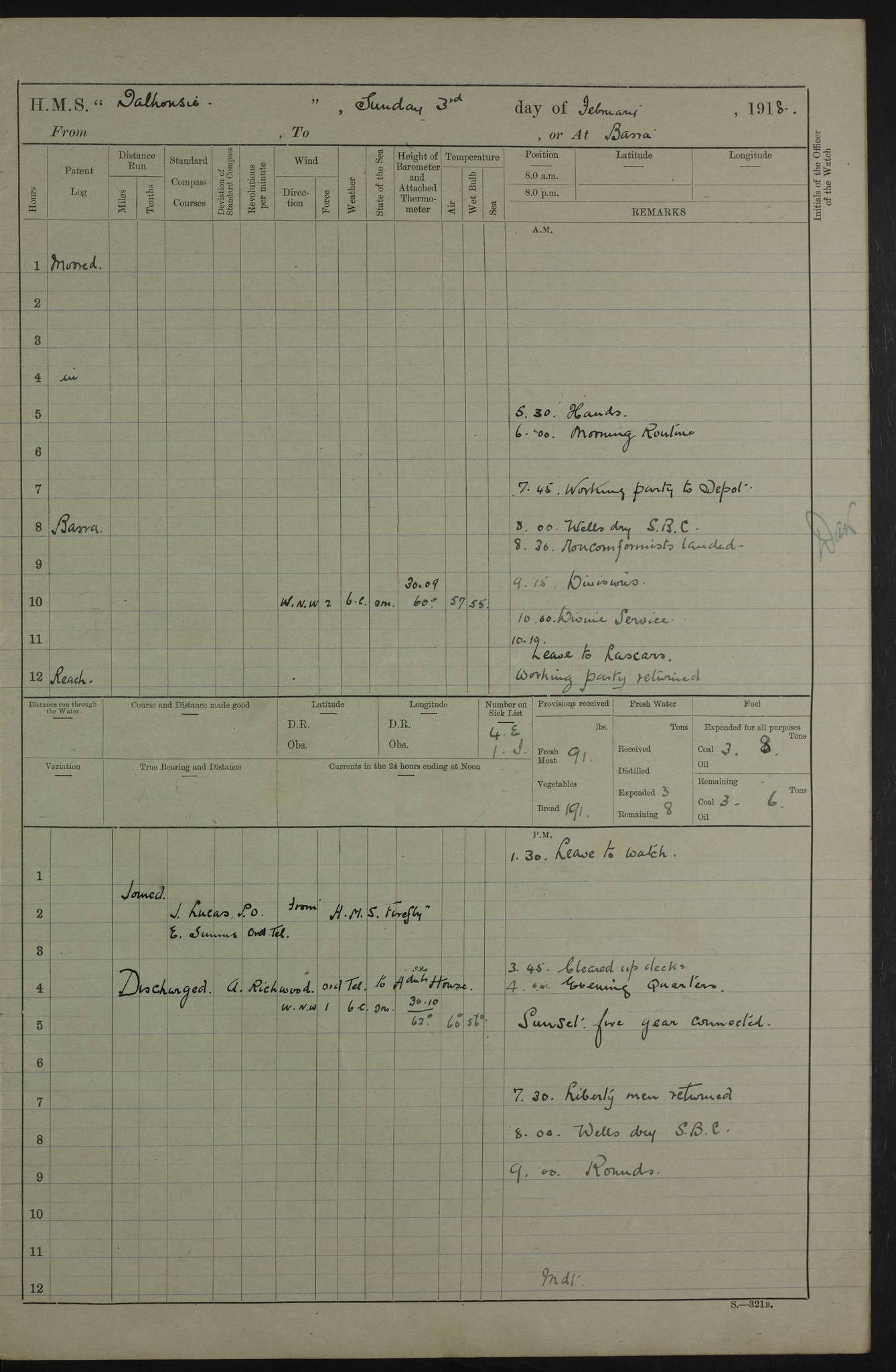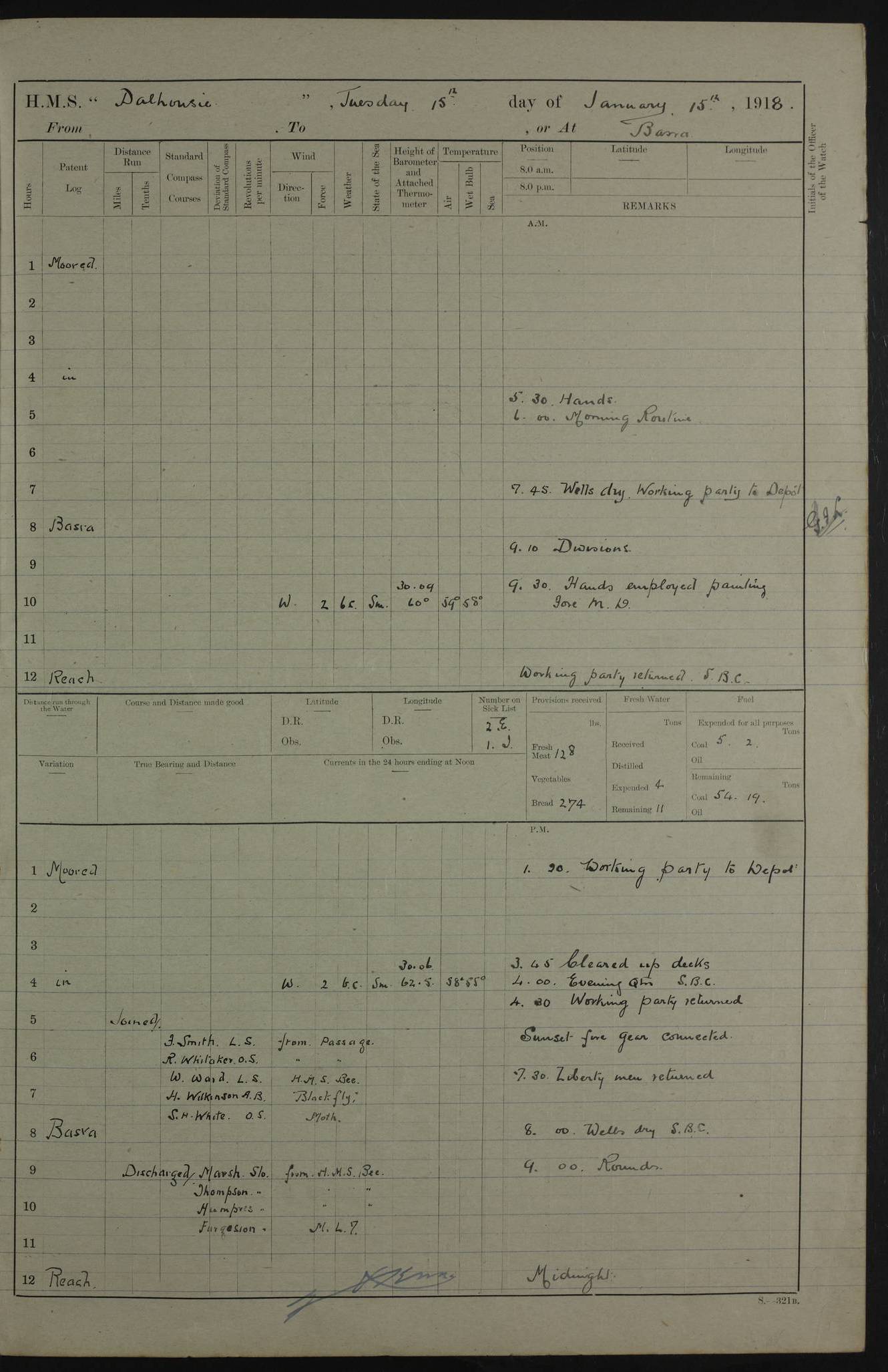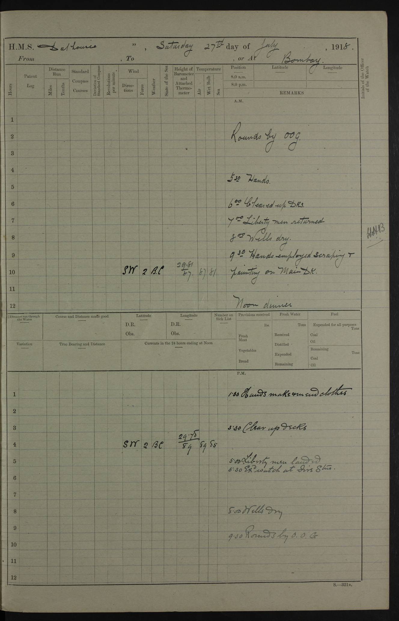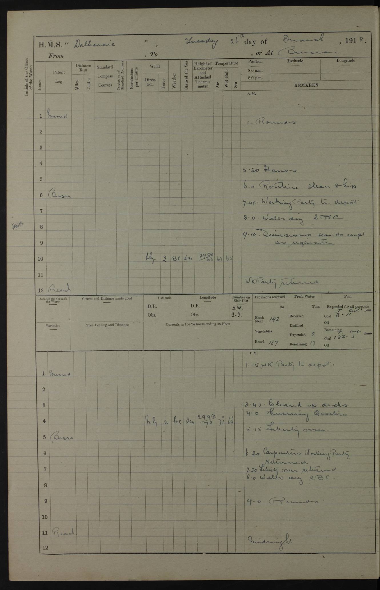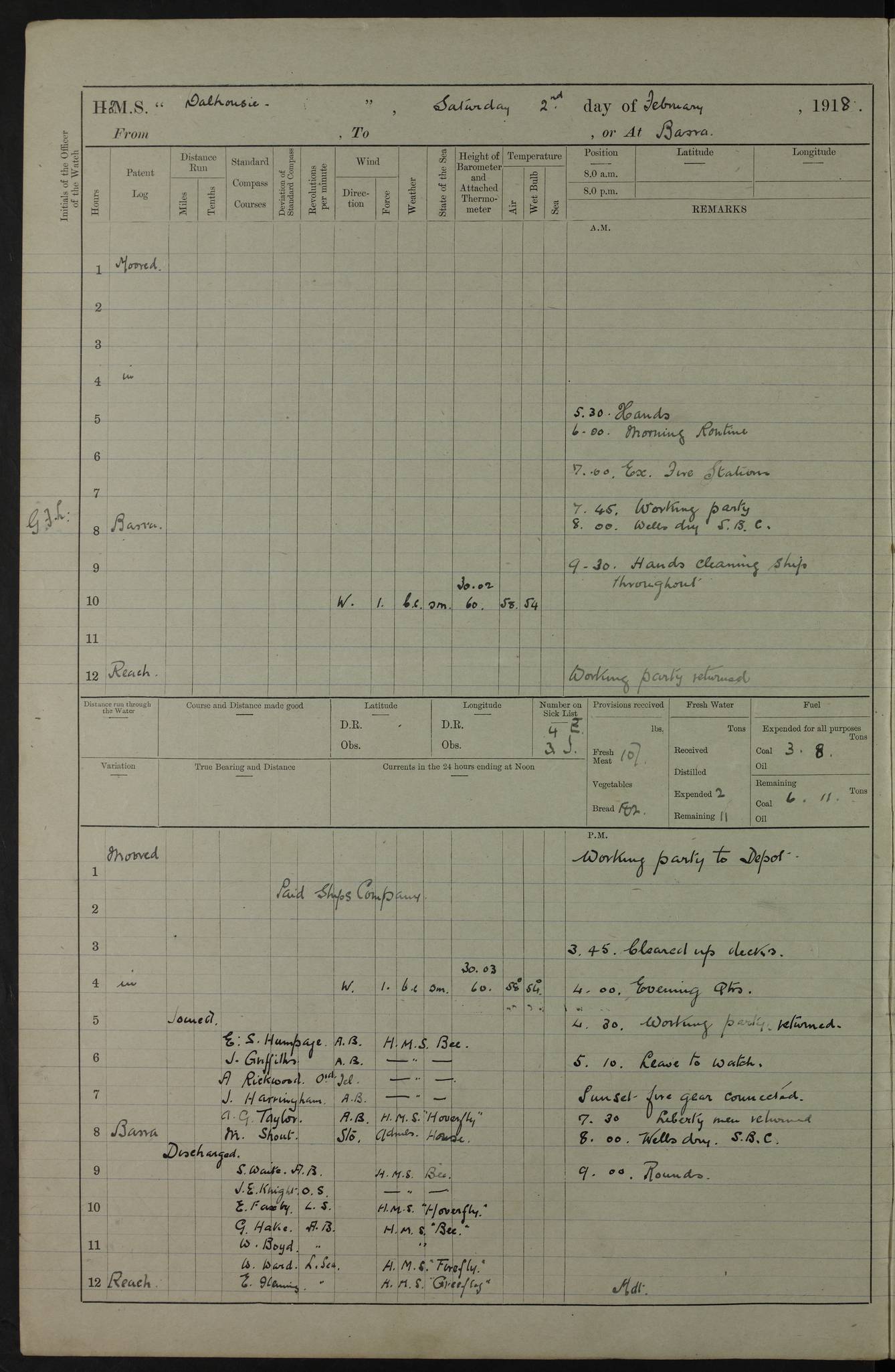 AM – Discharged To EKMA: PJ O’Connor, Lieutenant Royal Navy To Passage: 2 Indian Ratings To FLYCATCHER: D Butcher, Leading Seaman 4ef4fb19e53e0a0c910059d0: (https://s3.amazonaws.com:443/oldweather/ADM53-39410/0015_0.jpg) 26 February 1918 Place: Basrah Lat 30.5269, Long 47.8407 2:00am: Rounds 5:30am: Hands 6:00am: Morning Routine 7:45am: Working party to Depot 8:00am: Wells dry - Signal Books correct 9:10am: Divisions 10:00am: Hands employed painting in cabins & as requisite 12:00pm: Signal Books correct – Working party returned 1:20pm: Working party to Depot 3:45pm: Cleared up decks 4:00pm: Evening Quarters – Signal Books correct 4:30pm: Working party returned 5:10pm: Leave to Watch 6:00pm: Sunset - Fire Gear connected 7:30pm: Liberty men returned 8:00pm: Wells dry - Signal Books correct 9:00pm: Rounds – Signal Books correct PM – Joined From TARANTULA: J Baldwin, Leading Signalman From Hospital: Louis Mones, Engineering driver PM - Discharged To MANTIS: G Munay, Leading Signalman – C Killburn, Signalman To TARANTULA: CM Leary, Telegrapher 4ef4fb19e53e0a0c910059d1: (https://s3.amazonaws.com:443/oldweather/ADM53-39410/0015_1.jpg) 27 February 1918 Place: Basrah Lat 30.5269, Long 47.8407 2:00am: Rounds 5:30am: Hands 6:00am: Morning Routine 7:45am: Working party to Depot 8:00am: Wells dry - Signal Books correct 9:10am: Divisions 10:00am: Hands employed packing surveyed stores, cleaning out boats & painting in Warrant Ratings 12:00pm: Signal Books correct – Working party returned 1:20pm: Working party to Depot 3:45pm: Cleared up decks 4:00pm: Evening Quarters – Signal Books correct 4:30pm: Working party returned 5:10pm: Leave to Watch 6:00pm: Sunset - Fire Gear connected 7:30pm: Liberty men returned 8:00pm: Wells dry - Signal Books correct 9:00pm: Rounds – Signal Books correct AM – Joined From ELEPHANTA: No. 22 Sheik Kadir Sheik Mahomed, Lascar 2nd – No. 41 Abdool Rahman Sheik Dawood, Lamp Trimmer – No. 56 Mahomed Sabia Sheik Bosman, Stoker 2nd – No. 50A Sheik Mahomed Sheik Hassan, Stoker 2nd – No. 90 Abelino Fernandez, Topass – No. 86 Avelino Leitas, Topass 4ef4fb1ae53e0a0c910059d2: (https://s3.amazonaws.com:443/oldweather/ADM53-39410/0016_0.jpg) 28 February 1918 Place: Basrah Lat 30.5269, Long 47.8407 2:00am: Rounds 5:30am: Hands 6:00am: Morning Routine 7:45am: Working party to Depot 8:00am: Wells dry - Signal Books correct 9:10am: Divisions 10:00am: Hands employed discharging stores 12:00pm: Signal Books correct – Working party returned 1:00pm: Issued Quinine to Naval Ratings - Issued Quinine to Native Ratings 1:20pm: Working party to Depot 3:45pm: Cleared up decks 4:00pm: Evening Quarters – Signal Books correct 4:30pm: Working party returned 5:10pm: Leave to Watch 6:00pm: Sunset - Fire Gear connected 7:30pm: Liberty men returned 8:00pm: Wells dry - Signal Books correct 9:00pm: Rounds – Signal Books correct PM – Joined From SAPPHIRE: WC Woolley, Petty Officer PM - Discharged To TARANTULA: L Harris, Signalman To SEDGEFLY: T Hughes, Able Seaman To MANTIS: S Redshaw, Able Seaman To Depot: R Matheison, Stoker – H Philo, Stoker TO GRAYFLY: H Stockbridge, Senior Petty Officer 4ef4fb1ae53e0a0c910059d3: (https://s3.amazonaws.com:443/oldweather/ADM53-39410/0016_1.jpg) Log Page – Blank – no data on Page 4ef4fb1ae53e0a0c910059d4: (https://s3.amazonaws.com:443/oldweather/ADM53-39410/0017_0.jpg) Log Page – Blank – no data on Page 4ef4fb1ae53e0a0c910059d5: (https://s3.amazonaws.com:443/oldweather/ADM53-39410/0017_1.jpg) Log Page – Blank 4ef4fb1ae53e0a0c910059d6: (https://s3.amazonaws.com:443/oldweather/ADM53-39410/0018_0.jpg) Log Page – Blank 4ef4fb1ae53e0a0c910059d7: (https://s3.amazonaws.com:443/oldweather/ADM53-39410/0018_1.jpg) Log Page – Blank LOGS FOR MARCH 1918 4ef4fb1be53e0a0c910059d8: (https://s3.amazonaws.com:443/oldweather/ADM53-39411/0000_0.jpg) Log Page – Cover March 1918 4ef4fb1be53e0a0c910059d9: (https://s3.amazonaws.com:443/oldweather/ADM53-39411/0000_1.jpg) Log Page – Cover – March 1918 4ef4fb1be53e0a0c910059da: (https://s3.amazonaws.com:443/oldweather/ADM53-39411/0001_0.jpg) Log Page – Blank 4ef4fb1be53e0a0c910059db: (https://s3.amazonaws.com:443/oldweather/ADM53-39411/0001_1.jpg) Log Page – Blank – no data on Page 4ef4fb1ce53e0a0c910059dc: (https://s3.amazonaws.com:443/oldweather/ADM53-39411/0002_0.jpg) Log Page – Blank – no data on Page 4ef4fb1ce53e0a0c910059dd: (https://s3.amazonaws.com:443/oldweather/ADM53-39411/0002_1.jpg) 1 March 1918 Place: Basrah Lat 30.5269, Long 47.8407 1:00am: drew from Field Chest Treasury Officer Basrah Five thousand (5,000) Rupees only 2:00am: Rounds 5:30am: Hands 6:00am: Morning Routine 7:45am: Working party to Depot 8:00am: Wells dry – Signal Books correct – CHAKLA arrived with 5 Officers & 60 Ratings 12:00pm: Signal Books correct – Working party returned 1:15pm: Working party to Depot 2:00pm: Paid Lascar Ratings 3:45pm: Cleared up decks 4:00pm: Evening Quarters 4:30pm: Working party returned 5:10pm: Leave to Watch 5:30pm: 5 Petty Officers & 57 Ratings to Bandra for Passage 6:00pm: Sunset - Fire Gear connected 7:30pm: Liberty men returned 9:00pm: Rounds – Petty Officers returned AM – Joined From CHALKA: Hawkins, Paymaster Royal Navy PM - Discharged To FLYCATCHER: Dennis, Sub Lieutenant Royal Navy Volunteer Reserve To TARANTULA: L Harris, Signalman To SEDGEFLY: TG Hughes, Able Seaman To MANTIS: S Redshaw, Able Seaman To Depot: R Mathieson, Stoker To GRAYFLY: H Stockbridge, Senior Petty Officer 4ef4fb1ce53e0a0c910059de: (https://s3.amazonaws.com:443/oldweather/ADM53-39411/0003_0.jpg) 2 March 1918 Place: Basrah Lat 30.5269, Long 47.8407 2:00am: Rounds 5:30am: Hands 6:00am: Morning Routine 7:00am: Exercised Fire Stations 7:45am: Working party to Depot 8:00am: Wells dry - Signal Books correct 9:10am: Divisions 10:00am: Hands employed as requisite 12:00pm: Working party returned 1:15pm: Working party to Depot 3:45pm: Cleared up decks 4:00pm: Evening Quarters – Signal Books corr