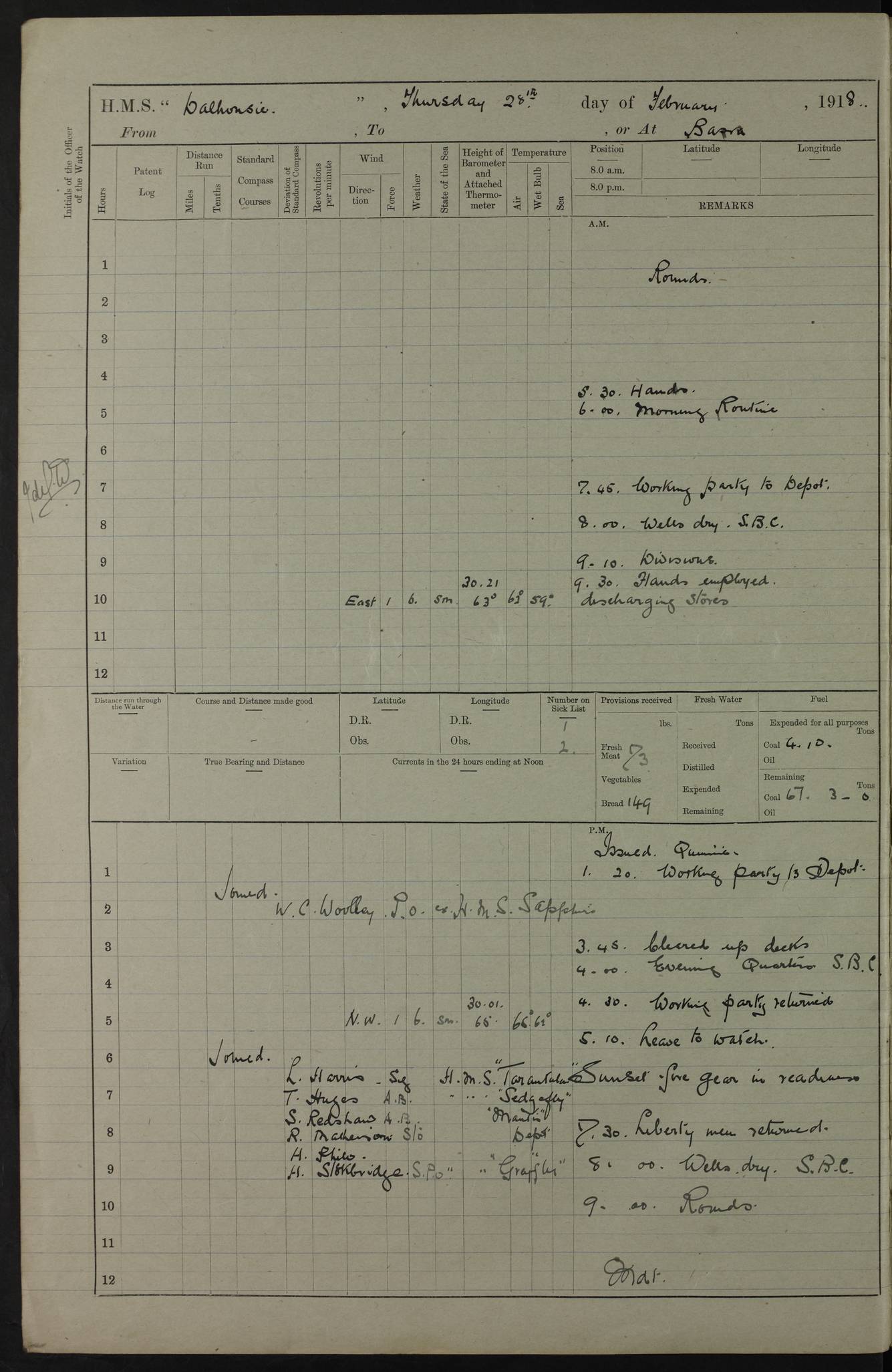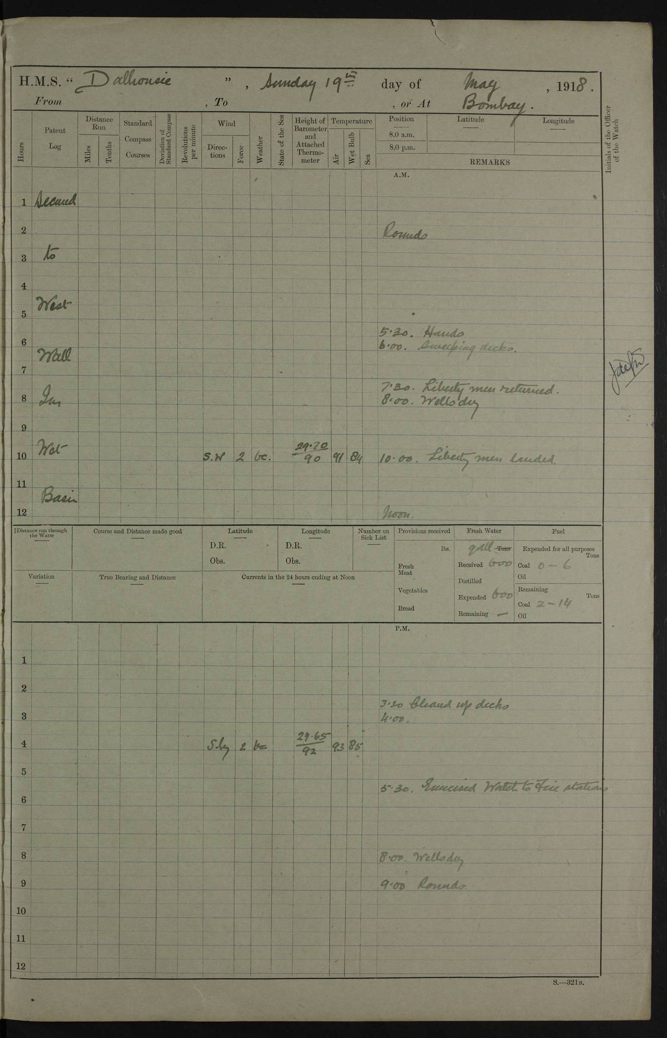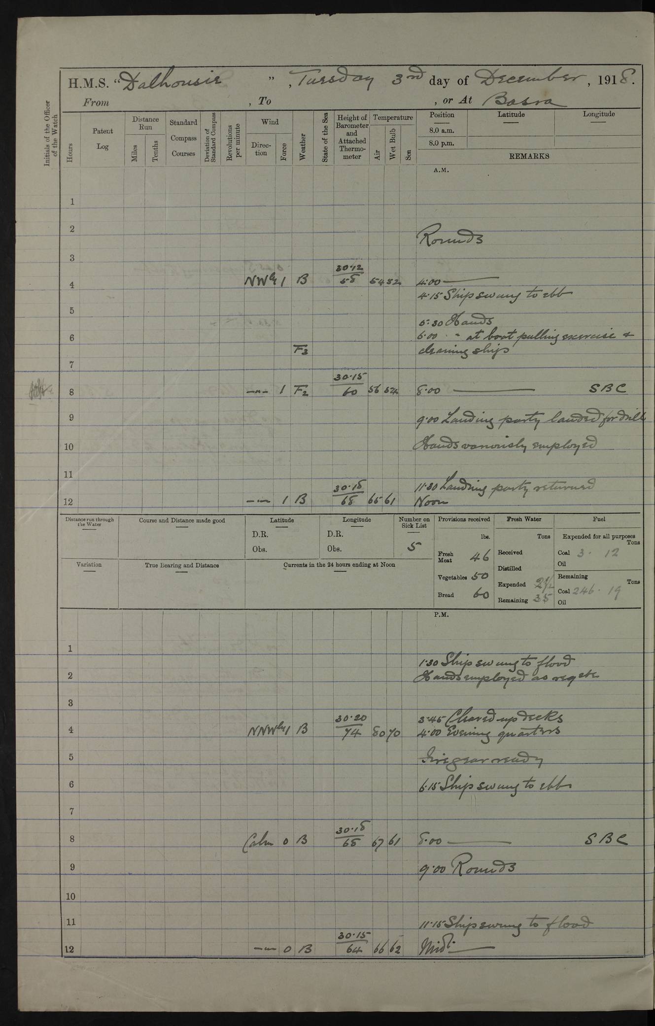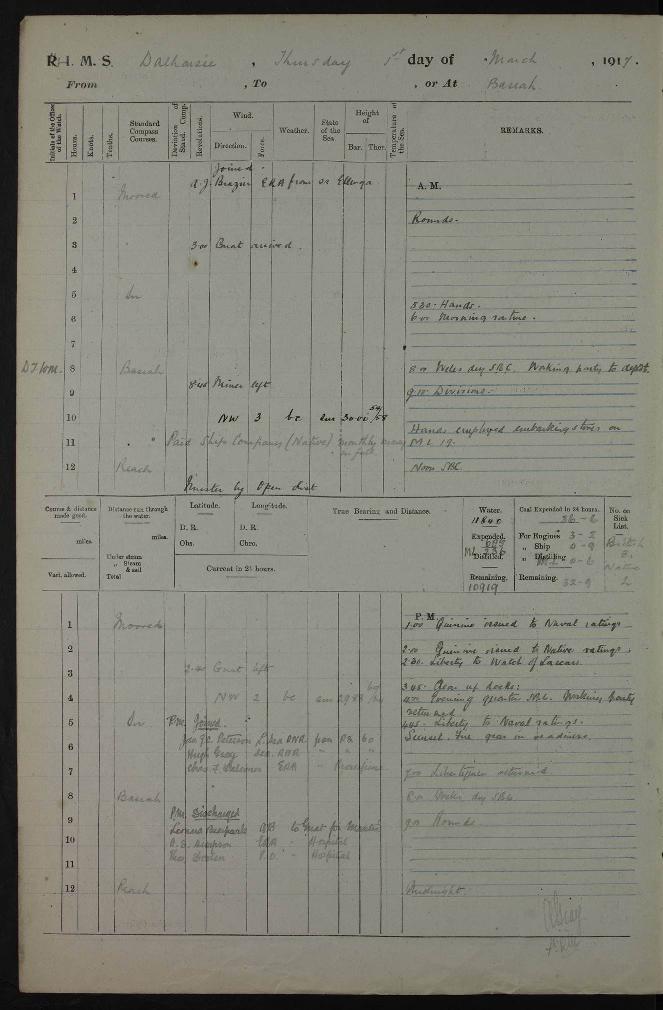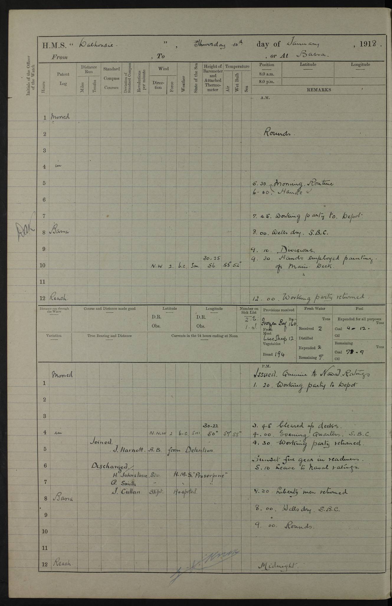 AM – Discharged To EKMA: PJ O’Connor, Lieutenant Royal Navy To Passage: 2 Indian Ratings To FLYCATCHER: D Butcher, Leading Seaman 4ef4fb19e53e0a0c910059d0: (https://s3.amazonaws.com:443/oldweather/ADM53-39410/0015_0.jpg) 26 February 1918 Place: Basrah Lat 30.5269, Long 47.8407 2:00am: Rounds 5:30am: Hands 6:00am: Morning Routine 7:45am: Working party to Depot 8:00am: Wells dry - Signal Books correct 9:10am: Divisions 10:00am: Hands employed painting in cabins & as requisite 12:00pm: Signal Books correct – Working party returned 1:20pm: Working party to Depot 3:45pm: Cleared up decks 4:00pm: Evening Quarters – Signal Books correct 4:30pm: Working party returned 5:10pm: Leave to Watch 6:00pm: Sunset - Fire Gear connected 7:30pm: Liberty men returned 8:00pm: Wells dry - Signal Books correct 9:00pm: Rounds – Signal Books correct PM – Joined From TARANTULA: J Baldwin, Leading Signalman From Hospital: Louis Mones, Engineering driver PM - Discharged To MANTIS: G Munay, Leading Signalman – C Killburn, Signalman To TARANTULA: CM Leary, Telegrapher 4ef4fb19e53e0a0c910059d1: (https://s3.amazonaws.com:443/oldweather/ADM53-39410/0015_1.jpg) 27 February 1918 Place: Basrah Lat 30.5269, Long 47.8407 2:00am: Rounds 5:30am: Hands 6:00am: Morning Routine 7:45am: Working party to Depot 8:00am: Wells dry - Signal Books correct 9:10am: Divisions 10:00am: Hands employed packing surveyed stores, cleaning out boats & painting in Warrant Ratings 12:00pm: Signal Books correct – Working party returned 1:20pm: Working party to Depot 3:45pm: Cleared up decks 4:00pm: Evening Quarters – Signal Books correct 4:30pm: Working party returned 5:10pm: Leave to Watch 6:00pm: Sunset - Fire Gear connected 7:30pm: Liberty men returned 8:00pm: Wells dry - Signal Books correct 9:00pm: Rounds – Signal Books correct AM – Joined From ELEPHANTA: No. 22 Sheik Kadir Sheik Mahomed, Lascar 2nd – No. 41 Abdool Rahman Sheik Dawood, Lamp Trimmer – No. 56 Mahomed Sabia Sheik Bosman, Stoker 2nd – No. 50A Sheik Mahomed Sheik Hassan, Stoker 2nd – No. 90 Abelino Fernandez, Topass – No. 86 Avelino Leitas, Topass 4ef4fb1ae53e0a0c910059d2: (https://s3.amazonaws.com:443/oldweather/ADM53-39410/0016_0.jpg) 28 February 1918 Place: Basrah Lat 30.5269, Long 47.8407 2:00am: Rounds 5:30am: Hands 6:00am: Morning Routine 7:45am: Working party to Depot 8:00am: Wells dry - Signal Books correct 9:10am: Divisions 10:00am: Hands employed discharging stores 12:00pm: Signal Books correct – Working party returned 1:00pm: Issued Quinine to Naval Ratings - Issued Quinine to Native Ratings 1:20pm: Working party to Depot 3:45pm: Cleared up decks 4:00pm: Evening Quarters – Signal Books correct 4:30pm: Working party returned 5:10pm: Leave to Watch 6:00pm: Sunset - Fire Gear connected 7:30pm: Liberty men returned 8:00pm: Wells dry - Signal Books correct 9:00pm: Rounds – Signal Books correct PM – Joined From SAPPHIRE: WC Woolley, Petty Officer PM - Discharged To TARANTULA: L Harris, Signalman To SEDGEFLY: T Hughes, Able Seaman To MANTIS: S Redshaw, Able Seaman To Depot: R Matheison, Stoker – H Philo, Stoker TO GRAYFLY: H Stockbridge, Senior Petty Officer 4ef4fb1ae53e0a0c910059d3: (https://s3.amazonaws.com:443/oldweather/ADM53-39410/0016_1.jpg) Log Page – Blank – no data on Page 4ef4fb1ae53e0a0c910059d4: (https://s3.amazonaws.com:443/oldweather/ADM53-39410/0017_0.jpg) Log Page – Blank – no data on Page 4ef4fb1ae53e0a0c910059d5: (https://s3.amazonaws.com:443/oldweather/ADM53-39410/0017_1.jpg) Log Page – Blank 4ef4fb1ae53e0a0c910059d6: (https://s3.amazonaws.com:443/oldweather/ADM53-39410/0018_0.jpg) Log Page – Blank 4ef4fb1ae53e0a0c910059d7: (https://s3.amazonaws.com:443/oldweather/ADM53-39410/0018_1.jpg) Log Page – Blank LOGS FOR MARCH 1918 4ef4fb1be53e0a0c910059d8: (https://s3.amazonaws.com:443/oldweather/ADM53-39411/0000_0.jpg) Log Page – Cover March 1918 4ef4fb1be53e0a0c910059d9: (https://s3.amazonaws.com:443/oldweather/ADM53-39411/0000_1.jpg) Log Page – Cover – March 1918 4ef4fb1be53e0a0c910059da: (https://s3.amazonaws.com:443/oldweather/ADM53-39411/0001_0.jpg) Log Page – Blank 4ef4fb1be53e0a0c910059db: (https://s3.amazonaws.com:443/oldweather/ADM53-39411/0001_1.jpg) Log Page – Blank – no data on Page 4ef4fb1ce53e0a0c910059dc: (https://s3.amazonaws.com:443/oldweather/ADM53-39411/0002_0.jpg) Log Page – Blank – no data on Page 4ef4fb1ce53e0a0c910059dd: (https://s3.amazonaws.com:443/oldweather/ADM53-39411/0002_1.jpg) 1 March 1918 Place: Basrah Lat 30.5269, Long 47.8407 1:00am: drew from Field Chest Treasury Officer Basrah Five thousand (5,000) Rupees only 2:00am: Rounds 5:30am: Hands 6:00am: Morning Routine 7:45am: Working party to Depot 8:00am: Wells dry – Signal Books correct – CHAKLA arrived with 5 Officers & 60 Ratings 12:00pm: Signal Books correct – Working party returned 1:15pm: Working party to Depot 2:00pm: Paid Lascar Ratings 3:45pm: Cleared up decks 4:00pm: Evening Quarters 4:30pm: Working party returned 5:10pm: Leave to Watch 5:30pm: 5 Petty Officers & 57 Ratings to Bandra for Passage 6:00pm: Sunset - Fire Gear connected 7:30pm: Liberty men returned 9:00pm: Rounds – Petty Officers returned AM – Joined From CHALKA: Hawkins, Paymaster Royal Navy PM - Discharged To FLYCATCHER: Dennis, Sub Lieutenant Royal Navy Volunteer Reserve To TARANTULA: L Harris, Signalman To SEDGEFLY: TG Hughes, Able Seaman To MANTIS: S Redshaw, Able Seaman To Depot: R Mathieson, Stoker To GRAYFLY: H Stockbridge, Senior Petty Officer 4ef4fb1ce53e0a0c910059de: (https://s3.amazonaws.com:443/oldweather/ADM53-39411/0003_0.jpg) 2 March 1918 Place: Basrah Lat 30.5269, Long 47.8407 2:00am: Rounds 5:30am: Hands 6:00am: Morning Routine 7:00am: Exercised Fire Stations 7:45am: Working party to Depot 8:00am: Wells dry - Signal Books correct 9:10am: Divisions 10:00am: Hands employed as requisite 12:00pm: Working party returned 1:15pm: Working party to Depot 3:45pm: Cleared up decks 4:00pm: Evening Quarters – Signal Books corr
