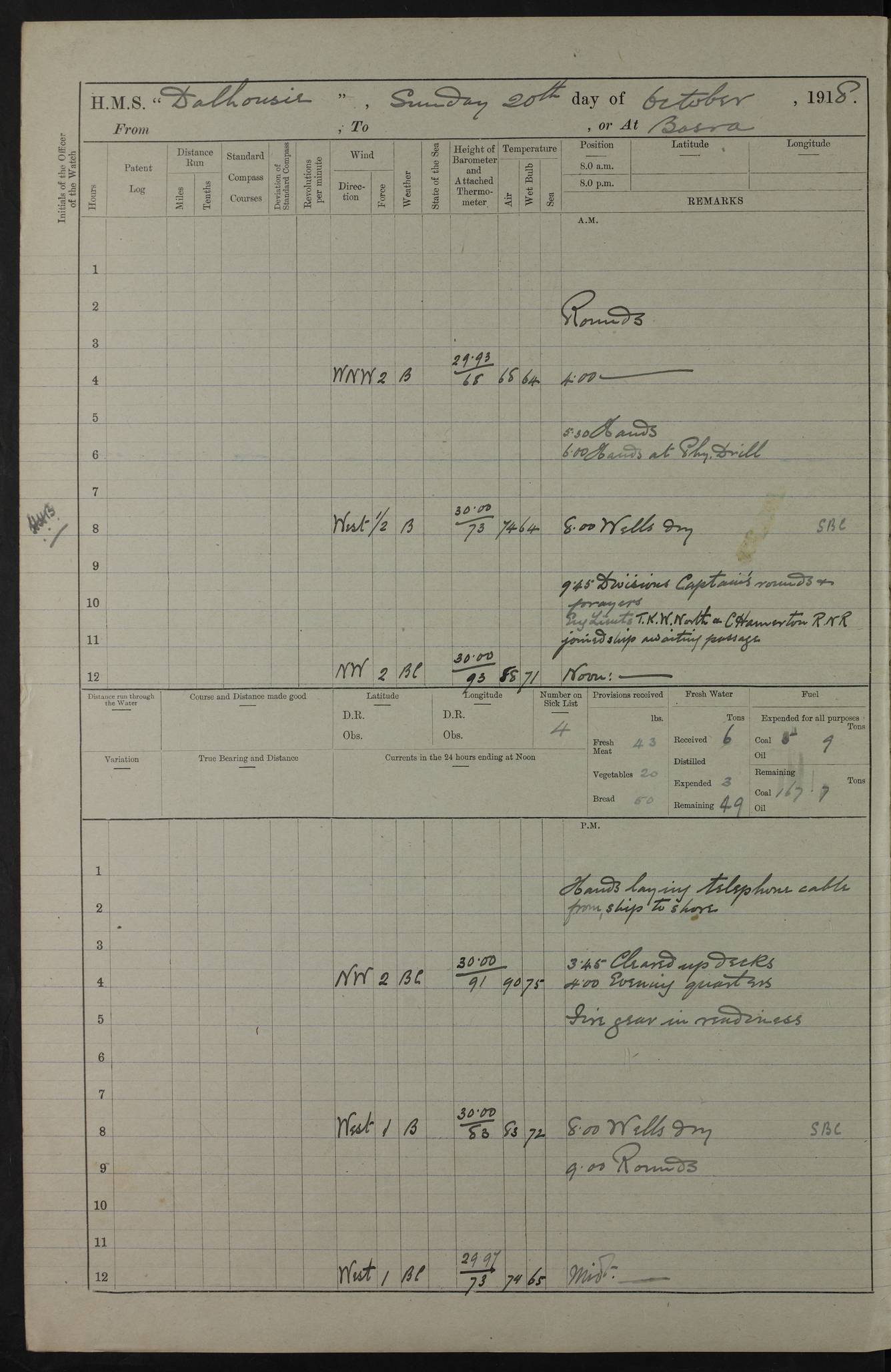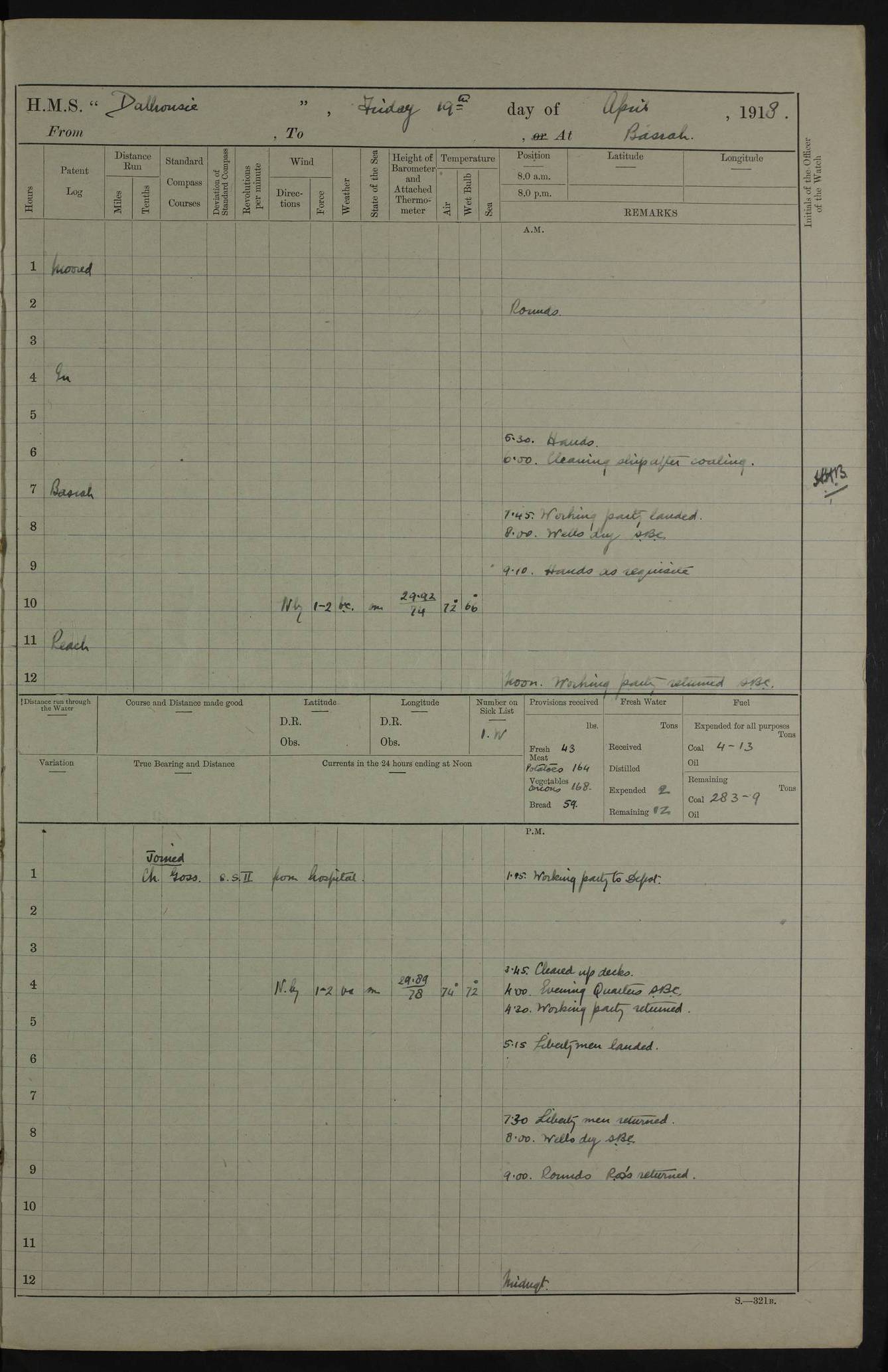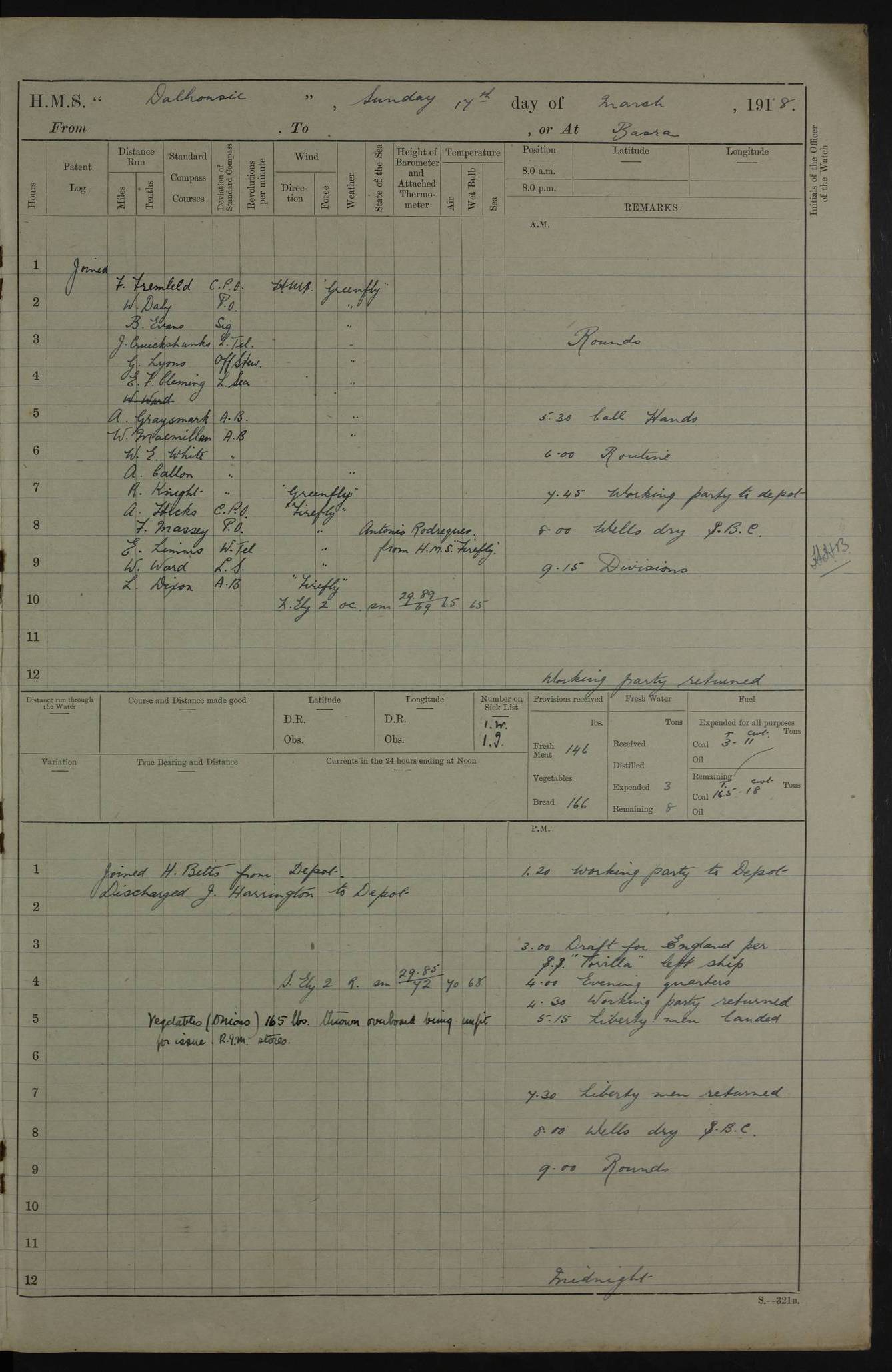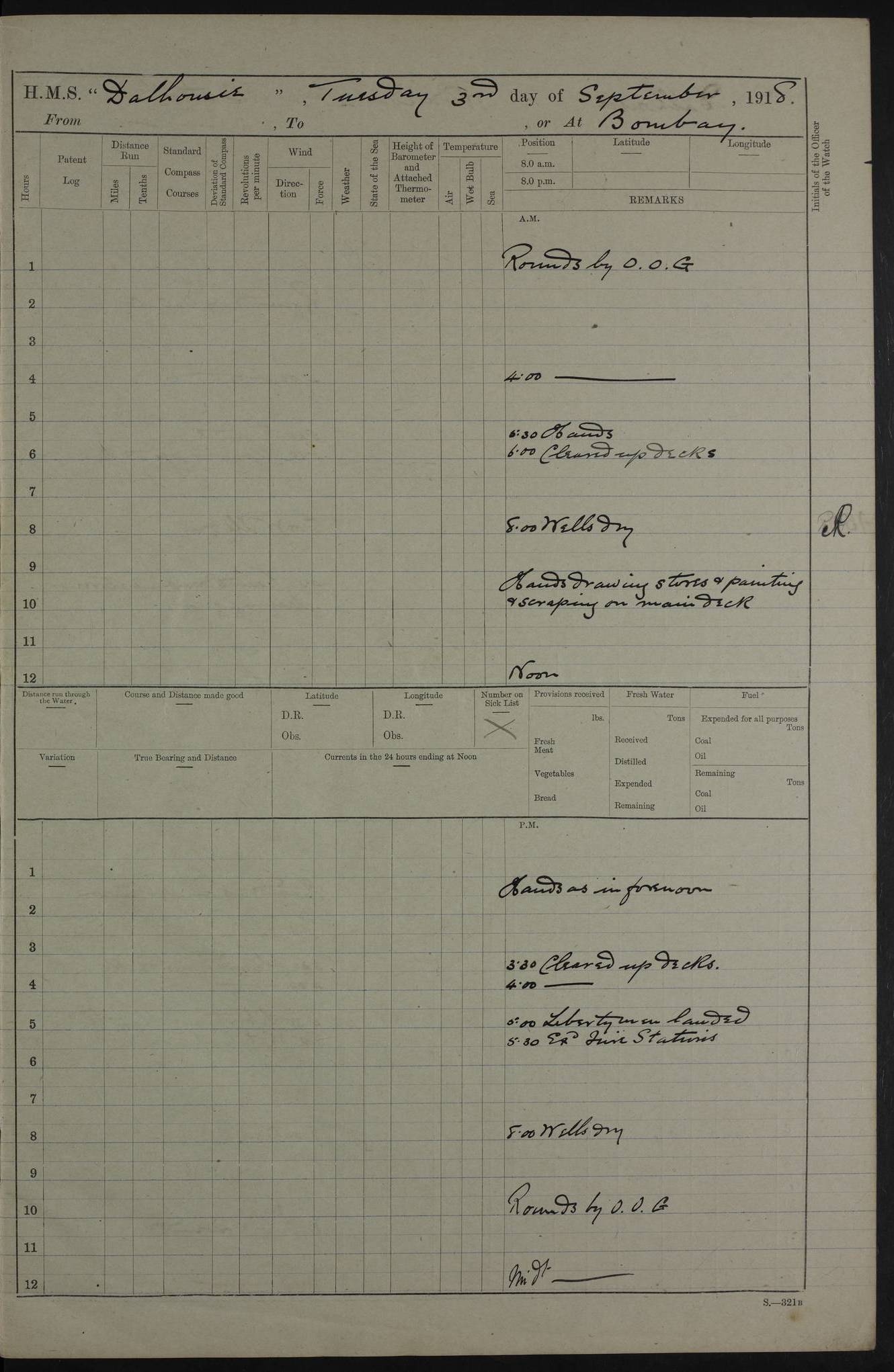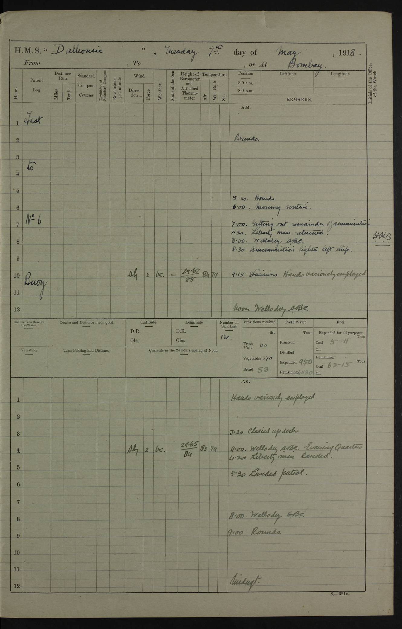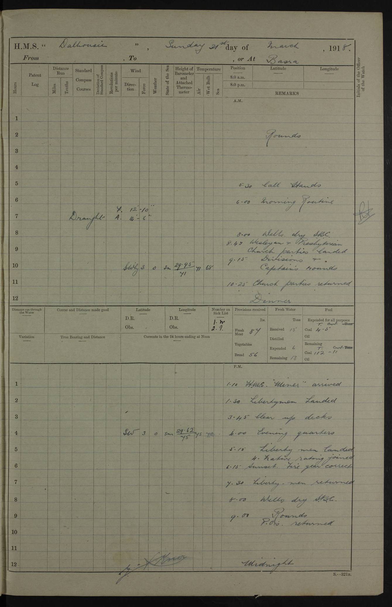 AM – Discharged To EKMA: PJ O’Connor, Lieutenant Royal Navy To Passage: 2 Indian Ratings To FLYCATCHER: D Butcher, Leading Seaman 4ef4fb19e53e0a0c910059d0: (https://s3.amazonaws.com:443/oldweather/ADM53-39410/0015_0.jpg) 26 February 1918 Place: Basrah Lat 30.5269, Long 47.8407 2:00am: Rounds 5:30am: Hands 6:00am: Morning Routine 7:45am: Working party to Depot 8:00am: Wells dry - Signal Books correct 9:10am: Divisions 10:00am: Hands employed painting in cabins & as requisite 12:00pm: Signal Books correct – Working party returned 1:20pm: Working party to Depot 3:45pm: Cleared up decks 4:00pm: Evening Quarters – Signal Books correct 4:30pm: Working party returned 5:10pm: Leave to Watch 6:00pm: Sunset - Fire Gear connected 7:30pm: Liberty men returned 8:00pm: Wells dry - Signal Books correct 9:00pm: Rounds – Signal Books correct PM – Joined From TARANTULA: J Baldwin, Leading Signalman From Hospital: Louis Mones, Engineering driver PM - Discharged To MANTIS: G Munay, Leading Signalman – C Killburn, Signalman To TARANTULA: CM Leary, Telegrapher 4ef4fb19e53e0a0c910059d1: (https://s3.amazonaws.com:443/oldweather/ADM53-39410/0015_1.jpg) 27 February 1918 Place: Basrah Lat 30.5269, Long 47.8407 2:00am: Rounds 5:30am: Hands 6:00am: Morning Routine 7:45am: Working party to Depot 8:00am: Wells dry - Signal Books correct 9:10am: Divisions 10:00am: Hands employed packing surveyed stores, cleaning out boats & painting in Warrant Ratings 12:00pm: Signal Books correct – Working party returned 1:20pm: Working party to Depot 3:45pm: Cleared up decks 4:00pm: Evening Quarters – Signal Books correct 4:30pm: Working party returned 5:10pm: Leave to Watch 6:00pm: Sunset - Fire Gear connected 7:30pm: Liberty men returned 8:00pm: Wells dry - Signal Books correct 9:00pm: Rounds – Signal Books correct AM – Joined From ELEPHANTA: No. 22 Sheik Kadir Sheik Mahomed, Lascar 2nd – No. 41 Abdool Rahman Sheik Dawood, Lamp Trimmer – No. 56 Mahomed Sabia Sheik Bosman, Stoker 2nd – No. 50A Sheik Mahomed Sheik Hassan, Stoker 2nd – No. 90 Abelino Fernandez, Topass – No. 86 Avelino Leitas, Topass 4ef4fb1ae53e0a0c910059d2: (https://s3.amazonaws.com:443/oldweather/ADM53-39410/0016_0.jpg) 28 February 1918 Place: Basrah Lat 30.5269, Long 47.8407 2:00am: Rounds 5:30am: Hands 6:00am: Morning Routine 7:45am: Working party to Depot 8:00am: Wells dry - Signal Books correct 9:10am: Divisions 10:00am: Hands employed discharging stores 12:00pm: Signal Books correct – Working party returned 1:00pm: Issued Quinine to Naval Ratings - Issued Quinine to Native Ratings 1:20pm: Working party to Depot 3:45pm: Cleared up decks 4:00pm: Evening Quarters – Signal Books correct 4:30pm: Working party returned 5:10pm: Leave to Watch 6:00pm: Sunset - Fire Gear connected 7:30pm: Liberty men returned 8:00pm: Wells dry - Signal Books correct 9:00pm: Rounds – Signal Books correct PM – Joined From SAPPHIRE: WC Woolley, Petty Officer PM - Discharged To TARANTULA: L Harris, Signalman To SEDGEFLY: T Hughes, Able Seaman To MANTIS: S Redshaw, Able Seaman To Depot: R Matheison, Stoker – H Philo, Stoker TO GRAYFLY: H Stockbridge, Senior Petty Officer 4ef4fb1ae53e0a0c910059d3: (https://s3.amazonaws.com:443/oldweather/ADM53-39410/0016_1.jpg) Log Page – Blank – no data on Page 4ef4fb1ae53e0a0c910059d4: (https://s3.amazonaws.com:443/oldweather/ADM53-39410/0017_0.jpg) Log Page – Blank – no data on Page 4ef4fb1ae53e0a0c910059d5: (https://s3.amazonaws.com:443/oldweather/ADM53-39410/0017_1.jpg) Log Page – Blank 4ef4fb1ae53e0a0c910059d6: (https://s3.amazonaws.com:443/oldweather/ADM53-39410/0018_0.jpg) Log Page – Blank 4ef4fb1ae53e0a0c910059d7: (https://s3.amazonaws.com:443/oldweather/ADM53-39410/0018_1.jpg) Log Page – Blank LOGS FOR MARCH 1918 4ef4fb1be53e0a0c910059d8: (https://s3.amazonaws.com:443/oldweather/ADM53-39411/0000_0.jpg) Log Page – Cover March 1918 4ef4fb1be53e0a0c910059d9: (https://s3.amazonaws.com:443/oldweather/ADM53-39411/0000_1.jpg) Log Page – Cover – March 1918 4ef4fb1be53e0a0c910059da: (https://s3.amazonaws.com:443/oldweather/ADM53-39411/0001_0.jpg) Log Page – Blank 4ef4fb1be53e0a0c910059db: (https://s3.amazonaws.com:443/oldweather/ADM53-39411/0001_1.jpg) Log Page – Blank – no data on Page 4ef4fb1ce53e0a0c910059dc: (https://s3.amazonaws.com:443/oldweather/ADM53-39411/0002_0.jpg) Log Page – Blank – no data on Page 4ef4fb1ce53e0a0c910059dd: (https://s3.amazonaws.com:443/oldweather/ADM53-39411/0002_1.jpg) 1 March 1918 Place: Basrah Lat 30.5269, Long 47.8407 1:00am: drew from Field Chest Treasury Officer Basrah Five thousand (5,000) Rupees only 2:00am: Rounds 5:30am: Hands 6:00am: Morning Routine 7:45am: Working party to Depot 8:00am: Wells dry – Signal Books correct – CHAKLA arrived with 5 Officers & 60 Ratings 12:00pm: Signal Books correct – Working party returned 1:15pm: Working party to Depot 2:00pm: Paid Lascar Ratings 3:45pm: Cleared up decks 4:00pm: Evening Quarters 4:30pm: Working party returned 5:10pm: Leave to Watch 5:30pm: 5 Petty Officers & 57 Ratings to Bandra for Passage 6:00pm: Sunset - Fire Gear connected 7:30pm: Liberty men returned 9:00pm: Rounds – Petty Officers returned AM – Joined From CHALKA: Hawkins, Paymaster Royal Navy PM - Discharged To FLYCATCHER: Dennis, Sub Lieutenant Royal Navy Volunteer Reserve To TARANTULA: L Harris, Signalman To SEDGEFLY: TG Hughes, Able Seaman To MANTIS: S Redshaw, Able Seaman To Depot: R Mathieson, Stoker To GRAYFLY: H Stockbridge, Senior Petty Officer 4ef4fb1ce53e0a0c910059de: (https://s3.amazonaws.com:443/oldweather/ADM53-39411/0003_0.jpg) 2 March 1918 Place: Basrah Lat 30.5269, Long 47.8407 2:00am: Rounds 5:30am: Hands 6:00am: Morning Routine 7:00am: Exercised Fire Stations 7:45am: Working party to Depot 8:00am: Wells dry - Signal Books correct 9:10am: Divisions 10:00am: Hands employed as requisite 12:00pm: Working party returned 1:15pm: Working party to Depot 3:45pm: Cleared up decks 4:00pm: Evening Quarters – Signal Books corr