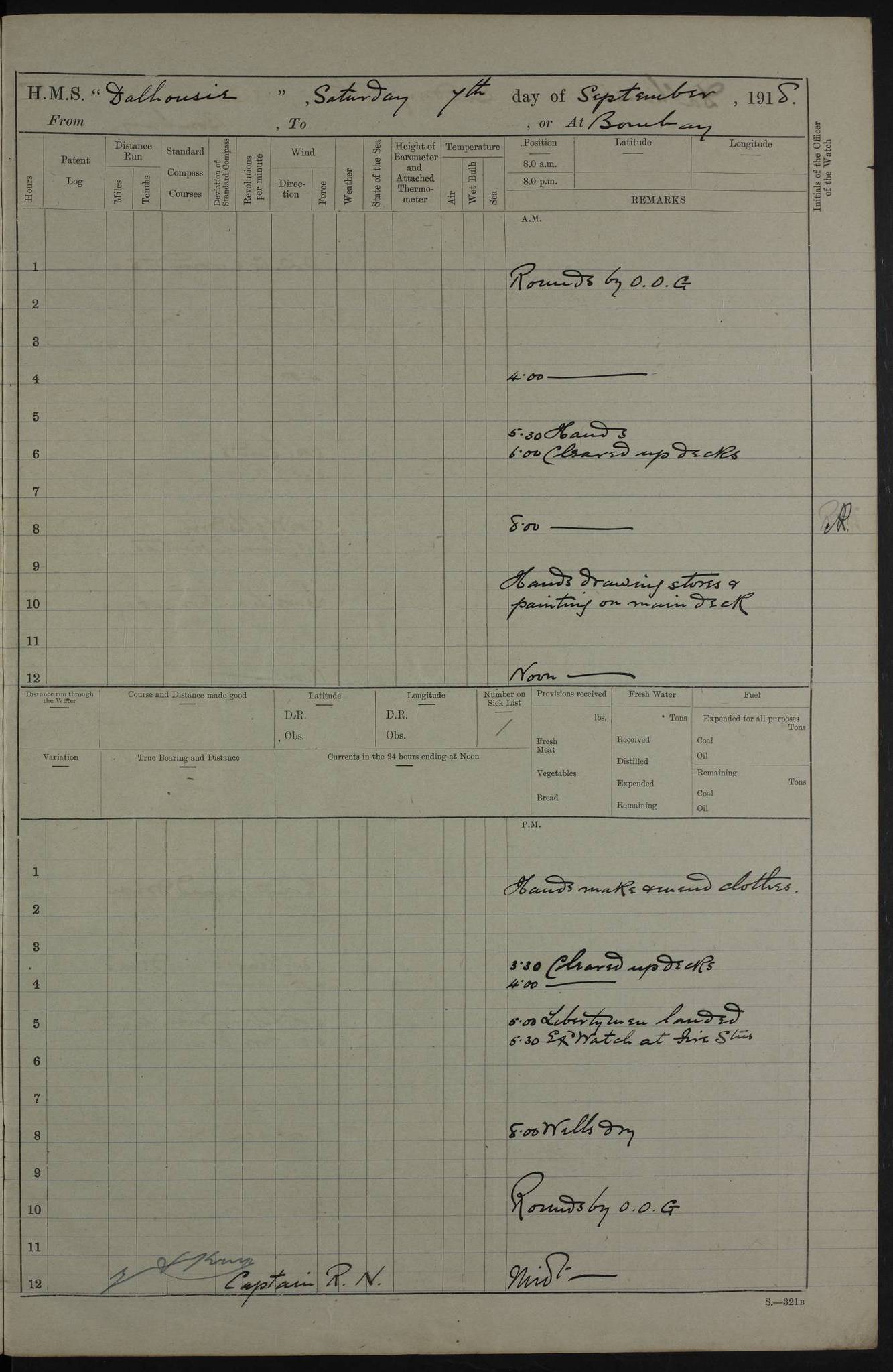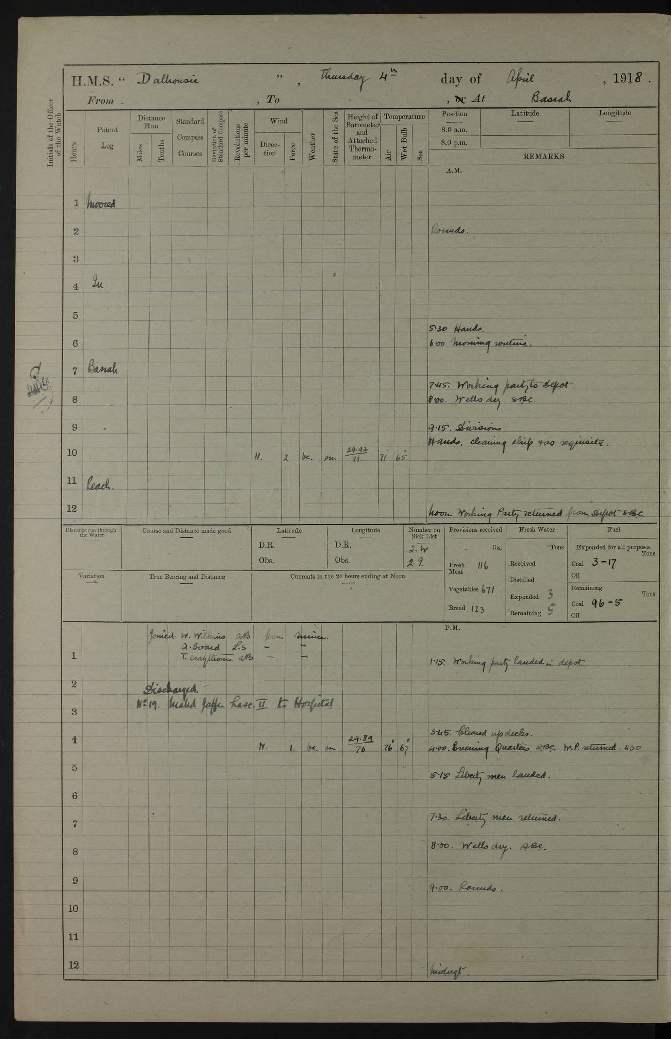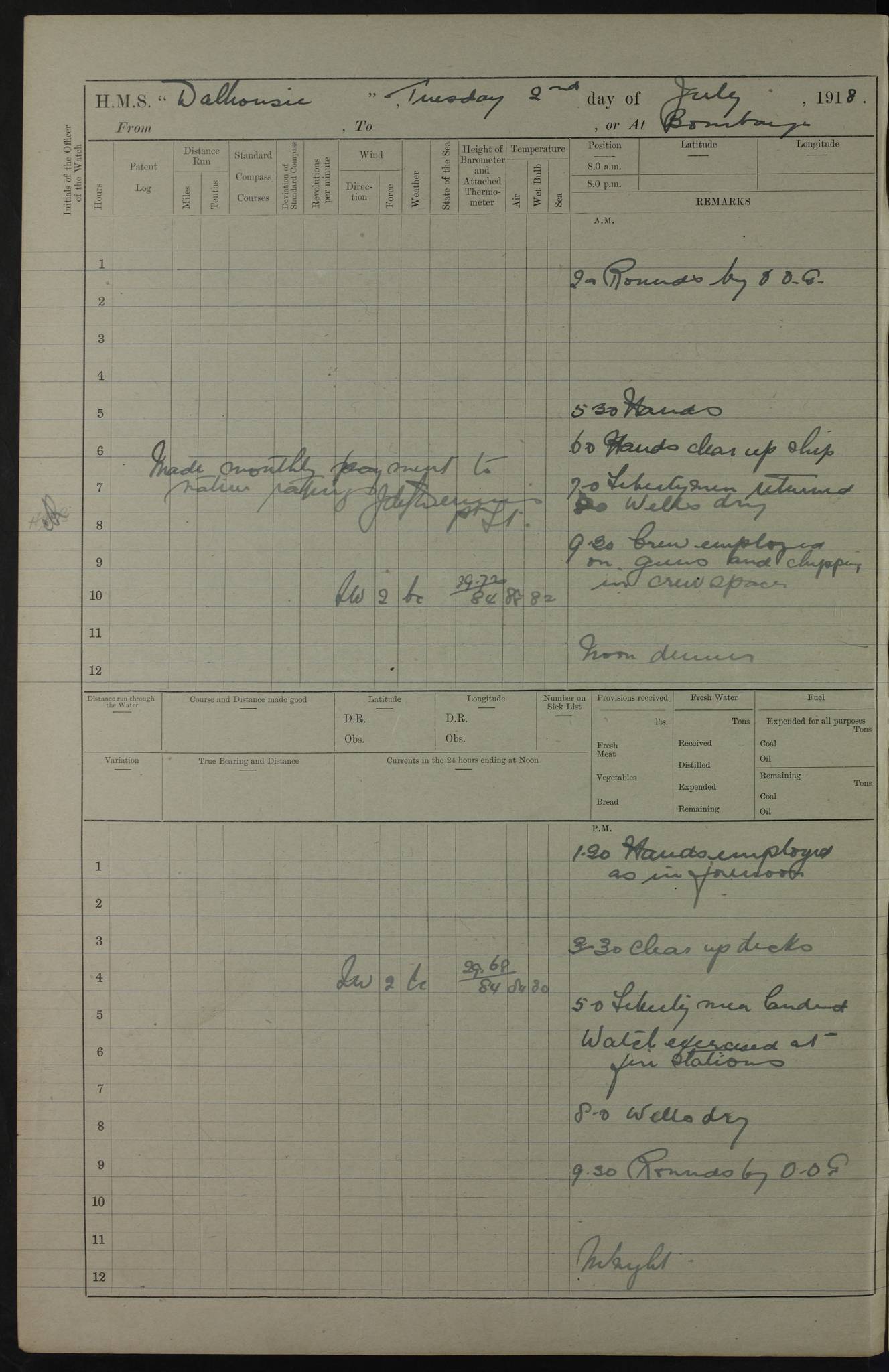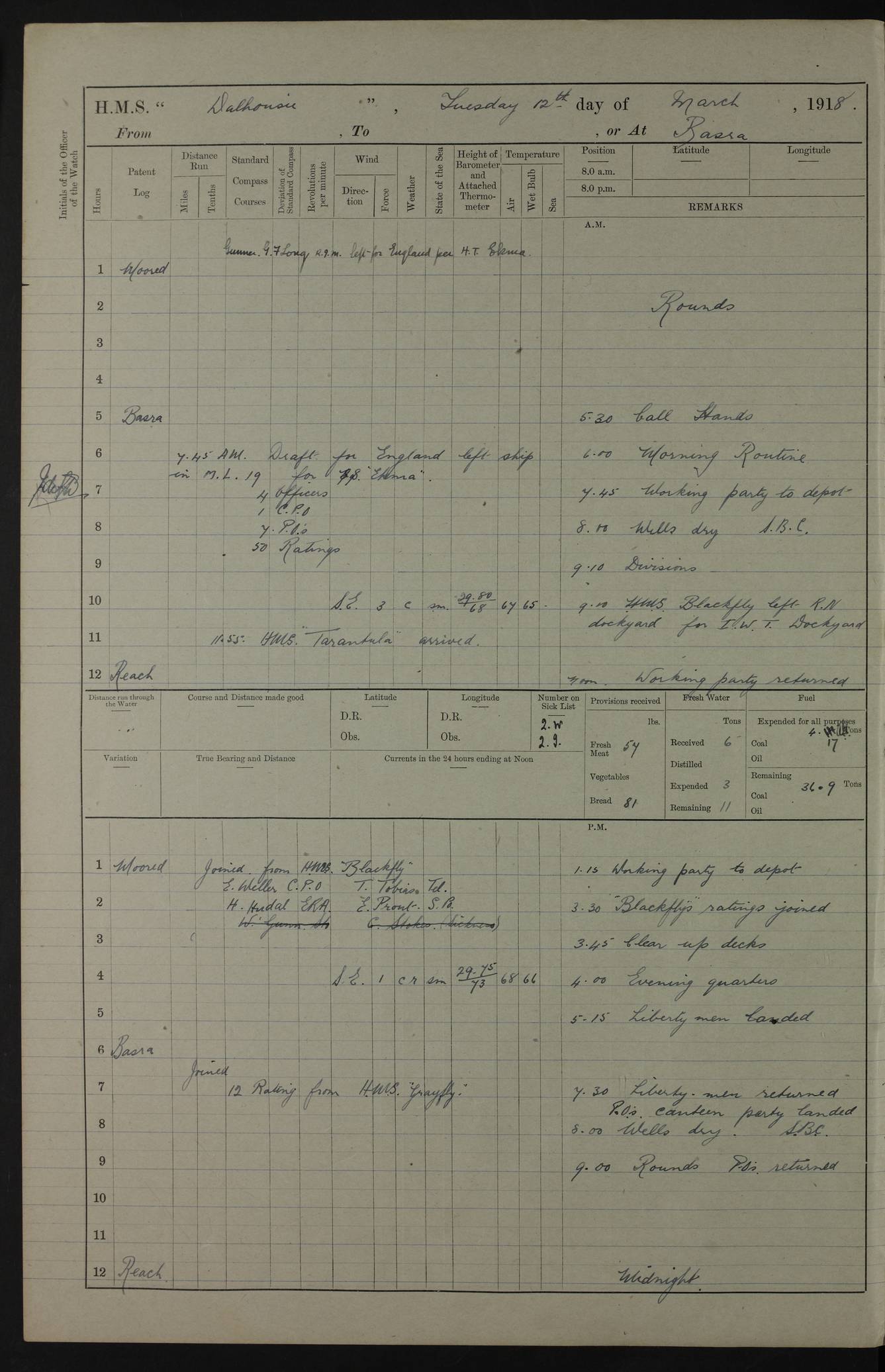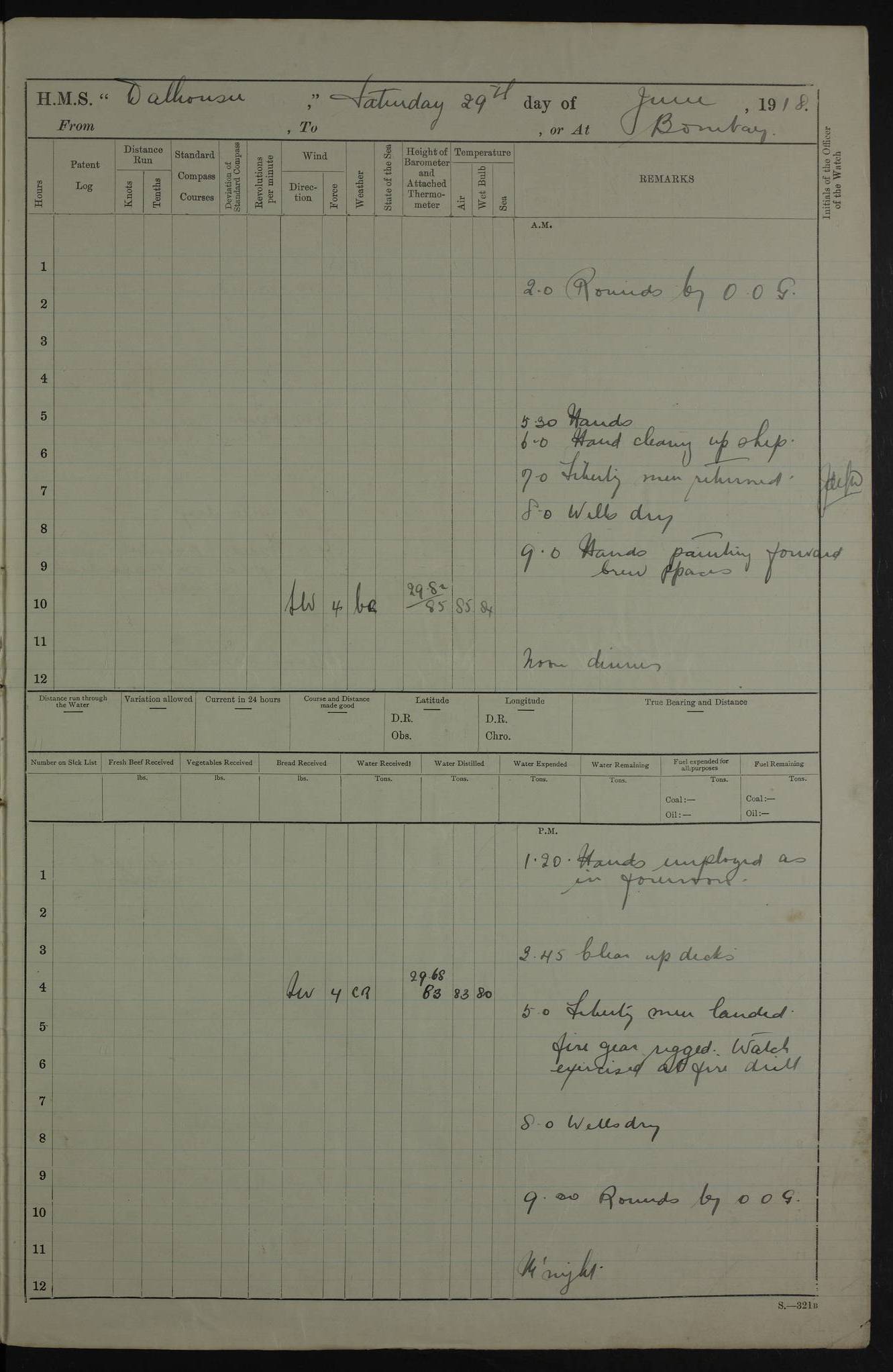 AM – Discharged To EKMA: PJ O’Connor, Lieutenant Royal Navy To Passage: 2 Indian Ratings To FLYCATCHER: D Butcher, Leading Seaman 4ef4fb19e53e0a0c910059d0: (https://s3.amazonaws.com:443/oldweather/ADM53-39410/0015_0.jpg) 26 February 1918 Place: Basrah Lat 30.5269, Long 47.8407 2:00am: Rounds 5:30am: Hands 6:00am: Morning Routine 7:45am: Working party to Depot 8:00am: Wells dry - Signal Books correct 9:10am: Divisions 10:00am: Hands employed painting in cabins & as requisite 12:00pm: Signal Books correct – Working party returned 1:20pm: Working party to Depot 3:45pm: Cleared up decks 4:00pm: Evening Quarters – Signal Books correct 4:30pm: Working party returned 5:10pm: Leave to Watch 6:00pm: Sunset - Fire Gear connected 7:30pm: Liberty men returned 8:00pm: Wells dry - Signal Books correct 9:00pm: Rounds – Signal Books correct PM – Joined From TARANTULA: J Baldwin, Leading Signalman From Hospital: Louis Mones, Engineering driver PM - Discharged To MANTIS: G Munay, Leading Signalman – C Killburn, Signalman To TARANTULA: CM Leary, Telegrapher 4ef4fb19e53e0a0c910059d1: (https://s3.amazonaws.com:443/oldweather/ADM53-39410/0015_1.jpg) 27 February 1918 Place: Basrah Lat 30.5269, Long 47.8407 2:00am: Rounds 5:30am: Hands 6:00am: Morning Routine 7:45am: Working party to Depot 8:00am: Wells dry - Signal Books correct 9:10am: Divisions 10:00am: Hands employed packing surveyed stores, cleaning out boats & painting in Warrant Ratings 12:00pm: Signal Books correct – Working party returned 1:20pm: Working party to Depot 3:45pm: Cleared up decks 4:00pm: Evening Quarters – Signal Books correct 4:30pm: Working party returned 5:10pm: Leave to Watch 6:00pm: Sunset - Fire Gear connected 7:30pm: Liberty men returned 8:00pm: Wells dry - Signal Books correct 9:00pm: Rounds – Signal Books correct AM – Joined From ELEPHANTA: No. 22 Sheik Kadir Sheik Mahomed, Lascar 2nd – No. 41 Abdool Rahman Sheik Dawood, Lamp Trimmer – No. 56 Mahomed Sabia Sheik Bosman, Stoker 2nd – No. 50A Sheik Mahomed Sheik Hassan, Stoker 2nd – No. 90 Abelino Fernandez, Topass – No. 86 Avelino Leitas, Topass 4ef4fb1ae53e0a0c910059d2: (https://s3.amazonaws.com:443/oldweather/ADM53-39410/0016_0.jpg) 28 February 1918 Place: Basrah Lat 30.5269, Long 47.8407 2:00am: Rounds 5:30am: Hands 6:00am: Morning Routine 7:45am: Working party to Depot 8:00am: Wells dry - Signal Books correct 9:10am: Divisions 10:00am: Hands employed discharging stores 12:00pm: Signal Books correct – Working party returned 1:00pm: Issued Quinine to Naval Ratings - Issued Quinine to Native Ratings 1:20pm: Working party to Depot 3:45pm: Cleared up decks 4:00pm: Evening Quarters – Signal Books correct 4:30pm: Working party returned 5:10pm: Leave to Watch 6:00pm: Sunset - Fire Gear connected 7:30pm: Liberty men returned 8:00pm: Wells dry - Signal Books correct 9:00pm: Rounds – Signal Books correct PM – Joined From SAPPHIRE: WC Woolley, Petty Officer PM - Discharged To TARANTULA: L Harris, Signalman To SEDGEFLY: T Hughes, Able Seaman To MANTIS: S Redshaw, Able Seaman To Depot: R Matheison, Stoker – H Philo, Stoker TO GRAYFLY: H Stockbridge, Senior Petty Officer 4ef4fb1ae53e0a0c910059d3: (https://s3.amazonaws.com:443/oldweather/ADM53-39410/0016_1.jpg) Log Page – Blank – no data on Page 4ef4fb1ae53e0a0c910059d4: (https://s3.amazonaws.com:443/oldweather/ADM53-39410/0017_0.jpg) Log Page – Blank – no data on Page 4ef4fb1ae53e0a0c910059d5: (https://s3.amazonaws.com:443/oldweather/ADM53-39410/0017_1.jpg) Log Page – Blank 4ef4fb1ae53e0a0c910059d6: (https://s3.amazonaws.com:443/oldweather/ADM53-39410/0018_0.jpg) Log Page – Blank 4ef4fb1ae53e0a0c910059d7: (https://s3.amazonaws.com:443/oldweather/ADM53-39410/0018_1.jpg) Log Page – Blank LOGS FOR MARCH 1918 4ef4fb1be53e0a0c910059d8: (https://s3.amazonaws.com:443/oldweather/ADM53-39411/0000_0.jpg) Log Page – Cover March 1918 4ef4fb1be53e0a0c910059d9: (https://s3.amazonaws.com:443/oldweather/ADM53-39411/0000_1.jpg) Log Page – Cover – March 1918 4ef4fb1be53e0a0c910059da: (https://s3.amazonaws.com:443/oldweather/ADM53-39411/0001_0.jpg) Log Page – Blank 4ef4fb1be53e0a0c910059db: (https://s3.amazonaws.com:443/oldweather/ADM53-39411/0001_1.jpg) Log Page – Blank – no data on Page 4ef4fb1ce53e0a0c910059dc: (https://s3.amazonaws.com:443/oldweather/ADM53-39411/0002_0.jpg) Log Page – Blank – no data on Page 4ef4fb1ce53e0a0c910059dd: (https://s3.amazonaws.com:443/oldweather/ADM53-39411/0002_1.jpg) 1 March 1918 Place: Basrah Lat 30.5269, Long 47.8407 1:00am: drew from Field Chest Treasury Officer Basrah Five thousand (5,000) Rupees only 2:00am: Rounds 5:30am: Hands 6:00am: Morning Routine 7:45am: Working party to Depot 8:00am: Wells dry – Signal Books correct – CHAKLA arrived with 5 Officers & 60 Ratings 12:00pm: Signal Books correct – Working party returned 1:15pm: Working party to Depot 2:00pm: Paid Lascar Ratings 3:45pm: Cleared up decks 4:00pm: Evening Quarters 4:30pm: Working party returned 5:10pm: Leave to Watch 5:30pm: 5 Petty Officers & 57 Ratings to Bandra for Passage 6:00pm: Sunset - Fire Gear connected 7:30pm: Liberty men returned 9:00pm: Rounds – Petty Officers returned AM – Joined From CHALKA: Hawkins, Paymaster Royal Navy PM - Discharged To FLYCATCHER: Dennis, Sub Lieutenant Royal Navy Volunteer Reserve To TARANTULA: L Harris, Signalman To SEDGEFLY: TG Hughes, Able Seaman To MANTIS: S Redshaw, Able Seaman To Depot: R Mathieson, Stoker To GRAYFLY: H Stockbridge, Senior Petty Officer 4ef4fb1ce53e0a0c910059de: (https://s3.amazonaws.com:443/oldweather/ADM53-39411/0003_0.jpg) 2 March 1918 Place: Basrah Lat 30.5269, Long 47.8407 2:00am: Rounds 5:30am: Hands 6:00am: Morning Routine 7:00am: Exercised Fire Stations 7:45am: Working party to Depot 8:00am: Wells dry - Signal Books correct 9:10am: Divisions 10:00am: Hands employed as requisite 12:00pm: Working party returned 1:15pm: Working party to Depot 3:45pm: Cleared up decks 4:00pm: Evening Quarters – Signal Books corr