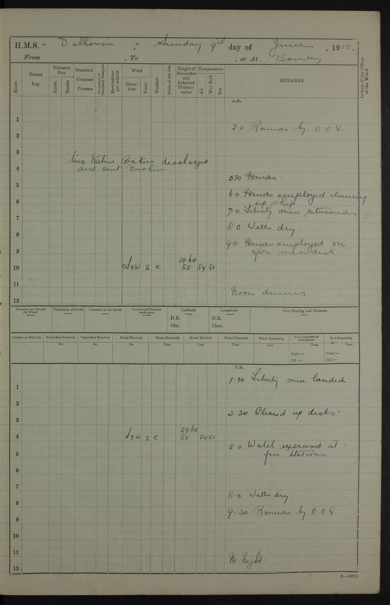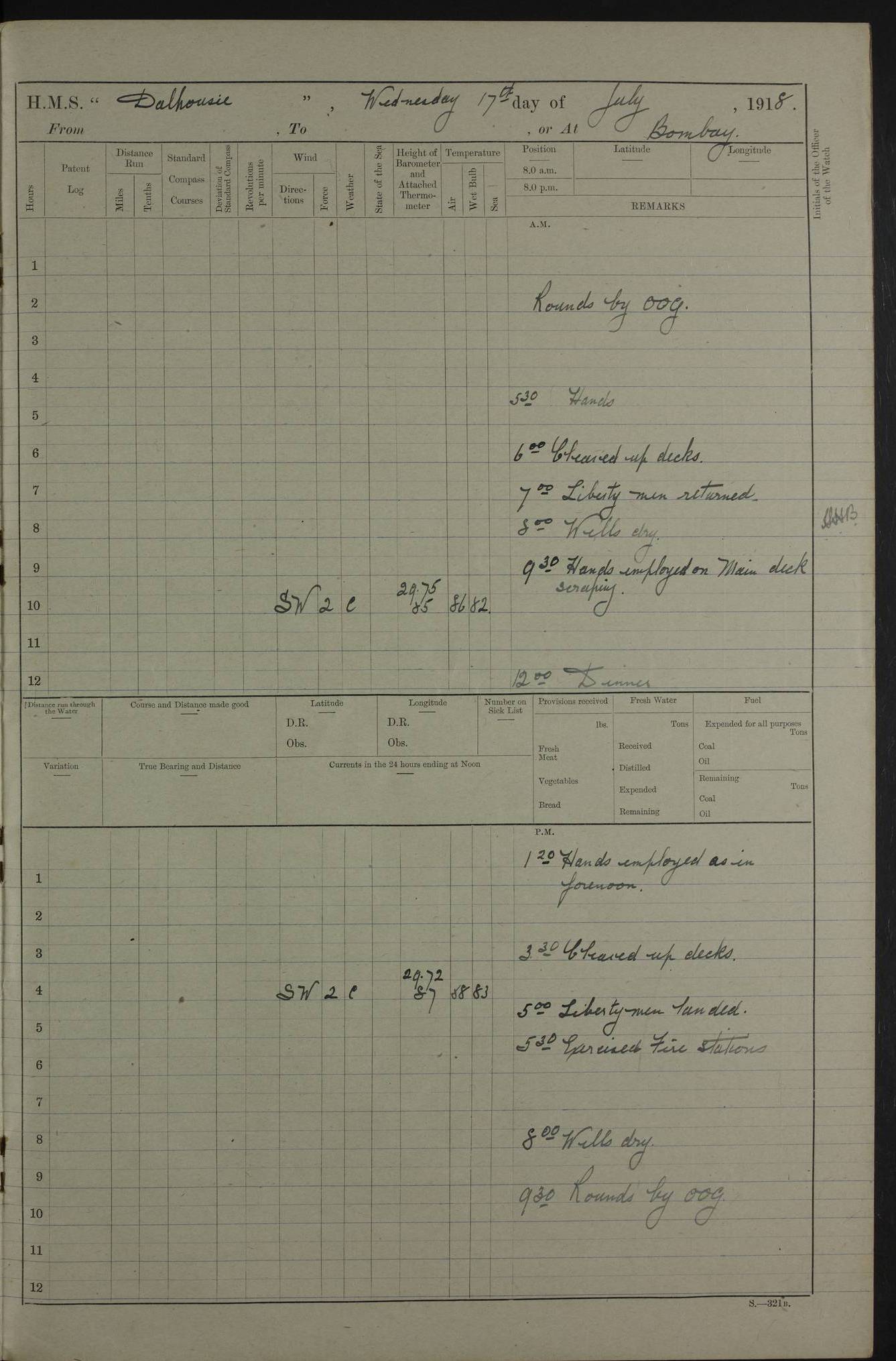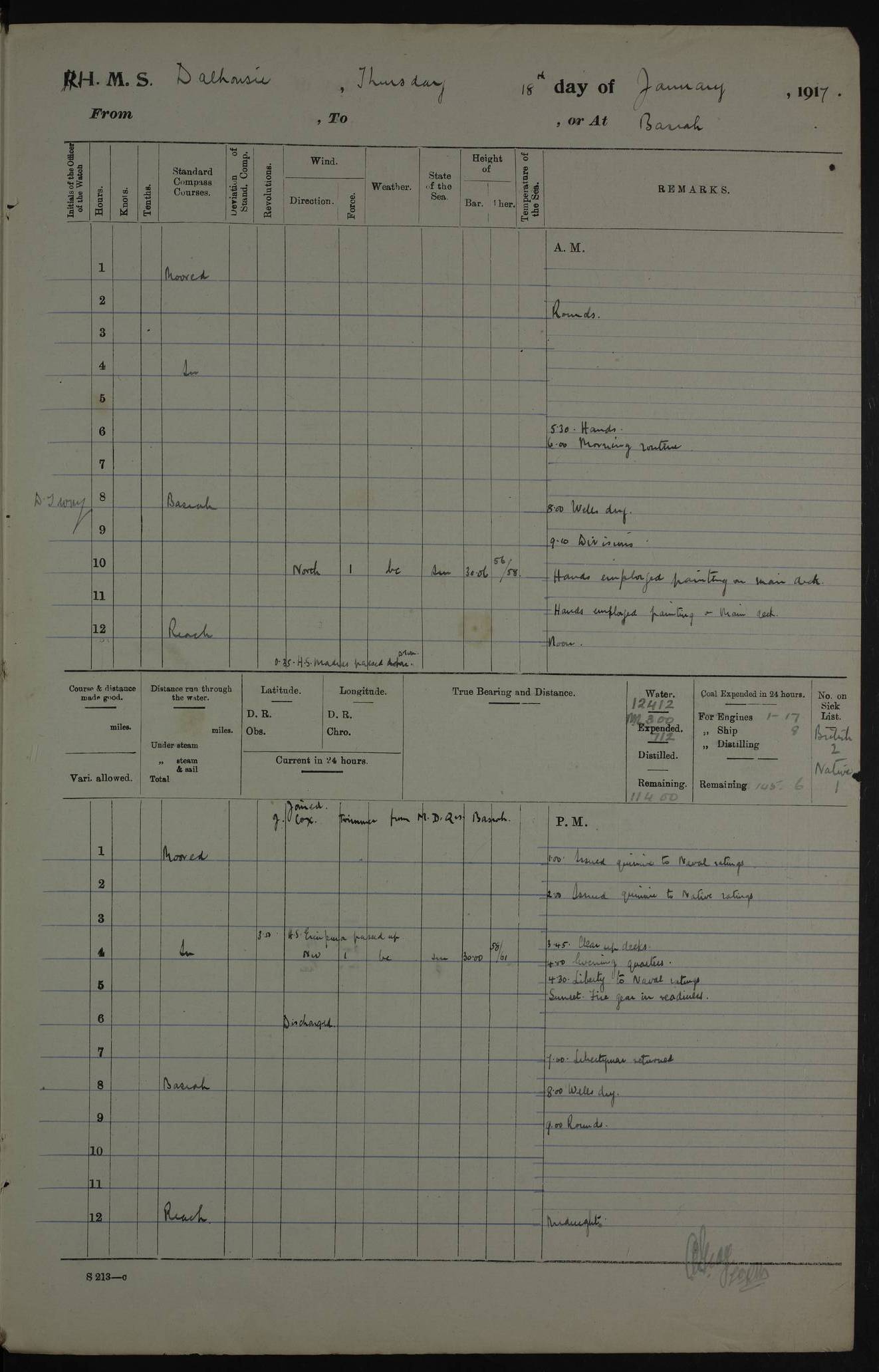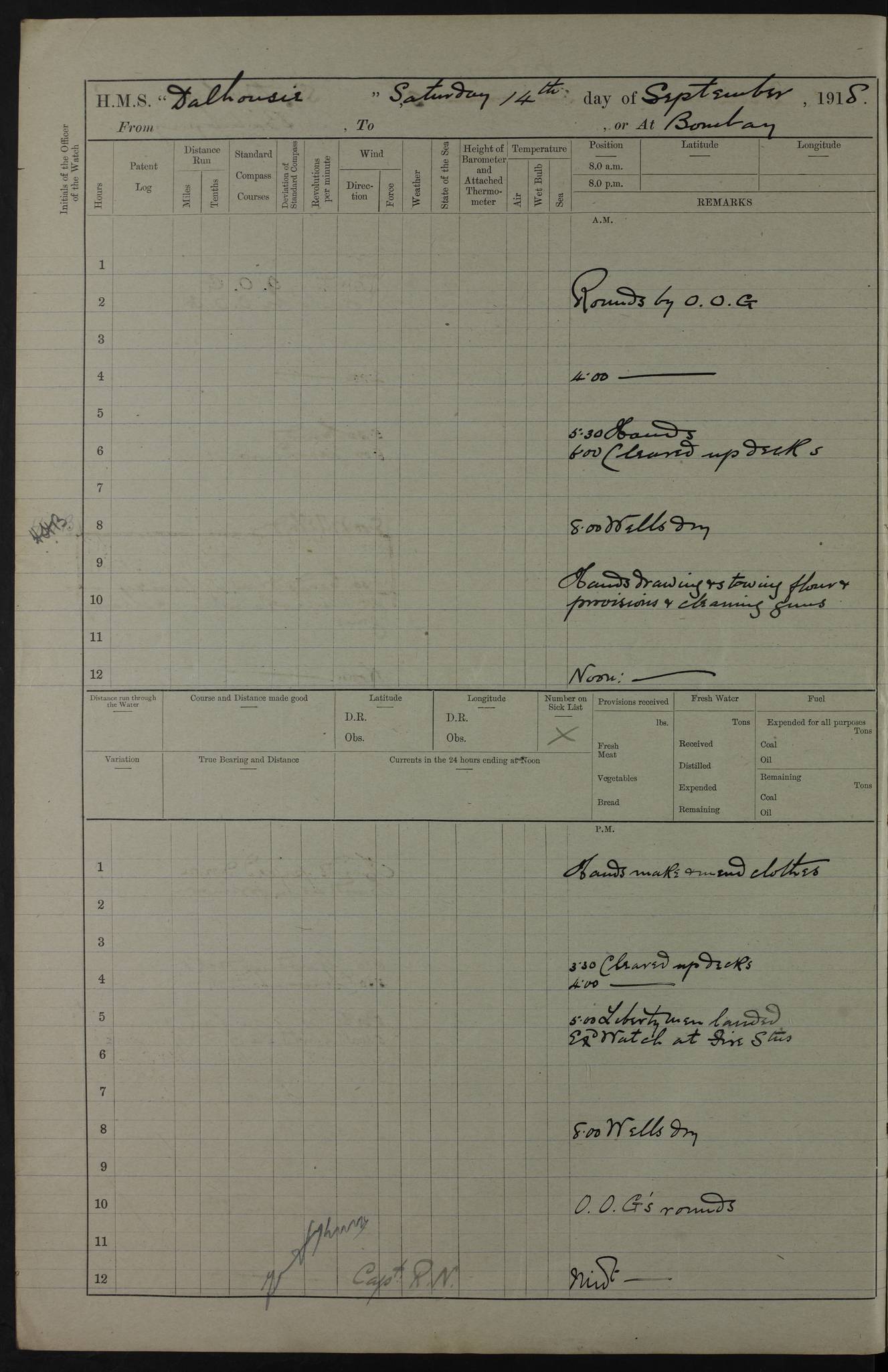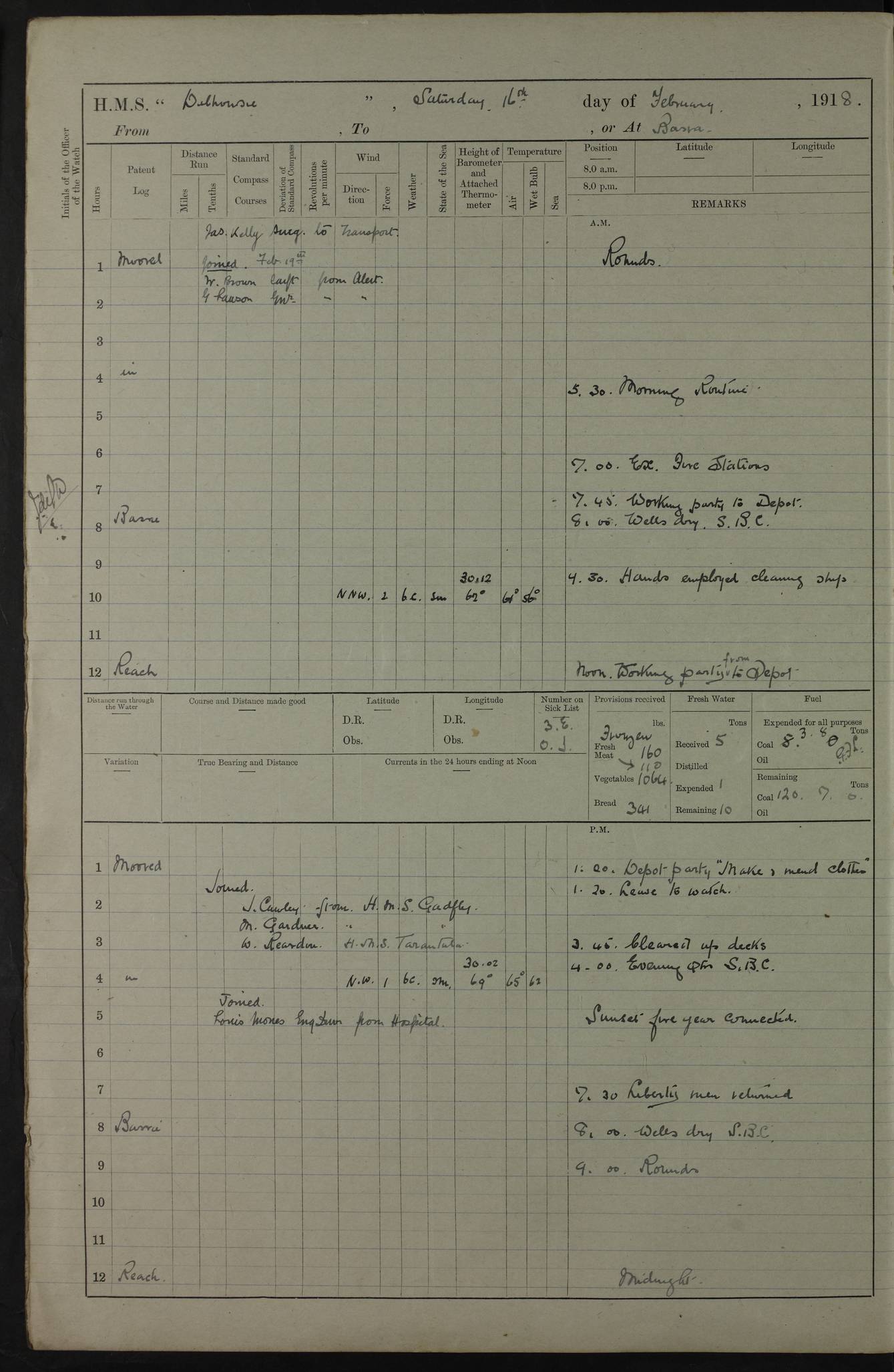 AM – Discharged To EKMA: PJ O’Connor, Lieutenant Royal Navy To Passage: 2 Indian Ratings To FLYCATCHER: D Butcher, Leading Seaman 4ef4fb19e53e0a0c910059d0: (https://s3.amazonaws.com:443/oldweather/ADM53-39410/0015_0.jpg) 26 February 1918 Place: Basrah Lat 30.5269, Long 47.8407 2:00am: Rounds 5:30am: Hands 6:00am: Morning Routine 7:45am: Working party to Depot 8:00am: Wells dry - Signal Books correct 9:10am: Divisions 10:00am: Hands employed painting in cabins & as requisite 12:00pm: Signal Books correct – Working party returned 1:20pm: Working party to Depot 3:45pm: Cleared up decks 4:00pm: Evening Quarters – Signal Books correct 4:30pm: Working party returned 5:10pm: Leave to Watch 6:00pm: Sunset - Fire Gear connected 7:30pm: Liberty men returned 8:00pm: Wells dry - Signal Books correct 9:00pm: Rounds – Signal Books correct PM – Joined From TARANTULA: J Baldwin, Leading Signalman From Hospital: Louis Mones, Engineering driver PM - Discharged To MANTIS: G Munay, Leading Signalman – C Killburn, Signalman To TARANTULA: CM Leary, Telegrapher 4ef4fb19e53e0a0c910059d1: (https://s3.amazonaws.com:443/oldweather/ADM53-39410/0015_1.jpg) 27 February 1918 Place: Basrah Lat 30.5269, Long 47.8407 2:00am: Rounds 5:30am: Hands 6:00am: Morning Routine 7:45am: Working party to Depot 8:00am: Wells dry - Signal Books correct 9:10am: Divisions 10:00am: Hands employed packing surveyed stores, cleaning out boats & painting in Warrant Ratings 12:00pm: Signal Books correct – Working party returned 1:20pm: Working party to Depot 3:45pm: Cleared up decks 4:00pm: Evening Quarters – Signal Books correct 4:30pm: Working party returned 5:10pm: Leave to Watch 6:00pm: Sunset - Fire Gear connected 7:30pm: Liberty men returned 8:00pm: Wells dry - Signal Books correct 9:00pm: Rounds – Signal Books correct AM – Joined From ELEPHANTA: No. 22 Sheik Kadir Sheik Mahomed, Lascar 2nd – No. 41 Abdool Rahman Sheik Dawood, Lamp Trimmer – No. 56 Mahomed Sabia Sheik Bosman, Stoker 2nd – No. 50A Sheik Mahomed Sheik Hassan, Stoker 2nd – No. 90 Abelino Fernandez, Topass – No. 86 Avelino Leitas, Topass 4ef4fb1ae53e0a0c910059d2: (https://s3.amazonaws.com:443/oldweather/ADM53-39410/0016_0.jpg) 28 February 1918 Place: Basrah Lat 30.5269, Long 47.8407 2:00am: Rounds 5:30am: Hands 6:00am: Morning Routine 7:45am: Working party to Depot 8:00am: Wells dry - Signal Books correct 9:10am: Divisions 10:00am: Hands employed discharging stores 12:00pm: Signal Books correct – Working party returned 1:00pm: Issued Quinine to Naval Ratings - Issued Quinine to Native Ratings 1:20pm: Working party to Depot 3:45pm: Cleared up decks 4:00pm: Evening Quarters – Signal Books correct 4:30pm: Working party returned 5:10pm: Leave to Watch 6:00pm: Sunset - Fire Gear connected 7:30pm: Liberty men returned 8:00pm: Wells dry - Signal Books correct 9:00pm: Rounds – Signal Books correct PM – Joined From SAPPHIRE: WC Woolley, Petty Officer PM - Discharged To TARANTULA: L Harris, Signalman To SEDGEFLY: T Hughes, Able Seaman To MANTIS: S Redshaw, Able Seaman To Depot: R Matheison, Stoker – H Philo, Stoker TO GRAYFLY: H Stockbridge, Senior Petty Officer 4ef4fb1ae53e0a0c910059d3: (https://s3.amazonaws.com:443/oldweather/ADM53-39410/0016_1.jpg) Log Page – Blank – no data on Page 4ef4fb1ae53e0a0c910059d4: (https://s3.amazonaws.com:443/oldweather/ADM53-39410/0017_0.jpg) Log Page – Blank – no data on Page 4ef4fb1ae53e0a0c910059d5: (https://s3.amazonaws.com:443/oldweather/ADM53-39410/0017_1.jpg) Log Page – Blank 4ef4fb1ae53e0a0c910059d6: (https://s3.amazonaws.com:443/oldweather/ADM53-39410/0018_0.jpg) Log Page – Blank 4ef4fb1ae53e0a0c910059d7: (https://s3.amazonaws.com:443/oldweather/ADM53-39410/0018_1.jpg) Log Page – Blank LOGS FOR MARCH 1918 4ef4fb1be53e0a0c910059d8: (https://s3.amazonaws.com:443/oldweather/ADM53-39411/0000_0.jpg) Log Page – Cover March 1918 4ef4fb1be53e0a0c910059d9: (https://s3.amazonaws.com:443/oldweather/ADM53-39411/0000_1.jpg) Log Page – Cover – March 1918 4ef4fb1be53e0a0c910059da: (https://s3.amazonaws.com:443/oldweather/ADM53-39411/0001_0.jpg) Log Page – Blank 4ef4fb1be53e0a0c910059db: (https://s3.amazonaws.com:443/oldweather/ADM53-39411/0001_1.jpg) Log Page – Blank – no data on Page 4ef4fb1ce53e0a0c910059dc: (https://s3.amazonaws.com:443/oldweather/ADM53-39411/0002_0.jpg) Log Page – Blank – no data on Page 4ef4fb1ce53e0a0c910059dd: (https://s3.amazonaws.com:443/oldweather/ADM53-39411/0002_1.jpg) 1 March 1918 Place: Basrah Lat 30.5269, Long 47.8407 1:00am: drew from Field Chest Treasury Officer Basrah Five thousand (5,000) Rupees only 2:00am: Rounds 5:30am: Hands 6:00am: Morning Routine 7:45am: Working party to Depot 8:00am: Wells dry – Signal Books correct – CHAKLA arrived with 5 Officers & 60 Ratings 12:00pm: Signal Books correct – Working party returned 1:15pm: Working party to Depot 2:00pm: Paid Lascar Ratings 3:45pm: Cleared up decks 4:00pm: Evening Quarters 4:30pm: Working party returned 5:10pm: Leave to Watch 5:30pm: 5 Petty Officers & 57 Ratings to Bandra for Passage 6:00pm: Sunset - Fire Gear connected 7:30pm: Liberty men returned 9:00pm: Rounds – Petty Officers returned AM – Joined From CHALKA: Hawkins, Paymaster Royal Navy PM - Discharged To FLYCATCHER: Dennis, Sub Lieutenant Royal Navy Volunteer Reserve To TARANTULA: L Harris, Signalman To SEDGEFLY: TG Hughes, Able Seaman To MANTIS: S Redshaw, Able Seaman To Depot: R Mathieson, Stoker To GRAYFLY: H Stockbridge, Senior Petty Officer 4ef4fb1ce53e0a0c910059de: (https://s3.amazonaws.com:443/oldweather/ADM53-39411/0003_0.jpg) 2 March 1918 Place: Basrah Lat 30.5269, Long 47.8407 2:00am: Rounds 5:30am: Hands 6:00am: Morning Routine 7:00am: Exercised Fire Stations 7:45am: Working party to Depot 8:00am: Wells dry - Signal Books correct 9:10am: Divisions 10:00am: Hands employed as requisite 12:00pm: Working party returned 1:15pm: Working party to Depot 3:45pm: Cleared up decks 4:00pm: Evening Quarters – Signal Books corr