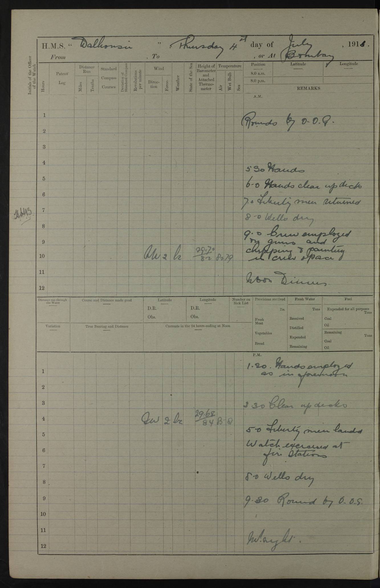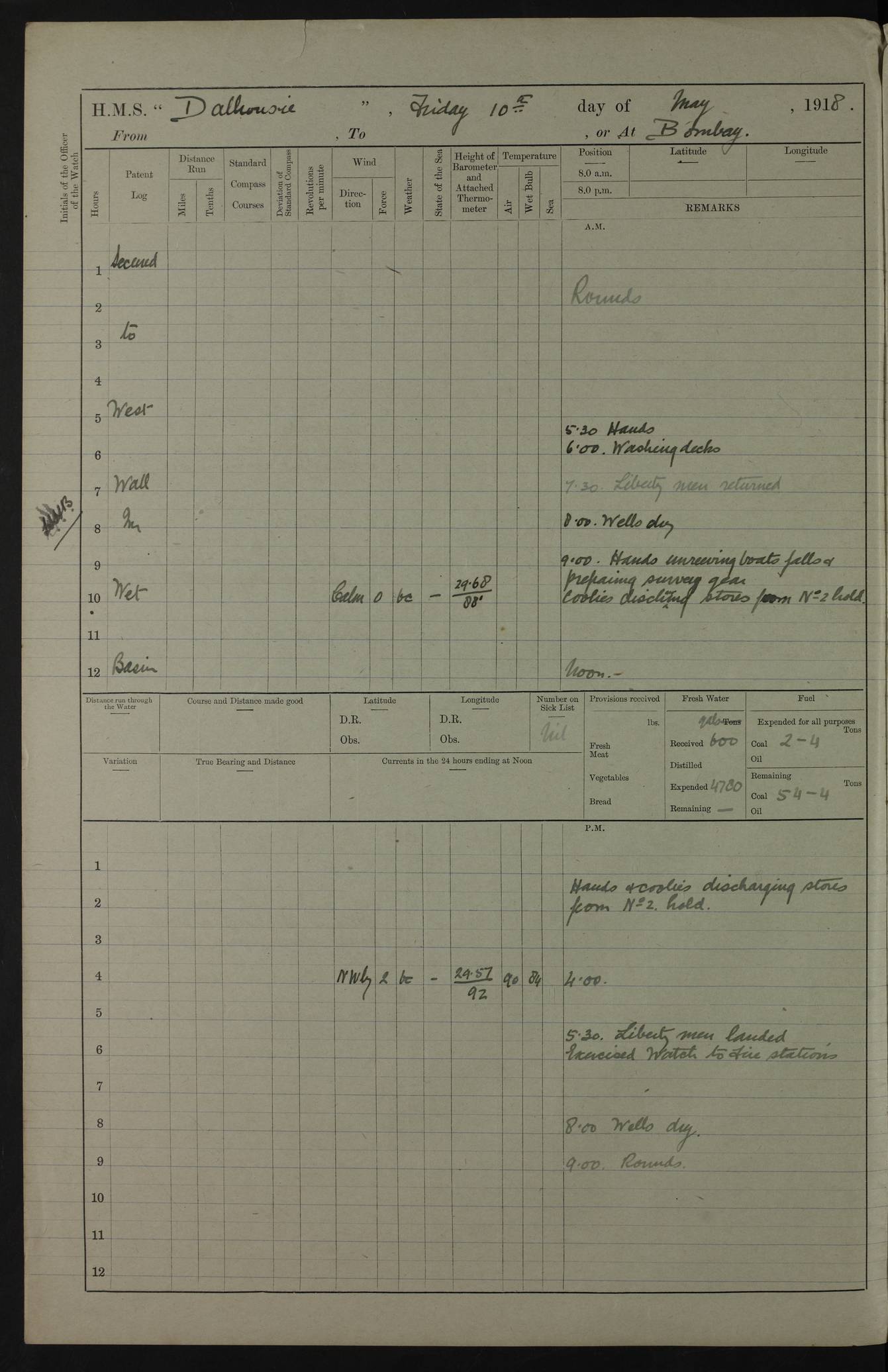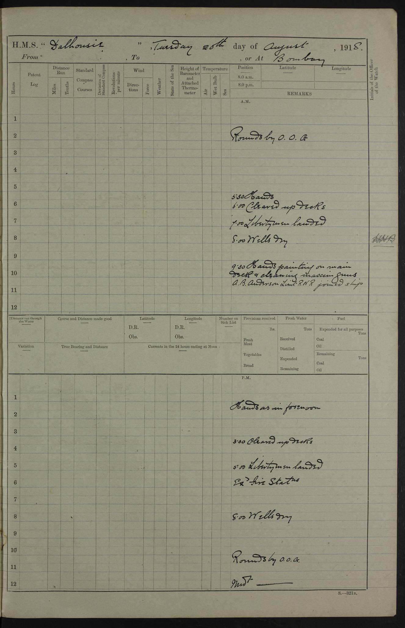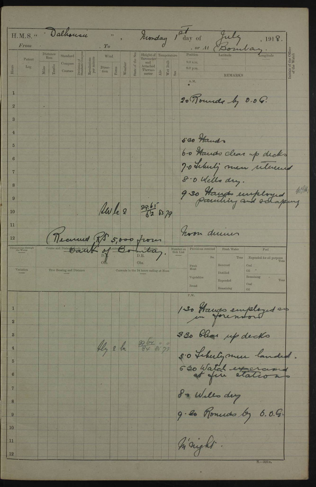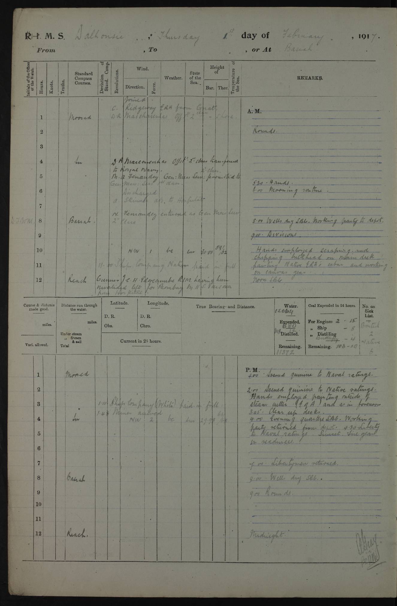 AM – Discharged To EKMA: PJ O’Connor, Lieutenant Royal Navy To Passage: 2 Indian Ratings To FLYCATCHER: D Butcher, Leading Seaman 4ef4fb19e53e0a0c910059d0: (https://s3.amazonaws.com:443/oldweather/ADM53-39410/0015_0.jpg) 26 February 1918 Place: Basrah Lat 30.5269, Long 47.8407 2:00am: Rounds 5:30am: Hands 6:00am: Morning Routine 7:45am: Working party to Depot 8:00am: Wells dry - Signal Books correct 9:10am: Divisions 10:00am: Hands employed painting in cabins & as requisite 12:00pm: Signal Books correct – Working party returned 1:20pm: Working party to Depot 3:45pm: Cleared up decks 4:00pm: Evening Quarters – Signal Books correct 4:30pm: Working party returned 5:10pm: Leave to Watch 6:00pm: Sunset - Fire Gear connected 7:30pm: Liberty men returned 8:00pm: Wells dry - Signal Books correct 9:00pm: Rounds – Signal Books correct PM – Joined From TARANTULA: J Baldwin, Leading Signalman From Hospital: Louis Mones, Engineering driver PM - Discharged To MANTIS: G Munay, Leading Signalman – C Killburn, Signalman To TARANTULA: CM Leary, Telegrapher 4ef4fb19e53e0a0c910059d1: (https://s3.amazonaws.com:443/oldweather/ADM53-39410/0015_1.jpg) 27 February 1918 Place: Basrah Lat 30.5269, Long 47.8407 2:00am: Rounds 5:30am: Hands 6:00am: Morning Routine 7:45am: Working party to Depot 8:00am: Wells dry - Signal Books correct 9:10am: Divisions 10:00am: Hands employed packing surveyed stores, cleaning out boats & painting in Warrant Ratings 12:00pm: Signal Books correct – Working party returned 1:20pm: Working party to Depot 3:45pm: Cleared up decks 4:00pm: Evening Quarters – Signal Books correct 4:30pm: Working party returned 5:10pm: Leave to Watch 6:00pm: Sunset - Fire Gear connected 7:30pm: Liberty men returned 8:00pm: Wells dry - Signal Books correct 9:00pm: Rounds – Signal Books correct AM – Joined From ELEPHANTA: No. 22 Sheik Kadir Sheik Mahomed, Lascar 2nd – No. 41 Abdool Rahman Sheik Dawood, Lamp Trimmer – No. 56 Mahomed Sabia Sheik Bosman, Stoker 2nd – No. 50A Sheik Mahomed Sheik Hassan, Stoker 2nd – No. 90 Abelino Fernandez, Topass – No. 86 Avelino Leitas, Topass 4ef4fb1ae53e0a0c910059d2: (https://s3.amazonaws.com:443/oldweather/ADM53-39410/0016_0.jpg) 28 February 1918 Place: Basrah Lat 30.5269, Long 47.8407 2:00am: Rounds 5:30am: Hands 6:00am: Morning Routine 7:45am: Working party to Depot 8:00am: Wells dry - Signal Books correct 9:10am: Divisions 10:00am: Hands employed discharging stores 12:00pm: Signal Books correct – Working party returned 1:00pm: Issued Quinine to Naval Ratings - Issued Quinine to Native Ratings 1:20pm: Working party to Depot 3:45pm: Cleared up decks 4:00pm: Evening Quarters – Signal Books correct 4:30pm: Working party returned 5:10pm: Leave to Watch 6:00pm: Sunset - Fire Gear connected 7:30pm: Liberty men returned 8:00pm: Wells dry - Signal Books correct 9:00pm: Rounds – Signal Books correct PM – Joined From SAPPHIRE: WC Woolley, Petty Officer PM - Discharged To TARANTULA: L Harris, Signalman To SEDGEFLY: T Hughes, Able Seaman To MANTIS: S Redshaw, Able Seaman To Depot: R Matheison, Stoker – H Philo, Stoker TO GRAYFLY: H Stockbridge, Senior Petty Officer 4ef4fb1ae53e0a0c910059d3: (https://s3.amazonaws.com:443/oldweather/ADM53-39410/0016_1.jpg) Log Page – Blank – no data on Page 4ef4fb1ae53e0a0c910059d4: (https://s3.amazonaws.com:443/oldweather/ADM53-39410/0017_0.jpg) Log Page – Blank – no data on Page 4ef4fb1ae53e0a0c910059d5: (https://s3.amazonaws.com:443/oldweather/ADM53-39410/0017_1.jpg) Log Page – Blank 4ef4fb1ae53e0a0c910059d6: (https://s3.amazonaws.com:443/oldweather/ADM53-39410/0018_0.jpg) Log Page – Blank 4ef4fb1ae53e0a0c910059d7: (https://s3.amazonaws.com:443/oldweather/ADM53-39410/0018_1.jpg) Log Page – Blank LOGS FOR MARCH 1918 4ef4fb1be53e0a0c910059d8: (https://s3.amazonaws.com:443/oldweather/ADM53-39411/0000_0.jpg) Log Page – Cover March 1918 4ef4fb1be53e0a0c910059d9: (https://s3.amazonaws.com:443/oldweather/ADM53-39411/0000_1.jpg) Log Page – Cover – March 1918 4ef4fb1be53e0a0c910059da: (https://s3.amazonaws.com:443/oldweather/ADM53-39411/0001_0.jpg) Log Page – Blank 4ef4fb1be53e0a0c910059db: (https://s3.amazonaws.com:443/oldweather/ADM53-39411/0001_1.jpg) Log Page – Blank – no data on Page 4ef4fb1ce53e0a0c910059dc: (https://s3.amazonaws.com:443/oldweather/ADM53-39411/0002_0.jpg) Log Page – Blank – no data on Page 4ef4fb1ce53e0a0c910059dd: (https://s3.amazonaws.com:443/oldweather/ADM53-39411/0002_1.jpg) 1 March 1918 Place: Basrah Lat 30.5269, Long 47.8407 1:00am: drew from Field Chest Treasury Officer Basrah Five thousand (5,000) Rupees only 2:00am: Rounds 5:30am: Hands 6:00am: Morning Routine 7:45am: Working party to Depot 8:00am: Wells dry – Signal Books correct – CHAKLA arrived with 5 Officers & 60 Ratings 12:00pm: Signal Books correct – Working party returned 1:15pm: Working party to Depot 2:00pm: Paid Lascar Ratings 3:45pm: Cleared up decks 4:00pm: Evening Quarters 4:30pm: Working party returned 5:10pm: Leave to Watch 5:30pm: 5 Petty Officers & 57 Ratings to Bandra for Passage 6:00pm: Sunset - Fire Gear connected 7:30pm: Liberty men returned 9:00pm: Rounds – Petty Officers returned AM – Joined From CHALKA: Hawkins, Paymaster Royal Navy PM - Discharged To FLYCATCHER: Dennis, Sub Lieutenant Royal Navy Volunteer Reserve To TARANTULA: L Harris, Signalman To SEDGEFLY: TG Hughes, Able Seaman To MANTIS: S Redshaw, Able Seaman To Depot: R Mathieson, Stoker To GRAYFLY: H Stockbridge, Senior Petty Officer 4ef4fb1ce53e0a0c910059de: (https://s3.amazonaws.com:443/oldweather/ADM53-39411/0003_0.jpg) 2 March 1918 Place: Basrah Lat 30.5269, Long 47.8407 2:00am: Rounds 5:30am: Hands 6:00am: Morning Routine 7:00am: Exercised Fire Stations 7:45am: Working party to Depot 8:00am: Wells dry - Signal Books correct 9:10am: Divisions 10:00am: Hands employed as requisite 12:00pm: Working party returned 1:15pm: Working party to Depot 3:45pm: Cleared up decks 4:00pm: Evening Quarters – Signal Books corr