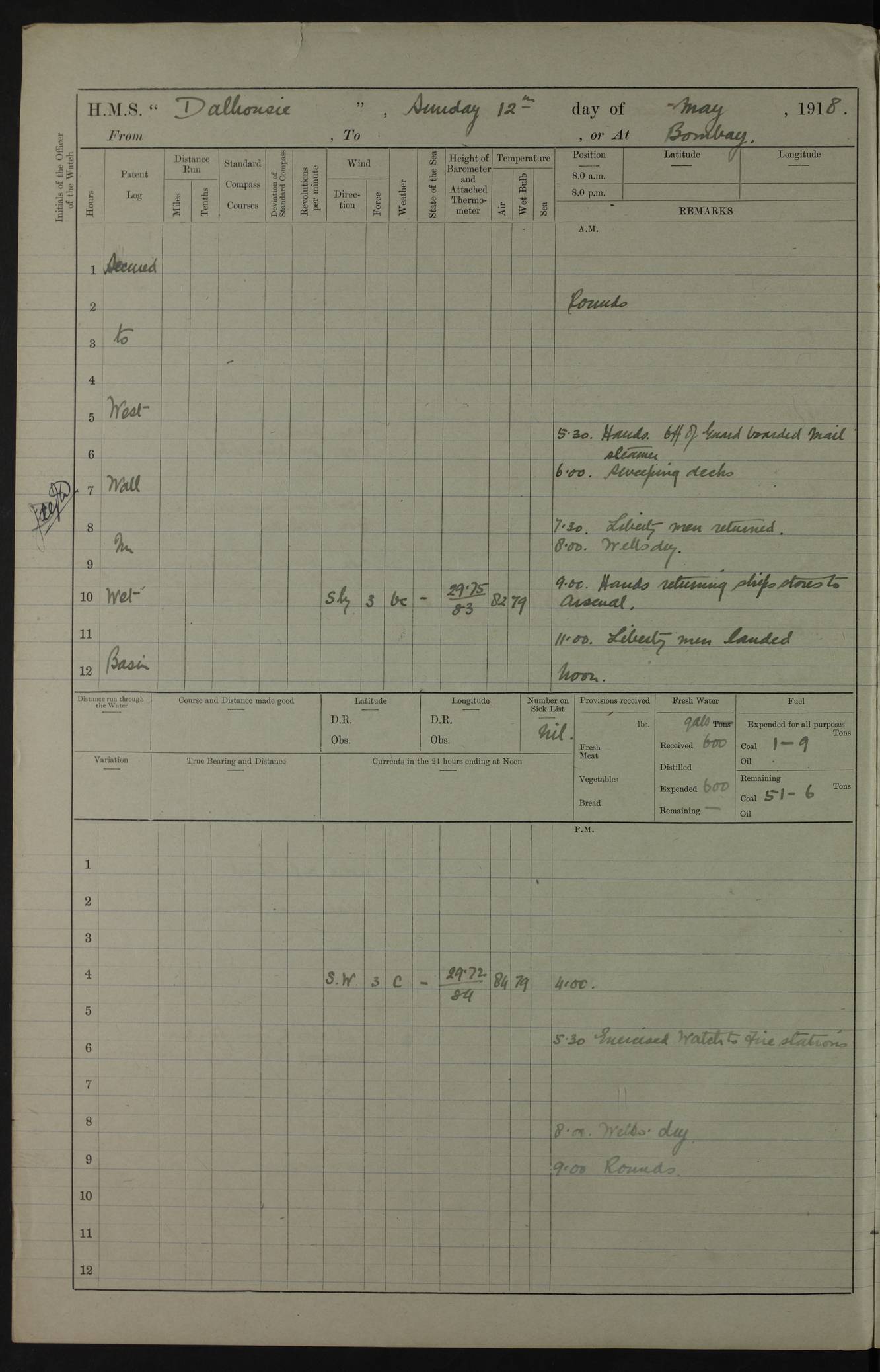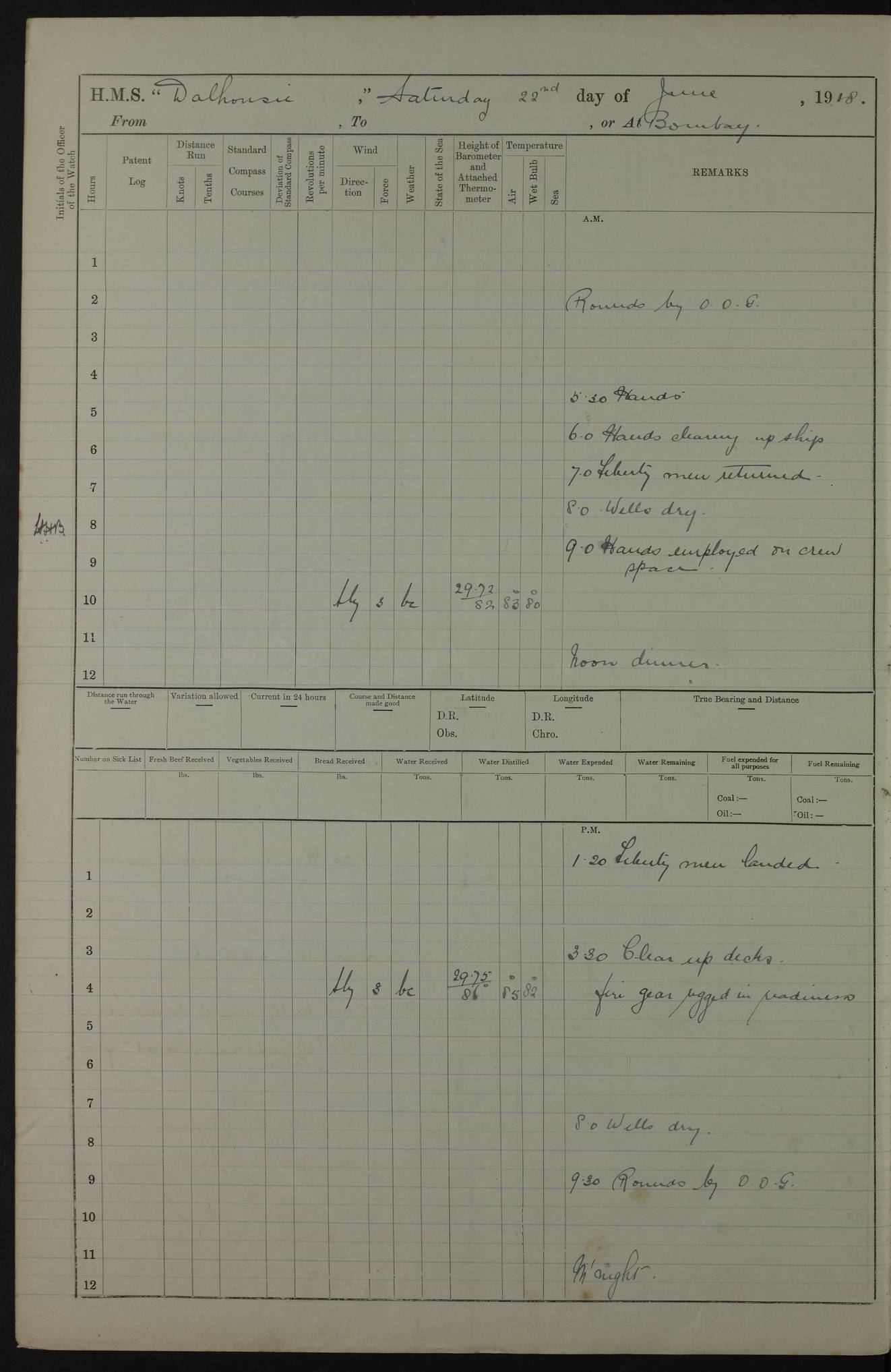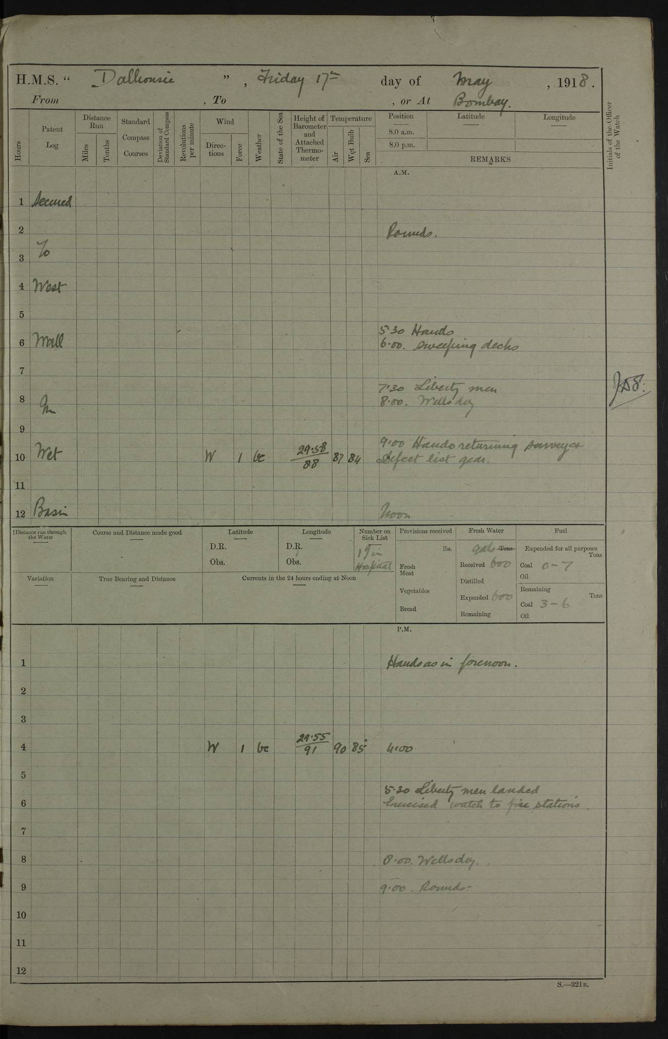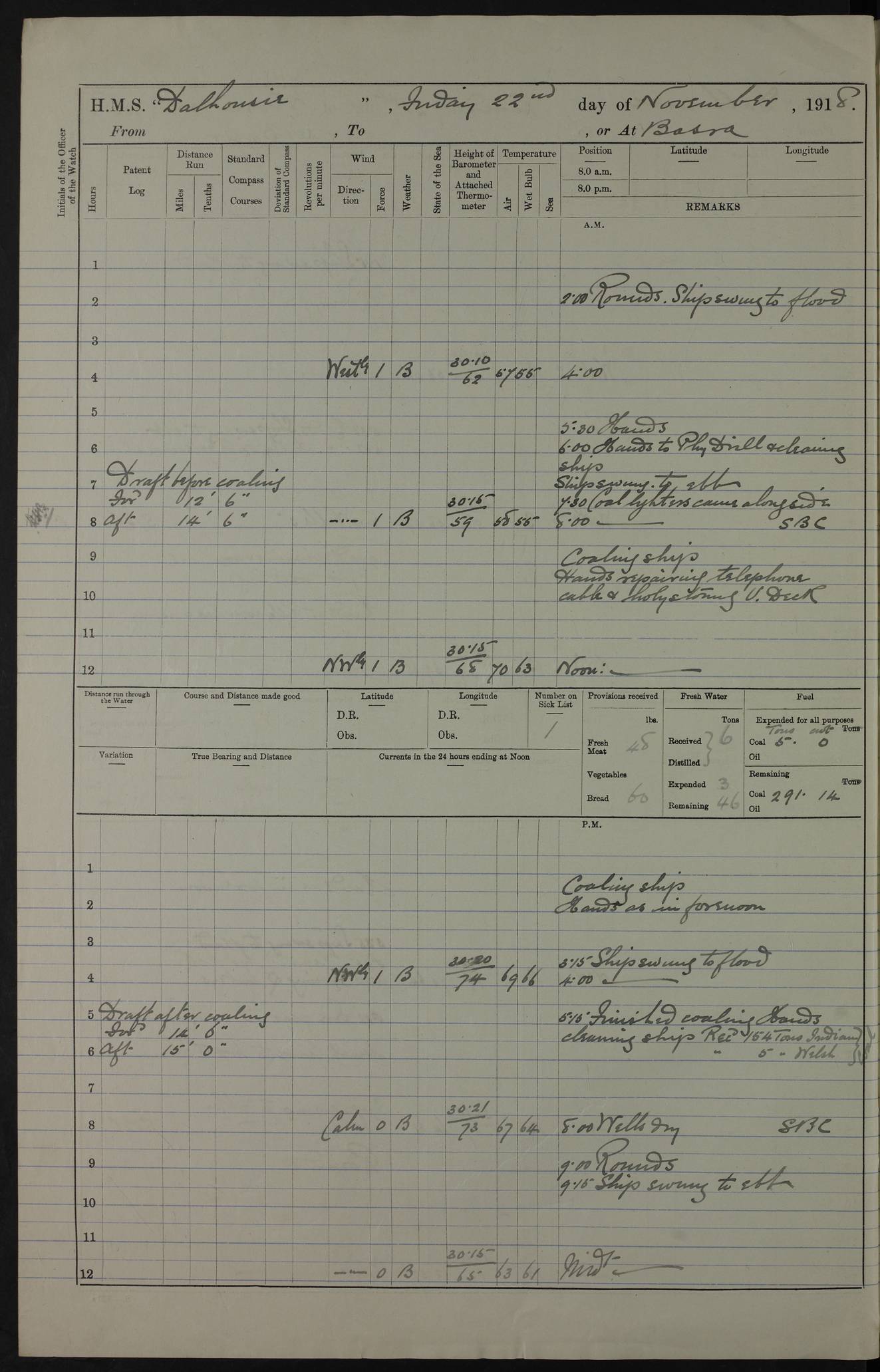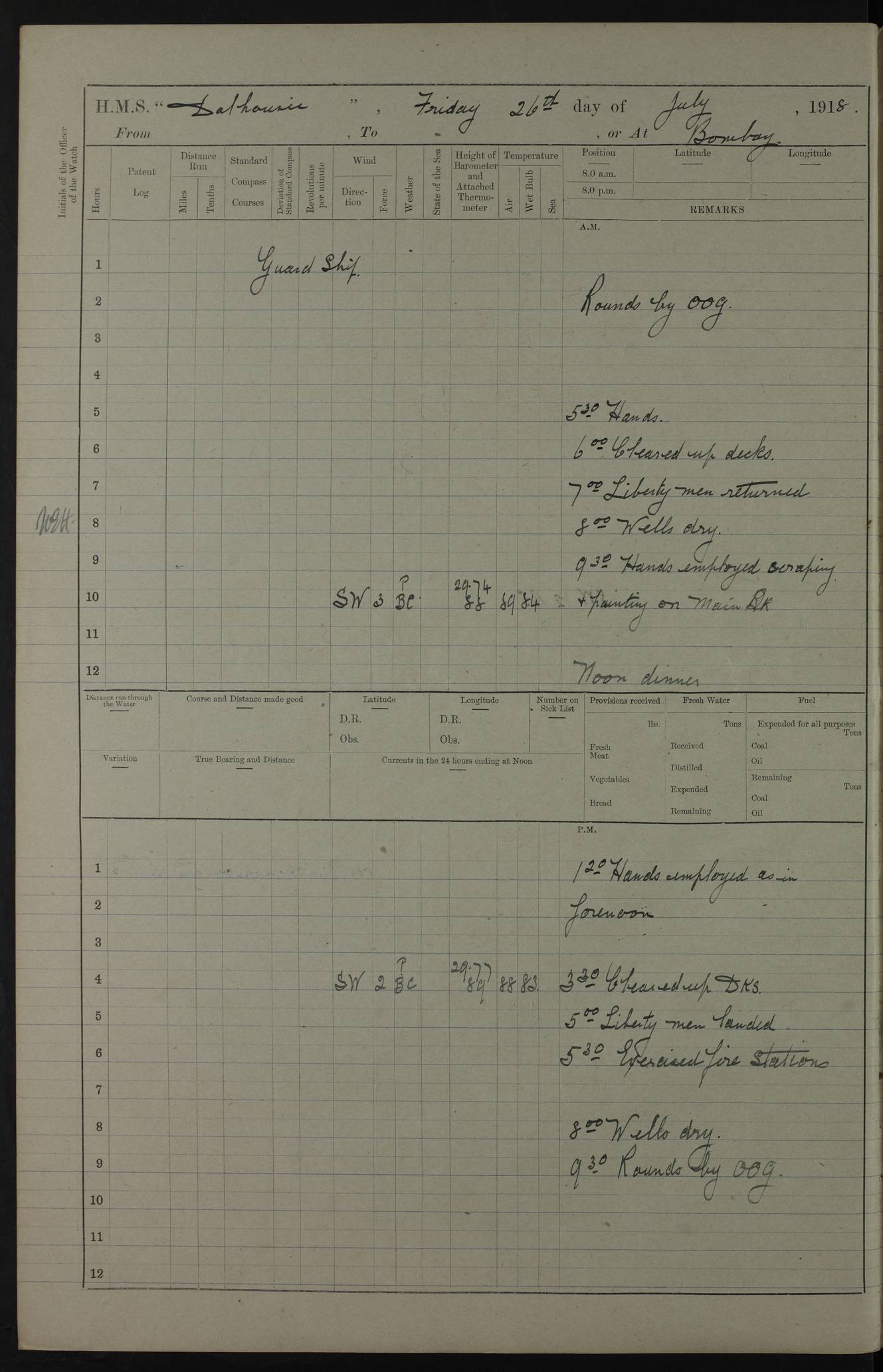 AM – Discharged To EKMA: PJ O’Connor, Lieutenant Royal Navy To Passage: 2 Indian Ratings To FLYCATCHER: D Butcher, Leading Seaman 4ef4fb19e53e0a0c910059d0: (https://s3.amazonaws.com:443/oldweather/ADM53-39410/0015_0.jpg) 26 February 1918 Place: Basrah Lat 30.5269, Long 47.8407 2:00am: Rounds 5:30am: Hands 6:00am: Morning Routine 7:45am: Working party to Depot 8:00am: Wells dry - Signal Books correct 9:10am: Divisions 10:00am: Hands employed painting in cabins & as requisite 12:00pm: Signal Books correct – Working party returned 1:20pm: Working party to Depot 3:45pm: Cleared up decks 4:00pm: Evening Quarters – Signal Books correct 4:30pm: Working party returned 5:10pm: Leave to Watch 6:00pm: Sunset - Fire Gear connected 7:30pm: Liberty men returned 8:00pm: Wells dry - Signal Books correct 9:00pm: Rounds – Signal Books correct PM – Joined From TARANTULA: J Baldwin, Leading Signalman From Hospital: Louis Mones, Engineering driver PM - Discharged To MANTIS: G Munay, Leading Signalman – C Killburn, Signalman To TARANTULA: CM Leary, Telegrapher 4ef4fb19e53e0a0c910059d1: (https://s3.amazonaws.com:443/oldweather/ADM53-39410/0015_1.jpg) 27 February 1918 Place: Basrah Lat 30.5269, Long 47.8407 2:00am: Rounds 5:30am: Hands 6:00am: Morning Routine 7:45am: Working party to Depot 8:00am: Wells dry - Signal Books correct 9:10am: Divisions 10:00am: Hands employed packing surveyed stores, cleaning out boats & painting in Warrant Ratings 12:00pm: Signal Books correct – Working party returned 1:20pm: Working party to Depot 3:45pm: Cleared up decks 4:00pm: Evening Quarters – Signal Books correct 4:30pm: Working party returned 5:10pm: Leave to Watch 6:00pm: Sunset - Fire Gear connected 7:30pm: Liberty men returned 8:00pm: Wells dry - Signal Books correct 9:00pm: Rounds – Signal Books correct AM – Joined From ELEPHANTA: No. 22 Sheik Kadir Sheik Mahomed, Lascar 2nd – No. 41 Abdool Rahman Sheik Dawood, Lamp Trimmer – No. 56 Mahomed Sabia Sheik Bosman, Stoker 2nd – No. 50A Sheik Mahomed Sheik Hassan, Stoker 2nd – No. 90 Abelino Fernandez, Topass – No. 86 Avelino Leitas, Topass 4ef4fb1ae53e0a0c910059d2: (https://s3.amazonaws.com:443/oldweather/ADM53-39410/0016_0.jpg) 28 February 1918 Place: Basrah Lat 30.5269, Long 47.8407 2:00am: Rounds 5:30am: Hands 6:00am: Morning Routine 7:45am: Working party to Depot 8:00am: Wells dry - Signal Books correct 9:10am: Divisions 10:00am: Hands employed discharging stores 12:00pm: Signal Books correct – Working party returned 1:00pm: Issued Quinine to Naval Ratings - Issued Quinine to Native Ratings 1:20pm: Working party to Depot 3:45pm: Cleared up decks 4:00pm: Evening Quarters – Signal Books correct 4:30pm: Working party returned 5:10pm: Leave to Watch 6:00pm: Sunset - Fire Gear connected 7:30pm: Liberty men returned 8:00pm: Wells dry - Signal Books correct 9:00pm: Rounds – Signal Books correct PM – Joined From SAPPHIRE: WC Woolley, Petty Officer PM - Discharged To TARANTULA: L Harris, Signalman To SEDGEFLY: T Hughes, Able Seaman To MANTIS: S Redshaw, Able Seaman To Depot: R Matheison, Stoker – H Philo, Stoker TO GRAYFLY: H Stockbridge, Senior Petty Officer 4ef4fb1ae53e0a0c910059d3: (https://s3.amazonaws.com:443/oldweather/ADM53-39410/0016_1.jpg) Log Page – Blank – no data on Page 4ef4fb1ae53e0a0c910059d4: (https://s3.amazonaws.com:443/oldweather/ADM53-39410/0017_0.jpg) Log Page – Blank – no data on Page 4ef4fb1ae53e0a0c910059d5: (https://s3.amazonaws.com:443/oldweather/ADM53-39410/0017_1.jpg) Log Page – Blank 4ef4fb1ae53e0a0c910059d6: (https://s3.amazonaws.com:443/oldweather/ADM53-39410/0018_0.jpg) Log Page – Blank 4ef4fb1ae53e0a0c910059d7: (https://s3.amazonaws.com:443/oldweather/ADM53-39410/0018_1.jpg) Log Page – Blank LOGS FOR MARCH 1918 4ef4fb1be53e0a0c910059d8: (https://s3.amazonaws.com:443/oldweather/ADM53-39411/0000_0.jpg) Log Page – Cover March 1918 4ef4fb1be53e0a0c910059d9: (https://s3.amazonaws.com:443/oldweather/ADM53-39411/0000_1.jpg) Log Page – Cover – March 1918 4ef4fb1be53e0a0c910059da: (https://s3.amazonaws.com:443/oldweather/ADM53-39411/0001_0.jpg) Log Page – Blank 4ef4fb1be53e0a0c910059db: (https://s3.amazonaws.com:443/oldweather/ADM53-39411/0001_1.jpg) Log Page – Blank – no data on Page 4ef4fb1ce53e0a0c910059dc: (https://s3.amazonaws.com:443/oldweather/ADM53-39411/0002_0.jpg) Log Page – Blank – no data on Page 4ef4fb1ce53e0a0c910059dd: (https://s3.amazonaws.com:443/oldweather/ADM53-39411/0002_1.jpg) 1 March 1918 Place: Basrah Lat 30.5269, Long 47.8407 1:00am: drew from Field Chest Treasury Officer Basrah Five thousand (5,000) Rupees only 2:00am: Rounds 5:30am: Hands 6:00am: Morning Routine 7:45am: Working party to Depot 8:00am: Wells dry – Signal Books correct – CHAKLA arrived with 5 Officers & 60 Ratings 12:00pm: Signal Books correct – Working party returned 1:15pm: Working party to Depot 2:00pm: Paid Lascar Ratings 3:45pm: Cleared up decks 4:00pm: Evening Quarters 4:30pm: Working party returned 5:10pm: Leave to Watch 5:30pm: 5 Petty Officers & 57 Ratings to Bandra for Passage 6:00pm: Sunset - Fire Gear connected 7:30pm: Liberty men returned 9:00pm: Rounds – Petty Officers returned AM – Joined From CHALKA: Hawkins, Paymaster Royal Navy PM - Discharged To FLYCATCHER: Dennis, Sub Lieutenant Royal Navy Volunteer Reserve To TARANTULA: L Harris, Signalman To SEDGEFLY: TG Hughes, Able Seaman To MANTIS: S Redshaw, Able Seaman To Depot: R Mathieson, Stoker To GRAYFLY: H Stockbridge, Senior Petty Officer 4ef4fb1ce53e0a0c910059de: (https://s3.amazonaws.com:443/oldweather/ADM53-39411/0003_0.jpg) 2 March 1918 Place: Basrah Lat 30.5269, Long 47.8407 2:00am: Rounds 5:30am: Hands 6:00am: Morning Routine 7:00am: Exercised Fire Stations 7:45am: Working party to Depot 8:00am: Wells dry - Signal Books correct 9:10am: Divisions 10:00am: Hands employed as requisite 12:00pm: Working party returned 1:15pm: Working party to Depot 3:45pm: Cleared up decks 4:00pm: Evening Quarters – Signal Books corr