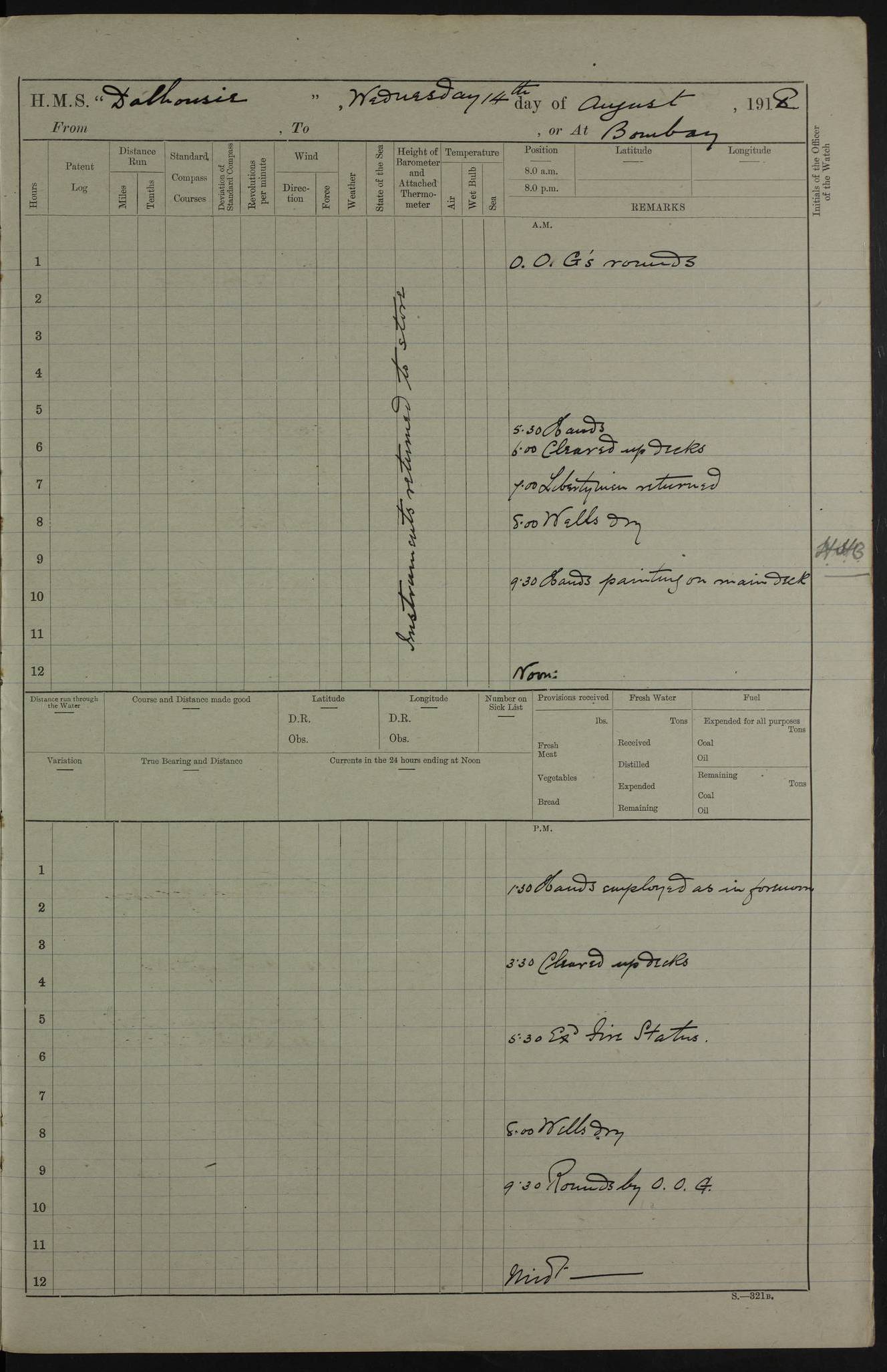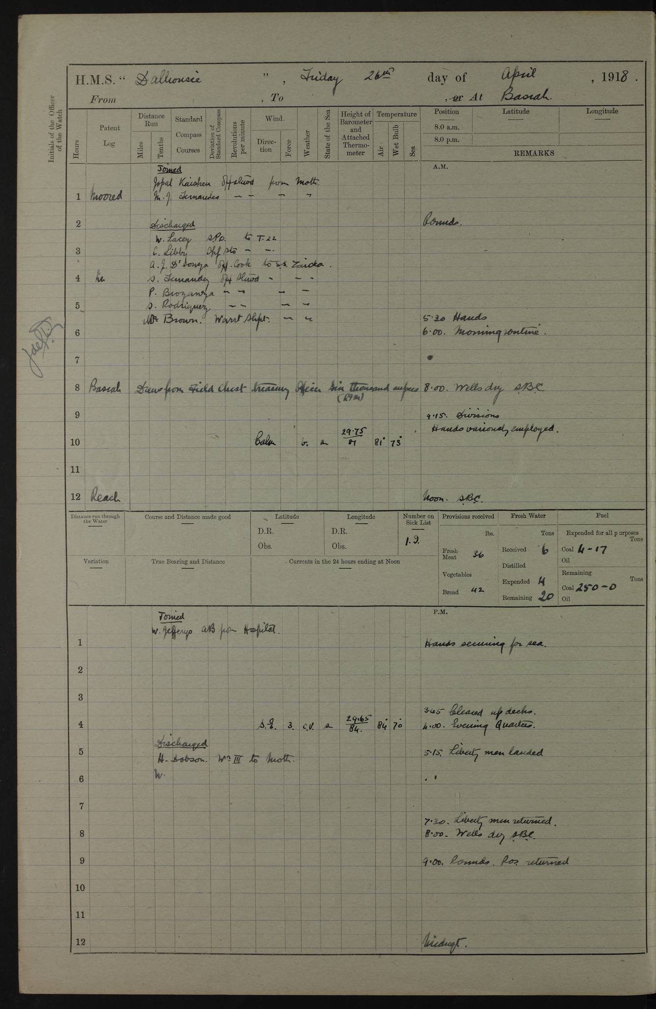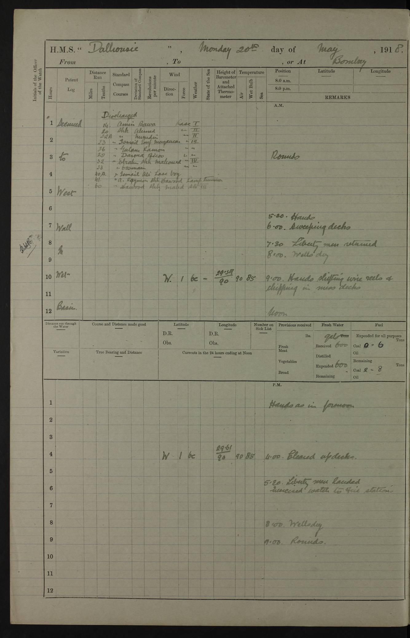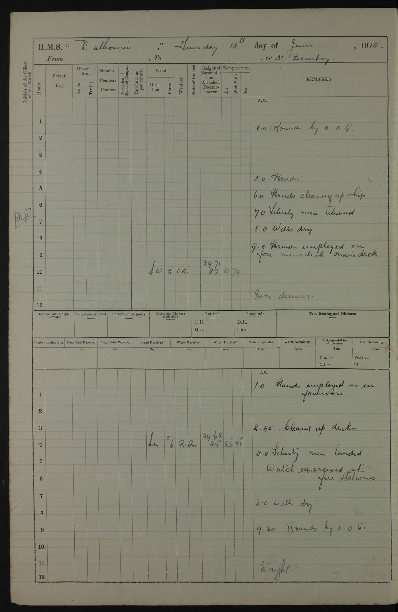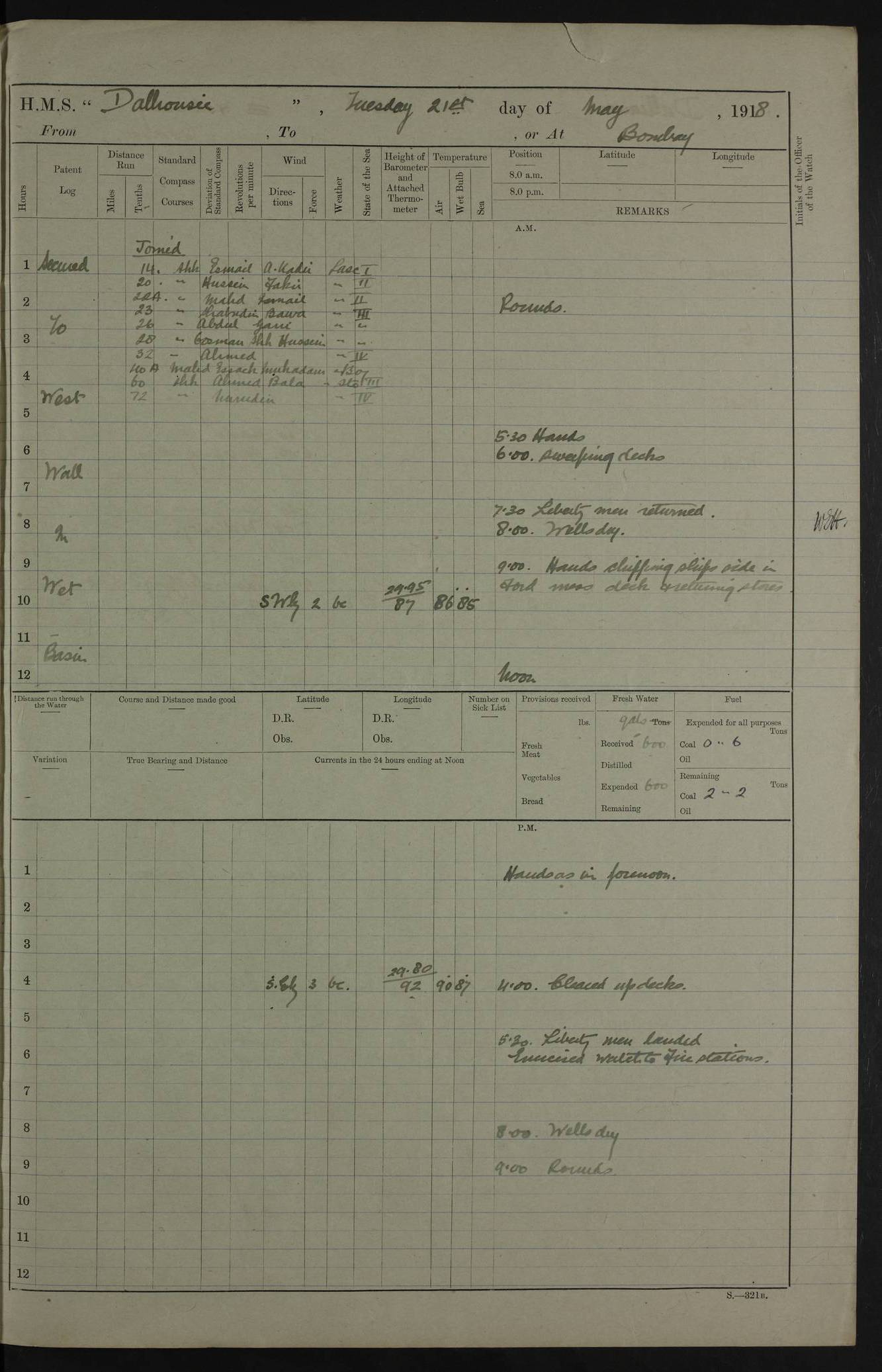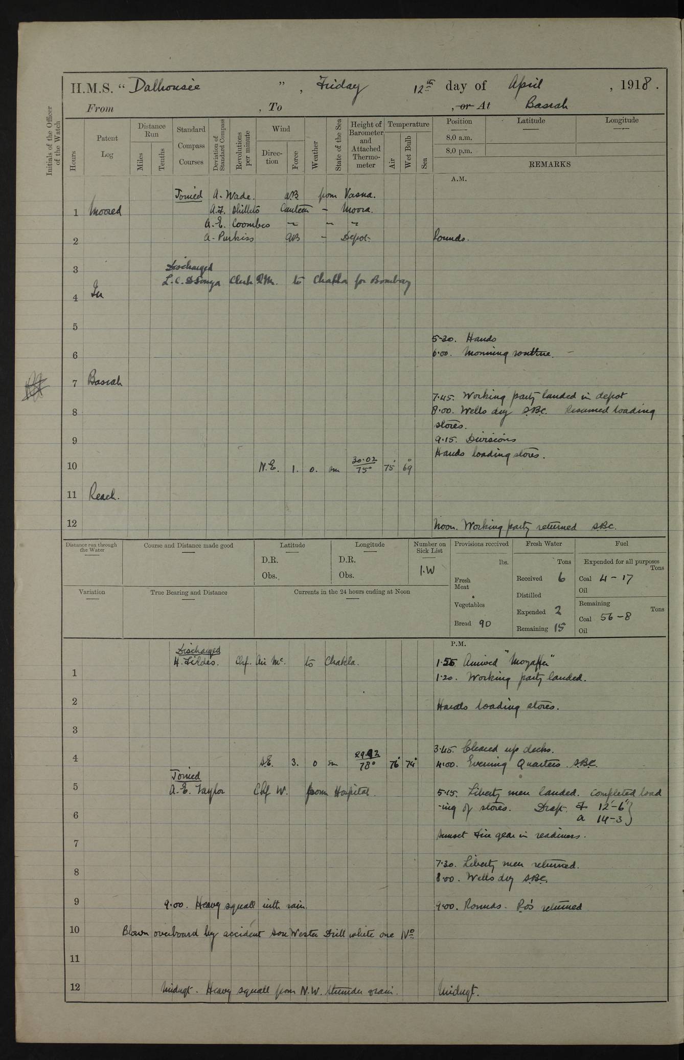 AM – Discharged To EKMA: PJ O’Connor, Lieutenant Royal Navy To Passage: 2 Indian Ratings To FLYCATCHER: D Butcher, Leading Seaman 4ef4fb19e53e0a0c910059d0: (https://s3.amazonaws.com:443/oldweather/ADM53-39410/0015_0.jpg) 26 February 1918 Place: Basrah Lat 30.5269, Long 47.8407 2:00am: Rounds 5:30am: Hands 6:00am: Morning Routine 7:45am: Working party to Depot 8:00am: Wells dry - Signal Books correct 9:10am: Divisions 10:00am: Hands employed painting in cabins & as requisite 12:00pm: Signal Books correct – Working party returned 1:20pm: Working party to Depot 3:45pm: Cleared up decks 4:00pm: Evening Quarters – Signal Books correct 4:30pm: Working party returned 5:10pm: Leave to Watch 6:00pm: Sunset - Fire Gear connected 7:30pm: Liberty men returned 8:00pm: Wells dry - Signal Books correct 9:00pm: Rounds – Signal Books correct PM – Joined From TARANTULA: J Baldwin, Leading Signalman From Hospital: Louis Mones, Engineering driver PM - Discharged To MANTIS: G Munay, Leading Signalman – C Killburn, Signalman To TARANTULA: CM Leary, Telegrapher 4ef4fb19e53e0a0c910059d1: (https://s3.amazonaws.com:443/oldweather/ADM53-39410/0015_1.jpg) 27 February 1918 Place: Basrah Lat 30.5269, Long 47.8407 2:00am: Rounds 5:30am: Hands 6:00am: Morning Routine 7:45am: Working party to Depot 8:00am: Wells dry - Signal Books correct 9:10am: Divisions 10:00am: Hands employed packing surveyed stores, cleaning out boats & painting in Warrant Ratings 12:00pm: Signal Books correct – Working party returned 1:20pm: Working party to Depot 3:45pm: Cleared up decks 4:00pm: Evening Quarters – Signal Books correct 4:30pm: Working party returned 5:10pm: Leave to Watch 6:00pm: Sunset - Fire Gear connected 7:30pm: Liberty men returned 8:00pm: Wells dry - Signal Books correct 9:00pm: Rounds – Signal Books correct AM – Joined From ELEPHANTA: No. 22 Sheik Kadir Sheik Mahomed, Lascar 2nd – No. 41 Abdool Rahman Sheik Dawood, Lamp Trimmer – No. 56 Mahomed Sabia Sheik Bosman, Stoker 2nd – No. 50A Sheik Mahomed Sheik Hassan, Stoker 2nd – No. 90 Abelino Fernandez, Topass – No. 86 Avelino Leitas, Topass 4ef4fb1ae53e0a0c910059d2: (https://s3.amazonaws.com:443/oldweather/ADM53-39410/0016_0.jpg) 28 February 1918 Place: Basrah Lat 30.5269, Long 47.8407 2:00am: Rounds 5:30am: Hands 6:00am: Morning Routine 7:45am: Working party to Depot 8:00am: Wells dry - Signal Books correct 9:10am: Divisions 10:00am: Hands employed discharging stores 12:00pm: Signal Books correct – Working party returned 1:00pm: Issued Quinine to Naval Ratings - Issued Quinine to Native Ratings 1:20pm: Working party to Depot 3:45pm: Cleared up decks 4:00pm: Evening Quarters – Signal Books correct 4:30pm: Working party returned 5:10pm: Leave to Watch 6:00pm: Sunset - Fire Gear connected 7:30pm: Liberty men returned 8:00pm: Wells dry - Signal Books correct 9:00pm: Rounds – Signal Books correct PM – Joined From SAPPHIRE: WC Woolley, Petty Officer PM - Discharged To TARANTULA: L Harris, Signalman To SEDGEFLY: T Hughes, Able Seaman To MANTIS: S Redshaw, Able Seaman To Depot: R Matheison, Stoker – H Philo, Stoker TO GRAYFLY: H Stockbridge, Senior Petty Officer 4ef4fb1ae53e0a0c910059d3: (https://s3.amazonaws.com:443/oldweather/ADM53-39410/0016_1.jpg) Log Page – Blank – no data on Page 4ef4fb1ae53e0a0c910059d4: (https://s3.amazonaws.com:443/oldweather/ADM53-39410/0017_0.jpg) Log Page – Blank – no data on Page 4ef4fb1ae53e0a0c910059d5: (https://s3.amazonaws.com:443/oldweather/ADM53-39410/0017_1.jpg) Log Page – Blank 4ef4fb1ae53e0a0c910059d6: (https://s3.amazonaws.com:443/oldweather/ADM53-39410/0018_0.jpg) Log Page – Blank 4ef4fb1ae53e0a0c910059d7: (https://s3.amazonaws.com:443/oldweather/ADM53-39410/0018_1.jpg) Log Page – Blank LOGS FOR MARCH 1918 4ef4fb1be53e0a0c910059d8: (https://s3.amazonaws.com:443/oldweather/ADM53-39411/0000_0.jpg) Log Page – Cover March 1918 4ef4fb1be53e0a0c910059d9: (https://s3.amazonaws.com:443/oldweather/ADM53-39411/0000_1.jpg) Log Page – Cover – March 1918 4ef4fb1be53e0a0c910059da: (https://s3.amazonaws.com:443/oldweather/ADM53-39411/0001_0.jpg) Log Page – Blank 4ef4fb1be53e0a0c910059db: (https://s3.amazonaws.com:443/oldweather/ADM53-39411/0001_1.jpg) Log Page – Blank – no data on Page 4ef4fb1ce53e0a0c910059dc: (https://s3.amazonaws.com:443/oldweather/ADM53-39411/0002_0.jpg) Log Page – Blank – no data on Page 4ef4fb1ce53e0a0c910059dd: (https://s3.amazonaws.com:443/oldweather/ADM53-39411/0002_1.jpg) 1 March 1918 Place: Basrah Lat 30.5269, Long 47.8407 1:00am: drew from Field Chest Treasury Officer Basrah Five thousand (5,000) Rupees only 2:00am: Rounds 5:30am: Hands 6:00am: Morning Routine 7:45am: Working party to Depot 8:00am: Wells dry – Signal Books correct – CHAKLA arrived with 5 Officers & 60 Ratings 12:00pm: Signal Books correct – Working party returned 1:15pm: Working party to Depot 2:00pm: Paid Lascar Ratings 3:45pm: Cleared up decks 4:00pm: Evening Quarters 4:30pm: Working party returned 5:10pm: Leave to Watch 5:30pm: 5 Petty Officers & 57 Ratings to Bandra for Passage 6:00pm: Sunset - Fire Gear connected 7:30pm: Liberty men returned 9:00pm: Rounds – Petty Officers returned AM – Joined From CHALKA: Hawkins, Paymaster Royal Navy PM - Discharged To FLYCATCHER: Dennis, Sub Lieutenant Royal Navy Volunteer Reserve To TARANTULA: L Harris, Signalman To SEDGEFLY: TG Hughes, Able Seaman To MANTIS: S Redshaw, Able Seaman To Depot: R Mathieson, Stoker To GRAYFLY: H Stockbridge, Senior Petty Officer 4ef4fb1ce53e0a0c910059de: (https://s3.amazonaws.com:443/oldweather/ADM53-39411/0003_0.jpg) 2 March 1918 Place: Basrah Lat 30.5269, Long 47.8407 2:00am: Rounds 5:30am: Hands 6:00am: Morning Routine 7:00am: Exercised Fire Stations 7:45am: Working party to Depot 8:00am: Wells dry - Signal Books correct 9:10am: Divisions 10:00am: Hands employed as requisite 12:00pm: Working party returned 1:15pm: Working party to Depot 3:45pm: Cleared up decks 4:00pm: Evening Quarters – Signal Books corr