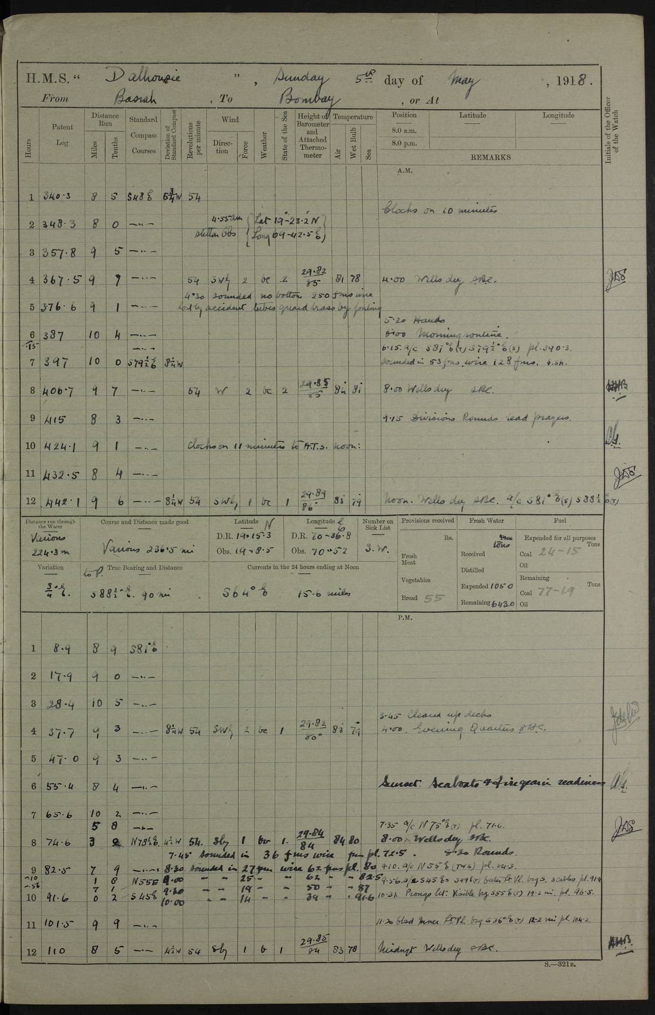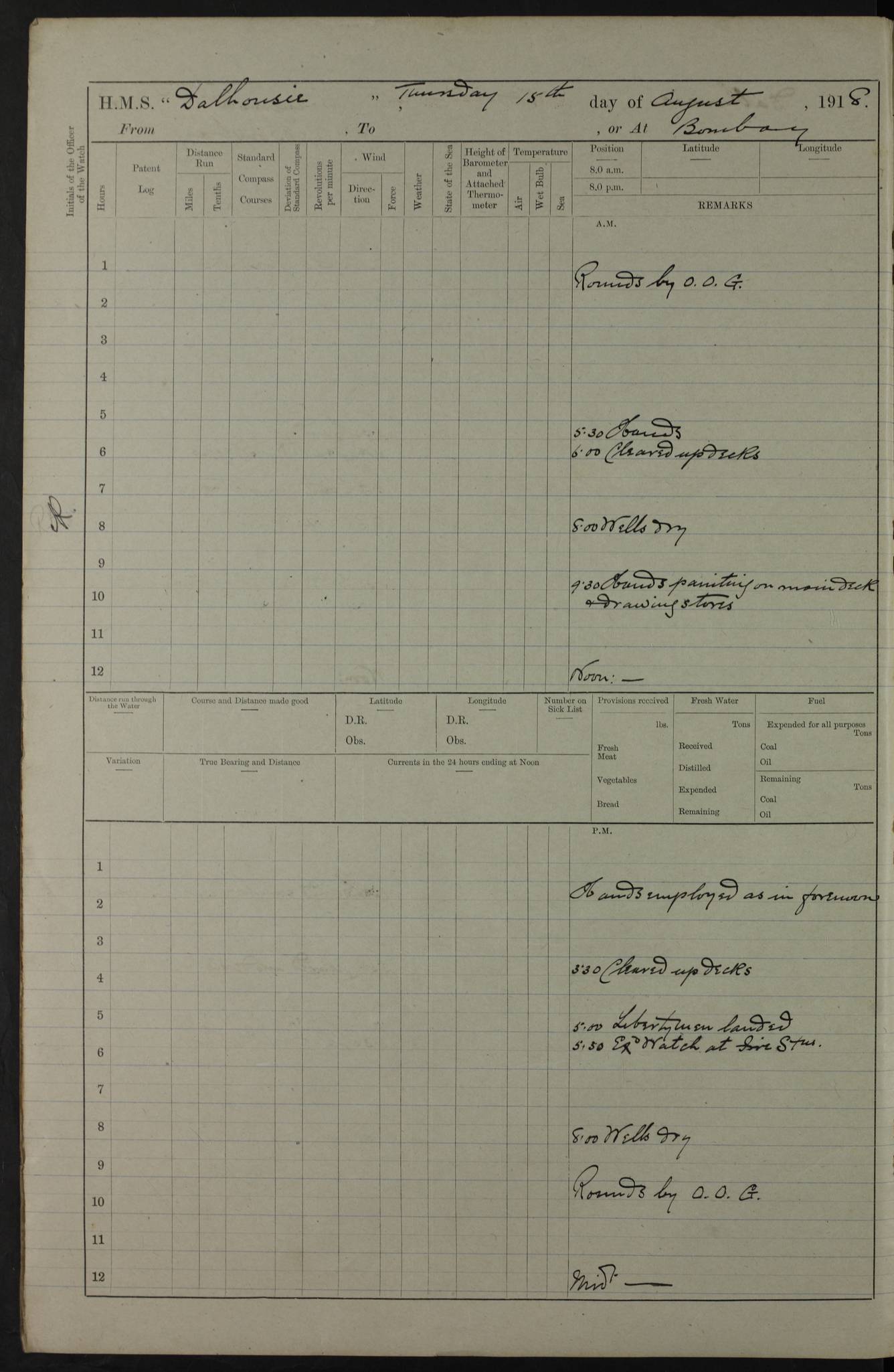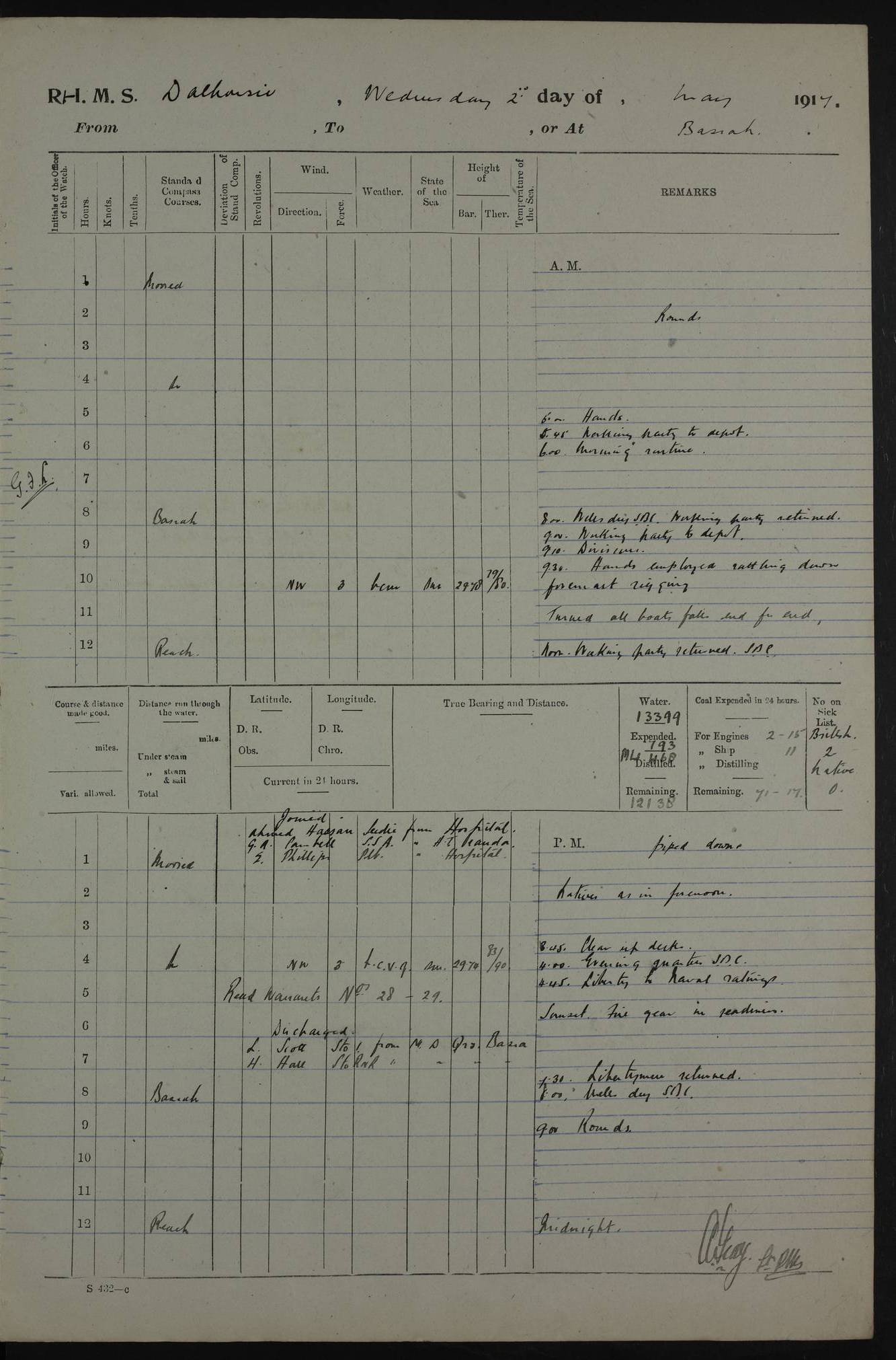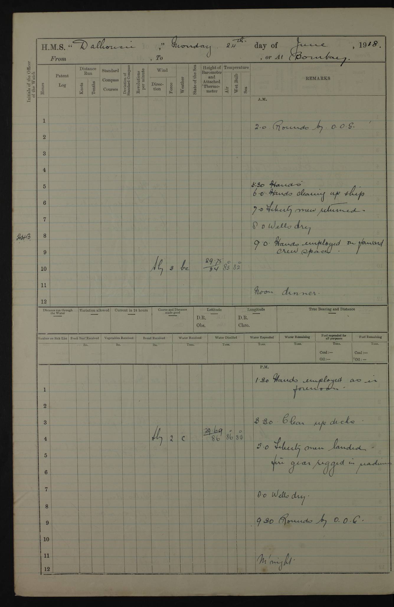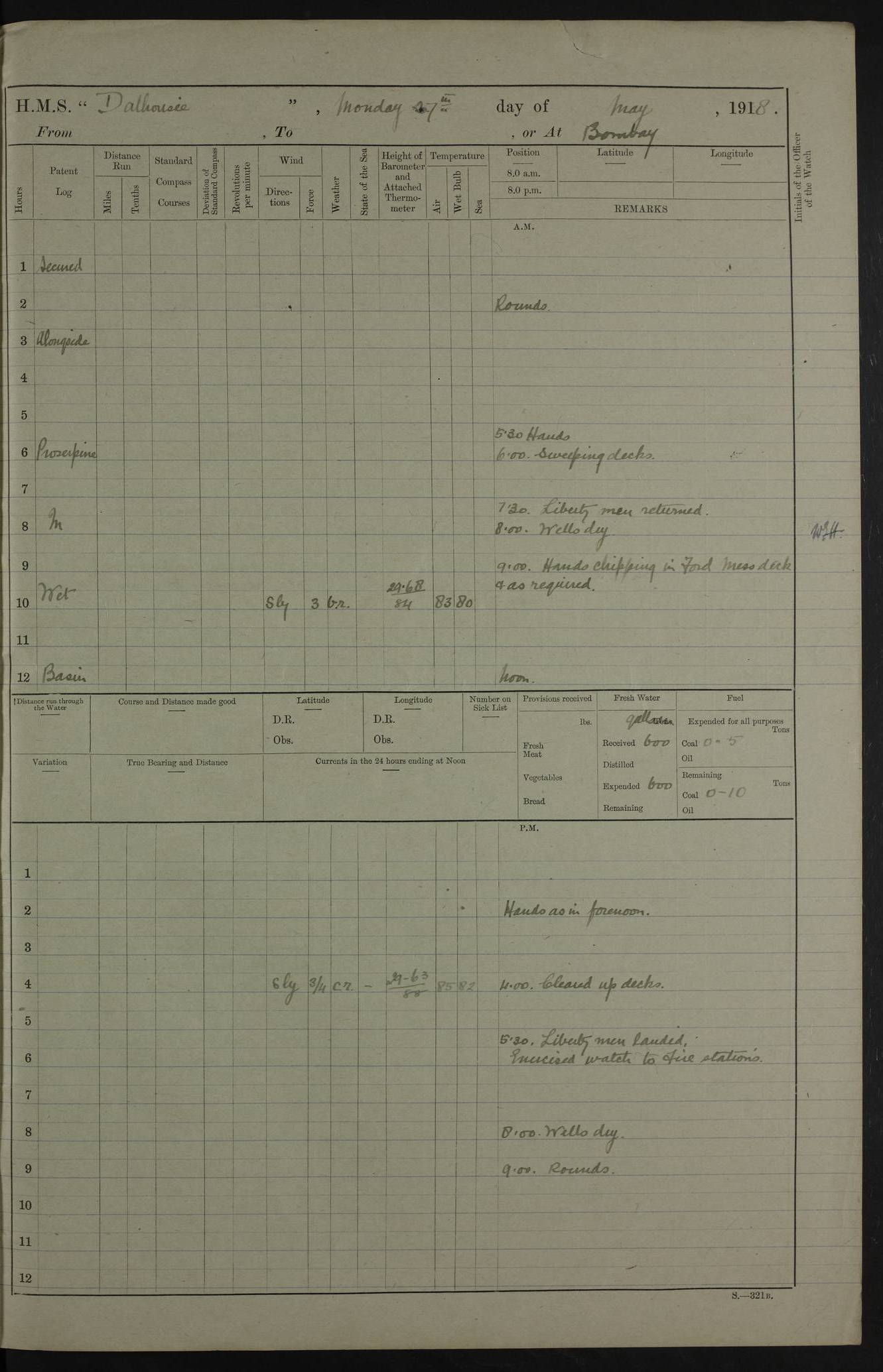 AM – Discharged To EKMA: PJ O’Connor, Lieutenant Royal Navy To Passage: 2 Indian Ratings To FLYCATCHER: D Butcher, Leading Seaman 4ef4fb19e53e0a0c910059d0: (https://s3.amazonaws.com:443/oldweather/ADM53-39410/0015_0.jpg) 26 February 1918 Place: Basrah Lat 30.5269, Long 47.8407 2:00am: Rounds 5:30am: Hands 6:00am: Morning Routine 7:45am: Working party to Depot 8:00am: Wells dry - Signal Books correct 9:10am: Divisions 10:00am: Hands employed painting in cabins & as requisite 12:00pm: Signal Books correct – Working party returned 1:20pm: Working party to Depot 3:45pm: Cleared up decks 4:00pm: Evening Quarters – Signal Books correct 4:30pm: Working party returned 5:10pm: Leave to Watch 6:00pm: Sunset - Fire Gear connected 7:30pm: Liberty men returned 8:00pm: Wells dry - Signal Books correct 9:00pm: Rounds – Signal Books correct PM – Joined From TARANTULA: J Baldwin, Leading Signalman From Hospital: Louis Mones, Engineering driver PM - Discharged To MANTIS: G Munay, Leading Signalman – C Killburn, Signalman To TARANTULA: CM Leary, Telegrapher 4ef4fb19e53e0a0c910059d1: (https://s3.amazonaws.com:443/oldweather/ADM53-39410/0015_1.jpg) 27 February 1918 Place: Basrah Lat 30.5269, Long 47.8407 2:00am: Rounds 5:30am: Hands 6:00am: Morning Routine 7:45am: Working party to Depot 8:00am: Wells dry - Signal Books correct 9:10am: Divisions 10:00am: Hands employed packing surveyed stores, cleaning out boats & painting in Warrant Ratings 12:00pm: Signal Books correct – Working party returned 1:20pm: Working party to Depot 3:45pm: Cleared up decks 4:00pm: Evening Quarters – Signal Books correct 4:30pm: Working party returned 5:10pm: Leave to Watch 6:00pm: Sunset - Fire Gear connected 7:30pm: Liberty men returned 8:00pm: Wells dry - Signal Books correct 9:00pm: Rounds – Signal Books correct AM – Joined From ELEPHANTA: No. 22 Sheik Kadir Sheik Mahomed, Lascar 2nd – No. 41 Abdool Rahman Sheik Dawood, Lamp Trimmer – No. 56 Mahomed Sabia Sheik Bosman, Stoker 2nd – No. 50A Sheik Mahomed Sheik Hassan, Stoker 2nd – No. 90 Abelino Fernandez, Topass – No. 86 Avelino Leitas, Topass 4ef4fb1ae53e0a0c910059d2: (https://s3.amazonaws.com:443/oldweather/ADM53-39410/0016_0.jpg) 28 February 1918 Place: Basrah Lat 30.5269, Long 47.8407 2:00am: Rounds 5:30am: Hands 6:00am: Morning Routine 7:45am: Working party to Depot 8:00am: Wells dry - Signal Books correct 9:10am: Divisions 10:00am: Hands employed discharging stores 12:00pm: Signal Books correct – Working party returned 1:00pm: Issued Quinine to Naval Ratings - Issued Quinine to Native Ratings 1:20pm: Working party to Depot 3:45pm: Cleared up decks 4:00pm: Evening Quarters – Signal Books correct 4:30pm: Working party returned 5:10pm: Leave to Watch 6:00pm: Sunset - Fire Gear connected 7:30pm: Liberty men returned 8:00pm: Wells dry - Signal Books correct 9:00pm: Rounds – Signal Books correct PM – Joined From SAPPHIRE: WC Woolley, Petty Officer PM - Discharged To TARANTULA: L Harris, Signalman To SEDGEFLY: T Hughes, Able Seaman To MANTIS: S Redshaw, Able Seaman To Depot: R Matheison, Stoker – H Philo, Stoker TO GRAYFLY: H Stockbridge, Senior Petty Officer 4ef4fb1ae53e0a0c910059d3: (https://s3.amazonaws.com:443/oldweather/ADM53-39410/0016_1.jpg) Log Page – Blank – no data on Page 4ef4fb1ae53e0a0c910059d4: (https://s3.amazonaws.com:443/oldweather/ADM53-39410/0017_0.jpg) Log Page – Blank – no data on Page 4ef4fb1ae53e0a0c910059d5: (https://s3.amazonaws.com:443/oldweather/ADM53-39410/0017_1.jpg) Log Page – Blank 4ef4fb1ae53e0a0c910059d6: (https://s3.amazonaws.com:443/oldweather/ADM53-39410/0018_0.jpg) Log Page – Blank 4ef4fb1ae53e0a0c910059d7: (https://s3.amazonaws.com:443/oldweather/ADM53-39410/0018_1.jpg) Log Page – Blank LOGS FOR MARCH 1918 4ef4fb1be53e0a0c910059d8: (https://s3.amazonaws.com:443/oldweather/ADM53-39411/0000_0.jpg) Log Page – Cover March 1918 4ef4fb1be53e0a0c910059d9: (https://s3.amazonaws.com:443/oldweather/ADM53-39411/0000_1.jpg) Log Page – Cover – March 1918 4ef4fb1be53e0a0c910059da: (https://s3.amazonaws.com:443/oldweather/ADM53-39411/0001_0.jpg) Log Page – Blank 4ef4fb1be53e0a0c910059db: (https://s3.amazonaws.com:443/oldweather/ADM53-39411/0001_1.jpg) Log Page – Blank – no data on Page 4ef4fb1ce53e0a0c910059dc: (https://s3.amazonaws.com:443/oldweather/ADM53-39411/0002_0.jpg) Log Page – Blank – no data on Page 4ef4fb1ce53e0a0c910059dd: (https://s3.amazonaws.com:443/oldweather/ADM53-39411/0002_1.jpg) 1 March 1918 Place: Basrah Lat 30.5269, Long 47.8407 1:00am: drew from Field Chest Treasury Officer Basrah Five thousand (5,000) Rupees only 2:00am: Rounds 5:30am: Hands 6:00am: Morning Routine 7:45am: Working party to Depot 8:00am: Wells dry – Signal Books correct – CHAKLA arrived with 5 Officers & 60 Ratings 12:00pm: Signal Books correct – Working party returned 1:15pm: Working party to Depot 2:00pm: Paid Lascar Ratings 3:45pm: Cleared up decks 4:00pm: Evening Quarters 4:30pm: Working party returned 5:10pm: Leave to Watch 5:30pm: 5 Petty Officers & 57 Ratings to Bandra for Passage 6:00pm: Sunset - Fire Gear connected 7:30pm: Liberty men returned 9:00pm: Rounds – Petty Officers returned AM – Joined From CHALKA: Hawkins, Paymaster Royal Navy PM - Discharged To FLYCATCHER: Dennis, Sub Lieutenant Royal Navy Volunteer Reserve To TARANTULA: L Harris, Signalman To SEDGEFLY: TG Hughes, Able Seaman To MANTIS: S Redshaw, Able Seaman To Depot: R Mathieson, Stoker To GRAYFLY: H Stockbridge, Senior Petty Officer 4ef4fb1ce53e0a0c910059de: (https://s3.amazonaws.com:443/oldweather/ADM53-39411/0003_0.jpg) 2 March 1918 Place: Basrah Lat 30.5269, Long 47.8407 2:00am: Rounds 5:30am: Hands 6:00am: Morning Routine 7:00am: Exercised Fire Stations 7:45am: Working party to Depot 8:00am: Wells dry - Signal Books correct 9:10am: Divisions 10:00am: Hands employed as requisite 12:00pm: Working party returned 1:15pm: Working party to Depot 3:45pm: Cleared up decks 4:00pm: Evening Quarters – Signal Books corr